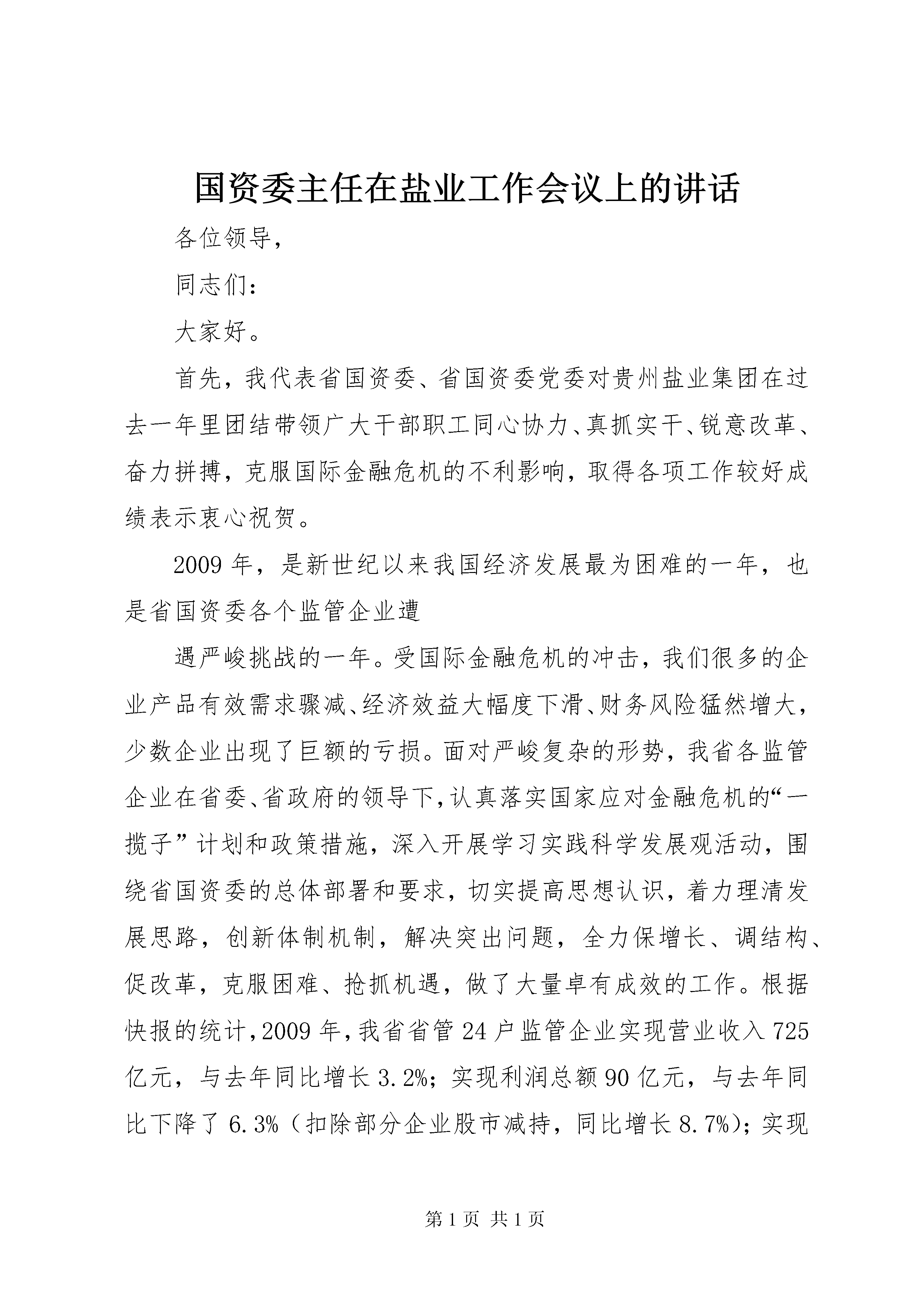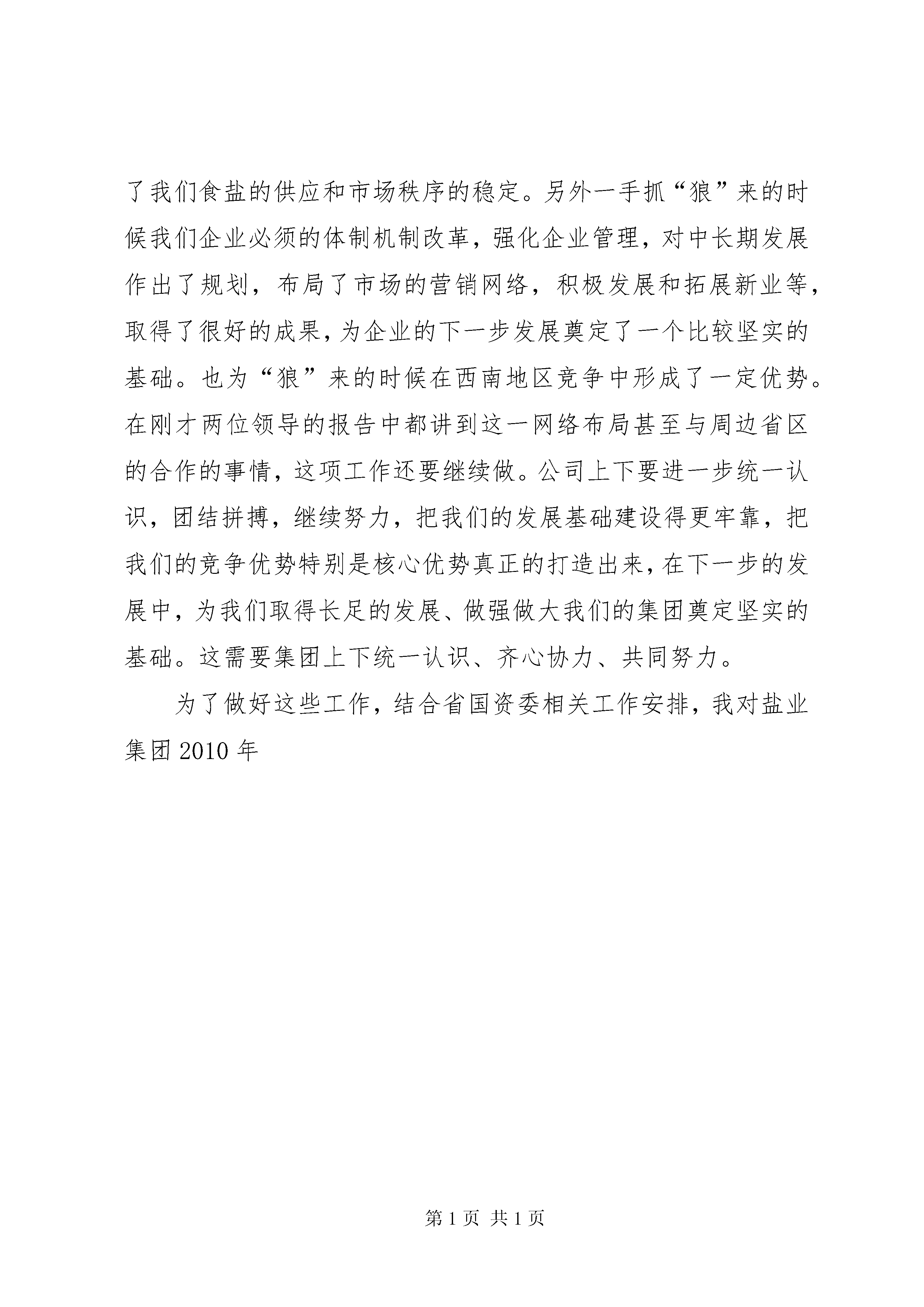 国资委主任在盐业工作会议上的讲话各位领导,同志们:大家好。首先,我代表省国资委、省国资委党委对贵州盐业集团在过去一年里团结带领广大干部职工同心协力、真抓实干、锐意改革、奋力拼搏,克服国际金融危机的不利影响,取得各项工作较好成绩表示衷心祝贺。2009年,是新世纪以来我国经济发展最为困难的一年,也是省国资委各个监管企业遭遇严峻挑战的一年。受国际金融危机的冲击,我们很多的企业产品有效需求骤减、经济效益大幅度下滑、财务风险猛然增大,少数企业出现了巨额的亏损。面对严峻复杂的形势,我省各监管企业在省委、省政府的领导下,认真落实国家应对金融危机的“一揽子”计划和政策措施,深入开展学习实践科学发展观活动,围绕省国资委的总体部署和要求,切实提高思想认识,着力理清发展思路,创新体制机制,解决突出问题,全力保增长、调结构、促改革,克服困难、抢抓机遇,做了大量卓有成效的工作。根据快报的统计,2009年,我省省管24户监管企业实现营业收入725亿元,与去年同比增长3.2%;实现利润总额90亿元,与去年同比下降了6.3%(扣除部分企业股市减持,同比增长8.7%);实现增加值270亿元,与去年同比增加了14.8%。总体看,省国资监管企业实现了平稳的增长。在我国30多个省市区国资委中,我省的各项指标还算不错,利润总额排在14名,高于四川、云南、广西,略少于重庆。就贵州盐业集团而言,从刘董事长、彭总经理通报的数据来看,贵州盐业集团2009年的总资产、净资产、营业收入、实现税利、利润总额均有不同程度的增长,创造了集团历史最好水平。企业的改革、新业的发展进一步推进,企业管理、盐政管理、党的建设进一步加强,也为我省国有企业的发展和经济建设作出了贡献。在这里,我代表省国资委对贵州盐业集团的广大干部职工表示衷心的感谢。2010年,省国资委将按照省委、省政府提出的“着力改善发展条件,着力转变发展方式,着力调整经济结构,着力推行新型工业化和绿色城镇化,着力推进改革开放,着力保障和改善民生”的“六个着力”的要求,调整提高上水平,打造竞争新优势,深化各项工作的措施,进一步加快发展的步伐,深化国企改革,优化布局结构,推动技术创新,加强党的建设,促使监管企业又好又快发展,为加快全省经济社会平稳较快发展作出我们国有企业的新贡献。围绕省委、省政府的要求和省国资委的工作安排,盐业集团的领导班子结合盐业工作实际,对形势和任务、挑战和困难、现状和问题、机遇和优势等作了非常深入的分析,在刘董事长和彭总的报告中均有详细的阐述和体现,并作出了“体制大转型、行业大调整、经营大转变”的基本判断,而且对今年的工作作出了全面的安排部署,我们都赞成。希望盐业集团领导班子团结带领全体干部职工,进一步统一思想、全力以赴抓好各项工作的落实。我先后几次参加了集团的全省盐业工作会议,每次都留下非常深刻的印象,也向我们盐业集团的广大干部职工学习了很多东西。这次会议又让我更加全面深入地了解了集团面临的形势和在我国盐业同行业中的位置。了解了我们盐业集团干部职工取得的业绩,了解我们干部职工所思、所想和精神风貌。几年来,盐业集团的领导班子以高度的政治责任感和强烈的事业心和紧迫的发展意识、危机意识、竞争意识和创新意识,从全局出发,超前谋划企业的改革发展,取得了切实的成效。我从与刘董事长的交谈中,多次听到了“狼来了”这句话,我能够充分理解贵州盐业集团领导班子的深刻用意。一方面,“狼”可能确实随时要来。另一方面,就是刘董事长在报告里面讲的:“关键是狼来的时候,我们的思想准备好没有、组织准备好没有、措施准备好没有、体制机制准备好了没有。”,集团班子实际上是在动员全体干部职工未雨绸缪、做好准备,确保企业稳健经营,可持续发展。几年来,我们盐业集团的领导班子和全体干部职工坚持两手抓,一手抓“狼”还没有来的时候,要充分抓住专营的机遇期,狠抓盐政管理,坚持食盐专营,维护食盐价格的统一和市场的统一,保证了我们食盐的供应和市场秩序的稳定。另外一手抓“狼”来的时候我们企业必须的体制机制改革,强化企业管理,对中长期发展作出了规划,布局了市场的营销网络,积极发展和拓展新业等,取得了很好的成果,为企业的下一步发展奠定了一个比较坚实的基础。也为“狼”来的时候在西南地区竞争中形成了一定优势。在刚才两位领导的报告中都讲到这一网络布局甚至与周边省区的合作的事情,这项工作还要继续做。公司上下要进一步统一认识,团结拼搏,继续努力,把我们的发展基础建设得更牢靠,把我们的竞争优势特别是核心优势真正的打造出来,在下一步的发展中,为我们取得长足的发展、做强做大我们的集团奠定坚实的基础。这需要集团上下统一认识、齐心协力、共同努力。为了做好这些工作,结合省国资委相关工作安排,我对盐业集团2010年