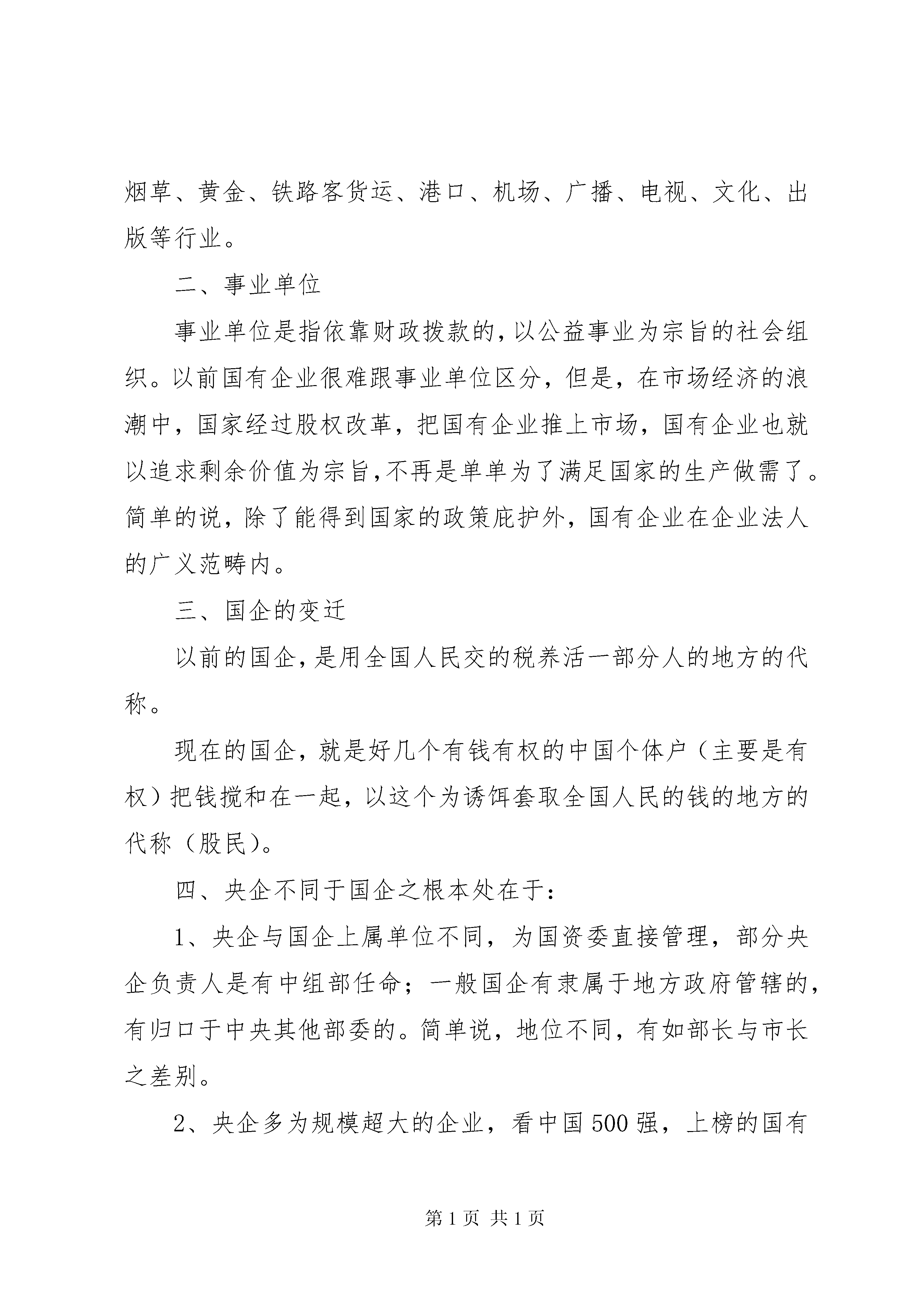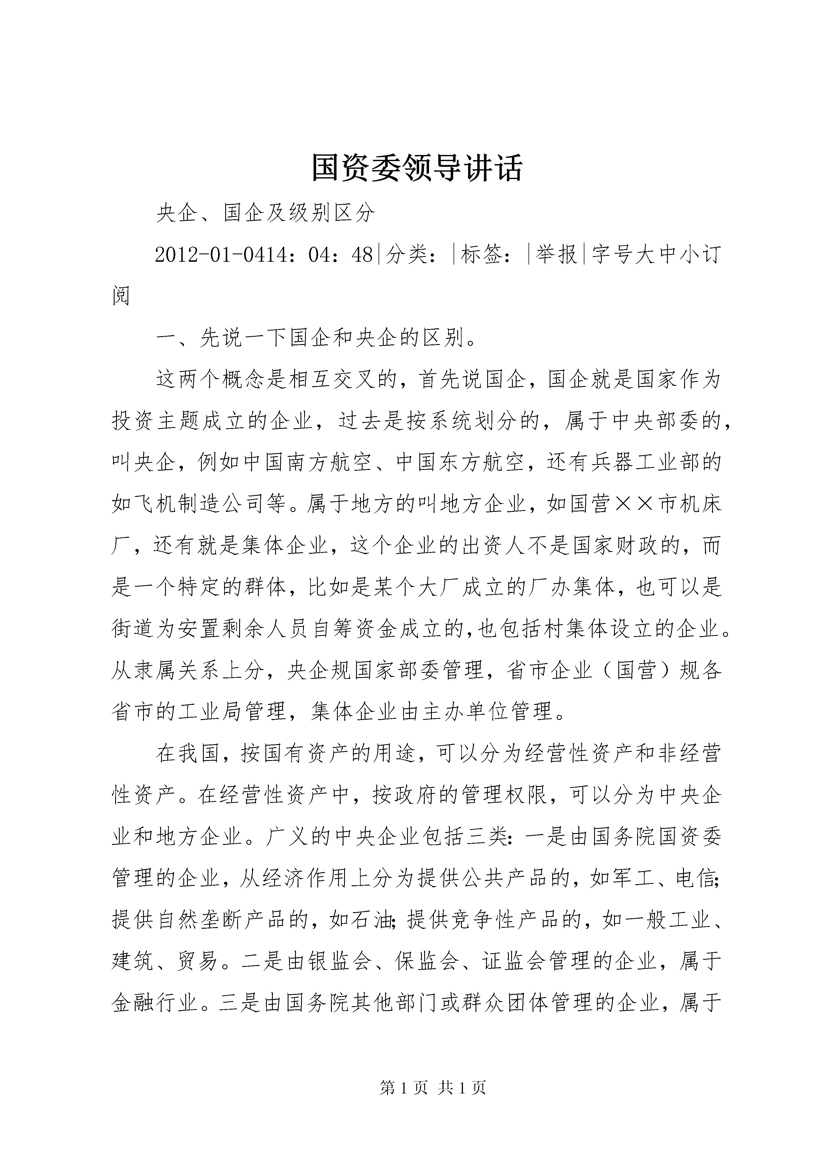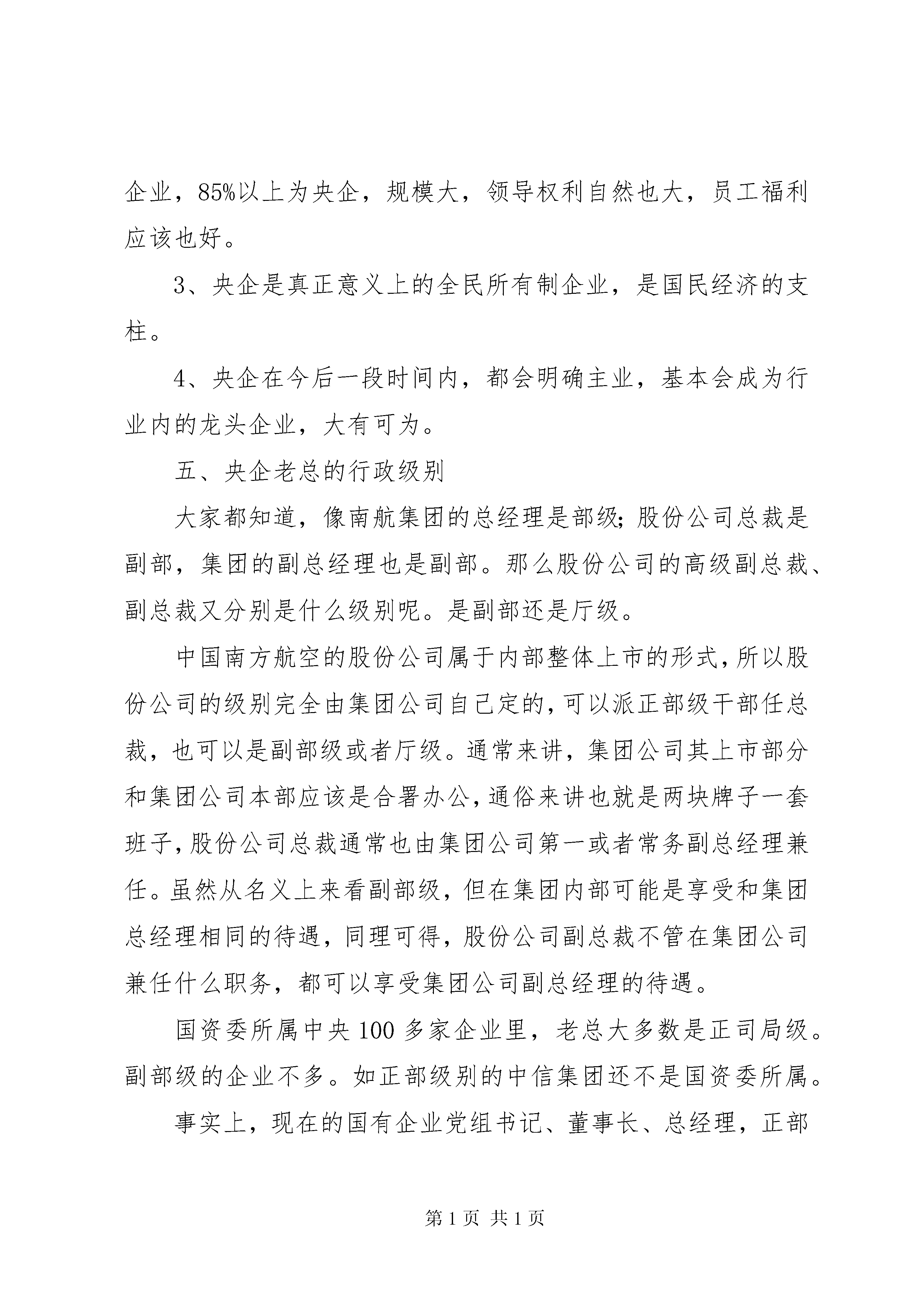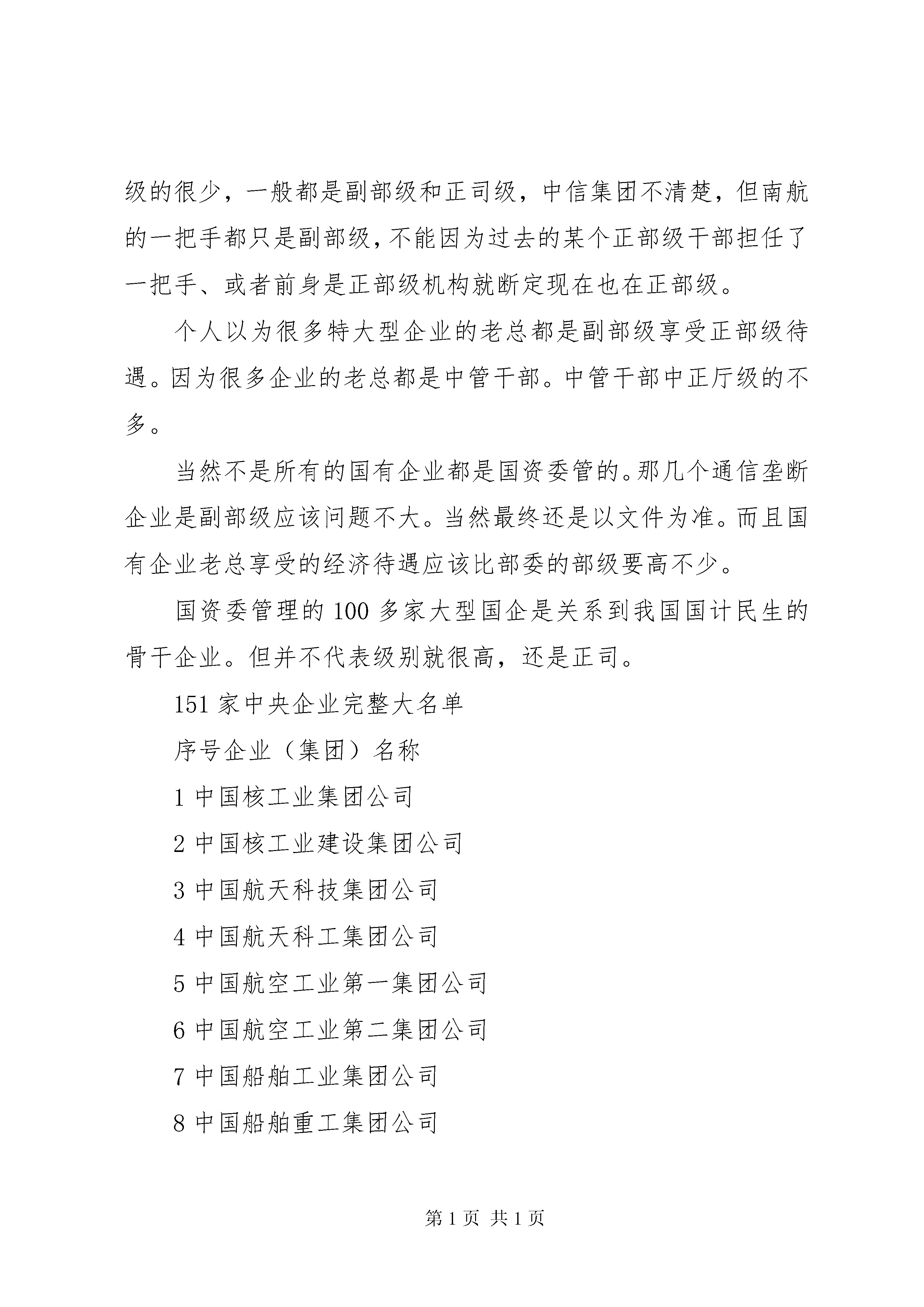 国资委领导讲话央企、国企及级别区分2012-01-0414:04:48|分类:|标签:|举报|字号大中小订阅一、先说一下国企和央企的区别。这两个概念是相互交叉的,首先说国企,国企就是国家作为投资主题成立的企业,过去是按系统划分的,属于中央部委的,叫央企,例如中国南方航空、中国东方航空,还有兵器工业部的如飞机制造公司等。属于地方的叫地方企业,如国营××市机床厂,还有就是集体企业,这个企业的出资人不是国家财政的,而是一个特定的群体,比如是某个大厂成立的厂办集体,也可以是街道为安置剩余人员自筹资金成立的,也包括村集体设立的企业。从隶属关系上分,央企规国家部委管理,省市企业(国营)规各省市的工业局管理,集体企业由主办单位管理。在我国,按国有资产的用途,可以分为经营性资产和非经营性资产。在经营性资产中,按政府的管理权限,可以分为中央企业和地方企业。广义的中央企业包括三类:一是由国务院国资委管理的企业,从经济作用上分为提供公共产品的,如军工、电信;提供自然垄断产品的,如石油;提供竞争性产品的,如一般工业、建筑、贸易。二是由银监会、保监会、证监会管理的企业,属于金融行业。三是由国务院其他部门或群众团体管理的企业,属于烟草、黄金、铁路客货运、港口、机场、广播、电视、文化、出版等行业。二、事业单位事业单位是指依靠财政拨款的,以公益事业为宗旨的社会组织。以前国有企业很难跟事业单位区分,但是,在市场经济的浪潮中,国家经过股权改革,把国有企业推上市场,国有企业也就以追求剩余价值为宗旨,不再是单单为了满足国家的生产做需了。简单的说,除了能得到国家的政策庇护外,国有企业在企业法人的广义范畴内。三、国企的变迁以前的国企,是用全国人民交的税养活一部分人的地方的代称。现在的国企,就是好几个有钱有权的中国个体户(主要是有权)把钱搅和在一起,以这个为诱饵套取全国人民的钱的地方的代称(股民)。四、央企不同于国企之根本处在于:1、央企与国企上属单位不同,为国资委直接管理,部分央企负责人是有中组部任命;一般国企有隶属于地方政府管辖的,有归口于中央其他部委的。简单说,地位不同,有如部长与市长之差别。2、央企多为规模超大的企业,看中国500强,上榜的国有企业,85%以上为央企,规模大,领导权利自然也大,员工福利应该也好。3、央企是真正意义上的全民所有制企业,是国民经济的支柱。4、央企在今后一段时间内,都会明确主业,基本会成为行业内的龙头企业,大有可为。五、央企老总的行政级别大家都知道,像南航集团的总经理是部级;股份公司总裁是副部,集团的副总经理也是副部。那么股份公司的高级副总裁、副总裁又分别是什么级别呢。是副部还是厅级。中国南方航空的股份公司属于内部整体上市的形式,所以股份公司的级别完全由集团公司自己定的,可以派正部级干部任总裁,也可以是副部级或者厅级。通常来讲,集团公司其上市部分和集团公司本部应该是合署办公,通俗来讲也就是两块牌子一套班子,股份公司总裁通常也由集团公司第一或者常务副总经理兼任。虽然从名义上来看副部级,但在集团内部可能是享受和集团总经理相同的待遇,同理可得,股份公司副总裁不管在集团公司兼任什么职务,都可以享受集团公司副总经理的待遇。国资委所属中央100多家企业里,老总大多数是正司局级。副部级的企业不多。如正部级别的中信集团还不是国资委所属。事实上,现在的国有企业党组书记、董事长、总经理,正部级的很少,一般都是副部级和正司级,中信集团不清楚,但南航的一把手都只是副部级,不能因为过去的某个正部级干部担任了一把手、或者前身是正部级机构就断定现在也在正部级。个人以为很多特大型企业的老总都是副部级享受正部级待遇。因为很多企业的老总都是中管干部。中管干部中正厅级的不多。当然不是所有的国有企业都是国资委管的。那几个通信垄断企业是副部级应该问题不大。当然最终还是以文件为准。而且国有企业老总享受的经济待遇应该比部委的部级要高不少。国资委管理的100多家大型国企是关系到我国国计民生的骨干企业。但并不代表级别就很高,还是正司。151家中央企业完整大名单序号企业(集团)名称1中国核工业集团公司2中国核工业建设集团公司3中国航天科技集团公司4中国航天科工集团公司5中国航空工业第一集团公司6中国航空工业第二集团公司7中国船舶工业集团公司8中国船舶重工集团公司9中国兵器工业集团公司10中国兵器装备集团公司11中国电子科技集团公司12中国石油天然气集团公司13中国石油化工集团公司14中国海洋石油总公司15国家电网公司16中国南方电网有限责任公司17中国华能集团公司18中国大唐集团公司19中国华电集团公司20中国国电集团公司21中国电力投资集团公司22中国长江三峡工程开发总公司23神华集团有限责任公司24中国电信集团公司25中国网络通信集团公司26中国联合通信有限公