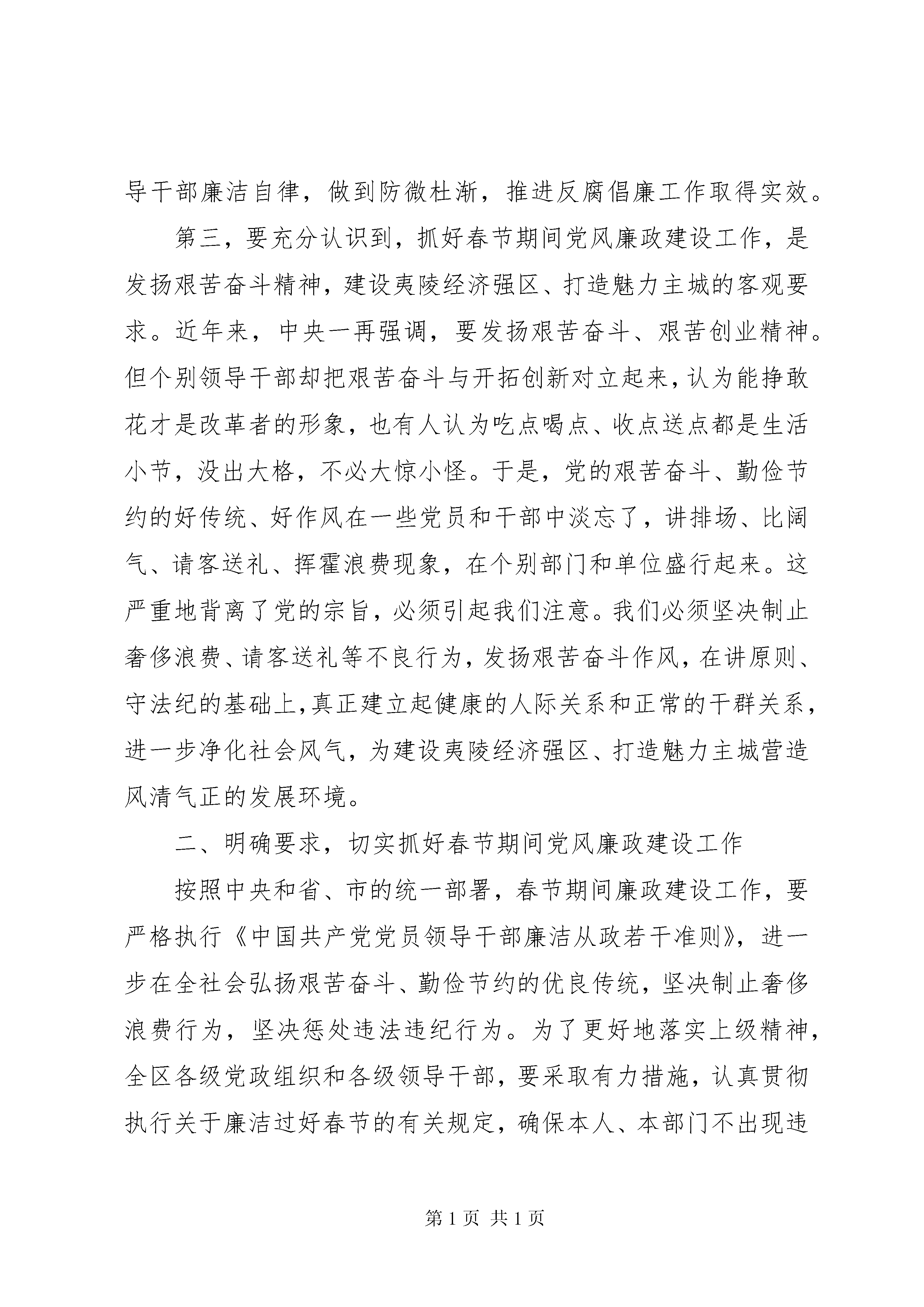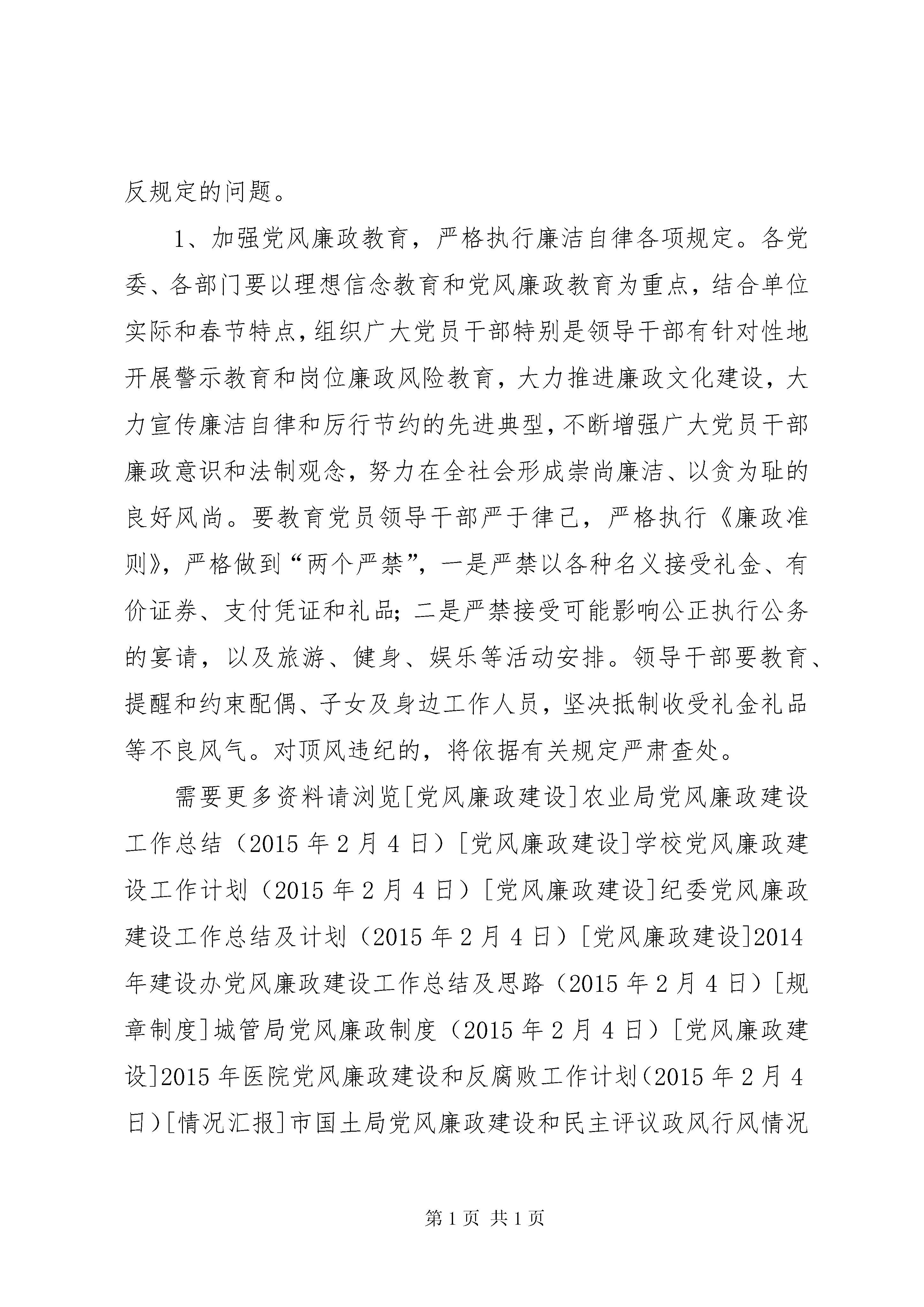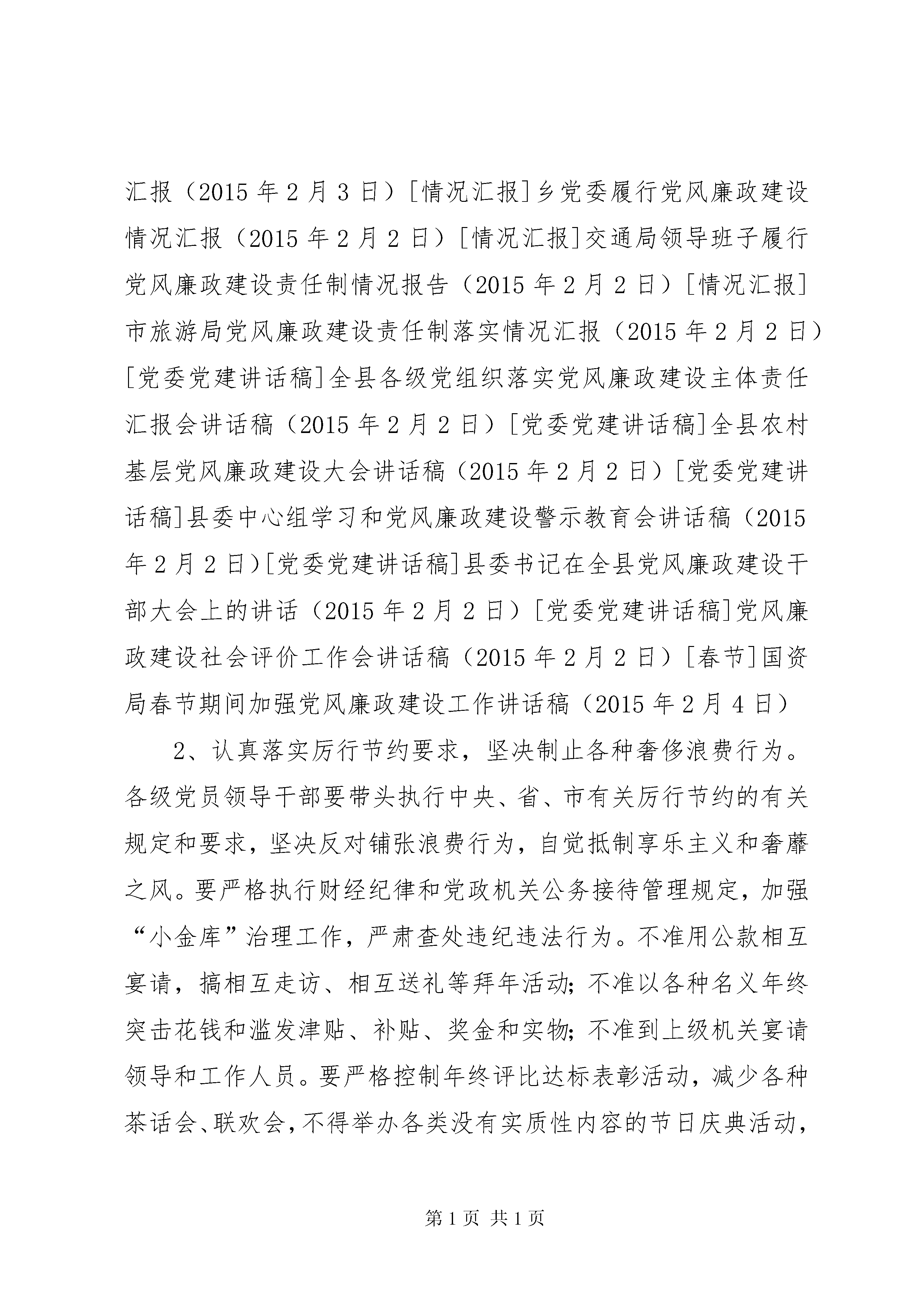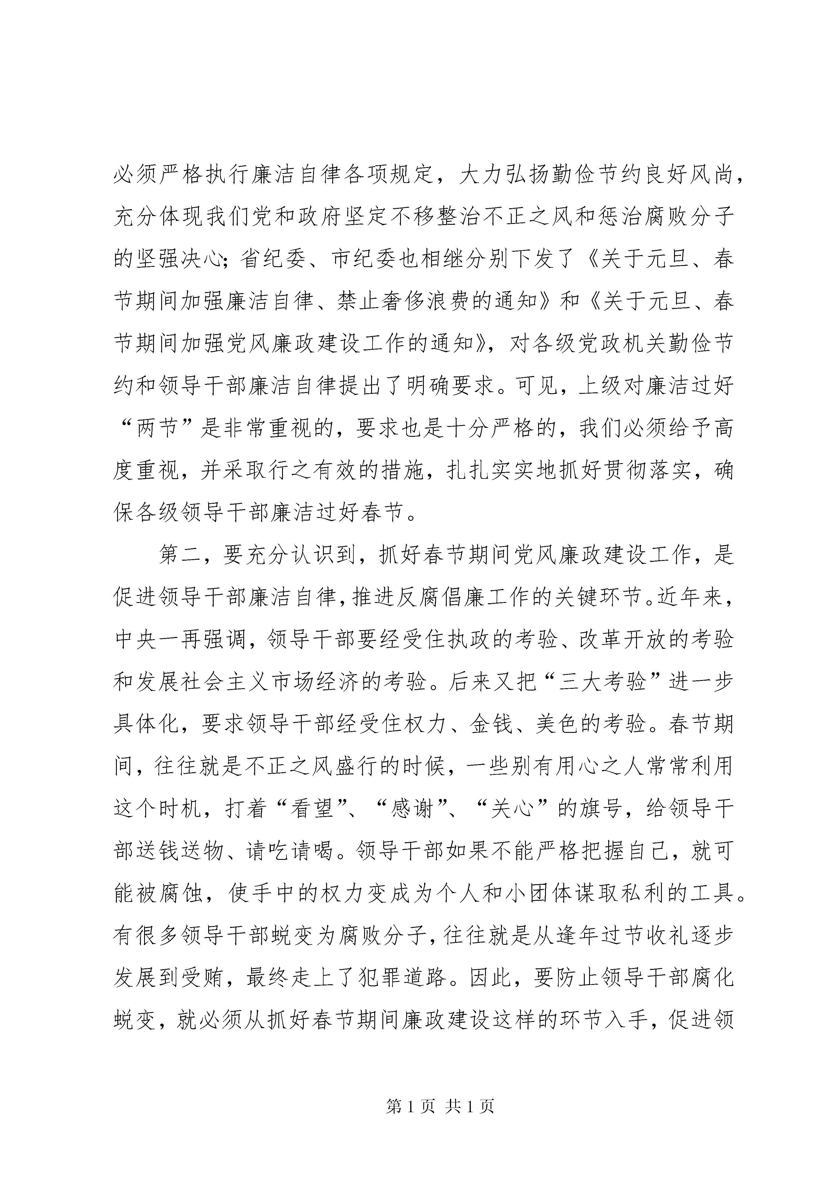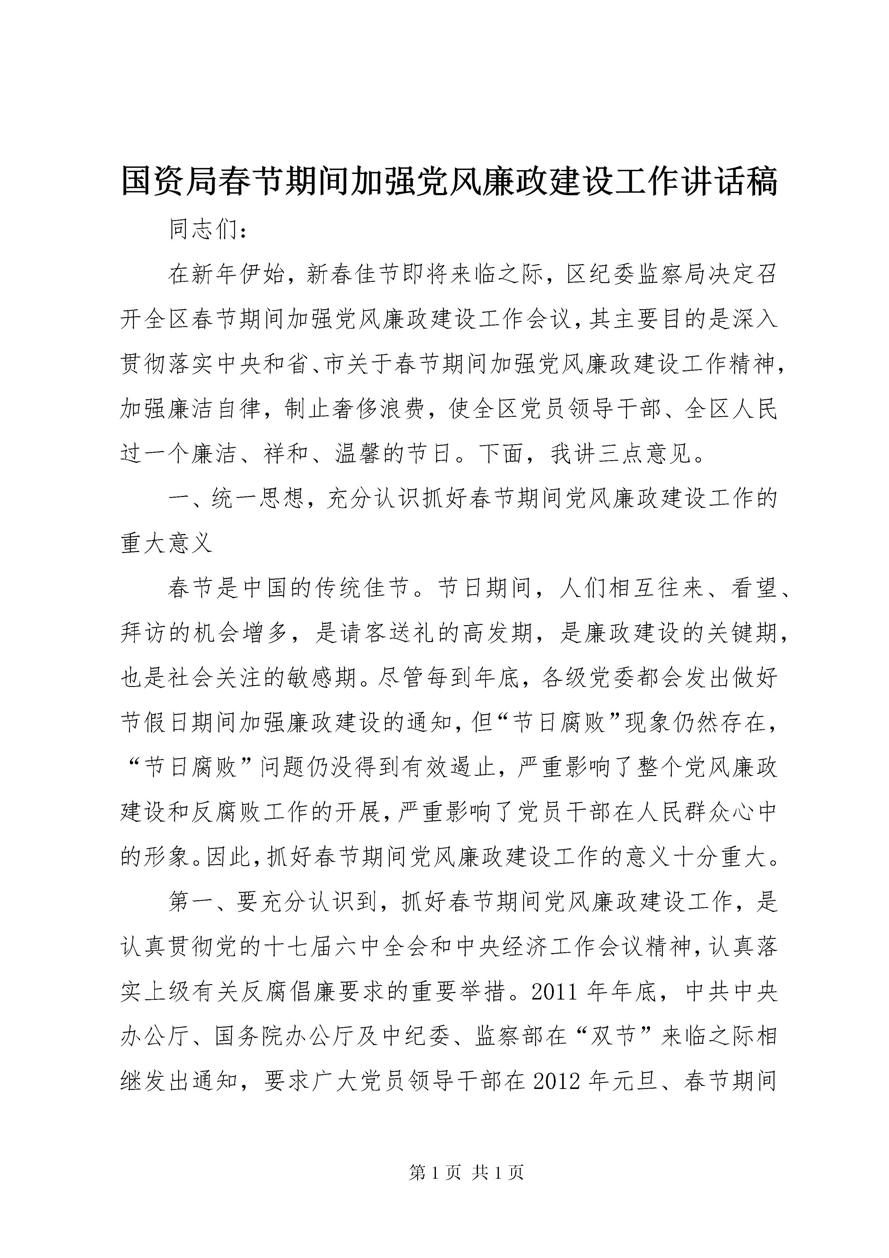 国资局春节期间加强党风廉政建设工作讲话稿同志们:在新年伊始,新春佳节即将来临之际,区纪委监察局决定召开全区春节期间加强党风廉政建设工作会议,其主要目的是深入贯彻落实中央和省、市关于春节期间加强党风廉政建设工作精神,加强廉洁自律,制止奢侈浪费,使全区党员领导干部、全区人民过一个廉洁、祥和、温馨的节日。下面,我讲三点意见。一、统一思想,充分认识抓好春节期间党风廉政建设工作的重大意义春节是中国的传统佳节。节日期间,人们相互往来、看望、拜访的机会增多,是请客送礼的高发期,是廉政建设的关键期,也是社会关注的敏感期。尽管每到年底,各级党委都会发出做好节假日期间加强廉政建设的通知,但“节日腐败”现象仍然存在,“节日腐败”问题仍没得到有效遏止,严重影响了整个党风廉政建设和反腐败工作的开展,严重影响了党员干部在人民群众心中的形象。因此,抓好春节期间党风廉政建设工作的意义十分重大。第一、要充分认识到,抓好春节期间党风廉政建设工作,是认真贯彻党的十七届六中全会和中央经济工作会议精神,认真落实上级有关反腐倡廉要求的重要举措。2011年年底,中共中央办公厅、国务院办公厅及中纪委、监察部在“双节”来临之际相继发出通知,要求广大党员领导干部在2012年元旦、春节期间必须严格执行廉洁自律各项规定,大力弘扬勤俭节约良好风尚,充分体现我们党和政府坚定不移整治不正之风和惩治腐败分子的坚强决心;省纪委、市纪委也相继分别下发了《关于元旦、春节期间加强廉洁自律、禁止奢侈浪费的通知》和《关于元旦、春节期间加强党风廉政建设工作的通知》,对各级党政机关勤俭节约和领导干部廉洁自律提出了明确要求。可见,上级对廉洁过好“两节”是非常重视的,要求也是十分严格的,我们必须给予高度重视,并采取行之有效的措施,扎扎实实地抓好贯彻落实,确保各级领导干部廉洁过好春节。第二,要充分认识到,抓好春节期间党风廉政建设工作,是促进领导干部廉洁自律,推进反腐倡廉工作的关键环节。近年来,中央一再强调,领导干部要经受住执政的考验、改革开放的考验和发展社会主义市场经济的考验。后来又把“三大考验”进一步具体化,要求领导干部经受住权力、金钱、美色的考验。春节期间,往往就是不正之风盛行的时候,一些别有用心之人常常利用这个时机,打着“看望”、“感谢”、“关心”的旗号,给领导干部送钱送物、请吃请喝。领导干部如果不能严格把握自己,就可能被腐蚀,使手中的权力变成为个人和小团体谋取私利的工具。有很多领导干部蜕变为腐败分子,往往就是从逢年过节收礼逐步发展到受贿,最终走上了犯罪道路。因此,要防止领导干部腐化蜕变,就必须从抓好春节期间廉政建设这样的环节入手,促进领导干部廉洁自律,做到防微杜渐,推进反腐倡廉工作取得实效。第三,要充分认识到,抓好春节期间党风廉政建设工作,是发扬艰苦奋斗精神,建设夷陵经济强区、打造魅力主城的客观要求。近年来,中央一再强调,要发扬艰苦奋斗、艰苦创业精神。但个别领导干部却把艰苦奋斗与开拓创新对立起来,认为能挣敢花才是改革者的形象,也有人认为吃点喝点、收点送点都是生活小节,没出大格,不必大惊小怪。于是,党的艰苦奋斗、勤俭节约的好传统、好作风在一些党员和干部中淡忘了,讲排场、比阔气、请客送礼、挥霍浪费现象,在个别部门和单位盛行起来。这严重地背离了党的宗旨,必须引起我们注意。我们必须坚决制止奢侈浪费、请客送礼等不良行为,发扬艰苦奋斗作风,在讲原则、守法纪的基础上,真正建立起健康的人际关系和正常的干群关系,进一步净化社会风气,为建设夷陵经济强区、打造魅力主城营造风清气正的发展环境。二、明确要求,切实抓好春节期间党风廉政建设工作按照中央和省、市的统一部署,春节期间廉政建设工作,要严格执行《中国共产党党员领导干部廉洁从政若干准则》,进一步在全社会弘扬艰苦奋斗、勤俭节约的优良传统,坚决制止奢侈浪费行为,坚决惩处违法违纪行为。为了更好地落实上级精神,全区各级党政组织和各级领导干部,要采取有力措施,认真贯彻执行关于廉洁过好春节的有关规定,确保本人、本部门不出现违反规定的问题。1、加强党风廉政教育,严格执行廉洁自律各项规定。各党委、各部门要以理想信念教育和党风廉政教育为重点,结合单位实际和春节特点,组织广大党员干部特别是领导干部有针对性地开展警示教育和岗位廉政风险教育,大力推进廉政文化建设,大力宣传廉洁自律和厉行节约的先进典型,不断增强广大党员干部廉政意识和法制观念,努力在全社会形成崇尚廉洁、以贪为耻的良好风尚。要教育党员领导干部严于律己,严格执行《廉政准则》,严格做到“两个严禁”,一是严禁以各种名义接受礼金、有价证券、支付凭证和礼品;二是严禁接受可能影响公正执行公务的宴请,以及旅游、健身、娱乐等活动安排。领导干部要教育、提醒和约束配偶、子女及身边工作人员,坚决抵制收受礼金礼品等不良风气。对顶风违纪的