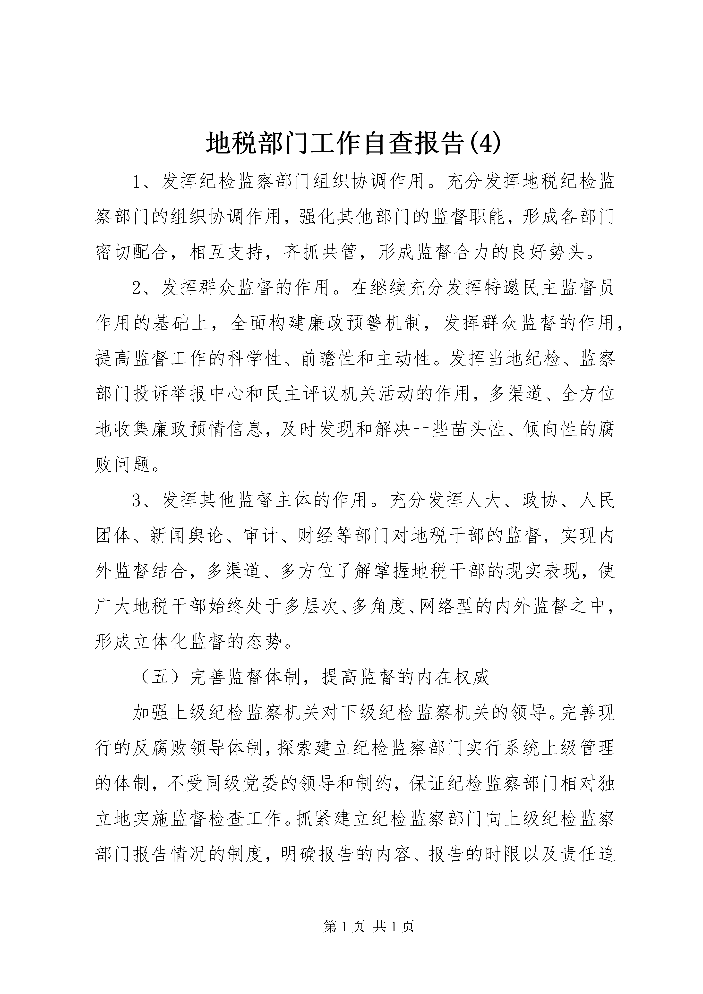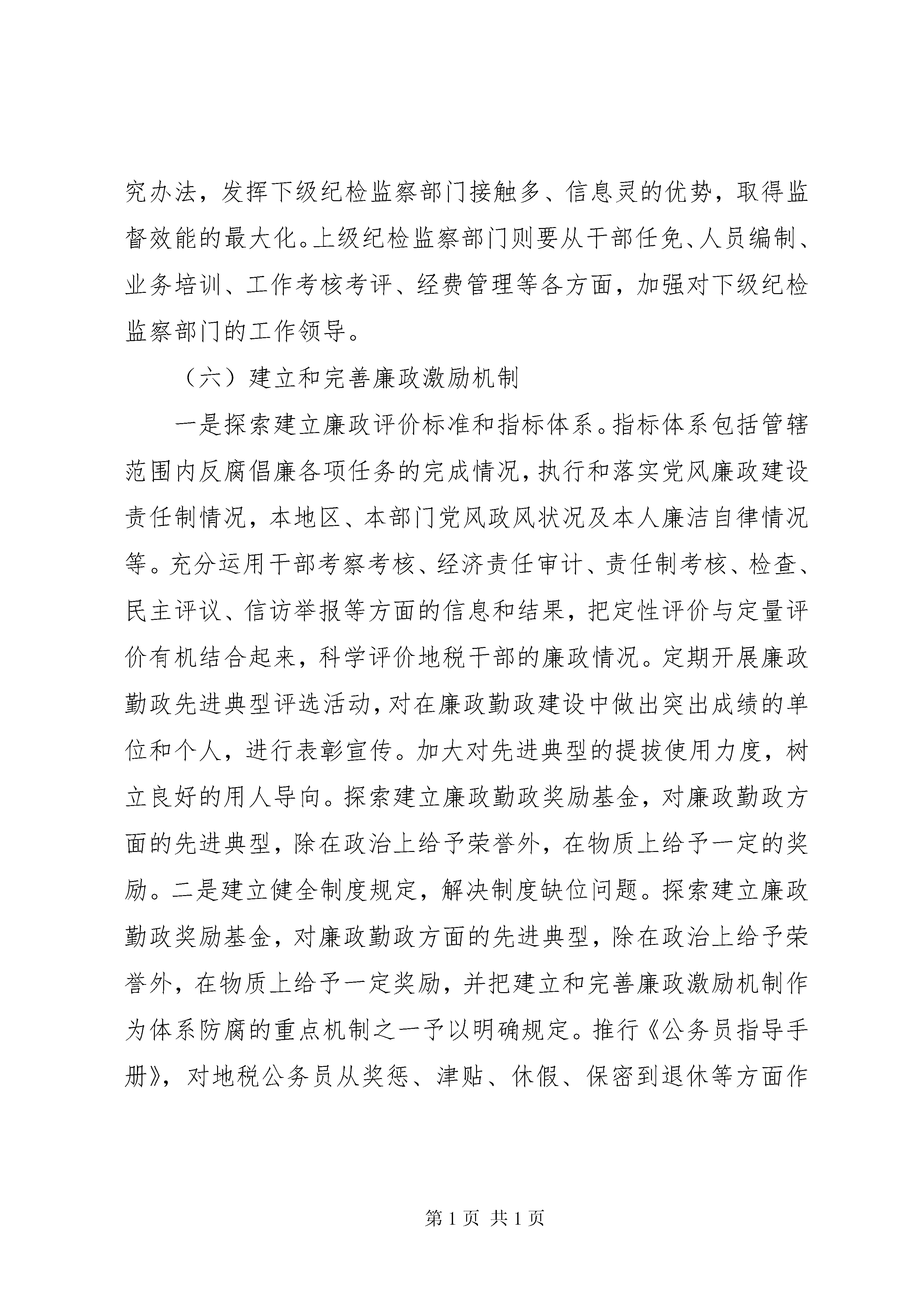 地税部门工作自查报告(4)1、发挥纪检监察部门组织协调作用。充分发挥地税纪检监察部门的组织协调作用,强化其他部门的监督职能,形成各部门密切配合,相互支持,齐抓共管,形成监督合力的良好势头。2、发挥群众监督的作用。在继续充分发挥特邀民主监督员作用的基础上,全面构建廉政预警机制,发挥群众监督的作用,提高监督工作的科学性、前瞻性和主动性。发挥当地纪检、监察部门投诉举报中心和民主评议机关活动的作用,多渠道、全方位地收集廉政预情信息,及时发现和解决一些苗头性、倾向性的腐败问题。3、发挥其他监督主体的作用。充分发挥人大、政协、人民团体、新闻舆论、审计、财经等部门对地税干部的监督,实现内外监督结合,多渠道、多方位了解掌握地税干部的现实表现,使广大地税干部始终处于多层次、多角度、网络型的内外监督之中,形成立体化监督的态势。(五)完善监督体制,提高监督的内在权威加强上级纪检监察机关对下级纪检监察机关的领导。完善现行的反腐败领导体制,探索建立纪检监察部门实行系统上级管理的体制,不受同级党委的领导和制约,保证纪检监察部门相对独立地实施监督检查工作。抓紧建立纪检监察部门向上级纪检监察部门报告情况的制度,明确报告的内容、报告的时限以及责任追究办法,发挥下级纪检监察部门接触多、信息灵的优势,取得监督效能的最大化。上级纪检监察部门则要从干部任免、人员编制、业务培训、工作考核考评、经费管理等各方面,加强对下级纪检监察部门的工作领导。(六)建立和完善廉政激励机制一是探索建立廉政评价标准和指标体系。指标体系包括管辖范围内反腐倡廉各项任务的完成情况,执行和落实党风廉政建设责任制情况,本地区、本部门党风政风状况及本人廉洁自律情况等。充分运用干部考察考核、经济责任审计、责任制考核、检查、民主评议、信访举报等方面的信息和结果,把定性评价与定量评价有机结合起来,科学评价地税干部的廉政情况。定期开展廉政勤政先进典型评选活动,对在廉政勤政建设中做出突出成绩的单位和个人,进行表彰宣传。加大对先进典型的提拔使用力度,树立良好的用人导向。探索建立廉政勤政奖励基金,对廉政勤政方面的先进典型,除在政治上给予荣誉外,在物质上给予一定的奖励。二是建立健全制度规定,解决制度缺位问题。探索建立廉政勤政奖励基金,对廉政勤政方面的先进典型,除在政治上给予荣誉外,在物质上给予一定奖励,并把建立和完善廉政激励机制作为体系防腐的重点机制之一予以明确规定。推行《公务员指导手册》,对地税公务员从奖惩、津贴、休假、保密到退休等方面作出明确具体的规定,以此做到防患于未然。