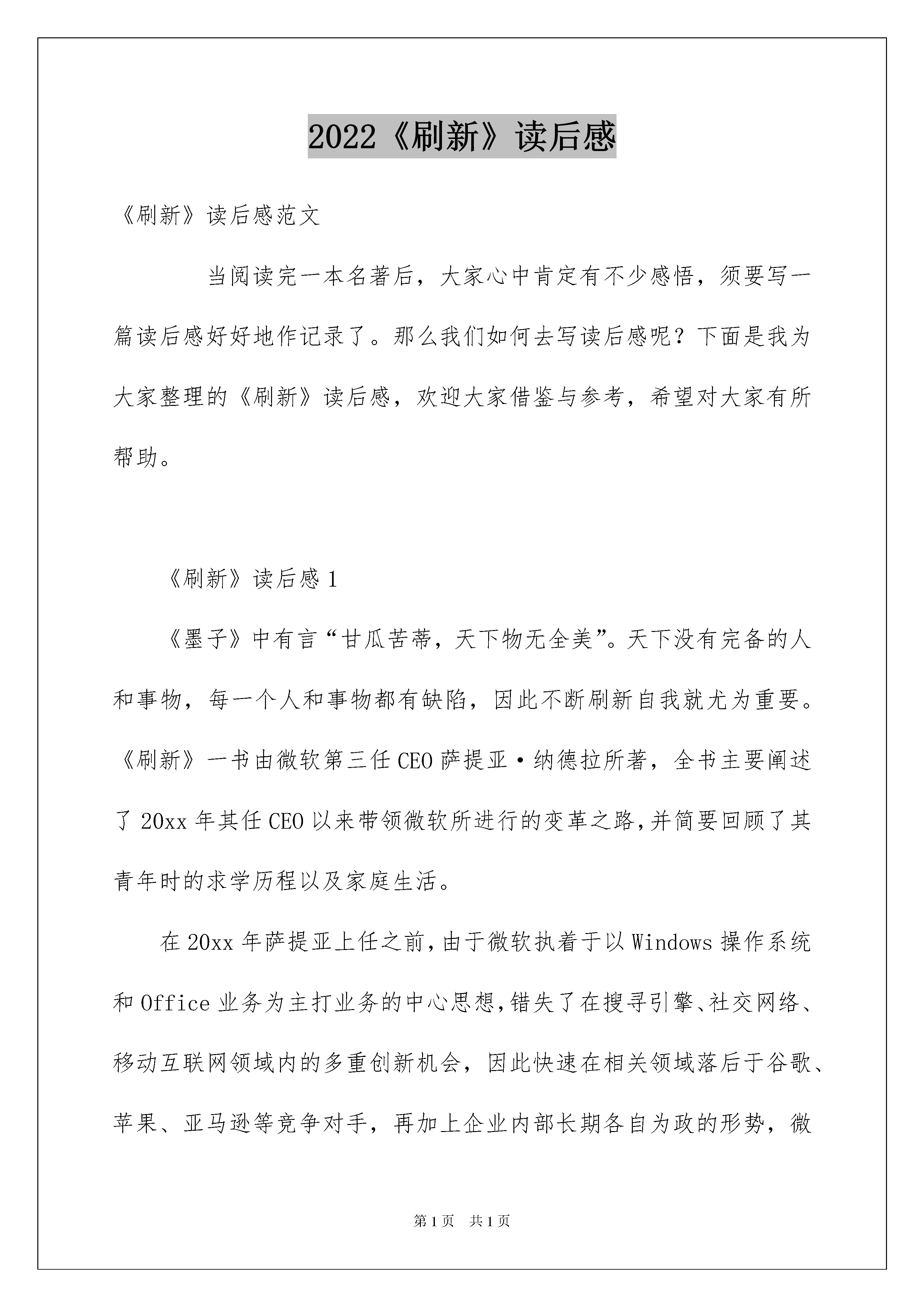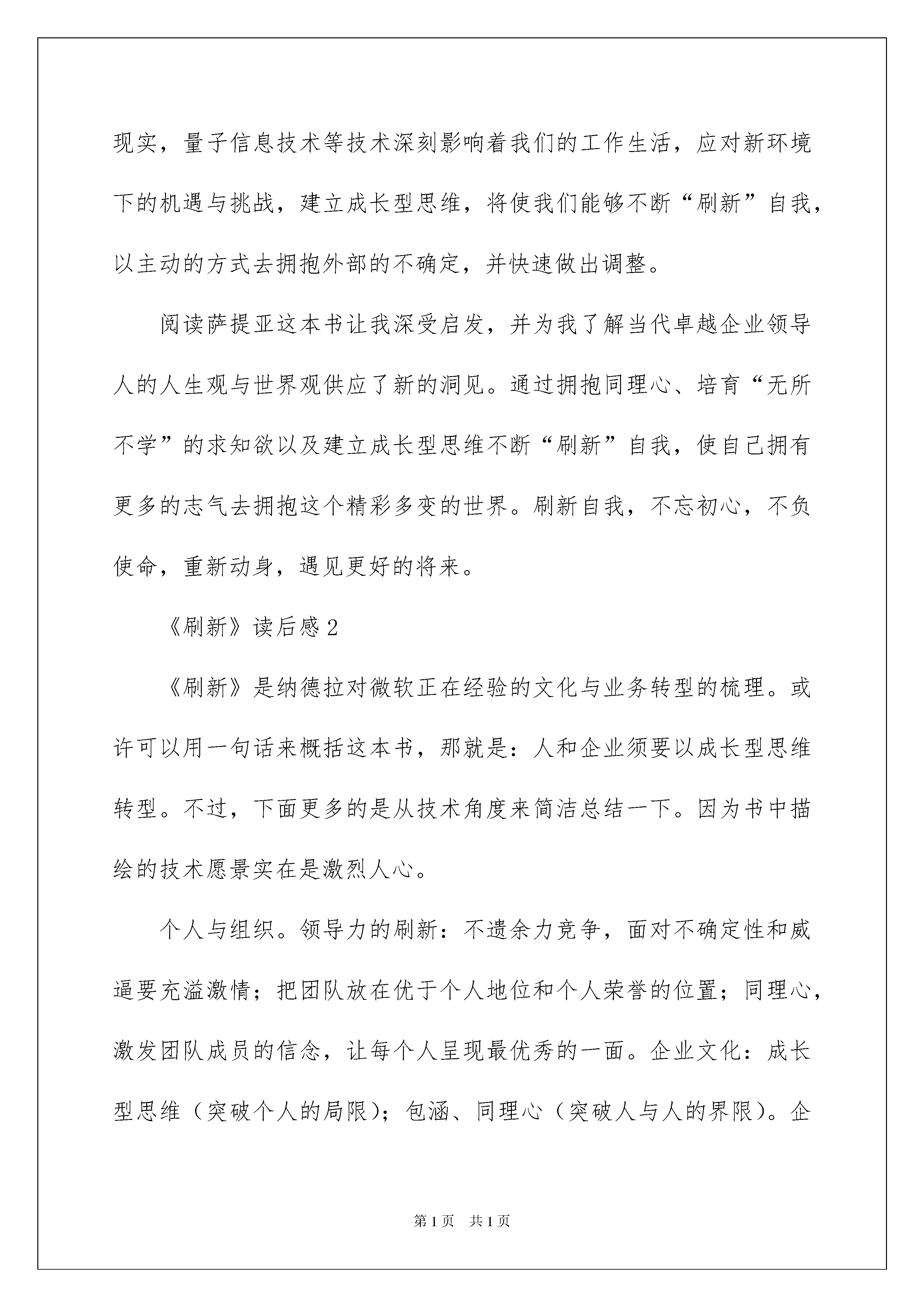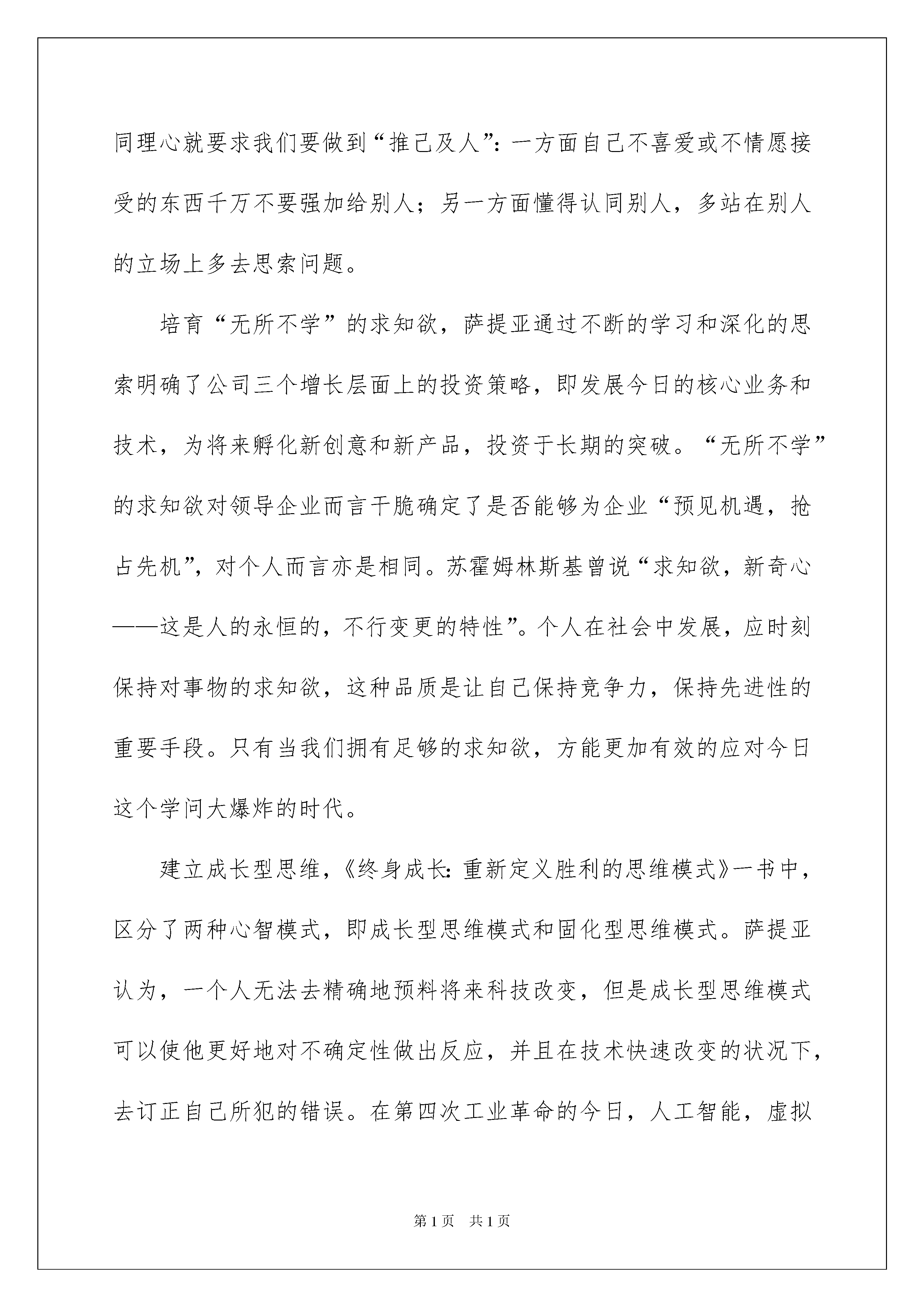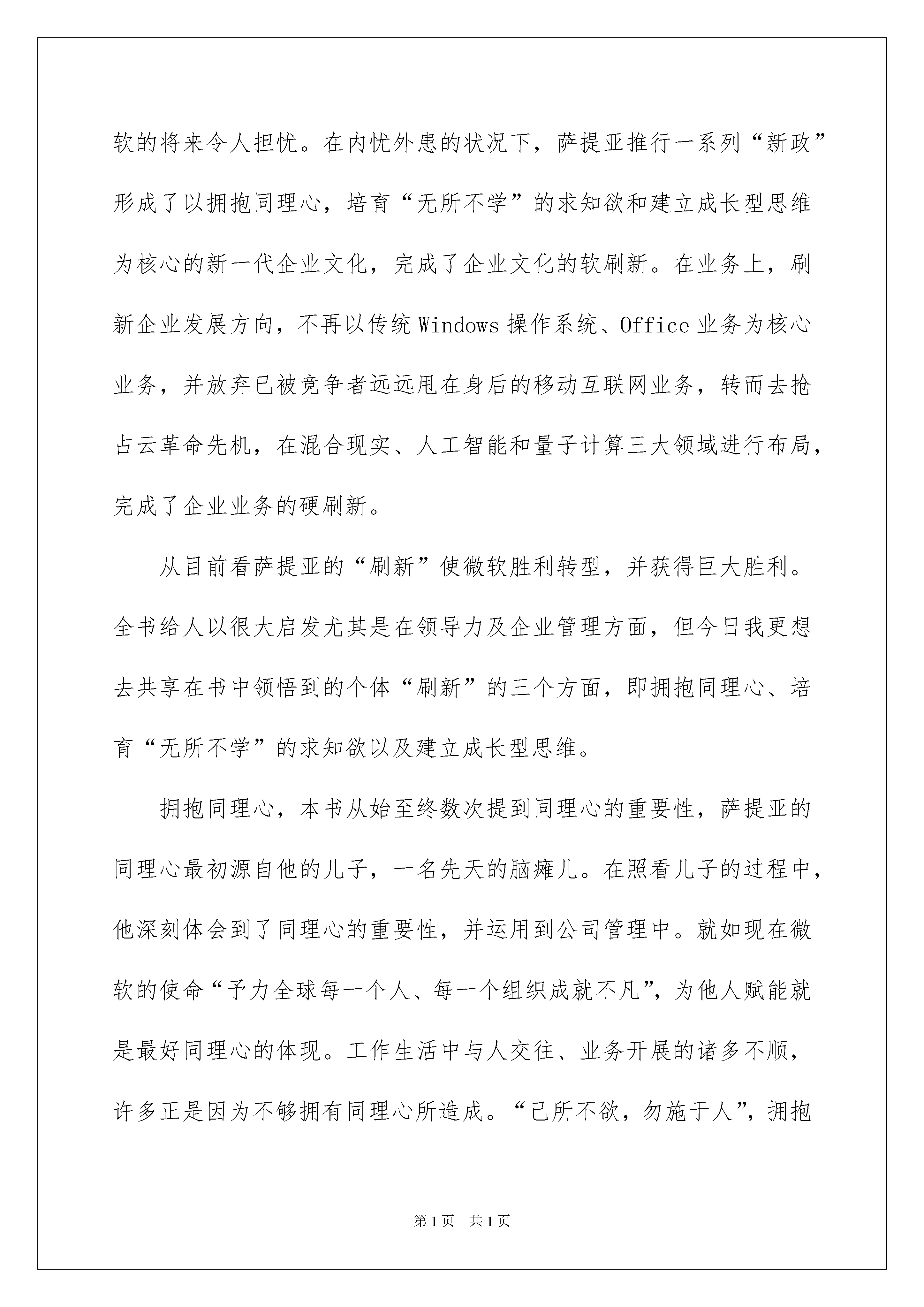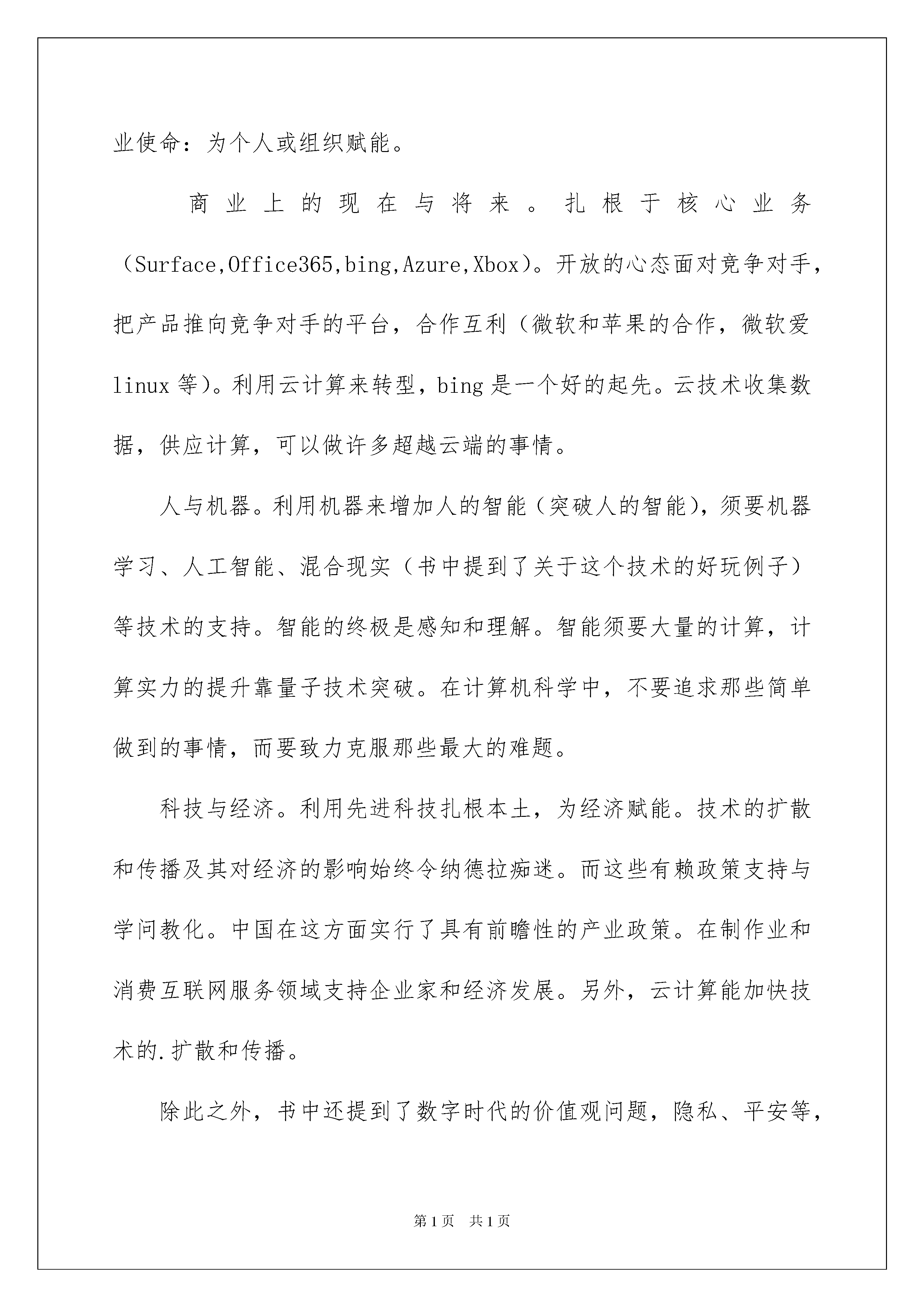 2022《刷新》读后感《刷新》读后感范文当阅读完一本名著后,大家心中肯定有不少感悟,须要写一篇读后感好好地作记录了。那么我们如何去写读后感呢?下面是我为大家整理的《刷新》读后感,欢迎大家借鉴与参考,希望对大家有所帮助。《刷新》读后感1《墨子》中有言“甘瓜苦蒂,天下物无全美”。天下没有完备的人和事物,每一个人和事物都有缺陷,因此不断刷新自我就尤为重要。《刷新》一书由微软第三任CEO萨提亚·纳德拉所著,全书主要阐述了20xx年其任CEO以来带领微软所进行的变革之路,并简要回顾了其青年时的求学历程以及家庭生活。在20xx年萨提亚上任之前,由于微软执着于以Windows操作系统和Office业务为主打业务的中心思想,错失了在搜寻引擎、社交网络、移动互联网领域内的多重创新机会,因此快速在相关领域落后于谷歌、苹果、亚马逊等竞争对手,再加上企业内部长期各自为政的形势,微软的将来令人担忧。在内忧外患的状况下,萨提亚推行一系列“新政”形成了以拥抱同理心,培育“无所不学”的求知欲和建立成长型思维为核心的新一代企业文化,完成了企业文化的软刷新。在业务上,刷新企业发展方向,不再以传统Windows操作系统、Office业务为核心业务,并放弃已被竞争者远远甩在身后的移动互联网业务,转而去抢占云革命先机,在混合现实、人工智能和量子计算三大领域进行布局,完成了企业业务的硬刷新。从目前看萨提亚的“刷新”使微软胜利转型,并获得巨大胜利。全书给人以很大启发尤其是在领导力及企业管理方面,但今日我更想去共享在书中领悟到的个体“刷新”的三个方面,即拥抱同理心、培育“无所不学”的求知欲以及建立成长型思维。拥抱同理心,本书从始至终数次提到同理心的重要性,萨提亚的同理心最初源自他的儿子,一名先天的脑瘫儿。在照看儿子的过程中,他深刻体会到了同理心的重要性,并运用到公司管理中。就如现在微软的使命“予力全球每一个人、每一个组织成就不凡”,为他人赋能就是最好同理心的体现。工作生活中与人交往、业务开展的诸多不顺,许多正是因为不够拥有同理心所造成。“己所不欲,勿施于人”,拥抱同理心就要求我们要做到“推己及人”:一方面自己不喜爱或不情愿接受的东西千万不要强加给别人;另一方面懂得认同别人,多站在别人的立场上多去思索问题。培育“无所不学”的求知欲,萨提亚通过不断的学习和深化的思索明确了公司三个增长层面上的投资策略,即发展今日的核心业务和技术,为将来孵化新创意和新产品,投资于长期的突破。“无所不学”的求知欲对领导企业而言干脆确定了是否能够为企业“预见机遇,抢占先机”,对个人而言亦是相同。苏霍姆林斯基曾说“求知欲,新奇心——这是人的永恒的,不行变更的特性”。个人在社会中发展,应时刻保持对事物的求知欲,这种品质是让自己保持竞争力,保持先进性的重要手段。只有当我们拥有足够的求知欲,方能更加有效的应对今日这个学问大爆炸的时代。建立成长型思维,《终身成长:重新定义胜利的思维模式》一书中,区分了两种心智模式,即成长型思维模式和固化型思维模式。萨提亚认为,一个人无法去精确地预料将来科技改变,但是成长型思维模式可以使他更好地对不确定性做出反应,并且在技术快速改变的状况下,去订正自己所犯的错误。在第四次工业革命的今日,人工智能,虚拟现实,量子信息技术等技术深刻影响着我们的工作生活,应对新环境下的机遇与挑战,建立成长型思维,将使我们能够不断“刷新”自我,以主动的方式去拥抱外部的不确定,并快速做出调整。阅读萨提亚这本书让我深受启发,并为我了解当代卓越企业领导人的人生观与世界观供应了新的洞见。通过拥抱同理心、培育“无所不学”的求知欲以及建立成长型思维不断“刷新”自我,使自己拥有更多的志气去拥抱这个精彩多变的世界。刷新自我,不忘初心,不负使命,重新动身,遇见更好的将来。《刷新》读后感2《刷新》是纳德拉对微软正在经验的文化与业务转型的梳理。或许可以用一句话来概括这本书,那就是:人和企业须要以成长型思维转型。不过,下面更多的是从技术角度来简洁总结一下。因为书中描绘的技术愿景实在是激烈人心。个人与组织。领导力的刷新:不遗余力竞争,面对不确定性和威逼要充溢激情;把团队放在优于个人地位和个人荣誉的位置;同理心,激发团队成员的信念,让每个人呈现最优秀的一面。企业文化:成长型思维(突破个人的局限);包涵、同理心(突破人与人的界限)。企业使命:为个人或组织赋能。商业上的现在与将来。扎根于核心业务(Surface,Office365,bing,Azure,Xbox)。开放的心态面对竞争对手,把产品推向竞争对手的平台,合作互利(微软和苹果的合作,微软爱linux等)。利用云计算来转型