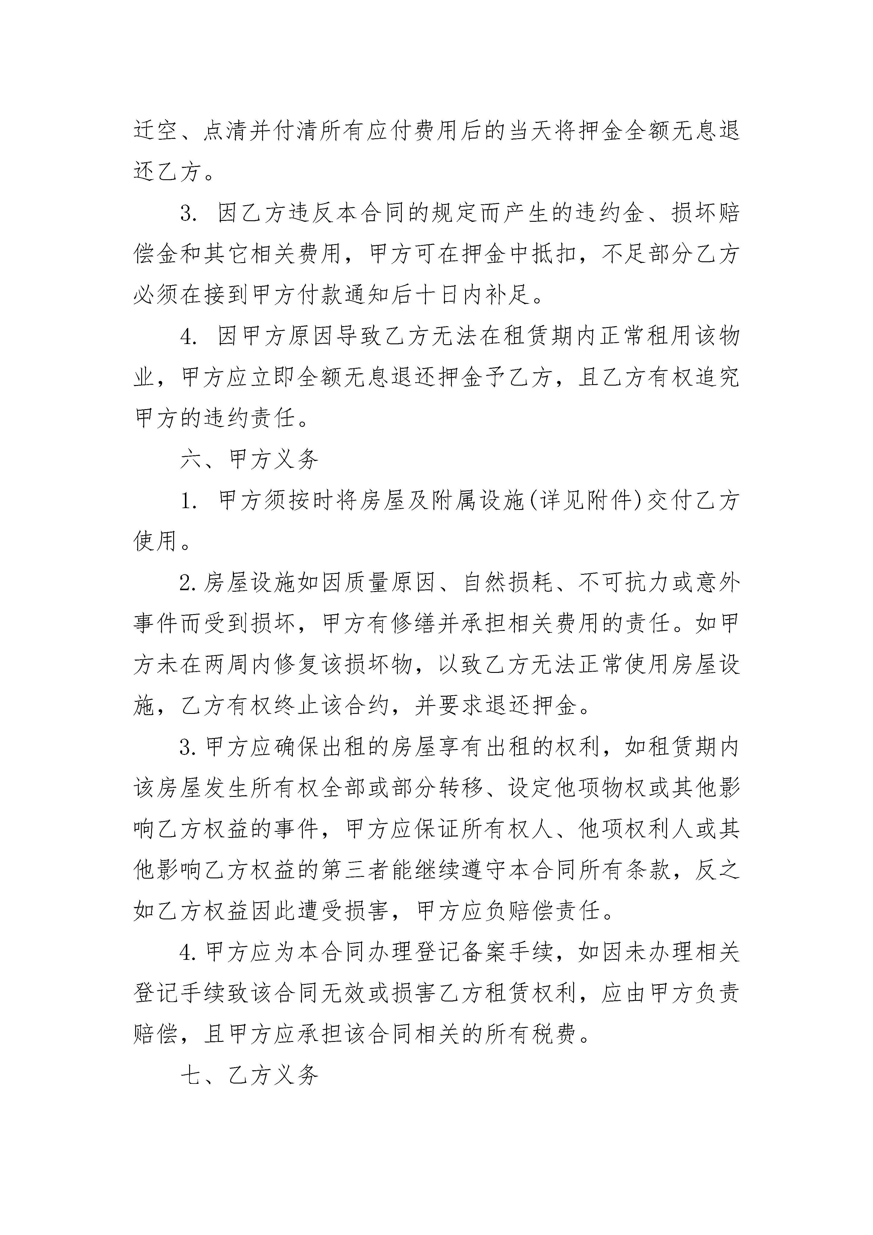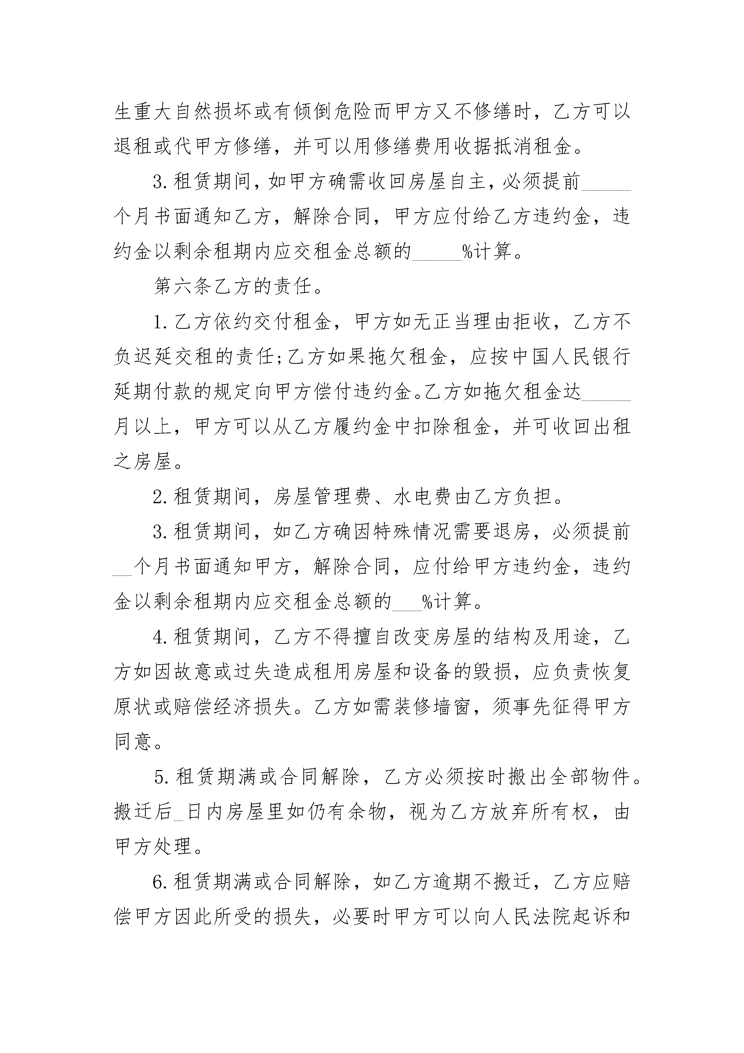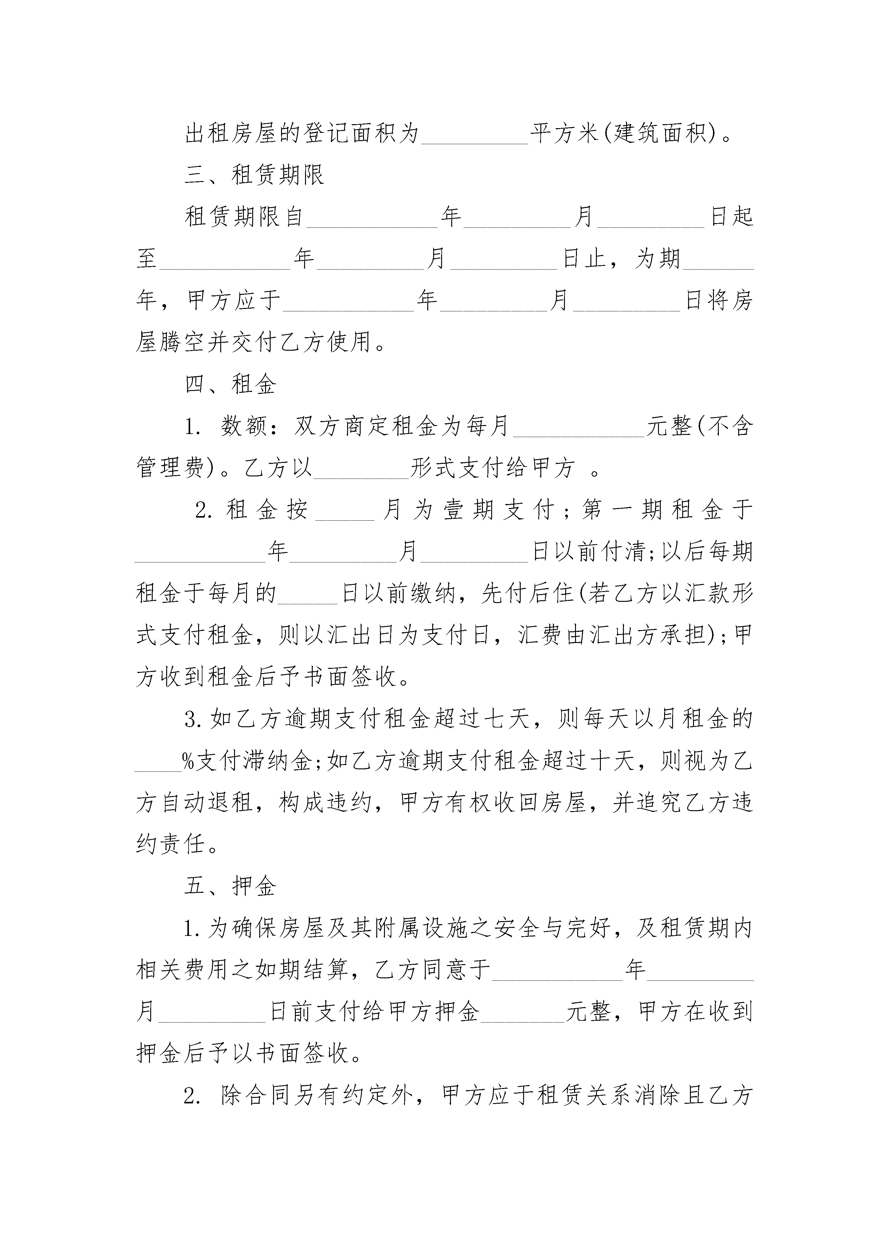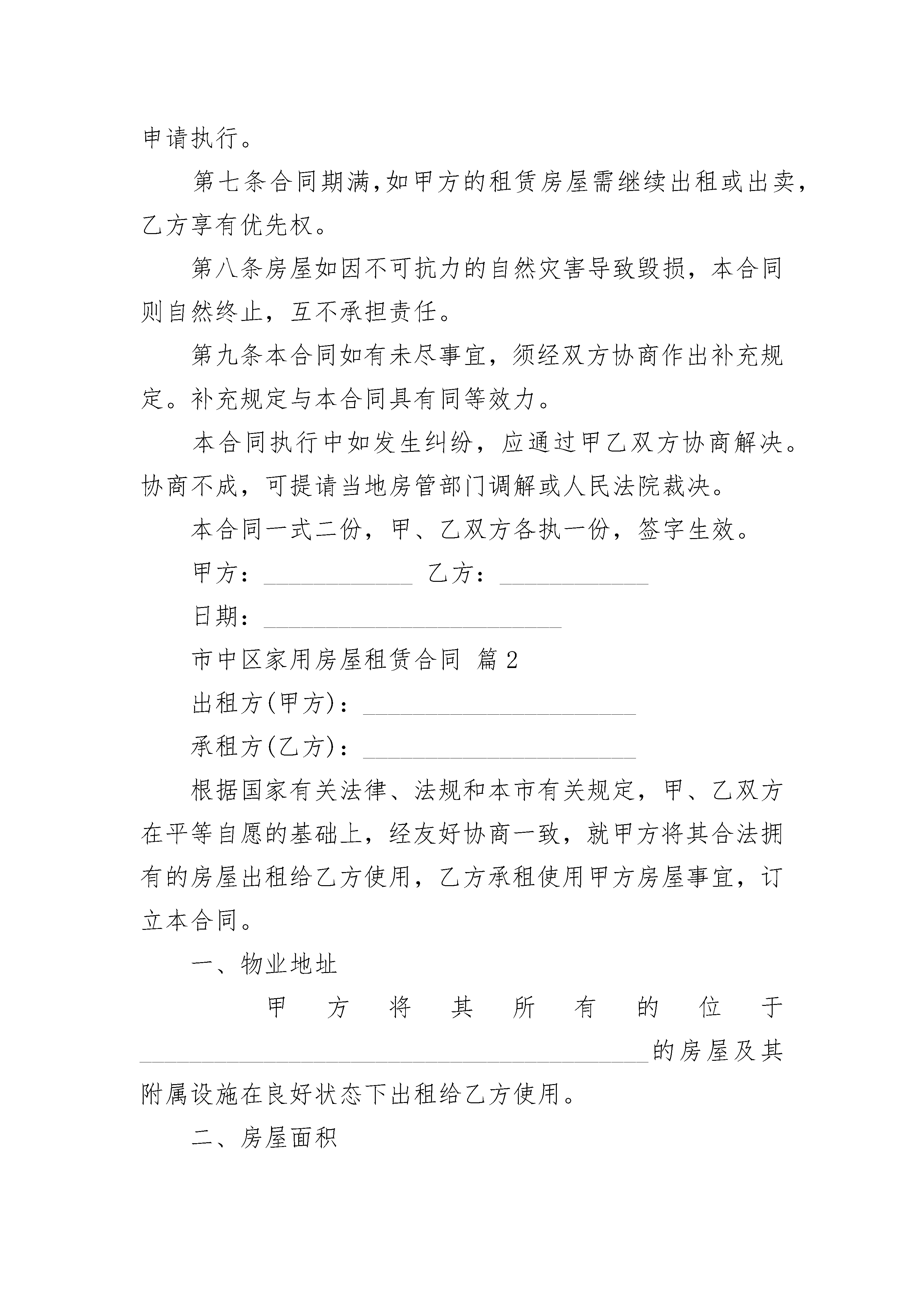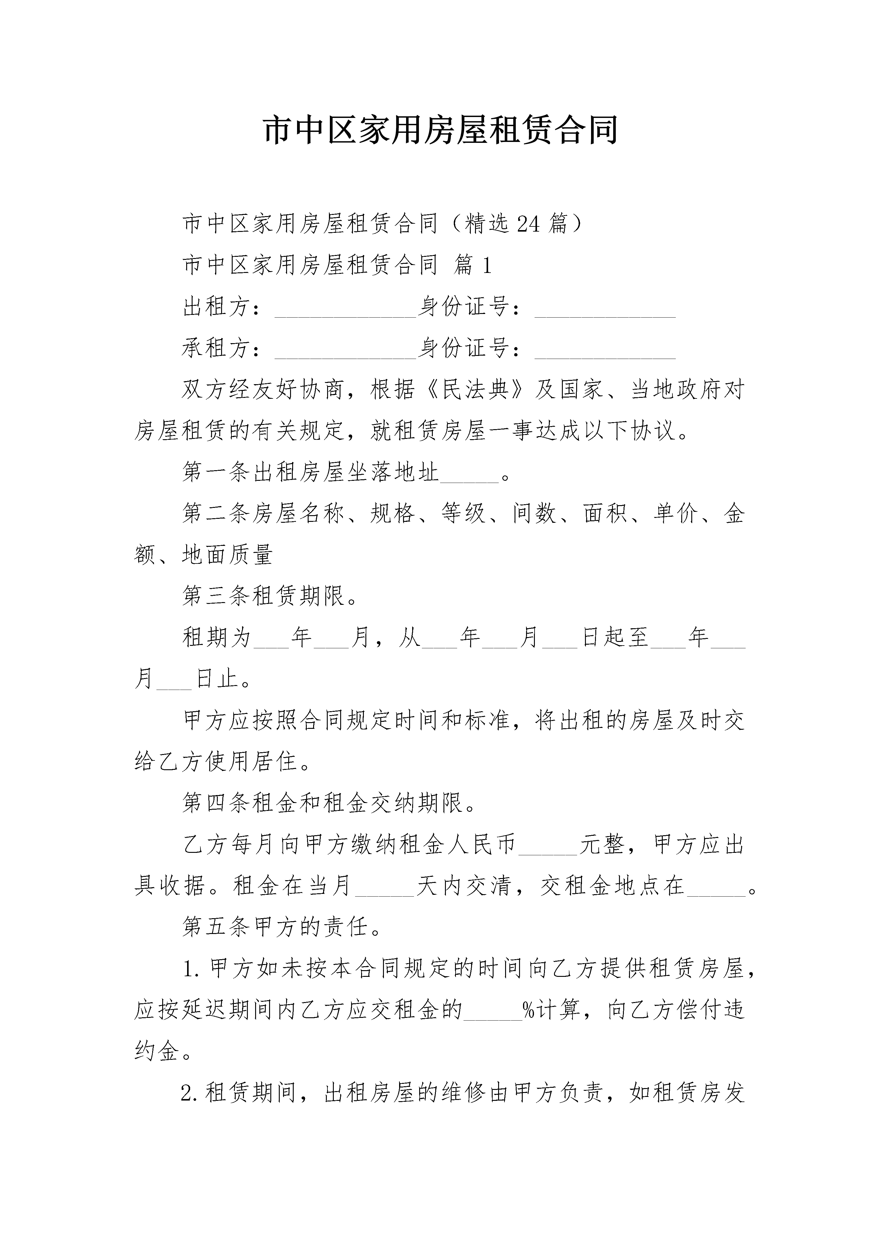 市中区家用房屋租赁合同市中区家用房屋租赁合同(精选24篇)市中区家用房屋租赁合同篇1出租方:____________身份证号:____________承租方:____________身份证号:____________双方经友好协商,根据《民法典》及国家、当地政府对房屋租赁的有关规定,就租赁房屋一事达成以下协议。第一条出租房屋坐落地址_____。第二条房屋名称、规格、等级、间数、面积、单价、金额、地面质量第三条租赁期限。租期为___年___月,从___年___月___日起至___年___月___日止。甲方应按照合同规定时间和标准,将出租的房屋及时交给乙方使用居住。第四条租金和租金交纳期限。乙方每月向甲方缴纳租金人民币_____元整,甲方应出具收据。租金在当月_____天内交清,交租金地点在_____。第五条甲方的责任。1.甲方如未按本合同规定的时间向乙方提供租赁房屋,应按延迟期间内乙方应交租金的_____%计算,向乙方偿付违约金。2.租赁期间,出租房屋的维修由甲方负责,如租赁房发生重大自然损坏或有倾倒危险而甲方又不修缮时,乙方可以退租或代甲方修缮,并可以用修缮费用收据抵消租金。3.租赁期间,如甲方确需收回房屋自主,必须提前_____个月书面通知乙方,解除合同,甲方应付给乙方违约金,违约金以剩余租期内应交租金总额的_____%计算。第六条乙方的责任。1.乙方依约交付租金,甲方如无正当理由拒收,乙方不负迟延交租的责任;乙方如果拖欠租金,应按中国人民银行延期付款的规定向甲方偿付违约金。乙方如拖欠租金达_____月以上,甲方可以从乙方履约金中扣除租金,并可收回出租之房屋。2.租赁期间,房屋管理费、水电费由乙方负担。3.租赁期间,如乙方确因特殊情况需要退房,必须提前__个月书面通知甲方,解除合同,应付给甲方违约金,违约金以剩余租期内应交租金总额的___%计算。4.租赁期间,乙方不得擅自改变房屋的结构及用途,乙方如因故意或过失造成租用房屋和设备的毁损,应负责恢复原状或赔偿经济损失。乙方如需装修墙窗,须事先征得甲方同意。5.租赁期满或合同解除,乙方必须按时搬出全部物件。搬迁后_日内房屋里如仍有余物,视为乙方放弃所有权,由甲方处理。6.租赁期满或合同解除,如乙方逾期不搬迁,乙方应赔偿甲方因此所受的损失,必要时甲方可以向人民法院起诉和申请执行。第七条合同期满,如甲方的租赁房屋需继续出租或出卖,乙方享有优先权。第八条房屋如因不可抗力的自然灾害导致毁损,本合同则自然终止,互不承担责任。第九条本合同如有未尽事宜,须经双方协商作出补充规定。补充规定与本合同具有同等效力。本合同执行中如发生纠纷,应通过甲乙双方协商解决。协商不成,可提请当地房管部门调解或人民法院裁决。本合同一式二份,甲、乙双方各执一份,签字生效。甲方:____________乙方:____________日期:________________________市中区家用房屋租赁合同篇2出租方(甲方):______________________承租方(乙方):______________________根据国家有关法律、法规和本市有关规定,甲、乙双方在平等自愿的基础上,经友好协商一致,就甲方将其合法拥有的房屋出租给乙方使用,乙方承租使用甲方房屋事宜,订立本合同。一、物业地址甲方将其所有的位于_________________________________________的房屋及其附属设施在良好状态下出租给乙方使用。二、房屋面积出租房屋的登记面积为_________平方米(建筑面积)。三、租赁期限租赁期限自___________年_________月_________日起至___________年_________月_________日止,为期______年,甲方应于___________年_________月_________日将房屋腾空并交付乙方使用。四、租金1.数额:双方商定租金为每月___________元整(不含管理费)。乙方以________形式支付给甲方。2.租金按_____月为壹期支付;第一期租金于___________年_________月_________日以前付清;以后每期租金于每月的_____日以前缴纳,先付后住(若乙方以汇款形式支付租金,则以汇出日为支付日,汇费由汇出方承担);甲方收到租金后予书面签收。3.如乙方逾期支付租金超过七天,则每天以月租金的____%支付滞纳金;如乙方逾期支付租金超过十天,则视为乙方自动退租,构成违约,甲方有权收回房屋,并追究乙方违约责任。五、押金1.为确保房屋及其附属设施之安全与完好,及租赁期内相关费用之如期结算,乙方同意于___________年_________月_________日前支付给甲方押金_______元整,甲方在收到押金
