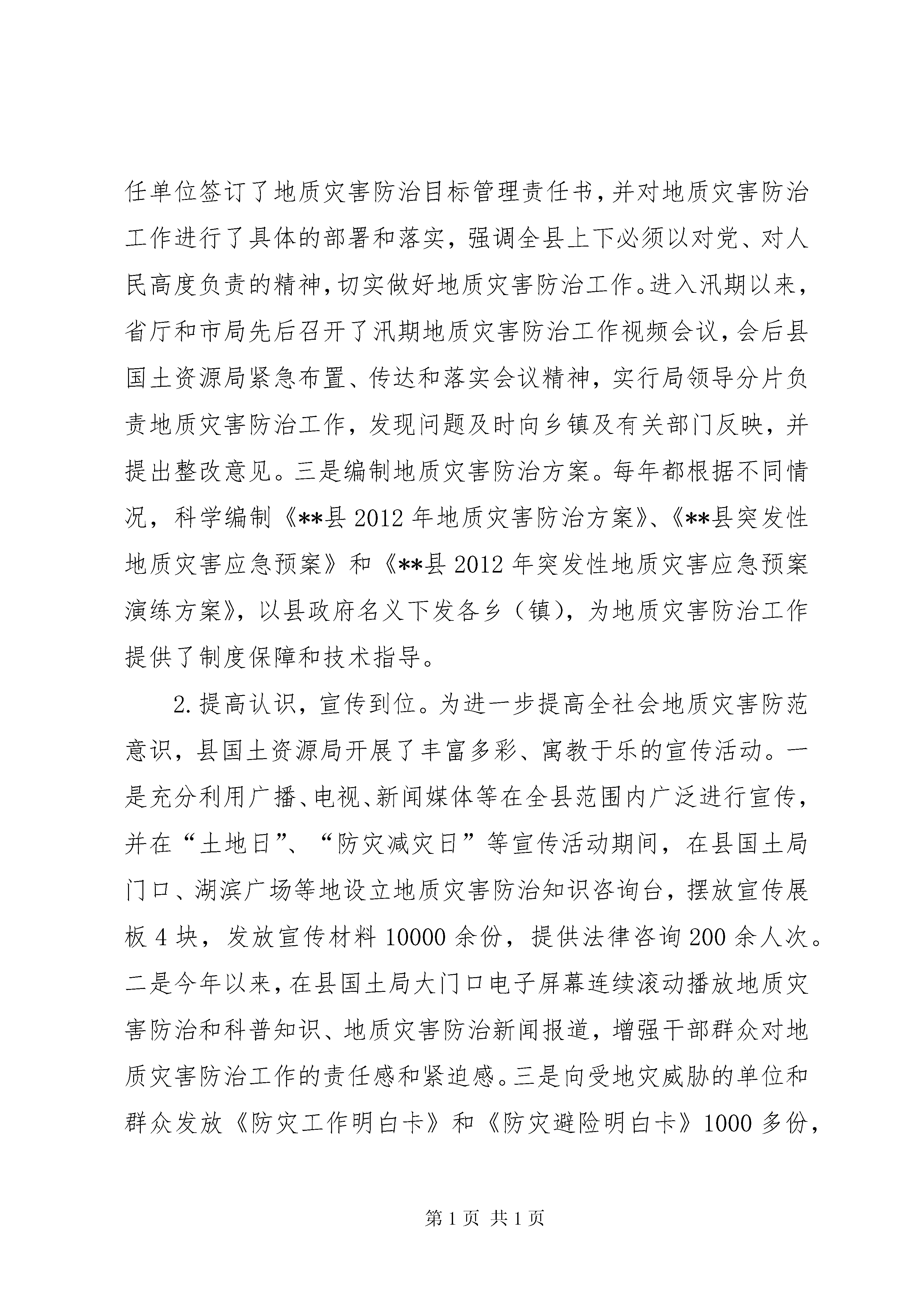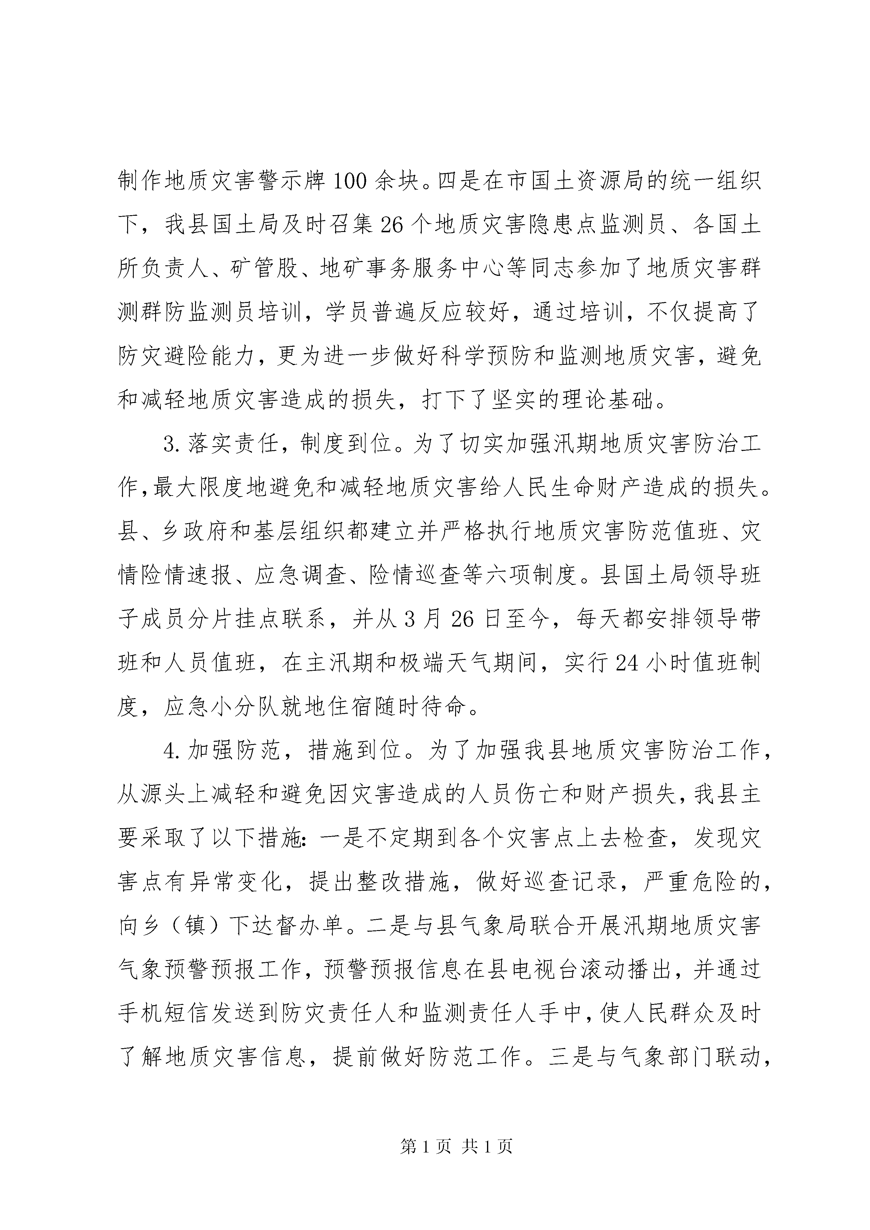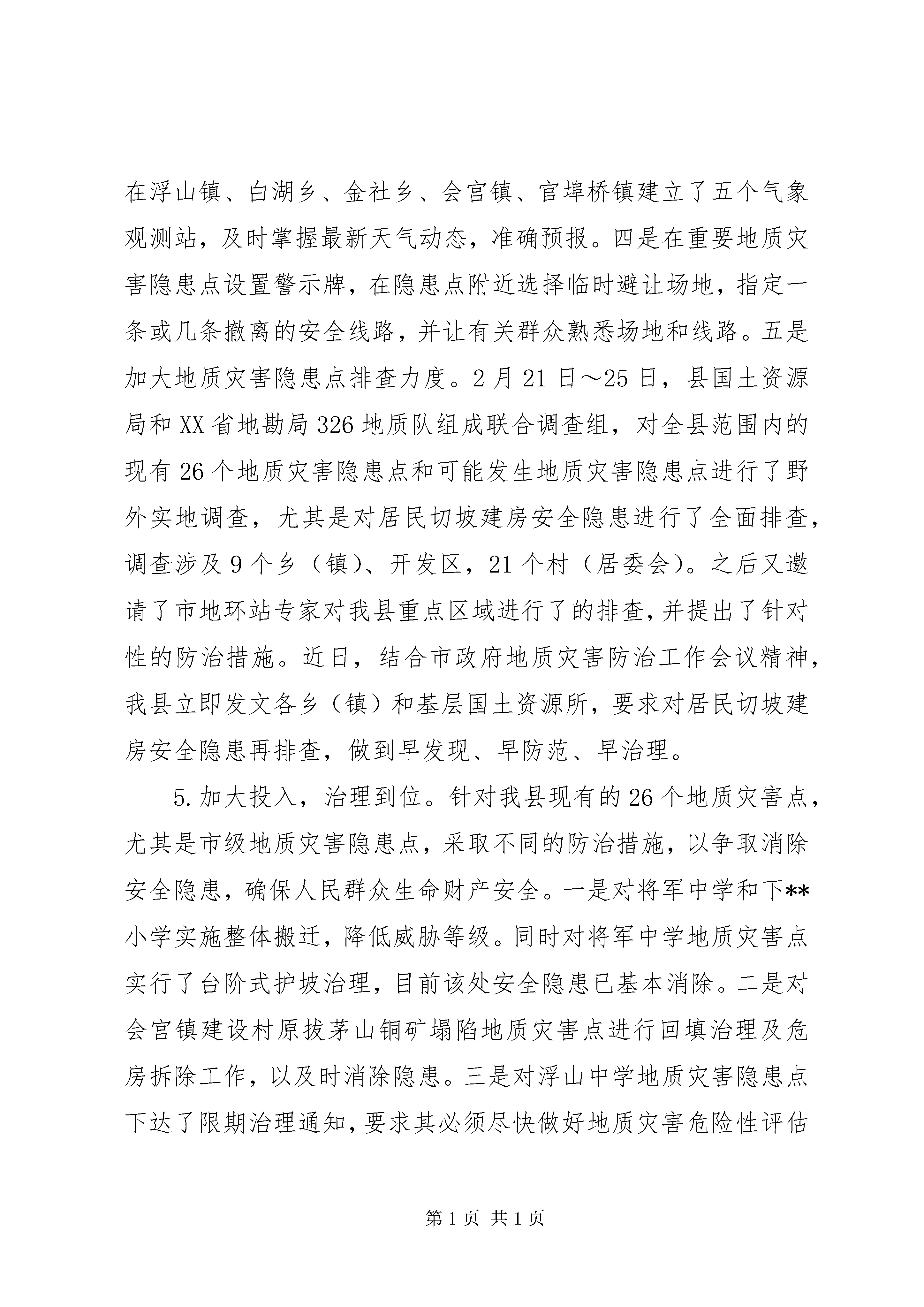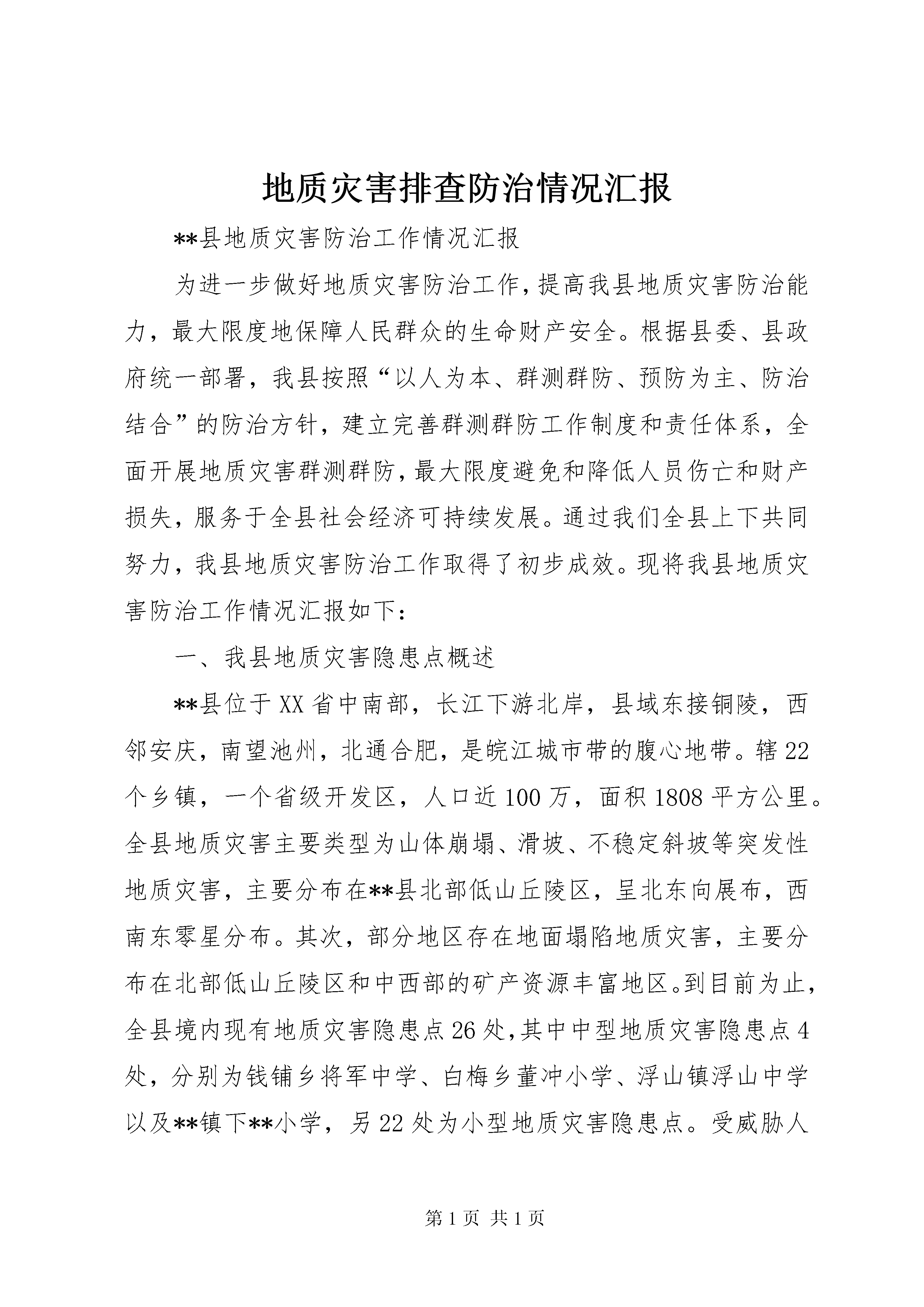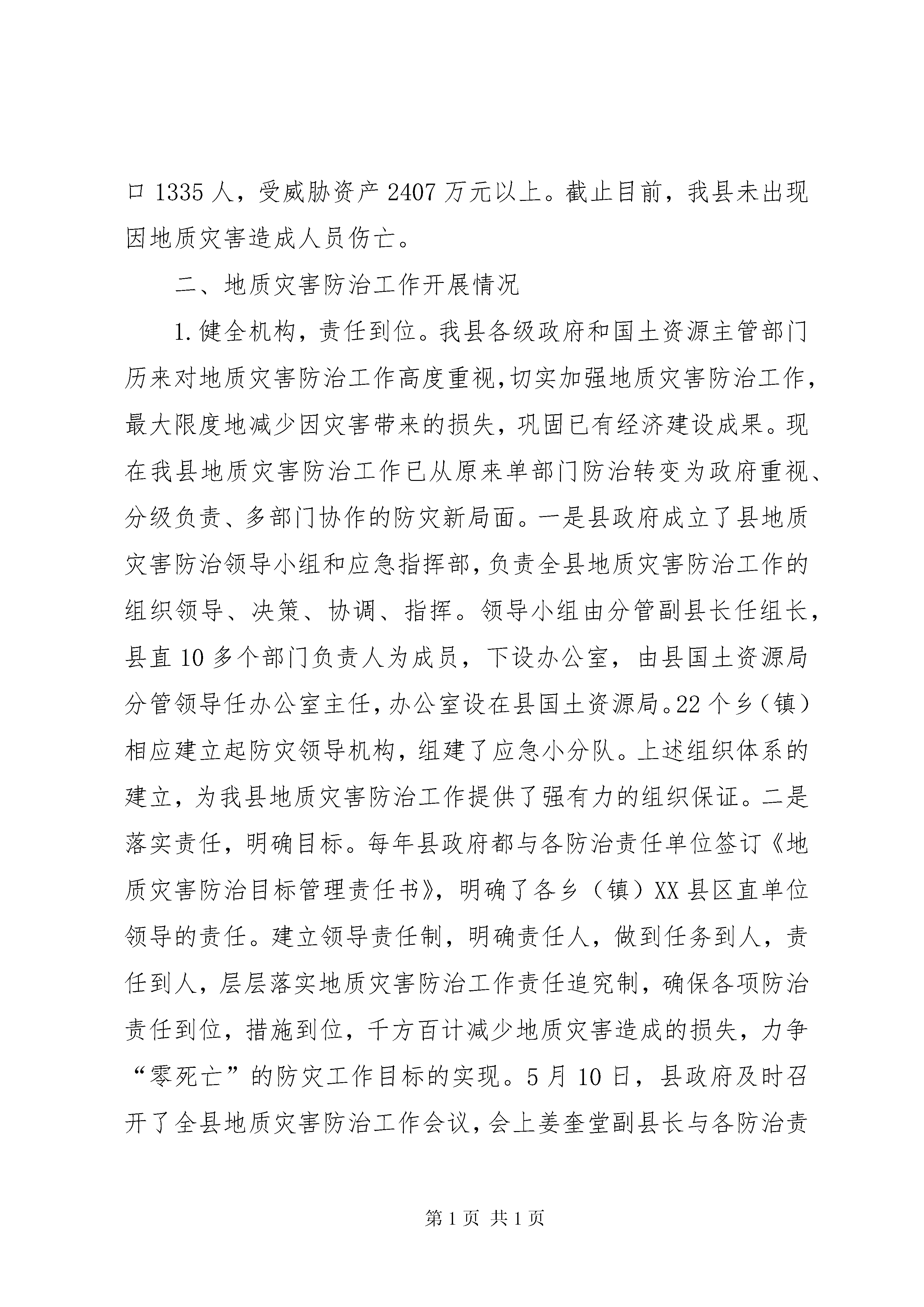 地质灾害排查防治情况汇报**县地质灾害防治工作情况汇报为进一步做好地质灾害防治工作,提高我县地质灾害防治能力,最大限度地保障人民群众的生命财产安全。根据县委、县政府统一部署,我县按照“以人为本、群测群防、预防为主、防治结合”的防治方针,建立完善群测群防工作制度和责任体系,全面开展地质灾害群测群防,最大限度避免和降低人员伤亡和财产损失,服务于全县社会经济可持续发展。通过我们全县上下共同努力,我县地质灾害防治工作取得了初步成效。现将我县地质灾害防治工作情况汇报如下:一、我县地质灾害隐患点概述**县位于XX省中南部,长江下游北岸,县域东接铜陵,西邻安庆,南望池州,北通合肥,是皖江城市带的腹心地带。辖22个乡镇,一个省级开发区,人口近100万,面积1808平方公里。全县地质灾害主要类型为山体崩塌、滑坡、不稳定斜坡等突发性地质灾害,主要分布在**县北部低山丘陵区,呈北东向展布,西南东零星分布。其次,部分地区存在地面塌陷地质灾害,主要分布在北部低山丘陵区和中西部的矿产资源丰富地区。到目前为止,全县境内现有地质灾害隐患点26处,其中中型地质灾害隐患点4处,分别为钱铺乡将军中学、白梅乡董冲小学、浮山镇浮山中学以及**镇下**小学,另22处为小型地质灾害隐患点。受威胁人口1335人,受威胁资产2407万元以上。截止目前,我县未出现因地质灾害造成人员伤亡。二、地质灾害防治工作开展情况1.健全机构,责任到位。我县各级政府和国土资源主管部门历来对地质灾害防治工作高度重视,切实加强地质灾害防治工作,最大限度地减少因灾害带来的损失,巩固已有经济建设成果。现在我县地质灾害防治工作已从原来单部门防治转变为政府重视、分级负责、多部门协作的防灾新局面。一是县政府成立了县地质灾害防治领导小组和应急指挥部,负责全县地质灾害防治工作的组织领导、决策、协调、指挥。领导小组由分管副县长任组长,县直10多个部门负责人为成员,下设办公室,由县国土资源局分管领导任办公室主任,办公室设在县国土资源局。22个乡(镇)相应建立起防灾领导机构,组建了应急小分队。上述组织体系的建立,为我县地质灾害防治工作提供了强有力的组织保证。二是落实责任,明确目标。每年县政府都与各防治责任单位签订《地质灾害防治目标管理责任书》,明确了各乡(镇)XX县区直单位领导的责任。建立领导责任制,明确责任人,做到任务到人,责任到人,层层落实地质灾害防治工作责任追究制,确保各项防治责任到位,措施到位,千方百计减少地质灾害造成的损失,力争“零死亡”的防灾工作目标的实现。5月10日,县政府及时召开了全县地质灾害防治工作会议,会上姜奎堂副县长与各防治责任单位签订了地质灾害防治目标管理责任书,并对地质灾害防治工作进行了具体的部署和落实,强调全县上下必须以对党、对人民高度负责的精神,切实做好地质灾害防治工作。进入汛期以来,省厅和市局先后召开了汛期地质灾害防治工作视频会议,会后县国土资源局紧急布置、传达和落实会议精神,实行局领导分片负责地质灾害防治工作,发现问题及时向乡镇及有关部门反映,并提出整改意见。三是编制地质灾害防治方案。每年都根据不同情况,科学编制《**县2012年地质灾害防治方案》、《**县突发性地质灾害应急预案》和《**县2012年突发性地质灾害应急预案演练方案》,以县政府名义下发各乡(镇),为地质灾害防治工作提供了制度保障和技术指导。2.提高认识,宣传到位。为进一步提高全社会地质灾害防范意识,县国土资源局开展了丰富多彩、寓教于乐的宣传活动。一是充分利用广播、电视、新闻媒体等在全县范围内广泛进行宣传,并在“土地日”、“防灾减灾日”等宣传活动期间,在县国土局门口、湖滨广场等地设立地质灾害防治知识咨询台,摆放宣传展板4块,发放宣传材料10000余份,提供法律咨询200余人次。二是今年以来,在县国土局大门口电子屏幕连续滚动播放地质灾害防治和科普知识、地质灾害防治新闻报道,增强干部群众对地质灾害防治工作的责任感和紧迫感。三是向受地灾威胁的单位和群众发放《防灾工作明白卡》和《防灾避险明白卡》1000多份,制作地质灾害警示牌100余块。四是在市国土资源局的统一组织下,我县国土局及时召集26个地质灾害隐患点监测员、各国土所负责人、矿管股、地矿事务服务中心等同志参加了地质灾害群测群防监测员培训,学员普遍反应较好,通过培训,不仅提高了防灾避险能力,更为进一步做好科学预防和监测地质灾害,避免和减轻地质灾害造成的损失,打下了坚实的理论基础。3.落实责任,制度到位。为了切实加强汛期地质灾害防治工作,最大限度地避免和减轻地质灾害给人民生命财产造成的损失。县、乡政府和基层组织都建立并严格执行地质灾害防范值班、灾情险情速报、应急调查、险情巡查等六项制度。县国土局领导班子成员分片挂点联系,并从3月26日至今,每天都安排领