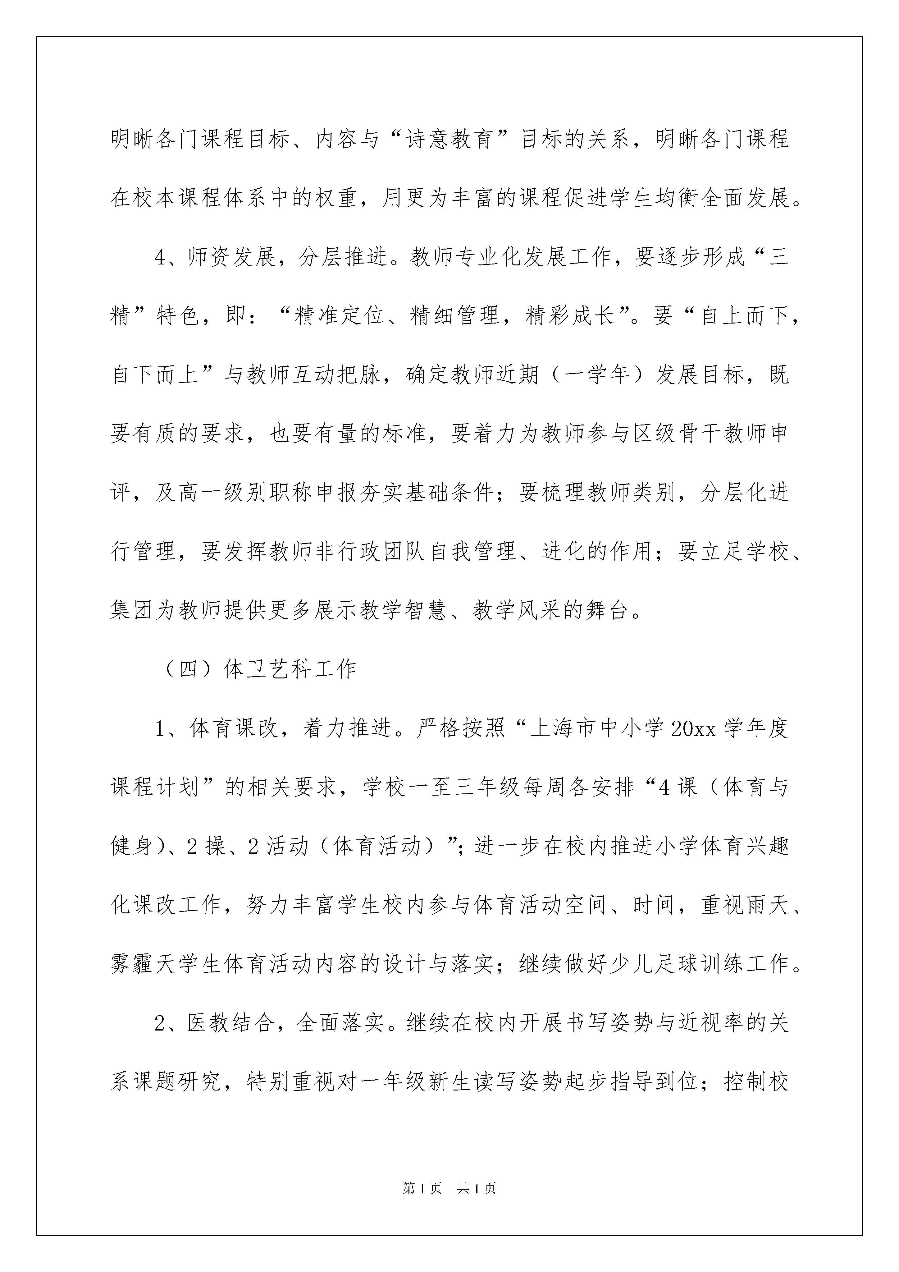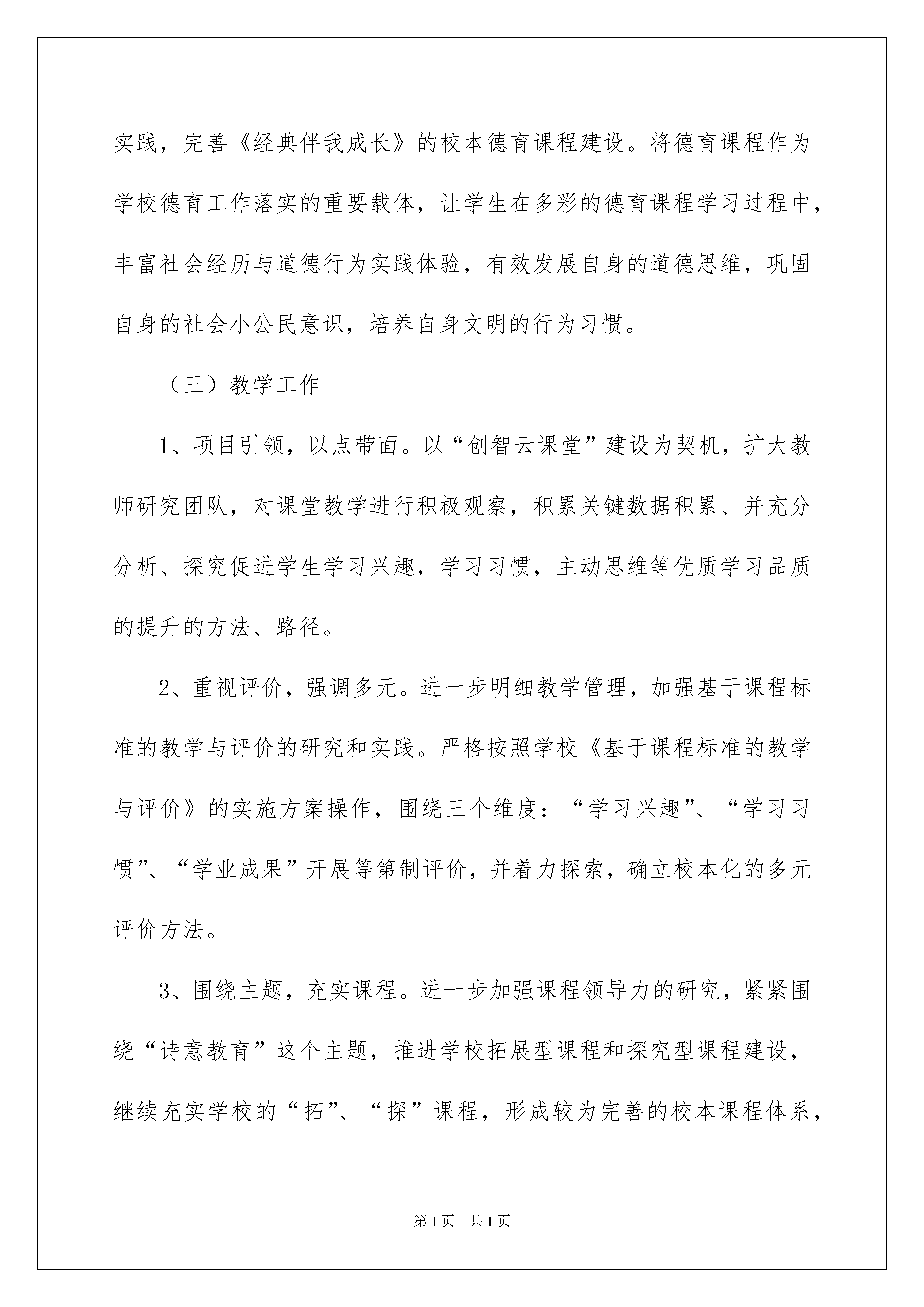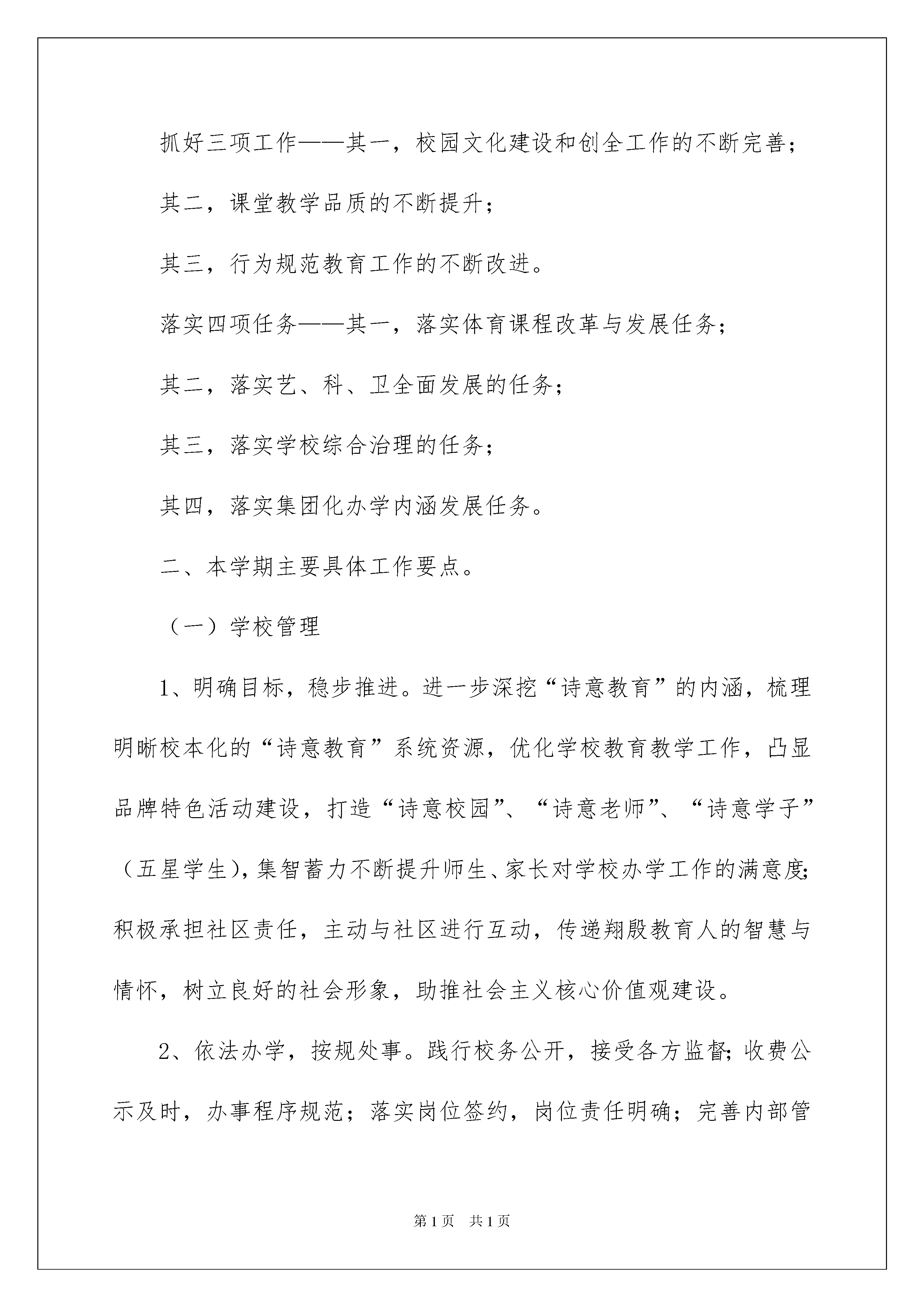 2022关于小学第一学期教学计划范文汇总7篇关于小学第一学期教学计划范文汇总7篇人生天地之间,若白驹过隙,忽然而已,相信大家对即将到来的工作生活满心期待吧!现在就让我们制定一份计划,好好地规划一下吧。好的计划都具备一些什么特点呢?以下是我帮大家整理的小学第一学期教学计划7篇,欢迎阅读与收藏。小学第一学期教学计划篇1本学期,学校工作紧紧围绕十届区委六次全会主要精神,履行区教育局下半年工作要点,结合学校教育教学实际,深入推进教育改革和发展“十三五”规划,助力深化教育综合改革和第三轮上海市基础教育创新试验区建设,蓄力提升学校办学品位、育人品质,打造学校特色品牌,办好让人民满意的教育。一、本学期的主要目标:明确一个主题——“诗意教育”的三年规划稳步实施。推进两个项目——其一,教师专业发展项目的推进;其二,“创智云课堂”项目的推进。抓好三项工作——其一,校园文化建设和创全工作的不断完善;其二,课堂教学品质的不断提升;其三,行为规范教育工作的不断改进。落实四项任务——其一,落实体育课程改革与发展任务;其二,落实艺、科、卫全面发展的任务;其三,落实学校综合治理的任务;其四,落实集团化办学内涵发展任务。二、本学期主要具体工作要点。(一)学校管理1、明确目标,稳步推进。进一步深挖“诗意教育”的内涵,梳理明晰校本化的“诗意教育”系统资源,优化学校教育教学工作,凸显品牌特色活动建设,打造“诗意校园”、“诗意老师”、“诗意学子”(五星学生),集智蓄力不断提升师生、家长对学校办学工作的满意度;积极承担社区责任,主动与社区进行互动,传递翔殷教育人的智慧与情怀,树立良好的社会形象,助推社会主义核心价值观建设。2、依法办学,按规处事。践行校务公开,接受各方监督;收费公示及时,办事程序规范;落实岗位签约,岗位责任明确;完善内部管理制度,校内处事有章可循;努力建设好校风、行风、政风,推进学校的精神文明建设。3、重视安全,强化保障。定人定期进行校园安全自查,加强学校保安人员安全意识的培训,充分发挥学校技防设施作用;进一步改善校园门户网站和局域网建设,确保网络信息安全;抓实校内各项安全制度,使学校安全时时有人管,事事有人管,建设好一所让家长放心,让师生安心的“平安校园”。(二)德育工作1、结合“创全”,凸显特色。积极参与全国文明校园创建,紧密结合区的“创全”工作,学校要利用不同形式、各种渠道大力宣传社会主义核心价值观。进一步学习推进《中小学德育工作指南》,加强中华优秀传统文化教育,围绕“诗意教育”开展学校主题教育系列活动。2、夯实队伍,提炼经验。推进德育教师队伍建设,开展“如何做一名诗意教师”师德论坛活动;积累学校“诗意教师”案例,提炼德育工作经验。3、完善载体,丰富体验。重视加强校本行为规范课程、心理健康课程、博物馆课程的建设,继续依托全国德育教育“一体化”探索和实践,完善《经典伴我成长》的校本德育课程建设。将德育课程作为学校德育工作落实的重要载体,让学生在多彩的德育课程学习过程中,丰富社会经历与道德行为实践体验,有效发展自身的道德思维,巩固自身的社会小公民意识,培养自身文明的行为习惯。(三)教学工作1、项目引领,以点带面。以“创智云课堂”建设为契机,扩大教师研究团队,对课堂教学进行积极观察,积累关键数据积累、并充分分析、探究促进学生学习兴趣,学习习惯,主动思维等优质学习品质的提升的方法、路径。2、重视评价,强调多元。进一步明细教学管理,加强基于课程标准的教学与评价的研究和实践。严格按照学校《基于课程标准的教学与评价》的实施方案操作,围绕三个维度:“学习兴趣”、“学习习惯”、“学业成果”开展等第制评价,并着力探索,确立校本化的多元评价方法。3、围绕主题,充实课程。进一步加强课程领导力的研究,紧紧围绕“诗意教育”这个主题,推进学校拓展型课程和探究型课程建设,继续充实学校的“拓”、“探”课程,形成较为完善的校本课程体系,明晰各门课程目标、内容与“诗意教育”目标的关系,明晰各门课程在校本课程体系中的权重,用更为丰富的课程促进学生均衡全面发展。4、师资发展,分层推进。教师专业化发展工作,要逐步形成“三精”特色,即:“精准定位、精细管理,精彩成长”。要“自上而下,自下而上”与教师互动把脉,确定教师近期(一学年)发展目标,既要有质的要求,也要有量的标准,要着力为教师参与区级骨干教师申评,及高一级别职称申报夯实基础条件;要梳理教师类别,分层化进行管理,要发挥教师非行政团队自我管理、进化的作用;要立足学校、集团为教师提供更多展示教学智慧、教学风采的舞台。(四)体卫艺科工作1、体育课改,着力推进。严格按照“上海市中小学20xx