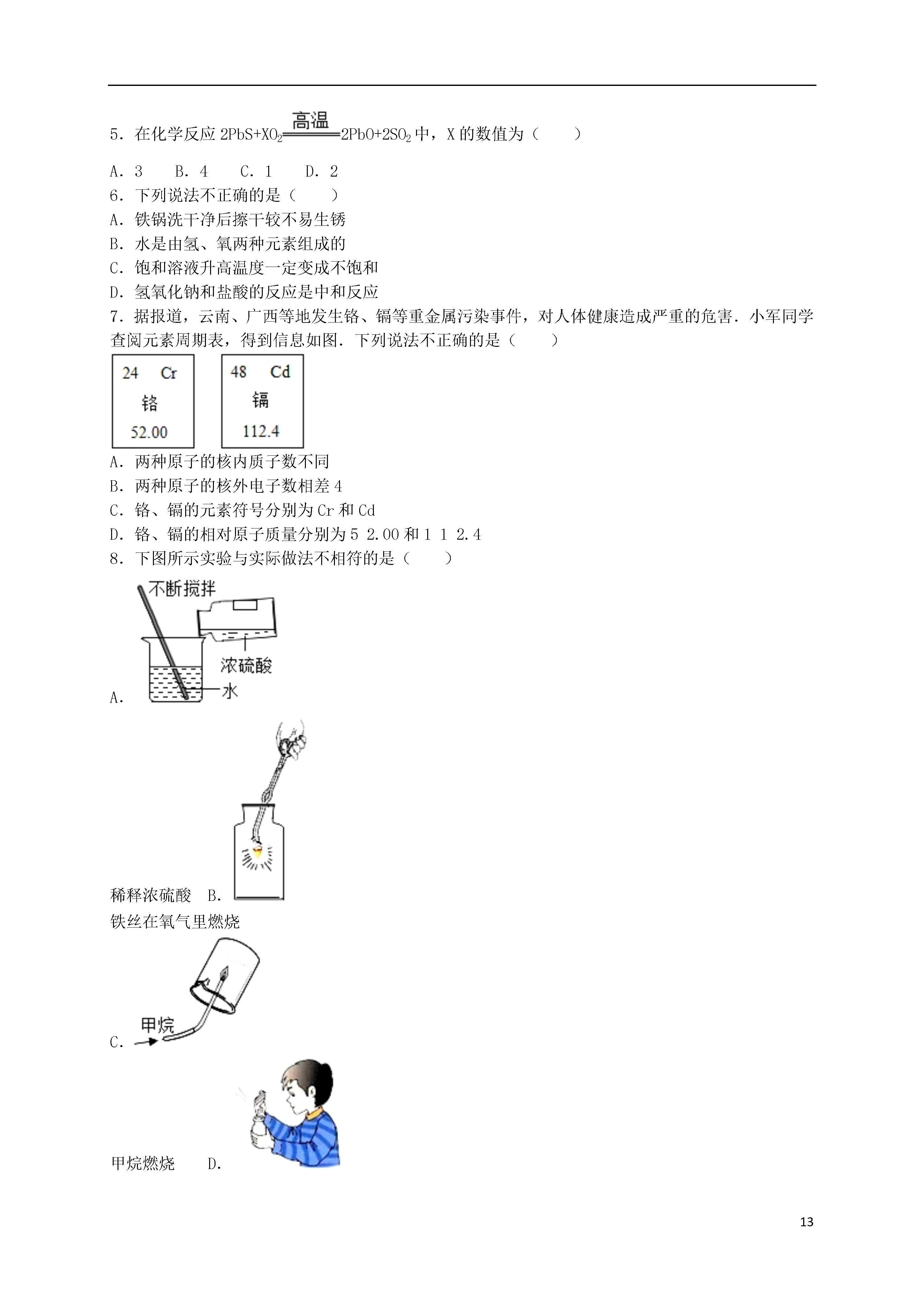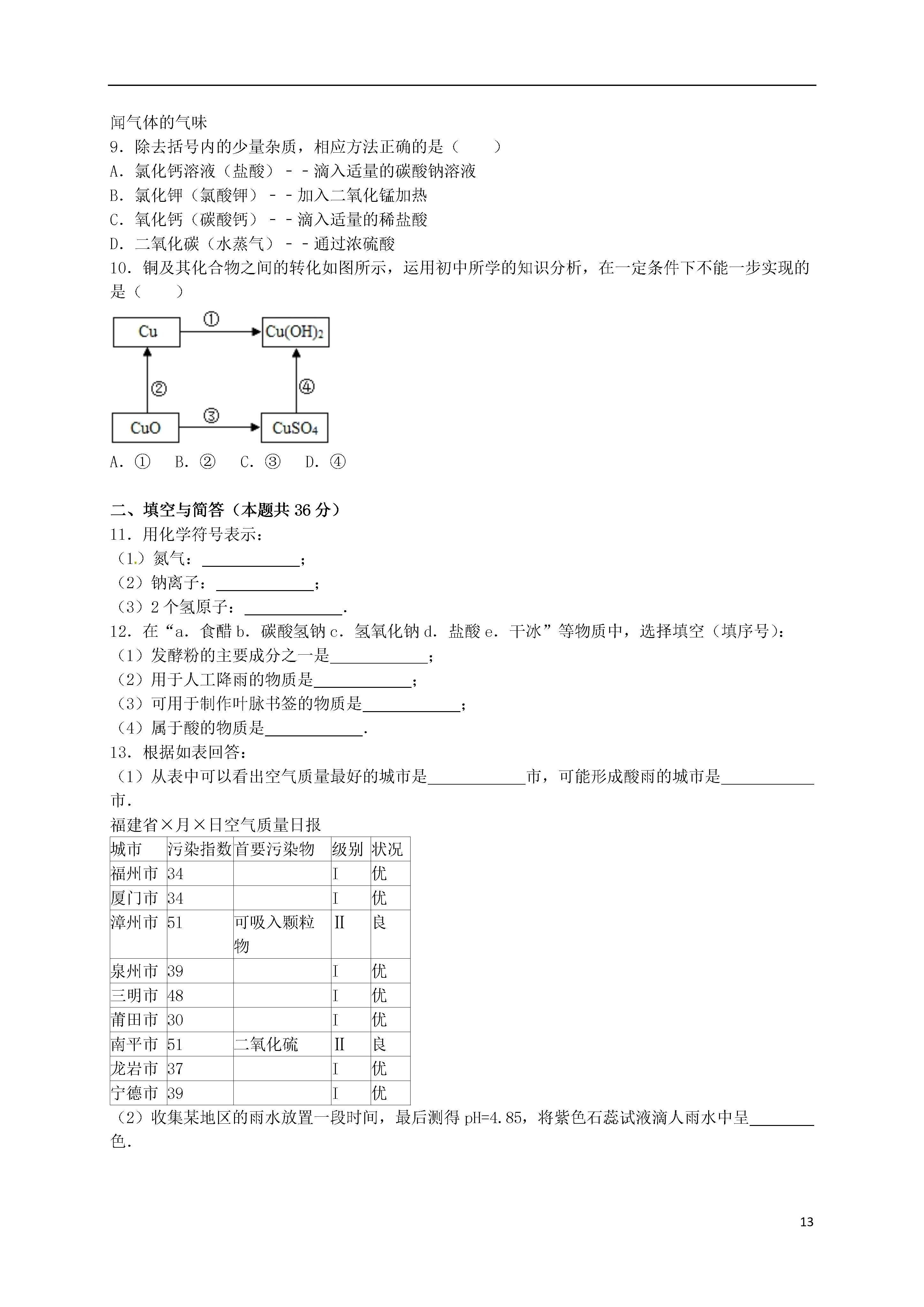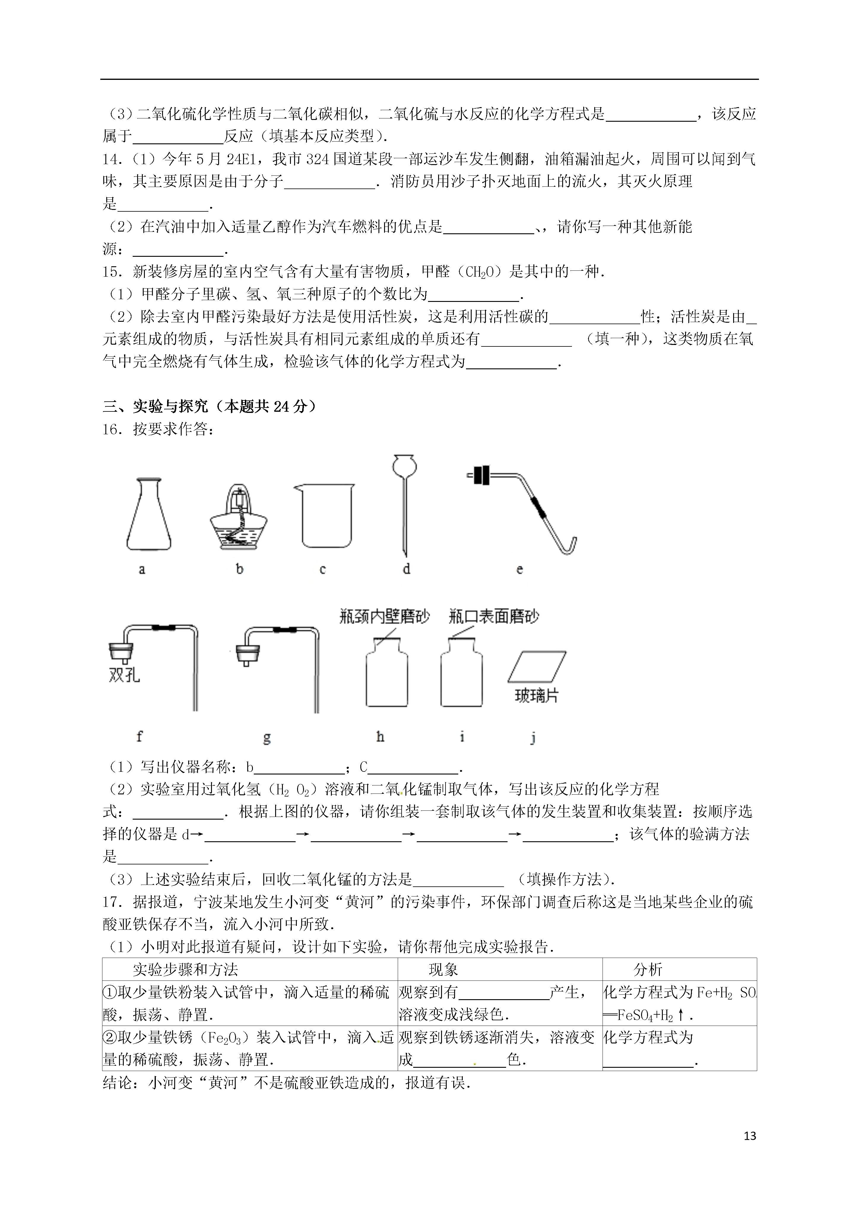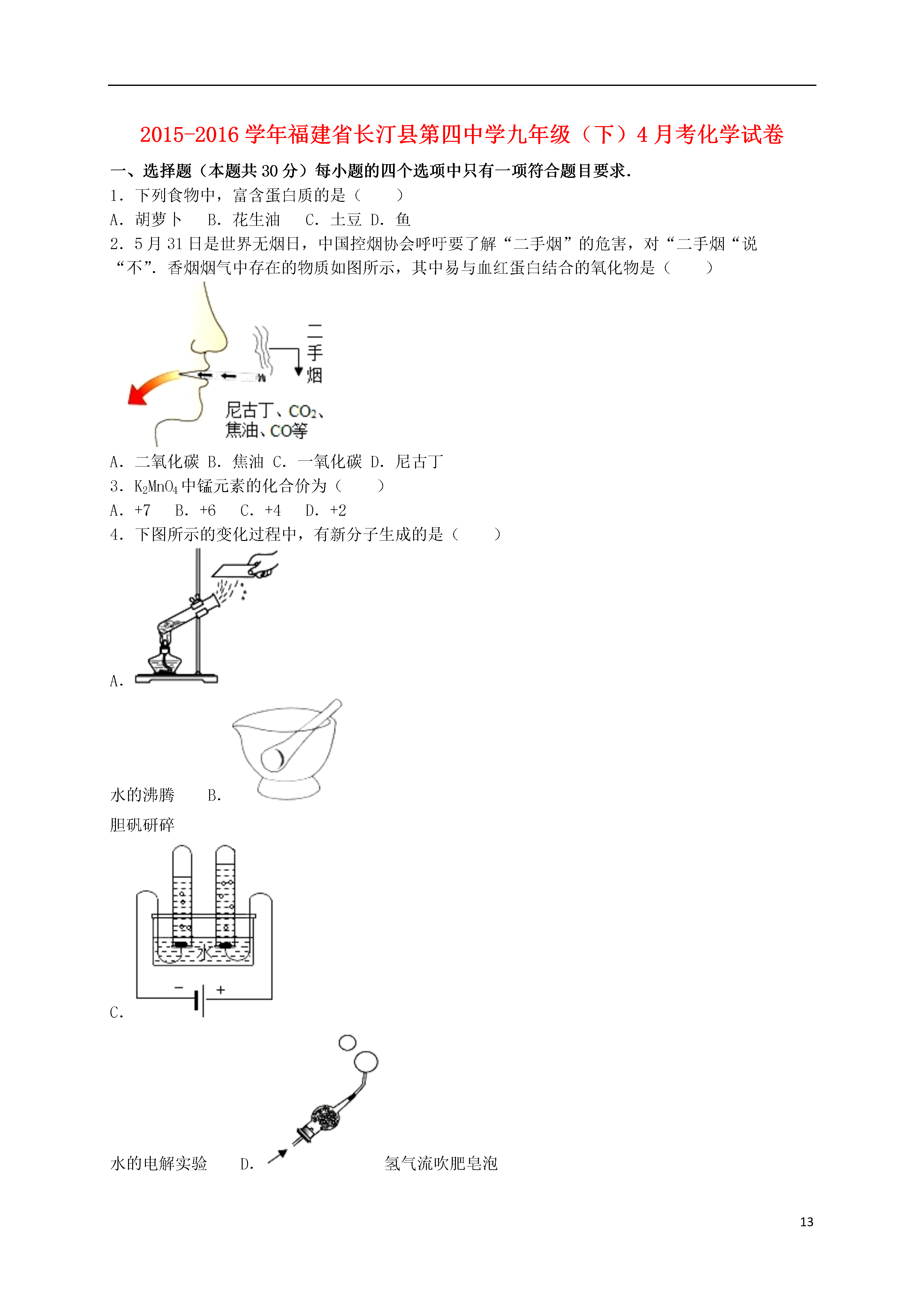 132015-2016学年福建省长汀县第四中学九年级(下)4月考化学试卷一、选择题(本题共30分)每小题的四个选项中只有一项符合题目要求.1.下列食物中,富含蛋白质的是()A.胡萝卜B.花生油C.土豆D.鱼2.5月31日是世界无烟日,中国控烟协会呼吁要了解“二手烟”的危害,对“二手烟“说“不”.香烟烟气中存在的物质如图所示,其中易与血红蛋白结合的氧化物是()A.二氧化碳B.焦油C.一氧化碳D.尼古丁3.K2MnO4中锰元素的化合价为()A.+7B.+6C.+4D.+24.下图所示的变化过程中,有新分子生成的是()A.水的沸腾B.胆矾研碎C.水的电解实验D.氢气流吹肥皂泡5.在化学反应2PbS+XO22PbO+2SO2中,X的数值为()A.3B.4C.1D.26.下列说法不正确的是()A.铁锅洗干净后擦干较不易生锈B.水是由氢、氧两种元素组成的C.饱和溶液升高温度一定变成不饱和D.氢氧化钠和盐酸的反应是中和反应7.据报道,云南、广西等地发生铬、镉等重金属污染事件,对人体健康造成严重的危害.小军同学查阅元素周期表,得到信息如图.下列说法不正确的是()A.两种原子的核内质子数不同B.两种原子的核外电子数相差4C.铬、镉的元素符号分别为Cr和CdD.铬、镉的相对原子质量分别为52.00和112.48.下图所示实验与实际做法不相符的是()A.稀释浓硫酸B.铁丝在氧气里燃烧C.甲烷燃烧D.闻气体的气味9.除去括号内的少量杂质,相应方法正确的是()A.氯化钙溶液(盐酸)﹣﹣滴入适量的碳酸钠溶液B.氯化钾(氯酸钾)﹣﹣加入二氧化锰加热C.氧化钙(碳酸钙)﹣﹣滴入适量的稀盐酸D.二氧化碳(水蒸气)﹣﹣通过浓硫酸10.铜及其化合物之间的转化如图所示,运用初中所学的知识分析,在一定条件下不能一步实现的是()A.①B.②C.③D.④二、填空与简答(本题共36分)11.用化学符号表示:(1)氮气:;(2)钠离子:;(3)2个氢原子:.12.在“a.食醋b.碳酸氢钠c.氢氧化钠d.盐酸e.干冰”等物质中,选择填空(填序号):(1)发酵粉的主要成分之一是;(2)用于人工降雨的物质是;(3)可用于制作叶脉书签的物质是;(4)属于酸的物质是.13.根据如表回答:(1)从表中可以看出空气质量最好的城市是市,可能形成酸雨的城市是市.福建省×月×日空气质量日报城市污染指数首要污染物级别状况福州市34I优厦门市34I优漳州市5l可吸入颗粒物Ⅱ良泉州市39I优三明市48I优莆田市30I优南平市51二氧化硫Ⅱ良龙岩市37I优宁德市39I优(2)收集某地区的雨水放置一段时间,最后测得pH=4.85,将紫色石蕊试液滴人雨水中呈色.(3)二氧化硫化学性质与二氧化碳相似,二氧化硫与水反应的化学方程式是,该反应属于反应(填基本反应类型).14.(1)今年5月24E1,我市324国道某段一部运沙车发生侧翻,油箱漏油起火,周围可以闻到气味,其主要原因是由于分子.消防员用沙子扑灭地面上的流火,其灭火原理是.(2)在汽油中加入适量乙醇作为汽车燃料的优点是、,请你写一种其他新能源:.15.新装修房屋的室内空气含有大量有害物质,甲醛(CH2O)是其中的一种.(1)甲醛分子里碳、氢、氧三种原子的个数比为.(2)除去室内甲醛污染最好方法是使用活性炭,这是利用活性碳的性;活性炭是由元素组成的物质,与活性炭具有相同元素组成的单质还有(填一种),这类物质在氧气中完全燃烧有气体生成,检验该气体的化学方程式为.三、实验与探究(本题共24分)16.按要求作答:(1)写出仪器名称:b;C.(2)实验室用过氧化氢(H2O2)溶液和二氧化锰制取气体,写出该反应的化学方程式:.根据上图的仪器,请你组装一套制取该气体的发生装置和收集装置:按顺序选择的仪器是d→→→→;该气体的验满方法是.(3)上述实验结束后,回收二氧化锰的方法是(填操作方法).17.据报道,宁波某地发生小河变“黄河”的污染事件,环保部门调查后称这是当地某些企业的硫酸亚铁保存不当,流入小河中所致.(1)小明对此报道有疑问,设计如下实验,请你帮他完成实验报告.实验步骤和方法现象分析①取少量铁粉装入试管中,滴入适量的稀硫酸,振荡、静置.观察到有产生,溶液变成浅绿色.化学方程式为Fe+H2SO4═FeSO4+H2↑.②取少量铁锈(Fe2O3)装入试管中,滴入适量的稀硫酸,振荡、静置.观察到铁锈逐渐消失,溶液变成色.化学方程式为.结论:小河变“黄河”不是硫酸亚铁造成的,报道有误.(2)小玲不赞成小明的观点,查阅资料得知:①硫酸亚铁在空气中不稳定,易被氧化成硫酸铁;②在酸性溶液中硫酸亚铁较稳定.据