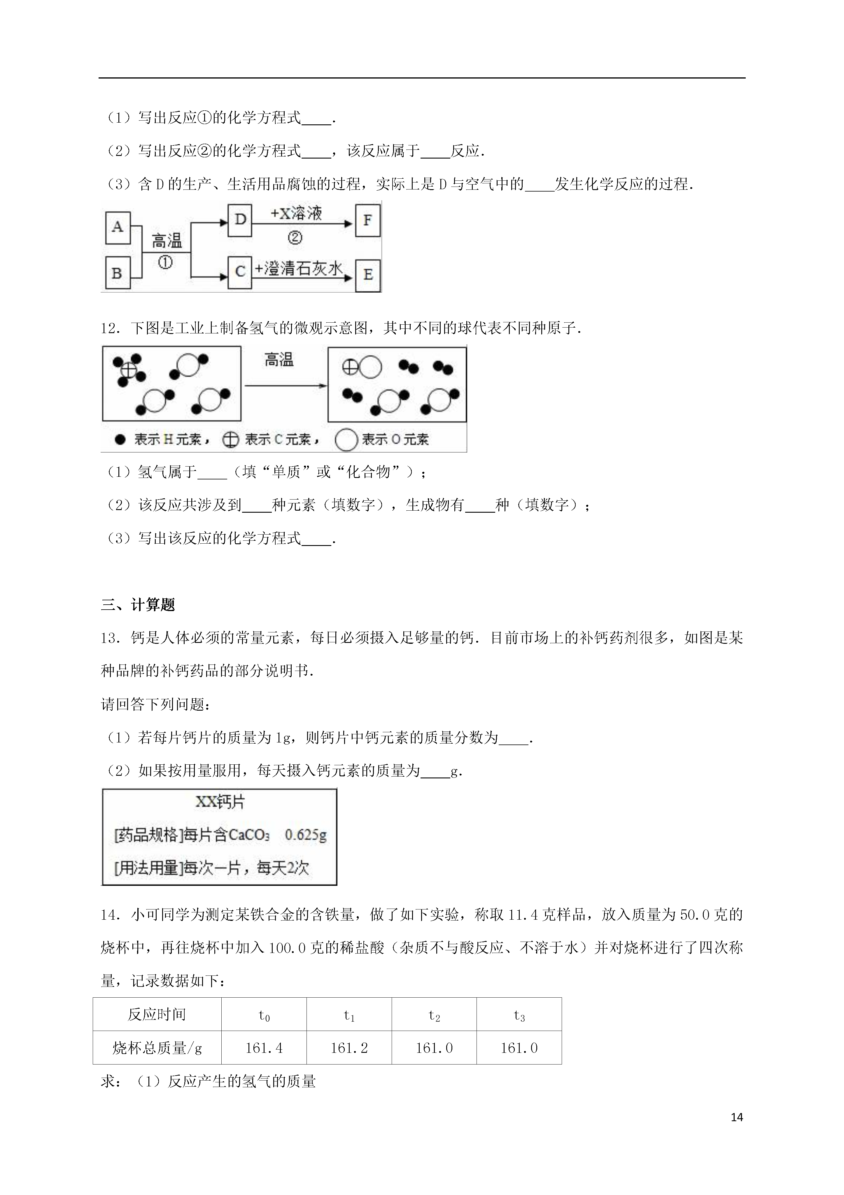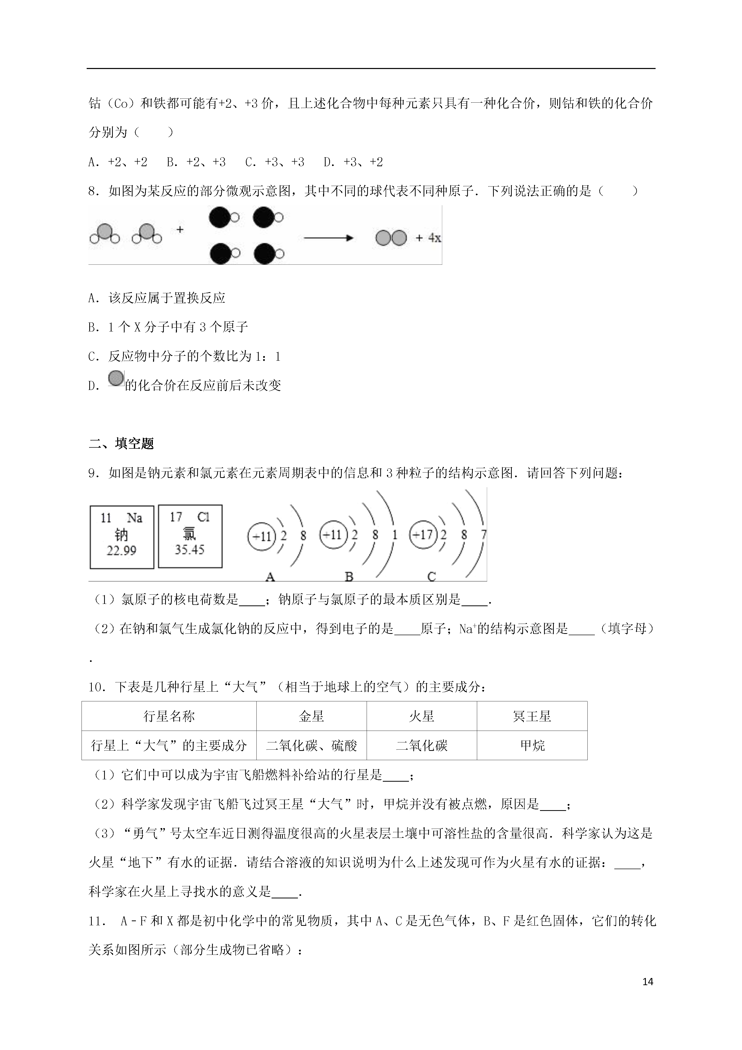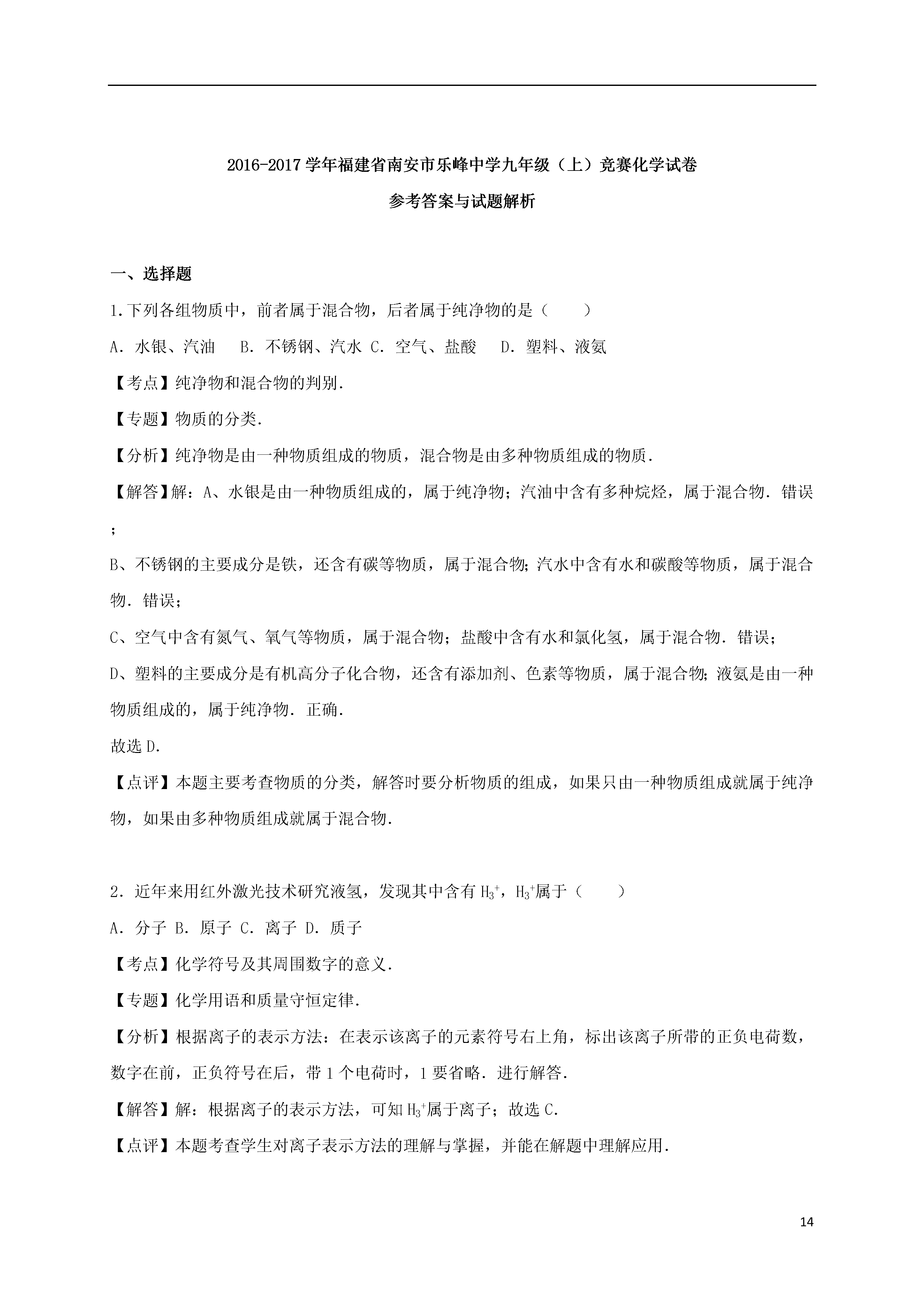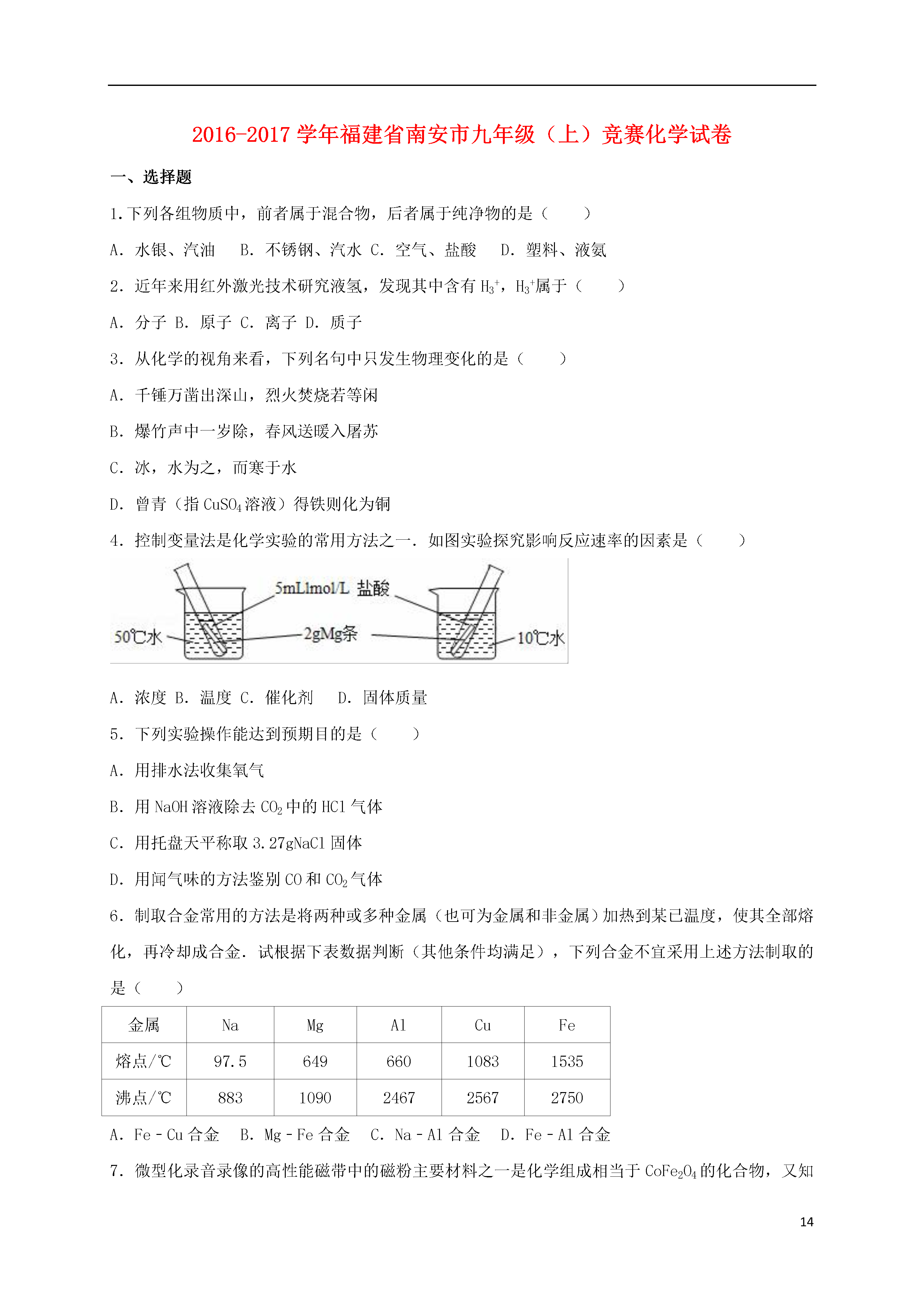 142016-2017学年福建省南安市九年级(上)竞赛化学试卷一、选择题1.下列各组物质中,前者属于混合物,后者属于纯净物的是()A.水银、汽油B.不锈钢、汽水C.空气、盐酸D.塑料、液氨2.近年来用红外激光技术研究液氢,发现其中含有H3+,H3+属于()A.分子B.原子C.离子D.质子3.从化学的视角来看,下列名句中只发生物理变化的是()A.千锤万凿出深山,烈火焚烧若等闲B.爆竹声中一岁除,春风送暖入屠苏C.冰,水为之,而寒于水D.曾青(指CuSO4溶液)得铁则化为铜4.控制变量法是化学实验的常用方法之一.如图实验探究影响反应速率的因素是()A.浓度B.温度C.催化剂D.固体质量5.下列实验操作能达到预期目的是()A.用排水法收集氧气B.用NaOH溶液除去CO2中的HCl气体C.用托盘天平称取3.27gNaCl固体D.用闻气味的方法鉴别CO和CO2气体6.制取合金常用的方法是将两种或多种金属(也可为金属和非金属)加热到某已温度,使其全部熔化,再冷却成合金.试根据下表数据判断(其他条件均满足),下列合金不宜采用上述方法制取的是()金属NaMgAlCuFe熔点/℃97.564966010831535沸点/℃8831090246725672750A.Fe﹣Cu合金B.Mg﹣Fe合金C.Na﹣Al合金D.Fe﹣Al合金7.微型化录音录像的高性能磁带中的磁粉主要材料之一是化学组成相当于CoFe2O4的化合物,又知钴(Co)和铁都可能有+2、+3价,且上述化合物中每种元素只具有一种化合价,则钴和铁的化合价分别为()A.+2、+2B.+2、+3C.+3、+3D.+3、+28.如图为某反应的部分微观示意图,其中不同的球代表不同种原子.下列说法正确的是()A.该反应属于置换反应B.1个X分子中有3个原子C.反应物中分子的个数比为1:1D.的化合价在反应前后未改变二、填空题9.如图是钠元素和氯元素在元素周期表中的信息和3种粒子的结构示意图.请回答下列问题:(1)氯原子的核电荷数是;钠原子与氯原子的最本质区别是.(2)在钠和氯气生成氯化钠的反应中,得到电子的是原子;Na+的结构示意图是(填字母).10.下表是几种行星上“大气”(相当于地球上的空气)的主要成分:行星名称金星火星冥王星行星上“大气”的主要成分二氧化碳、硫酸二氧化碳甲烷(1)它们中可以成为宇宙飞船燃料补给站的行星是;(2)科学家发现宇宙飞船飞过冥王星“大气”时,甲烷并没有被点燃,原因是;(3)“勇气”号太空车近日测得温度很高的火星表层土壤中可溶性盐的含量很高.科学家认为这是火星“地下”有水的证据.请结合溶液的知识说明为什么上述发现可作为火星有水的证据:,科学家在火星上寻找水的意义是.11.A﹣F和X都是初中化学中的常见物质,其中A、C是无色气体,B、F是红色固体,它们的转化关系如图所示(部分生成物已省略):(1)写出反应①的化学方程式.(2)写出反应②的化学方程式,该反应属于反应.(3)含D的生产、生活用品腐蚀的过程,实际上是D与空气中的发生化学反应的过程.12.下图是工业上制备氢气的微观示意图,其中不同的球代表不同种原子.(1)氢气属于(填“单质”或“化合物”);(2)该反应共涉及到种元素(填数字),生成物有种(填数字);(3)写出该反应的化学方程式.三、计算题13.钙是人体必须的常量元素,每日必须摄入足够量的钙.目前市场上的补钙药剂很多,如图是某种品牌的补钙药品的部分说明书.请回答下列问题:(1)若每片钙片的质量为1g,则钙片中钙元素的质量分数为.(2)如果按用量服用,每天摄入钙元素的质量为g.14.小可同学为测定某铁合金的含铁量,做了如下实验,称取11.4克样品,放入质量为50.0克的烧杯中,再往烧杯中加入100.0克的稀盐酸(杂质不与酸反应、不溶于水)并对烧杯进行了四次称量,记录数据如下:反应时间t0t1t2t3烧杯总质量/g161.4161.2161.0161.0求:(1)反应产生的氢气的质量(2)该铁合金中铁的质量分数(保留一位小数)2016-2017学年福建省南安市乐峰中学九年级(上)竞赛化学试卷参考答案与试题解析一、选择题1.下列各组物质中,前者属于混合物,后者属于纯净物的是()A.水银、汽油B.不锈钢、汽水C.空气、盐酸D.塑料、液氨【考点】纯净物和混合物的判别.【专题】物质的分类.【分析】纯净物是由一种物质组成的物质,混合物是由多种物质组成的物质.【解答】解:A、水银是由一种物质组成的,属于纯净物;汽油中含有多种烷烃,属于混合物.错误;B、不锈钢的主要成分是铁,还含有碳等物质,属于混合物;汽水中含有水和碳酸等物