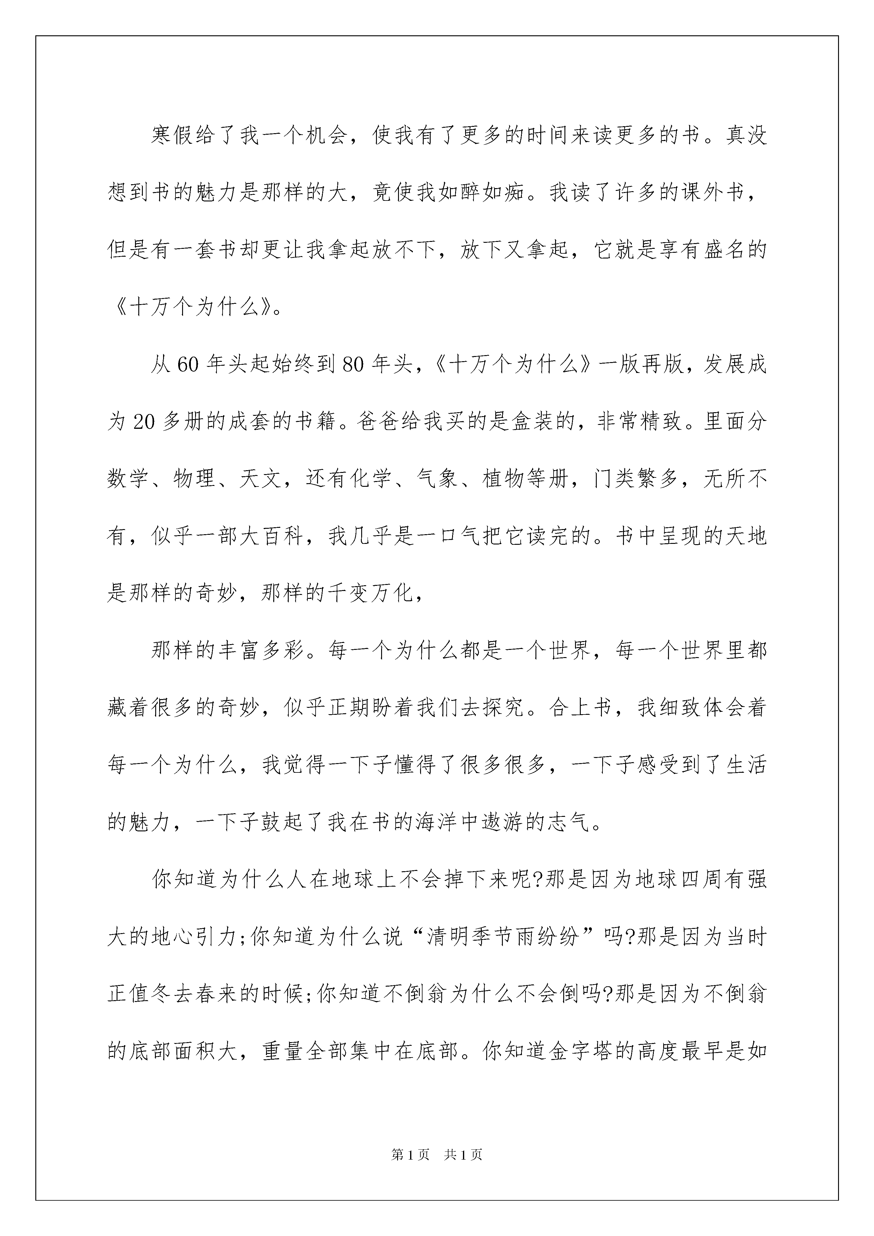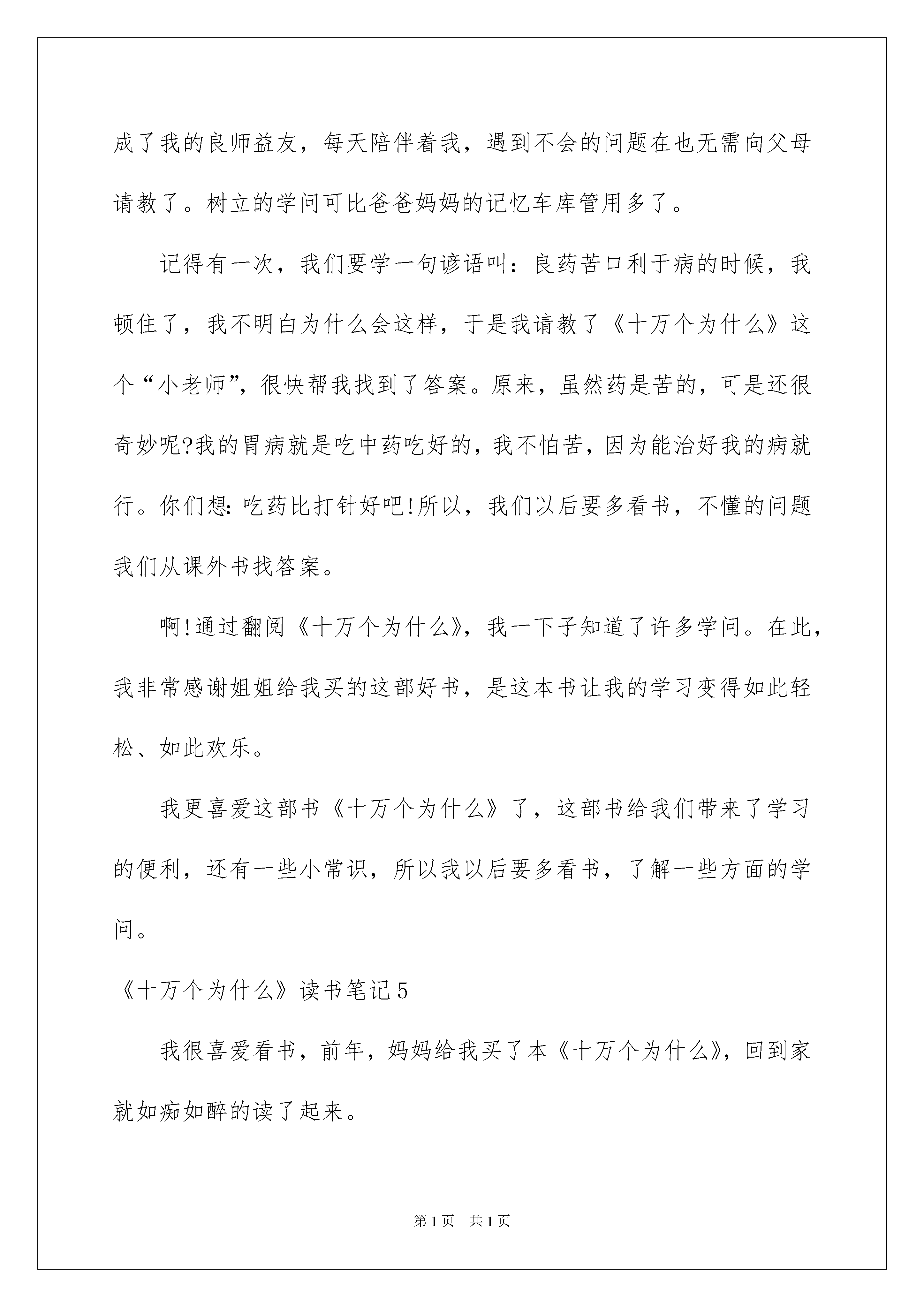 2022《十万个为什么》读书笔记《十万个为什么》读书笔记当阅读完一本名著后,大家心中肯定有许多感想,须要回过头来写一写读书笔记了。可是读书笔记怎么写才合适呢?以下是我为大家整理的《十万个为什么》读书笔记,欢迎大家共享。《十万个为什么》读书笔记1今日,我读了《十万个为什么》,里面可以让我知道关于很多人类与动物和大自然的好玩的学问。比如说为什么阳光会使人感到暖和?谁是太阳系的老大?地球会发生爆炸吗?这些问题都可以在《十万个为什么》里揭晓答案。让我最感爱好的是《人有第三只眼睛吗?》其实,人是有第三只眼睛的,只不过第三只眼睛已经退化了深深地埋在大脑里了,它位于丘脑上部。它的名字叫松果腺体,松果腺体对太阳光非常敏感,并通过神经纤维与眼睛相连。当太阳光非常剧烈的时刻,松果腺体受阳光抑制,分泌的松果激素就会削减,反之就多。松果激素有调整人体内其它激素含量的本事,人从生到死,松果腺体都在主动的起着作用。读了《十万个为什么》,我感到学问特别好玩,所以,我要常常读《十万个为什么》!《十万个为什么》读书笔记2今日我写完作业又拿起《十万个为什么》,看了老鹰为什么是千里眼?面包树真的会结出面包吗?……长了很多学问。老鹰为什么是千里眼呢?因为老鹰可以在几千米的高空,精确无误地辨别地上的动物,就连蛇、田鼠等也逃不过它的眼睛。这是由于老鹰每只眼睛中心有两个凹槽,一个是特地用来向前方看,另一个特地用来向侧面看。这样它的视觉范围就宽的多。老鹰的每个中心凹槽内看东西的细胞比人多出六、七倍。所以,鹰得眼睛不仅比其它动物看得远,而且看得清晰,于是,人们就给它起了一个外号——千里眼。面包树真的会结出面包。因为在太平洋的一些的小岛上有面包树,这种树会结出面包果,主要分为两大类,第一类是核面包,其次类是没核面包。这些面包果只要摘下来烤上一会就可以吃了,味道和真的面包差不多,只不过核面包时候吃的须要吐核。之所以我知道这些学问,都是从书上看的,以后我还要看更多的书,不断地去积累学问。《十万个为什么》读书笔记3寒假给了我一个机会,使我有了更多的时间来读更多的书。真没想到书的魅力是那样的大,竟使我如醉如痴。我读了许多的课外书,但是有一套书却更让我拿起放不下,放下又拿起,它就是享有盛名的《十万个为什么》。从60年头起始终到80年头,《十万个为什么》一版再版,发展成为20多册的成套的书籍。爸爸给我买的是盒装的,非常精致。里面分数学、物理、天文,还有化学、气象、植物等册,门类繁多,无所不有,似乎一部大百科,我几乎是一口气把它读完的。书中呈现的天地是那样的奇妙,那样的千变万化,那样的丰富多彩。每一个为什么都是一个世界,每一个世界里都藏着很多的奇妙,似乎正期盼着我们去探究。合上书,我细致体会着每一个为什么,我觉得一下子懂得了很多很多,一下子感受到了生活的魅力,一下子鼓起了我在书的海洋中遨游的志气。你知道为什么人在地球上不会掉下来呢?那是因为地球四周有强大的地心引力;你知道为什么说“清明季节雨纷纷”吗?那是因为当时正值冬去春来的时候;你知道不倒翁为什么不会倒吗?那是因为不倒翁的底部面积大,重量全部集中在底部。你知道金字塔的高度最早是如何测量的吗?你知道尼罗河为什么会定期泛滥吗?为什么?为什么?这些在《十万个为什么》中都有解答。它就像是航海的灯塔,远足的路标,找到答案时,你会豁然开朗,我真庆幸有这样一本书。我还发觉了有很多问题在《十万个为什么》里并没有解答,我便跑去问妈妈,妈妈告知我说:“宇宙是无限的,学问也是无限的,我们目前的科技还仅限于这个范围之内,所以有很多问题是我们目前无法探究得知的。”啊!《十万个为什么》是多么的精彩,我要把它们通通装进脑子里,一想到将来,一想到这五彩缤纷的世界,我就充溢了信念,充溢了对学问的渴求。《十万个为什么》读书笔记4从小,我遇到不懂的问题,我就问爸爸妈妈问个为什么。但随着年纪的上升,慢慢的我会提出一些问题,于是我便请姐姐去新华书店给我买了一套《十万个为什么》。现在,一遇到不会的问题,我只须要翻开这本书,就迎刃而解。这套书像一块磁铁深深地吸引着我,我发觉生活中的很多小常识,它上面都有。这下,我就越喜爱阅读它了,现在《十万个为什么》已经成了我的良师益友,每天陪伴着我,遇到不会的问题在也无需向父母请教了。树立的学问可比爸爸妈妈的记忆车库管用多了。记得有一次,我们要学一句谚语叫:良药苦口利于病的时候,我顿住了,我不明白为什么会这样,于是我请教了《十万个为什么》这个“小老师”,很快帮我找到了答案。原来,虽然药是苦的,可是还很奇妙呢?我的胃病就是吃中药吃好的,我不怕苦,因为能治好我的病就行。你们想:吃药比打针好吧!所以