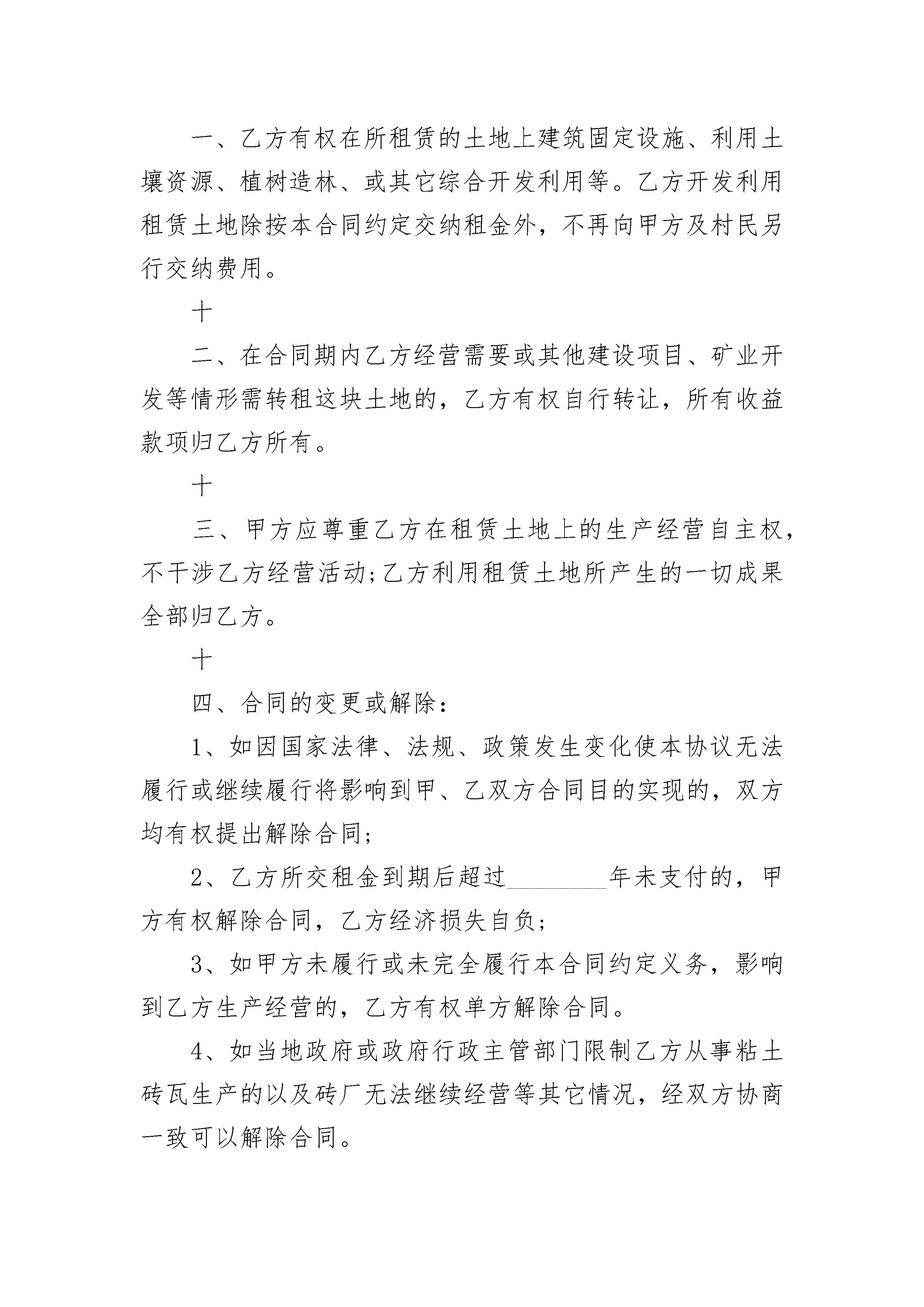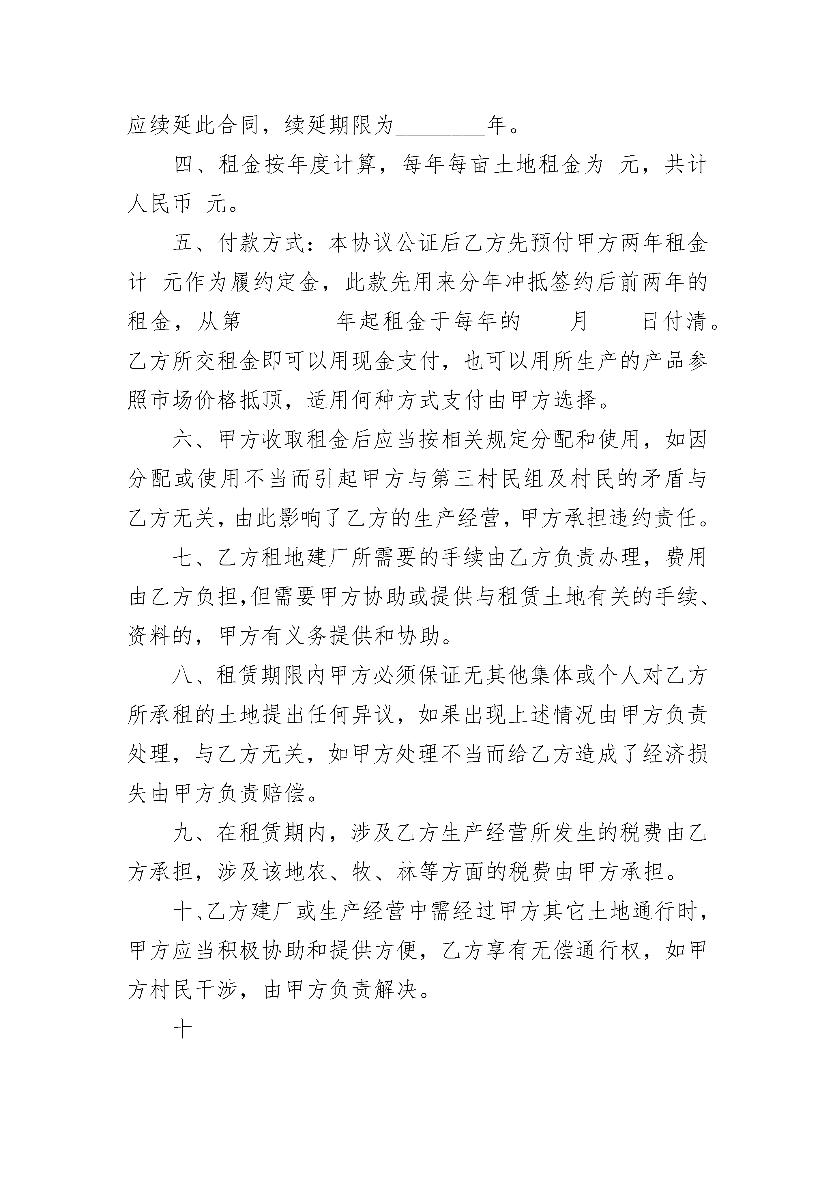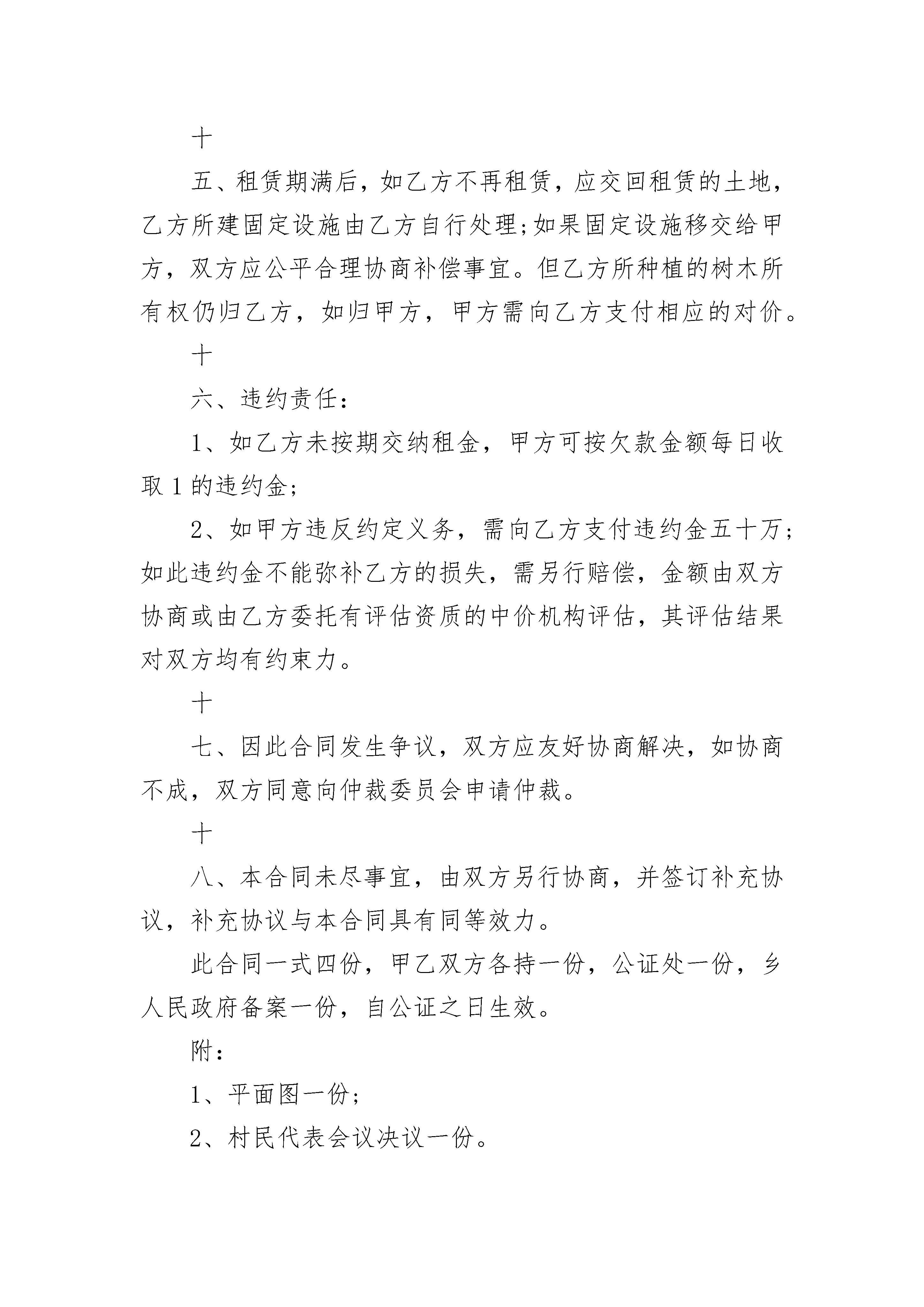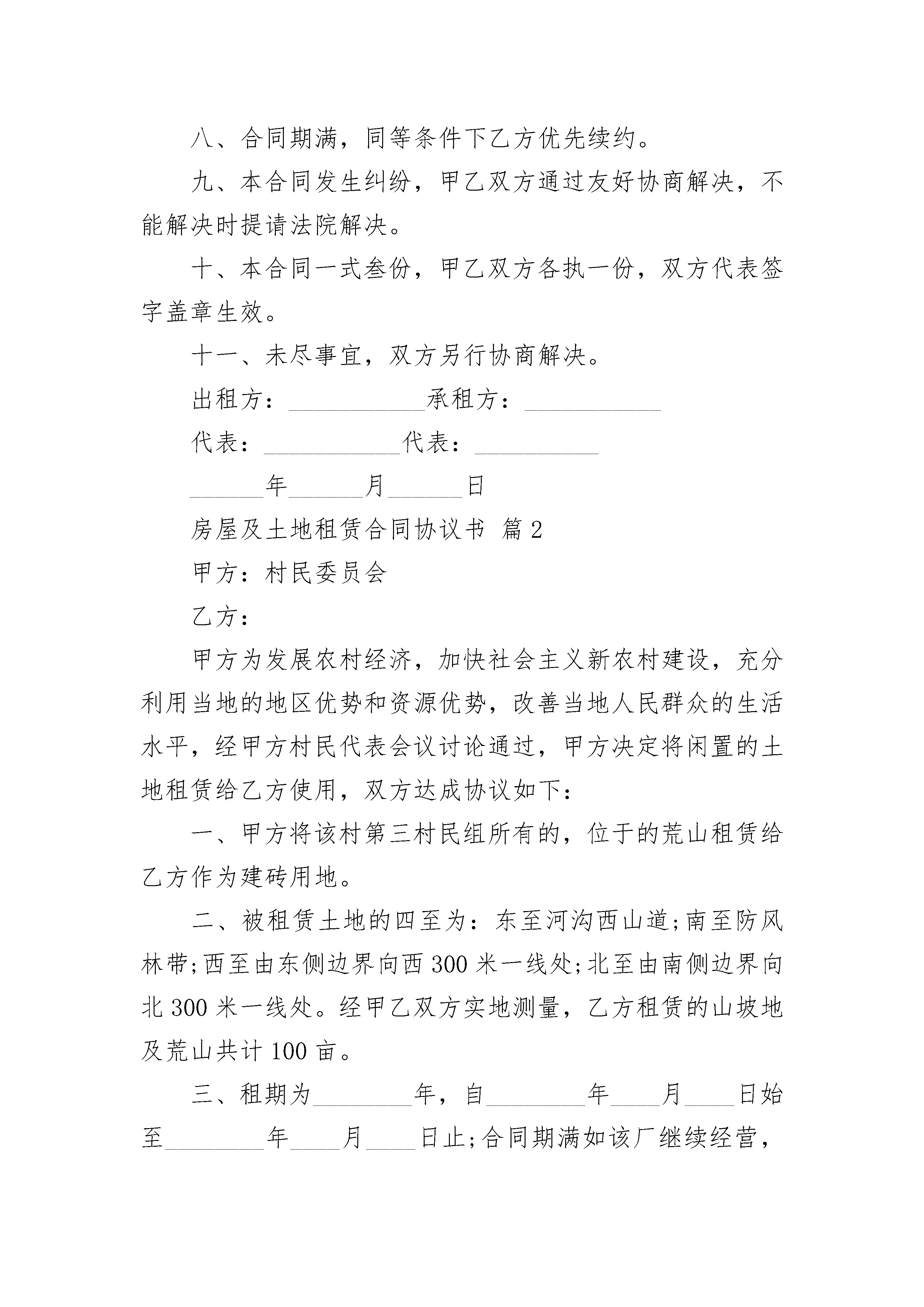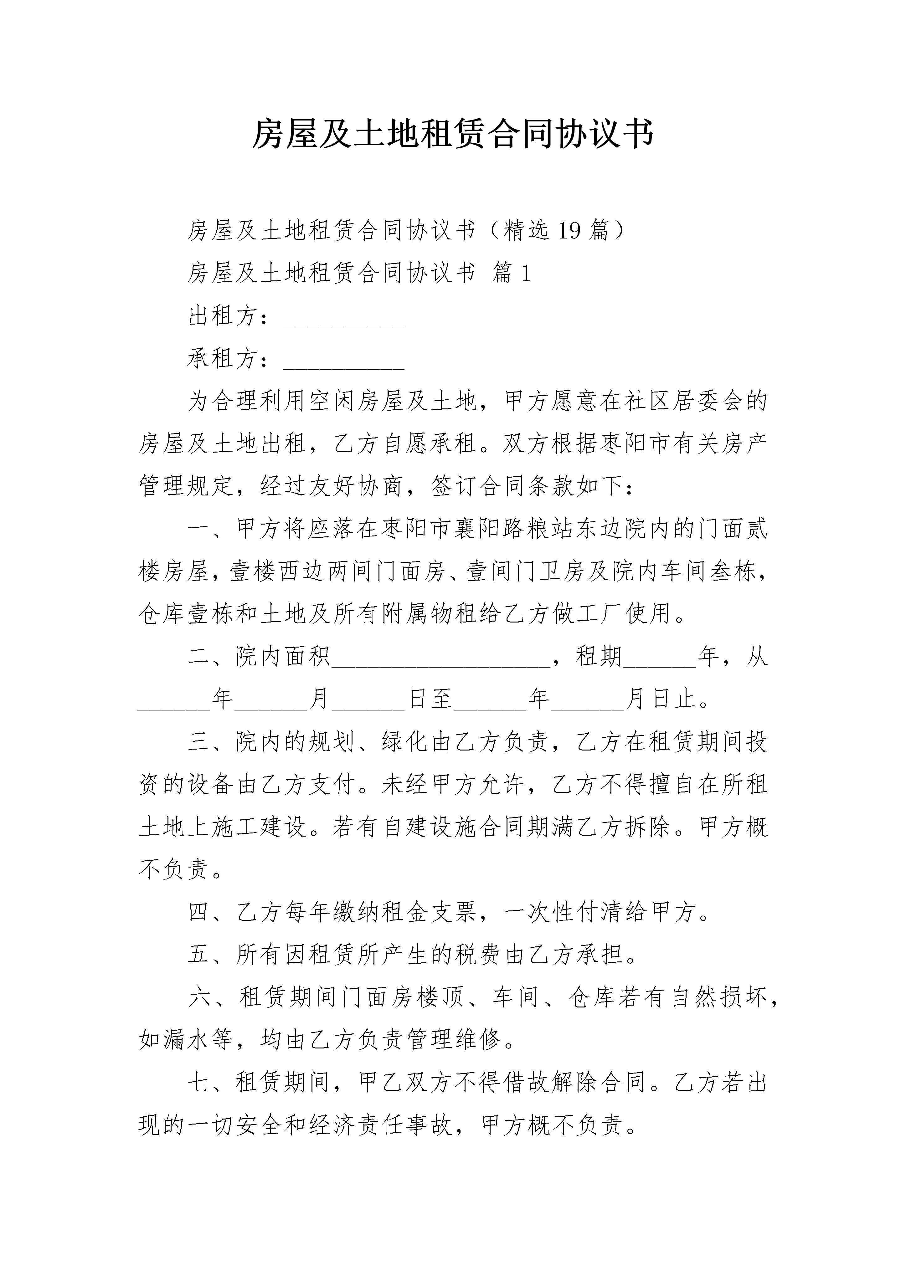 房屋及土地租赁合同协议书房屋及土地租赁合同协议书(精选19篇)房屋及土地租赁合同协议书篇1出租方:__________承租方:__________为合理利用空闲房屋及土地,甲方愿意在社区居委会的房屋及土地出租,乙方自愿承租。双方根据枣阳市有关房产管理规定,经过友好协商,签订合同条款如下:一、甲方将座落在枣阳市襄阳路粮站东边院内的门面贰楼房屋,壹楼西边两间门面房、壹间门卫房及院内车间叁栋,仓库壹栋和土地及所有附属物租给乙方做工厂使用。二、院内面积__________________,租期______年,从______年______月______日至______年______月日止。三、院内的规划、绿化由乙方负责,乙方在租赁期间投资的设备由乙方支付。未经甲方允许,乙方不得擅自在所租土地上施工建设。若有自建设施合同期满乙方拆除。甲方概不负责。四、乙方每年缴纳租金支票,一次性付清给甲方。五、所有因租赁所产生的税费由乙方承担。六、租赁期间门面房楼顶、车间、仓库若有自然损坏,如漏水等,均由乙方负责管理维修。七、租赁期间,甲乙双方不得借故解除合同。乙方若出现的一切安全和经济责任事故,甲方概不负责。八、合同期满,同等条件下乙方优先续约。九、本合同发生纠纷,甲乙双方通过友好协商解决,不能解决时提请法院解决。十、本合同一式叁份,甲乙双方各执一份,双方代表签字盖章生效。十一、未尽事宜,双方另行协商解决。出租方:___________承租方:___________代表:___________代表:________________年______月______日房屋及土地租赁合同协议书篇2甲方:村民委员会乙方:甲方为发展农村经济,加快社会主义新农村建设,充分利用当地的地区优势和资源优势,改善当地人民群众的生活水平,经甲方村民代表会议讨论通过,甲方决定将闲置的土地租赁给乙方使用,双方达成协议如下:一、甲方将该村第三村民组所有的,位于的荒山租赁给乙方作为建砖用地。二、被租赁土地的四至为:东至河沟西山道;南至防风林带;西至由东侧边界向西300米一线处;北至由南侧边界向北300米一线处。经甲乙双方实地测量,乙方租赁的山坡地及荒山共计100亩。三、租期为________年,自________年____月____日始至________年____月____日止;合同期满如该厂继续经营,应续延此合同,续延期限为________年。四、租金按年度计算,每年每亩土地租金为元,共计人民币元。五、付款方式:本协议公证后乙方先预付甲方两年租金计元作为履约定金,此款先用来分年冲抵签约后前两年的租金,从第________年起租金于每年的____月____日付清。乙方所交租金即可以用现金支付,也可以用所生产的产品参照市场价格抵顶,适用何种方式支付由甲方选择。六、甲方收取租金后应当按相关规定分配和使用,如因分配或使用不当而引起甲方与第三村民组及村民的矛盾与乙方无关,由此影响了乙方的生产经营,甲方承担违约责任。七、乙方租地建厂所需要的手续由乙方负责办理,费用由乙方负担,但需要甲方协助或提供与租赁土地有关的手续、资料的,甲方有义务提供和协助。八、租赁期限内甲方必须保证无其他集体或个人对乙方所承租的土地提出任何异议,如果出现上述情况由甲方负责处理,与乙方无关,如甲方处理不当而给乙方造成了经济损失由甲方负责赔偿。九、在租赁期内,涉及乙方生产经营所发生的税费由乙方承担,涉及该地农、牧、林等方面的税费由甲方承担。十、乙方建厂或生产经营中需经过甲方其它土地通行时,甲方应当积极协助和提供方便,乙方享有无偿通行权,如甲方村民干涉,由甲方负责解决。十一、乙方有权在所租赁的土地上建筑固定设施、利用土壤资源、植树造林、或其它综合开发利用等。乙方开发利用租赁土地除按本合同约定交纳租金外,不再向甲方及村民另行交纳费用。十二、在合同期内乙方经营需要或其他建设项目、矿业开发等情形需转租这块土地的,乙方有权自行转让,所有收益款项归乙方所有。十三、甲方应尊重乙方在租赁土地上的生产经营自主权,不干涉乙方经营活动;乙方利用租赁土地所产生的一切成果全部归乙方。十四、合同的变更或解除:1、如因国家法律、法规、政策发生变化使本协议无法履行或继续履行将影响到甲、乙双方合同目的实现的,双方均有权提出解除合同;2、乙方所交租金到期后超过________年未支付的,甲方有权解除合同,乙方经济损失自负;3、如甲方未履行或未完全履行本合同约定义务,影响到乙方生产经营的,乙方有权单方解除合同。4、如当地政府或政府行政主管部门限制乙方从事粘土砖瓦生产的以及砖厂无法继续经营等其它情况,经双方协商一致可以解除合同。十五、租赁期满后,如乙方不再租赁,应交回租赁的土地,乙方所建固定设施由乙方自行处理;如果固定设施移交给甲方,双方应公平合理协商补偿事宜。