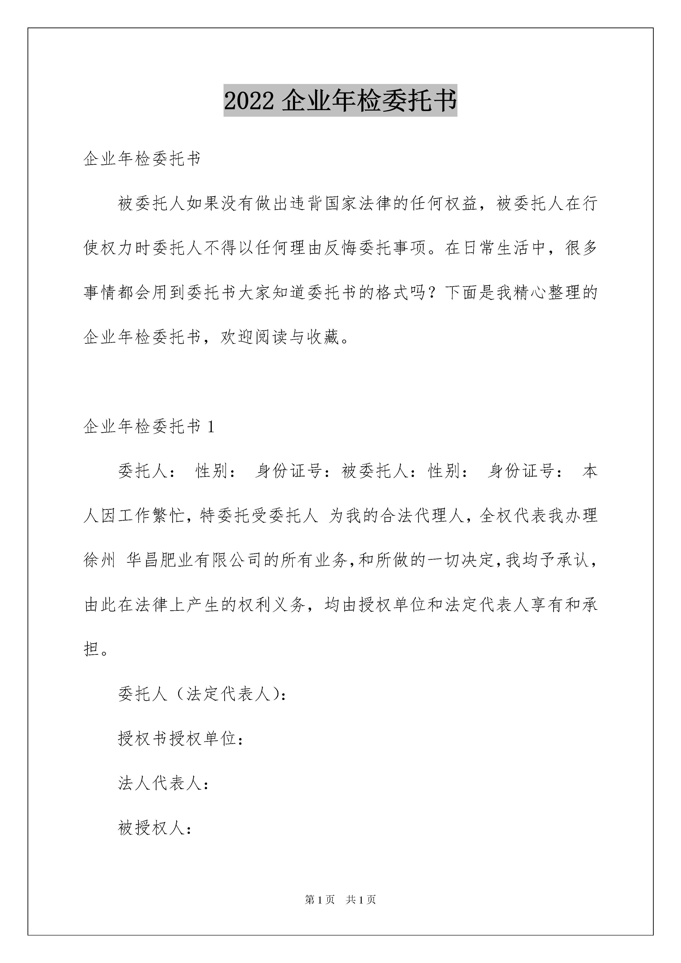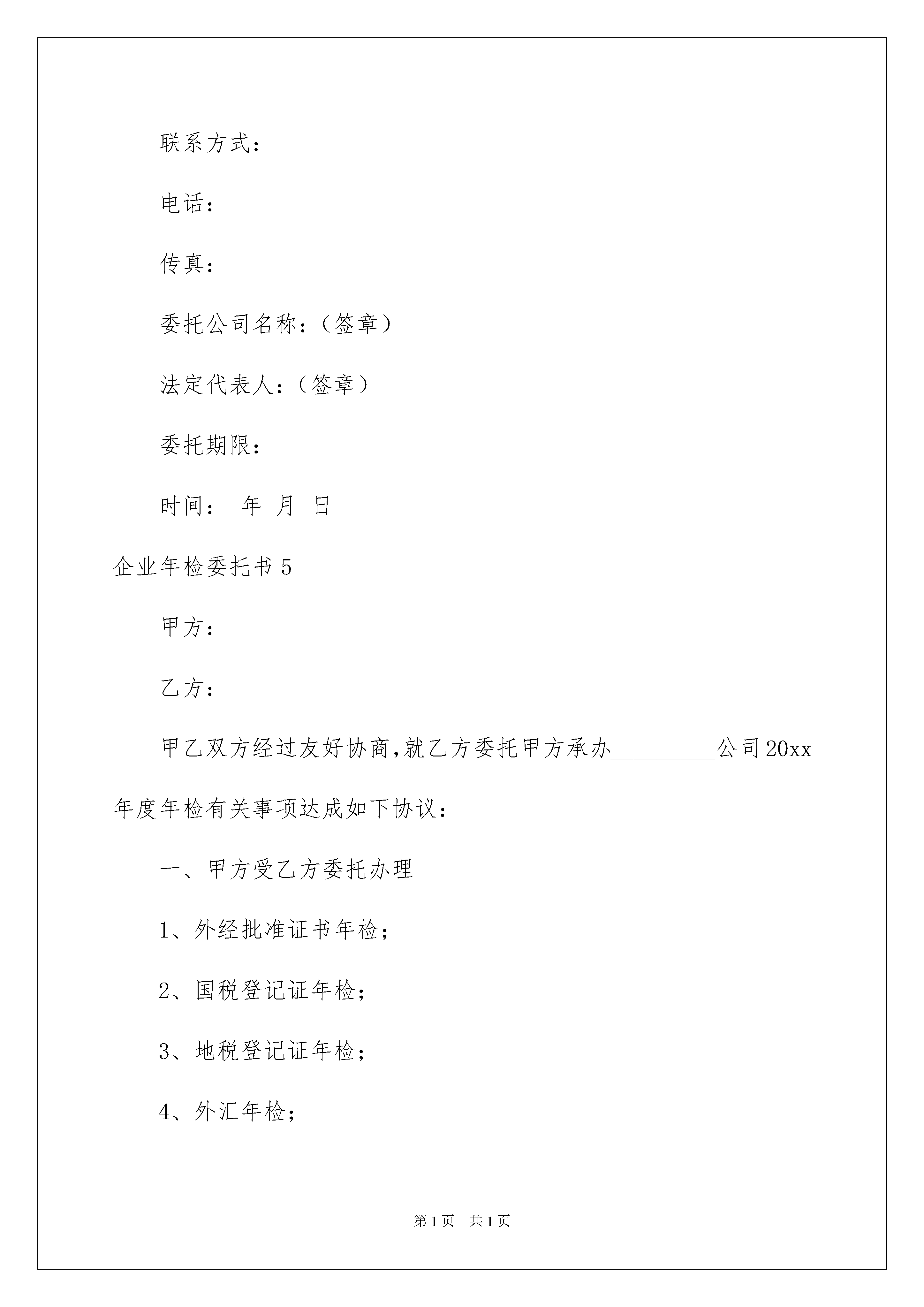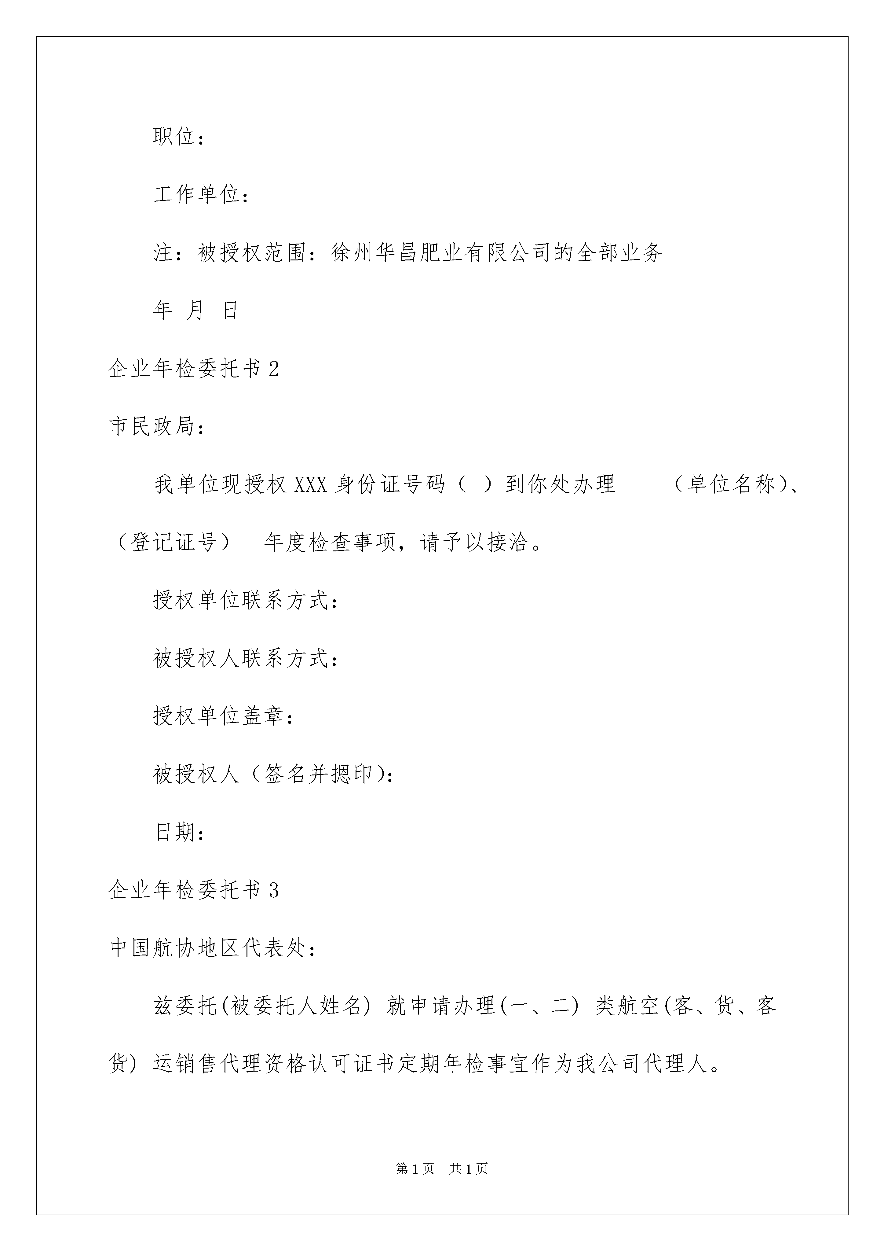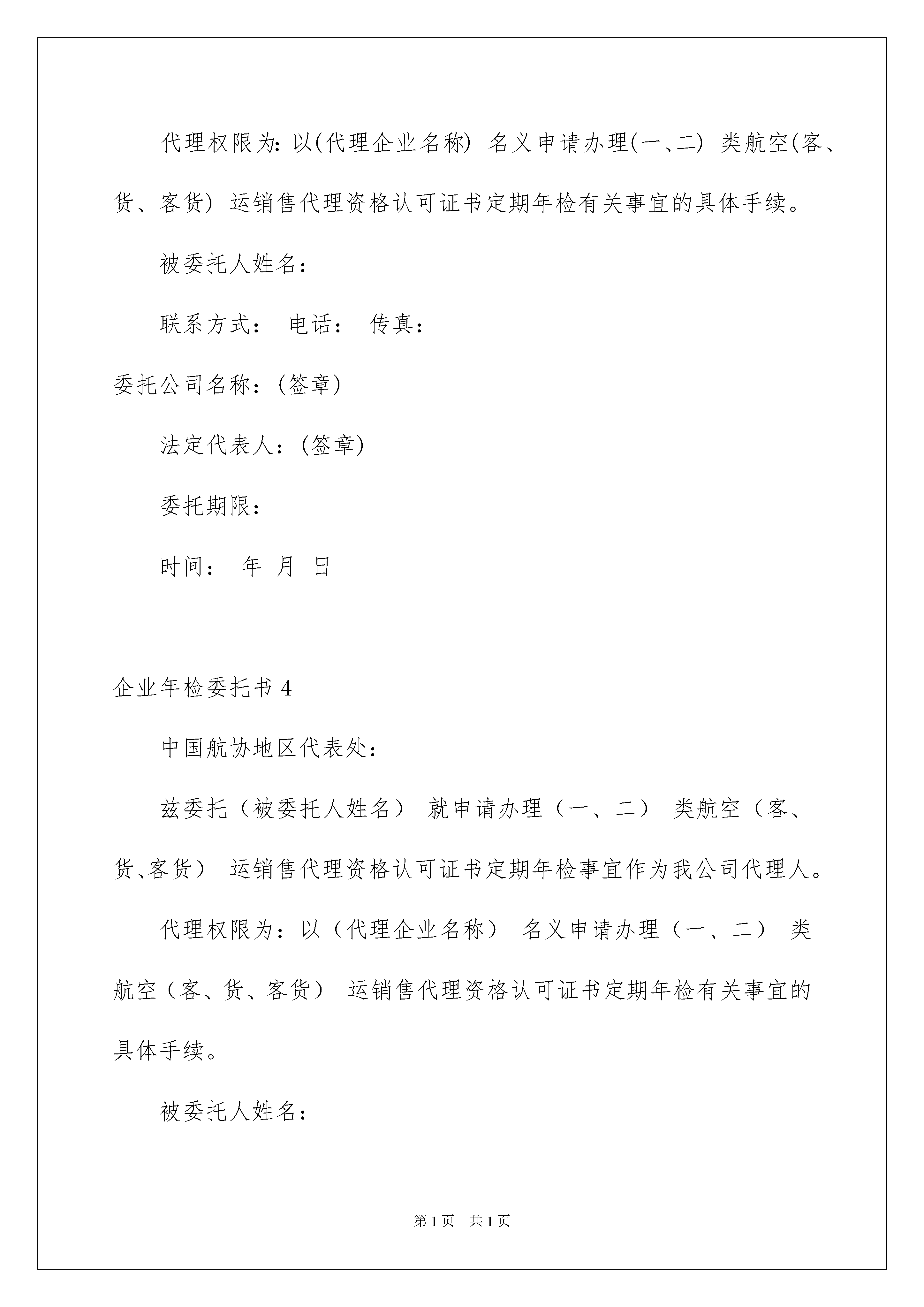 2022企业年检委托书企业年检委托书被委托人如果没有做出违背国家法律的任何权益,被委托人在行使权力时委托人不得以任何理由反悔委托事项。在日常生活中,很多事情都会用到委托书大家知道委托书的格式吗?下面是我精心整理的企业年检委托书,欢迎阅读与收藏。企业年检委托书1委托人:性别:身份证号:被委托人:性别:身份证号:本人因工作繁忙,特委托受委托人为我的合法代理人,全权代表我办理徐州华昌肥业有限公司的所有业务,和所做的一切决定,我均予承认,由此在法律上产生的权利义务,均由授权单位和法定代表人享有和承担。委托人(法定代表人):授权书授权单位:法人代表人:被授权人:职位:工作单位:注:被授权范围:徐州华昌肥业有限公司的全部业务年月日企业年检委托书2市民政局:我单位现授权XXX身份证号码()到你处办理(单位名称)、(登记证号)年度检查事项,请予以接洽。授权单位联系方式:被授权人联系方式:授权单位盖章:被授权人(签名并摁印):日期:企业年检委托书3中国航协地区代表处:兹委托(被委托人姓名)就申请办理(一、二)类航空(客、货、客货)运销售代理资格认可证书定期年检事宜作为我公司代理人。代理权限为:以(代理企业名称)名义申请办理(一、二)类航空(客、货、客货)运销售代理资格认可证书定期年检有关事宜的具体手续。被委托人姓名:联系方式:电话:传真:委托公司名称:(签章)法定代表人:(签章)委托期限:时间:年月日企业年检委托书4中国航协地区代表处:兹委托(被委托人姓名)就申请办理(一、二)类航空(客、货、客货)运销售代理资格认可证书定期年检事宜作为我公司代理人。代理权限为:以(代理企业名称)名义申请办理(一、二)类航空(客、货、客货)运销售代理资格认可证书定期年检有关事宜的具体手续。被委托人姓名:联系方式:电话:传真:委托公司名称:(签章)法定代表人:(签章)委托期限:时间:年月日企业年检委托书5甲方:乙方:甲乙双方经过友好协商,就乙方委托甲方承办_________公司20xx年度年检有关事项达成如下协议:一、甲方受乙方委托办理1、外经批准证书年检;2、国税登记证年检;3、地税登记证年检;4、外汇年检;5、财政登记证年检;6、工商营业执照年检;7、统计部门(网上数据)年检;二、乙方责任1、按要求填写年检表格,所填数据应准确、无误;2、提交的资料应真实、合法、有效,并积极配合甲方工作。三、费用乙方向甲方支付服务费人民币叁仟元整。四、其他事项1、如乙方中途停办,已支付的服务费甲方不予退回;2、因乙方提交的资料不符合要求,未通过个别部门的年检,已支付的服务费甲方不予退回,甲方不承担责任。3、部门过期年检罚款由乙方支付,甲方不承担责任。五、其他约定甲方:乙方:(盖章)代表:代表:20__年__月__日20__年__月__日企业年检委托书6指定代表或者委托代理人姓名:联系电话:固定电话移动电话委托事项:□提交年检报告书及其它年检材料。□领取加盖年检戳记后的营业执照副本。委托权限:是否同意指定代表或者委托代理人修改年检报告书的填写错误:□同意□不同意指定或者委托的有效期限至年月日年月日(企业盖章)年月日中华人民共和国国家工商行政管理总局制企业年检委托书7委托代理人姓名:联系电话:固定电话移动电话委托事项:□提交年检报告书及其它年检材料。□领取加盖年检戳记后的营业执照副本。委托权限:是否同意指定代表或者委托代理人修改年检报告书的填写错误:现委托_______________在我与____________________________________________________________________一案中,作为我参加诉讼(或仲裁)的委托代理人。□同意在撤销授权的书面通知以前,本授权书一直有效。被委托人签署的所有文件(在授权有效期内签署的)不因授权的撤销而失效。□不同意法定代表人授权委托书是企业法人委托他人代为某种法律行为的法律文书。法定代表人因事不能亲自为某种行为时,可以通过授权委托方式,指派他人去办理。这时,就需要制作法定代表人授权委托书,被委托人在授权的范围进行活动,对委托人直接产生法律效力。指定或者委托的有效期限至年月日年月日今有XXX分公司属我公司下属子公司,因业务发展需要,经我公司商议决定授权XXX分公司与XXX金融机构发生XXX信贷关系,予以办理为感!(企业盖章)本人工作繁忙,不能亲自办理的相关手续,特委托____________作为我的合法代理人,全权代表我办理相关事项,对委托人在办理上述事项过程中所签署的有关文件,我均予以认可,并承担相应的法律责任.年月日中华人民共和国国家工商行政管理