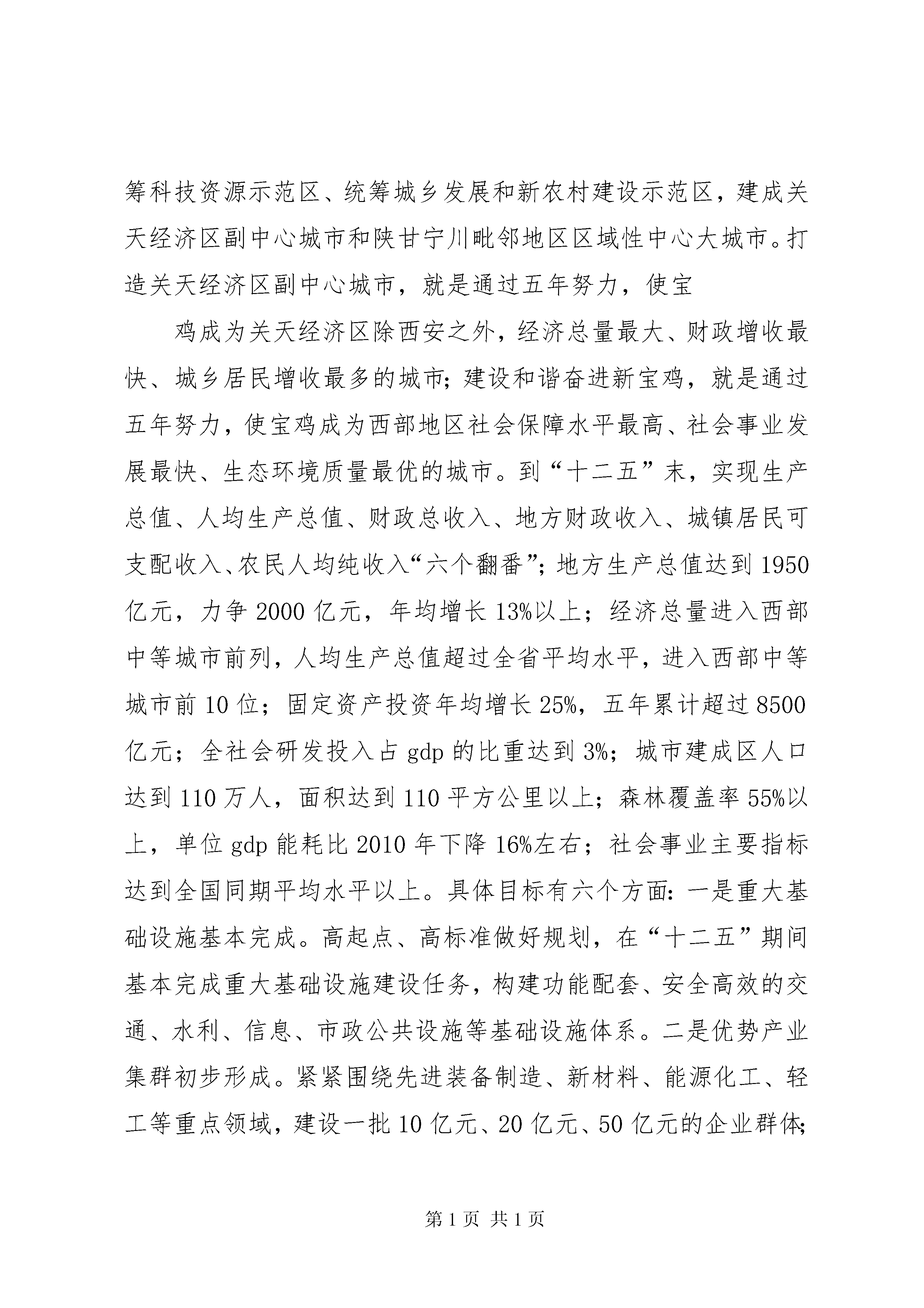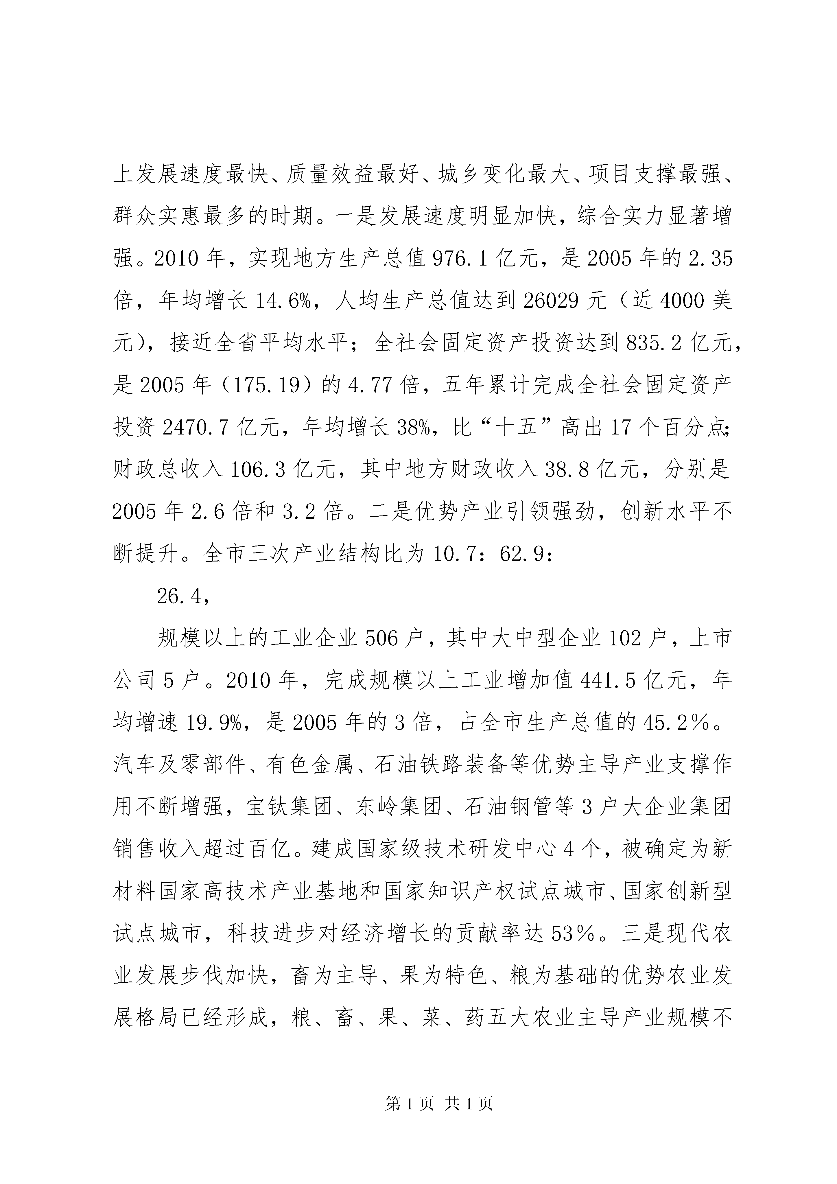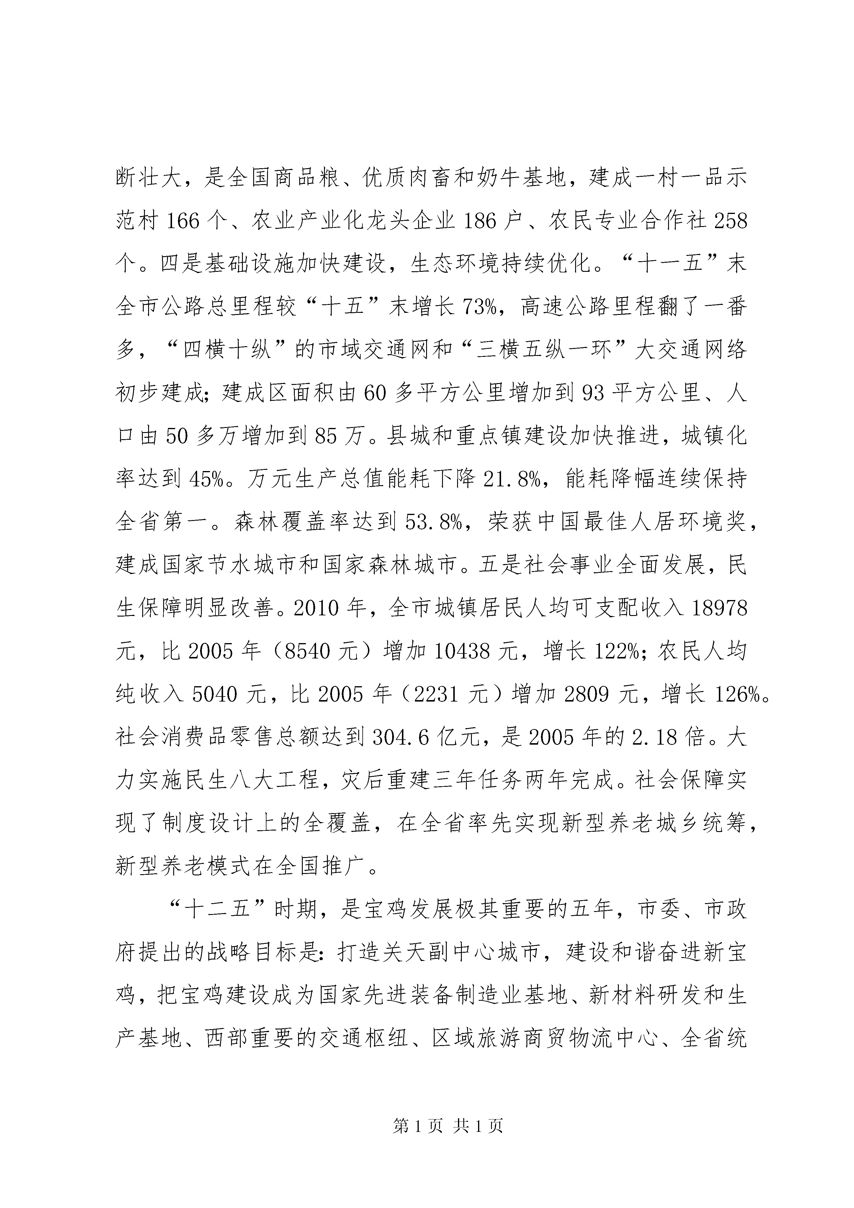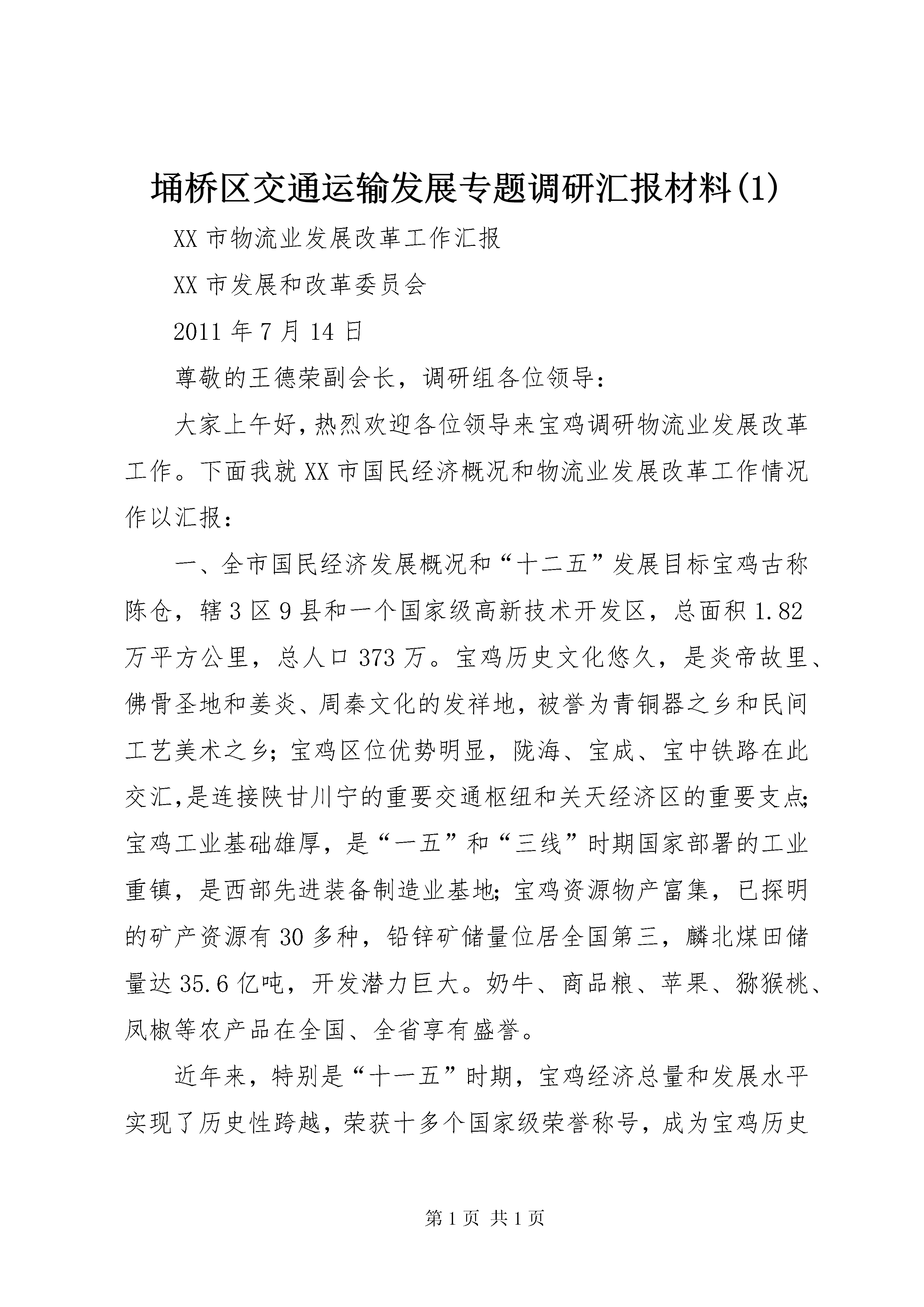 埇桥区交通运输发展专题调研汇报材料(1)XX市物流业发展改革工作汇报XX市发展和改革委员会2011年7月14日尊敬的王德荣副会长,调研组各位领导:大家上午好,热烈欢迎各位领导来宝鸡调研物流业发展改革工作。下面我就XX市国民经济概况和物流业发展改革工作情况作以汇报:一、全市国民经济发展概况和“十二五”发展目标宝鸡古称陈仓,辖3区9县和一个国家级高新技术开发区,总面积1.82万平方公里,总人口373万。宝鸡历史文化悠久,是炎帝故里、佛骨圣地和姜炎、周秦文化的发祥地,被誉为青铜器之乡和民间工艺美术之乡;宝鸡区位优势明显,陇海、宝成、宝中铁路在此交汇,是连接陕甘川宁的重要交通枢纽和关天经济区的重要支点;宝鸡工业基础雄厚,是“一五”和“三线”时期国家部署的工业重镇,是西部先进装备制造业基地;宝鸡资源物产富集,已探明的矿产资源有30多种,铅锌矿储量位居全国第三,麟北煤田储量达35.6亿吨,开发潜力巨大。奶牛、商品粮、苹果、猕猴桃、凤椒等农产品在全国、全省享有盛誉。近年来,特别是“十一五”时期,宝鸡经济总量和发展水平实现了历史性跨越,荣获十多个国家级荣誉称号,成为宝鸡历史上发展速度最快、质量效益最好、城乡变化最大、项目支撑最强、群众实惠最多的时期。一是发展速度明显加快,综合实力显著增强。2010年,实现地方生产总值976.1亿元,是2005年的2.35倍,年均增长14.6%,人均生产总值达到26029元(近4000美元),接近全省平均水平;全社会固定资产投资达到835.2亿元,是2005年(175.19)的4.77倍,五年累计完成全社会固定资产投资2470.7亿元,年均增长38%,比“十五”高出17个百分点;财政总收入106.3亿元,其中地方财政收入38.8亿元,分别是2005年2.6倍和3.2倍。二是优势产业引领强劲,创新水平不断提升。全市三次产业结构比为10.7:62.9:26.4,规模以上的工业企业506户,其中大中型企业102户,上市公司5户。2010年,完成规模以上工业增加值441.5亿元,年均增速19.9%,是2005年的3倍,占全市生产总值的45.2%。汽车及零部件、有色金属、石油铁路装备等优势主导产业支撑作用不断增强,宝钛集团、东岭集团、石油钢管等3户大企业集团销售收入超过百亿。建成国家级技术研发中心4个,被确定为新材料国家高技术产业基地和国家知识产权试点城市、国家创新型试点城市,科技进步对经济增长的贡献率达53%。三是现代农业发展步伐加快,畜为主导、果为特色、粮为基础的优势农业发展格局已经形成,粮、畜、果、菜、药五大农业主导产业规模不断壮大,是全国商品粮、优质肉畜和奶牛基地,建成一村一品示范村166个、农业产业化龙头企业186户、农民专业合作社258个。四是基础设施加快建设,生态环境持续优化。“十一五”末全市公路总里程较“十五”末增长73%,高速公路里程翻了一番多,“四横十纵”的市域交通网和“三横五纵一环”大交通网络初步建成;建成区面积由60多平方公里增加到93平方公里、人口由50多万增加到85万。县城和重点镇建设加快推进,城镇化率达到45%。万元生产总值能耗下降21.8%,能耗降幅连续保持全省第一。森林覆盖率达到53.8%,荣获中国最佳人居环境奖,建成国家节水城市和国家森林城市。五是社会事业全面发展,民生保障明显改善。2010年,全市城镇居民人均可支配收入18978元,比2005年(8540元)增加10438元,增长122%;农民人均纯收入5040元,比2005年(2231元)增加2809元,增长126%。社会消费品零售总额达到304.6亿元,是2005年的2.18倍。大力实施民生八大工程,灾后重建三年任务两年完成。社会保障实现了制度设计上的全覆盖,在全省率先实现新型养老城乡统筹,新型养老模式在全国推广。“十二五”时期,是宝鸡发展极其重要的五年,市委、市政府提出的战略目标是:打造关天副中心城市,建设和谐奋进新宝鸡,把宝鸡建设成为国家先进装备制造业基地、新材料研发和生产基地、西部重要的交通枢纽、区域旅游商贸物流中心、全省统筹科技资源示范区、统筹城乡发展和新农村建设示范区,建成关天经济区副中心城市和陕甘宁川毗邻地区区域性中心大城市。打造关天经济区副中心城市,就是通过五年努力,使宝鸡成为关天经济区除西安之外,经济总量最大、财政增收最快、城乡居民增收最多的城市;建设和谐奋进新宝鸡,就是通过五年努力,使宝鸡成为西部地区社会保障水平最高、社会事业发展最快、生态环境质量最优的城市。到“十二五”末,实现生产总值、人均生产总值、财政总收入、地方财政收入、城镇居民可支配收入、农民人均纯收入“六个翻番”;地方生产总值达到1950亿元,力争2000亿元,年均增长13%以上;经济总量进入西部中等城市前列,人均生产总值超过
