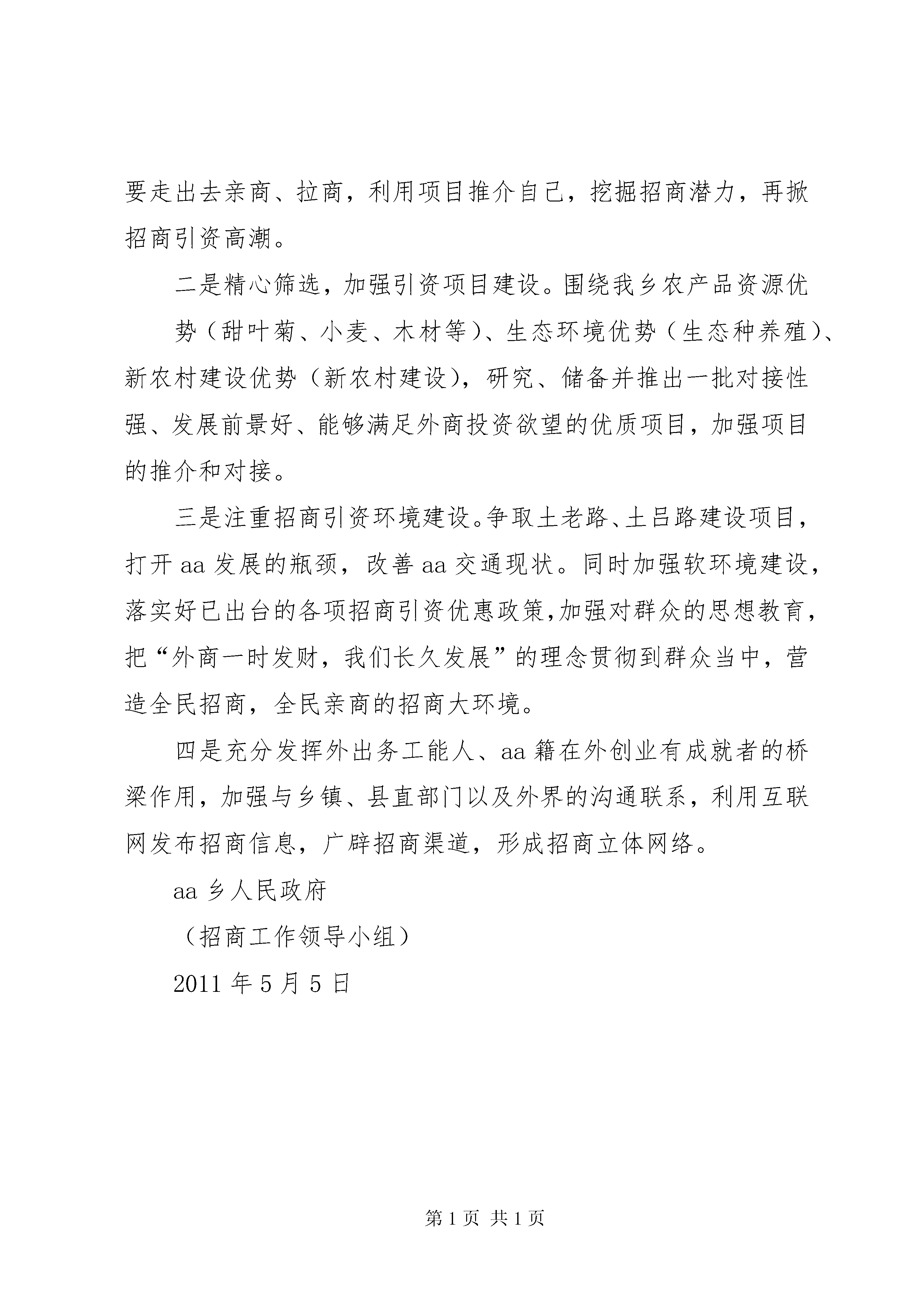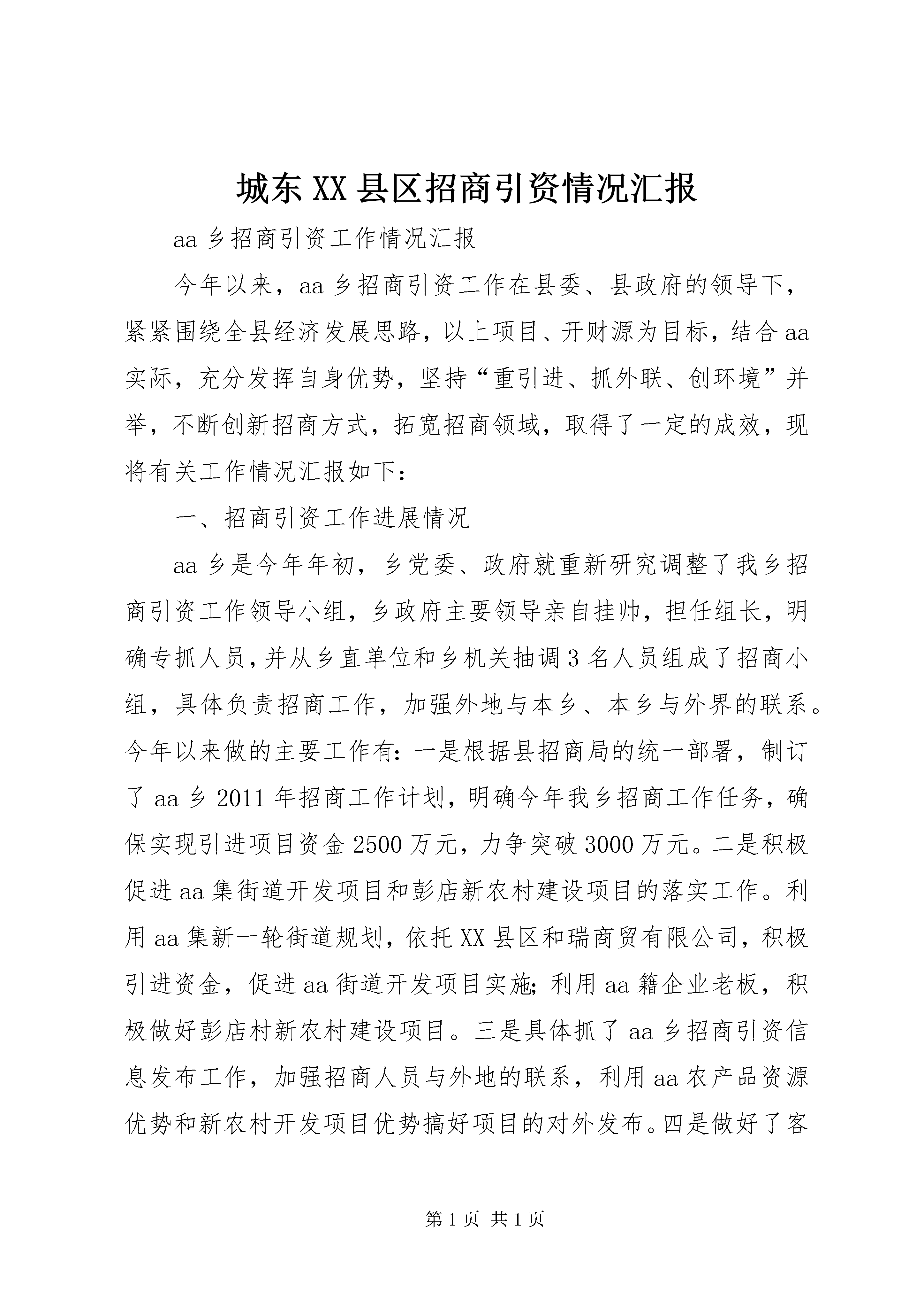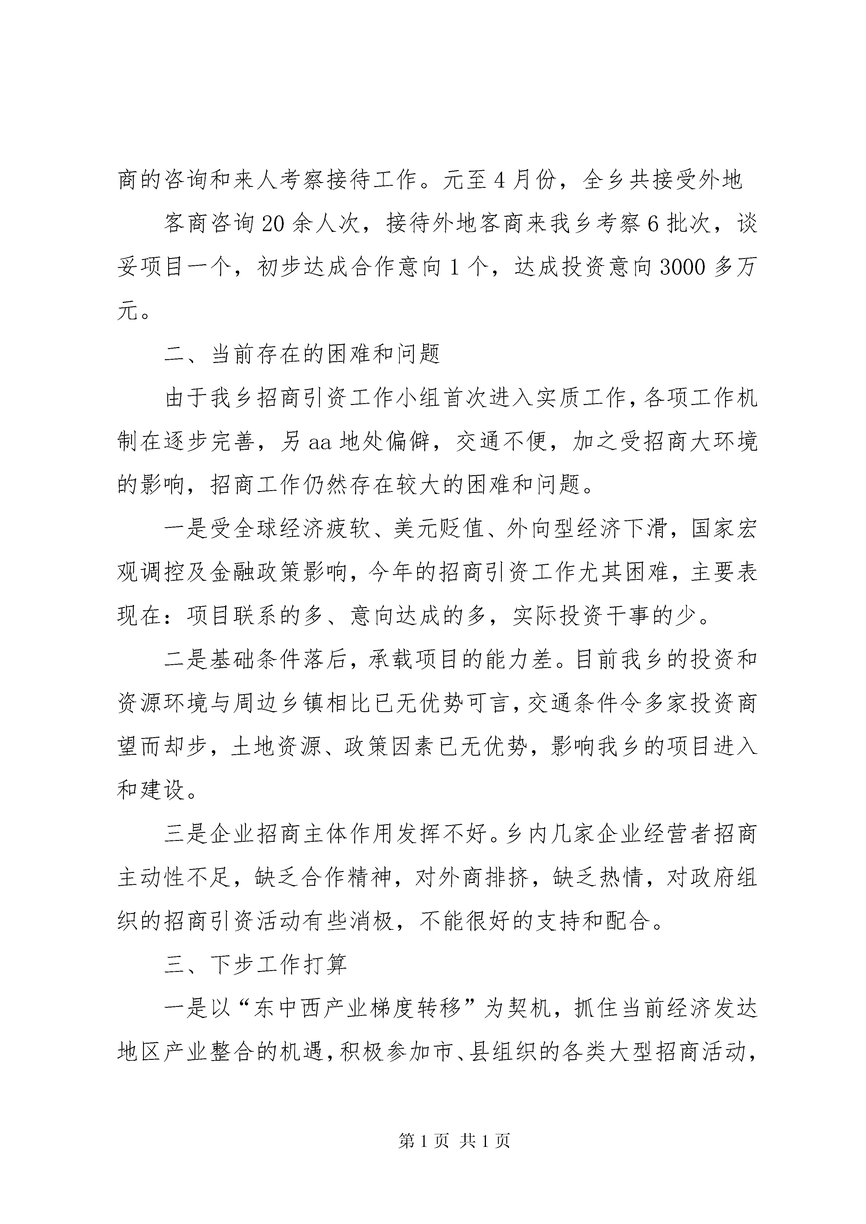 城东XX县区招商引资情况汇报aa乡招商引资工作情况汇报今年以来,aa乡招商引资工作在县委、县政府的领导下,紧紧围绕全县经济发展思路,以上项目、开财源为目标,结合aa实际,充分发挥自身优势,坚持“重引进、抓外联、创环境”并举,不断创新招商方式,拓宽招商领域,取得了一定的成效,现将有关工作情况汇报如下:一、招商引资工作进展情况aa乡是今年年初,乡党委、政府就重新研究调整了我乡招商引资工作领导小组,乡政府主要领导亲自挂帅,担任组长,明确专抓人员,并从乡直单位和乡机关抽调3名人员组成了招商小组,具体负责招商工作,加强外地与本乡、本乡与外界的联系。今年以来做的主要工作有:一是根据县招商局的统一部署,制订了aa乡2011年招商工作计划,明确今年我乡招商工作任务,确保实现引进项目资金2500万元,力争突破3000万元。二是积极促进aa集街道开发项目和彭店新农村建设项目的落实工作。利用aa集新一轮街道规划,依托XX县区和瑞商贸有限公司,积极引进资金,促进aa街道开发项目实施;利用aa籍企业老板,积极做好彭店村新农村建设项目。三是具体抓了aa乡招商引资信息发布工作,加强招商人员与外地的联系,利用aa农产品资源优势和新农村开发项目优势搞好项目的对外发布。四是做好了客商的咨询和来人考察接待工作。元至4月份,全乡共接受外地客商咨询20余人次,接待外地客商来我乡考察6批次,谈妥项目一个,初步达成合作意向1个,达成投资意向3000多万元。二、当前存在的困难和问题由于我乡招商引资工作小组首次进入实质工作,各项工作机制在逐步完善,另aa地处偏僻,交通不便,加之受招商大环境的影响,招商工作仍然存在较大的困难和问题。一是受全球经济疲软、美元贬值、外向型经济下滑,国家宏观调控及金融政策影响,今年的招商引资工作尤其困难,主要表现在:项目联系的多、意向达成的多,实际投资干事的少。二是基础条件落后,承载项目的能力差。目前我乡的投资和资源环境与周边乡镇相比已无优势可言,交通条件令多家投资商望而却步,土地资源、政策因素已无优势,影响我乡的项目进入和建设。三是企业招商主体作用发挥不好。乡内几家企业经营者招商主动性不足,缺乏合作精神,对外商排挤,缺乏热情,对政府组织的招商引资活动有些消极,不能很好的支持和配合。三、下步工作打算一是以“东中西产业梯度转移”为契机,抓住当前经济发达地区产业整合的机遇,积极参加市、县组织的各类大型招商活动,要走出去亲商、拉商,利用项目推介自己,挖掘招商潜力,再掀招商引资高潮。二是精心筛选,加强引资项目建设。围绕我乡农产品资源优势(甜叶菊、小麦、木材等)、生态环境优势(生态种养殖)、新农村建设优势(新农村建设),研究、储备并推出一批对接性强、发展前景好、能够满足外商投资欲望的优质项目,加强项目的推介和对接。三是注重招商引资环境建设。争取土老路、土吕路建设项目,打开aa发展的瓶颈,改善aa交通现状。同时加强软环境建设,落实好已出台的各项招商引资优惠政策,加强对群众的思想教育,把“外商一时发财,我们长久发展”的理念贯彻到群众当中,营造全民招商,全民亲商的招商大环境。四是充分发挥外出务工能人、aa籍在外创业有成就者的桥梁作用,加强与乡镇、县直部门以及外界的沟通联系,利用互联网发布招商信息,广辟招商渠道,形成招商立体网络。aa乡人民政府(招商工作领导小组)2011年5月5日