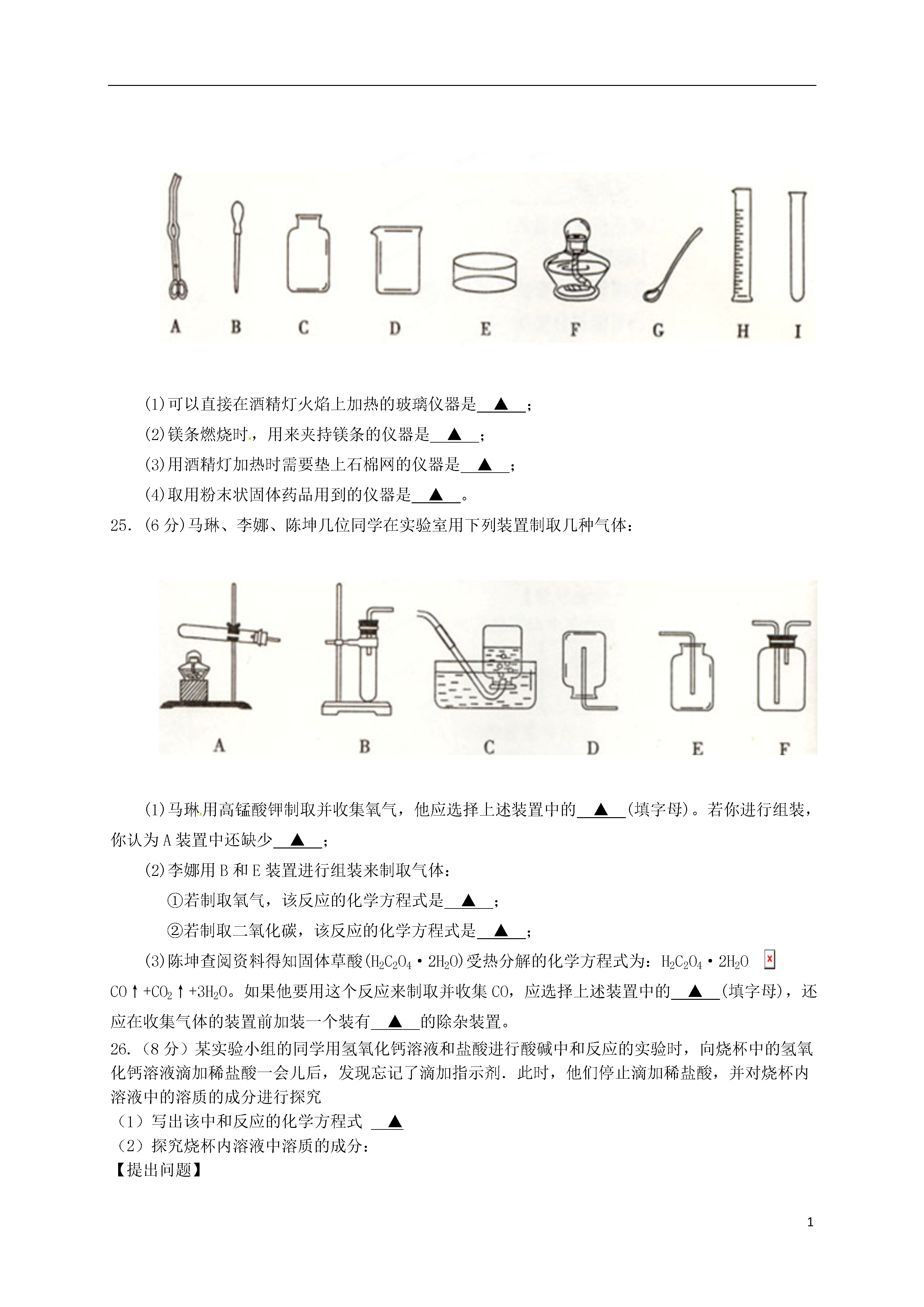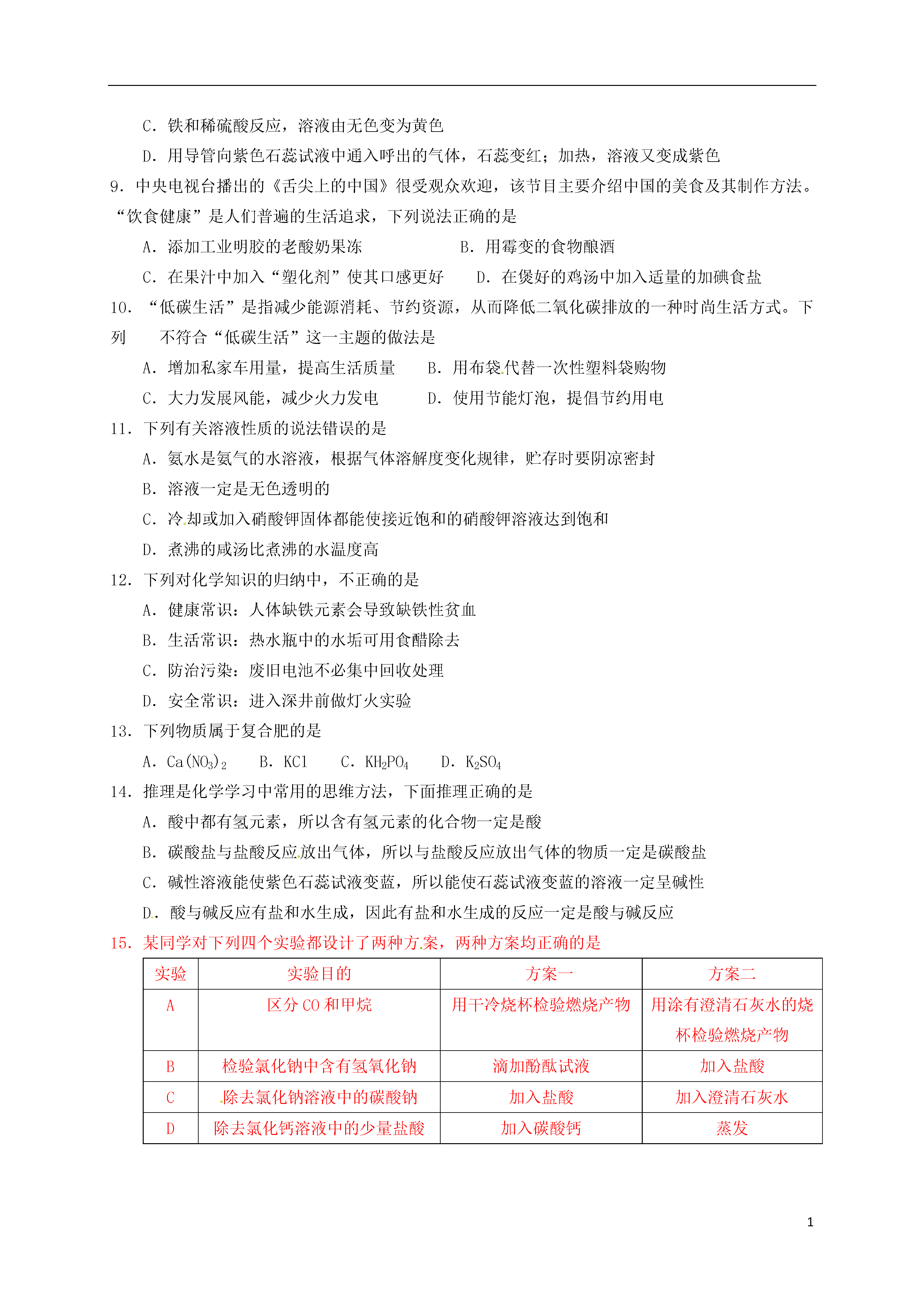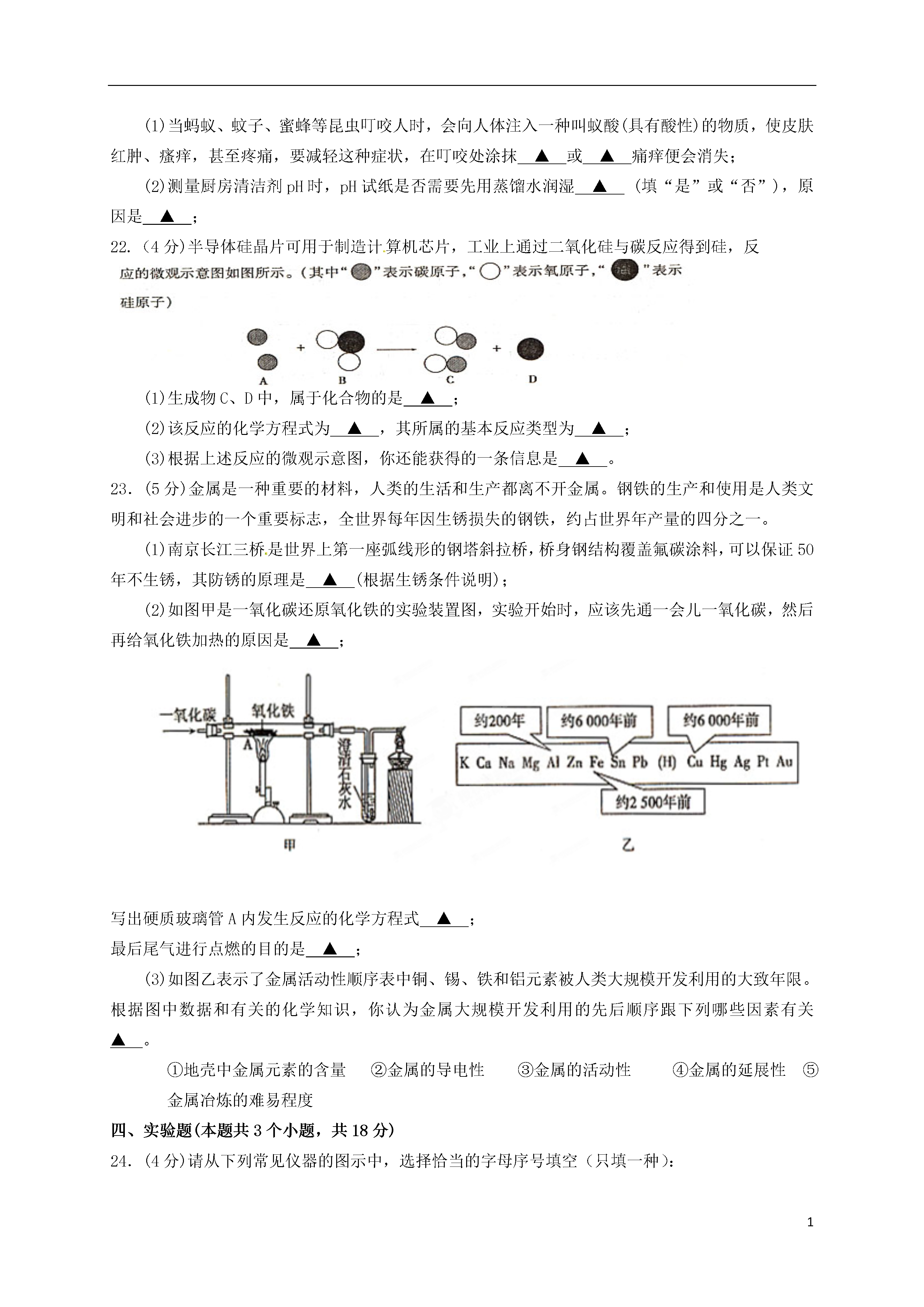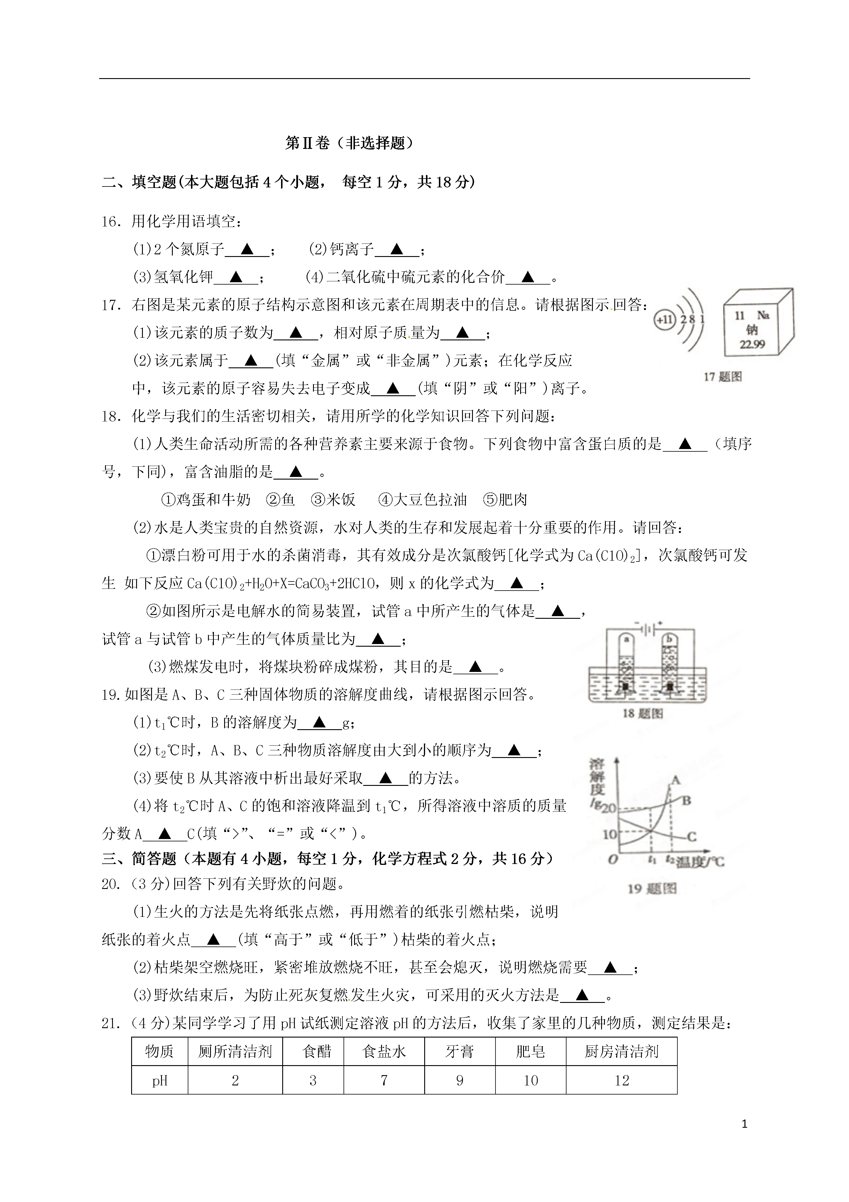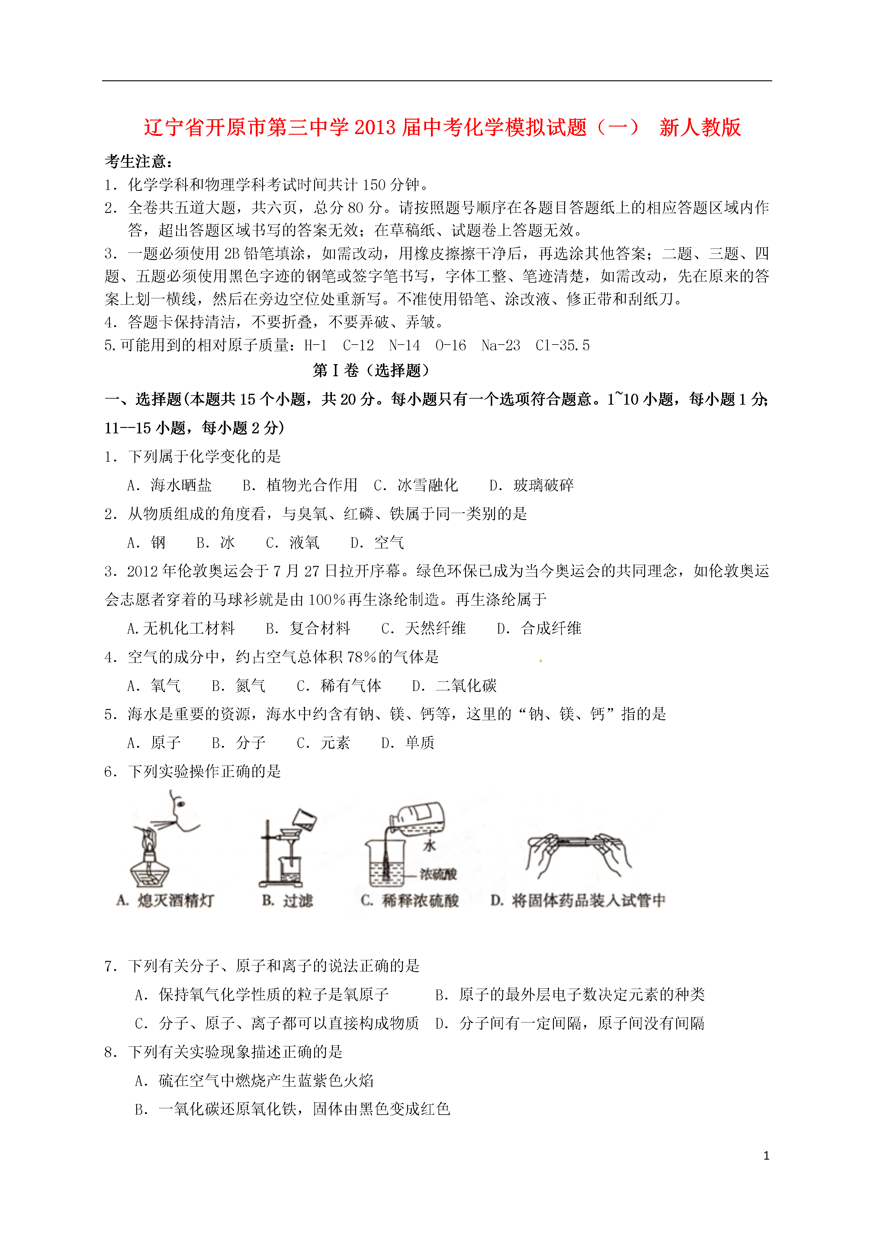 1辽宁省开原市第三中学2013届中考化学模拟试题(一)新人教版考生注意:1.化学学科和物理学科考试时间共计150分钟。2.全卷共五道大题,共六页,总分80分。请按照题号顺序在各题目答题纸上的相应答题区域内作答,超出答题区域书写的答案无效;在草稿纸、试题卷上答题无效。3.一题必须使用2B铅笔填涂,如需改动,用橡皮擦擦干净后,再选涂其他答案;二题、三题、四题、五题必须使用黑色字迹的钢笔或签字笔书写,字体工整、笔迹清楚,如需改动,先在原来的答案上划一横线,然后在旁边空位处重新写。不准使用铅笔、涂改液、修正带和刮纸刀。4.答题卡保持清洁,不要折叠,不要弄破、弄皱。5.可能用到的相对原子质量:H-1C-12N-14O-16Na-23Cl-35.5第Ⅰ卷(选择题)一、选择题(本题共15个小题,共20分。每小题只有一个选项符合题意。1~10小题,每小题1分;11--15小题,每小题2分)1.下列属于化学变化的是A.海水晒盐B.植物光合作用C.冰雪融化D.玻璃破碎2.从物质组成的角度看,与臭氧、红磷、铁属于同一类别的是A.钢B.冰C.液氧D.空气3.2012年伦敦奥运会于7月27日拉开序幕。绿色环保已成为当今奥运会的共同理念,如伦敦奥运会志愿者穿着的马球衫就是由100%再生涤纶制造。再生涤纶属于A.无机化工材料B.复合材料C.天然纤维D.合成纤维4.空气的成分中,约占空气总体积78%的气体是A.氧气B.氮气C.稀有气体D.二氧化碳5.海水是重要的资源,海水中约含有钠、镁、钙等,这里的“钠、镁、钙”指的是A.原子B.分子C.元素D.单质6.下列实验操作正确的是7.下列有关分子、原子和离子的说法正确的是A.保持氧气化学性质的粒子是氧原子B.原子的最外层电子数决定元素的种类C.分子、原子、离子都可以直接构成物质D.分子间有一定间隔,原子间没有间隔8.下列有关实验现象描述正确的是A.硫在空气中燃烧产生蓝紫色火焰B.一氧化碳还原氧化铁,固体由黑色变成红色C.铁和稀硫酸反应,溶液由无色变为黄色D.用导管向紫色石蕊试液中通入呼出的气体,石蕊变红;加热,溶液又变成紫色9.中央电视台播出的《舌尖上的中国》很受观众欢迎,该节目主要介绍中国的美食及其制作方法。“饮食健康”是人们普遍的生活追求,下列说法正确的是A.添加工业明胶的老酸奶果冻B.用霉变的食物酿酒C.在果汁中加入“塑化剂”使其口感更好D.在煲好的鸡汤中加入适量的加碘食盐10.“低碳生活”是指减少能源消耗、节约资源,从而降低二氧化碳排放的一种时尚生活方式。下列不符合“低碳生活”这一主题的做法是A.增加私家车用量,提高生活质量B.用布袋代替一次性塑料袋购物C.大力发展风能,减少火力发电D.使用节能灯泡,提倡节约用电11.下列有关溶液性质的说法错误的是A.氨水是氨气的水溶液,根据气体溶解度变化规律,贮存时要阴凉密封B.溶液一定是无色透明的C.冷却或加入硝酸钾固体都能使接近饱和的硝酸钾溶液达到饱和D.煮沸的咸汤比煮沸的水温度高12.下列对化学知识的归纳中,不正确的是A.健康常识:人体缺铁元素会导致缺铁性贫血B.生活常识:热水瓶中的水垢可用食醋除去C.防治污染:废旧电池不必集中回收处理D.安全常识:进入深井前做灯火实验13.下列物质属于复合肥的是A.Ca(NO3)2B.KClC.KH2PO4D.K2SO414.推理是化学学习中常用的思维方法,下面推理正确的是A.酸中都有氢元素,所以含有氢元素的化合物一定是酸B.碳酸盐与盐酸反应放出气体,所以与盐酸反应放出气体的物质一定是碳酸盐C.碱性溶液能使紫色石蕊试液变蓝,所以能使石蕊试液变蓝的溶液一定呈碱性D.酸与碱反应有盐和水生成,因此有盐和水生成的反应一定是酸与碱反应15.某同学对下列四个实验都设计了两种方案,两种方案均正确的是实验实验目的方案一方案二A区分CO和甲烷用干冷烧杯检验燃烧产物用涂有澄清石灰水的烧杯检验燃烧产物B检验氯化钠中含有氢氧化钠滴加酚酞试液加入盐酸C除去氯化钠溶液中的碳酸钠加入盐酸加入澄清石灰水D除去氯化钙溶液中的少量盐酸加入碳酸钙蒸发第Ⅱ卷(非选择题)二、填空题(本大题包括4个小题,每空1分,共18分)16.用化学用语填空:(1)2个氮原子▲;(2)钙离子▲;(3)氢氧化钾▲;(4)二氧化硫中硫元素的化合价▲。17.右图是某元素的原子结构示意图和该元素在周期表中的信息。请根据图示回答:(1)该元素的质子数为▲,相对原子质量为▲;(2)该元素属于▲(填“金属”或“非金属”)元素;在化学反应中,该元素的原子容易失去电子变成▲(填“阴”或“阳”)离子。l8.化学与我们的生活密切相关,请用所学的化学知识回答下列问题: