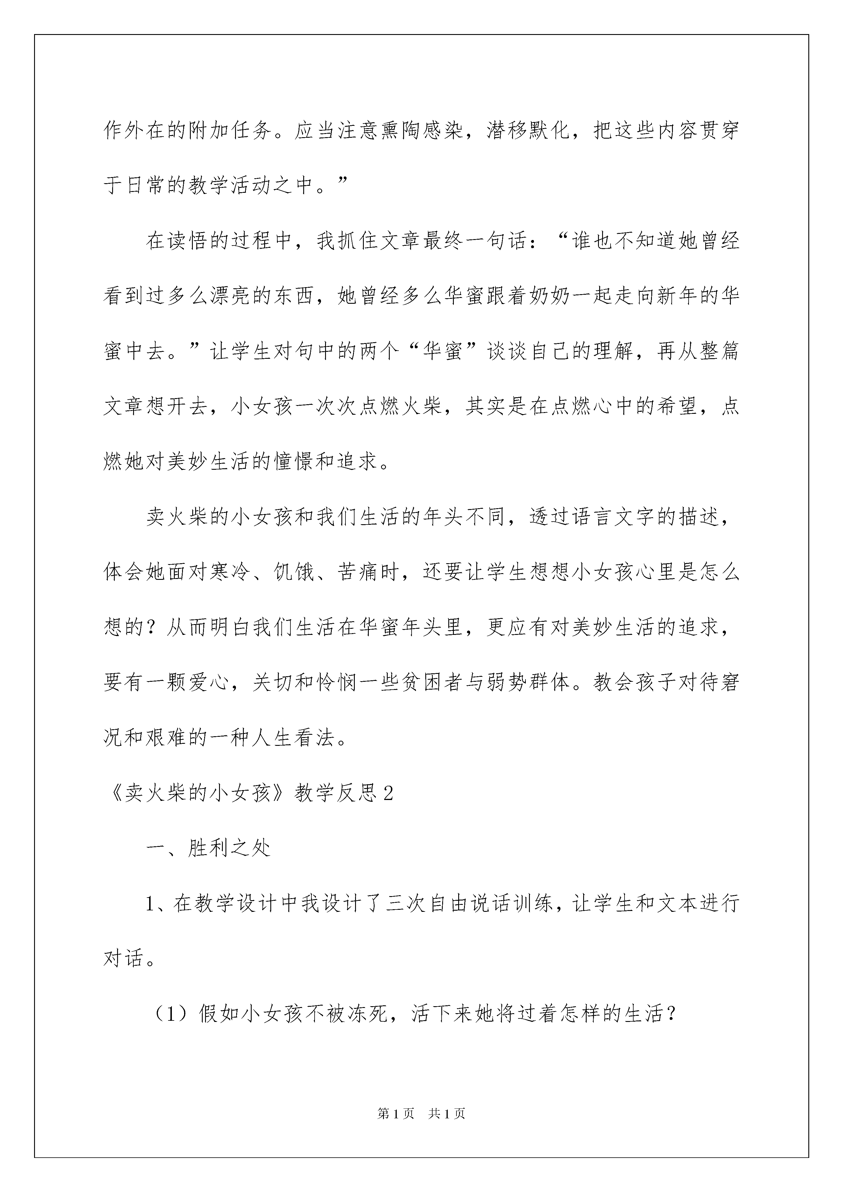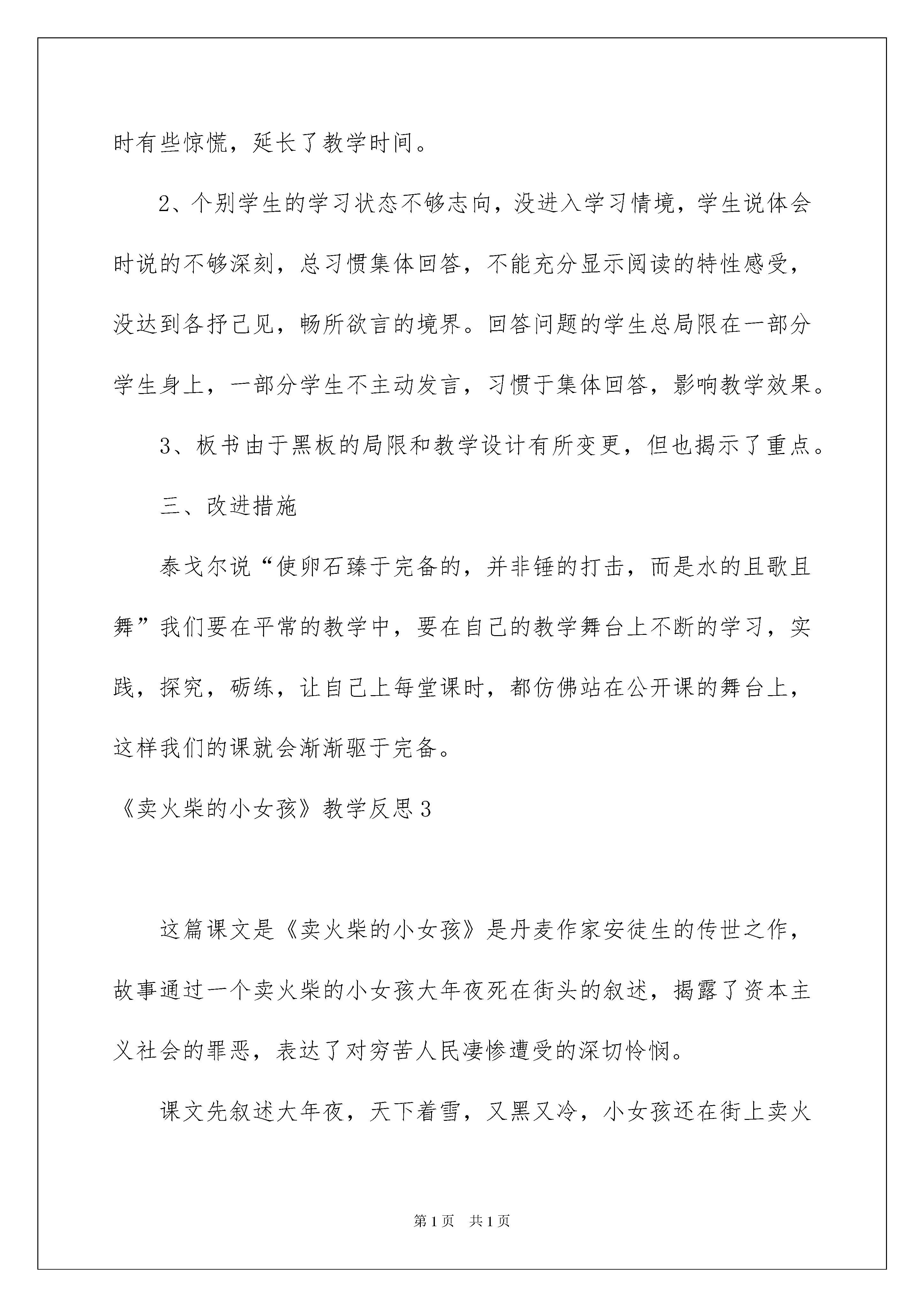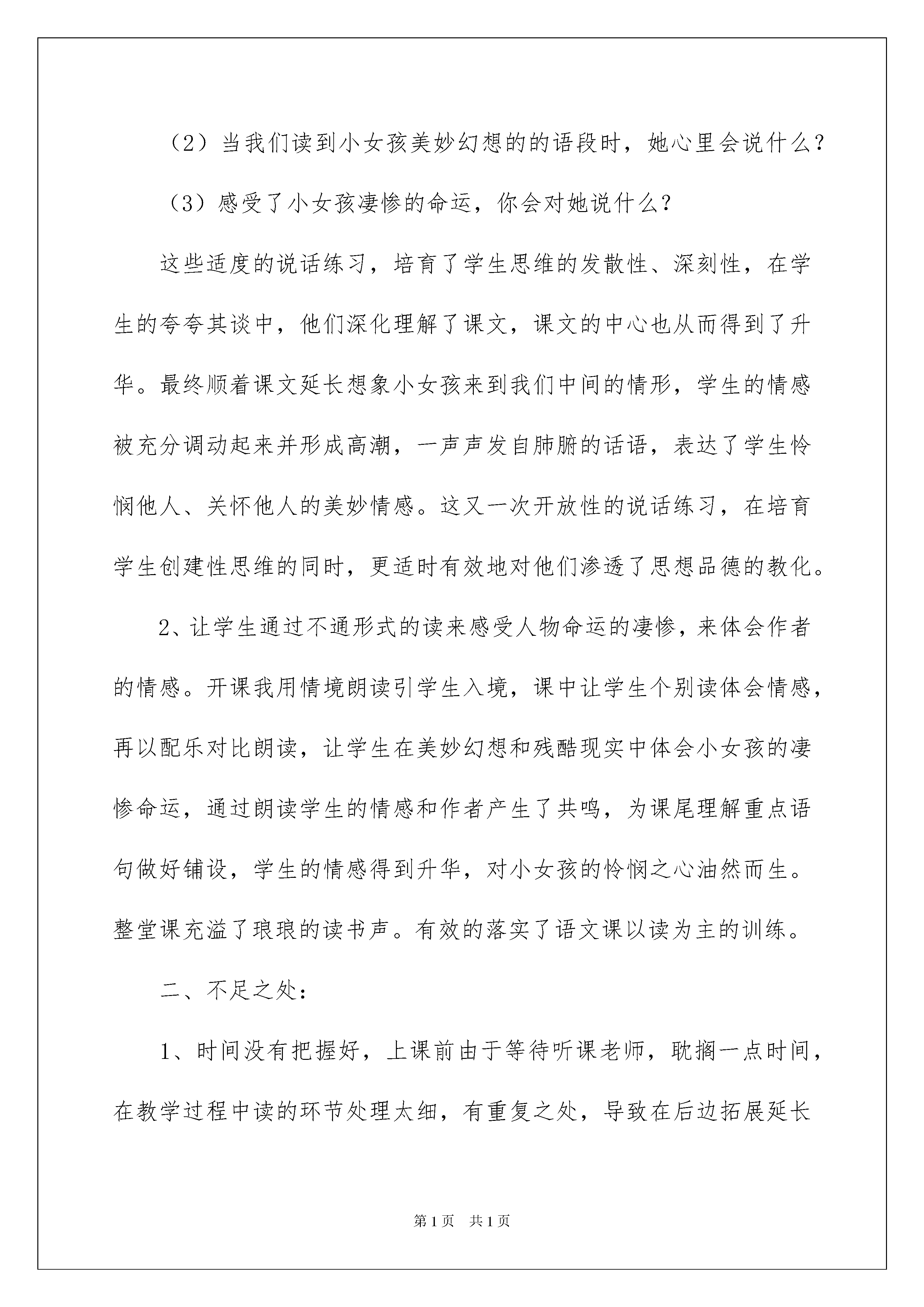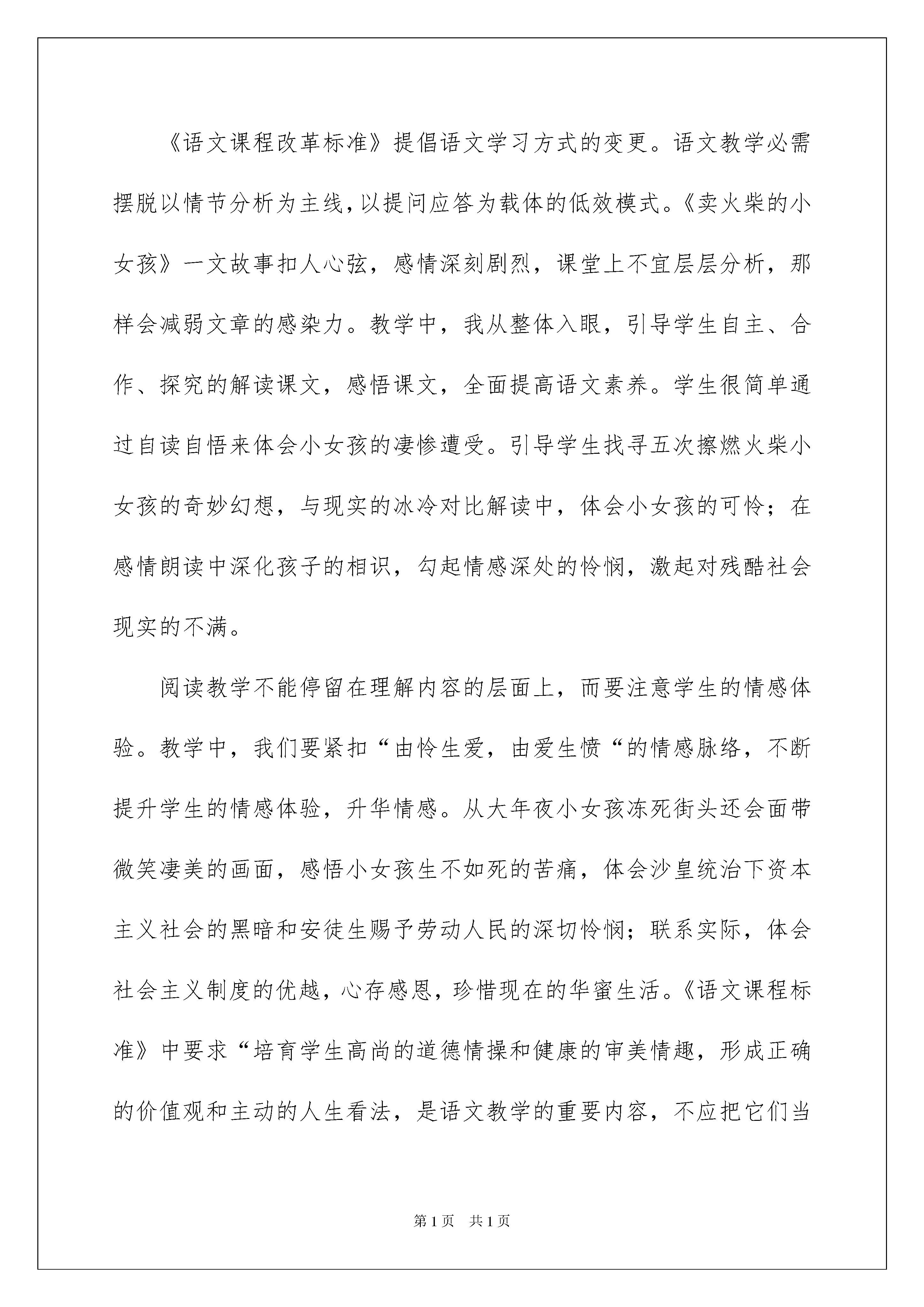 2022《卖火柴的小女孩》教学反思《卖火柴的小女孩》教学反思身为一名刚到岗的人民老师,我们要有一流的课堂教学实力,写教学反思能总结教学过程中的许多讲课技巧,那么什么样的教学反思才是好的呢?以下是我为大家收集的《卖火柴的小女孩》教学反思,仅供参考,欢迎大家阅读。《卖火柴的小女孩》教学反思1丹麦作家安徒生的凄美童话《卖火柴的小女孩》,讲解并描述了一个卖火柴的小女孩大年夜冻死在街头的故事。大年夜里天又黑又冷,下着雪,当我们和一家人一起吃团聚饭的时候,而这个赤着脚在街上卖火柴的小女孩,为了温煦自己,一次次擦亮手中的火柴,在火柴的亮光中看到了温煦的烤炉,喷香的烤鹅,漂亮的圣诞树,慈爱的奶奶,直到跟奶奶一起飞走。她死了,在旧年的大年夜冻死了,嘴角还带着微笑。小女孩的凄惨命运深深地牵动着我们的心,漂亮和善的小女孩冻死街头却无人问津,可见当时的社会是多么冷漠,劳苦人民的生活是多么凄惨!《语文课程改革标准》提倡语文学习方式的变更。语文教学必需摆脱以情节分析为主线,以提问应答为载体的低效模式。《卖火柴的小女孩》一文故事扣人心弦,感情深刻剧烈,课堂上不宜层层分析,那样会减弱文章的感染力。教学中,我从整体入眼,引导学生自主、合作、探究的解读课文,感悟课文,全面提高语文素养。学生很简单通过自读自悟来体会小女孩的凄惨遭受。引导学生找寻五次擦燃火柴小女孩的奇妙幻想,与现实的冰冷对比解读中,体会小女孩的可怜;在感情朗读中深化孩子的相识,勾起情感深处的怜悯,激起对残酷社会现实的不满。阅读教学不能停留在理解内容的层面上,而要注意学生的情感体验。教学中,我们要紧扣“由怜生爱,由爱生愤“的情感脉络,不断提升学生的情感体验,升华情感。从大年夜小女孩冻死街头还会面带微笑凄美的画面,感悟小女孩生不如死的苦痛,体会沙皇统治下资本主义社会的黑暗和安徒生赐予劳动人民的深切怜悯;联系实际,体会社会主义制度的优越,心存感恩,珍惜现在的华蜜生活。《语文课程标准》中要求“培育学生高尚的道德情操和健康的审美情趣,形成正确的价值观和主动的人生看法,是语文教学的重要内容,不应把它们当作外在的附加任务。应当注意熏陶感染,潜移默化,把这些内容贯穿于日常的教学活动之中。”在读悟的过程中,我抓住文章最终一句话:“谁也不知道她曾经看到过多么漂亮的东西,她曾经多么华蜜跟着奶奶一起走向新年的华蜜中去。”让学生对句中的两个“华蜜”谈谈自己的理解,再从整篇文章想开去,小女孩一次次点燃火柴,其实是在点燃心中的希望,点燃她对美妙生活的憧憬和追求。卖火柴的小女孩和我们生活的年头不同,透过语言文字的描述,体会她面对寒冷、饥饿、苦痛时,还要让学生想想小女孩心里是怎么想的?从而明白我们生活在华蜜年头里,更应有对美妙生活的追求,要有一颗爱心,关切和怜悯一些贫困者与弱势群体。教会孩子对待窘况和艰难的一种人生看法。《卖火柴的小女孩》教学反思2一、胜利之处1、在教学设计中我设计了三次自由说话训练,让学生和文本进行对话。(1)假如小女孩不被冻死,活下来她将过着怎样的生活?(2)当我们读到小女孩美妙幻想的的语段时,她心里会说什么?(3)感受了小女孩凄惨的命运,你会对她说什么?这些适度的说话练习,培育了学生思维的发散性、深刻性,在学生的夸夸其谈中,他们深化理解了课文,课文的中心也从而得到了升华。最终顺着课文延长想象小女孩来到我们中间的情形,学生的情感被充分调动起来并形成高潮,一声声发自肺腑的话语,表达了学生怜悯他人、关怀他人的美妙情感。这又一次开放性的说话练习,在培育学生创建性思维的同时,更适时有效地对他们渗透了思想品德的教化。2、让学生通过不通形式的读来感受人物命运的凄惨,来体会作者的情感。开课我用情境朗读引学生入境,课中让学生个别读体会情感,再以配乐对比朗读,让学生在美妙幻想和残酷现实中体会小女孩的凄惨命运,通过朗读学生的情感和作者产生了共鸣,为课尾理解重点语句做好铺设,学生的情感得到升华,对小女孩的怜悯之心油然而生。整堂课充溢了琅琅的读书声。有效的落实了语文课以读为主的训练。二、不足之处:1、时间没有把握好,上课前由于等待听课老师,耽搁一点时间,在教学过程中读的环节处理太细,有重复之处,导致在后边拓展延长时有些惊慌,延长了教学时间。2、个别学生的学习状态不够志向,没进入学习情境,学生说体会时说的不够深刻,总习惯集体回答,不能充分显示阅读的特性感受,没达到各抒己见,畅所欲言的境界。回答问题的学生总局限在一部分学生身上,一部分学生不主动发言,习惯于集体回答,影响教学效果。3、板书由于黑板的局限和教学设计有所变更,但也揭示了重点。三、改进措施泰戈尔说“使卵石臻于完备的,并非锤的打