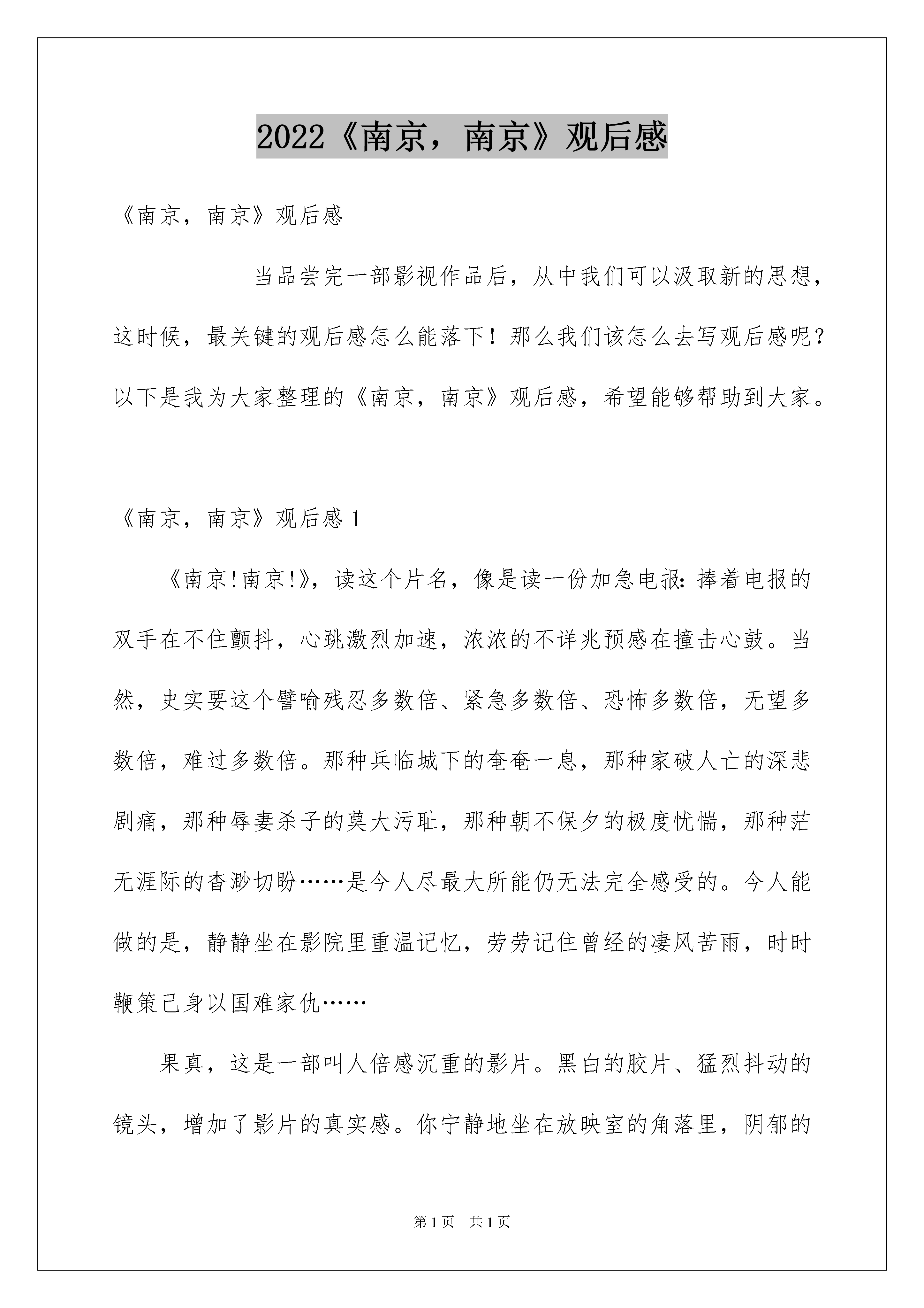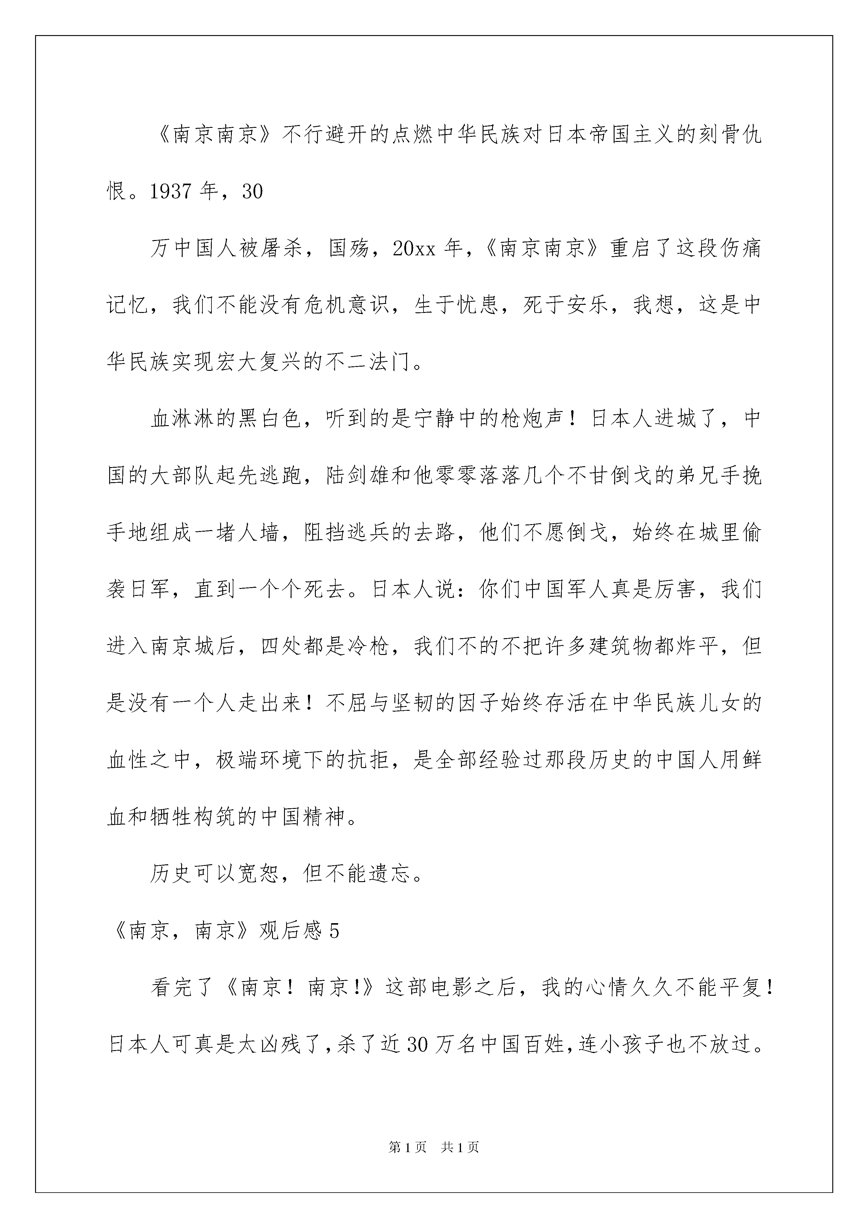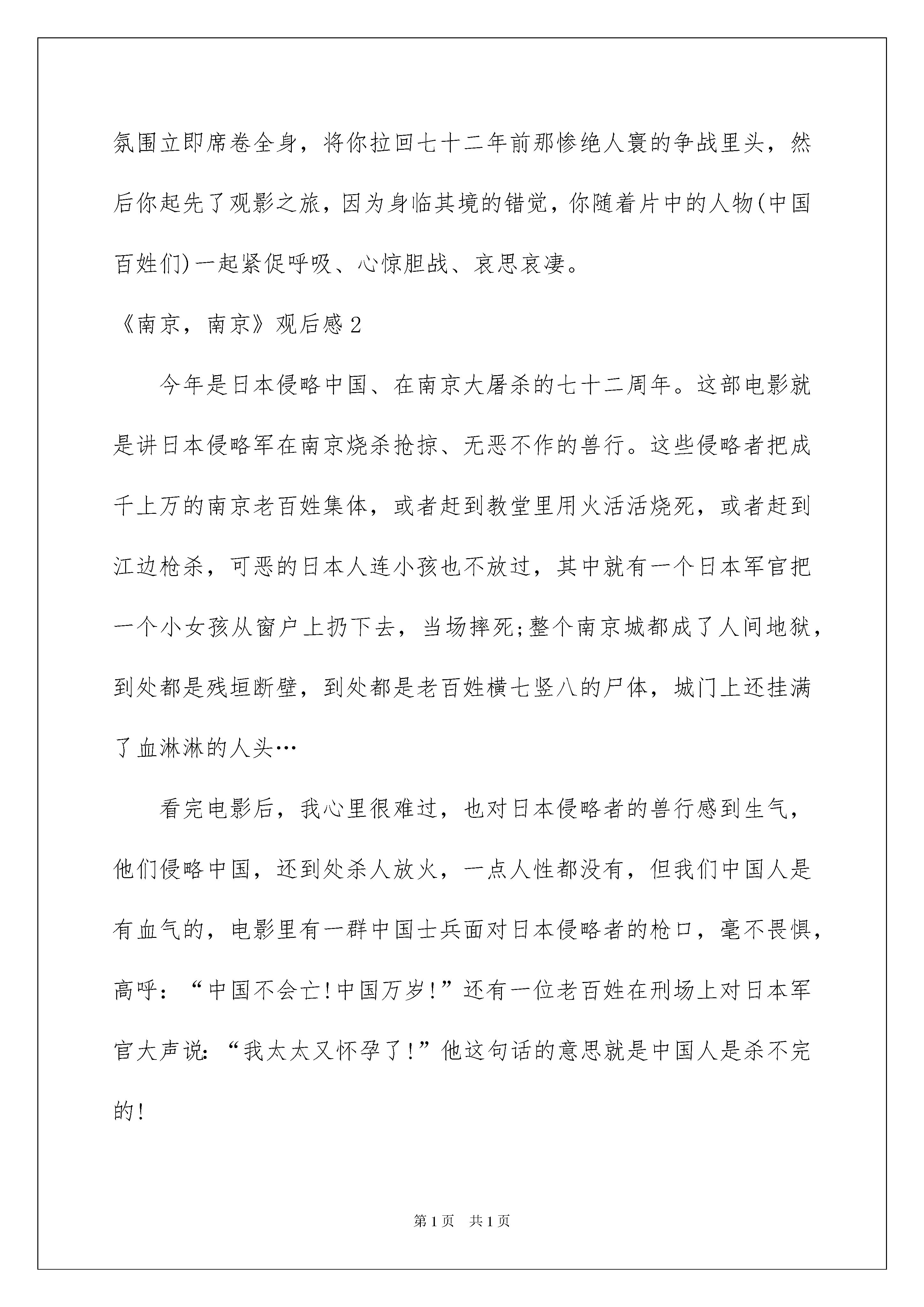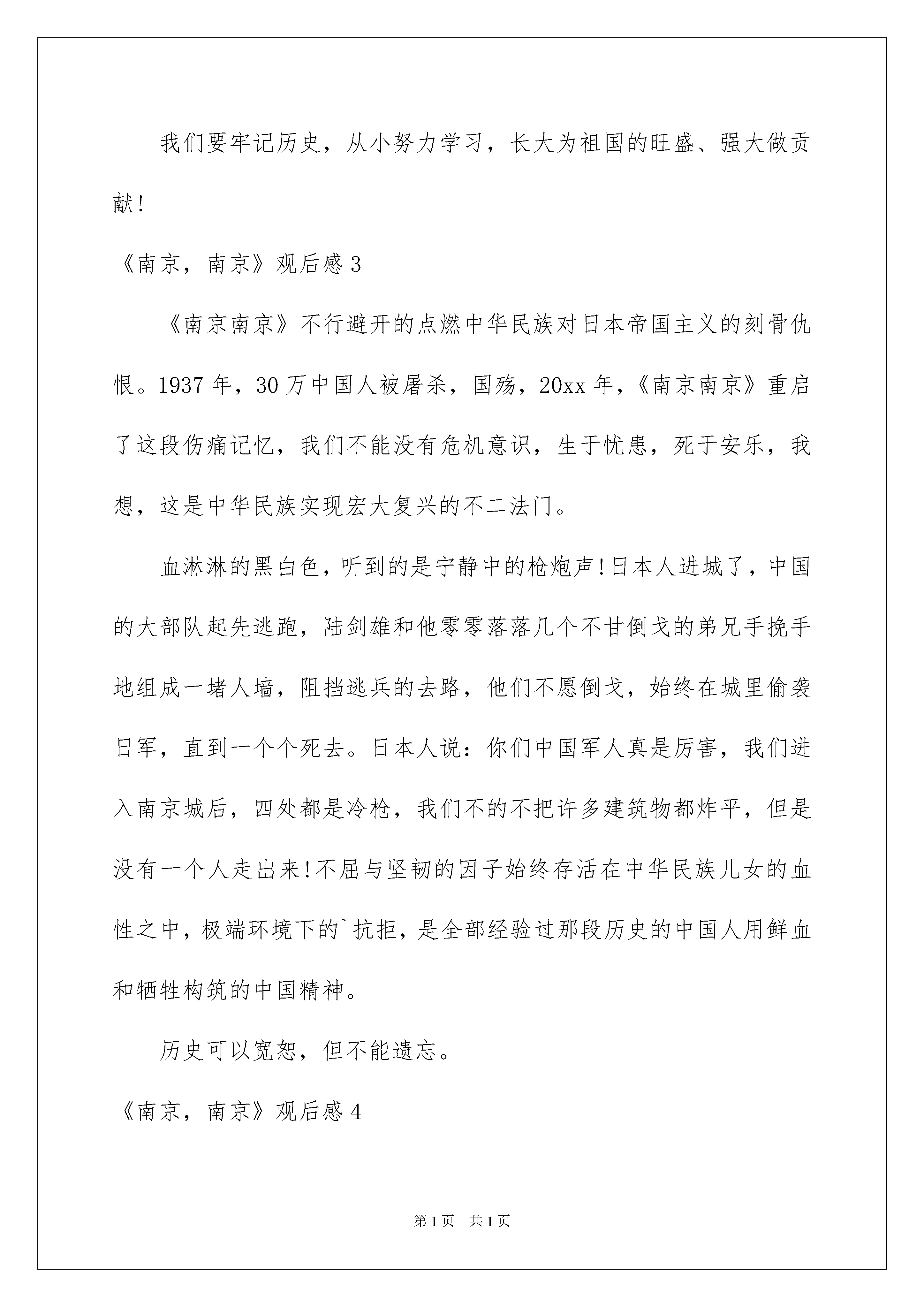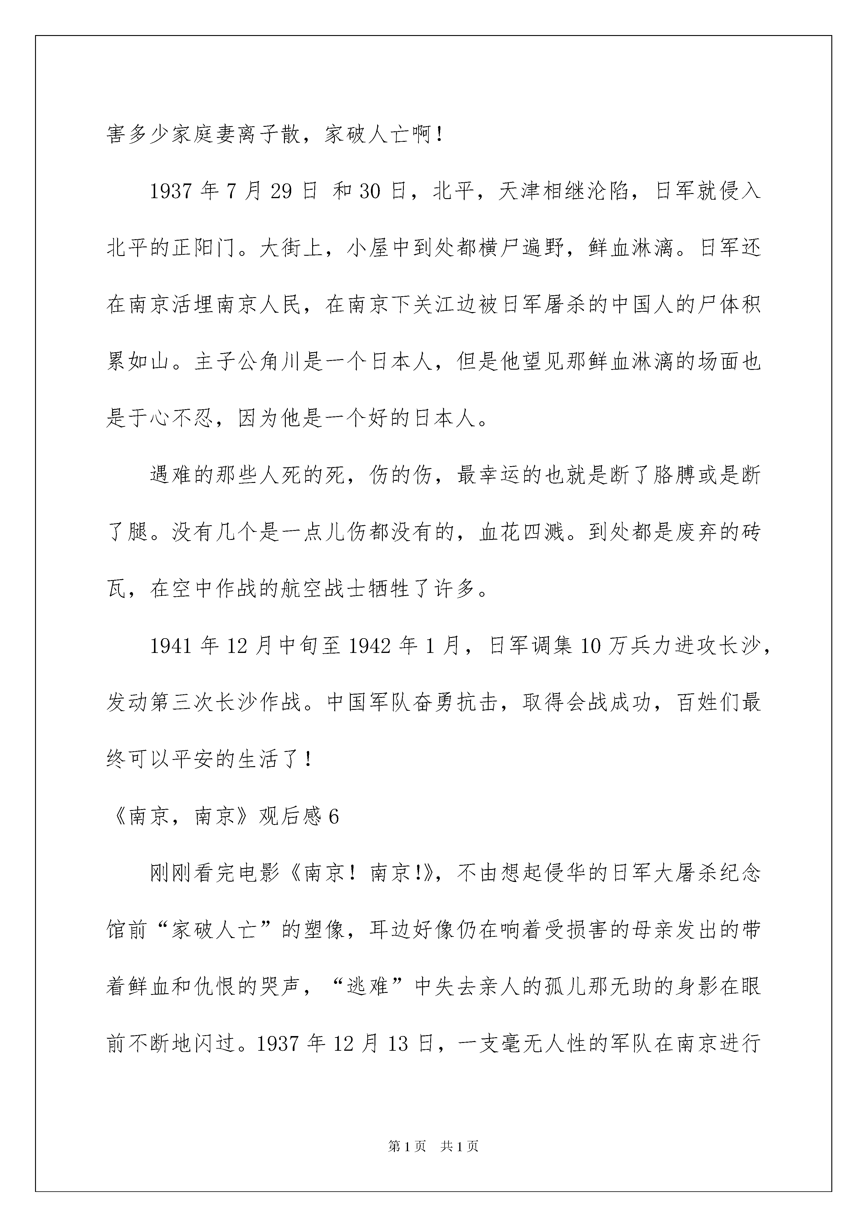 2022《南京,南京》观后感《南京,南京》观后感当品尝完一部影视作品后,从中我们可以汲取新的思想,这时候,最关键的观后感怎么能落下!那么我们该怎么去写观后感呢?以下是我为大家整理的《南京,南京》观后感,希望能够帮助到大家。《南京,南京》观后感1《南京!南京!》,读这个片名,像是读一份加急电报:捧着电报的双手在不住颤抖,心跳激烈加速,浓浓的不详兆预感在撞击心鼓。当然,史实要这个譬喻残忍多数倍、紧急多数倍、恐怖多数倍,无望多数倍,难过多数倍。那种兵临城下的奄奄一息,那种家破人亡的深悲剧痛,那种辱妻杀子的莫大污耻,那种朝不保夕的极度忧惴,那种茫无涯际的杳渺切盼……是今人尽最大所能仍无法完全感受的。今人能做的是,静静坐在影院里重温记忆,劳劳记住曾经的凄风苦雨,时时鞭策己身以国难家仇……果真,这是一部叫人倍感沉重的影片。黑白的胶片、猛烈抖动的镜头,增加了影片的真实感。你宁静地坐在放映室的角落里,阴郁的氛围立即席卷全身,将你拉回七十二年前那惨绝人寰的争战里头,然后你起先了观影之旅,因为身临其境的错觉,你随着片中的人物(中国百姓们)一起紧促呼吸、心惊胆战、哀思哀凄。《南京,南京》观后感2今年是日本侵略中国、在南京大屠杀的七十二周年。这部电影就是讲日本侵略军在南京烧杀抢掠、无恶不作的兽行。这些侵略者把成千上万的南京老百姓集体,或者赶到教堂里用火活活烧死,或者赶到江边枪杀,可恶的日本人连小孩也不放过,其中就有一个日本军官把一个小女孩从窗户上扔下去,当场摔死;整个南京城都成了人间地狱,到处都是残垣断壁,到处都是老百姓横七竖八的尸体,城门上还挂满了血淋淋的人头…看完电影后,我心里很难过,也对日本侵略者的兽行感到生气,他们侵略中国,还到处杀人放火,一点人性都没有,但我们中国人是有血气的,电影里有一群中国士兵面对日本侵略者的枪口,毫不畏惧,高呼:“中国不会亡!中国万岁!”还有一位老百姓在刑场上对日本军官大声说:“我太太又怀孕了!”他这句话的意思就是中国人是杀不完的!我们要牢记历史,从小努力学习,长大为祖国的旺盛、强大做贡献!《南京,南京》观后感3《南京南京》不行避开的点燃中华民族对日本帝国主义的刻骨仇恨。1937年,30万中国人被屠杀,国殇,20xx年,《南京南京》重启了这段伤痛记忆,我们不能没有危机意识,生于忧患,死于安乐,我想,这是中华民族实现宏大复兴的不二法门。血淋淋的黑白色,听到的是宁静中的枪炮声!日本人进城了,中国的大部队起先逃跑,陆剑雄和他零零落落几个不甘倒戈的弟兄手挽手地组成一堵人墙,阻挡逃兵的去路,他们不愿倒戈,始终在城里偷袭日军,直到一个个死去。日本人说:你们中国军人真是厉害,我们进入南京城后,四处都是冷枪,我们不的不把许多建筑物都炸平,但是没有一个人走出来!不屈与坚韧的因子始终存活在中华民族儿女的血性之中,极端环境下的`抗拒,是全部经验过那段历史的中国人用鲜血和牺牲构筑的中国精神。历史可以宽恕,但不能遗忘。《南京,南京》观后感4《南京南京》不行避开的点燃中华民族对日本帝国主义的刻骨仇恨。1937年,30万中国人被屠杀,国殇,20xx年,《南京南京》重启了这段伤痛记忆,我们不能没有危机意识,生于忧患,死于安乐,我想,这是中华民族实现宏大复兴的不二法门。血淋淋的黑白色,听到的是宁静中的枪炮声!日本人进城了,中国的大部队起先逃跑,陆剑雄和他零零落落几个不甘倒戈的弟兄手挽手地组成一堵人墙,阻挡逃兵的去路,他们不愿倒戈,始终在城里偷袭日军,直到一个个死去。日本人说:你们中国军人真是厉害,我们进入南京城后,四处都是冷枪,我们不的不把许多建筑物都炸平,但是没有一个人走出来!不屈与坚韧的因子始终存活在中华民族儿女的血性之中,极端环境下的抗拒,是全部经验过那段历史的中国人用鲜血和牺牲构筑的中国精神。历史可以宽恕,但不能遗忘。《南京,南京》观后感5看完了《南京!南京!》这部电影之后,我的心情久久不能平复!日本人可真是太凶残了,杀了近30万名中国百姓,连小孩子也不放过。害多少家庭妻离子散,家破人亡啊!1937年7月29日和30日,北平,天津相继沦陷,日军就侵入北平的正阳门。大街上,小屋中到处都横尸遍野,鲜血淋漓。日军还在南京活埋南京人民,在南京下关江边被日军屠杀的中国人的尸体积累如山。主子公角川是一个日本人,但是他望见那鲜血淋漓的场面也是于心不忍,因为他是一个好的日本人。遇难的那些人死的死,伤的伤,最幸运的也就是断了胳膊或是断了腿。没有几个是一点儿伤都没有的,血花四溅。到处都是废弃的砖瓦,在空中作战的航空战士牺牲了许多。1941年12月中旬至1942年1月,日军调集10万兵力进攻长沙,发动第三次长沙