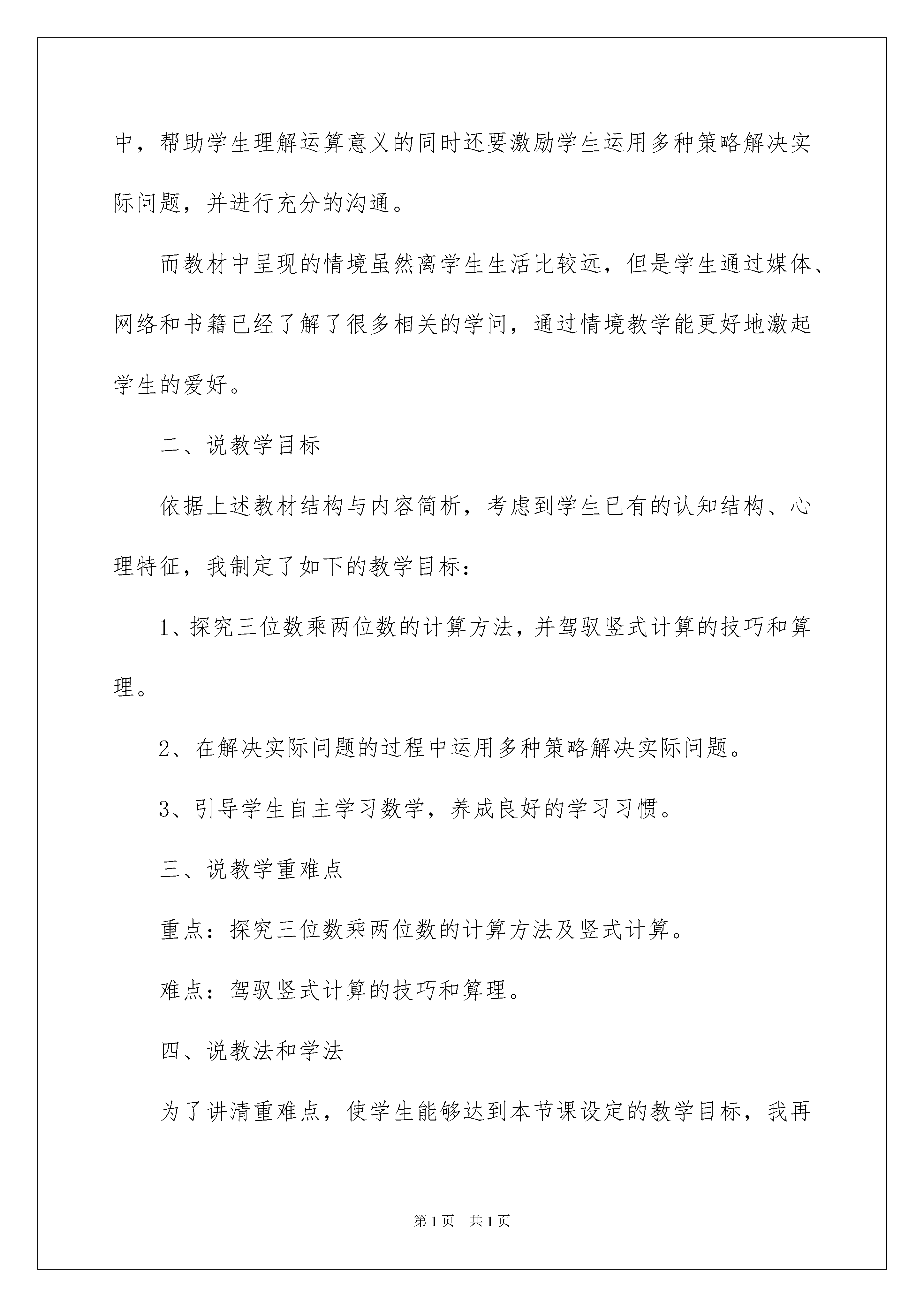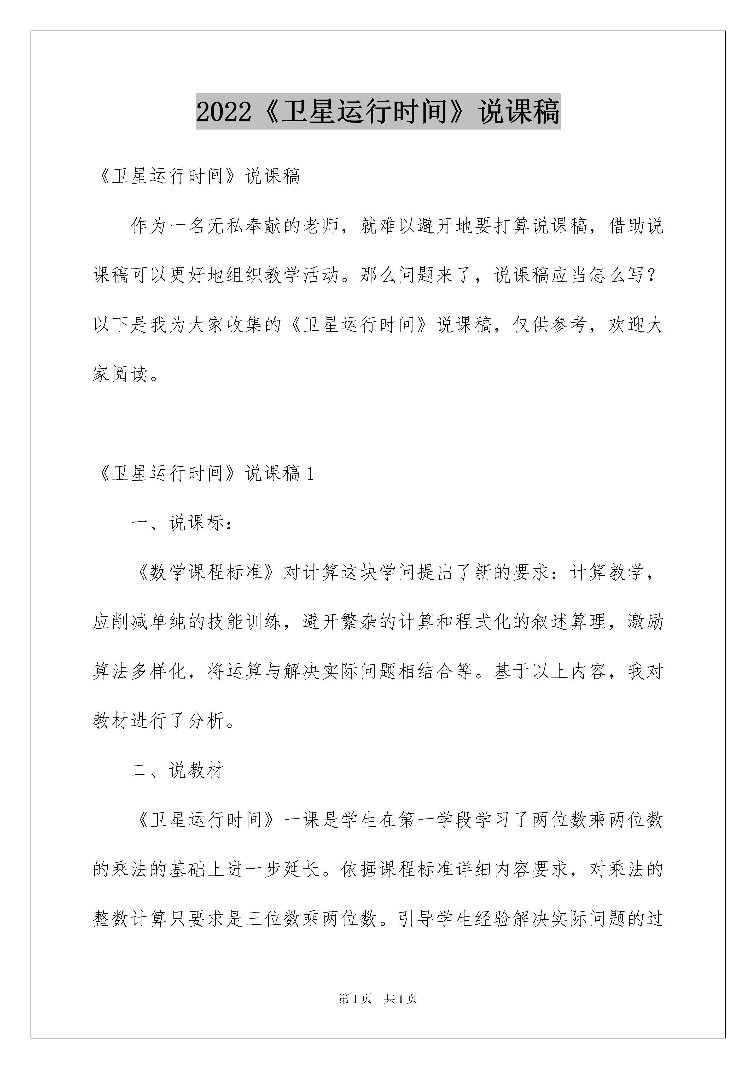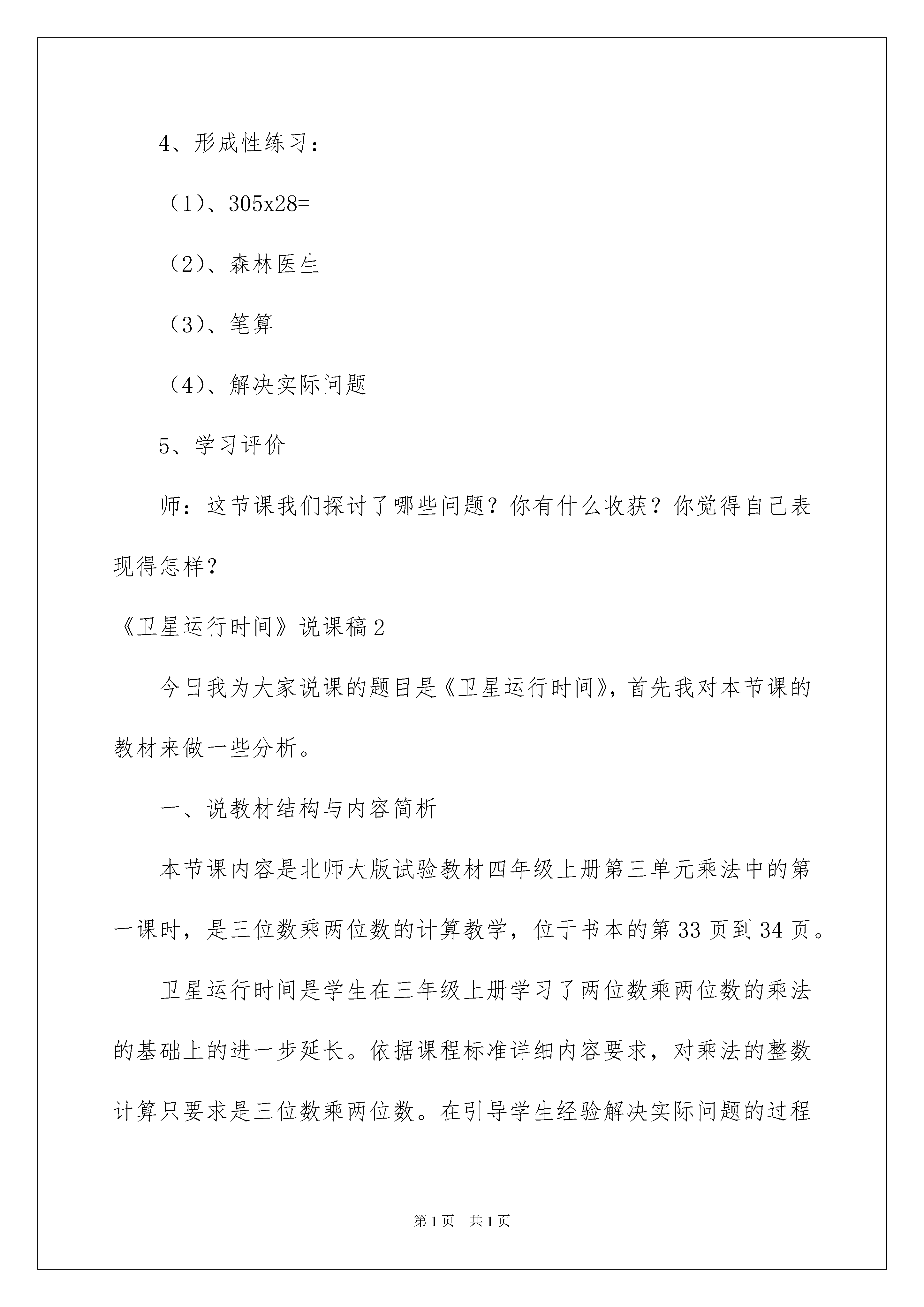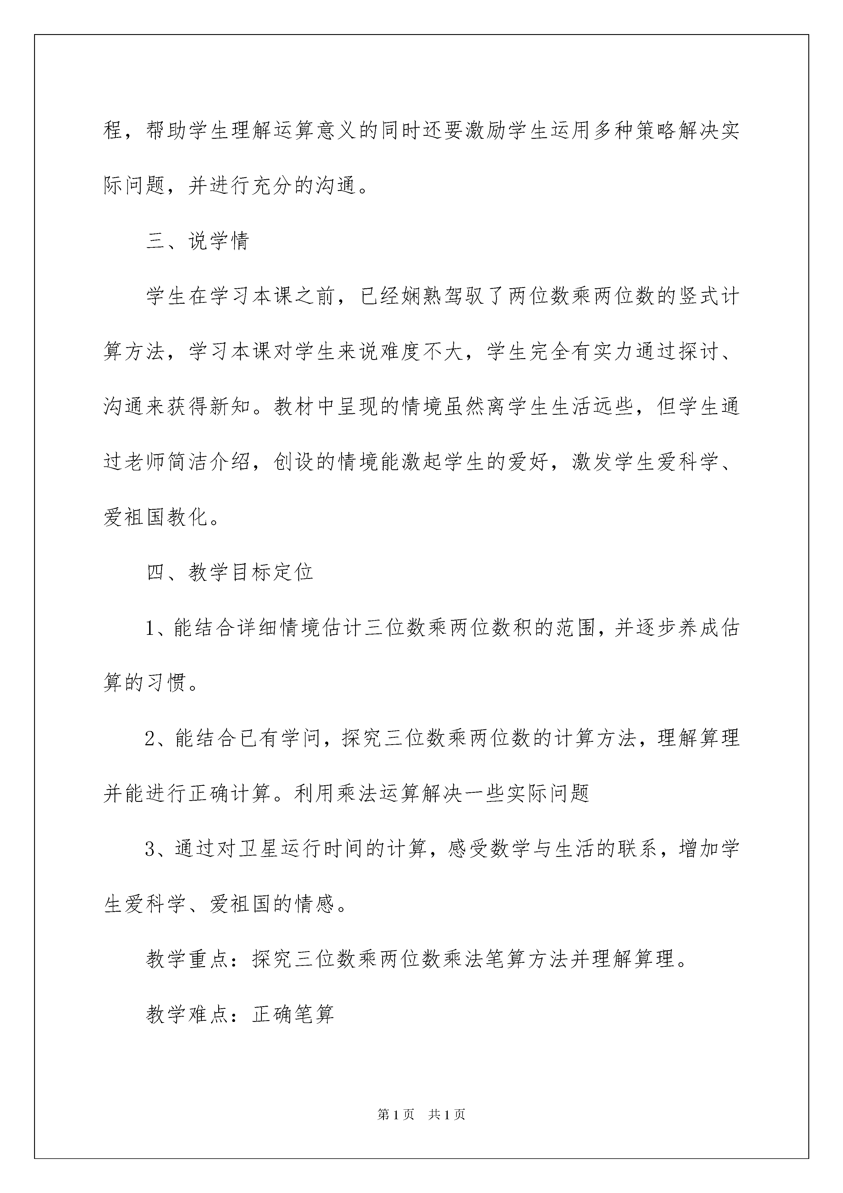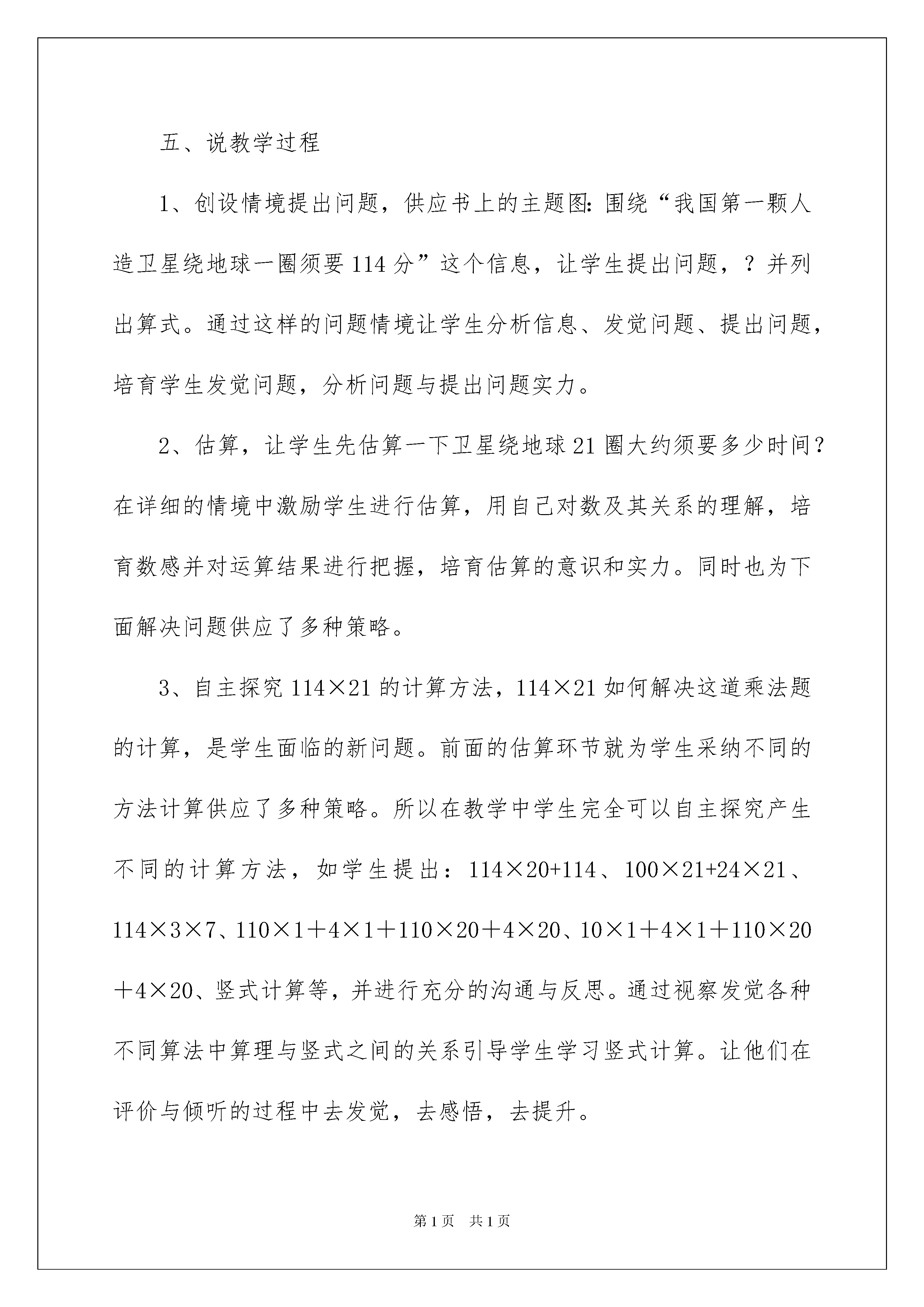 2022《卫星运行时间》说课稿《卫星运行时间》说课稿作为一名无私奉献的老师,就难以避开地要打算说课稿,借助说课稿可以更好地组织教学活动。那么问题来了,说课稿应当怎么写?以下是我为大家收集的《卫星运行时间》说课稿,仅供参考,欢迎大家阅读。《卫星运行时间》说课稿1一、说课标:《数学课程标准》对计算这块学问提出了新的要求:计算教学,应削减单纯的技能训练,避开繁杂的计算和程式化的叙述算理,激励算法多样化,将运算与解决实际问题相结合等。基于以上内容,我对教材进行了分析。二、说教材《卫星运行时间》一课是学生在第一学段学习了两位数乘两位数的乘法的基础上进一步延长。依据课程标准详细内容要求,对乘法的整数计算只要求是三位数乘两位数。引导学生经验解决实际问题的过程,帮助学生理解运算意义的同时还要激励学生运用多种策略解决实际问题,并进行充分的沟通。三、说学情学生在学习本课之前,已经娴熟驾驭了两位数乘两位数的竖式计算方法,学习本课对学生来说难度不大,学生完全有实力通过探讨、沟通来获得新知。教材中呈现的情境虽然离学生生活远些,但学生通过老师简洁介绍,创设的情境能激起学生的爱好,激发学生爱科学、爱祖国教化。四、教学目标定位1、能结合详细情境估计三位数乘两位数积的范围,并逐步养成估算的习惯。2、能结合已有学问,探究三位数乘两位数的计算方法,理解算理并能进行正确计算。利用乘法运算解决一些实际问题3、通过对卫星运行时间的计算,感受数学与生活的联系,增加学生爱科学、爱祖国的情感。教学重点:探究三位数乘两位数乘法笔算方法并理解算理。教学难点:正确笔算五、说教学过程1、创设情境提出问题,供应书上的主题图:围绕“我国第一颗人造卫星绕地球一圈须要114分”这个信息,让学生提出问题,?并列出算式。通过这样的问题情境让学生分析信息、发觉问题、提出问题,培育学生发觉问题,分析问题与提出问题实力。2、估算,让学生先估算一下卫星绕地球21圈大约须要多少时间?在详细的情境中激励学生进行估算,用自己对数及其关系的理解,培育数感并对运算结果进行把握,培育估算的意识和实力。同时也为下面解决问题供应了多种策略。3、自主探究114×21的计算方法,114×21如何解决这道乘法题的计算,是学生面临的新问题。前面的估算环节就为学生采纳不同的方法计算供应了多种策略。所以在教学中学生完全可以自主探究产生不同的计算方法,如学生提出:114×20+114、100×21+24×21、114×3×7、110×1+4×1+110×20+4×20、10×1+4×1+110×20+4×20、竖式计算等,并进行充分的沟通与反思。通过视察发觉各种不同算法中算理与竖式之间的关系引导学生学习竖式计算。让他们在评价与倾听的过程中去发觉,去感悟,去提升。4、形成性练习:(1)、305x28=(2)、森林医生(3)、笔算(4)、解决实际问题5、学习评价师:这节课我们探讨了哪些问题?你有什么收获?你觉得自己表现得怎样?《卫星运行时间》说课稿2今日我为大家说课的题目是《卫星运行时间》,首先我对本节课的教材来做一些分析。一、说教材结构与内容简析本节课内容是北师大版试验教材四年级上册第三单元乘法中的第一课时,是三位数乘两位数的计算教学,位于书本的到34页。卫星运行时间是学生在三年级上册学习了两位数乘两位数的乘法的基础上的进一步延长。依据课程标准详细内容要求,对乘法的整数计算只要求是三位数乘两位数。在引导学生经验解决实际问题的过程中,帮助学生理解运算意义的同时还要激励学生运用多种策略解决实际问题,并进行充分的沟通。而教材中呈现的情境虽然离学生生活比较远,但是学生通过媒体、网络和书籍已经了解了很多相关的学问,通过情境教学能更好地激起学生的爱好。二、说教学目标依据上述教材结构与内容简析,考虑到学生已有的认知结构、心理特征,我制定了如下的教学目标:1、探究三位数乘两位数的计算方法,并驾驭竖式计算的技巧和算理。2、在解决实际问题的过程中运用多种策略解决实际问题。3、引导学生自主学习数学,养成良好的学习习惯。三、说教学重难点重点:探究三位数乘两位数的计算方法及竖式计算。难点:驾驭竖式计算的技巧和算理。四、说教法和学法为了讲清重难点,使学生能够达到本节课设定的教学目标,我再从教法和学法上谈谈我对本节课的理解。教法:《卫星运行时间》一课是学生学习了两位数乘两位数的乘法与三位数乘一位数的乘法的基础上来进一步拓展的。在学习本课之前,学生已经驾驭了两位数乘两位数的与三位数乘一位数的竖式计算方法,学习本课对学生来说难度不大,学生完全有实力通过探讨、沟通来获得新的学问。所以在教法上,我实行自主探究