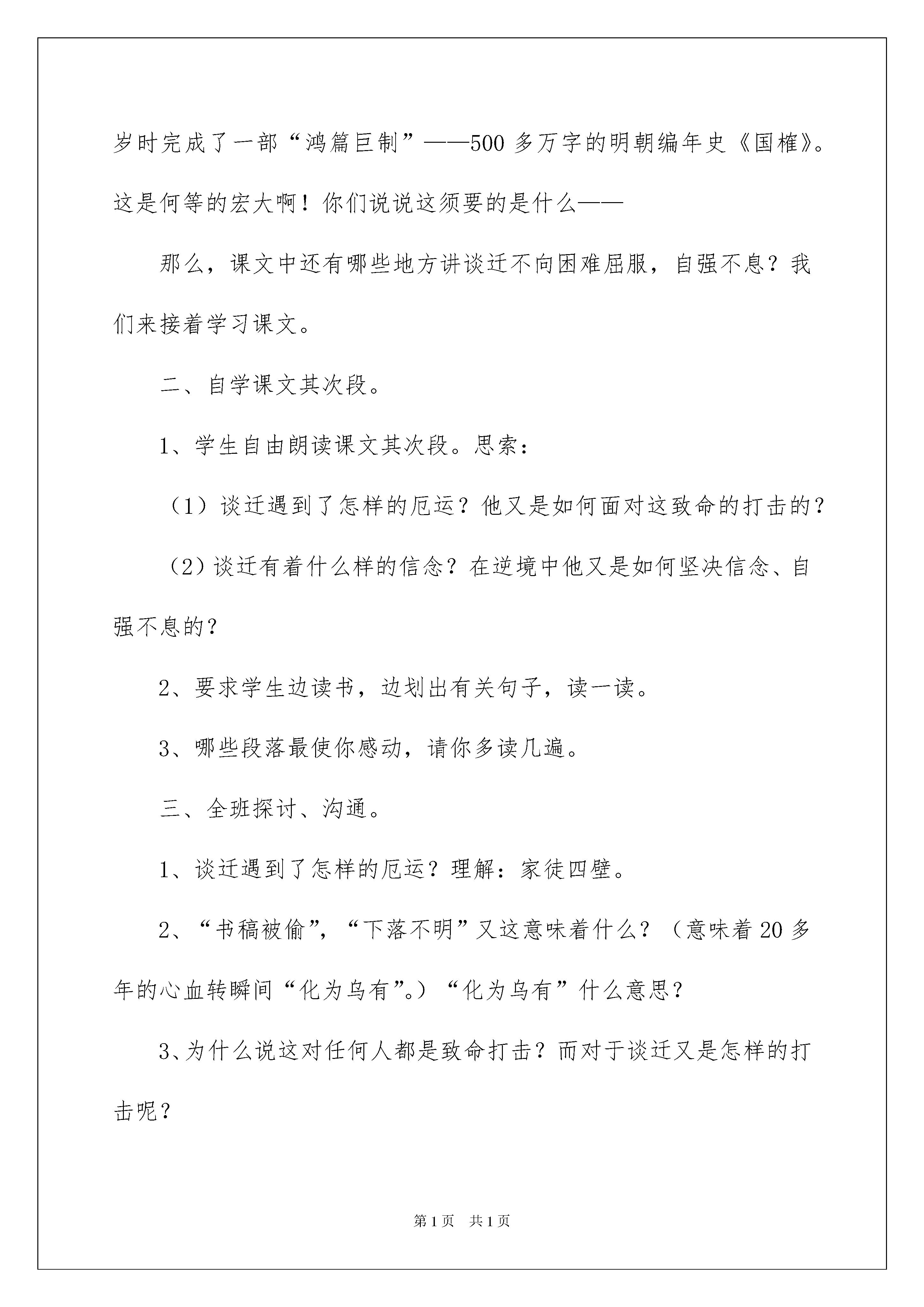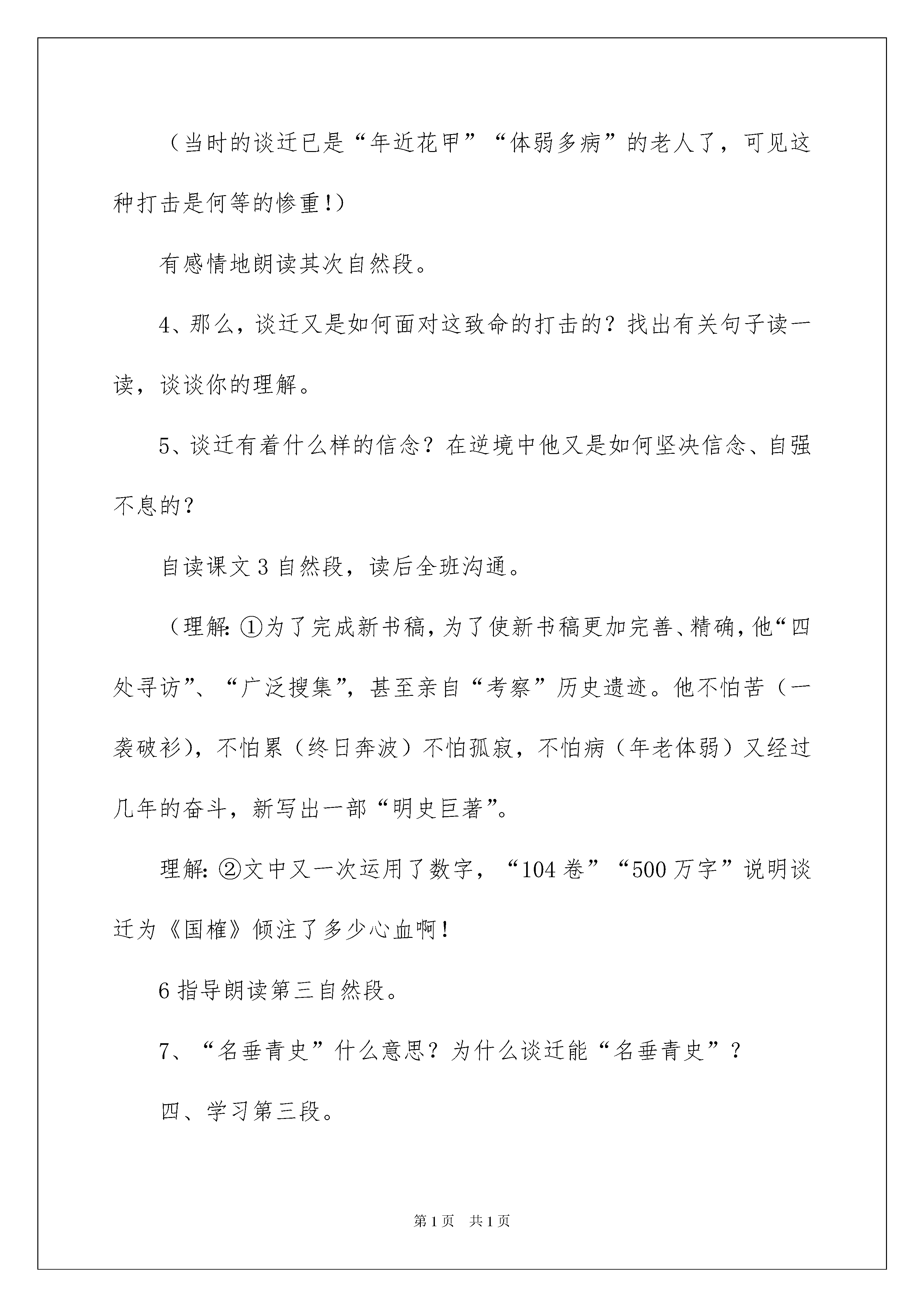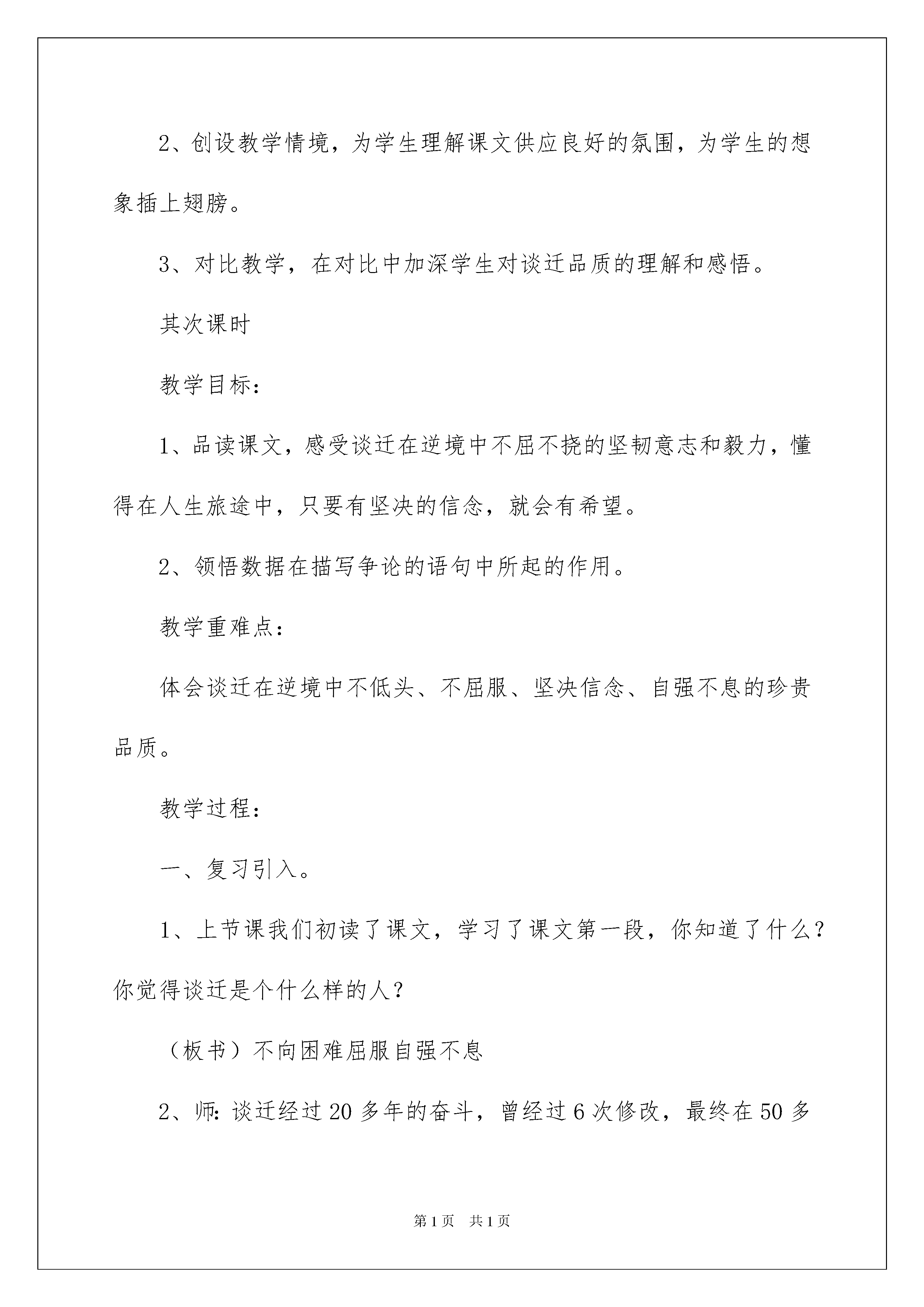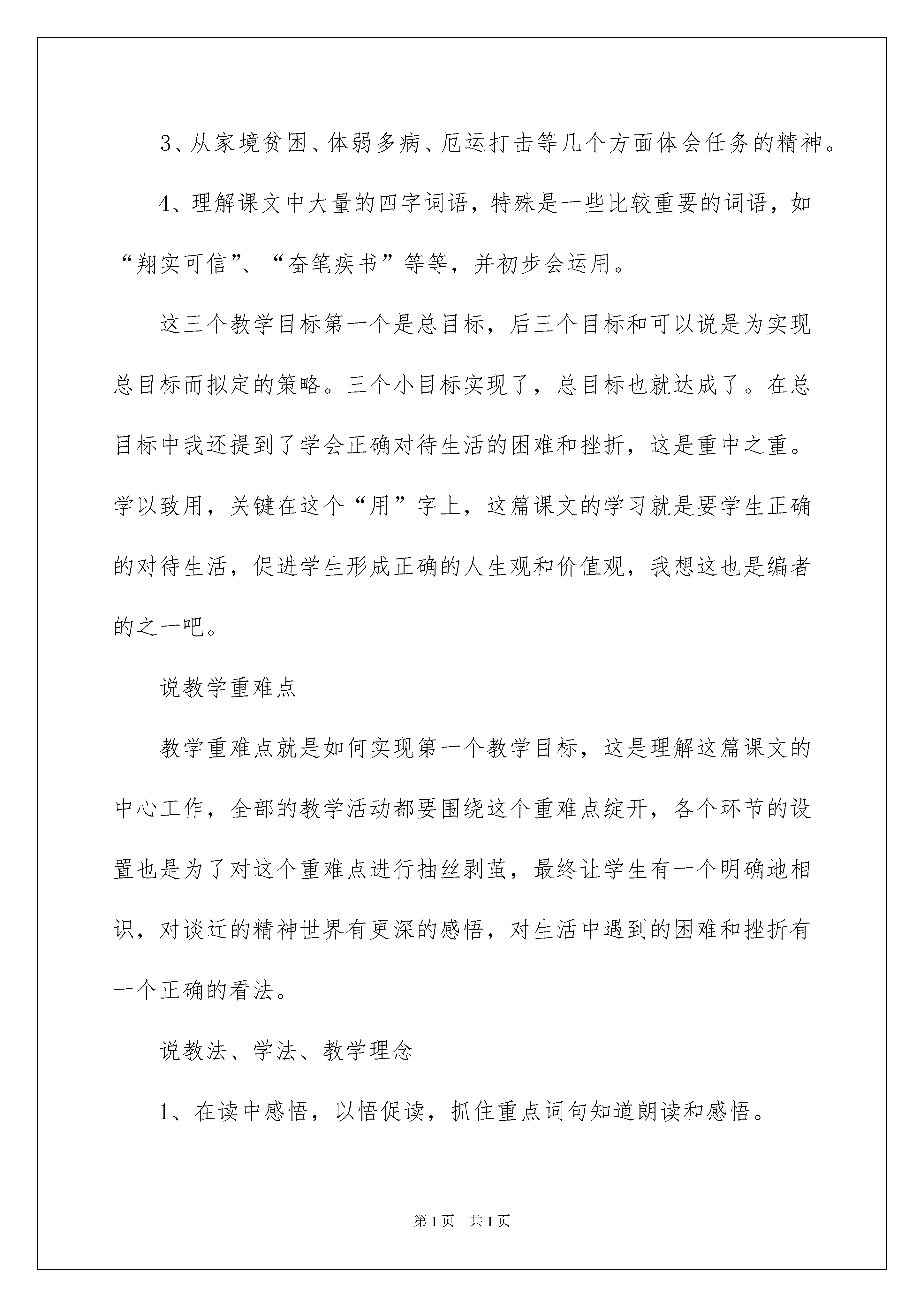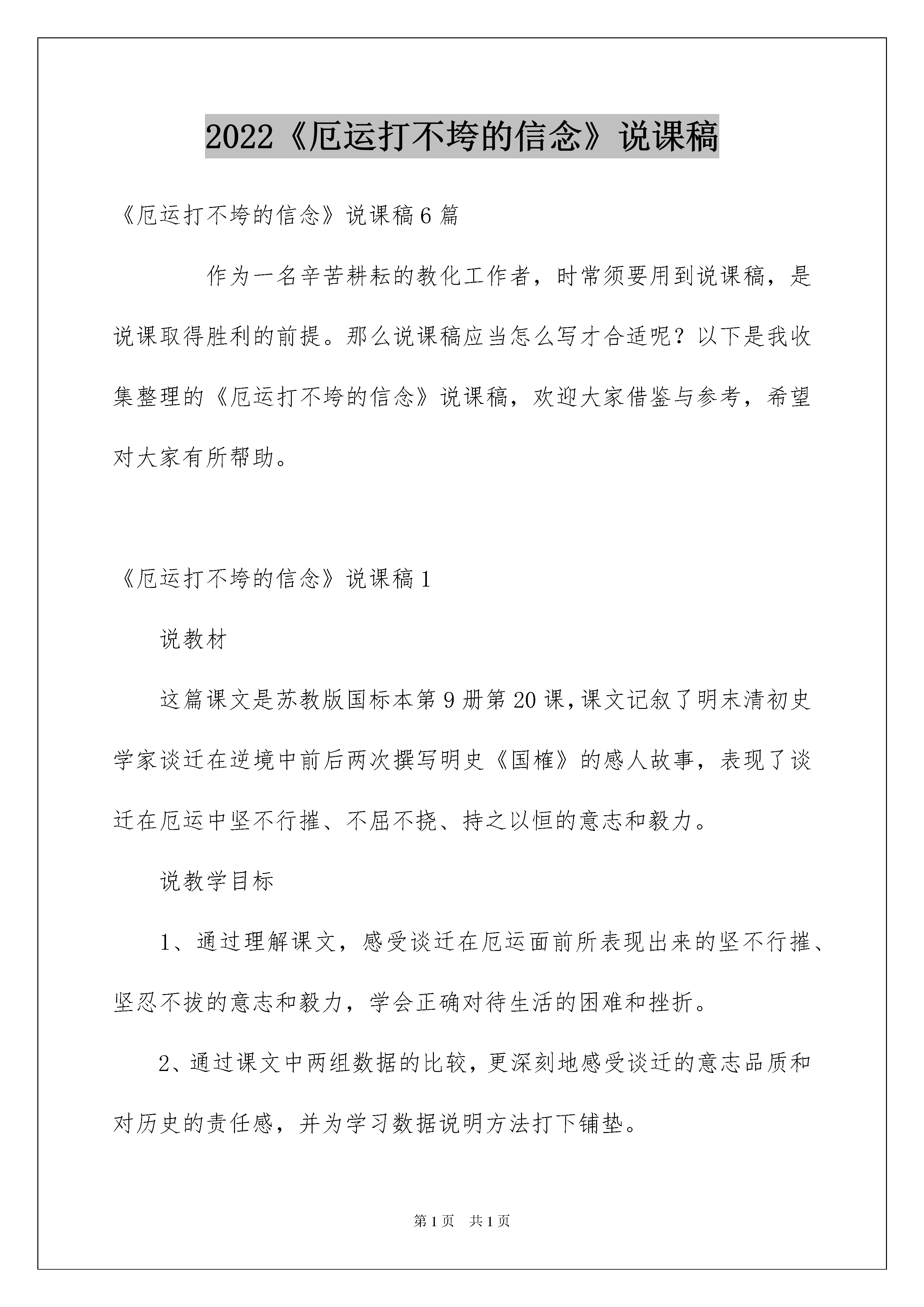2022《厄运打不垮的信念》说课稿《厄运打不垮的信念》说课稿6篇作为一名辛苦耕耘的教化工作者,时常须要用到说课稿,是说课取得胜利的前提。那么说课稿应当怎么写才合适呢?以下是我收集整理的《厄运打不垮的信念》说课稿,欢迎大家借鉴与参考,希望对大家有所帮助。《厄运打不垮的信念》说课稿1说教材这篇课文是苏教版国标本第9册第20课,课文记叙了明末清初史学家谈迁在逆境中前后两次撰写明史《国榷》的感人故事,表现了谈迁在厄运中坚不行摧、不屈不挠、持之以恒的意志和毅力。说教学目标1、通过理解课文,感受谈迁在厄运面前所表现出来的坚不行摧、坚忍不拔的意志和毅力,学会正确对待生活的困难和挫折。2、通过课文中两组数据的比较,更深刻地感受谈迁的意志品质和对历史的责任感,并为学习数据说明方法打下铺垫。3、从家境贫困、体弱多病、厄运打击等几个方面体会任务的精神。4、理解课文中大量的四字词语,特殊是一些比较重要的词语,如“翔实可信”、“奋笔疾书”等等,并初步会运用。这三个教学目标第一个是总目标,后三个目标和可以说是为实现总目标而拟定的策略。三个小目标实现了,总目标也就达成了。在总目标中我还提到了学会正确对待生活的困难和挫折,这是重中之重。学以致用,关键在这个“用”字上,这篇课文的学习就是要学生正确的对待生活,促进学生形成正确的人生观和价值观,我想这也是编者的之一吧。说教学重难点教学重难点就是如何实现第一个教学目标,这是理解这篇课文的中心工作,全部的教学活动都要围绕这个重难点绽开,各个环节的设置也是为了对这个重难点进行抽丝剥茧,最终让学生有一个明确地相识,对谈迁的精神世界有更深的感悟,对生活中遇到的困难和挫折有一个正确的看法。说教法、学法、教学理念1、在读中感悟,以悟促读,抓住重点词句知道朗读和感悟。2、创设教学情境,为学生理解课文供应良好的氛围,为学生的想象插上翅膀。3、对比教学,在对比中加深学生对谈迁品质的理解和感悟。其次课时教学目标:1、品读课文,感受谈迁在逆境中不屈不挠的坚韧意志和毅力,懂得在人生旅途中,只要有坚决的信念,就会有希望。2、领悟数据在描写争论的语句中所起的作用。教学重难点:体会谈迁在逆境中不低头、不屈服、坚决信念、自强不息的珍贵品质。教学过程:一、复习引入。1、上节课我们初读了课文,学习了课文第一段,你知道了什么?你觉得谈迁是个什么样的人?(板书)不向困难屈服自强不息2、师:谈迁经过20多年的奋斗,曾经过6次修改,最终在50多岁时完成了一部“鸿篇巨制”——500多万字的明朝编年史《国榷》。这是何等的宏大啊!你们说说这须要的是什么——那么,课文中还有哪些地方讲谈迁不向困难屈服,自强不息?我们来接着学习课文。二、自学课文其次段。1、学生自由朗读课文其次段。思索:(1)谈迁遇到了怎样的厄运?他又是如何面对这致命的打击的?(2)谈迁有着什么样的信念?在逆境中他又是如何坚决信念、自强不息的?2、要求学生边读书,边划出有关句子,读一读。3、哪些段落最使你感动,请你多读几遍。三、全班探讨、沟通。1、谈迁遇到了怎样的厄运?理解:家徒四壁。2、“书稿被偷”,“下落不明”又这意味着什么?(意味着20多年的心血转瞬间“化为乌有”。)“化为乌有”什么意思?3、为什么说这对任何人都是致命打击?而对于谈迁又是怎样的打击呢?(当时的谈迁已是“年近花甲”“体弱多病”的老人了,可见这种打击是何等的惨重!)有感情地朗读其次自然段。4、那么,谈迁又是如何面对这致命的打击的?找出有关句子读一读,谈谈你的理解。5、谈迁有着什么样的信念?在逆境中他又是如何坚决信念、自强不息的?自读课文3自然段,读后全班沟通。(理解:①为了完成新书稿,为了使新书稿更加完善、精确,他“四处寻访”、“广泛搜集”,甚至亲自“考察”历史遗迹。他不怕苦(一袭破衫),不怕累(终日奔波)不怕孤寂,不怕病(年老体弱)又经过几年的奋斗,新写出一部“明史巨著”。理解:②文中又一次运用了数字,“104卷”“500万字”说明谈迁为《国榷》倾注了多少心血啊!6指导朗读第三自然段。7、“名垂青史”什么意思?为什么谈迁能“名垂青史”?四、学习第三段。1、是啊,这是一个多么感人的故事啊!作者发出了怎样的感叹呢?2、这句话是什么意思?说说你的理解。(人生难免有坎坷和坎坷,但只要信念不被打垮,希望就恒久存在。)3、这段在文中起了什么作用?(既是课文的总结,又点明白文章的中心。)课文学完了,你还有什么不懂的吗?五、有感情地朗读课文。六、总结全文。1、课文主要讲了一件什么事?2、归纳中心思想。(本文记叙了明末清初史学家谈迁在艰难的逆境中两次撰写明史巨著《国榷》的感人故事,表现了谈迁逆境