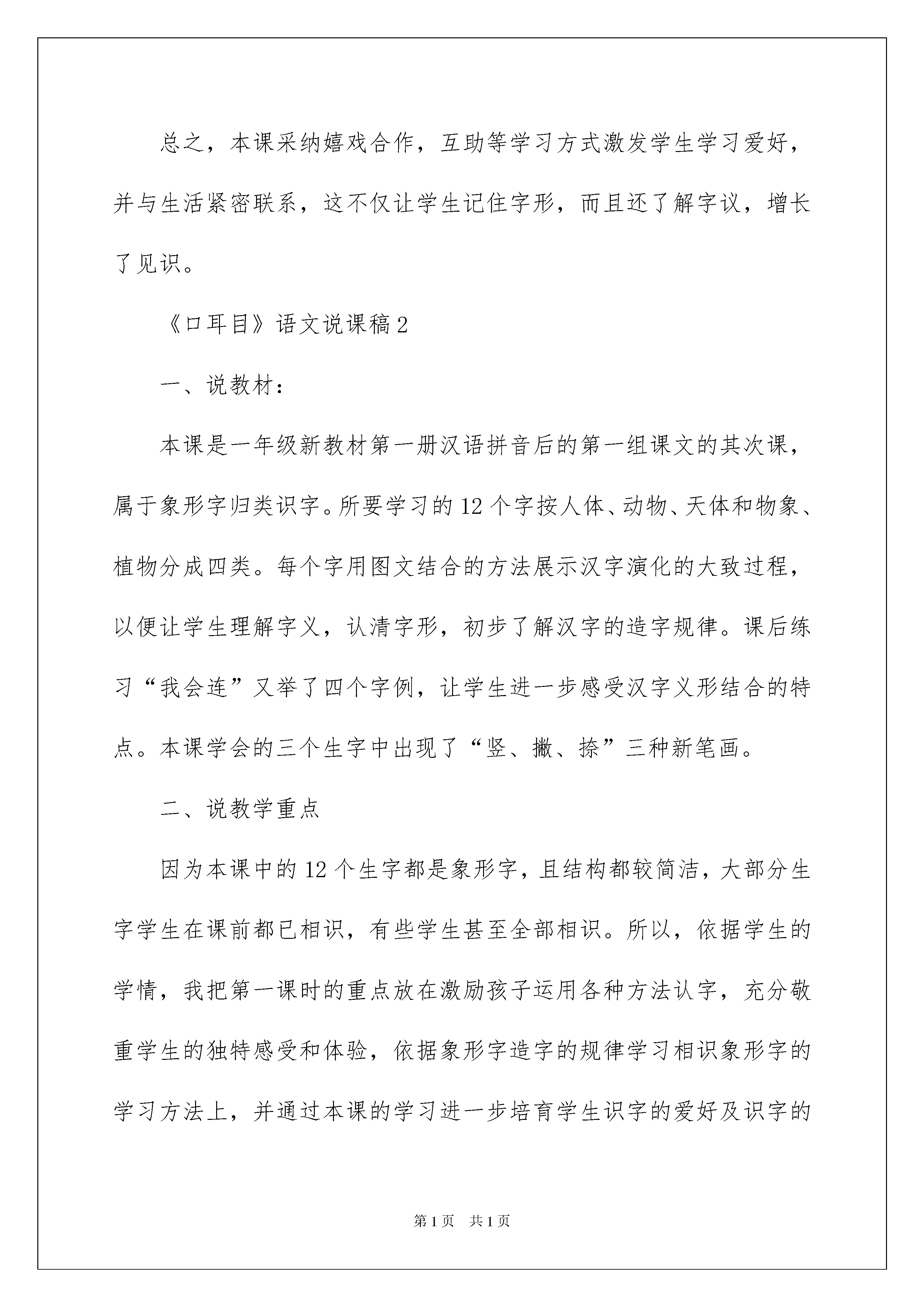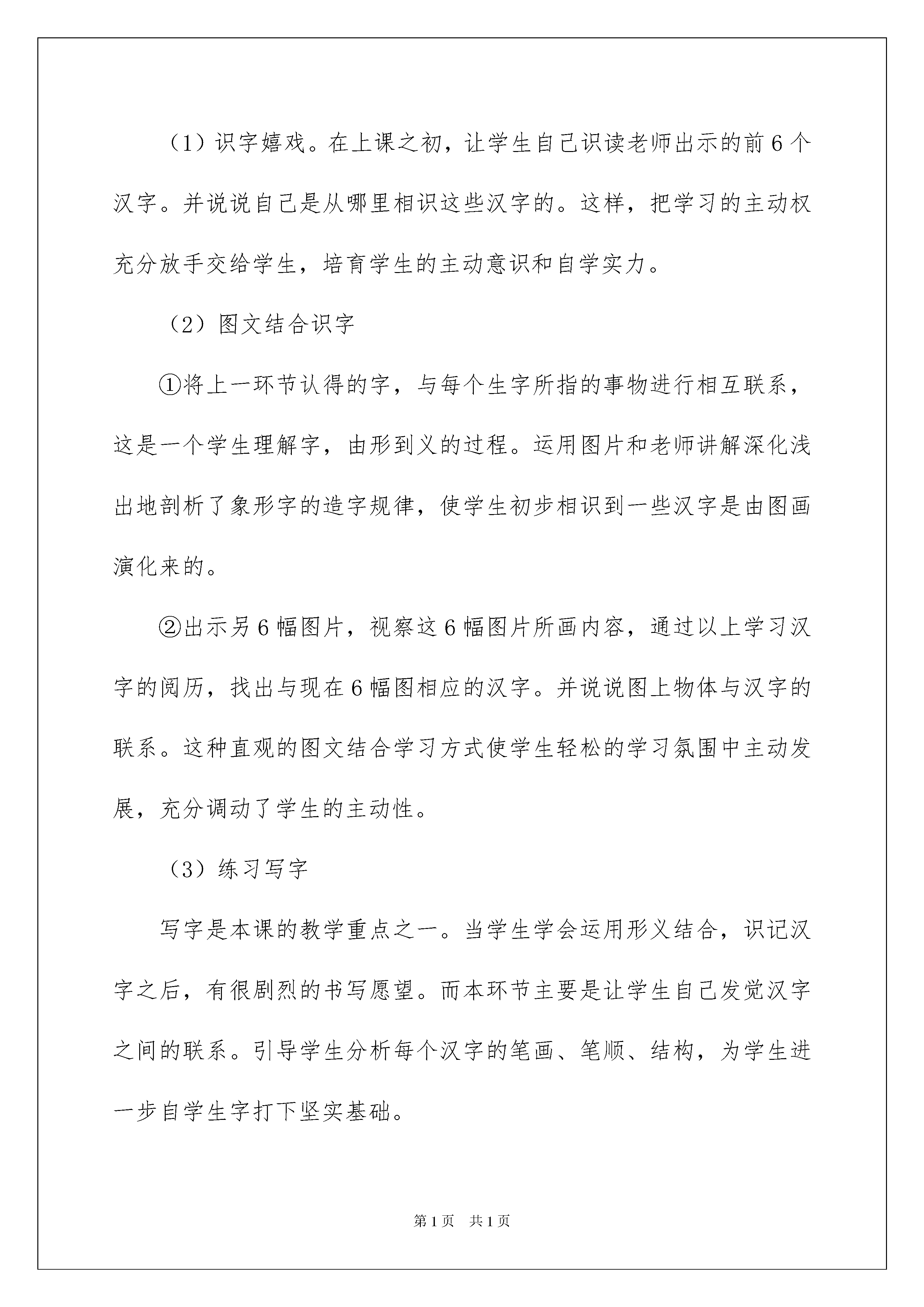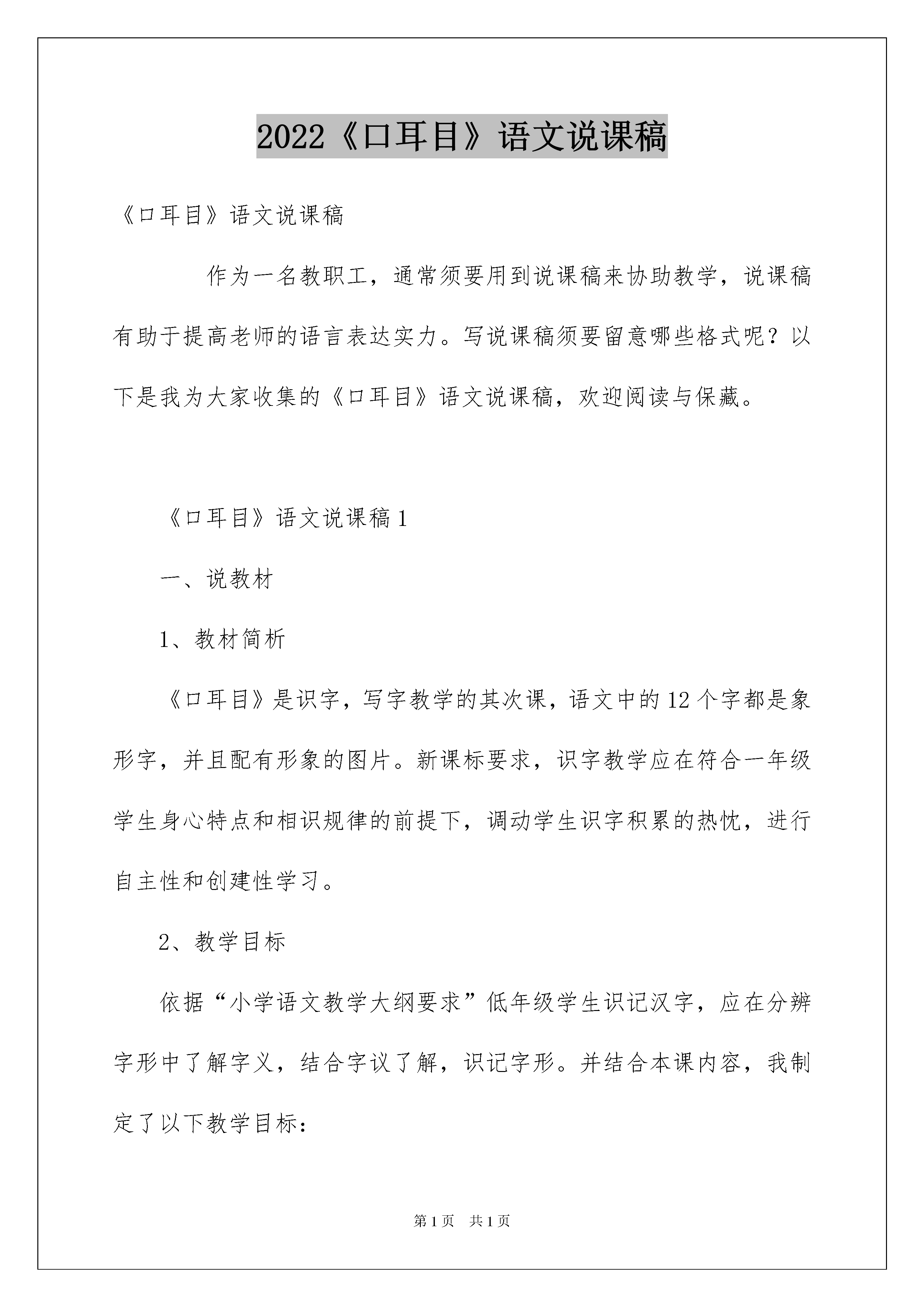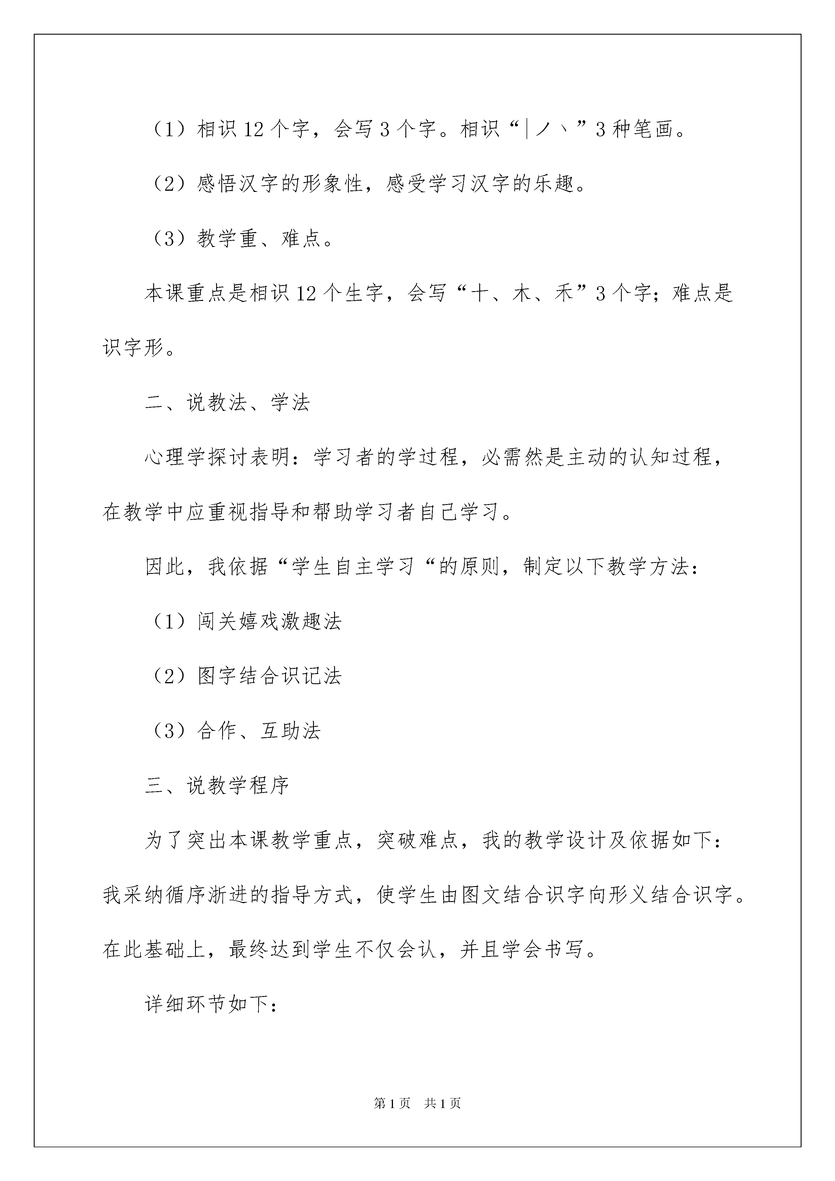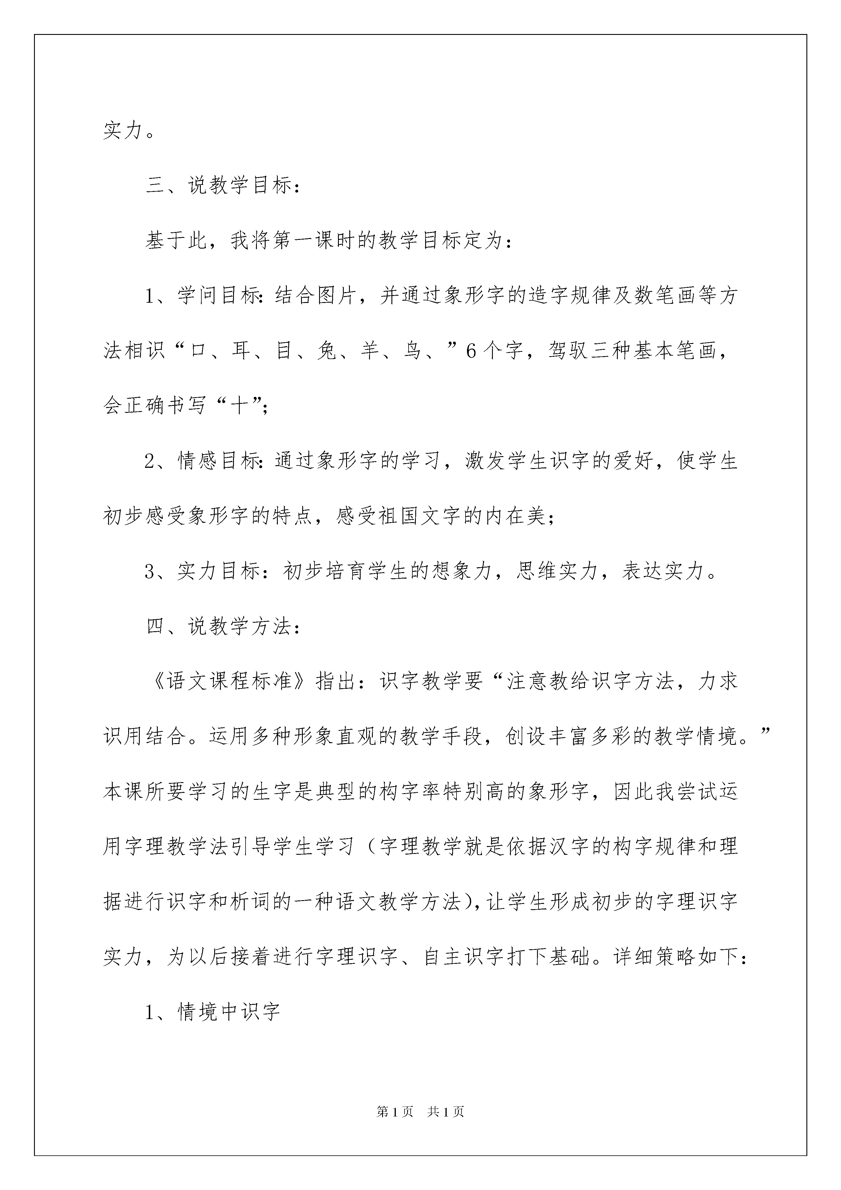 2022《口耳目》语文说课稿《口耳目》语文说课稿作为一名教职工,通常须要用到说课稿来协助教学,说课稿有助于提高老师的语言表达实力。写说课稿须要留意哪些格式呢?以下是我为大家收集的《口耳目》语文说课稿,欢迎阅读与保藏。《口耳目》语文说课稿1一、说教材1、教材简析《口耳目》是识字,写字教学的其次课,语文中的12个字都是象形字,并且配有形象的图片。新课标要求,识字教学应在符合一年级学生身心特点和相识规律的前提下,调动学生识字积累的热忱,进行自主性和创建性学习。2、教学目标依据“小学语文教学大纲要求”低年级学生识记汉字,应在分辨字形中了解字义,结合字议了解,识记字形。并结合本课内容,我制定了以下教学目标:(1)相识12个字,会写3个字。相识“|ノ丶”3种笔画。(2)感悟汉字的形象性,感受学习汉字的乐趣。(3)教学重、难点。本课重点是相识12个生字,会写“十、木、禾”3个字;难点是识字形。二、说教法、学法心理学探讨表明:学习者的学过程,必需然是主动的认知过程,在教学中应重视指导和帮助学习者自己学习。因此,我依据“学生自主学习“的原则,制定以下教学方法:(1)闯关嬉戏激趣法(2)图字结合识记法(3)合作、互助法三、说教学程序为了突出本课教学重点,突破难点,我的教学设计及依据如下:我采纳循序浙进的指导方式,使学生由图文结合识字向形义结合识字。在此基础上,最终达到学生不仅会认,并且学会书写。详细环节如下:(1)识字嬉戏。在上课之初,让学生自己识读老师出示的前6个汉字。并说说自己是从哪里相识这些汉字的。这样,把学习的主动权充分放手交给学生,培育学生的主动意识和自学实力。(2)图文结合识字①将上一环节认得的字,与每个生字所指的事物进行相互联系,这是一个学生理解字,由形到义的过程。运用图片和老师讲解深化浅出地剖析了象形字的造字规律,使学生初步相识到一些汉字是由图画演化来的。②出示另6幅图片,视察这6幅图片所画内容,通过以上学习汉字的阅历,找出与现在6幅图相应的汉字。并说说图上物体与汉字的联系。这种直观的图文结合学习方式使学生轻松的学习氛围中主动发展,充分调动了学生的主动性。(3)练习写字写字是本课的教学重点之一。当学生学会运用形义结合,识记汉字之后,有很剧烈的书写愿望。而本环节主要是让学生自己发觉汉字之间的联系。引导学生分析每个汉字的笔画、笔顺、结构,为学生进一步自学生字打下坚实基础。总之,本课采纳嬉戏合作,互助等学习方式激发学生学习爱好,并与生活紧密联系,这不仅让学生记住字形,而且还了解字议,增长了见识。《口耳目》语文说课稿2一、说教材:本课是一年级新教材第一册汉语拼音后的第一组课文的其次课,属于象形字归类识字。所要学习的12个字按人体、动物、天体和物象、植物分成四类。每个字用图文结合的方法展示汉字演化的大致过程,以便让学生理解字义,认清字形,初步了解汉字的造字规律。课后练习“我会连”又举了四个字例,让学生进一步感受汉字义形结合的特点。本课学会的三个生字中出现了“竖、撇、捺”三种新笔画。二、说教学重点因为本课中的12个生字都是象形字,且结构都较简洁,大部分生字学生在课前都已相识,有些学生甚至全部相识。所以,依据学生的学情,我把第一课时的重点放在激励孩子运用各种方法认字,充分敬重学生的独特感受和体验,依据象形字造字的规律学习相识象形字的学习方法上,并通过本课的学习进一步培育学生识字的爱好及识字的实力。三、说教学目标:基于此,我将第一课时的教学目标定为:1、学问目标:结合图片,并通过象形字的造字规律及数笔画等方法相识“口、耳、目、兔、羊、鸟、”6个字,驾驭三种基本笔画,会正确书写“十”;2、情感目标:通过象形字的学习,激发学生识字的爱好,使学生初步感受象形字的特点,感受祖国文字的内在美;3、实力目标:初步培育学生的想象力,思维实力,表达实力。四、说教学方法:《语文课程标准》指出:识字教学要“注意教给识字方法,力求识用结合。运用多种形象直观的教学手段,创设丰富多彩的教学情境。”本课所要学习的生字是典型的构字率特别高的象形字,因此我尝试运用字理教学法引导学生学习(字理教学就是依据汉字的构字规律和理据进行识字和析词的一种语文教学方法),让学生形成初步的字理识字实力,为以后接着进行字理识字、自主识字打下基础。详细策略如下:1、情境中识字针对我班学生好动、爱玩、做事没耐性的特点,在本课中我以喜羊羊为线索,通过游象形字王国的形式使学生始终处于最佳的学习状态,使孩子能主动参加,大大地提高识字的效率。2、嬉戏中记字嬉戏是孩子们喜闻乐见的活动方式,把嬉戏引入识字教学总有意想不到的效果。在整个情境中,我又穿插了诸多