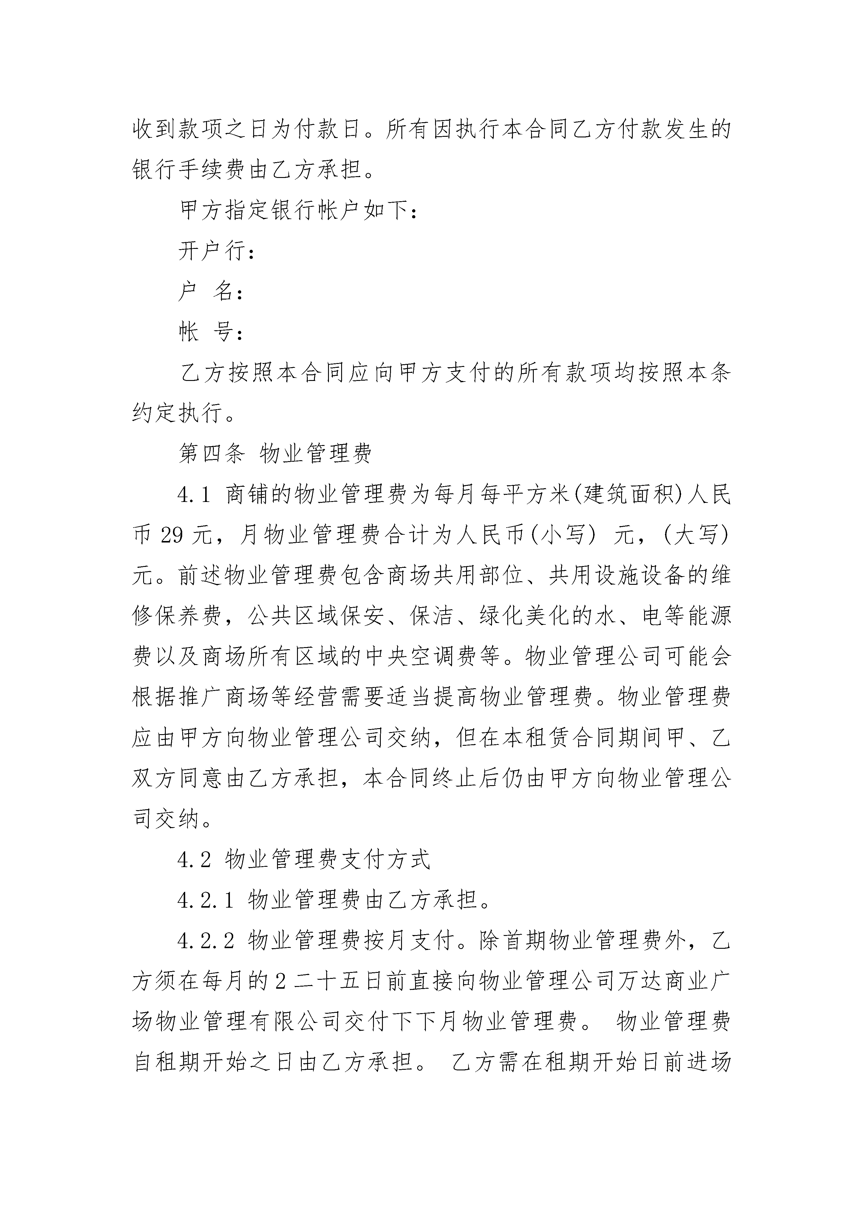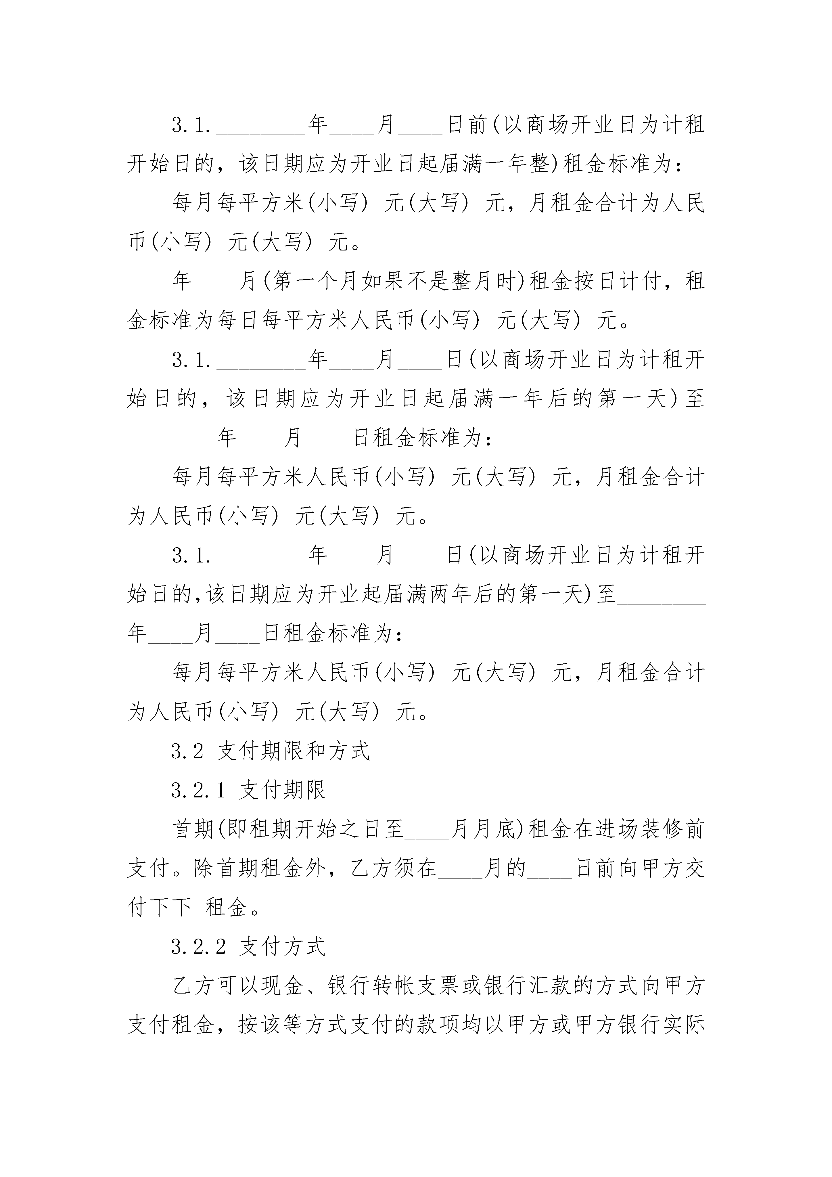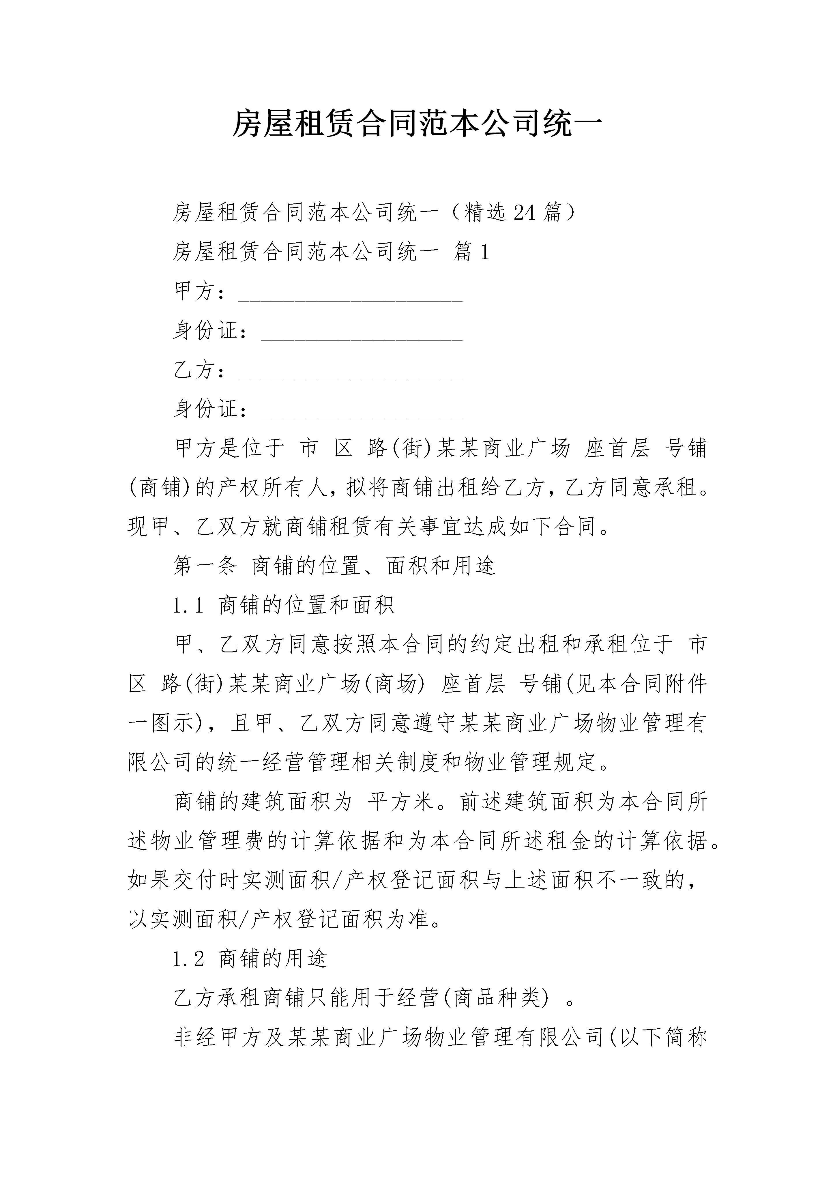 房屋租赁合同范本公司统一房屋租赁合同范本公司统一(精选24篇)房屋租赁合同范本公司统一篇1甲方:____________________身份证:__________________乙方:____________________身份证:__________________甲方是位于市区路(街)某某商业广场座首层号铺(商铺)的产权所有人,拟将商铺出租给乙方,乙方同意承租。现甲、乙双方就商铺租赁有关事宜达成如下合同。第一条商铺的位置、面积和用途1.1商铺的位置和面积甲、乙双方同意按照本合同的约定出租和承租位于市区路(街)某某商业广场(商场)座首层号铺(见本合同附件一图示),且甲、乙双方同意遵守某某商业广场物业管理有限公司的统一经营管理相关制度和物业管理规定。商铺的建筑面积为平方米。前述建筑面积为本合同所述物业管理费的计算依据和为本合同所述租金的计算依据。如果交付时实测面积/产权登记面积与上述面积不一致的,以实测面积/产权登记面积为准。1.2商铺的用途乙方承租商铺只能用于经营(商品种类)。非经甲方及某某商业广场物业管理有限公司(以下简称物业管理公司)书面同意,乙方不得在本合同约定的租赁期内将商铺用于经营其他任何种类的商品和用于其它任何目的。甲方或物业管理公司对乙方违反本条规定的行为未及时制止并不表示对乙方行为的默认。第二条租期租期自________年____月____日(如商场开业时间晚于上述起租日的,以商场开业日为计租开始日)起至________年____月____日止。租期开始前甲方允许乙方进场装修,租期开始前的装修期称免租期,免收租金,免收物业管理费,但仍应缴纳水、电等能源费。其他情况下,乙方装修期间也应支付租金、物业管理费。具体装修期自________年____月____日起至________年____月____日止。本合同在商场确定的统一开业日前____日签订本合同的,则乙方应在统一开业日前正式对外开业,否则每延迟一日,应向物业管理公司支付相当于本合同期租金总额1%的违约金。但是本协议签订日在商场开业日前的,如商场开业时间晚于上述租期开始日,以商场开业日为计租开始日,租期开始前甲方允许乙方进场装修,租期开始前的装修期称免租期,免收租金和物业管理费,但应支付水电等费用。开业日指商场具备对外营业能力时。乙方应按照商场确定的开业日对外营业。第三条租金3.1租金乙方在前述租期内租赁商铺的租金为:3.1.________年____月____日前(以商场开业日为计租开始日的,该日期应为开业日起届满一年整)租金标准为:每月每平方米(小写)元(大写)元,月租金合计为人民币(小写)元(大写)元。年____月(第一个月如果不是整月时)租金按日计付,租金标准为每日每平方米人民币(小写)元(大写)元。3.1.________年____月____日(以商场开业日为计租开始日的,该日期应为开业日起届满一年后的第一天)至________年____月____日租金标准为:每月每平方米人民币(小写)元(大写)元,月租金合计为人民币(小写)元(大写)元。3.1.________年____月____日(以商场开业日为计租开始日的,该日期应为开业起届满两年后的第一天)至________年____月____日租金标准为:每月每平方米人民币(小写)元(大写)元,月租金合计为人民币(小写)元(大写)元。3.2支付期限和方式3.2.1支付期限首期(即租期开始之日至____月月底)租金在进场装修前支付。除首期租金外,乙方须在____月的____日前向甲方交付下下租金。3.2.2支付方式乙方可以现金、银行转帐支票或银行汇款的方式向甲方支付租金,按该等方式支付的款项均以甲方或甲方银行实际收到款项之日为付款日。所有因执行本合同乙方付款发生的银行手续费由乙方承担。甲方指定银行帐户如下:开户行:户名:帐号:乙方按照本合同应向甲方支付的所有款项均按照本条约定执行。第四条物业管理费4.1商铺的物业管理费为每月每平方米(建筑面积)人民币29元,月物业管理费合计为人民币(小写)元,(大写)元。前述物业管理费包含商场共用部位、共用设施设备的维修保养费,公共区域保安、保洁、绿化美化的水、电等能源费以及商场所有区域的中央空调费等。物业管理公司可能会根据推广商场等经营需要适当提高物业管理费。物业管理费应由甲方向物业管理公司交纳,但在本租赁合同期间甲、乙双方同意由乙方承担,本合同终止后仍由甲方向物业管理公司交纳。4.2物业管理费支付方式4.2.1物业管理费由乙方承担。4.2.2物业管理费按月支付。除首期物业管理费外,乙方须在每月的2二十五日前直接向物业管理公司万达商业广场物业管理有限公司交付下下月物业管理费。物业管理费自租期开始之日由乙方承担。乙方需在租期开始日前进场装修前向物业管理公司交付首期物
