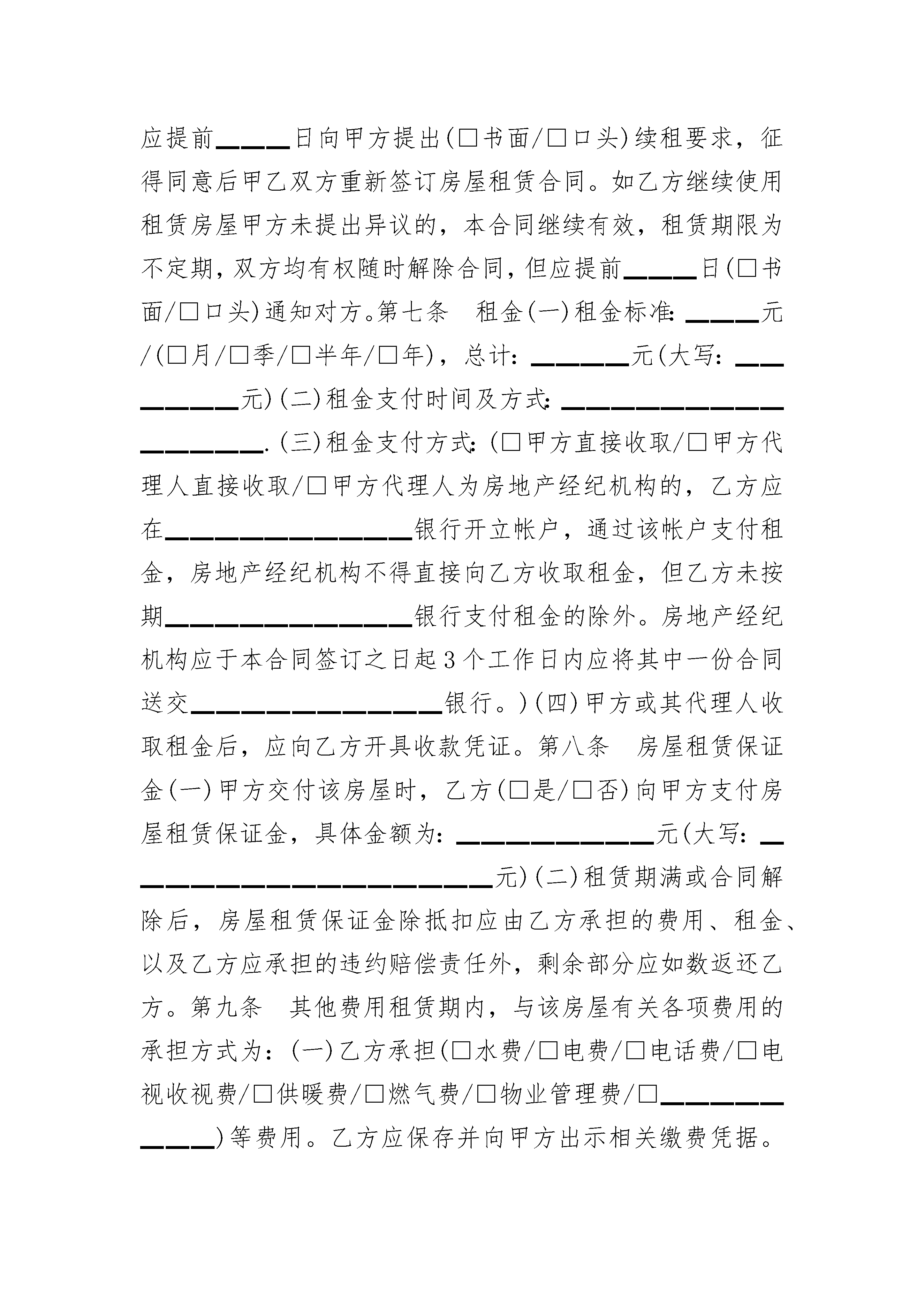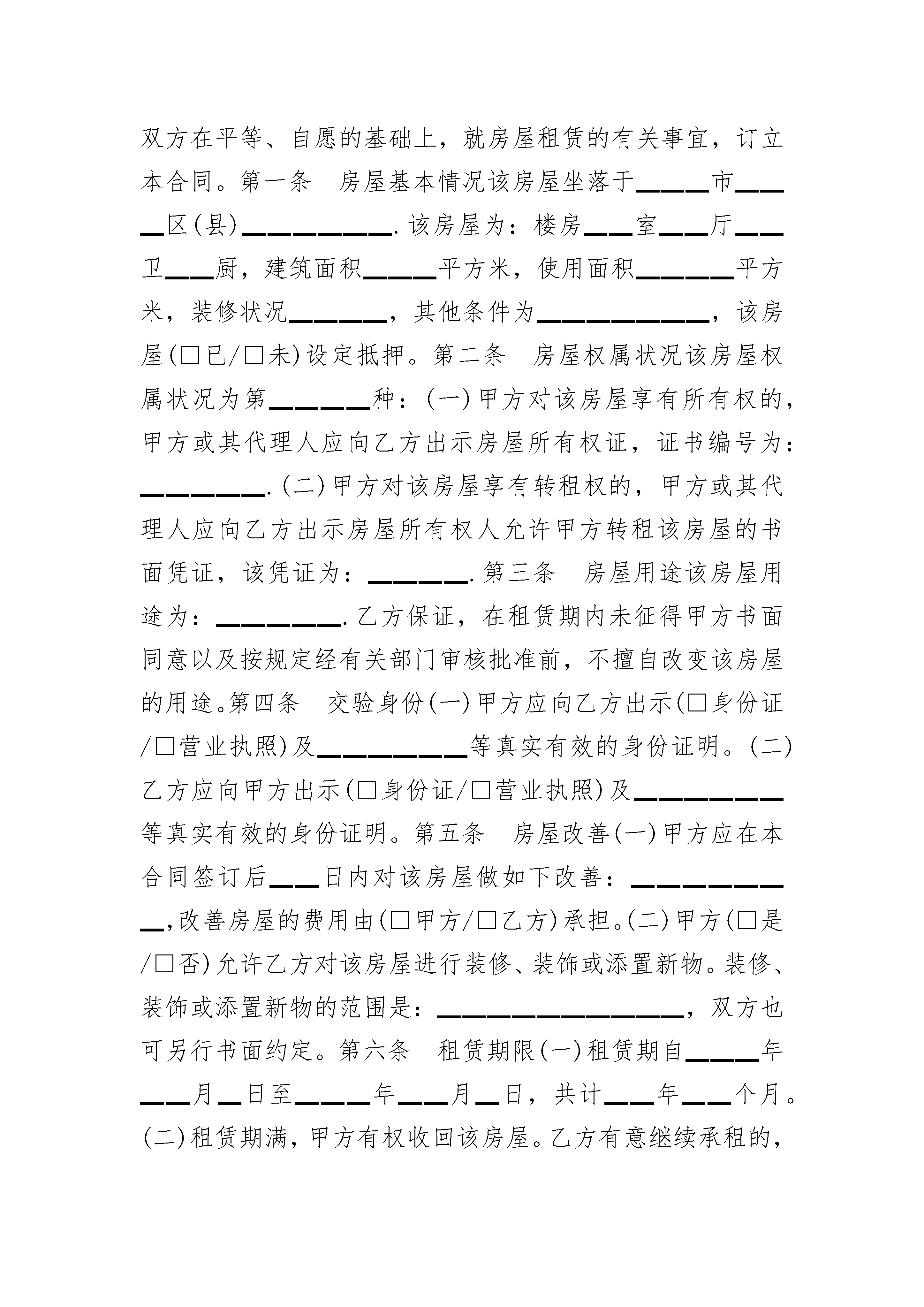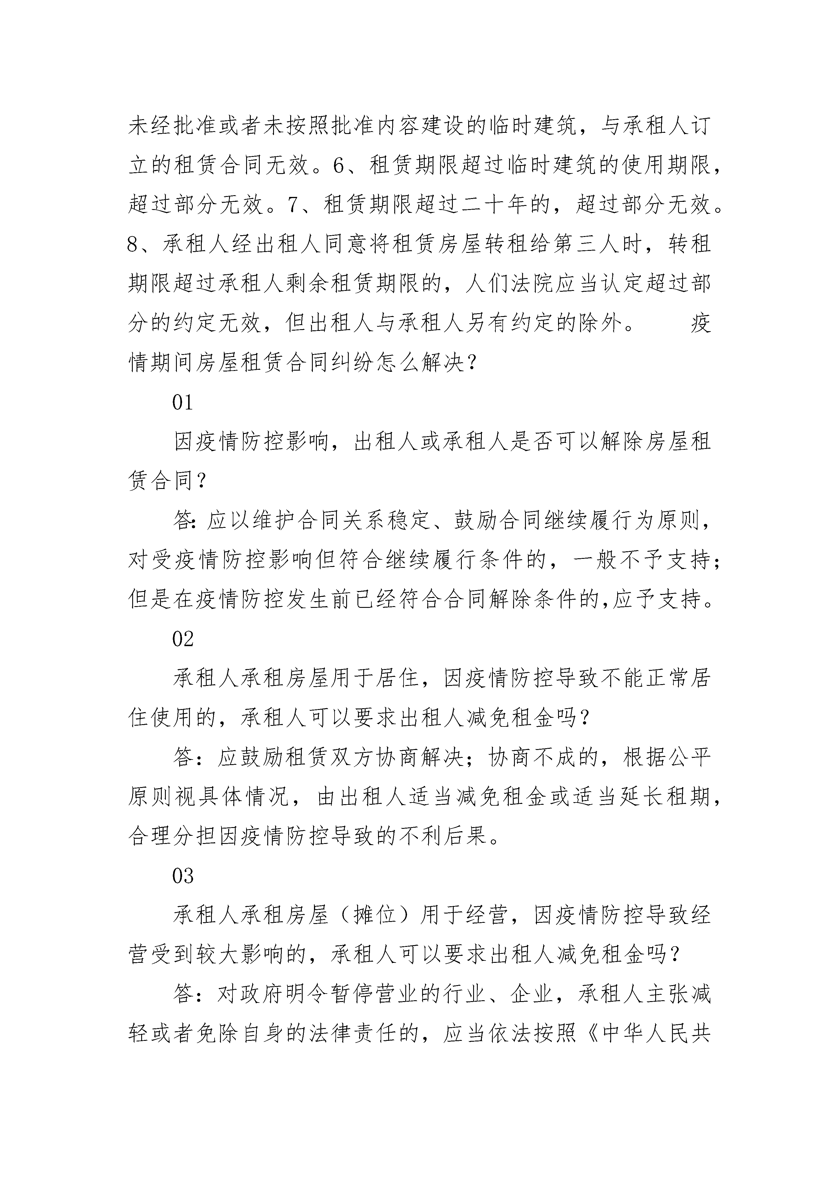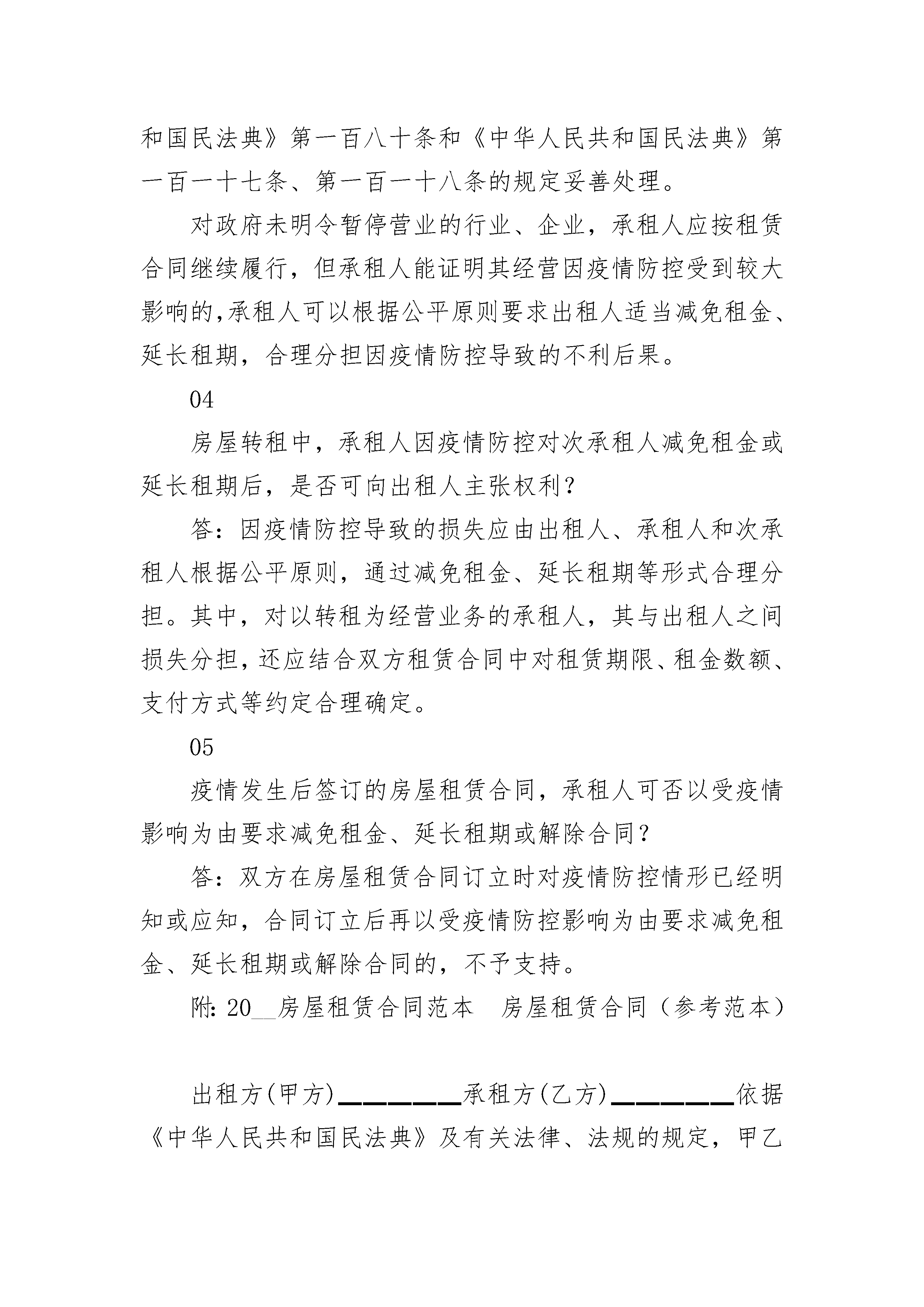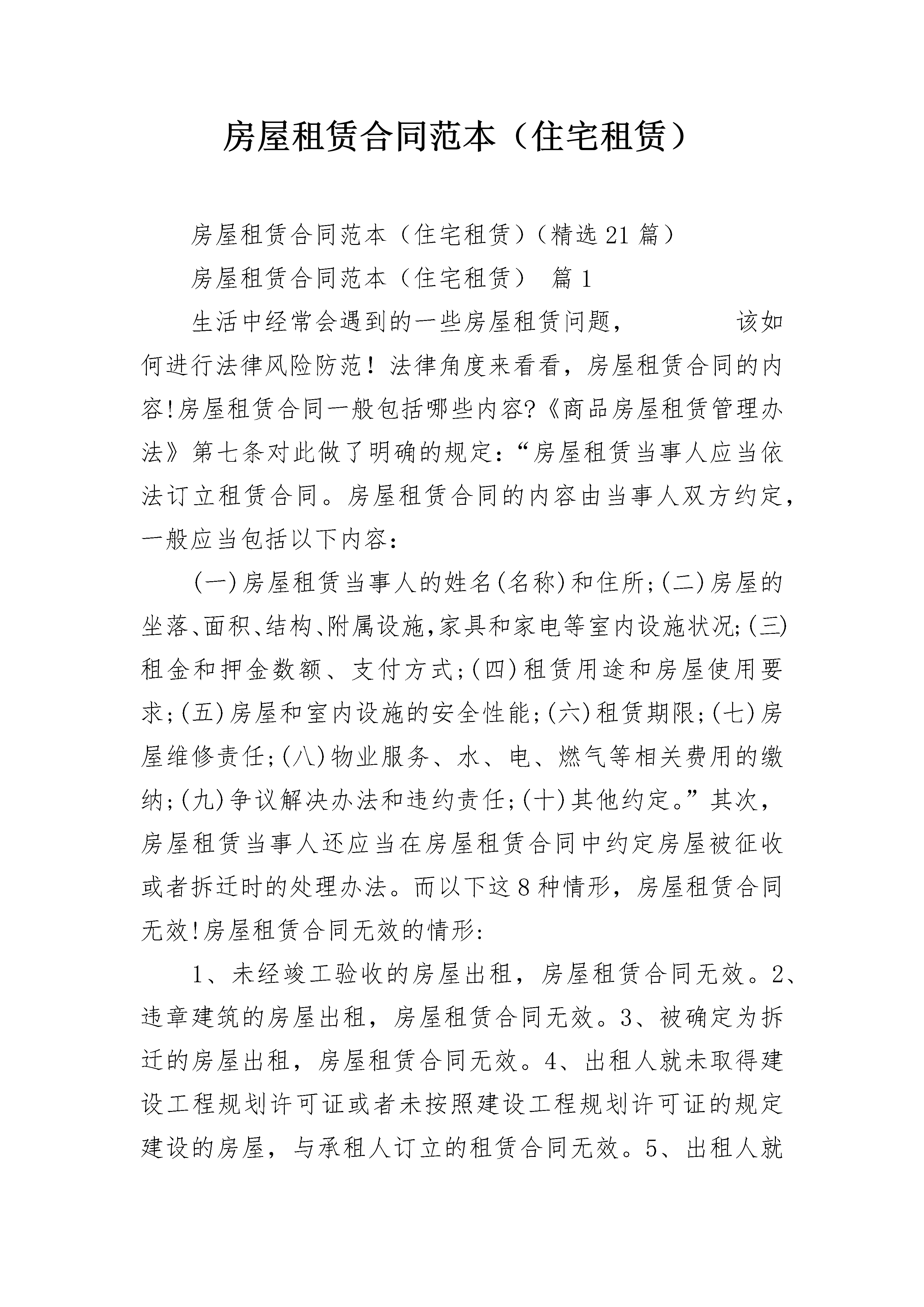 房屋租赁合同范本(住宅租赁)房屋租赁合同范本(住宅租赁)(精选21篇)房屋租赁合同范本(住宅租赁)篇1生活中经常会遇到的一些房屋租赁问题,该如何进行法律风险防范!法律角度来看看,房屋租赁合同的内容!房屋租赁合同一般包括哪些内容?《商品房屋租赁管理办法》第七条对此做了明确的规定:“房屋租赁当事人应当依法订立租赁合同。房屋租赁合同的内容由当事人双方约定,一般应当包括以下内容:(一)房屋租赁当事人的姓名(名称)和住所;(二)房屋的坐落、面积、结构、附属设施,家具和家电等室内设施状况;(三)租金和押金数额、支付方式;(四)租赁用途和房屋使用要求;(五)房屋和室内设施的安全性能;(六)租赁期限;(七)房屋维修责任;(八)物业服务、水、电、燃气等相关费用的缴纳;(九)争议解决办法和违约责任;(十)其他约定。”其次,房屋租赁当事人还应当在房屋租赁合同中约定房屋被征收或者拆迁时的处理办法。而以下这8种情形,房屋租赁合同无效!房屋租赁合同无效的情形:1、未经竣工验收的房屋出租,房屋租赁合同无效。2、违章建筑的房屋出租,房屋租赁合同无效。3、被确定为拆迁的房屋出租,房屋租赁合同无效。4、出租人就未取得建设工程规划许可证或者未按照建设工程规划许可证的规定建设的房屋,与承租人订立的租赁合同无效。5、出租人就未经批准或者未按照批准内容建设的临时建筑,与承租人订立的租赁合同无效。6、租赁期限超过临时建筑的使用期限,超过部分无效。7、租赁期限超过二十年的,超过部分无效。8、承租人经出租人同意将租赁房屋转租给第三人时,转租期限超过承租人剩余租赁期限的,人们法院应当认定超过部分的约定无效,但出租人与承租人另有约定的除外。疫情期间房屋租赁合同纠纷怎么解决?01因疫情防控影响,出租人或承租人是否可以解除房屋租赁合同?答:应以维护合同关系稳定、鼓励合同继续履行为原则,对受疫情防控影响但符合继续履行条件的,一般不予支持;但是在疫情防控发生前已经符合合同解除条件的,应予支持。02承租人承租房屋用于居住,因疫情防控导致不能正常居住使用的,承租人可以要求出租人减免租金吗?答:应鼓励租赁双方协商解决;协商不成的,根据公平原则视具体情况,由出租人适当减免租金或适当延长租期,合理分担因疫情防控导致的不利后果。03承租人承租房屋(摊位)用于经营,因疫情防控导致经营受到较大影响的,承租人可以要求出租人减免租金吗?答:对政府明令暂停营业的行业、企业,承租人主张减轻或者免除自身的法律责任的,应当依法按照《中华人民共和国民法典》第一百八十条和《中华人民共和国民法典》第一百一十七条、第一百一十八条的规定妥善处理。对政府未明令暂停营业的行业、企业,承租人应按租赁合同继续履行,但承租人能证明其经营因疫情防控受到较大影响的,承租人可以根据公平原则要求出租人适当减免租金、延长租期,合理分担因疫情防控导致的不利后果。04房屋转租中,承租人因疫情防控对次承租人减免租金或延长租期后,是否可向出租人主张权利?答:因疫情防控导致的损失应由出租人、承租人和次承租人根据公平原则,通过减免租金、延长租期等形式合理分担。其中,对以转租为经营业务的承租人,其与出租人之间损失分担,还应结合双方租赁合同中对租赁期限、租金数额、支付方式等约定合理确定。05疫情发生后签订的房屋租赁合同,承租人可否以受疫情影响为由要求减免租金、延长租期或解除合同?答:双方在房屋租赁合同订立时对疫情防控情形已经明知或应知,合同订立后再以受疫情防控影响为由要求减免租金、延长租期或解除合同的,不予支持。附:20__房屋租赁合同范本房屋租赁合同(参考范本)出租方(甲方)▁▁▁▁▁承租方(乙方)▁▁▁▁▁依据《中华人民共和国民法典》及有关法律、法规的规定,甲乙双方在平等、自愿的基础上,就房屋租赁的有关事宜,订立本合同。第一条房屋基本情况该房屋坐落于▁▁▁市▁▁▁区(县)▁▁▁▁▁▁.该房屋为:楼房▁▁室▁▁厅▁▁卫▁▁厨,建筑面积▁▁▁平方米,使用面积▁▁▁▁平方米,装修状况▁▁▁▁,其他条件为▁▁▁▁▁▁▁,该房屋(□已/□未)设定抵押。第二条房屋权属状况该房屋权属状况为第▁▁▁▁种:(一)甲方对该房屋享有所有权的,甲方或其代理人应向乙方出示房屋所有权证,证书编号为:▁▁▁▁▁.(二)甲方对该房屋享有转租权的,甲方或其代理人应向乙方出示房屋所有权人允许甲方转租该房屋的书面凭证,该凭证为:▁▁▁▁.第三条房屋用途该房屋用途为:▁▁▁▁▁.乙方保证,在租赁期内未征得甲方书面同意以及按规定经有关部门审核批准前,不擅自改变该房屋的用途。第四条交验身份(一)甲方应向乙方出示(□身份证/□营业执照)及▁▁▁▁▁▁等真实有效的身份证明。(二)乙方应向甲方出示(□身份证/□营业执照)及▁▁▁▁▁▁等真实有效的身份证明。第五条房屋改善(一)甲方应在本合