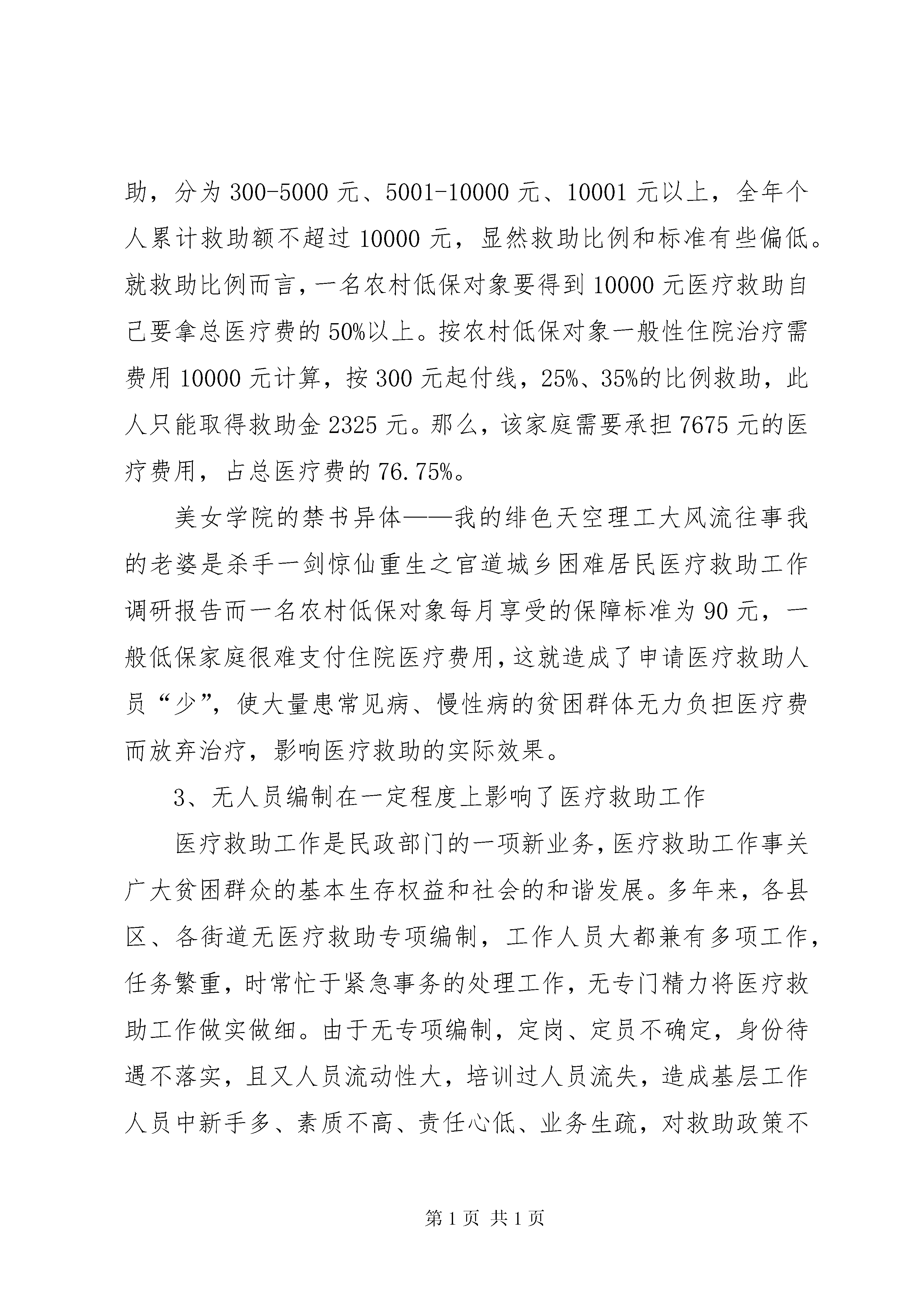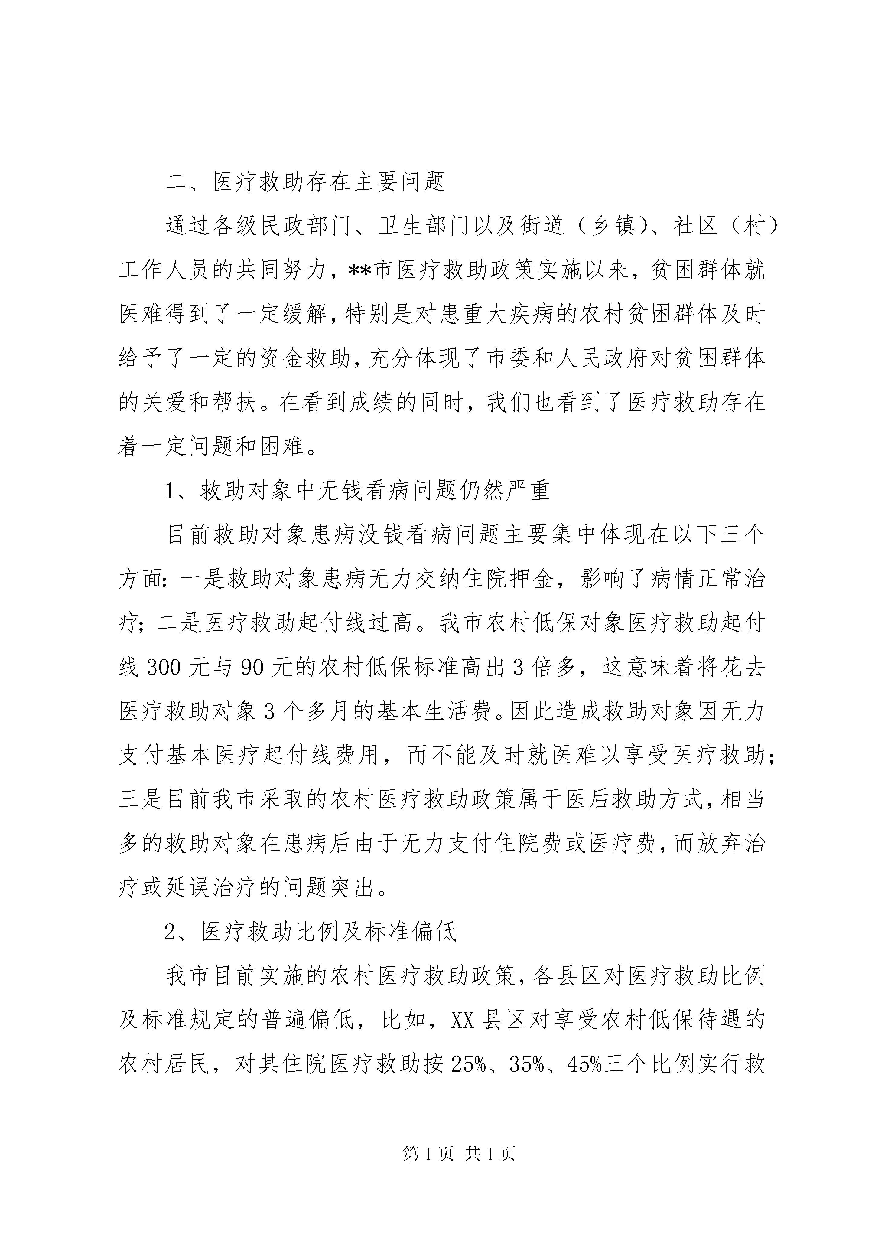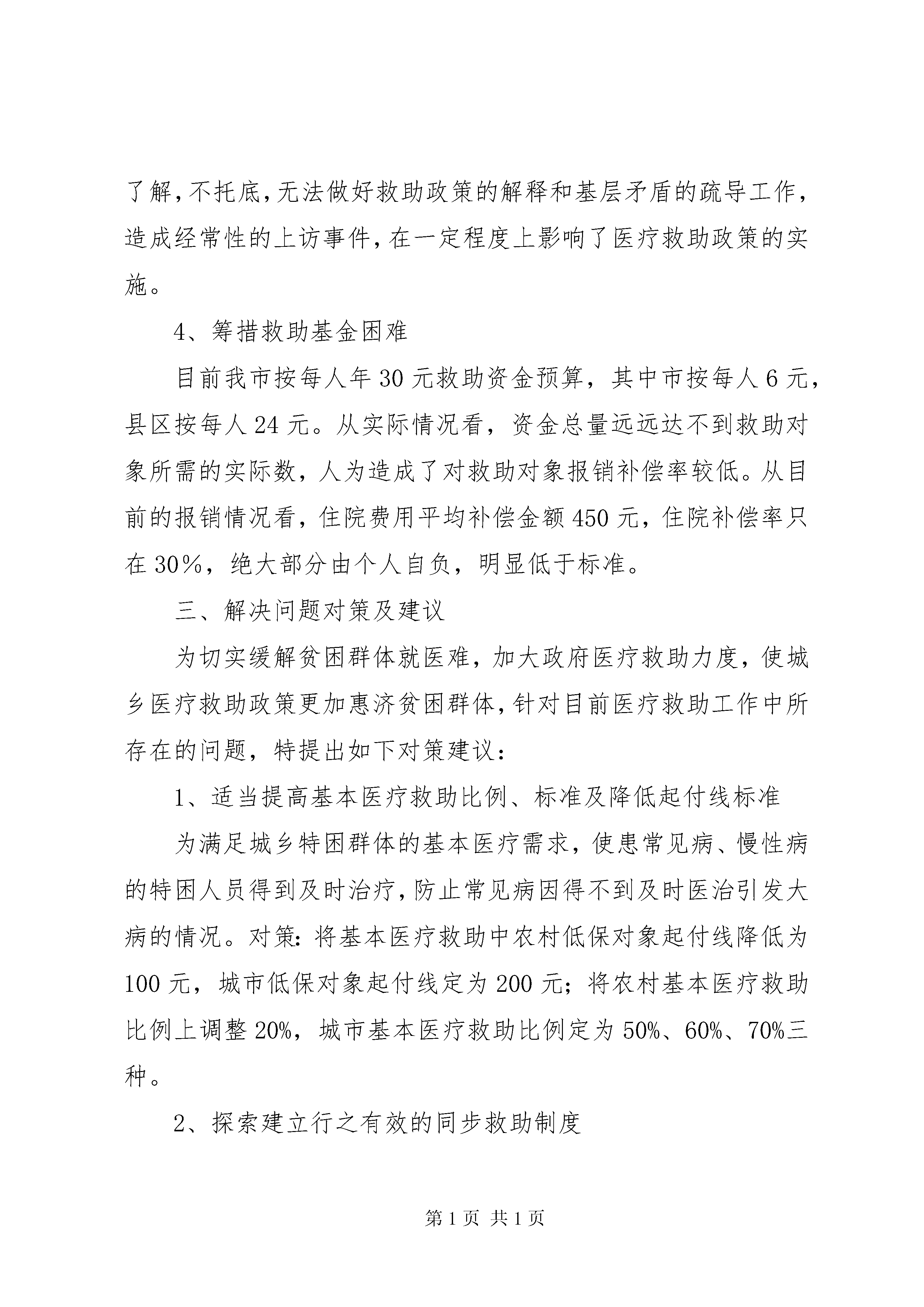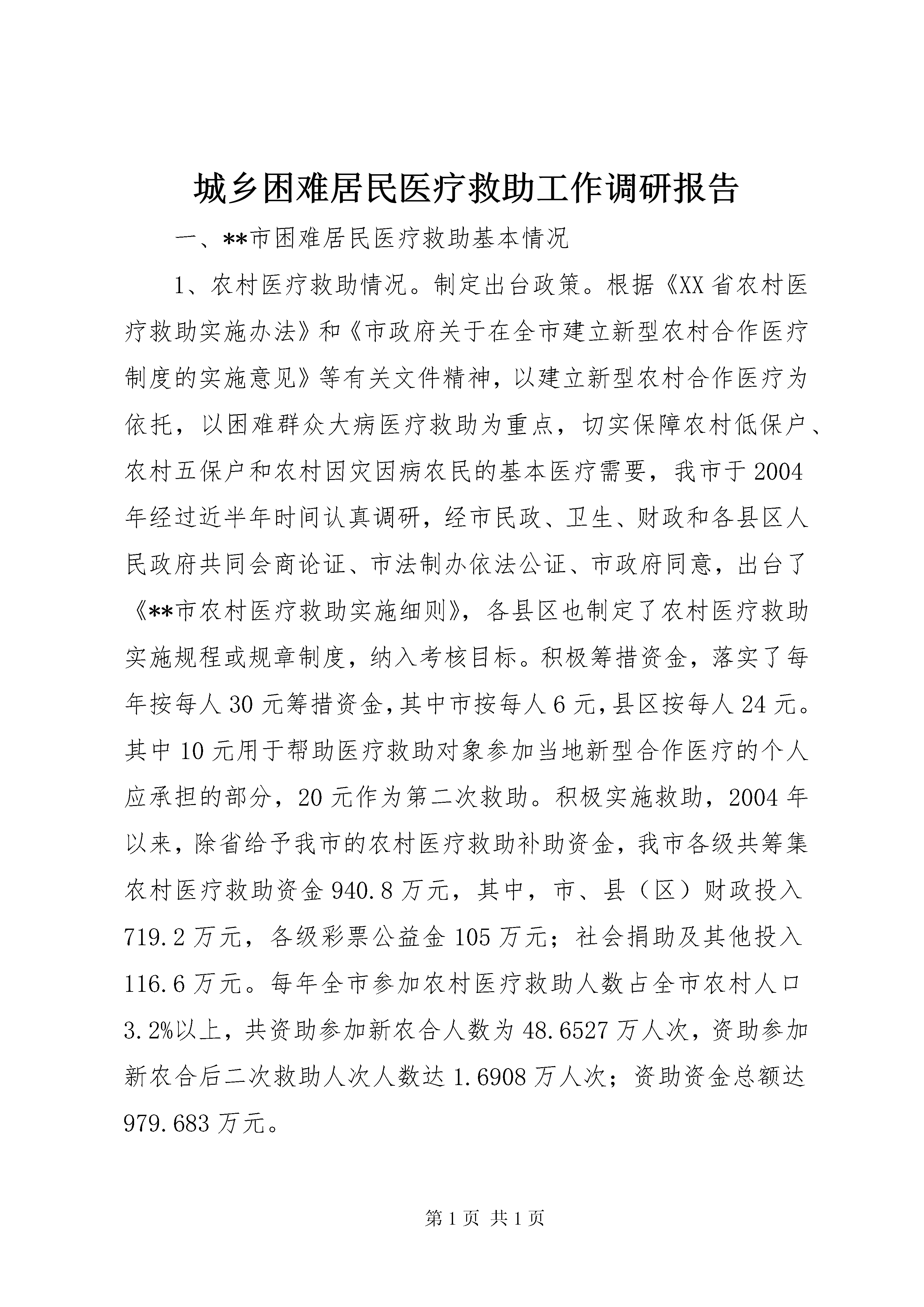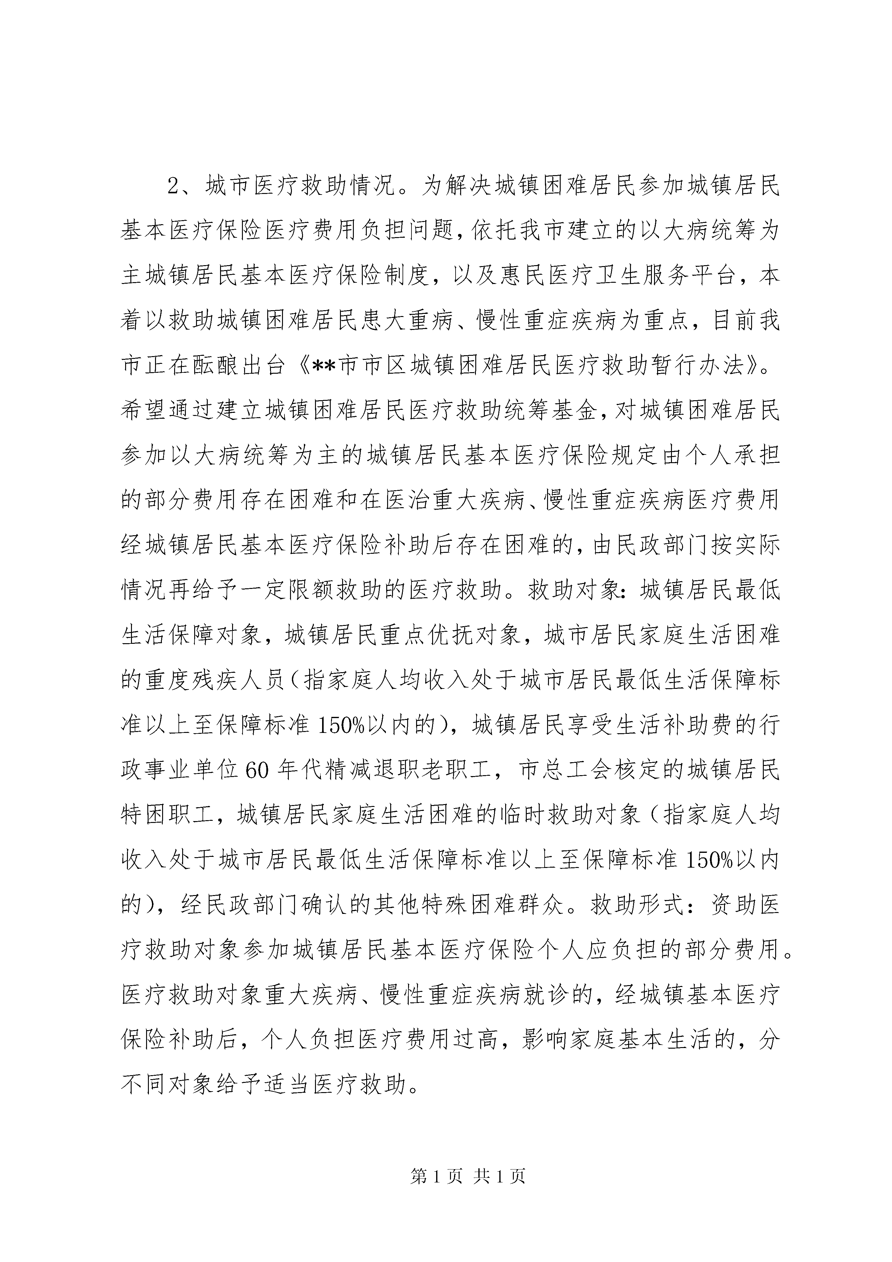 城乡困难居民医疗救助工作调研报告一、**市困难居民医疗救助基本情况1、农村医疗救助情况。制定出台政策。根据《XX省农村医疗救助实施办法》和《市政府关于在全市建立新型农村合作医疗制度的实施意见》等有关文件精神,以建立新型农村合作医疗为依托,以困难群众大病医疗救助为重点,切实保障农村低保户、农村五保户和农村因灾因病农民的基本医疗需要,我市于2004年经过近半年时间认真调研,经市民政、卫生、财政和各县区人民政府共同会商论证、市法制办依法公证、市政府同意,出台了《**市农村医疗救助实施细则》,各县区也制定了农村医疗救助实施规程或规章制度,纳入考核目标。积极筹措资金,落实了每年按每人30元筹措资金,其中市按每人6元,县区按每人24元。其中10元用于帮助医疗救助对象参加当地新型合作医疗的个人应承担的部分,20元作为第二次救助。积极实施救助,2004年以来,除省给予我市的农村医疗救助补助资金,我市各级共筹集农村医疗救助资金940.8万元,其中,市、县(区)财政投入719.2万元,各级彩票公益金105万元;社会捐助及其他投入116.6万元。每年全市参加农村医疗救助人数占全市农村人口3.2%以上,共资助参加新农合人数为48.6527万人次,资助参加新农合后二次救助人次人数达1.6908万人次;资助资金总额达979.683万元。2、城市医疗救助情况。为解决城镇困难居民参加城镇居民基本医疗保险医疗费用负担问题,依托我市建立的以大病统筹为主城镇居民基本医疗保险制度,以及惠民医疗卫生服务平台,本着以救助城镇困难居民患大重病、慢性重症疾病为重点,目前我市正在酝酿出台《**市市区城镇困难居民医疗救助暂行办法》。希望通过建立城镇困难居民医疗救助统筹基金,对城镇困难居民参加以大病统筹为主的城镇居民基本医疗保险规定由个人承担的部分费用存在困难和在医治重大疾病、慢性重症疾病医疗费用经城镇居民基本医疗保险补助后存在困难的,由民政部门按实际情况再给予一定限额救助的医疗救助。救助对象:城镇居民最低生活保障对象,城镇居民重点优抚对象,城市居民家庭生活困难的重度残疾人员(指家庭人均收入处于城市居民最低生活保障标准以上至保障标准150%以内的),城镇居民享受生活补助费的行政事业单位60年代精减退职老职工,市总工会核定的城镇居民特困职工,城镇居民家庭生活困难的临时救助对象(指家庭人均收入处于城市居民最低生活保障标准以上至保障标准150%以内的),经民政部门确认的其他特殊困难群众。救助形式:资助医疗救助对象参加城镇居民基本医疗保险个人应负担的部分费用。医疗救助对象重大疾病、慢性重症疾病就诊的,经城镇基本医疗保险补助后,个人负担医疗费用过高,影响家庭基本生活的,分不同对象给予适当医疗救助。二、医疗救助存在主要问题通过各级民政部门、卫生部门以及街道(乡镇)、社区(村)工作人员的共同努力,**市医疗救助政策实施以来,贫困群体就医难得到了一定缓解,特别是对患重大疾病的农村贫困群体及时给予了一定的资金救助,充分体现了市委和人民政府对贫困群体的关爱和帮扶。在看到成绩的同时,我们也看到了医疗救助存在着一定问题和困难。1、救助对象中无钱看病问题仍然严重目前救助对象患病没钱看病问题主要集中体现在以下三个方面:一是救助对象患病无力交纳住院押金,影响了病情正常治疗;二是医疗救助起付线过高。我市农村低保对象医疗救助起付线300元与90元的农村低保标准高出3倍多,这意味着将花去医疗救助对象3个多月的基本生活费。因此造成救助对象因无力支付基本医疗起付线费用,而不能及时就医难以享受医疗救助;三是目前我市采取的农村医疗救助政策属于医后救助方式,相当多的救助对象在患病后由于无力支付住院费或医疗费,而放弃治疗或延误治疗的问题突出。2、医疗救助比例及标准偏低我市目前实施的农村医疗救助政策,各县区对医疗救助比例及标准规定的普遍偏低,比如,XX县区对享受农村低保待遇的农村居民,对其住院医疗救助按25%、35%、45%三个比例实行救助,分为300-5000元、5001-10000元、10001元以上,全年个人累计救助额不超过10000元,显然救助比例和标准有些偏低。就救助比例而言,一名农村低保对象要得到10000元医疗救助自己要拿总医疗费的50%以上。按农村低保对象一般性住院治疗需费用10000元计算,按300元起付线,25%、35%的比例救助,此人只能取得救助金2325元。那么,该家庭需要承担7675元的医疗费用,占总医疗费的76.75%。美女学院的禁书异体——我的绯色天空理工大风流往事我的老婆是杀手一剑惊仙重生之官道城乡困难居民医疗救助工作调研报告而一名农村低保对象每月享受的保障标准为90元,一般低保家庭很难支付住院医疗费用,这就造成了申请医疗救助人员“少”,使大量患常见病、慢性病的贫困群体无
