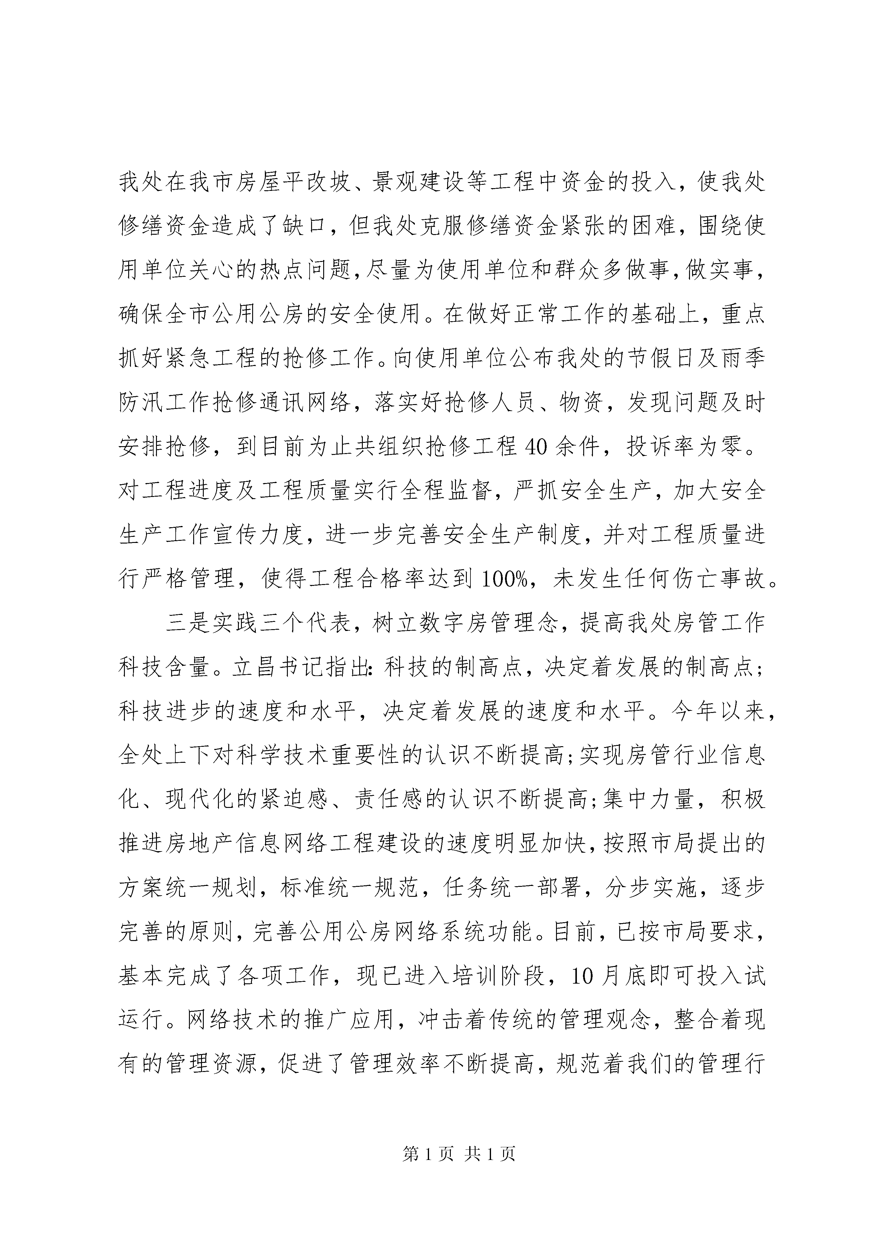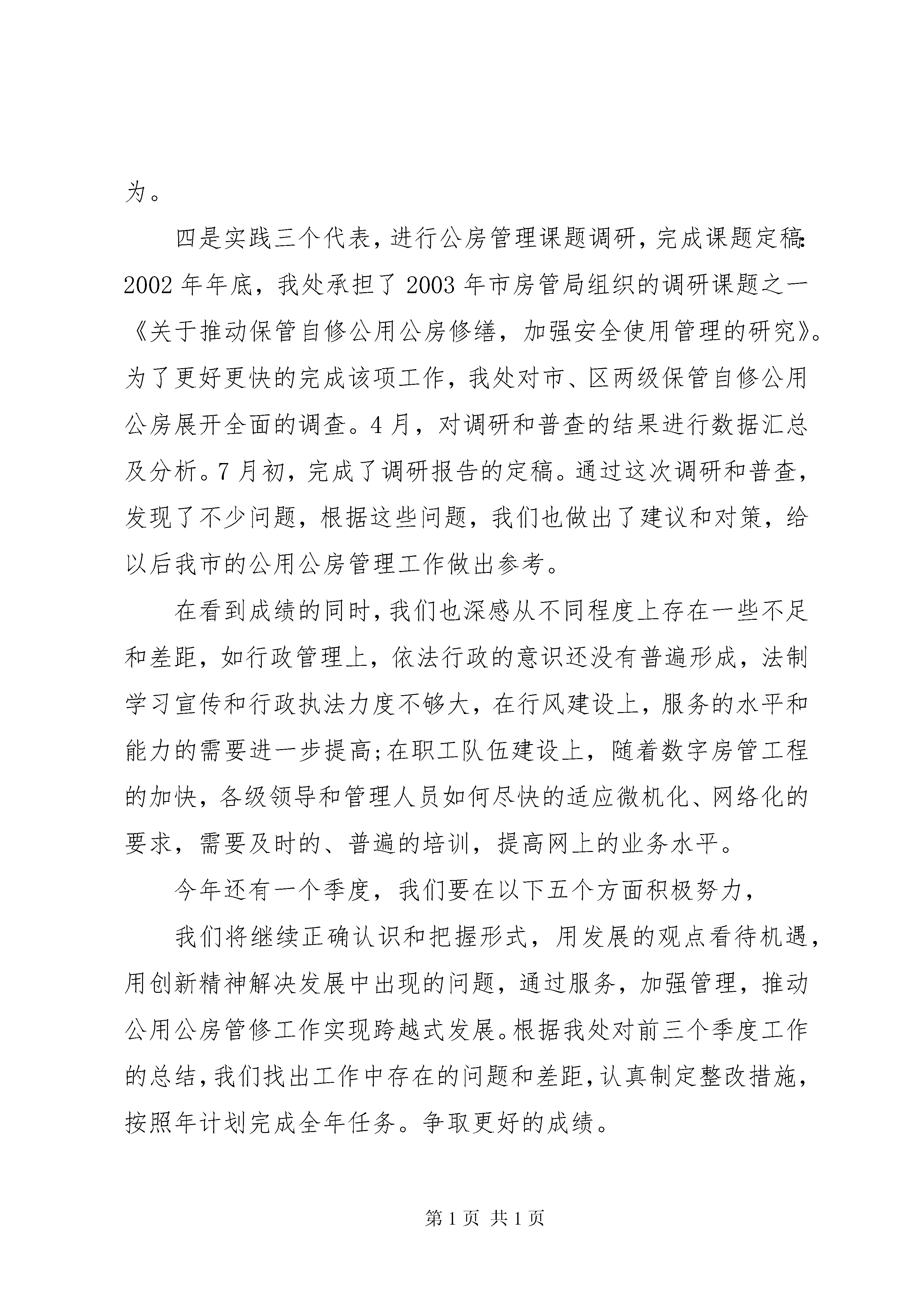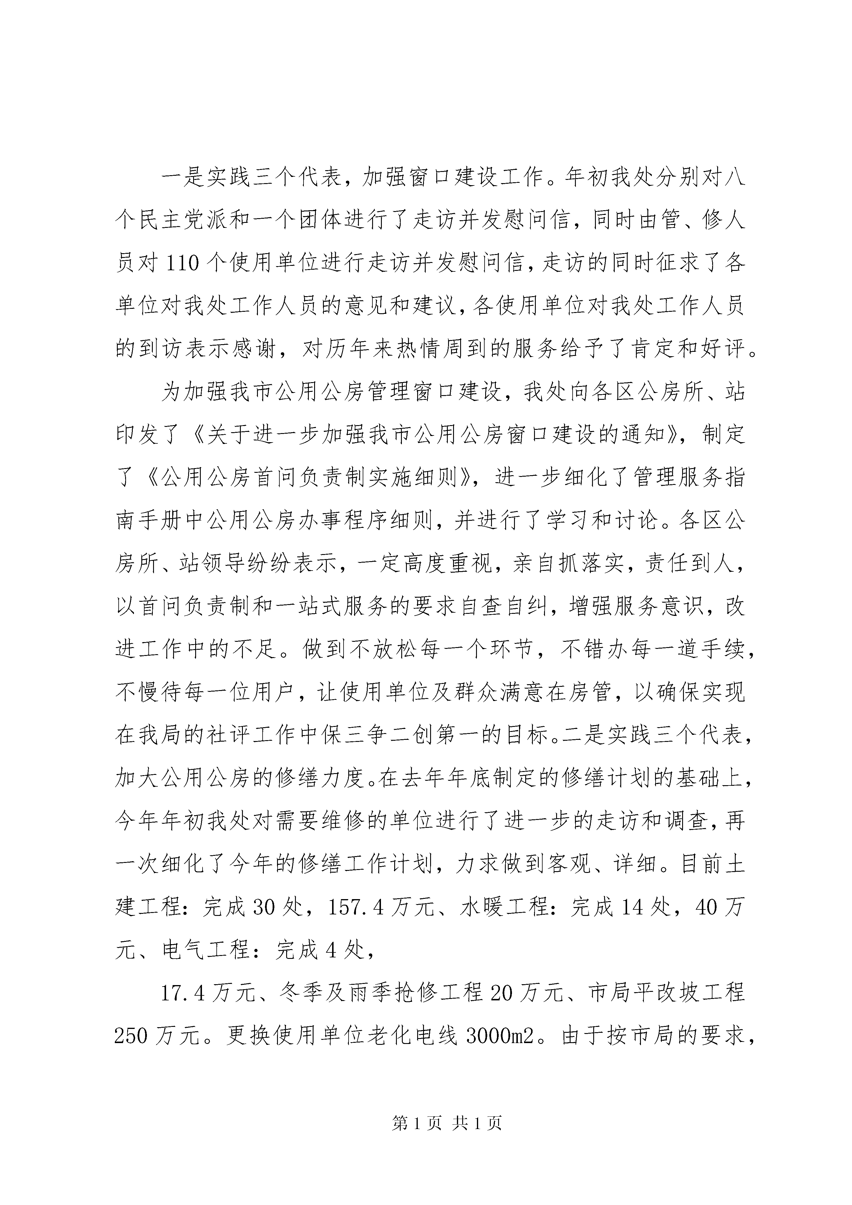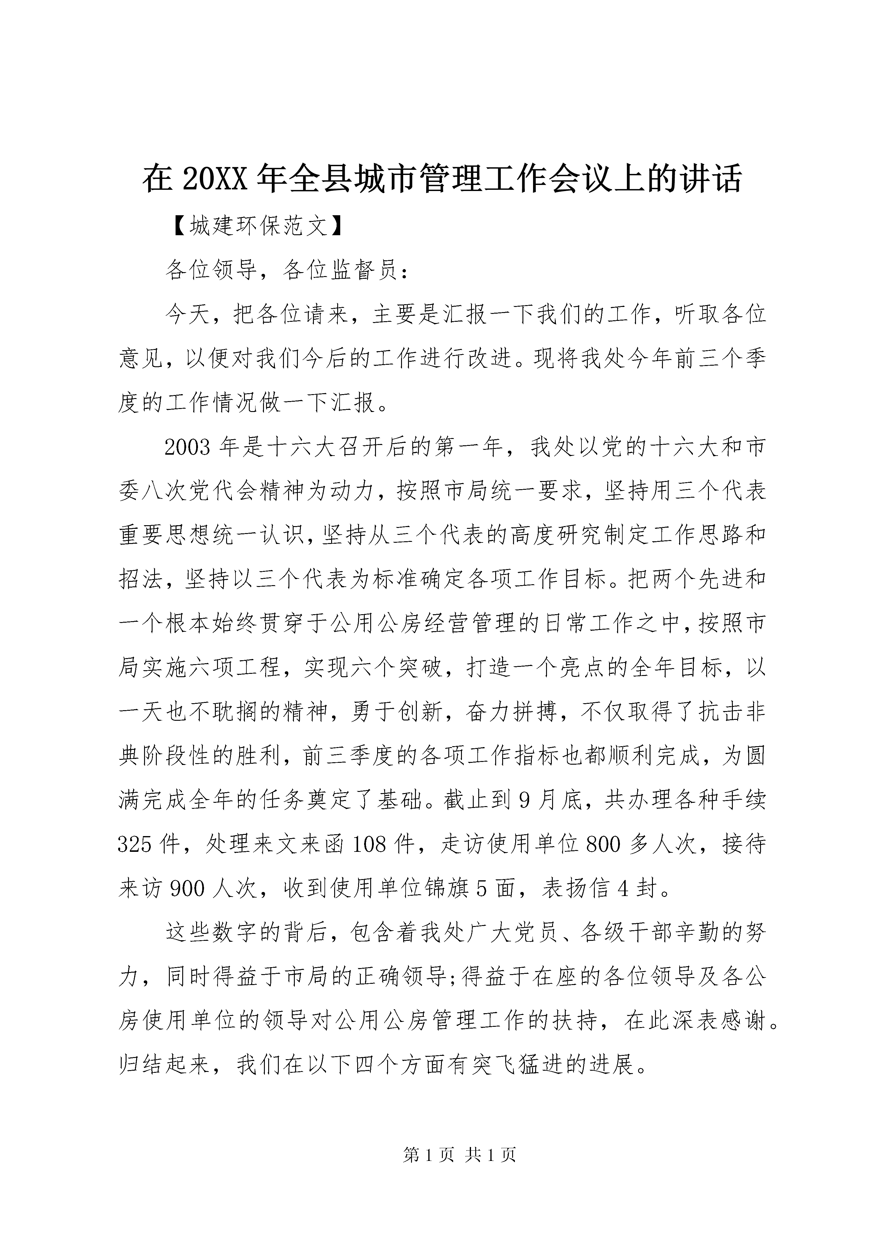 在20XX年全县城市管理工作会议上的讲话【城建环保范文】各位领导,各位监督员:今天,把各位请来,主要是汇报一下我们的工作,听取各位意见,以便对我们今后的工作进行改进。现将我处今年前三个季度的工作情况做一下汇报。2003年是十六大召开后的第一年,我处以党的十六大和市委八次党代会精神为动力,按照市局统一要求,坚持用三个代表重要思想统一认识,坚持从三个代表的高度研究制定工作思路和招法,坚持以三个代表为标准确定各项工作目标。把两个先进和一个根本始终贯穿于公用公房经营管理的日常工作之中,按照市局实施六项工程,实现六个突破,打造一个亮点的全年目标,以一天也不耽搁的精神,勇于创新,奋力拼搏,不仅取得了抗击非典阶段性的胜利,前三季度的各项工作指标也都顺利完成,为圆满完成全年的任务奠定了基础。截止到9月底,共办理各种手续325件,处理来文来函108件,走访使用单位800多人次,接待来访900人次,收到使用单位锦旗5面,表扬信4封。这些数字的背后,包含着我处广大党员、各级干部辛勤的努力,同时得益于市局的正确领导;得益于在座的各位领导及各公房使用单位的领导对公用公房管理工作的扶持,在此深表感谢。归结起来,我们在以下四个方面有突飞猛进的进展。一是实践三个代表,加强窗口建设工作。年初我处分别对八个民主党派和一个团体进行了走访并发慰问信,同时由管、修人员对110个使用单位进行走访并发慰问信,走访的同时征求了各单位对我处工作人员的意见和建议,各使用单位对我处工作人员的到访表示感谢,对历年来热情周到的服务给予了肯定和好评。为加强我市公用公房管理窗口建设,我处向各区公房所、站印发了《关于进一步加强我市公用公房窗口建设的通知》,制定了《公用公房首问负责制实施细则》,进一步细化了管理服务指南手册中公用公房办事程序细则,并进行了学习和讨论。各区公房所、站领导纷纷表示,一定高度重视,亲自抓落实,责任到人,以首问负责制和一站式服务的要求自查自纠,增强服务意识,改进工作中的不足。做到不放松每一个环节,不错办每一道手续,不慢待每一位用户,让使用单位及群众满意在房管,以确保实现在我局的社评工作中保三争二创第一的目标。二是实践三个代表,加大公用公房的修缮力度。在去年年底制定的修缮计划的基础上,今年年初我处对需要维修的单位进行了进一步的走访和调查,再一次细化了今年的修缮工作计划,力求做到客观、详细。目前土建工程:完成30处,157.4万元、水暖工程:完成14处,40万元、电气工程:完成4处,17.4万元、冬季及雨季抢修工程20万元、市局平改坡工程250万元。更换使用单位老化电线3000m2。由于按市局的要求,我处在我市房屋平改坡、景观建设等工程中资金的投入,使我处修缮资金造成了缺口,但我处克服修缮资金紧张的困难,围绕使用单位关心的热点问题,尽量为使用单位和群众多做事,做实事,确保全市公用公房的安全使用。在做好正常工作的基础上,重点抓好紧急工程的抢修工作。向使用单位公布我处的节假日及雨季防汛工作抢修通讯网络,落实好抢修人员、物资,发现问题及时安排抢修,到目前为止共组织抢修工程40余件,投诉率为零。对工程进度及工程质量实行全程监督,严抓安全生产,加大安全生产工作宣传力度,进一步完善安全生产制度,并对工程质量进行严格管理,使得工程合格率达到100%,未发生任何伤亡事故。三是实践三个代表,树立数字房管理念,提高我处房管工作科技含量。立昌书记指出:科技的制高点,决定着发展的制高点;科技进步的速度和水平,决定着发展的速度和水平。今年以来,全处上下对科学技术重要性的认识不断提高;实现房管行业信息化、现代化的紧迫感、责任感的认识不断提高;集中力量,积极推进房地产信息网络工程建设的速度明显加快,按照市局提出的方案统一规划,标准统一规范,任务统一部署,分步实施,逐步完善的原则,完善公用公房网络系统功能。目前,已按市局要求,基本完成了各项工作,现已进入培训阶段,10月底即可投入试运行。网络技术的推广应用,冲击着传统的管理观念,整合着现有的管理资源,促进了管理效率不断提高,规范着我们的管理行为。四是实践三个代表,进行公房管理课题调研,完成课题定稿:2002年年底,我处承担了2003年市房管局组织的调研课题之一《关于推动保管自修公用公房修缮,加强安全使用管理的研究》。为了更好更快的完成该项工作,我处对市、区两级保管自修公用公房展开全面的调查。4月,对调研和普查的结果进行数据汇总及分析。7月初,完成了调研报告的定稿。通过这次调研和普查,发现了不少问题,根据这些问题,我们也做出了建议和对策,给以后我市的公用公房管理工作做出参考。在看到成绩的同时,我们也深感从不同程度上存在一些不足和差距,如行政管理上,依法行政的意识还没有普遍形成,法制学习宣传和行政执法力度不够大,在行风建设上,服务的