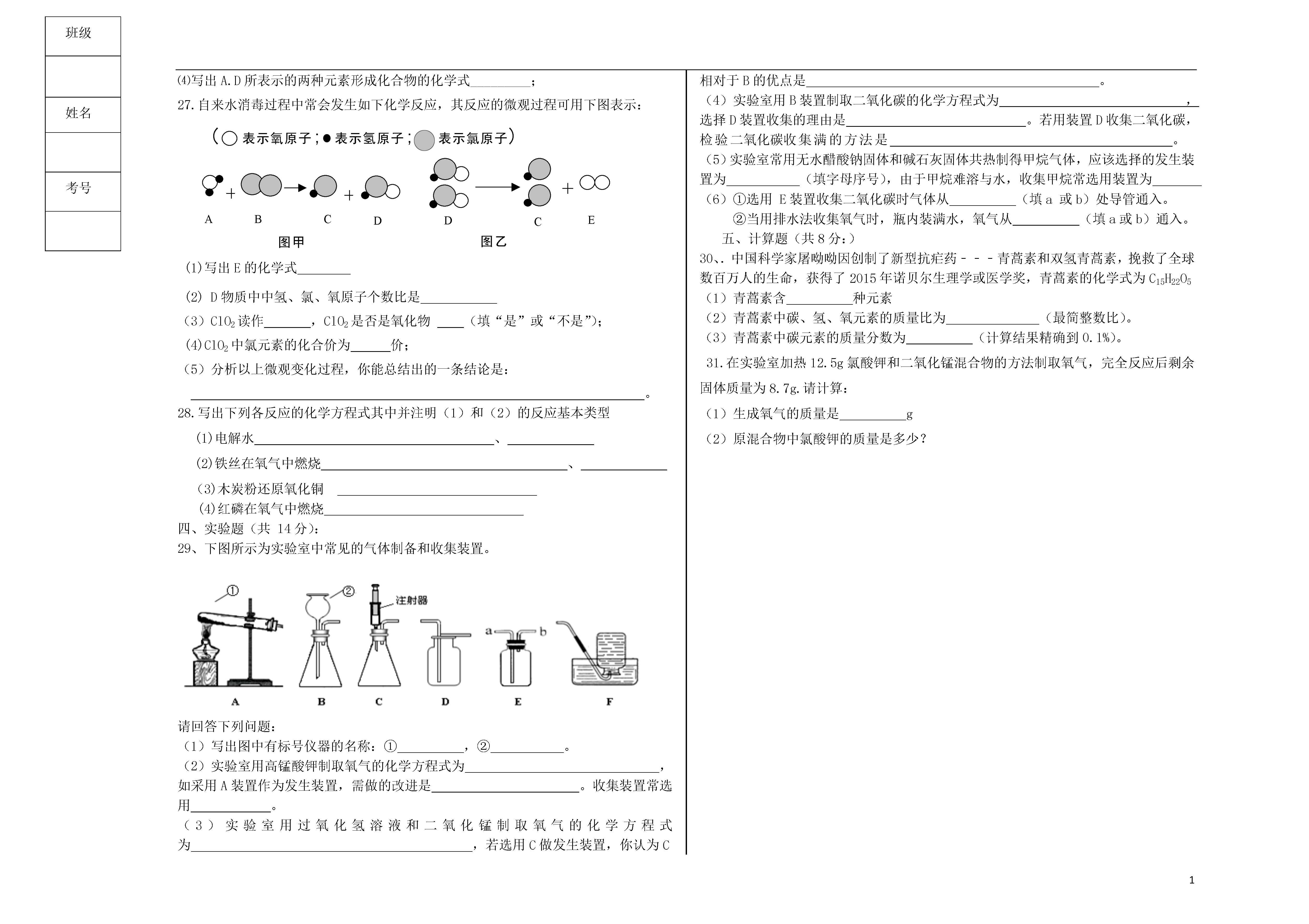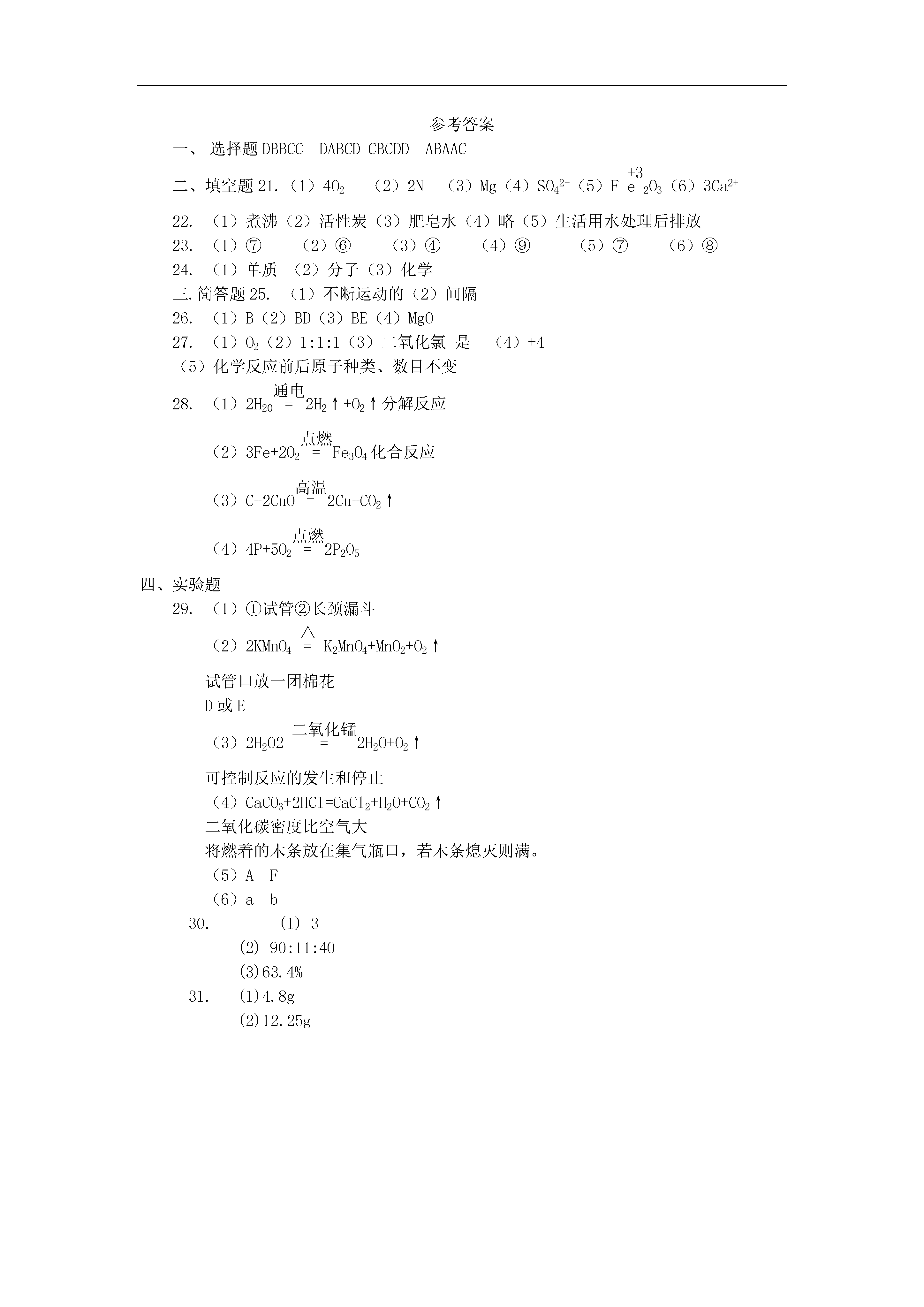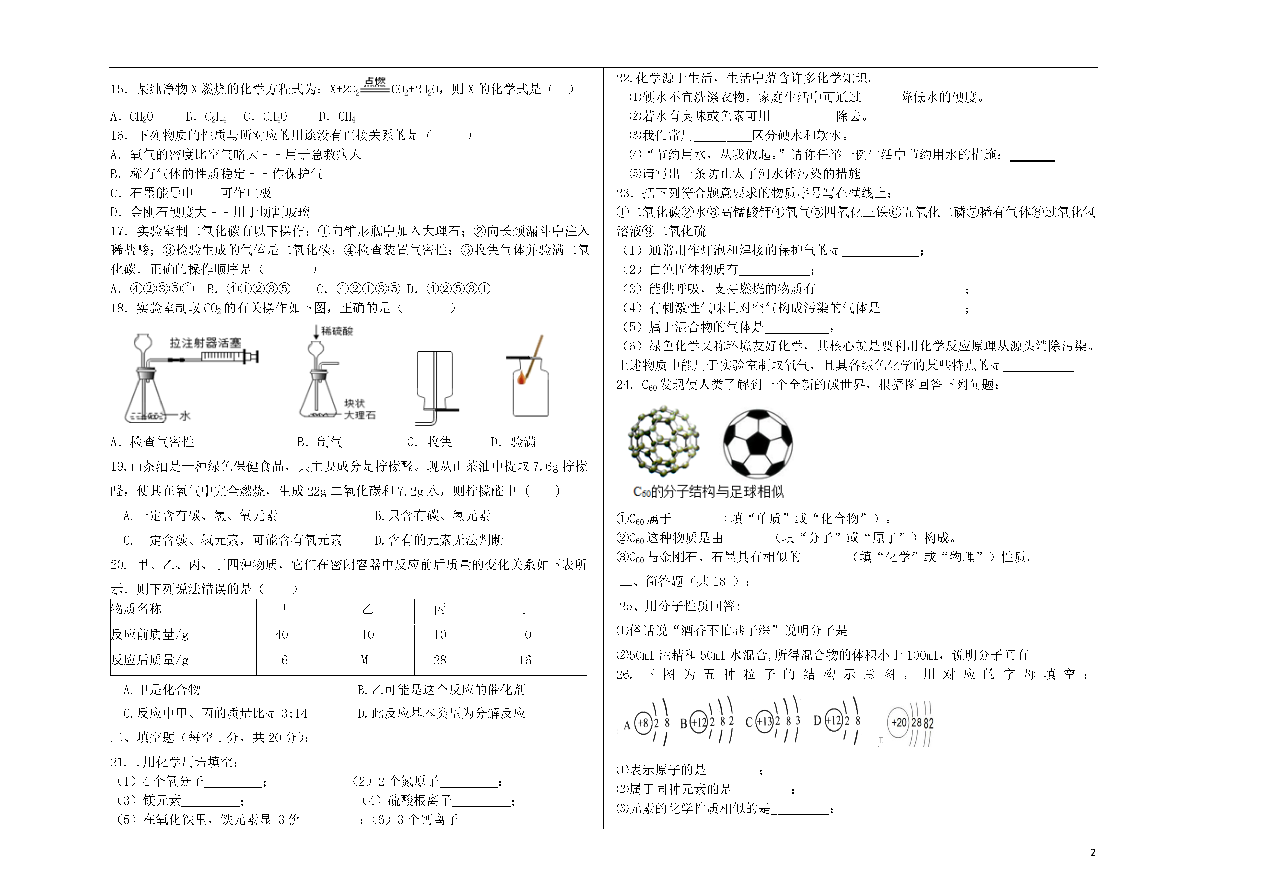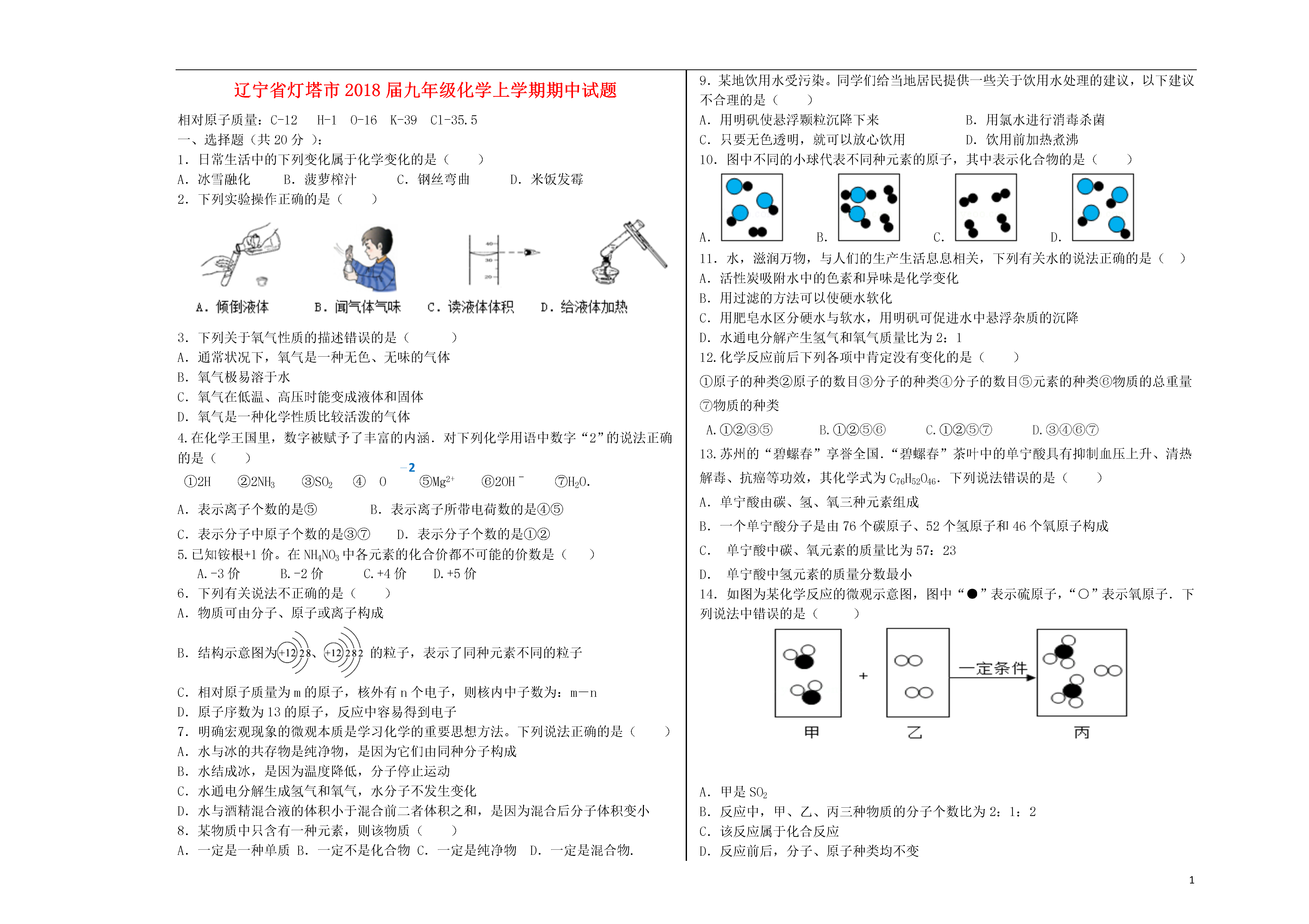 21辽宁省灯塔市2018届九年级化学上学期期中试题相对原子质量:C-12H-1O-16K-39Cl-35.5一、选择题(共20分):1.日常生活中的下列变化属于化学变化的是()A.冰雪融化B.菠萝榨汁C.钢丝弯曲D.米饭发霉2.下列实验操作正确的是()3.下列关于氧气性质的描述错误的是()A.通常状况下,氧气是一种无色、无味的气体B.氧气极易溶于水C.氧气在低温、高压时能变成液体和固体D.氧气是一种化学性质比较活泼的气体4.-2在化学王国里,数字被赋予了丰富的内涵.对下列化学用语中数字“2”的说法正确的是()①2H②2NH3③SO2④O⑤Mg2+⑥2OHˉ⑦H2O.A.表示离子个数的是⑤B.表示离子所带电荷数的是④⑤C.表示分子中原子个数的是③⑦D.表示分子个数的是①②5.已知铵根+1价。在NH4NO3中各元素的化合价都不可能的价数是()A.-3价B.-2价C.+4价D.+5价6.下列有关说法不正确的是()A.物质可由分子、原子或离子构成B.结构示意图为、的粒子,表示了同种元素不同的粒子C.相对原子质量为m的原子,核外有n个电子,则核内中子数为:m-nD.原子序数为13的原子,反应中容易得到电子7.明确宏观现象的微观本质是学习化学的重要思想方法。下列说法正确的是()A.水与冰的共存物是纯净物,是因为它们由同种分子构成B.水结成冰,是因为温度降低,分子停止运动C.水通电分解生成氢气和氧气,水分子不发生变化D.水与酒精混合液的体积小于混合前二者体积之和,是因为混合后分子体积变小8.某物质中只含有一种元素,则该物质()A.一定是一种单质B.一定不是化合物C.一定是纯净物D.一定是混合物.9.某地饮用水受污染。同学们给当地居民提供一些关于饮用水处理的建议,以下建议不合理的是()A.用明矾使悬浮颗粒沉降下来B.用氯水进行消毒杀菌C.只要无色透明,就可以放心饮用D.饮用前加热煮沸10.图中不同的小球代表不同种元素的原子,其中表示化合物的是()A.B.C.D.11.水,滋润万物,与人们的生产生活息息相关,下列有关水的说法正确的是()A.活性炭吸附水中的色素和异味是化学变化B.用过滤的方法可以使硬水软化C.用肥皂水区分硬水与软水,用明矾可促进水中悬浮杂质的沉降D.水通电分解产生氢气和氧气质量比为2:112.化学反应前后下列各项中肯定没有变化的是()①原子的种类②原子的数目③分子的种类④分子的数目⑤元素的种类⑥物质的总重量⑦物质的种类A.①②③⑤B.①②⑤⑥C.①②⑤⑦D.③④⑥⑦13.苏州的“碧螺春”享誉全国.“碧螺春”茶叶中的单宁酸具有抑制血压上升、清热解毒、抗癌等功效,其化学式为C76H52O46.下列说法错误的是()A.单宁酸由碳、氢、氧三种元素组成B.一个单宁酸分子是由76个碳原子、52个氢原子和46个氧原子构成C.单宁酸中碳、氧元素的质量比为57:23D.单宁酸中氢元素的质量分数最小14.如图为某化学反应的微观示意图,图中“●”表示硫原子,“○”表示氧原子.下列说法中错误的是()A.甲是SO2B.反应中,甲、乙、丙三种物质的分子个数比为2:1:2C.该反应属于化合反应D.反应前后,分子、原子种类均不变15.某纯净物X燃烧的化学方程式为:X+2O2CO2+2H2O,则X的化学式是()A.CH20B.C2H4C.CH4OD.CH416.下列物质的性质与所对应的用途没有直接关系的是()A.氧气的密度比空气略大﹣﹣用于急救病人B.稀有气体的性质稳定﹣﹣作保护气C.石墨能导电﹣﹣可作电极D.金刚石硬度大﹣﹣用于切割玻璃17.实验室制二氧化碳有以下操作:①向锥形瓶中加入大理石;②向长颈漏斗中注入稀盐酸;③检验生成的气体是二氧化碳;④检查装置气密性;⑤收集气体并验满二氧化碳.正确的操作顺序是()A.④②③⑤①B.④①②③⑤C.④②①③⑤D.④②⑤③①18.实验室制取CO2的有关操作如下图,正确的是()A.检查气密性B.制气C.收集D.验满19.山茶油是一种绿色保健食品,其主要成分是柠檬醛。现从山茶油中提取7.6g柠檬醛,使其在氧气中完全燃烧,生成22g二氧化碳和7.2g水,则柠檬醛中()A.一定含有碳、氢、氧元素B.只含有碳、氢元素C.一定含碳、氢元素,可能含有氧元素D.含有的元素无法判断20.甲、乙、丙、丁四种物质,它们在密闭容器中反应前后质量的变化关系如下表所示.则下列说法错误的是()物质名称甲乙丙丁反应前质量/g4010100反应后质量/g6M2816A.甲是化合物B.乙可能是这个反应的催化剂C.反应中甲、丙的质量比是3:14D.此反应基本类型为分解反应二、填