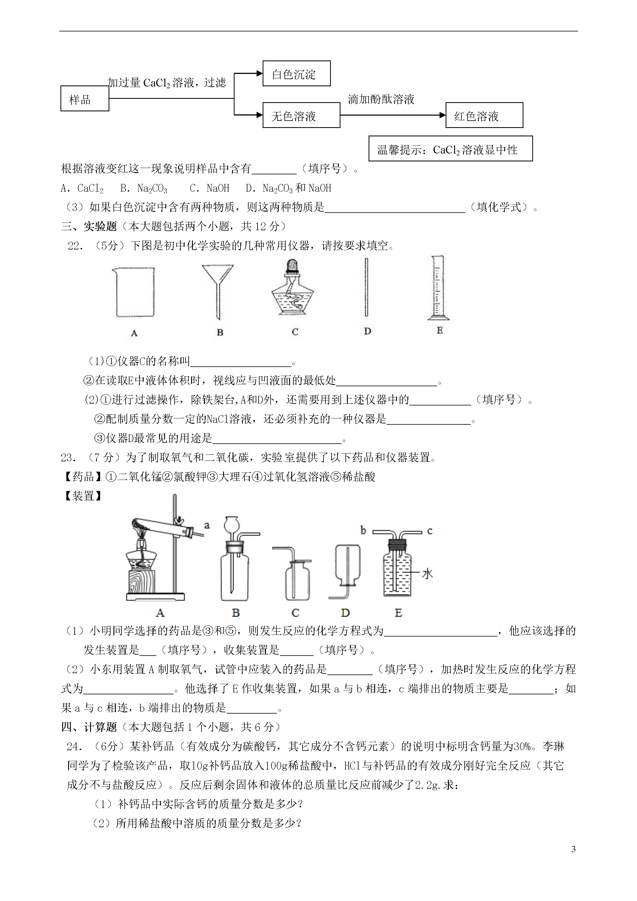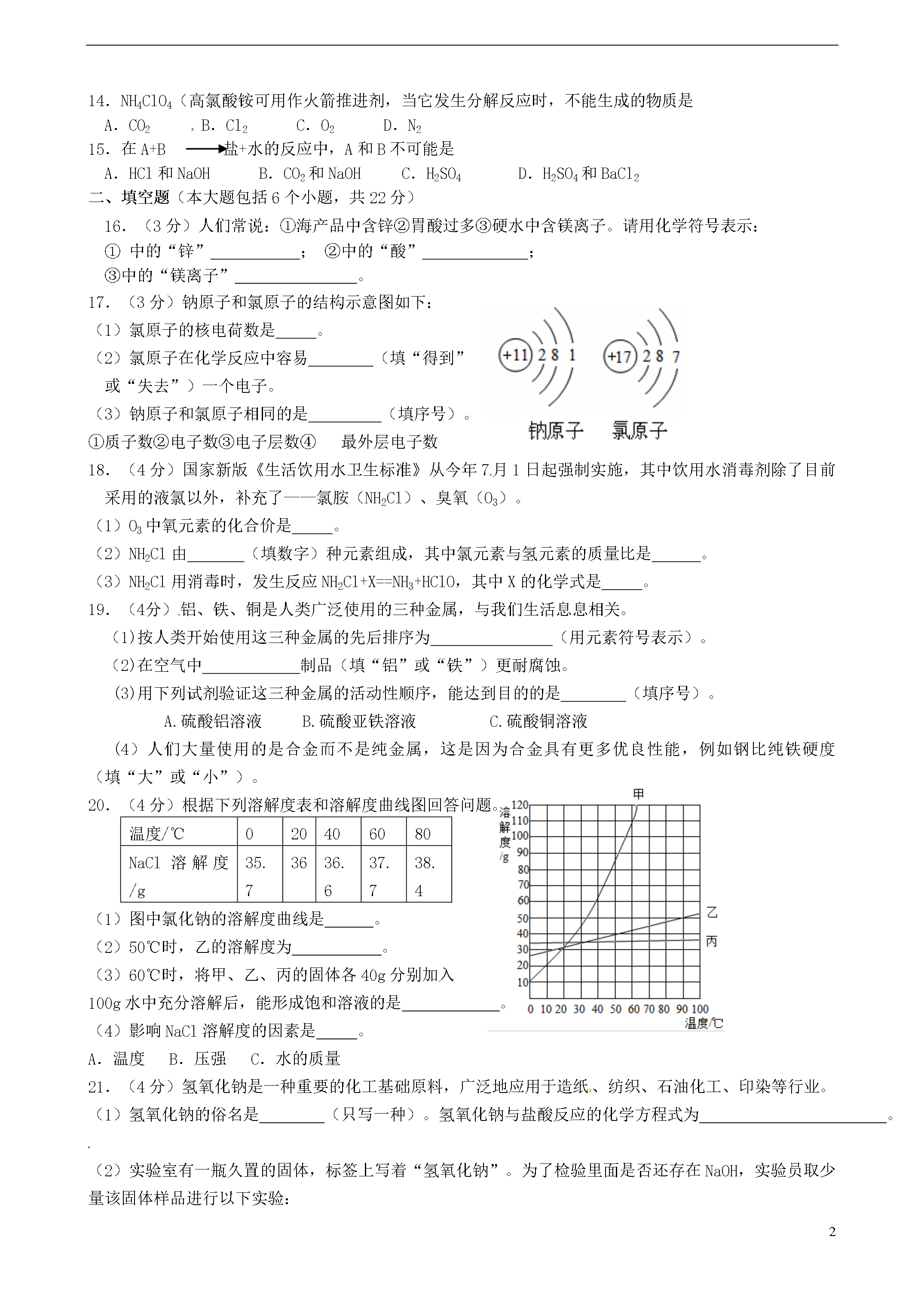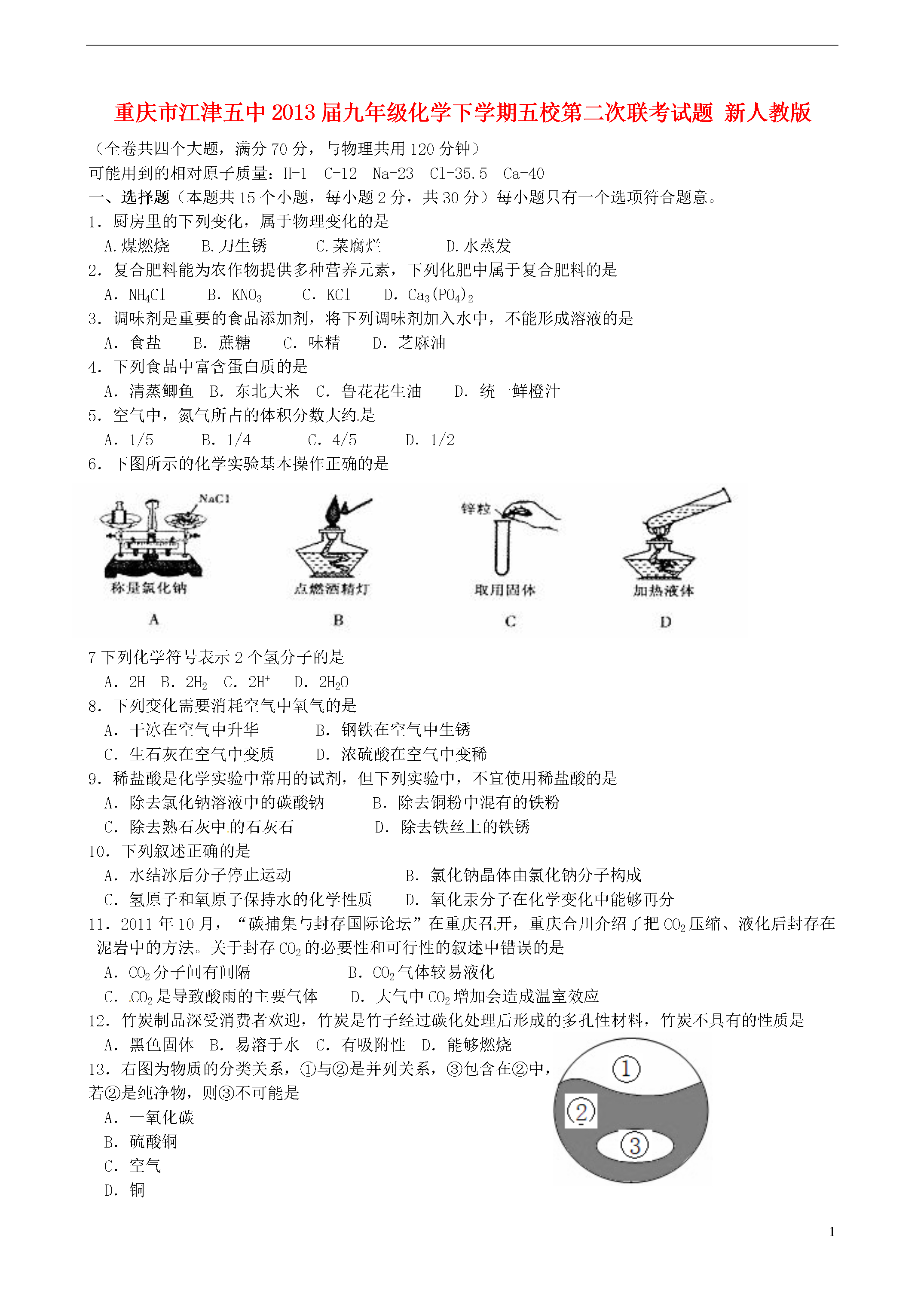 7重庆市江津五中2013届九年级化学下学期五校第二次联考试题新人教版(全卷共四个大题,满分70分,与物理共用120分钟)可能用到的相对原子质量:H-1C-12Na-23Cl-35.5Ca-40一、选择题(本题共15个小题,每小题2分,共30分)每小题只有一个选项符合题意。1.厨房里的下列变化,属于物理变化的是A.煤燃烧B.刀生锈C.菜腐烂D.水蒸发2.复合肥料能为农作物提供多种营养元素,下列化肥中属于复合肥料的是A.NH4ClB.KNO3C.KClD.Ca3(PO4)23.调味剂是重要的食品添加剂,将下列调味剂加入水中,不能形成溶液的是A.食盐B.蔗糖C.味精D.芝麻油4.下列食品中富含蛋白质的是A.清蒸鲫鱼B.东北大米C.鲁花花生油D.统一鲜橙汁5.空气中,氮气所占的体积分数大约是A.1/5B.1/4C.4/5D.1/26.下图所示的化学实验基本操作正确的是7下列化学符号表示2个氢分子的是A.2HB.2H2C.2H+D.2H2O8.下列变化需要消耗空气中氧气的是A.干冰在空气中升华B.钢铁在空气中生锈C.生石灰在空气中变质D.浓硫酸在空气中变稀9.稀盐酸是化学实验中常用的试剂,但下列实验中,不宜使用稀盐酸的是A.除去氯化钠溶液中的碳酸钠B.除去铜粉中混有的铁粉C.除去熟石灰中的石灰石D.除去铁丝上的铁锈10.下列叙述正确的是A.水结冰后分子停止运动B.氯化钠晶体由氯化钠分子构成C.氢原子和氧原子保持水的化学性质D.氧化汞分子在化学变化中能够再分11.2011年10月,“碳捕集与封存国际论坛”在重庆召开,重庆合川介绍了把CO2压缩、液化后封存在泥岩中的方法。关于封存CO2的必要性和可行性的叙述中错误的是A.CO2分子间有间隔B.CO2气体较易液化C.CO2是导致酸雨的主要气体D.大气中CO2增加会造成温室效应12.竹炭制品深受消费者欢迎,竹炭是竹子经过碳化处理后形成的多孔性材料,竹炭不具有的性质是A.黑色固体B.易溶于水C.有吸附性D.能够燃烧13.右图为物质的分类关系,①与②是并列关系,③包含在②中,若②是纯净物,则③不可能是A.一氧化碳B.硫酸铜C.空气D.铜14.NH4ClO4(高氯酸铵可用作火箭推进剂,当它发生分解反应时,不能生成的物质是A.CO2B.Cl2C.O2D.N215.在A+B盐+水的反应中,A和B不可能是A.HCl和NaOHB.CO2和NaOHC.H2SO4D.H2SO4和BaCl2二、填空题(本大题包括6个小题,共22分)16.(3分)人们常说:①海产品中含锌②胃酸过多③硬水中含镁离子。请用化学符号表示:①中的“锌”;②中的“酸”;③中的“镁离子”。17.(3分)钠原子和氯原子的结构示意图如下:(1)氯原子的核电荷数是。(2)氯原子在化学反应中容易(填“得到”或“失去”)一个电子。(3)钠原子和氯原子相同的是(填序号)。①质子数②电子数③电子层数④最外层电子数18.(4分)国家新版《生活饮用水卫生标准》从今年7月1日起强制实施,其中饮用水消毒剂除了目前采用的液氯以外,补充了——氯胺(NH2Cl)、臭氧(O3)。(1)O3中氧元素的化合价是。(2)NH2Cl由(填数字)种元素组成,其中氯元素与氢元素的质量比是。(3)NH2Cl用消毒时,发生反应NH2Cl+X==NH3+HClO,其中X的化学式是。19.(4分)铝、铁、铜是人类广泛使用的三种金属,与我们生活息息相关。(1)按人类开始使用这三种金属的先后排序为(用元素符号表示)。(2)在空气中制品(填“铝”或“铁”)更耐腐蚀。(3)用下列试剂验证这三种金属的活动性顺序,能达到目的的是(填序号)。A.硫酸铝溶液B.硫酸亚铁溶液C.硫酸铜溶液(4)人们大量使用的是合金而不是纯金属,这是因为合金具有更多优良性能,例如钢比纯铁硬度(填“大”或“小”)。20.(4分)根据下列溶解度表和溶解度曲线图回答问题。温度/℃020406080NaCl溶解度/g35.73636.637.738.4(1)图中氯化钠的溶解度曲线是。(2)50℃时,乙的溶解度为。(3)60℃时,将甲、乙、丙的固体各40g分别加入100g水中充分溶解后,能形成饱和溶液的是。(4)影响NaCl溶解度的因素是。A.温度B.压强C.水的质量21.(4分)氢氧化钠是一种重要的化工基础原料,广泛地应用于造纸、纺织、石油化工、印染等行业。(1)氢氧化钠的俗名是(只写一种)。氢氧化钠与盐酸反应的化学方程式为。(2)实验室有一瓶久置的固体,标签上写着“氢氧化钠”。为了检验里面是否还存在NaOH,实验员取少量该固体样品进行以下实验:滴加酚酞溶液加过量CaCl2溶液,过滤样品白色沉淀无色溶液红色溶液温馨提示:CaCl2溶液显中性根据溶液变红这一现象说明样品中含有(填序号)。A.CaCl2B.Na2CO3C.NaOHD.Na2