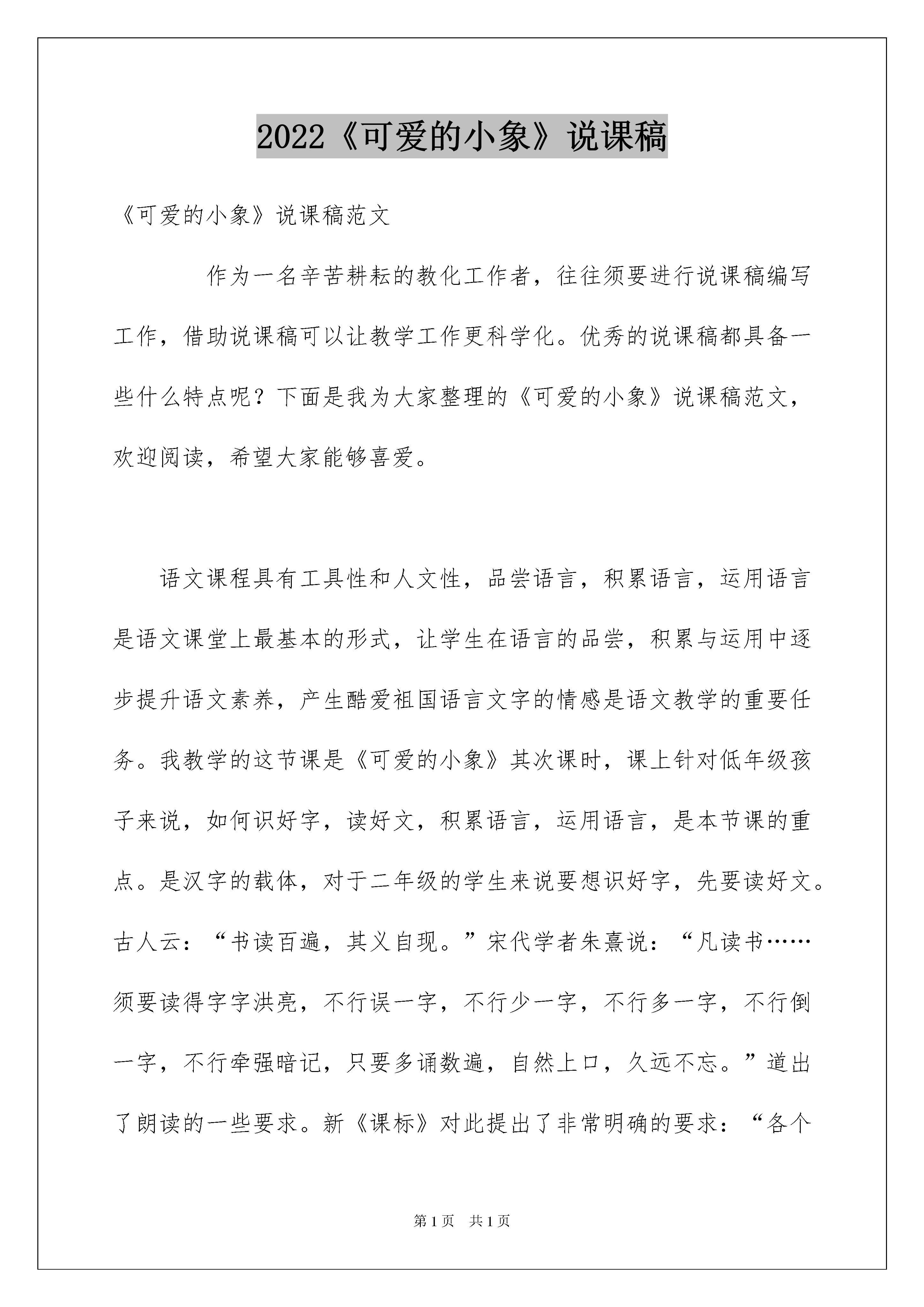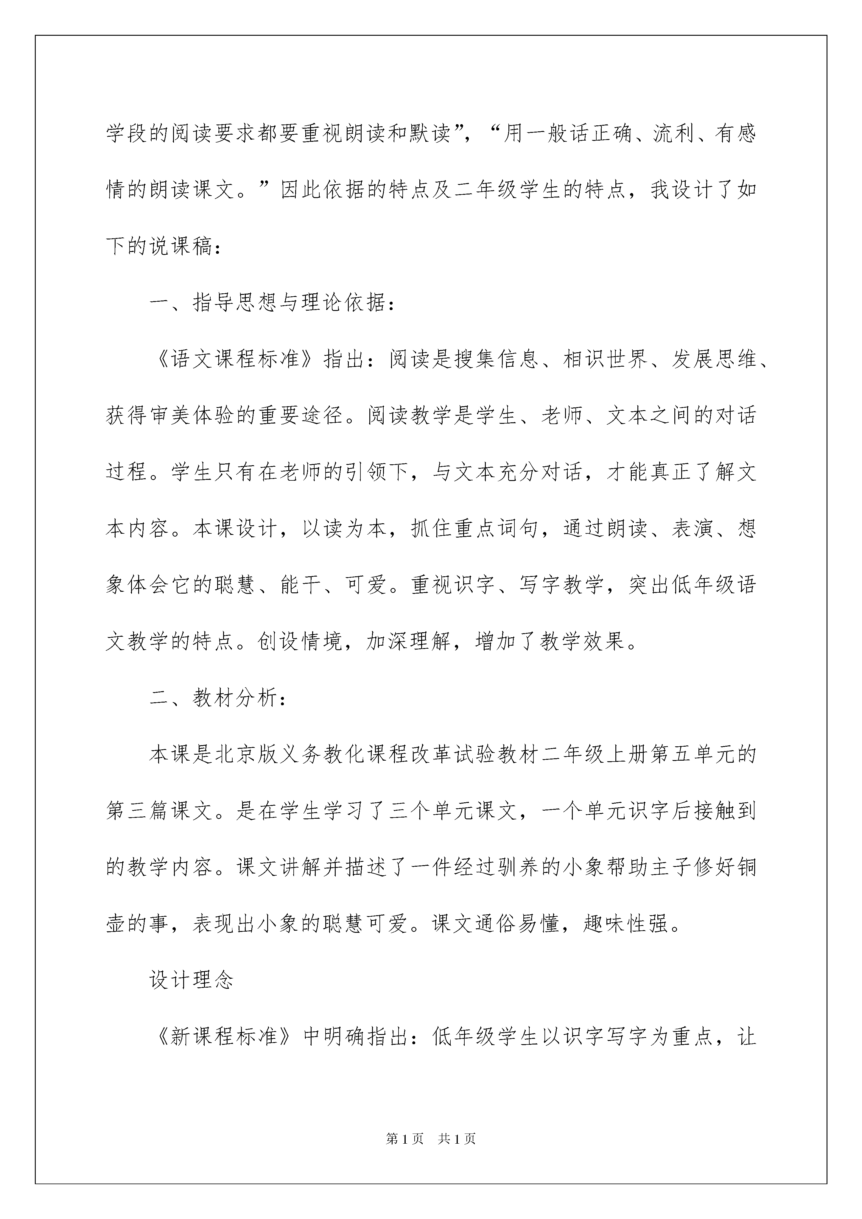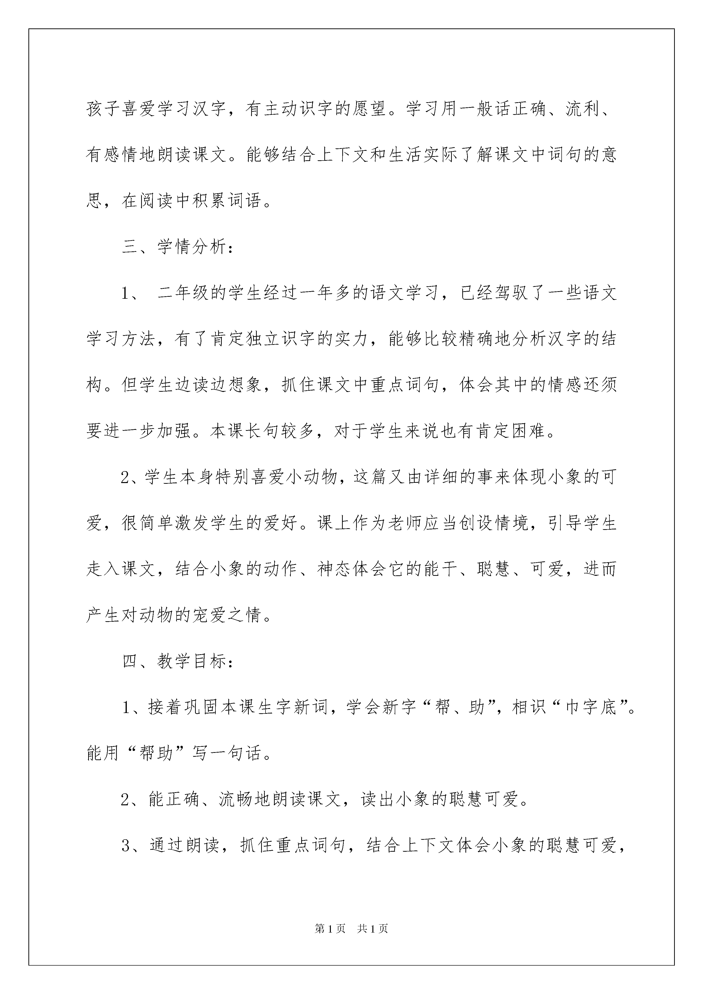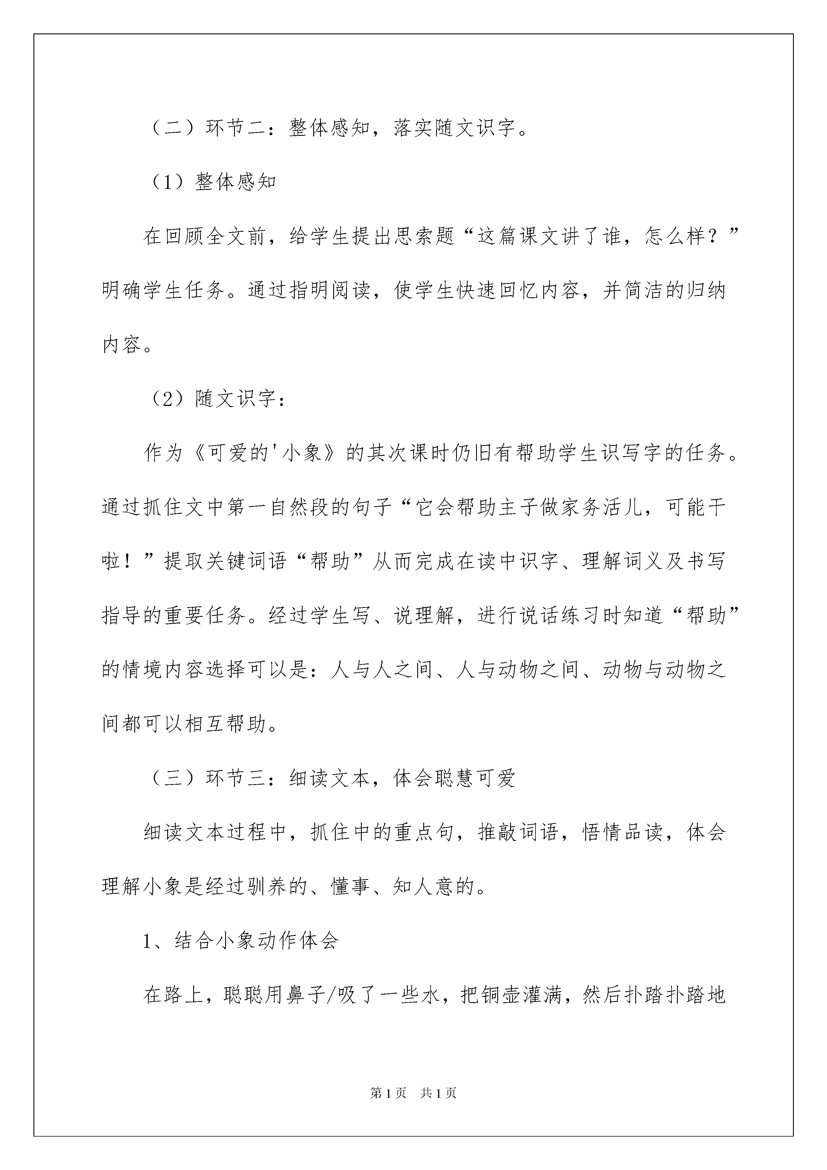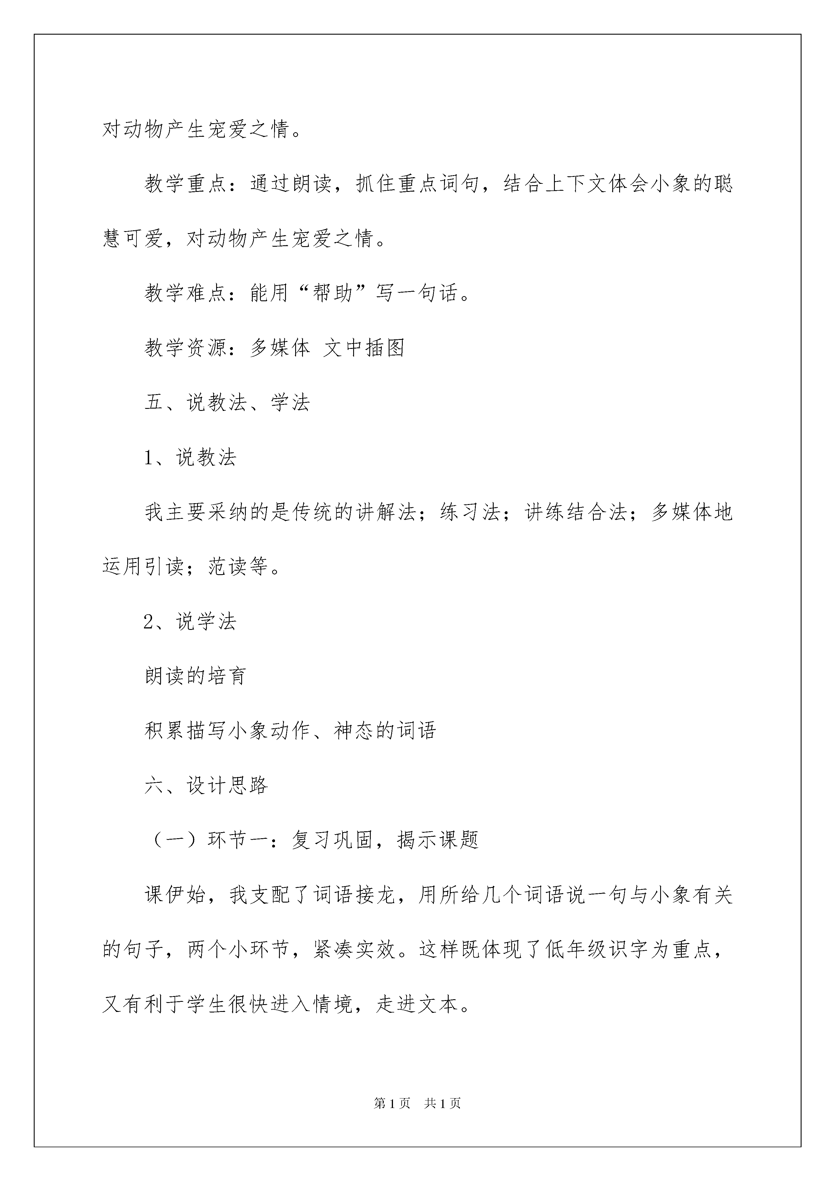 2022《可爱的小象》说课稿《可爱的小象》说课稿范文作为一名辛苦耕耘的教化工作者,往往须要进行说课稿编写工作,借助说课稿可以让教学工作更科学化。优秀的说课稿都具备一些什么特点呢?下面是我为大家整理的《可爱的小象》说课稿范文,欢迎阅读,希望大家能够喜爱。语文课程具有工具性和人文性,品尝语言,积累语言,运用语言是语文课堂上最基本的形式,让学生在语言的品尝,积累与运用中逐步提升语文素养,产生酷爱祖国语言文字的情感是语文教学的重要任务。我教学的这节课是《可爱的小象》其次课时,课上针对低年级孩子来说,如何识好字,读好文,积累语言,运用语言,是本节课的重点。是汉字的载体,对于二年级的学生来说要想识好字,先要读好文。古人云:“书读百遍,其义自现。”宋代学者朱熹说:“凡读书……须要读得字字洪亮,不行误一字,不行少一字,不行多一字,不行倒一字,不行牵强暗记,只要多诵数遍,自然上口,久远不忘。”道出了朗读的一些要求。新《课标》对此提出了非常明确的要求:“各个学段的阅读要求都要重视朗读和默读”,“用一般话正确、流利、有感情的朗读课文。”因此依据的特点及二年级学生的特点,我设计了如下的说课稿:一、指导思想与理论依据:《语文课程标准》指出:阅读是搜集信息、相识世界、发展思维、获得审美体验的重要途径。阅读教学是学生、老师、文本之间的对话过程。学生只有在老师的引领下,与文本充分对话,才能真正了解文本内容。本课设计,以读为本,抓住重点词句,通过朗读、表演、想象体会它的聪慧、能干、可爱。重视识字、写字教学,突出低年级语文教学的特点。创设情境,加深理解,增加了教学效果。二、教材分析:本课是北京版义务教化课程改革试验教材二年级上册第五单元的第三篇课文。是在学生学习了三个单元课文,一个单元识字后接触到的教学内容。课文讲解并描述了一件经过驯养的小象帮助主子修好铜壶的事,表现出小象的聪慧可爱。课文通俗易懂,趣味性强。设计理念《新课程标准》中明确指出:低年级学生以识字写字为重点,让孩子喜爱学习汉字,有主动识字的愿望。学习用一般话正确、流利、有感情地朗读课文。能够结合上下文和生活实际了解课文中词句的意思,在阅读中积累词语。三、学情分析:1、二年级的学生经过一年多的语文学习,已经驾驭了一些语文学习方法,有了肯定独立识字的实力,能够比较精确地分析汉字的结构。但学生边读边想象,抓住课文中重点词句,体会其中的情感还须要进一步加强。本课长句较多,对于学生来说也有肯定困难。2、学生本身特别喜爱小动物,这篇又由详细的事来体现小象的可爱,很简单激发学生的爱好。课上作为老师应当创设情境,引导学生走入课文,结合小象的动作、神态体会它的能干、聪慧、可爱,进而产生对动物的宠爱之情。四、教学目标:1、接着巩固本课生字新词,学会新字“帮、助”,相识“巾字底”。能用“帮助”写一句话。2、能正确、流畅地朗读课文,读出小象的聪慧可爱。3、通过朗读,抓住重点词句,结合上下文体会小象的聪慧可爱,对动物产生宠爱之情。教学重点:通过朗读,抓住重点词句,结合上下文体会小象的聪慧可爱,对动物产生宠爱之情。教学难点:能用“帮助”写一句话。教学资源:多媒体文中插图五、说教法、学法1、说教法我主要采纳的是传统的讲解法;练习法;讲练结合法;多媒体地运用引读;范读等。2、说学法朗读的培育积累描写小象动作、神态的词语六、设计思路(一)环节一:复习巩固,揭示课题课伊始,我支配了词语接龙,用所给几个词语说一句与小象有关的句子,两个小环节,紧凑实效。这样既体现了低年级识字为重点,又有利于学生很快进入情境,走进文本。(二)环节二:整体感知,落实随文识字。(1)整体感知在回顾全文前,给学生提出思索题“这篇课文讲了谁,怎么样?”明确学生任务。通过指明阅读,使学生快速回忆内容,并简洁的归纳内容。(2)随文识字:作为《可爱的'小象》的其次课时仍旧有帮助学生识写字的任务。通过抓住文中第一自然段的句子“它会帮助主子做家务活儿,可能干啦!”提取关键词语“帮助”从而完成在读中识字、理解词义及书写指导的重要任务。经过学生写、说理解,进行说话练习时知道“帮助”的情境内容选择可以是:人与人之间、人与动物之间、动物与动物之间都可以相互帮助。(三)环节三:细读文本,体会聪慧可爱细读文本过程中,抓住中的重点句,推敲词语,悟情品读,体会理解小象是经过驯养的、懂事、知人意的。1、结合小象动作体会在路上,聪聪用鼻子/吸了一些水,把铜壶灌满,然后扑踏扑踏地/向铜匠铺走去。重点让学生体会“小象为什么要吸一次水?”扑踏扑踏说明走路速度很慢。为什么走得这么慢呢?那就是小象走得稳,怕把壶里的水洒了。联系上文体会小象的“聪慧”。