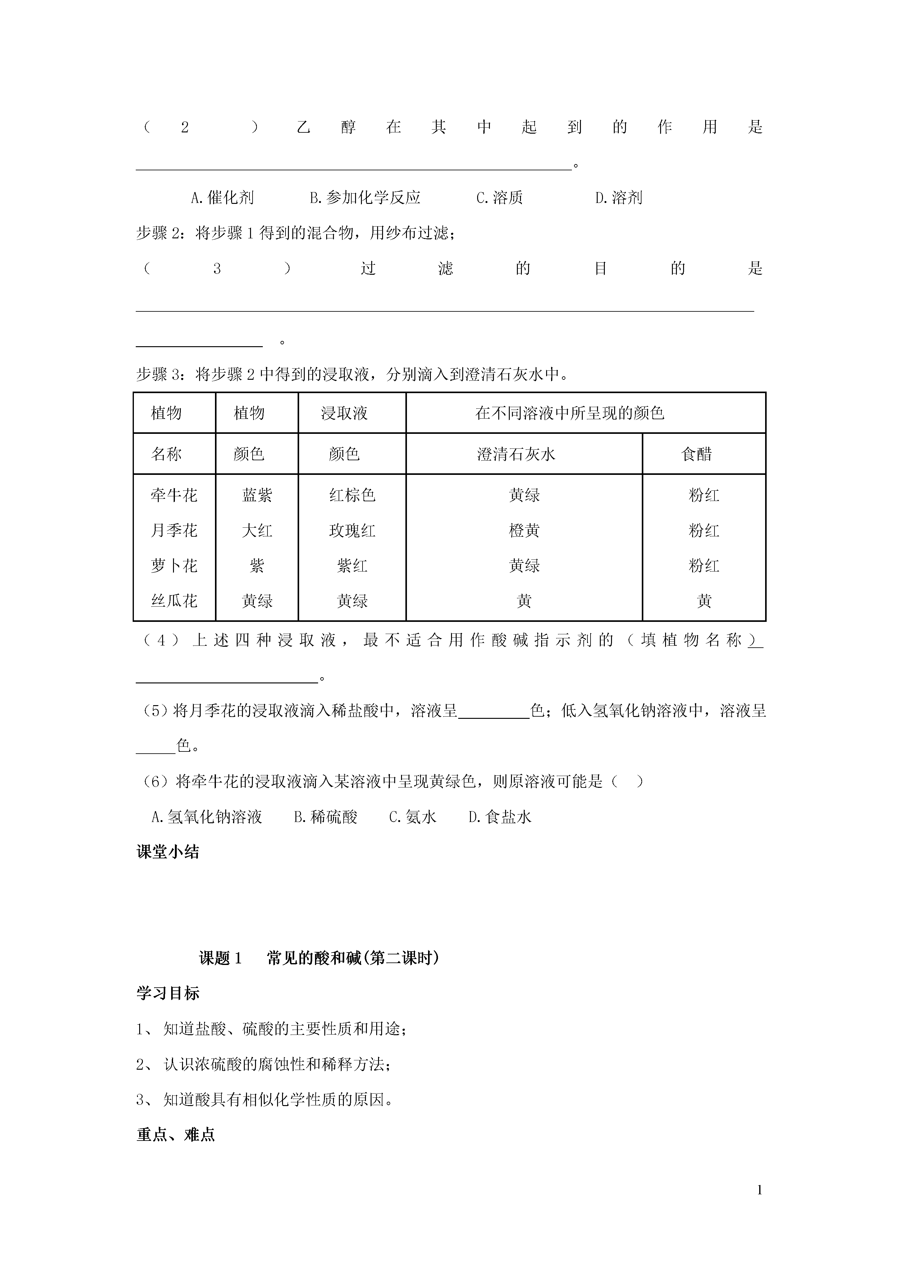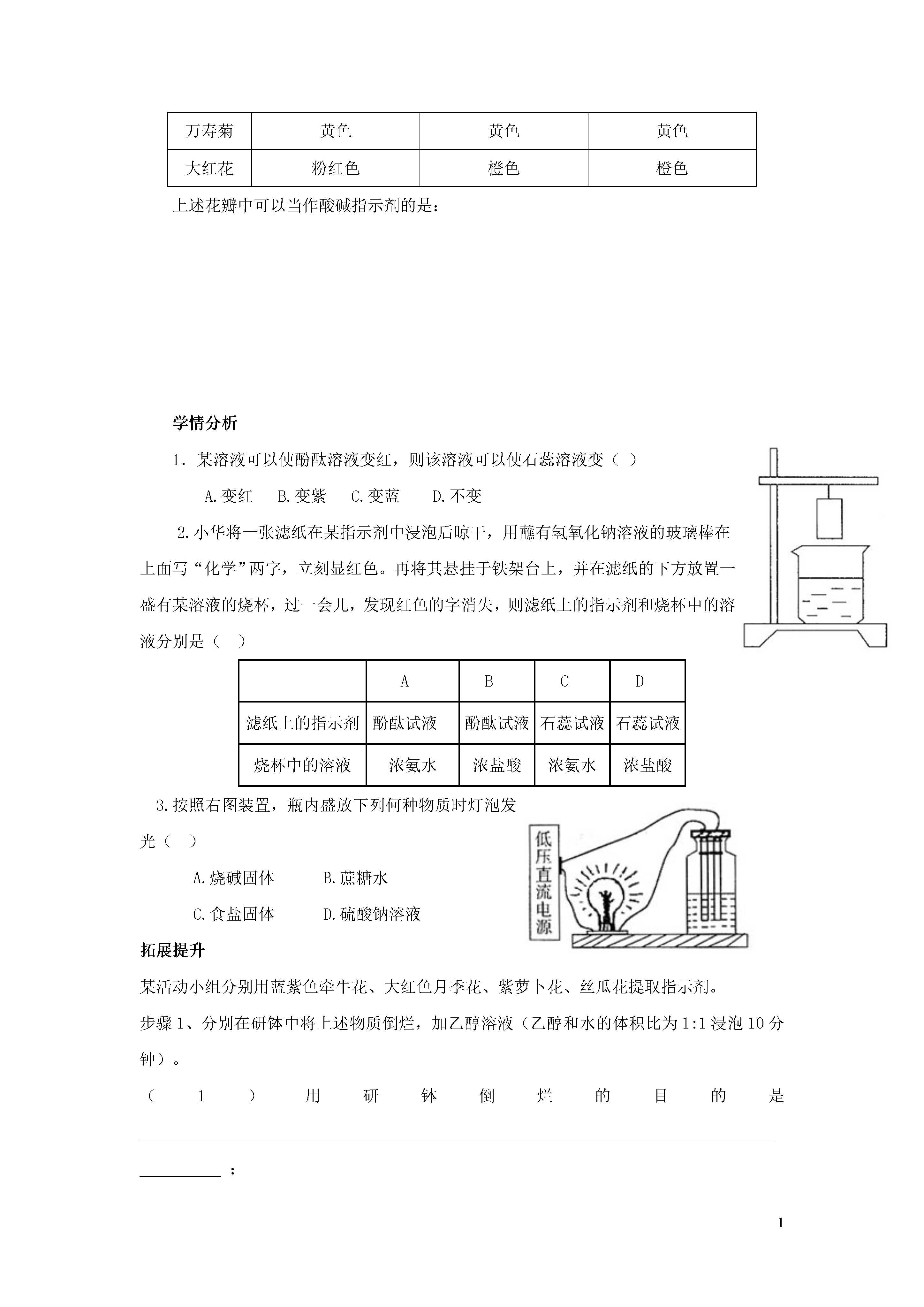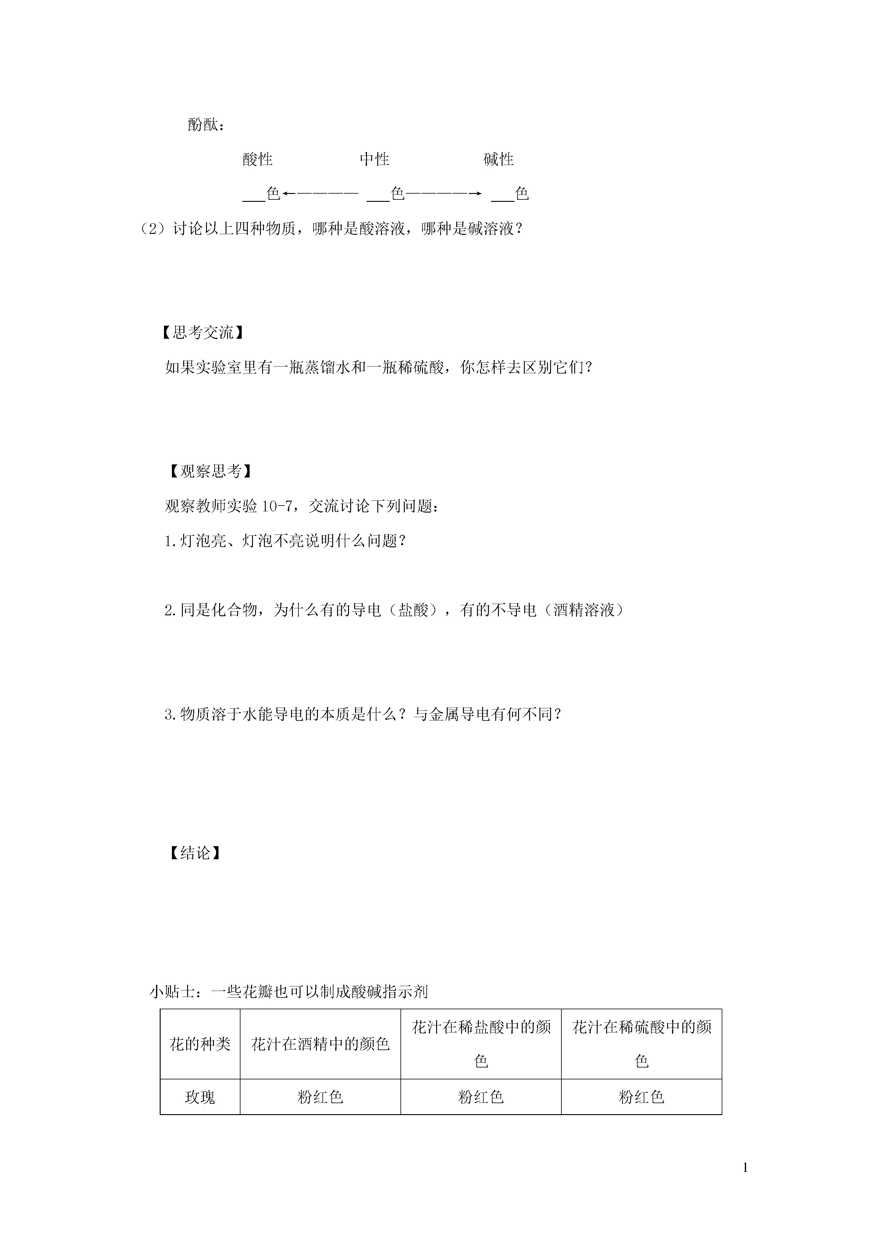 1课题1常见的酸和碱学习目标1、了解酸和碱是生活中常见的化合物;2、会使用酸碱指示剂区分酸溶液和碱溶液;3、认识溶液具有酸碱性的原因。重点、难点重点:学会用指示剂检验酸碱溶液。难点:认识溶液具有酸碱性的原因。情境导入1、将浓氨水滴入酚酞试液中有什么现象?2、将CO2通入滴有紫色石蕊试液中有什么现象?学习研讨【自主学习】了解生活中的酸和碱,阅读课本P50资料卡片。1、酸碱指示剂【实验10-1】加入紫色石蕊溶液后的颜色变化加入无色酚酞溶液后的颜色变化白醋苹果汁石灰水氢氧化钠溶液【交流讨论】(1)根据上面的探究总结指示剂在不同酸碱性溶液中的变色规律;石蕊:酸性中性碱性色←————色————→色酚酞:酸性中性碱性色←————色————→色(2)讨论以上四种物质,哪种是酸溶液,哪种是碱溶液?【思考交流】如果实验室里有一瓶蒸馏水和一瓶稀硫酸,你怎样去区别它们?【观察思考】观察教师实验10-7,交流讨论下列问题:1.灯泡亮、灯泡不亮说明什么问题?2.同是化合物,为什么有的导电(盐酸),有的不导电(酒精溶液)3.物质溶于水能导电的本质是什么?与金属导电有何不同?【结论】小贴士:一些花瓣也可以制成酸碱指示剂花的种类花汁在酒精中的颜色花汁在稀盐酸中的颜色花汁在稀硫酸中的颜色玫瑰粉红色粉红色粉红色万寿菊黄色黄色黄色大红花粉红色橙色橙色上述花瓣中可以当作酸碱指示剂的是:学情分析1.某溶液可以使酚酞溶液变红,则该溶液可以使石蕊溶液变()A.变红B.变紫C.变蓝D.不变2.小华将一张滤纸在某指示剂中浸泡后晾干,用蘸有氢氧化钠溶液的玻璃棒在上面写“化学”两字,立刻显红色。再将其悬挂于铁架台上,并在滤纸的下方放置一盛有某溶液的烧杯,过一会儿,发现红色的字消失,则滤纸上的指示剂和烧杯中的溶液分别是()ABCD滤纸上的指示剂酚酞试液酚酞试液石蕊试液石蕊试液烧杯中的溶液浓氨水浓盐酸浓氨水浓盐酸3.按照右图装置,瓶内盛放下列何种物质时灯泡发光()A.烧碱固体B.蔗糖水C.食盐固体D.硫酸钠溶液拓展提升某活动小组分别用蓝紫色牵牛花、大红色月季花、紫萝卜花、丝瓜花提取指示剂。步骤1、分别在研钵中将上述物质倒烂,加乙醇溶液(乙醇和水的体积比为1:1浸泡10分钟)。(1)用研钵倒烂的目的是;(2)乙醇在其中起到的作用是。A.催化剂B.参加化学反应C.溶质D.溶剂步骤2:将步骤1得到的混合物,用纱布过滤;(3)过滤的目的是。步骤3:将步骤2中得到的浸取液,分别滴入到澄清石灰水中。植物植物浸取液在不同溶液中所呈现的颜色名称颜色颜色澄清石灰水食醋牵牛花月季花萝卜花丝瓜花蓝紫大红紫黄绿红棕色玫瑰红紫红黄绿黄绿橙黄黄绿黄粉红粉红粉红黄(4)上述四种浸取液,最不适合用作酸碱指示剂的(填植物名称)。(5)将月季花的浸取液滴入稀盐酸中,溶液呈色;低入氢氧化钠溶液中,溶液呈色。(6)将牵牛花的浸取液滴入某溶液中呈现黄绿色,则原溶液可能是()A.氢氧化钠溶液B.稀硫酸C.氨水D.食盐水课堂小结课题1常见的酸和碱(第二课时)学习目标知道盐酸、硫酸的主要性质和用途;认识浓硫酸的腐蚀性和稀释方法;知道酸具有相似化学性质的原因。重点、难点浓硫酸的腐蚀性和酸的化学性质。情境导入1、酸碱指示剂在酸和碱中的变色情况2、写出铝与盐酸和稀硫酸反应的化学方程式学习研讨【自主学习】浓盐酸的质量分数在35%-37%,密度1.097g/cm3,浓硫酸用的浓硫酸中H2SO4的质量分数为98%,其密度为1.84g/cm3【观察思考】1、观察老师的实验10-2,观察记录实验现象并完成下表盐酸硫酸颜色、状态打开瓶盖后的现象气味【交流讨论】(1)打开浓盐酸的瓶盖为什么会产生白雾?说明浓盐酸具有什么性质?浓硫酸没有白雾说明浓硫酸具有什么性质?(2)阅读课本P52盐酸和硫酸的用途,常见的酸还有哪些?2、观察老师的实验10-3、10-4观察记录实验现象并完成下表实验现象1、用玻璃棒蘸浓硫酸在纸上写字2、用小木棍蘸少量浓硫酸3、将浓硫酸滴在一小块布上4、将浓硫酸缓慢的倒入烧杯的水中【交流讨论】(1)如果不慎将浓硫酸溅在皮肤或者衣物上会有