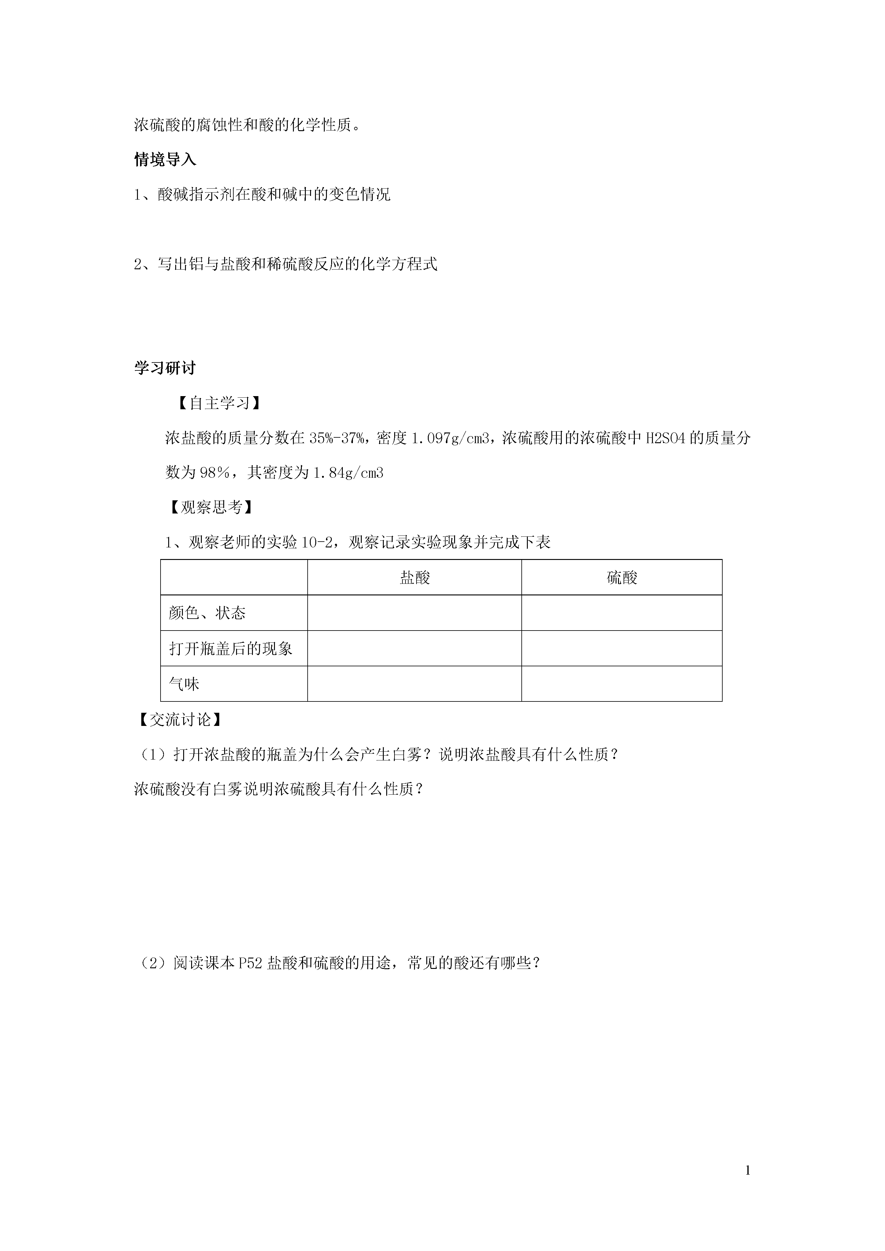 学案-全国-2019_2019春九年级化学下册 第十单元 酸和碱 课题1 常见的酸和碱学案(无答案)(新版)新人教版.doc