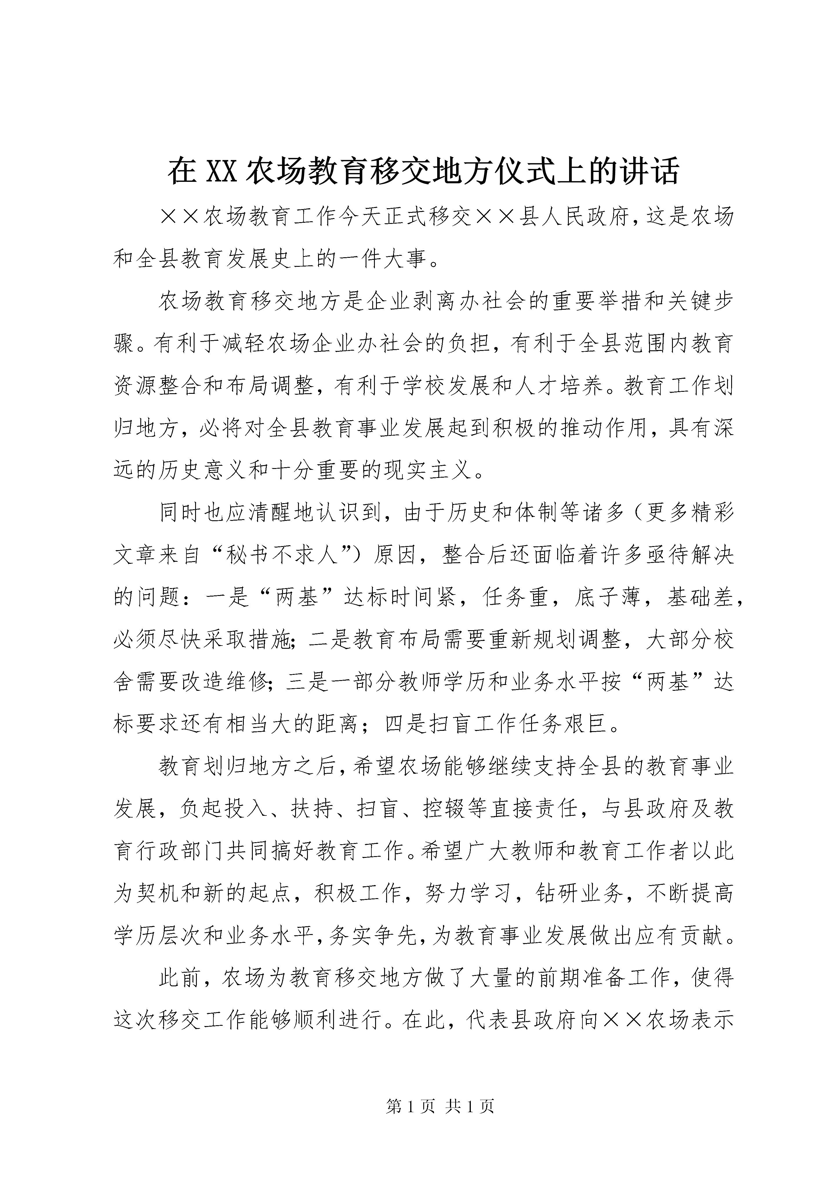 在XX农场教育移交地方仪式上的讲话××农场教育工作今天正式移交××县人民政府,这是农场和全县教育发展史上的一件大事。农场教育移交地方是企业剥离办社会的重要举措和关键步骤。有利于减轻农场企业办社会的负担,有利于全县范围内教育资源整合和布局调整,有利于学校发展和人才培养。教育工作划归地方,必将对全县教育事业发展起到积极的推动作用,具有深远的历史意义和十分重要的现实主义。同时也应清醒地认识到,由于历史和体制等诸多(更多精彩文章来自“秘书不求人”)原因,整合后还面临着许多亟待解决的问题:一是“两基”达标时间紧,任务重,底子薄,基础差,必须尽快采取措施;二是教育布局需要重新规划调整,大部分校舍需要改造维修;三是一部分教师学历和业务水平按“两基”达标要求还有相当大的距离;四是扫盲工作任务艰巨。教育划归地方之后,希望农场能够继续支持全县的教育事业发展,负起投入、扶持、扫盲、控辍等直接责任,与县政府及教育行政部门共同搞好教育工作。希望广大教师和教育工作者以此为契机和新的起点,积极工作,努力学习,钻研业务,不断提高学历层次和业务水平,务实争先,为教育事业发展做出应有贡献。此前,农场为教育移交地方做了大量的前期准备工作,使得这次移交工作能够顺利进行。在此,代表县政府向××农场表示衷心的感谢。也借此机会,向移交地方的各位教师及教育工作者表示热烈欢迎。