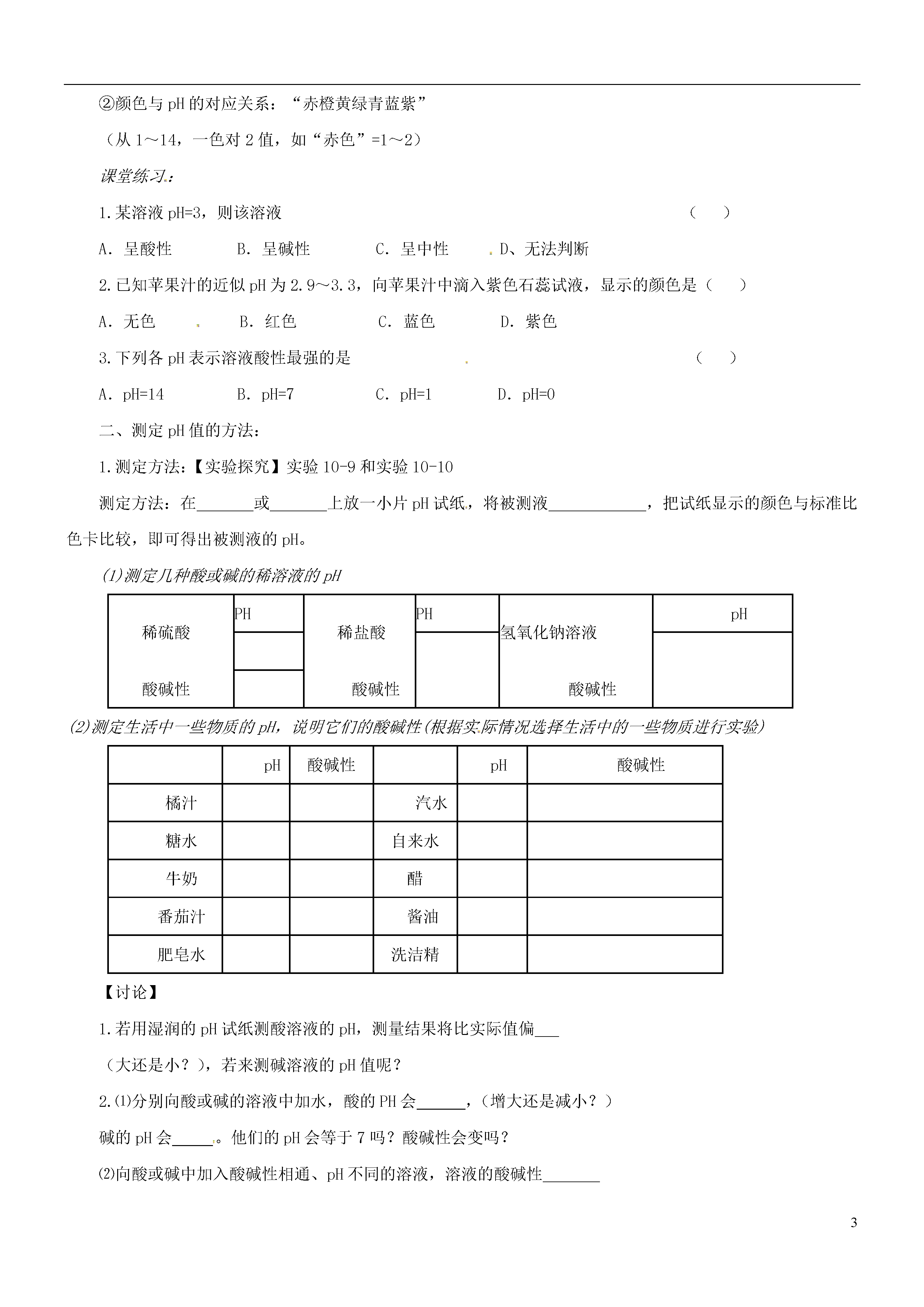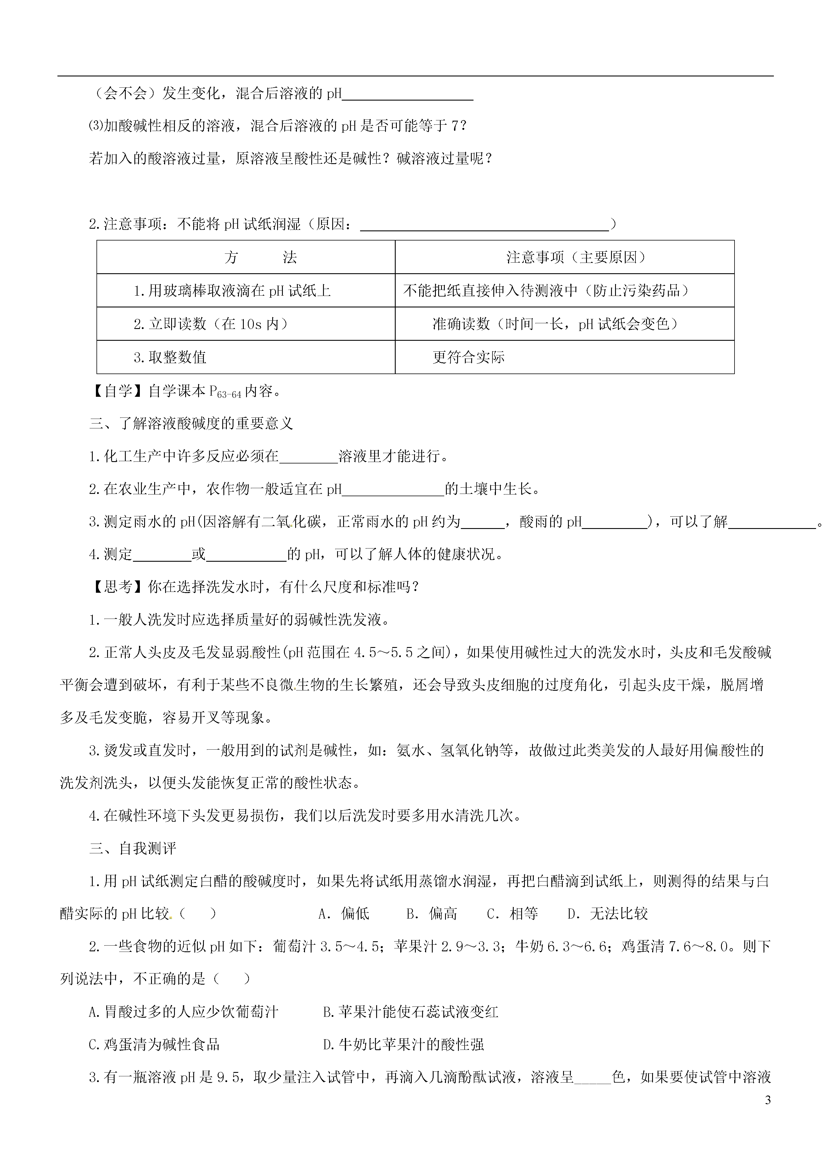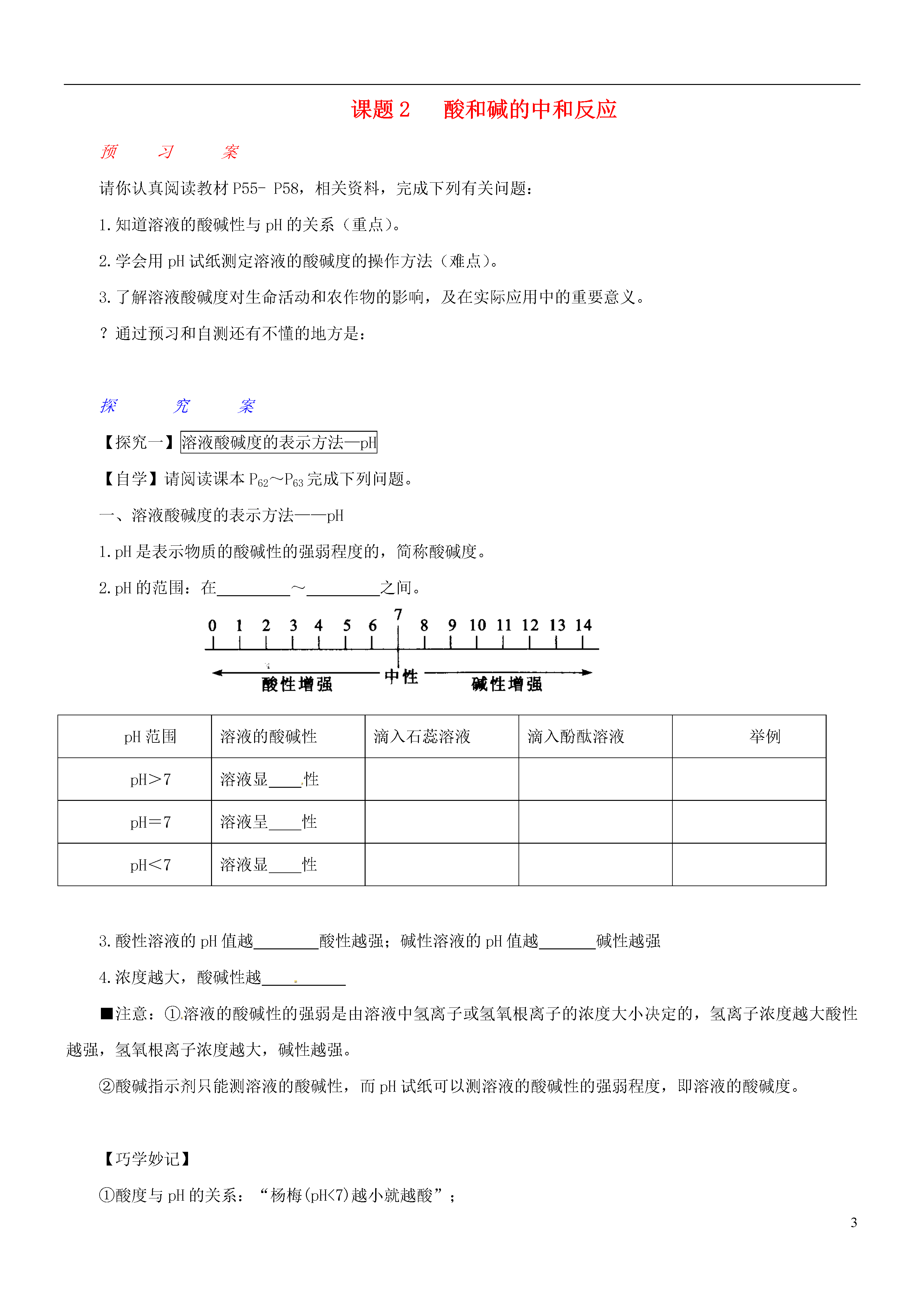 3课题2酸和碱的中和反应预习案请你认真阅读教材P55-P58,相关资料,完成下列有关问题:1.知道溶液的酸碱性与pH的关系(重点)。2.学会用pH试纸测定溶液的酸碱度的操作方法(难点)。3.了解溶液酸碱度对生命活动和农作物的影响,及在实际应用中的重要意义。?通过预习和自测还有不懂的地方是:探究案【探究一】溶液酸碱度的表示方法—pH【自学】请阅读课本P62~P63完成下列问题。一、溶液酸碱度的表示方法——pH1.pH是表示物质的酸碱性的强弱程度的,简称酸碱度。2.pH的范围:在~之间。pH范围溶液的酸碱性滴入石蕊溶液滴入酚酞溶液举例pH>7溶液显性pH=7溶液呈性pH<7溶液显性3.酸性溶液的pH值越酸性越强;碱性溶液的pH值越碱性越强4.浓度越大,酸碱性越■注意:①溶液的酸碱性的强弱是由溶液中氢离子或氢氧根离子的浓度大小决定的,氢离子浓度越大酸性越强,氢氧根离子浓度越大,碱性越强。②酸碱指示剂只能测溶液的酸碱性,而pH试纸可以测溶液的酸碱性的强弱程度,即溶液的酸碱度。【巧学妙记】①酸度与pH的关系:“杨梅(pH<7)越小就越酸”;②颜色与pH的对应关系:“赤橙黄绿青蓝紫”(从1~14,一色对2值,如“赤色”=1~2)课堂练习:1.某溶液pH=3,则该溶液()A.呈酸性B.呈碱性C.呈中性D、无法判断2.已知苹果汁的近似pH为2.9~3.3,向苹果汁中滴入紫色石蕊试液,显示的颜色是()A.无色B.红色C.蓝色D.紫色3.下列各pH表示溶液酸性最强的是()A.pH=14B.pH=7C.pH=1D.pH=0二、测定pH值的方法:1.测定方法:【实验探究】实验10-9和实验10-10测定方法:在或上放一小片pH试纸,将被测液,把试纸显示的颜色与标准比色卡比较,即可得出被测液的pH。(1)测定几种酸或碱的稀溶液的pH稀硫酸PH稀盐酸PH氢氧化钠溶液pH酸碱性酸碱性酸碱性(2)测定生活中一些物质的pH,说明它们的酸碱性(根据实际情况选择生活中的一些物质进行实验)pH酸碱性pH酸碱性橘汁汽水糖水自来水牛奶醋番茄汁酱油肥皂水洗洁精【讨论】1.若用湿润的pH试纸测酸溶液的pH,测量结果将比实际值偏(大还是小?),若来测碱溶液的pH值呢?2.⑴分别向酸或碱的溶液中加水,酸的PH会,(增大还是减小?)碱的pH会。他们的pH会等于7吗?酸碱性会变吗?⑵向酸或碱中加入酸碱性相通、pH不同的溶液,溶液的酸碱性(会不会)发生变化,混合后溶液的pH⑶加酸碱性相反的溶液,混合后溶液的pH是否可能等于7?若加入的酸溶液过量,原溶液呈酸性还是碱性?碱溶液过量呢?2.注意事项:不能将pH试纸润湿(原因:)方法注意事项(主要原因)1.用玻璃棒取液滴在pH试纸上不能把纸直接伸入待测液中(防止污染药品)2.立即读数(在10s内)准确读数(时间一长,pH试纸会变色)3.取整数值更符合实际【自学】自学课本P63-64内容。三、了解溶液酸碱度的重要意义1.化工生产中许多反应必须在溶液里才能进行。2.在农业生产中,农作物一般适宜在pH的土壤中生长。3.测定雨水的pH(因溶解有二氧化碳,正常雨水的pH约为,酸雨的pH),可以了解。4.测定或的pH,可以了解人体的健康状况。【思考】你在选择洗发水时,有什么尺度和标准吗?1.一般人洗发时应选择质量好的弱碱性洗发液。2.正常人头皮及毛发显弱酸性(pH范围在4.5~5.5之间),如果使用碱性过大的洗发水时,头皮和毛发酸碱平衡会遭到破坏,有利于某些不良微生物的生长繁殖,还会导致头皮细胞的过度角化,引起头皮干燥,脱屑增多及毛发变脆,容易开叉等现象。3.烫发或直发时,一般用到的试剂是碱性,如:氨水、氢氧化钠等,故做过此类美发的人最好用偏酸性的洗发剂洗头,以便头发能恢复正常的酸性状态。4.在碱性环境下头发更易损伤,我们以后洗发时要多用水清洗几次。三、自我测评1.用pH试纸测定白醋的酸碱度时,如果先将试纸用蒸馏水润湿,再把白醋滴到试纸上,则测得的结果与白醋实际的pH比较()A.偏低B.偏高C.相等D.无法比较2.一些食物的近似pH如下:葡萄汁3.5~4.5;苹果汁2.9~3.3;牛奶6.3~6.6;鸡蛋清7.6~8.0。则下列说法中,不正确的是()A.胃酸过多的人应少饮葡萄汁B.苹果汁能使石蕊试液变红C.鸡蛋清为碱性食品D.牛奶比苹果汁的酸性强3.有一瓶溶液pH是9.5,取少量注入试管中,再滴入几滴酚酞试液,溶液呈_____色,如果要使试管中溶液pH降为5,可以采取_________________的方法。