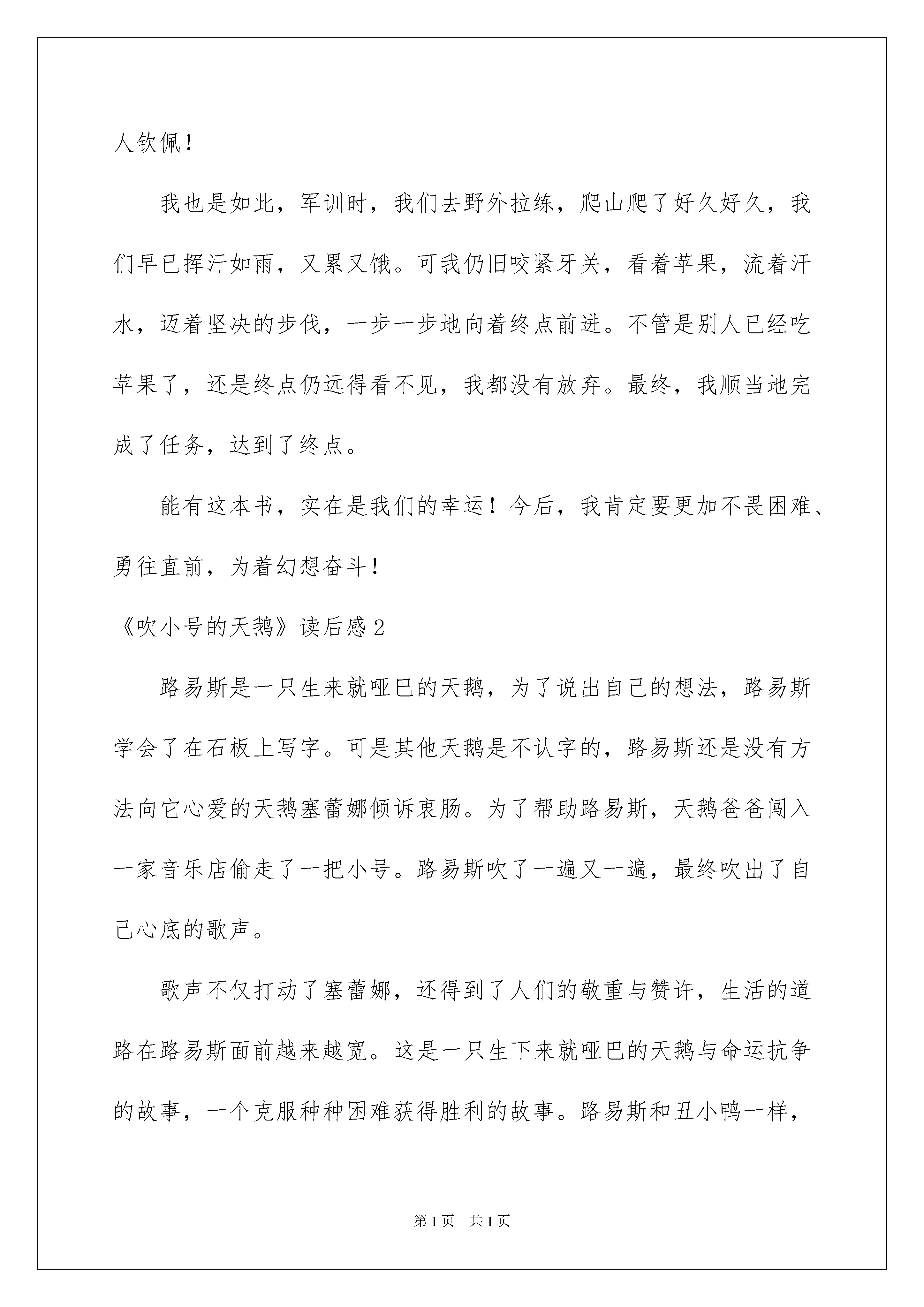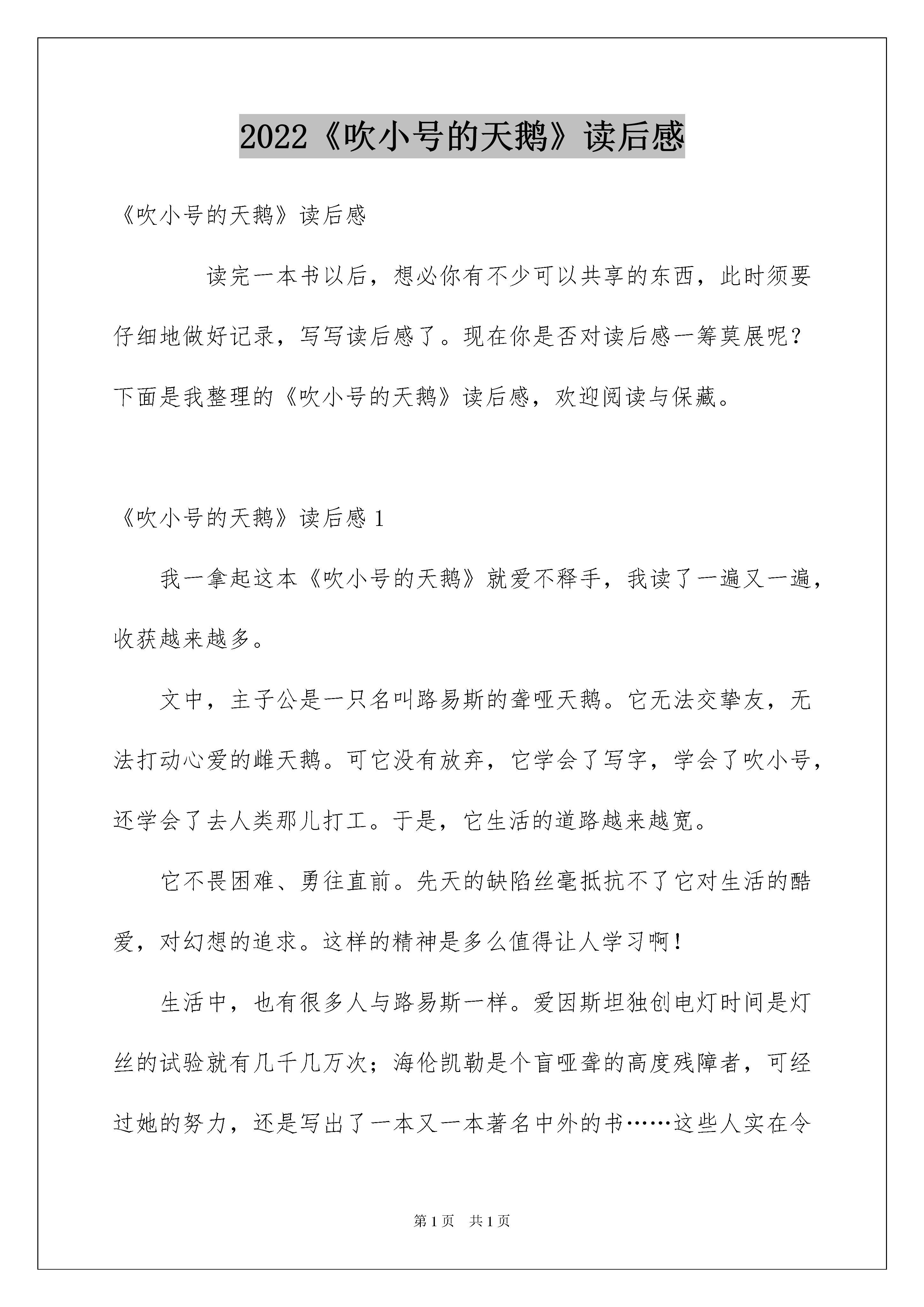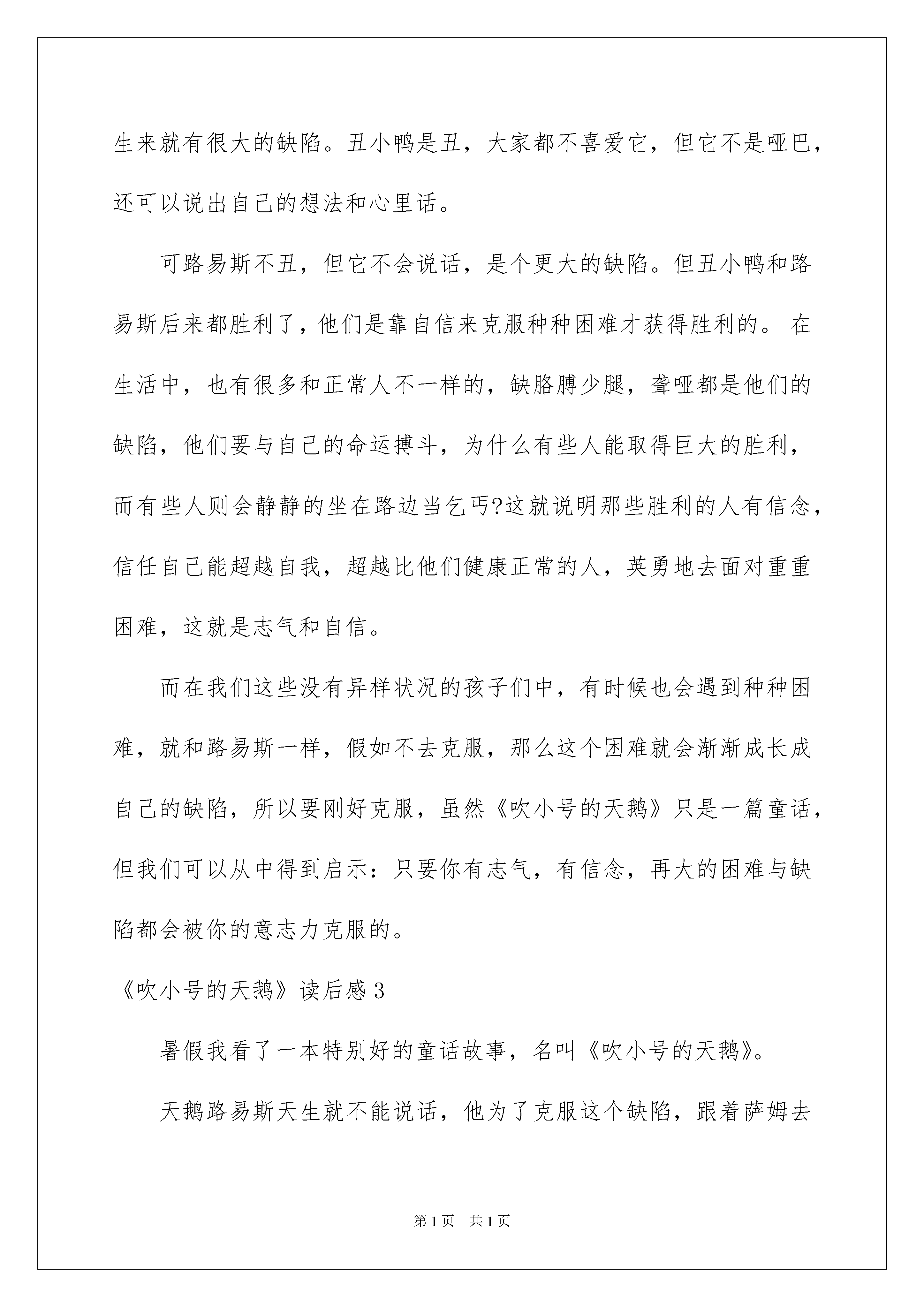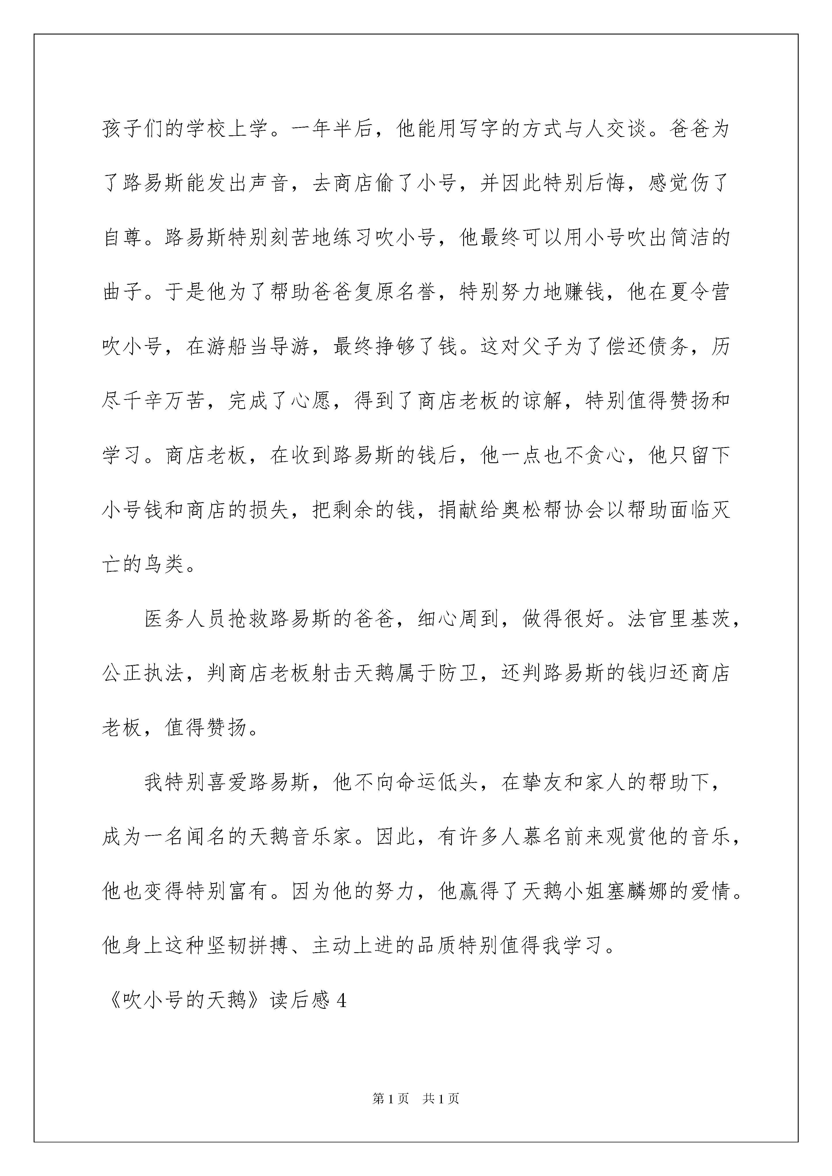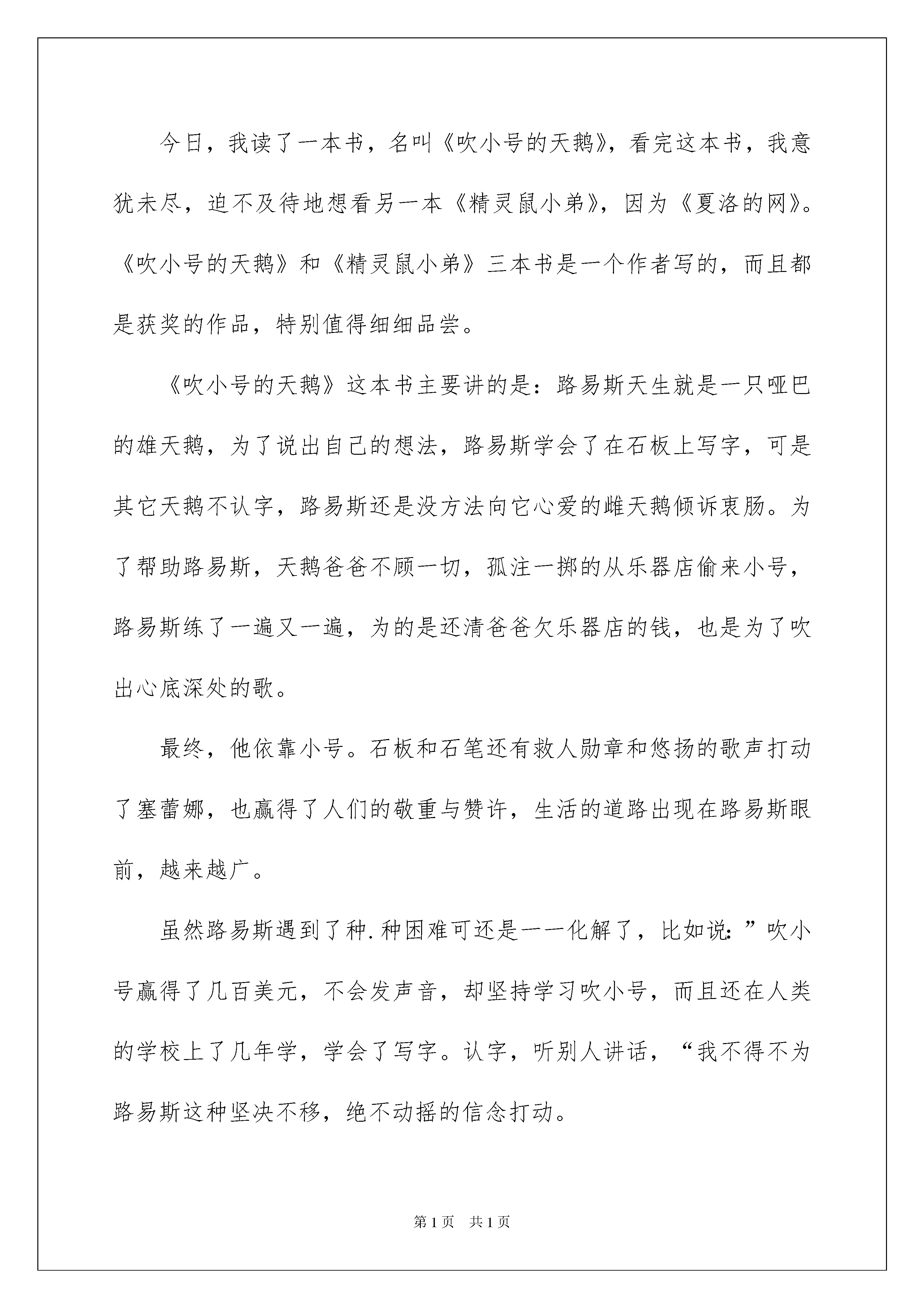 2022《吹小号的天鹅》读后感《吹小号的天鹅》读后感读完一本书以后,想必你有不少可以共享的东西,此时须要仔细地做好记录,写写读后感了。现在你是否对读后感一筹莫展呢?下面是我整理的《吹小号的天鹅》读后感,欢迎阅读与保藏。《吹小号的天鹅》读后感1我一拿起这本《吹小号的天鹅》就爱不释手,我读了一遍又一遍,收获越来越多。文中,主子公是一只名叫路易斯的聋哑天鹅。它无法交挚友,无法打动心爱的雌天鹅。可它没有放弃,它学会了写字,学会了吹小号,还学会了去人类那儿打工。于是,它生活的道路越来越宽。它不畏困难、勇往直前。先天的缺陷丝毫抵抗不了它对生活的酷爱,对幻想的追求。这样的精神是多么值得让人学习啊!生活中,也有很多人与路易斯一样。爱因斯坦独创电灯时间是灯丝的试验就有几千几万次;海伦凯勒是个盲哑聋的高度残障者,可经过她的努力,还是写出了一本又一本著名中外的书……这些人实在令人钦佩!我也是如此,军训时,我们去野外拉练,爬山爬了好久好久,我们早已挥汗如雨,又累又饿。可我仍旧咬紧牙关,看着苹果,流着汗水,迈着坚决的步伐,一步一步地向着终点前进。不管是别人已经吃苹果了,还是终点仍远得看不见,我都没有放弃。最终,我顺当地完成了任务,达到了终点。能有这本书,实在是我们的幸运!今后,我肯定要更加不畏困难、勇往直前,为着幻想奋斗!《吹小号的天鹅》读后感2路易斯是一只生来就哑巴的天鹅,为了说出自己的想法,路易斯学会了在石板上写字。可是其他天鹅是不认字的,路易斯还是没有方法向它心爱的天鹅塞蕾娜倾诉衷肠。为了帮助路易斯,天鹅爸爸闯入一家音乐店偷走了一把小号。路易斯吹了一遍又一遍,最终吹出了自己心底的歌声。歌声不仅打动了塞蕾娜,还得到了人们的敬重与赞许,生活的道路在路易斯面前越来越宽。这是一只生下来就哑巴的天鹅与命运抗争的故事,一个克服种种困难获得胜利的故事。路易斯和丑小鸭一样,生来就有很大的缺陷。丑小鸭是丑,大家都不喜爱它,但它不是哑巴,还可以说出自己的想法和心里话。可路易斯不丑,但它不会说话,是个更大的缺陷。但丑小鸭和路易斯后来都胜利了,他们是靠自信来克服种种困难才获得胜利的。在生活中,也有很多和正常人不一样的,缺胳膊少腿,聋哑都是他们的缺陷,他们要与自己的命运搏斗,为什么有些人能取得巨大的胜利,而有些人则会静静的坐在路边当乞丐?这就说明那些胜利的人有信念,信任自己能超越自我,超越比他们健康正常的人,英勇地去面对重重困难,这就是志气和自信。而在我们这些没有异样状况的孩子们中,有时候也会遇到种种困难,就和路易斯一样,假如不去克服,那么这个困难就会渐渐成长成自己的缺陷,所以要刚好克服,虽然《吹小号的天鹅》只是一篇童话,但我们可以从中得到启示:只要你有志气,有信念,再大的困难与缺陷都会被你的意志力克服的。《吹小号的天鹅》读后感3暑假我看了一本特别好的童话故事,名叫《吹小号的天鹅》。天鹅路易斯天生就不能说话,他为了克服这个缺陷,跟着萨姆去孩子们的学校上学。一年半后,他能用写字的方式与人交谈。爸爸为了路易斯能发出声音,去商店偷了小号,并因此特别后悔,感觉伤了自尊。路易斯特别刻苦地练习吹小号,他最终可以用小号吹出简洁的曲子。于是他为了帮助爸爸复原名誉,特别努力地赚钱,他在夏令营吹小号,在游船当导游,最终挣够了钱。这对父子为了偿还债务,历尽千辛万苦,完成了心愿,得到了商店老板的谅解,特别值得赞扬和学习。商店老板,在收到路易斯的钱后,他一点也不贪心,他只留下小号钱和商店的损失,把剩余的钱,捐献给奥松帮协会以帮助面临灭亡的鸟类。医务人员抢救路易斯的爸爸,细心周到,做得很好。法官里基茨,公正执法,判商店老板射击天鹅属于防卫,还判路易斯的钱归还商店老板,值得赞扬。我特别喜爱路易斯,他不向命运低头,在挚友和家人的帮助下,成为一名闻名的天鹅音乐家。因此,有许多人慕名前来观赏他的音乐,他也变得特别富有。因为他的努力,他赢得了天鹅小姐塞麟娜的爱情。他身上这种坚韧拼搏、主动上进的品质特别值得我学习。《吹小号的天鹅》读后感4今日,我读了一本书,名叫《吹小号的天鹅》,看完这本书,我意犹未尽,迫不及待地想看另一本《精灵鼠小弟》,因为《夏洛的网》。《吹小号的天鹅》和《精灵鼠小弟》三本书是一个作者写的,而且都是获奖的作品,特别值得细细品尝。《吹小号的天鹅》这本书主要讲的是:路易斯天生就是一只哑巴的雄天鹅,为了说出自己的想法,路易斯学会了在石板上写字,可是其它天鹅不认字,路易斯还是没方法向它心爱的雌天鹅倾诉衷肠。为了帮助路易斯,天鹅爸爸不顾一切,孤注一掷的从乐器店偷来小号,路易斯练了一遍又一遍,为的是还清爸爸欠乐器店的钱,也是为了吹出心底深处的歌。最终