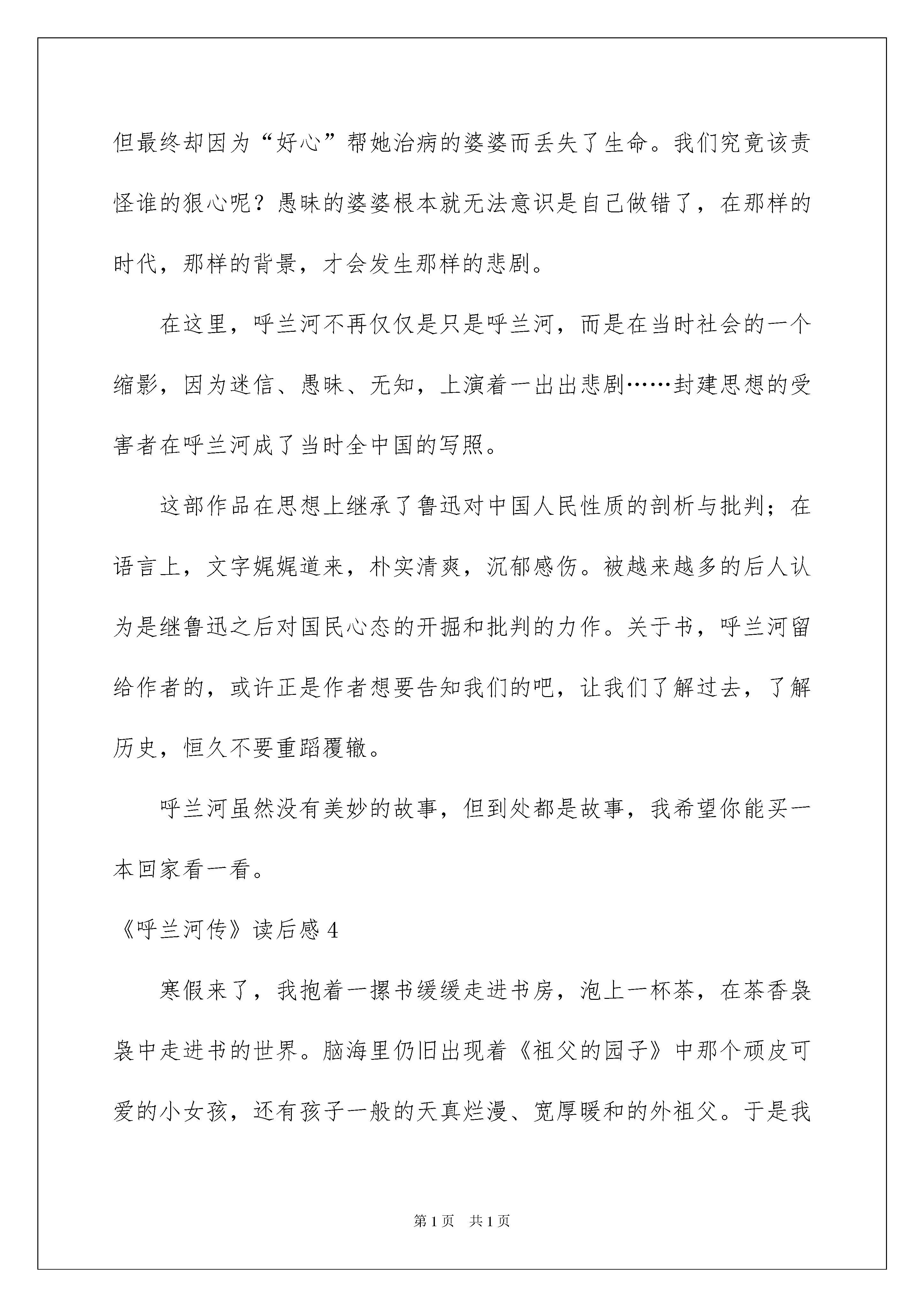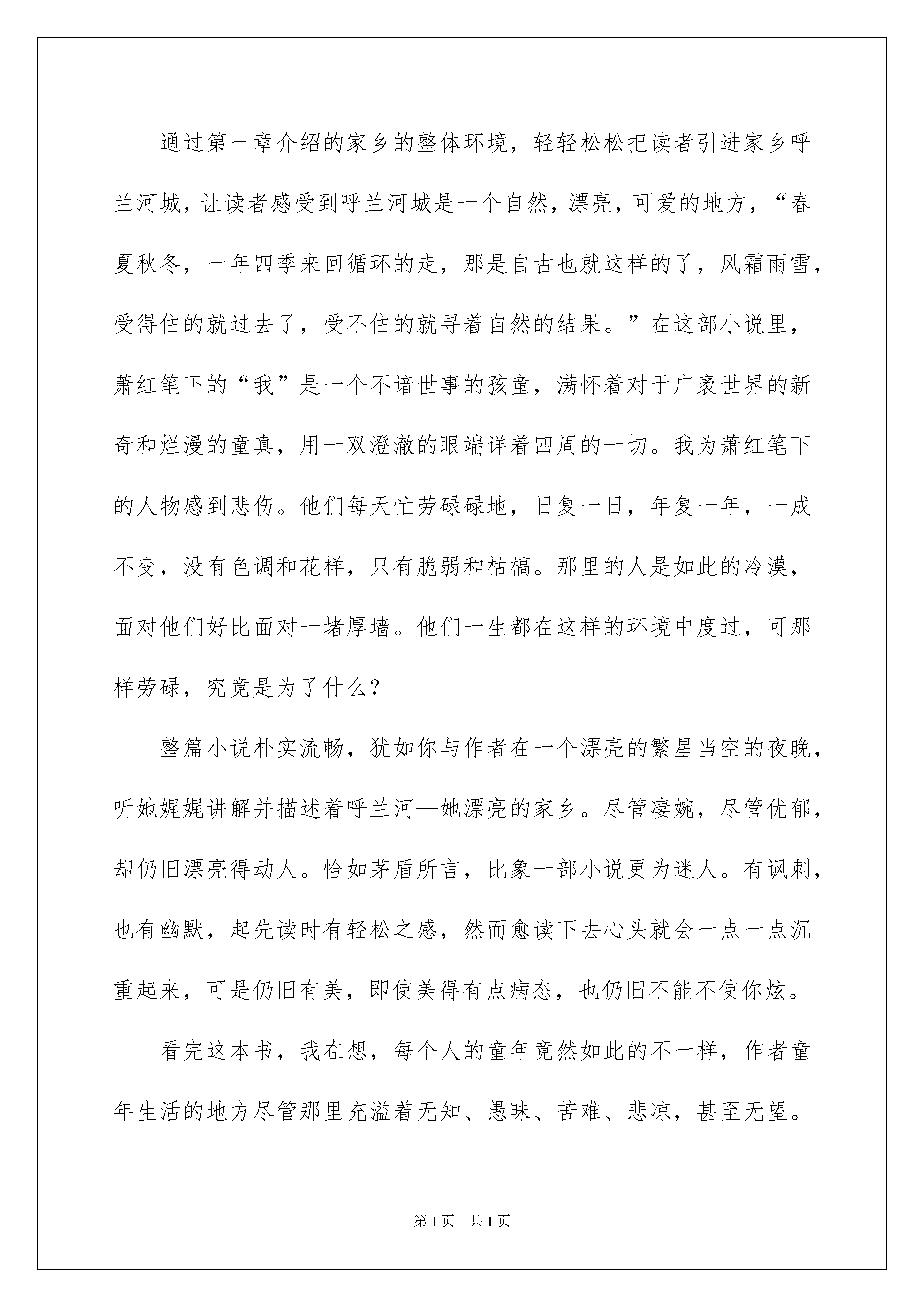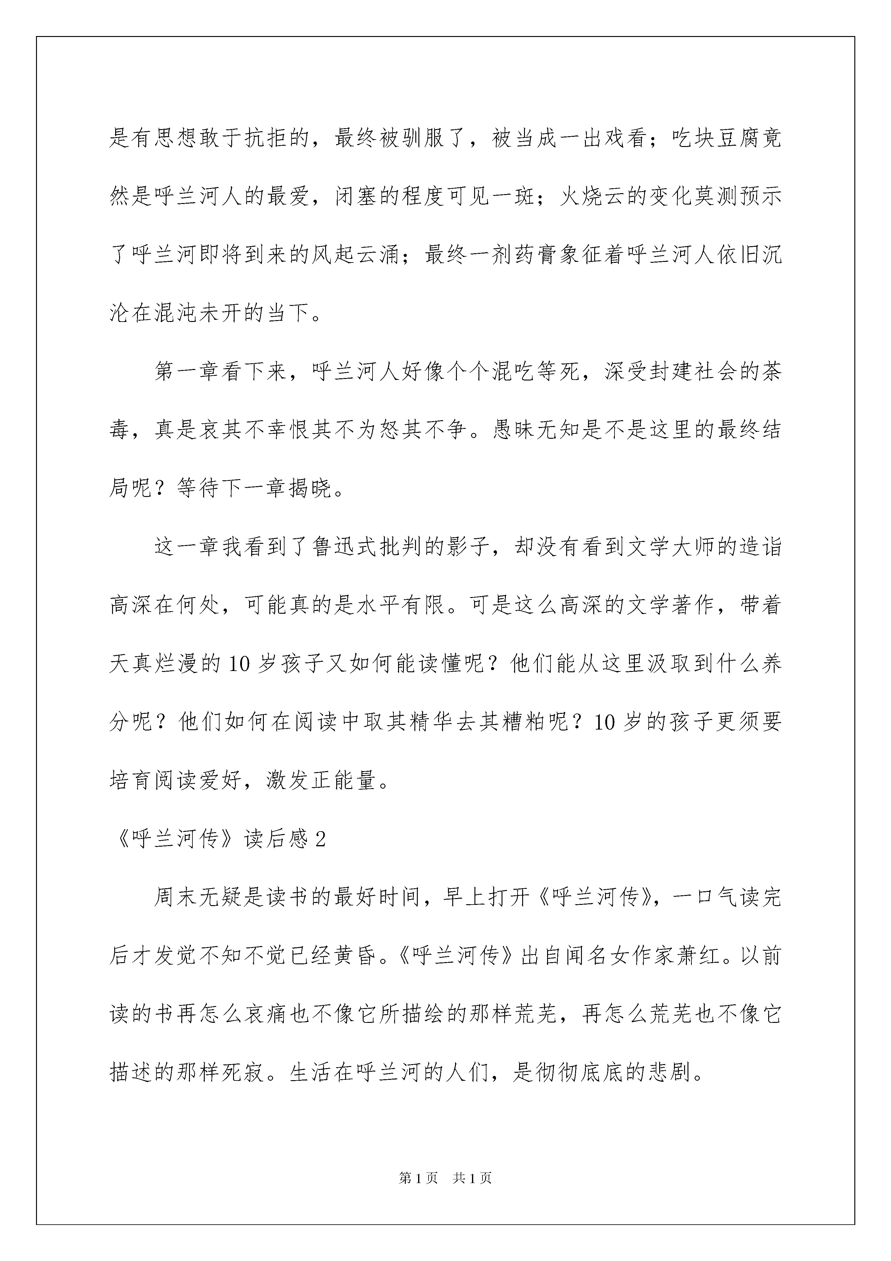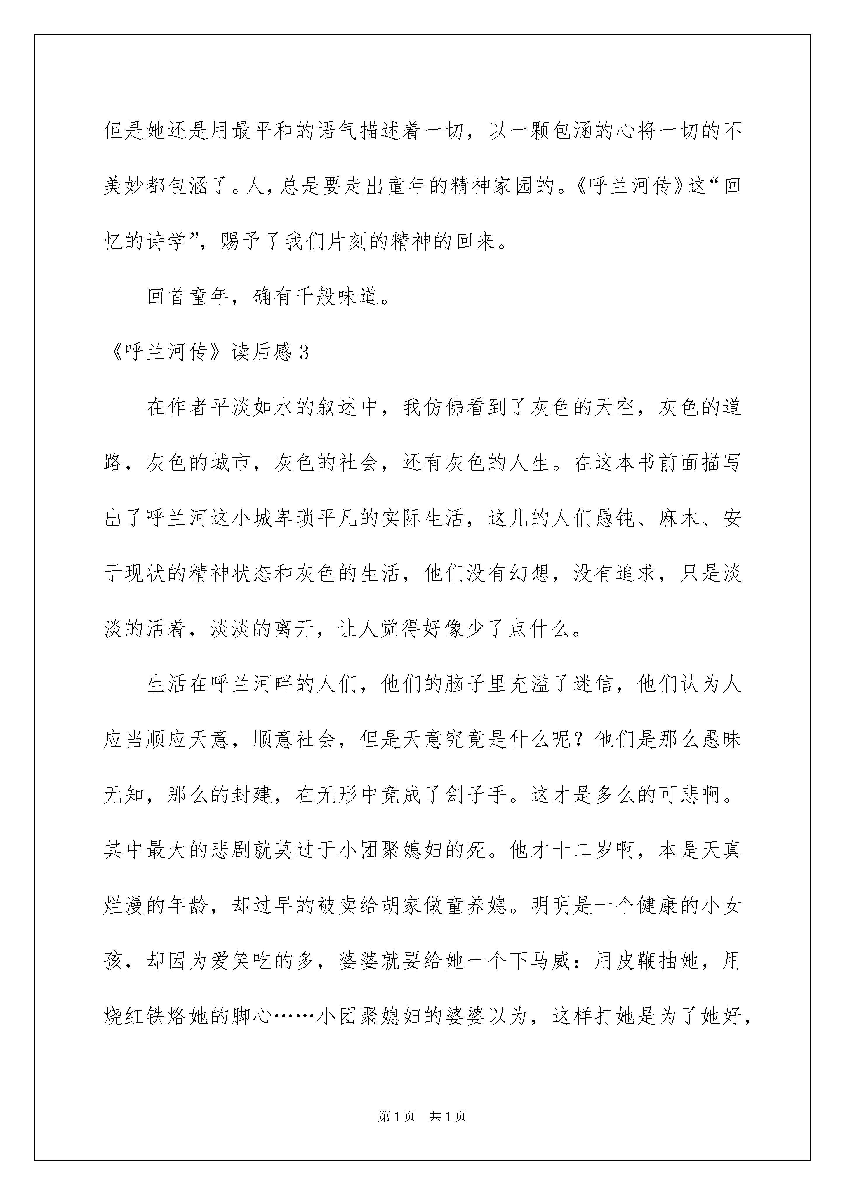 2022《呼兰河传》读后感《呼兰河传》读后感当阅读了一本名著后,信任大家都积累了属于自己的读书感悟,须要回过头来写一写读后感了。究竟应如何写读后感呢?下面是我为大家整理的《呼兰河传》读后感,希望能够帮助到大家。《呼兰河传》读后感1《呼兰河传》第一章讲解并描述了呼兰河的当地风情。乍一看,这完全是关于家庭八卦的事情,就像我不喜爱看的电视剧一样。呼兰河人充溢了惰性与愚昧,没有革新的意愿,体现在许多方面:一是那大泥坑子虽然搞得人仰马翻吞噬了不少,可呼兰河人除了拉人拉马和口头上说说的拓宽点走的路,却没有人运用填坑的方式彻底解决这一问题;二是对不幸者就都叫花子,没有一点恻隐之心;三是染缸淹死过人照样是生意红火,冷漠的呼兰河人没有因此而变更一点点;四是扎彩铺的精致与店员的粗糙丑陋形成显明对比,呼兰河人对生老病死没有一点点动容,一切都是走过场而已,仿佛一个个行尸走肉,没有思想,没有远方。后半部分的内容起先有一点点生气,买麻花的女人家的五个孩子是有思想敢于抗拒的,最终被驯服了,被当成一出戏看;吃块豆腐竟然是呼兰河人的最爱,闭塞的程度可见一斑;火烧云的变化莫测预示了呼兰河即将到来的风起云涌;最终一剂药膏象征着呼兰河人依旧沉沦在混沌未开的当下。第一章看下来,呼兰河人好像个个混吃等死,深受封建社会的荼毒,真是哀其不幸恨其不为怒其不争。愚昧无知是不是这里的最终结局呢?等待下一章揭晓。这一章我看到了鲁迅式批判的影子,却没有看到文学大师的造诣高深在何处,可能真的是水平有限。可是这么高深的文学著作,带着天真烂漫的10岁孩子又如何能读懂呢?他们能从这里汲取到什么养分呢?他们如何在阅读中取其精华去其糟粕呢?10岁的孩子更须要培育阅读爱好,激发正能量。《呼兰河传》读后感2周末无疑是读书的最好时间,早上打开《呼兰河传》,一口气读完后才发觉不知不觉已经黄昏。《呼兰河传》出自闻名女作家萧红。以前读的书再怎么哀痛也不像它所描绘的那样荒芜,再怎么荒芜也不像它描述的那样死寂。生活在呼兰河的人们,是彻彻底底的悲剧。通过第一章介绍的家乡的整体环境,轻轻松松把读者引进家乡呼兰河城,让读者感受到呼兰河城是一个自然,漂亮,可爱的地方,“春夏秋冬,一年四季来回循环的走,那是自古也就这样的了,风霜雨雪,受得住的就过去了,受不住的就寻着自然的结果。”在这部小说里,萧红笔下的“我”是一个不谙世事的孩童,满怀着对于广袤世界的新奇和烂漫的童真,用一双澄澈的眼端详着四周的一切。我为萧红笔下的人物感到悲伤。他们每天忙劳碌碌地,日复一日,年复一年,一成不变,没有色调和花样,只有脆弱和枯槁。那里的人是如此的冷漠,面对他们好比面对一堵厚墙。他们一生都在这样的环境中度过,可那样劳碌,究竟是为了什么?整篇小说朴实流畅,犹如你与作者在一个漂亮的繁星当空的夜晚,听她娓娓讲解并描述着呼兰河—她漂亮的家乡。尽管凄婉,尽管优郁,却仍旧漂亮得动人。恰如茅盾所言,比象一部小说更为迷人。有讽刺,也有幽默,起先读时有轻松之感,然而愈读下去心头就会一点一点沉重起来,可是仍旧有美,即使美得有点病态,也仍旧不能不使你炫。看完这本书,我在想,每个人的童年竟然如此的不一样,作者童年生活的地方尽管那里充溢着无知、愚昧、苦难、悲凉,甚至无望。但是她还是用最平和的语气描述着一切,以一颗包涵的心将一切的不美妙都包涵了。人,总是要走出童年的精神家园的。《呼兰河传》这“回忆的诗学”,赐予了我们片刻的精神的回来。回首童年,确有千般味道。《呼兰河传》读后感3在作者平淡如水的叙述中,我仿佛看到了灰色的天空,灰色的道路,灰色的城市,灰色的社会,还有灰色的人生。在这本书前面描写出了呼兰河这小城卑琐平凡的实际生活,这儿的人们愚钝、麻木、安于现状的精神状态和灰色的生活,他们没有幻想,没有追求,只是淡淡的活着,淡淡的离开,让人觉得好像少了点什么。生活在呼兰河畔的人们,他们的脑子里充溢了迷信,他们认为人应当顺应天意,顺意社会,但是天意究竟是什么呢?他们是那么愚昧无知,那么的封建,在无形中竟成了刽子手。这才是多么的可悲啊。其中最大的悲剧就莫过于小团聚媳妇的死。他才十二岁啊,本是天真烂漫的年龄,却过早的被卖给胡家做童养媳。明明是一个健康的小女孩,却因为爱笑吃的多,婆婆就要给她一个下马威:用皮鞭抽她,用烧红铁烙她的脚心……小团聚媳妇的婆婆以为,这样打她是为了她好,但最终却因为“好心”帮她治病的婆婆而丢失了生命。我们究竟该责怪谁的狠心呢?愚昧的婆婆根本就无法意识是自己做错了,在那样的时代,那样的背景,才会发生那样的悲剧。在这里,呼兰河不再仅仅是只是呼兰河,而是在当时社会的一个缩影,因为迷信、愚昧、无知,上演着一出出悲剧…