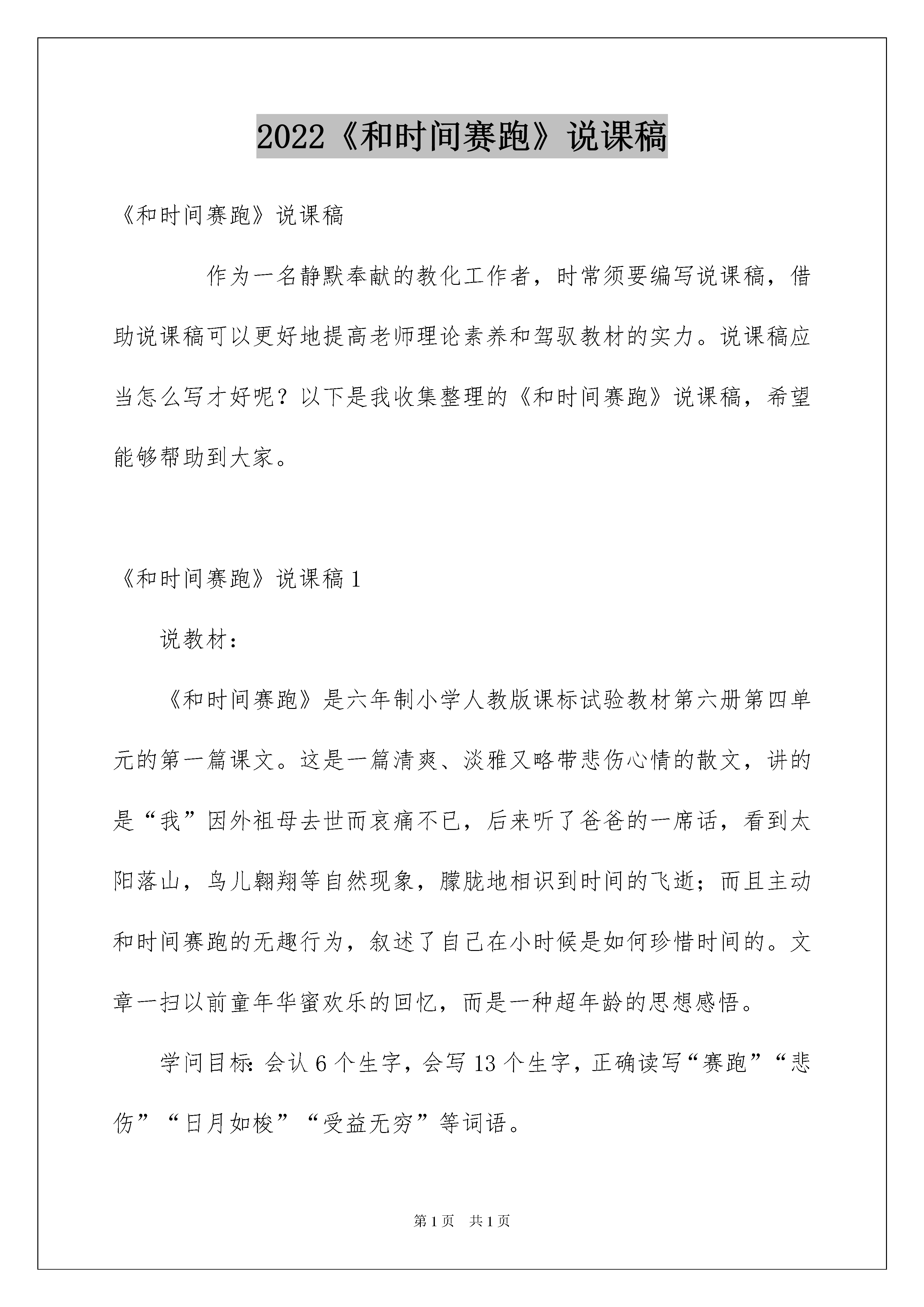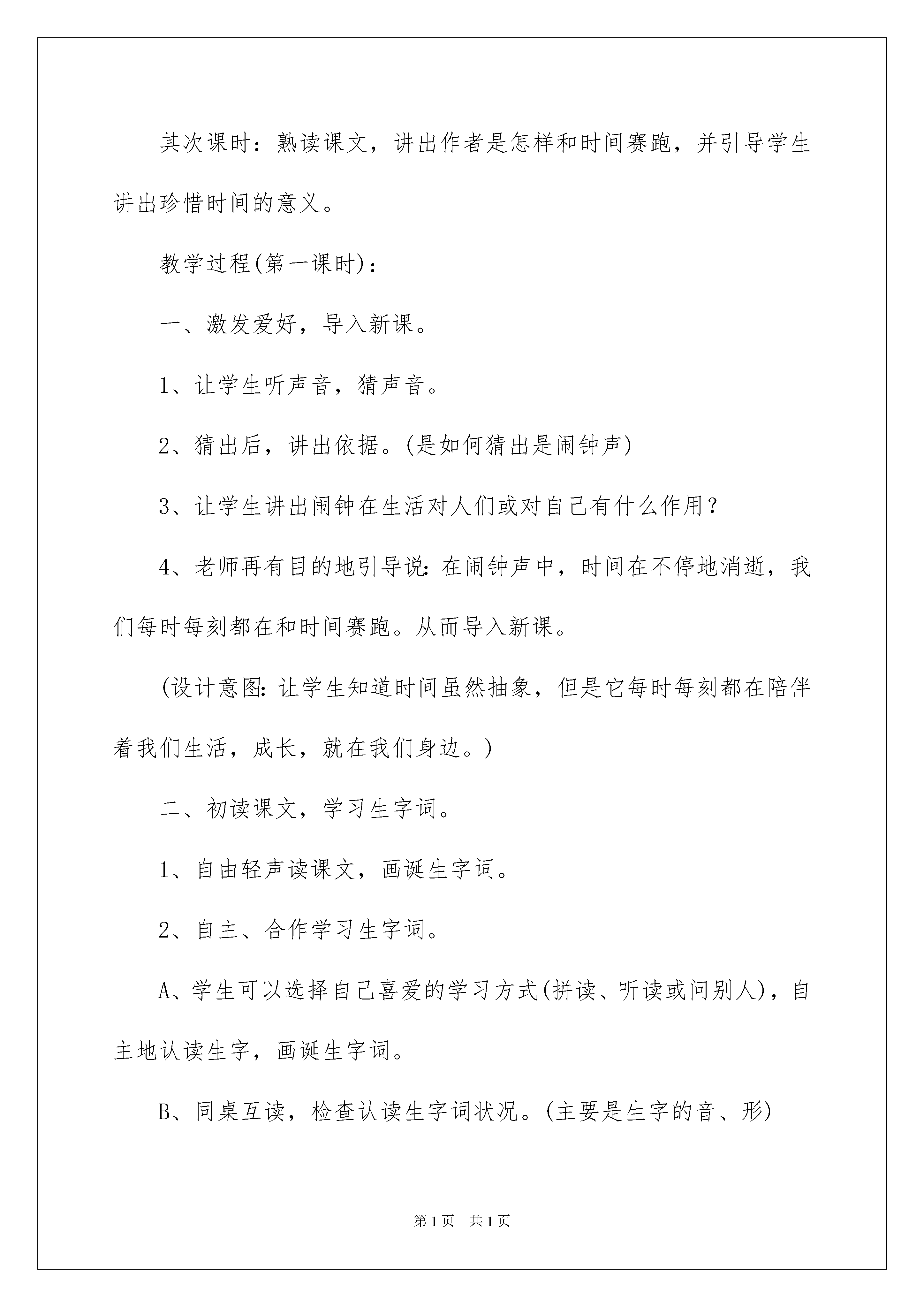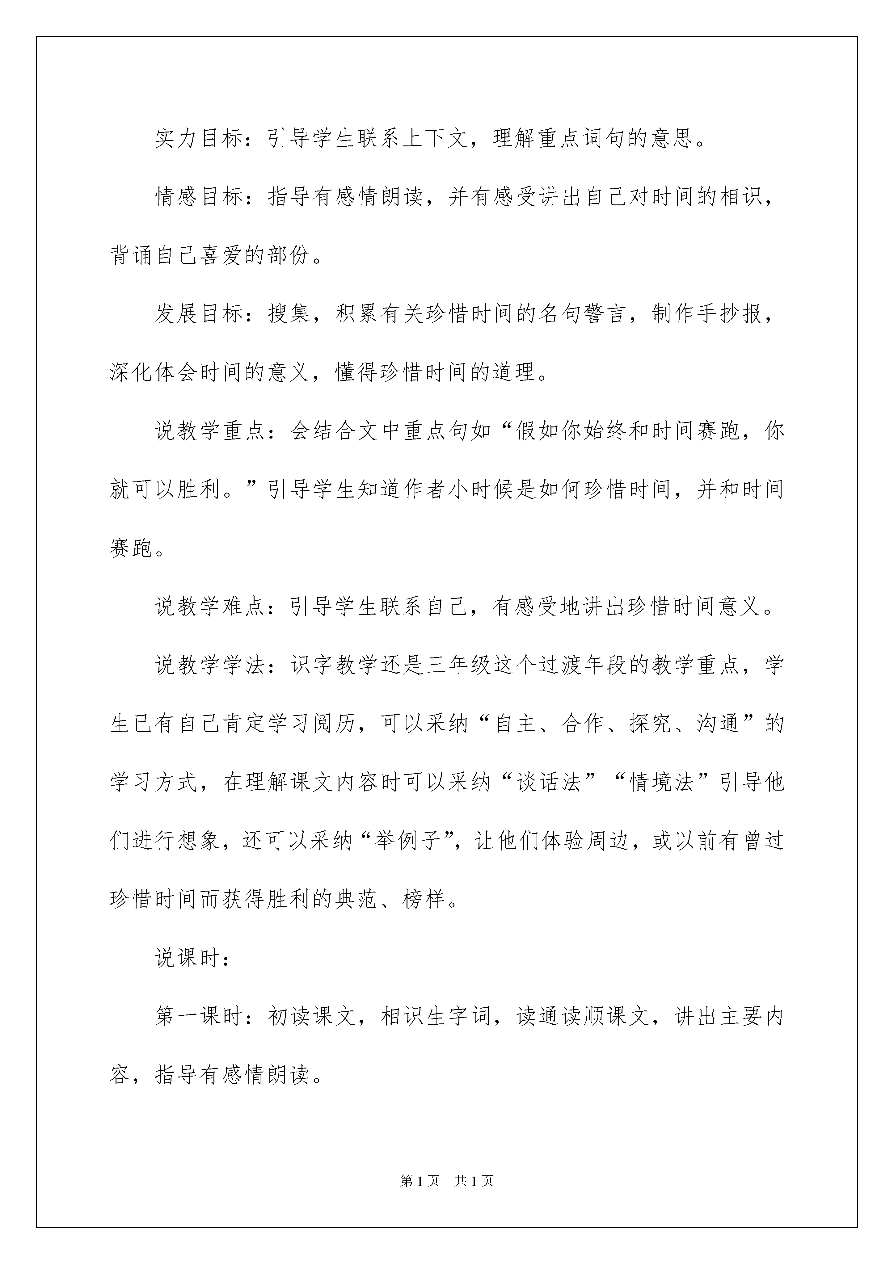 2022《和时间赛跑》说课稿《和时间赛跑》说课稿作为一名静默奉献的教化工作者,时常须要编写说课稿,借助说课稿可以更好地提高老师理论素养和驾驭教材的实力。说课稿应当怎么写才好呢?以下是我收集整理的《和时间赛跑》说课稿,希望能够帮助到大家。《和时间赛跑》说课稿1说教材:《和时间赛跑》是六年制小学人教版课标试验教材第六册第四单元的第一篇课文。这是一篇清爽、淡雅又略带悲伤心情的散文,讲的是“我”因外祖母去世而哀痛不已,后来听了爸爸的一席话,看到太阳落山,鸟儿翱翔等自然现象,朦胧地相识到时间的飞逝;而且主动和时间赛跑的无趣行为,叙述了自己在小时候是如何珍惜时间的。文章一扫以前童年华蜜欢乐的回忆,而是一种超年龄的思想感悟。学问目标:会认6个生字,会写13个生字,正确读写“赛跑”“悲伤”“日月如梭”“受益无穷”等词语。实力目标:引导学生联系上下文,理解重点词句的意思。情感目标:指导有感情朗读,并有感受讲出自己对时间的相识,背诵自己喜爱的部份。发展目标:搜集,积累有关珍惜时间的名句警言,制作手抄报,深化体会时间的意义,懂得珍惜时间的道理。说教学重点:会结合文中重点句如“假如你始终和时间赛跑,你就可以胜利。”引导学生知道作者小时候是如何珍惜时间,并和时间赛跑。说教学难点:引导学生联系自己,有感受地讲出珍惜时间意义。说教学学法:识字教学还是三年级这个过渡年段的教学重点,学生已有自己肯定学习阅历,可以采纳“自主、合作、探究、沟通”的学习方式,在理解课文内容时可以采纳“谈话法”“情境法”引导他们进行想象,还可以采纳“举例子”,让他们体验周边,或以前有曾过珍惜时间而获得胜利的典范、榜样。说课时:第一课时:初读课文,相识生字词,读通读顺课文,讲出主要内容,指导有感情朗读。其次课时:熟读课文,讲出作者是怎样和时间赛跑,并引导学生讲出珍惜时间的意义。教学过程(第一课时):一、激发爱好,导入新课。1、让学生听声音,猜声音。2、猜出后,讲出依据。(是如何猜出是闹钟声)3、让学生讲出闹钟在生活对人们或对自己有什么作用?4、老师再有目的地引导说:在闹钟声中,时间在不停地消逝,我们每时每刻都在和时间赛跑。从而导入新课。(设计意图:让学生知道时间虽然抽象,但是它每时每刻都在陪伴着我们生活,成长,就在我们身边。)二、初读课文,学习生字词。1、自由轻声读课文,画诞生字词。2、自主、合作学习生字词。A、学生可以选择自己喜爱的学习方式(拼读、听读或问别人),自主地认读生字,画诞生字词。B、同桌互读,检查认读生字词状况。(主要是生字的音、形)C、小组合作学习,出示制作的生字卡片。(小组内学习,老师个别赐予辅导。)D、全班学习生字词:请小老师带读;老师刚好订正或让学生自我正音;实行猜字、找挚友等嬉戏巩固生字词。3、把生字放回到课文里读一读。(设计意图:引导学生运用自己喜爱的识字方法自学生字,并在同桌内,小组里,全班中合作沟通,开展嬉戏识字,通过多向沟通学习,既能给优秀生以胜利的体验,又可以激发学生的识字爱好。学生在学习中学会学习,在合作中学会合作,有效地培育了学生独立识字实力和合作精神。)三、读通读顺课文。1、自由轻声读课文。2、小组轮番读课文。3、指名读,评读。4、配乐“开火车”读。(设计意图:在让学生读准字音后,采纳多种形式朗读是在强化学生朗读实力,让学生读通读顺课文,这也是过渡年段必需训练的一个环节。)四、指导有感情朗读,讲出主要内容。1、指导学生用“悲伤”的语气读出第一段对外祖母的思念。(语速要缓慢些。)2、指导学生用“怀疑”的语气读出第三、四、五段作者对“什么是恒久不会回来呢?”的怀疑。(语调要轻些)3、用“焦急”的语气读出第六、七段作者是如何与时间赛跑。(语速要轻快些)4、指名讲出文章主要内容。(要有:时间、地点、人物、事务)(设计意图:接着学生有感情地朗读是低、中年段,特殊是过渡年段的任务,但这是一个渐进的过程,引导学生用不同的语气读出各段的感情,让学生在理解基础上进行体验,再者深化感悟,这体现了朗读训练的层次性,也让学生在读中增加积累,发展语感,感受作者是如何从小懂得珍惜时间。进行说完整话练习,把朗读与语言训练结合起来,进行概括实力和表达实力训练。)五、作业布置。你能在一分钟内,做多少事?(如写几个字,画几幅画,走几步?出可以和同学比一比。)(设计意图:让学生在初步理解课文内容基础上,自己亲身体会如何和时间也在赛跑,身临其境地感受时间的消逝及重要。)《和时间赛跑》说课稿2一、说材料这是新课标人教版第六册第四组课文的第一课,本单元的主题是感受童年成长的美妙时间。本篇课文选编的意图在于通过作者的亲身经验,启示我们在