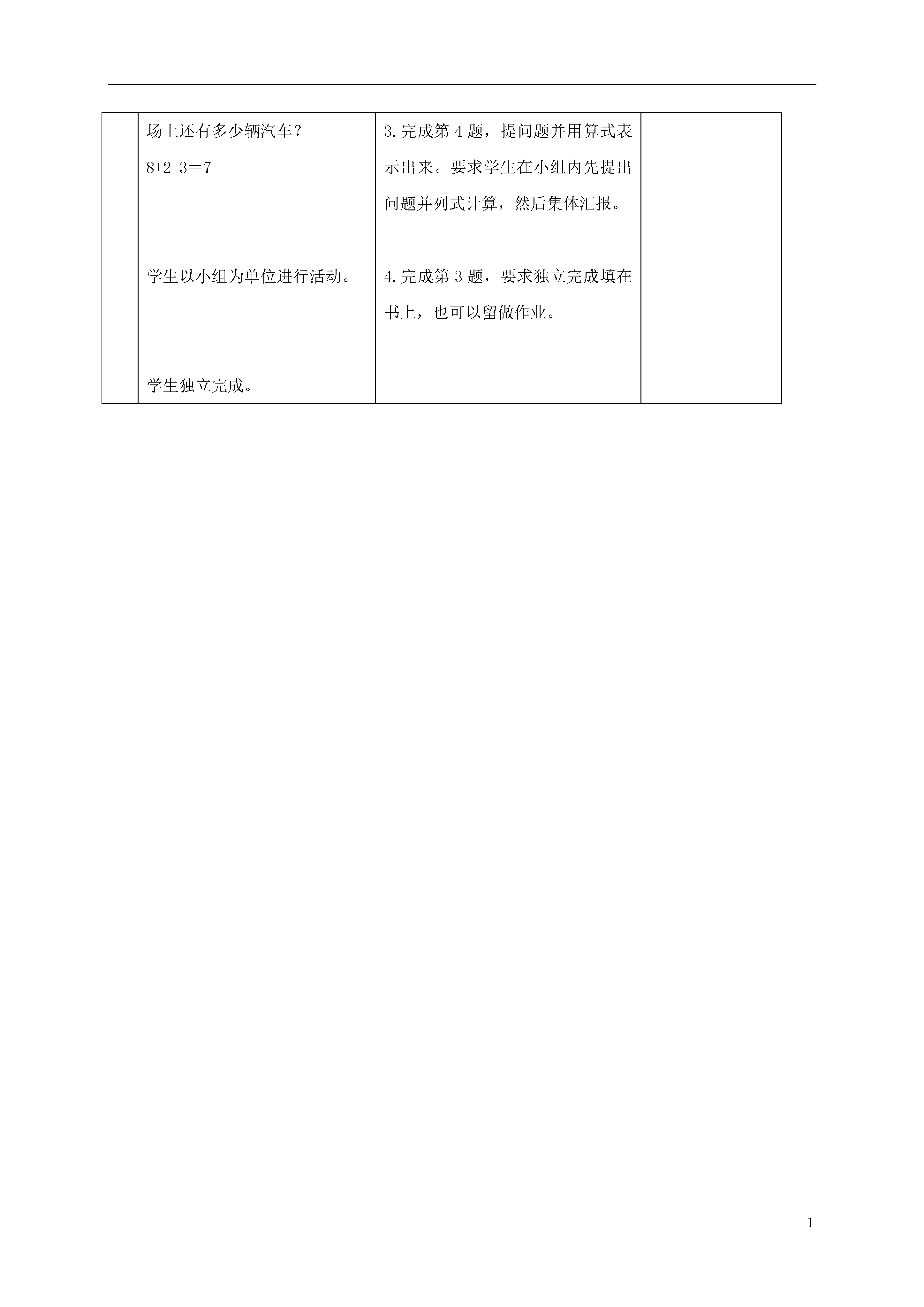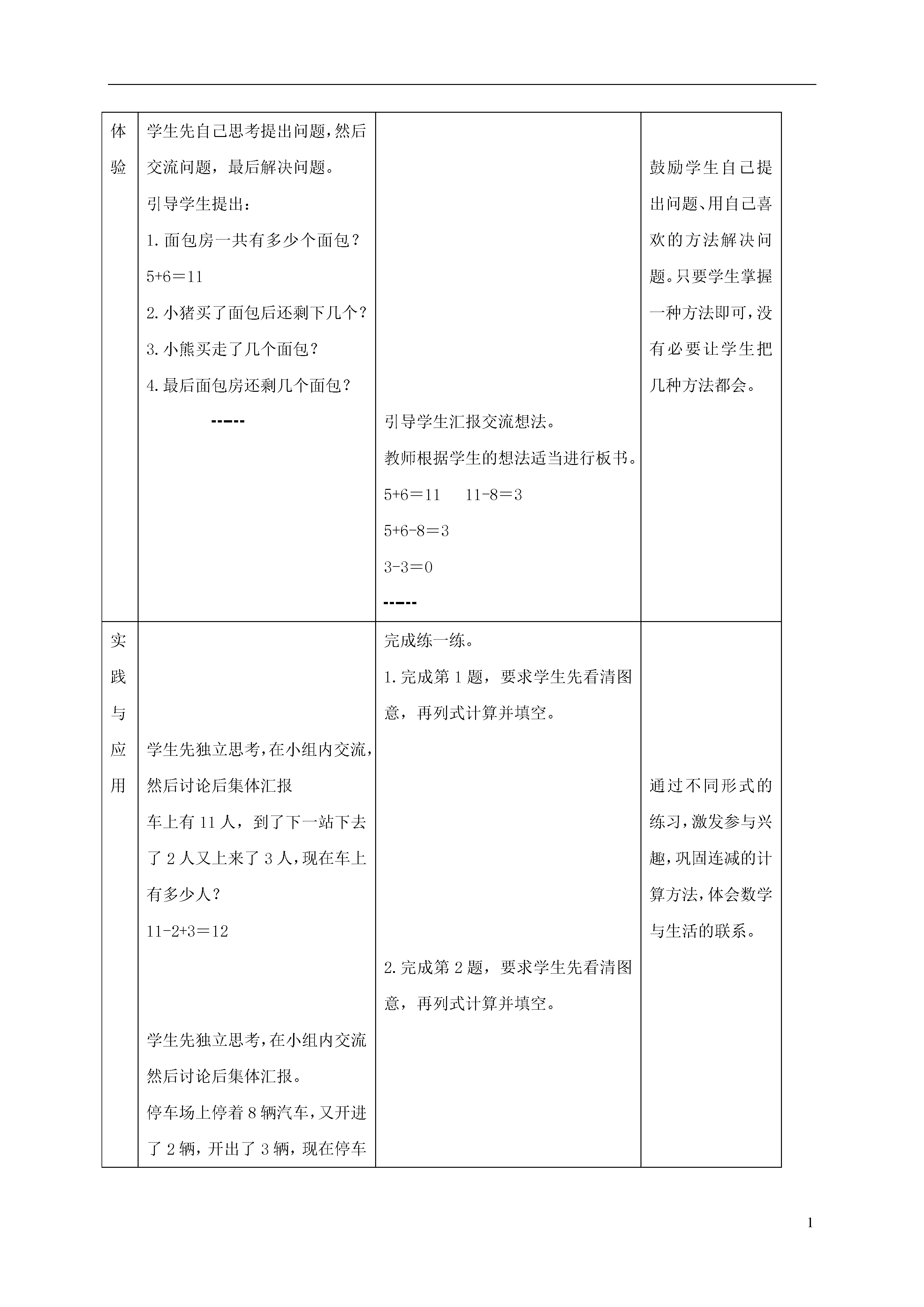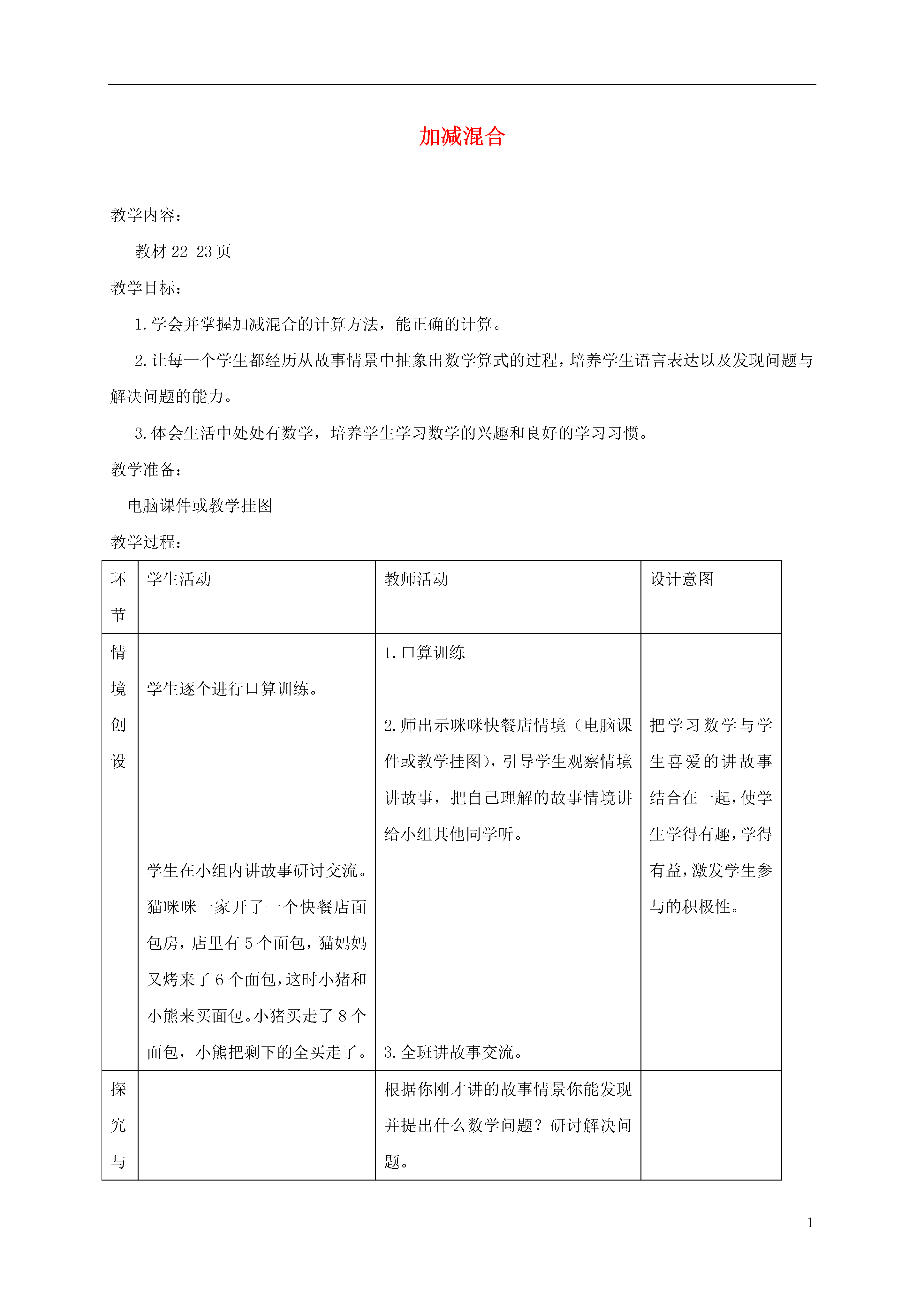 1加减混合教学内容:教材22-23页教学目标:1.学会并掌握加减混合的计算方法,能正确的计算。2.让每一个学生都经历从故事情景中抽象出数学算式的过程,培养学生语言表达以及发现问题与解决问题的能力。3.体会生活中处处有数学,培养学生学习数学的兴趣和良好的学习习惯。教学准备:电脑课件或教学挂图教学过程:环节学生活动教师活动设计意图情境创设学生逐个进行口算训练。学生在小组内讲故事研讨交流。猫咪咪一家开了一个快餐店面包房,店里有5个面包,猫妈妈又烤来了6个面包,这时小猪和小熊来买面包。小猪买走了8个面包,小熊把剩下的全买走了。1.口算训练2.师出示咪咪快餐店情境(电脑课件或教学挂图),引导学生观察情境讲故事,把自己理解的故事情境讲给小组其他同学听。3.全班讲故事交流。把学习数学与学生喜爱的讲故事结合在一起,使学生学得有趣,学得有益,激发学生参与的积极性。探究与体验学生先自己思考提出问题,然后交流问题,最后解决问题。引导学生提出:1.面包房一共有多少个面包?5+6=112.小猪买了面包后还剩下几个?3.小熊买走了几个面包?4.最后面包房还剩几个面包?┅┅根据你刚才讲的故事情景你能发现并提出什么数学问题?研讨解决问题。引导学生汇报交流想法。教师根据学生的想法适当进行板书。5+6=1111-8=35+6-8=33-3=0┅┅鼓励学生自己提出问题、用自己喜欢的方法解决问题。只要学生掌握一种方法即可,没有必要让学生把几种方法都会。实践与应用学生先独立思考,在小组内交流,然后讨论后集体汇报车上有11人,到了下一站下去了2人又上来了3人,现在车上有多少人?11-2+3=12学生先独立思考,在小组内交流然后讨论后集体汇报。停车场上停着8辆汽车,又开进了2辆,开出了3辆,现在停车场上还有多少辆汽车?8+2-3=7学生以小组为单位进行活动。学生独立完成。完成练一练。1.完成第1题,要求学生先看清图意,再列式计算并填空。2.完成第2题,要求学生先看清图意,再列式计算并填空。3.完成第4题,提问题并用算式表示出来。要求学生在小组内先提出问题并列式计算,然后集体汇报。4.完成第3题,要求独立完成填在书上,也可以留做作业。通过不同形式的练习,激发参与兴趣,巩固连减的计算方法,体会数学与生活的联系。