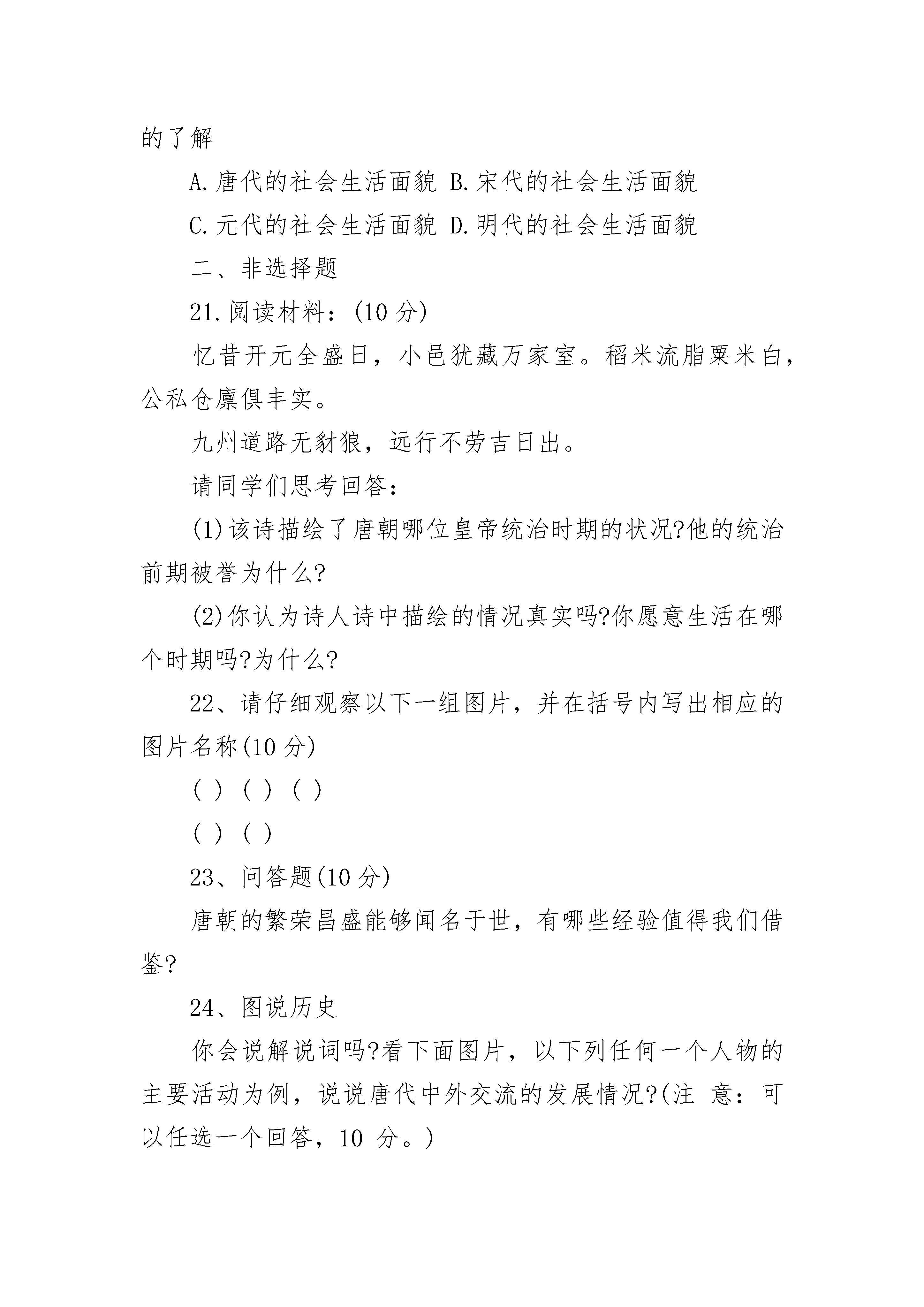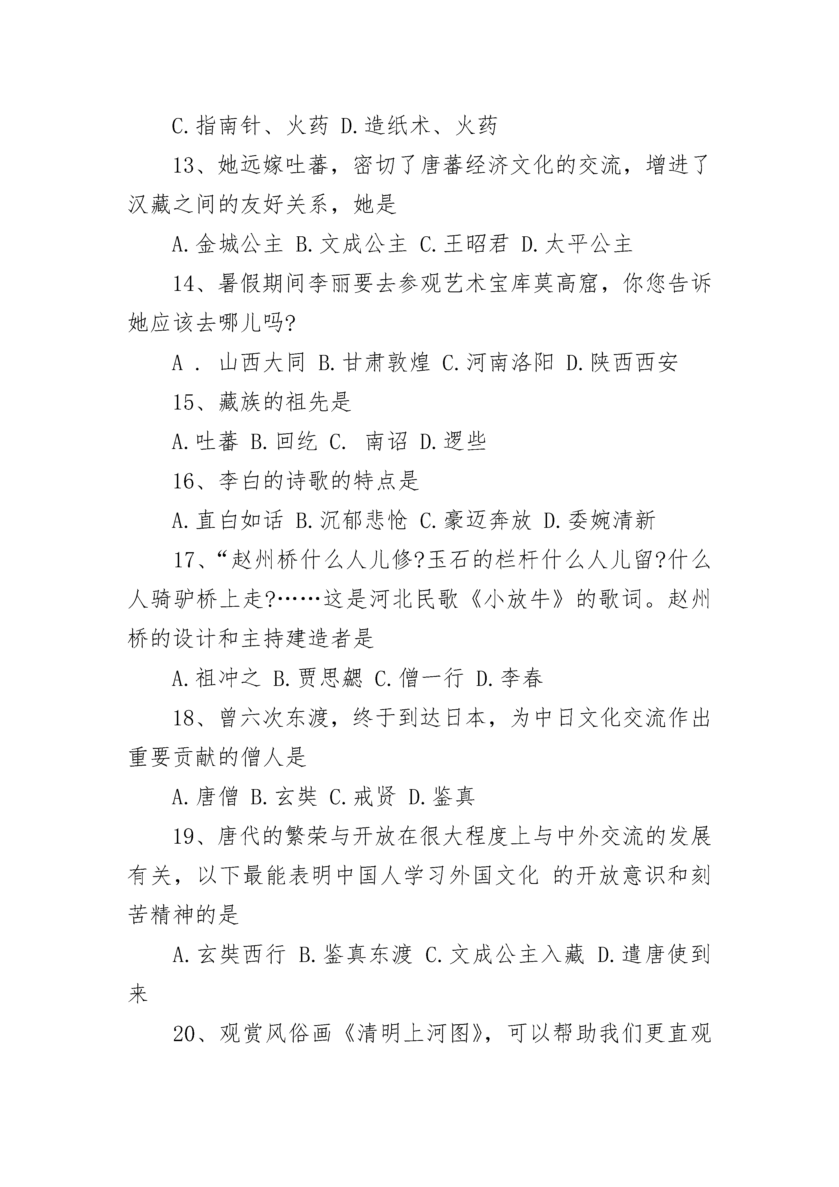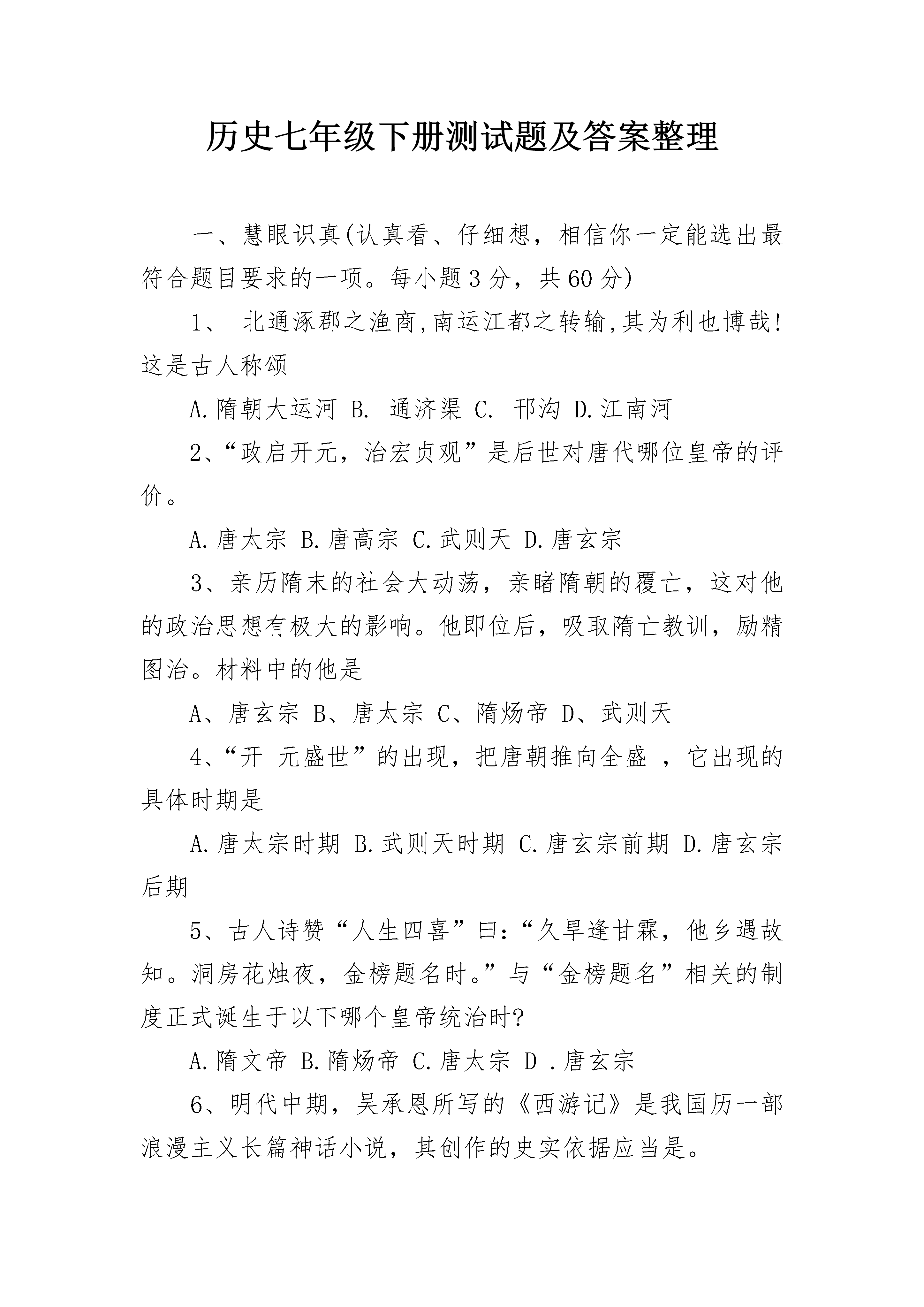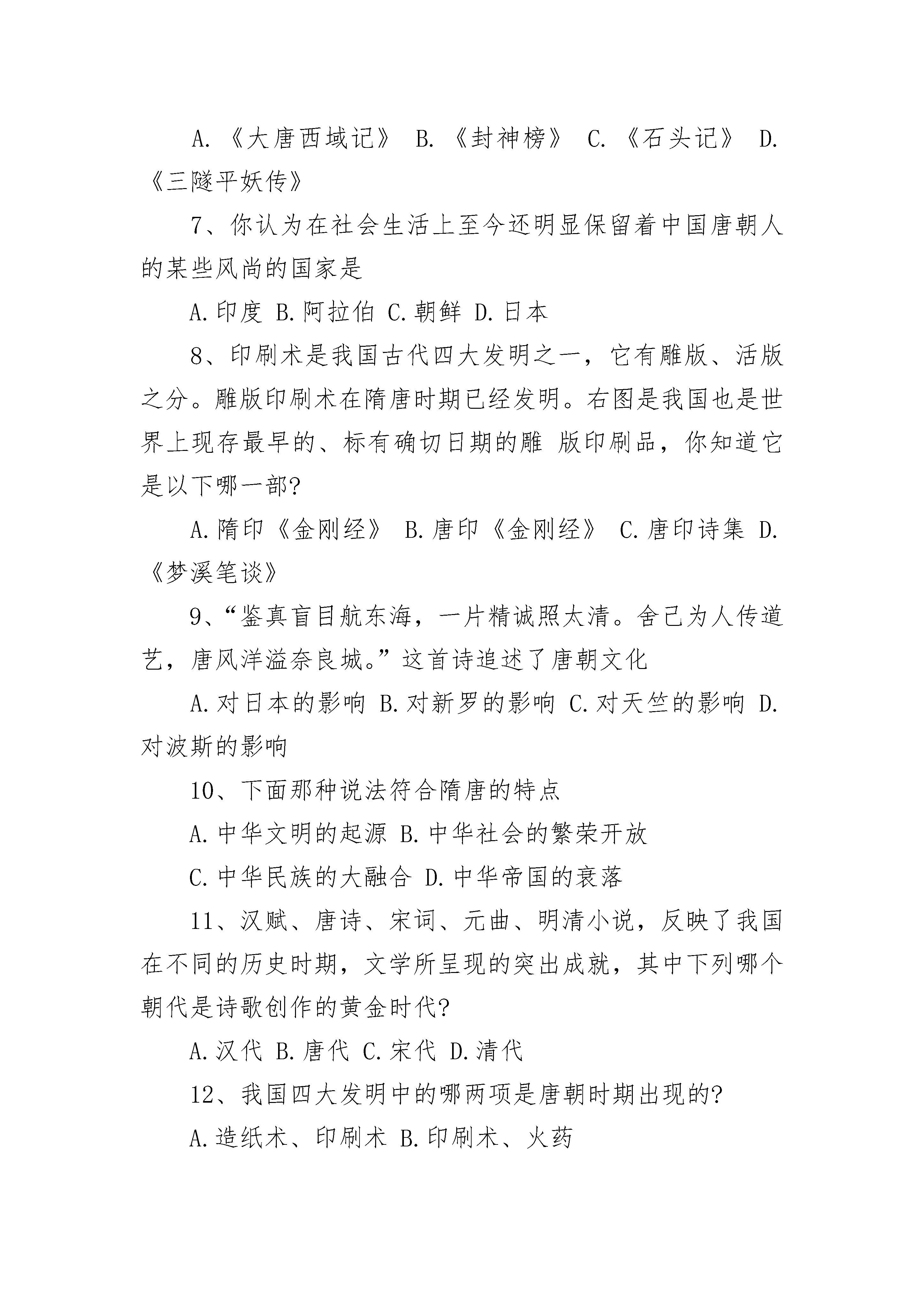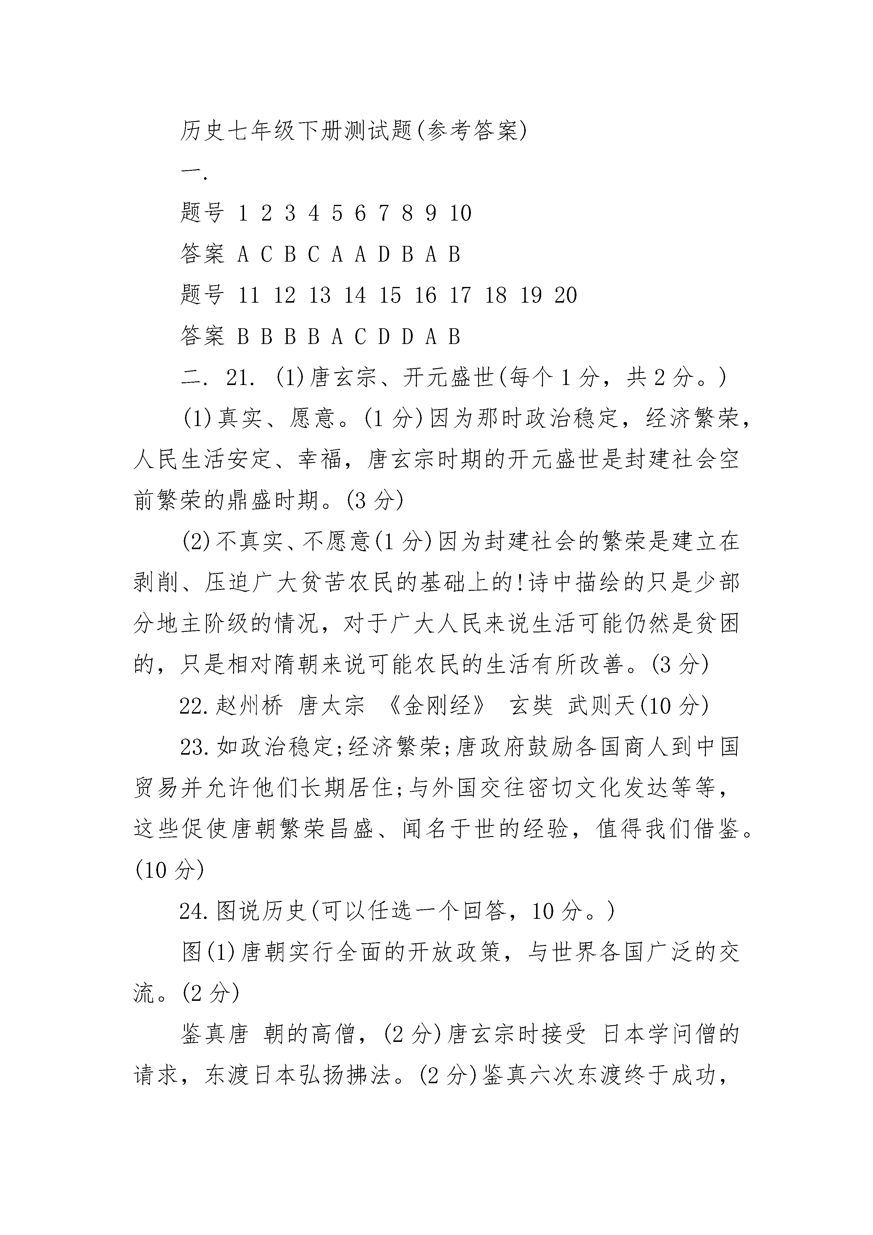 历史七年级下册测试题及答案整理一、慧眼识真(认真看、仔细想,相信你一定能选出最符合题目要求的一项。每小题3分,共60分)1、北通涿郡之渔商,南运江都之转输,其为利也博哉!这是古人称颂A.隋朝大运河B.通济渠C.邗沟D.江南河2、“政启开元,治宏贞观”是后世对唐代哪位皇帝的评价。A.唐太宗B.唐高宗C.武则天D.唐玄宗3、亲历隋末的社会大动荡,亲睹隋朝的覆亡,这对他的政治思想有极大的影响。他即位后,吸取隋亡教训,励精图治。材料中的他是A、唐玄宗B、唐太宗C、隋炀帝D、武则天4、“开元盛世”的出现,把唐朝推向全盛,它出现的具体时期是A.唐太宗时期B.武则天时期C.唐玄宗前期D.唐玄宗后期5、古人诗赞“人生四喜”曰:“久旱逢甘霖,他乡遇故知。洞房花烛夜,金榜题名时。”与“金榜题名”相关的制度正式诞生于以下哪个皇帝统治时?A.隋文帝B.隋炀帝C.唐太宗D.唐玄宗6、明代中期,吴承恩所写的《西游记》是我国历一部浪漫主义长篇神话小说,其创作的史实依据应当是。A.《大唐西域记》B.《封神榜》C.《石头记》D.《三隧平妖传》7、你认为在社会生活上至今还明显保留着中国唐朝人的某些风尚的国家是A.印度B.阿拉伯C.朝鲜D.日本8、印刷术是我国古代四大发明之一,它有雕版、活版之分。雕版印刷术在隋唐时期已经发明。右图是我国也是世界上现存最早的、标有确切日期的雕版印刷品,你知道它是以下哪一部?A.隋印《金刚经》B.唐印《金刚经》C.唐印诗集D.《梦溪笔谈》9、“鉴真盲目航东海,一片精诚照太清。舍己为人传道艺,唐风洋溢奈良城。”这首诗追述了唐朝文化A.对日本的影响B.对新罗的影响C.对天竺的影响D.对波斯的影响10、下面那种说法符合隋唐的特点A.中华文明的起源B.中华社会的繁荣开放C.中华民族的大融合D.中华帝国的衰落11、汉赋、唐诗、宋词、元曲、明清小说,反映了我国在不同的历史时期,文学所呈现的突出成就,其中下列哪个朝代是诗歌创作的黄金时代?A.汉代B.唐代C.宋代D.清代12、我国四大发明中的哪两项是唐朝时期出现的?A.造纸术、印刷术B.印刷术、火药C.指南针、火药D.造纸术、火药13、她远嫁吐蕃,密切了唐蕃经济文化的交流,增进了汉藏之间的友好关系,她是A.金城公主B.文成公主C.王昭君D.太平公主14、暑假期间李丽要去参观艺术宝库莫高窟,你您告诉她应该去哪儿吗?A.山西大同B.甘肃敦煌C.河南洛阳D.陕西西安15、藏族的祖先是A.吐蕃B.回纥C.南诏D.逻些16、李白的诗歌的特点是A.直白如话B.沉郁悲怆C.豪迈奔放D.委婉清新17、“赵州桥什么人儿修?玉石的栏杆什么人儿留?什么人骑驴桥上走?……这是河北民歌《小放牛》的歌词。赵州桥的设计和主持建造者是A.祖冲之B.贾思勰C.僧一行D.李春18、曾六次东渡,终于到达日本,为中日文化交流作出重要贡献的僧人是A.唐僧B.玄奘C.戒贤D.鉴真19、唐代的繁荣与开放在很大程度上与中外交流的发展有关,以下最能表明中国人学习外国文化的开放意识和刻苦精神的是A.玄奘西行B.鉴真东渡C.文成公主入藏D.遣唐使到来20、观赏风俗画《清明上河图》,可以帮助我们更直观的了解A.唐代的社会生活面貌B.宋代的社会生活面貌C.元代的社会生活面貌D.明代的社会生活面貌二、非选择题21.阅读材料:(10分)忆昔开元全盛日,小邑犹藏万家室。稻米流脂粟米白,公私仓廪俱丰实。九州道路无豺狼,远行不劳吉日出。请同学们思考回答:(1)该诗描绘了唐朝哪位皇帝统治时期的状况?他的统治前期被誉为什么?(2)你认为诗人诗中描绘的情况真实吗?你愿意生活在哪个时期吗?为什么?22、请仔细观察以下一组图片,并在括号内写出相应的图片名称(10分)()()()()()23、问答题(10分)唐朝的繁荣昌盛能够闻名于世,有哪些经验值得我们借鉴?24、图说历史你会说解说词吗?看下面图片,以下列任何一个人物的主要活动为例,说说唐代中外交流的发展情况?(注意:可以任选一个回答,10分。)历史七年级下册测试题(参考答案)一.题号12345678910答案ACBCAADBAB题号11121314151617181920答案BBBBACDDAB二.21.(1)唐玄宗、开元盛世(每个1分,共2分。)(1)真实、愿意。(1分)因为那时政治稳定,经济繁荣,人民生活安定、幸福,唐玄宗时期的开元盛世是封建社会空前繁荣的鼎盛时期。(3分)(2)不真实、不愿意(1分)因为封建社会的繁荣是建立在剥削、压迫广大贫苦农民的基础上的!诗中描绘的只是少部分地主阶级的情况,对于广大人民来说生活可能仍然是贫困的,只是相对隋朝来说可能农民的生活有所改善。(3分)22.赵州桥唐太宗《金刚经》玄奘武则天(10分)23.如政治稳定;经济繁荣;唐政府鼓励各国商人到中国贸易并允许他们长期居住;与外国交往密切文