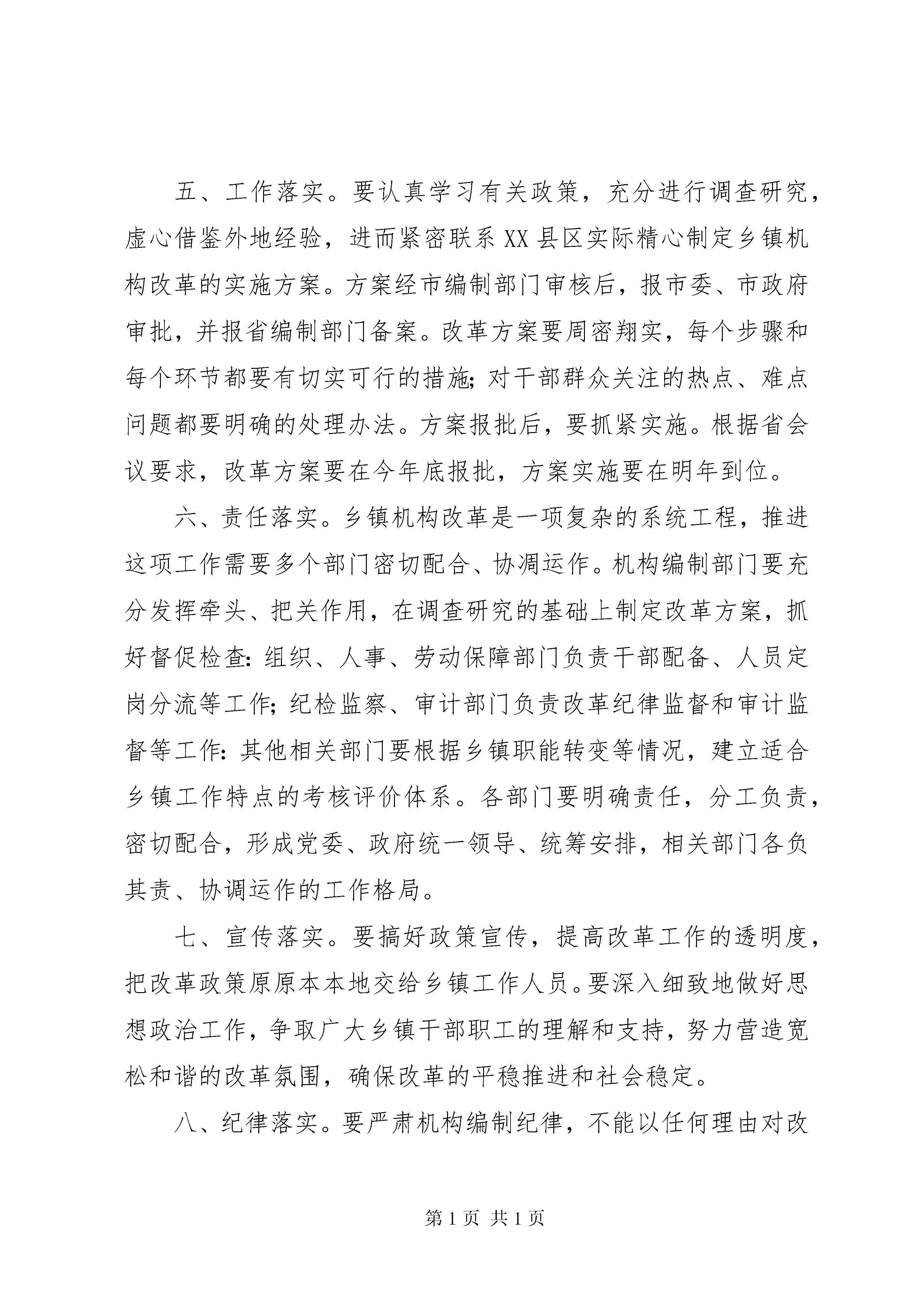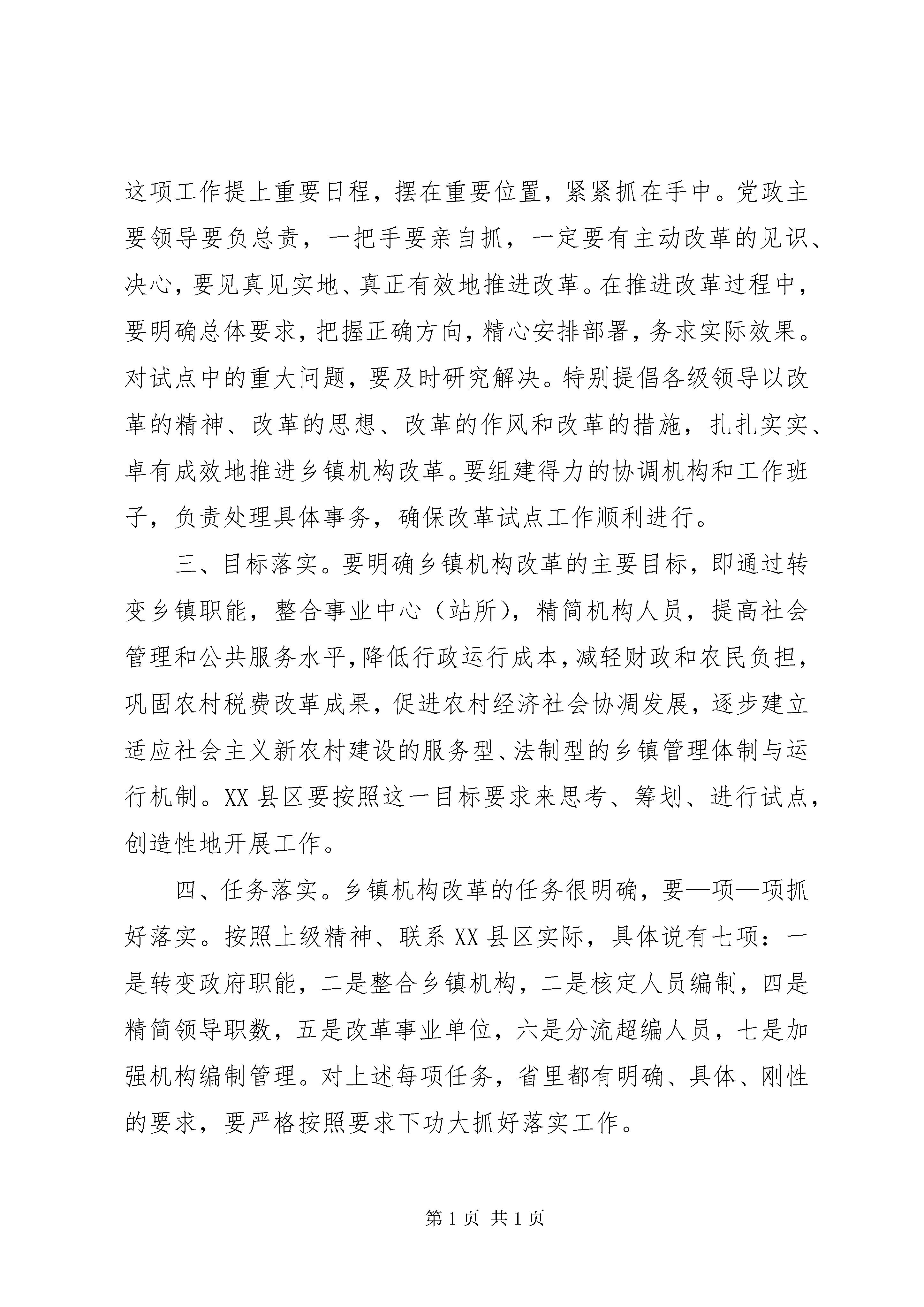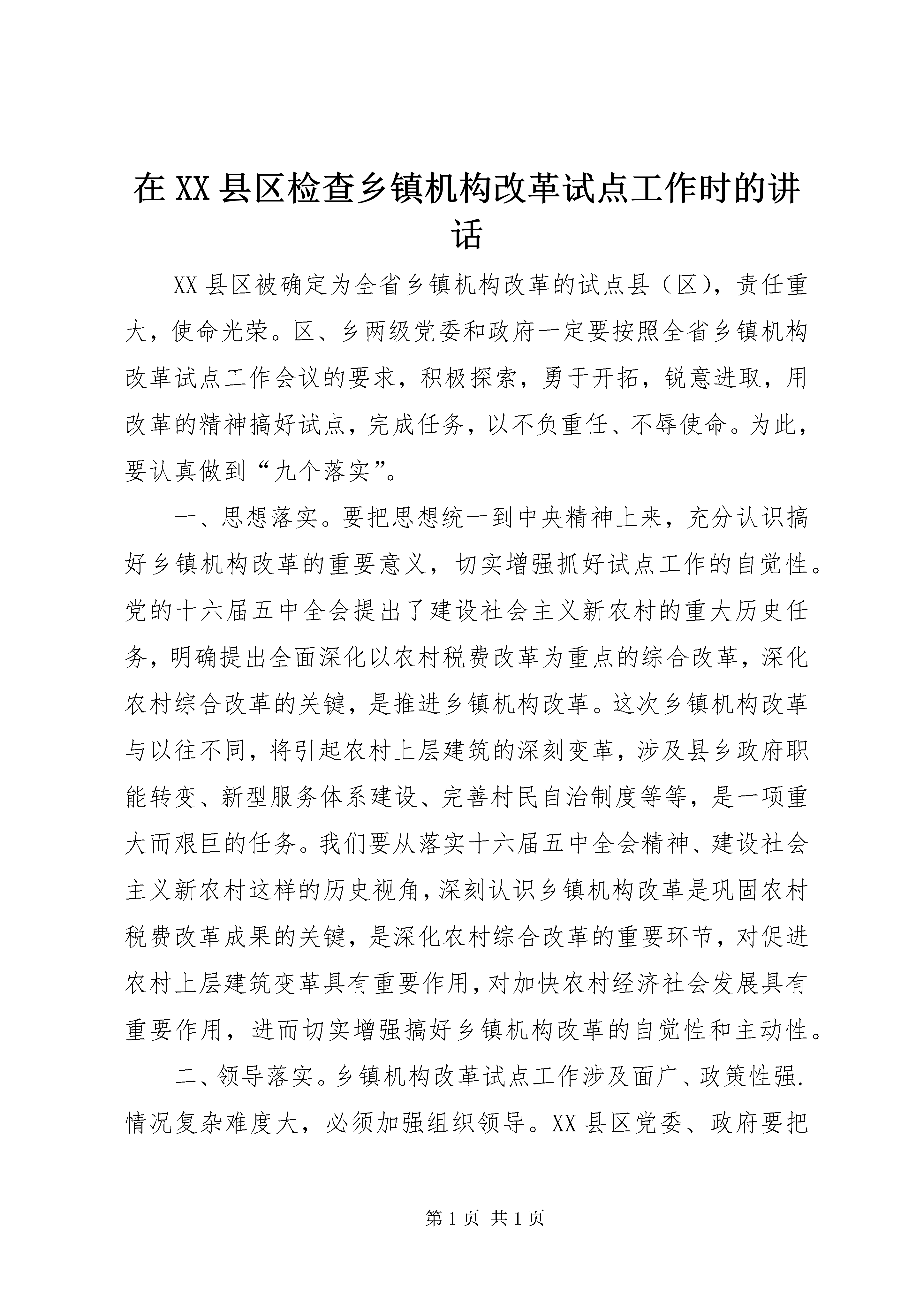 在XX县区检查乡镇机构改革试点工作时的讲话XX县区被确定为全省乡镇机构改革的试点县(区),责任重大,使命光荣。区、乡两级党委和政府一定要按照全省乡镇机构改革试点工作会议的要求,积极探索,勇于开拓,锐意进取,用改革的精神搞好试点,完成任务,以不负重任、不辱使命。为此,要认真做到“九个落实”。一、思想落实。要把思想统一到中央精神上来,充分认识搞好乡镇机构改革的重要意义,切实增强抓好试点工作的自觉性。党的十六届五中全会提出了建设社会主义新农村的重大历史任务,明确提出全面深化以农村税费改革为重点的综合改革,深化农村综合改革的关键,是推进乡镇机构改革。这次乡镇机构改革与以往不同,将引起农村上层建筑的深刻变革,涉及县乡政府职能转变、新型服务体系建设、完善村民自治制度等等,是一项重大而艰巨的任务。我们要从落实十六届五中全会精神、建设社会主义新农村这样的历史视角,深刻认识乡镇机构改革是巩固农村税费改革成果的关键,是深化农村综合改革的重要环节,对促进农村上层建筑变革具有重要作用,对加快农村经济社会发展具有重要作用,进而切实增强搞好乡镇机构改革的自觉性和主动性。二、领导落实。乡镇机构改革试点工作涉及面广、政策性强.情况复杂难度大,必须加强组织领导。XX县区党委、政府要把这项工作提上重要日程,摆在重要位置,紧紧抓在手中。党政主要领导要负总责,一把手要亲自抓,一定要有主动改革的见识、决心,要见真见实地、真正有效地推进改革。在推进改革过程中,要明确总体要求,把握正确方向,精心安排部署,务求实际效果。对试点中的重大问题,要及时研究解决。特别提倡各级领导以改革的精神、改革的思想、改革的作风和改革的措施,扎扎实实、卓有成效地推进乡镇机构改革。要组建得力的协调机构和工作班子,负责处理具体事务,确保改革试点工作顺利进行。三、目标落实。要明确乡镇机构改革的主要目标,即通过转变乡镇职能,整合事业中心(站所),精简机构人员,提高社会管理和公共服务水平,降低行政运行成本,减轻财政和农民负担,巩固农村税费改革成果,促进农村经济社会协凋发展,逐步建立适应社会主义新农村建设的服务型、法制型的乡镇管理体制与运行机制。XX县区要按照这一目标要求来思考、筹划、进行试点,创造性地开展工作。四、任务落实。乡镇机构改革的任务很明确,要—项—项抓好落实。按照上级精神、联系XX县区实际,具体说有七项:一是转变政府职能,二是整合乡镇机构,二是核定人员编制,四是精简领导职数,五是改革事业单位,六是分流超编人员,七是加强机构编制管理。对上述每项任务,省里都有明确、具体、刚性的要求,要严格按照要求下功大抓好落实工作。五、工作落实。要认真学习有关政策,充分进行调查研究,虚心借鉴外地经验,进而紧密联系XX县区实际精心制定乡镇机构改革的实施方案。方案经市编制部门审核后,报市委、市政府审批,并报省编制部门备案。改革方案要周密翔实,每个步骤和每个环节都要有切实可行的措施;对干部群众关注的热点、难点问题都要明确的处理办法。方案报批后,要抓紧实施。根据省会议要求,改革方案要在今年底报批,方案实施要在明年到位。六、责任落实。乡镇机构改革是一项复杂的系统工程,推进这项工作需要多个部门密切配合、协凋运作。机构编制部门要充分发挥牵头、把关作用,在调查研究的基础上制定改革方案,抓好督促检查:组织、人事、劳动保障部门负责干部配备、人员定岗分流等工作;纪检监察、审计部门负责改革纪律监督和审计监督等工作:其他相关部门要根据乡镇职能转变等情况,建立适合乡镇工作特点的考核评价体系。各部门要明确责任,分工负责,密切配合,形成党委、政府统一领导、统筹安排,相关部门各负其责、协调运作的工作格局。七、宣传落实。要搞好政策宣传,提高改革工作的透明度,把改革政策原原本本地交给乡镇工作人员。要深入细致地做好思想政治工作,争取广大乡镇干部职工的理解和支持,努力营造宽松和谐的改革氛围,确保改革的平稳推进和社会稳定。八、纪律落实。要严肃机构编制纪律,不能以任何理由对改革任务打折扣,更不能擅自增设机构,提高机构规格,增加人员编制和领导职数。要严肃组织纪律,人员分流工作要贯彻以人为本的原则,确保社会稳定。要严肃财经纪律,严格按照财务制度和国有资产管理制度办事,防止借改革之机违规转移资金、私分钱物等现象发生。市直、区直各部门要树立大局观念,带头执行机构编制管理规定,不得干预乡镇机构设置和人员编制核定。九、效果落实。抓乡镇机构改革要坚持高标准严要求,务求实际效果。遵循中央精神,衡量改革成效主要看四条:一是有利于巩固农村税费改革成果,确保农民负担不反弹:二是有利于提高工作效率,降低行政成本:二是增强为“三农”服务的功能,促进农村经济社会发展:四是提高依法行政的能力,促进农村社会稳定。同时在改革中要严守两条“底线”,即确保机构编制只减不增