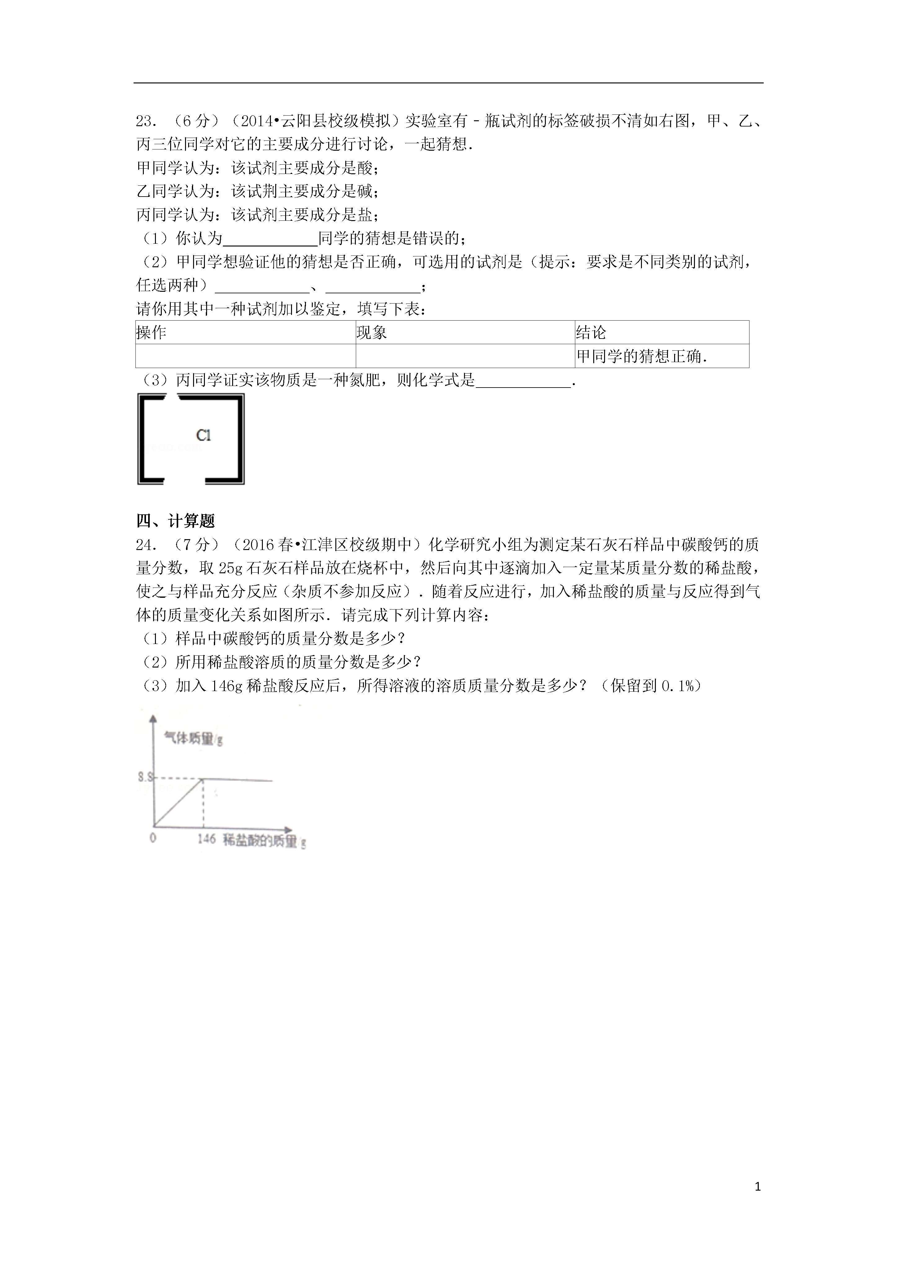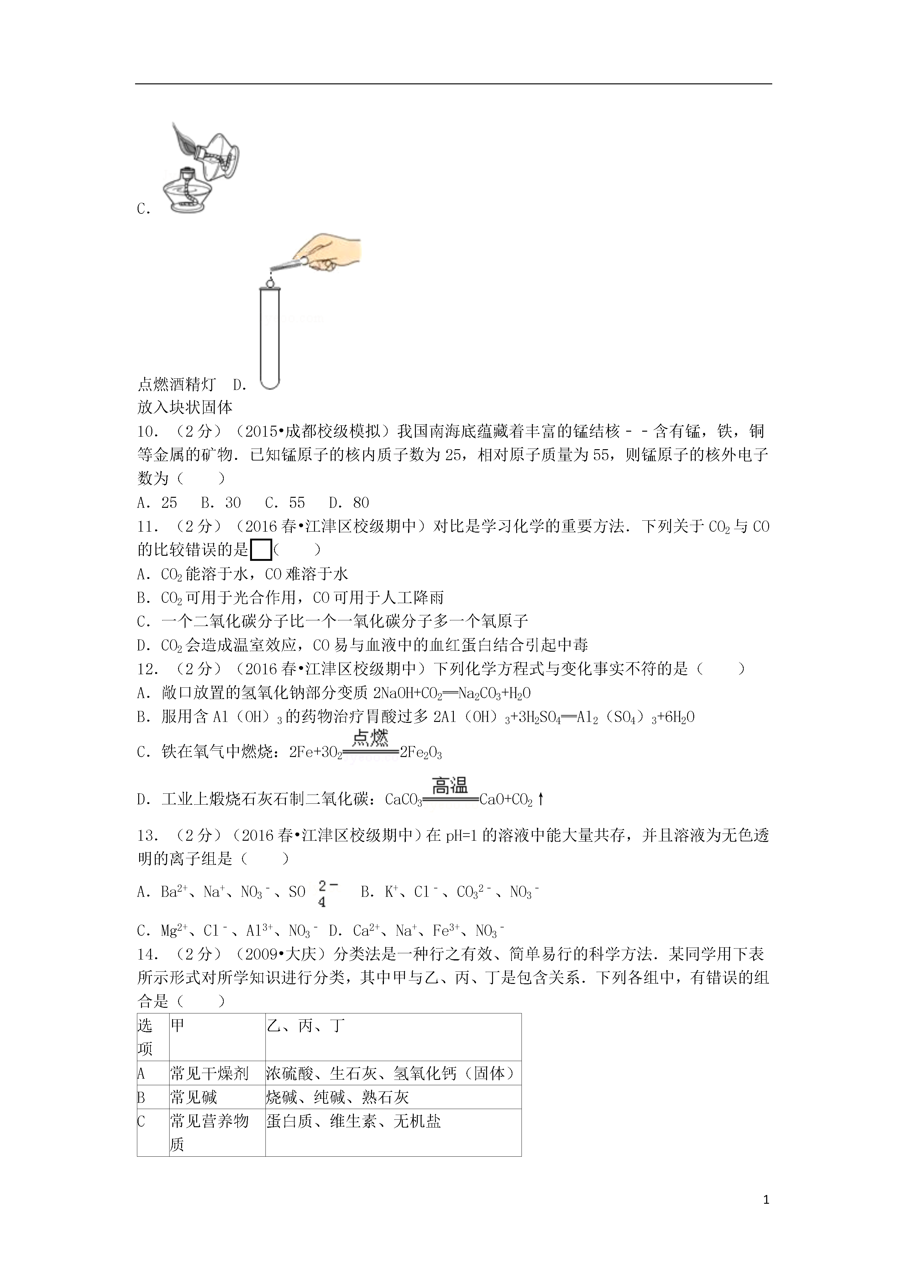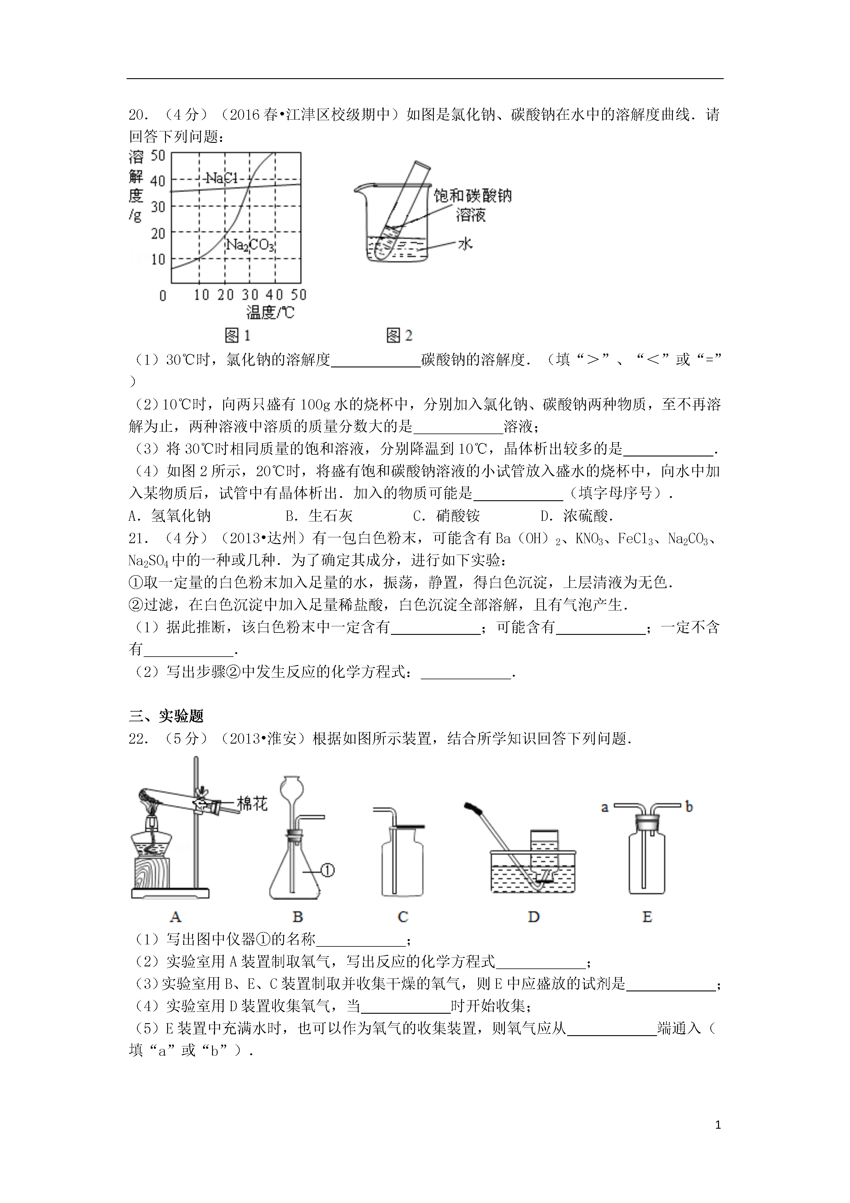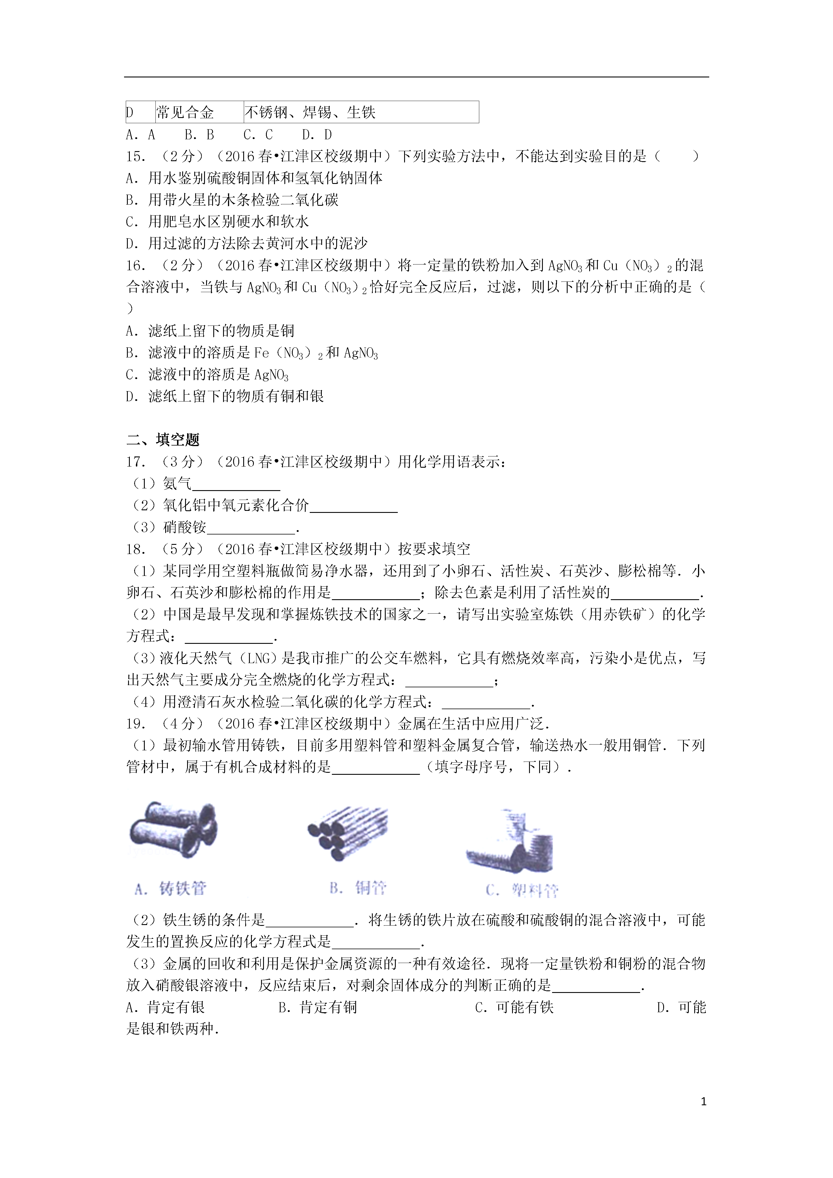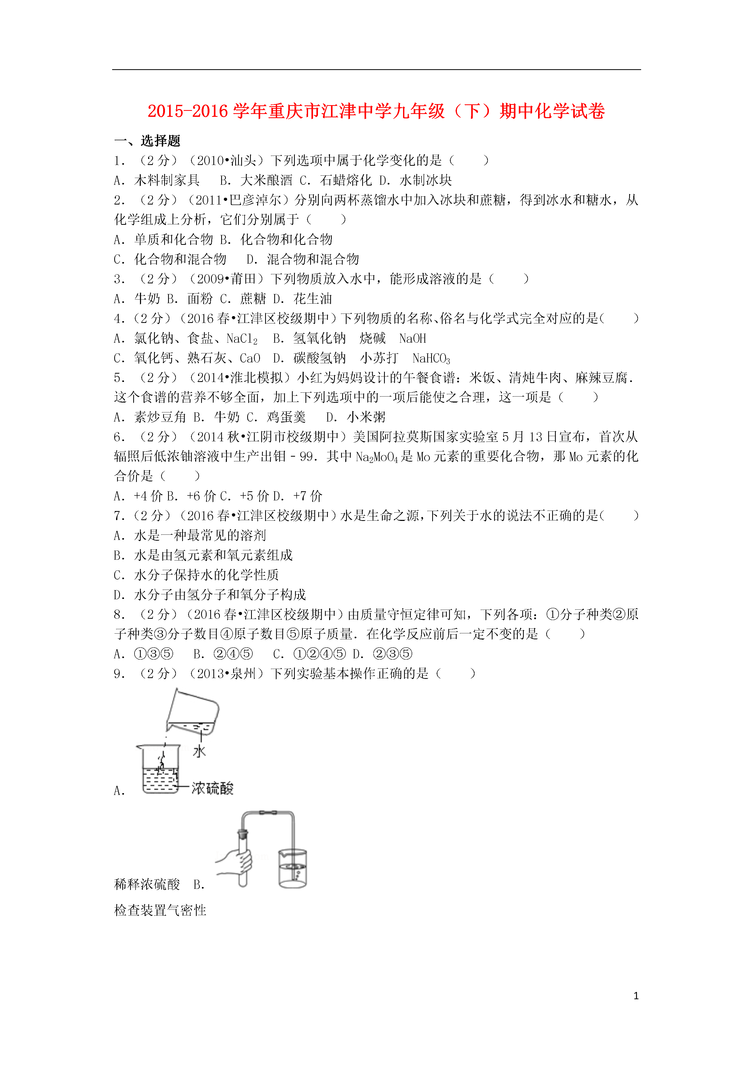 12015-2016学年重庆市江津中学九年级(下)期中化学试卷一、选择题1.(2分)(2010•汕头)下列选项中属于化学变化的是()A.木料制家具B.大米酿酒C.石蜡熔化D.水制冰块2.(2分)(2011•巴彦淖尔)分别向两杯蒸馏水中加入冰块和蔗糖,得到冰水和糖水,从化学组成上分析,它们分别属于()A.单质和化合物B.化合物和化合物C.化合物和混合物D.混合物和混合物3.(2分)(2009•莆田)下列物质放入水中,能形成溶液的是()A.牛奶B.面粉C.蔗糖D.花生油4.(2分)(2016春•江津区校级期中)下列物质的名称、俗名与化学式完全对应的是()A.氯化钠、食盐、NaCl2B.氢氧化钠烧碱NaOHC.氧化钙、熟石灰、CaOD.碳酸氢钠小苏打NaHCO35.(2分)(2014•淮北模拟)小红为妈妈设计的午餐食谱:米饭、清炖牛肉、麻辣豆腐.这个食谱的营养不够全面,加上下列选项中的一项后能使之合理,这一项是()A.素炒豆角B.牛奶C.鸡蛋羹D.小米粥6.(2分)(2014秋•江阴市校级期中)美国阿拉莫斯国家实验室5月13日宣布,首次从辐照后低浓铀溶液中生产出钼﹣99.其中Na2MoO4是Mo元素的重要化合物,那Mo元素的化合价是()A.+4价B.+6价C.+5价D.+7价7.(2分)(2016春•江津区校级期中)水是生命之源,下列关于水的说法不正确的是()A.水是一种最常见的溶剂B.水是由氢元素和氧元素组成C.水分子保持水的化学性质D.水分子由氢分子和氧分子构成8.(2分)(2016春•江津区校级期中)由质量守恒定律可知,下列各项:①分子种类②原子种类③分子数目④原子数目⑤原子质量.在化学反应前后一定不变的是()A.①③⑤B.②④⑤C.①②④⑤D.②③⑤9.(2分)(2013•泉州)下列实验基本操作正确的是()A.稀释浓硫酸B.检查装置气密性C.点燃酒精灯D.放入块状固体10.(2分)(2015•成都校级模拟)我国南海底蕴藏着丰富的锰结核﹣﹣含有锰,铁,铜等金属的矿物.已知锰原子的核内质子数为25,相对原子质量为55,则锰原子的核外电子数为()A.25B.30C.55D.8011.(2分)(2016春•江津区校级期中)对比是学习化学的重要方法.下列关于CO2与CO的比较错误的是()A.CO2能溶于水,CO难溶于水B.CO2可用于光合作用,CO可用于人工降雨C.一个二氧化碳分子比一个一氧化碳分子多一个氧原子D.CO2会造成温室效应,CO易与血液中的血红蛋白结合引起中毒12.(2分)(2016春•江津区校级期中)下列化学方程式与变化事实不符的是()A.敞口放置的氢氧化钠部分变质2NaOH+CO2═Na2CO3+H2OB.服用含Al(OH)3的药物治疗胃酸过多2Al(OH)3+3H2SO4═Al2(SO4)3+6H2OC.铁在氧气中燃烧:2Fe+3O22Fe2O3D.工业上煅烧石灰石制二氧化碳:CaCO3CaO+CO2↑13.(2分)(2016春•江津区校级期中)在pH=1的溶液中能大量共存,并且溶液为无色透明的离子组是()A.Ba2+、Na+、NO3﹣、SOB.K+、Cl﹣、CO32﹣、NO3﹣C.Mg2+、Cl﹣、Al3+、NO3﹣D.Ca2+、Na+、Fe3+、NO3﹣14.(2分)(2009•大庆)分类法是一种行之有效、简单易行的科学方法.某同学用下表所示形式对所学知识进行分类,其中甲与乙、丙、丁是包含关系.下列各组中,有错误的组合是()选项甲乙、丙、丁A常见干燥剂浓硫酸、生石灰、氢氧化钙(固体)B常见碱烧碱、纯碱、熟石灰C常见营养物质蛋白质、维生素、无机盐D常见合金不锈钢、焊锡、生铁A.AB.BC.CD.D15.(2分)(2016春•江津区校级期中)下列实验方法中,不能达到实验目的是()A.用水鉴别硫酸铜固体和氢氧化钠固体B.用带火星的木条检验二氧化碳C.用肥皂水区别硬水和软水D.用过滤的方法除去黄河水中的泥沙16.(2分)(2016春•江津区校级期中)将一定量的铁粉加入到AgNO3和Cu(NO3)2的混合溶液中,当铁与AgNO3和Cu(NO3)2恰好完全反应后,过滤,则以下的分析中正确的是()A.滤纸上留下的物质是铜B.滤液中的溶质是Fe(NO3)2和AgNO3C.滤液中的溶质是AgNO3D.滤纸上留下的物质有铜和银二、填空题17.(3分)(2016春•江津区校级期中)用化学用语表示:(1)氨气(2)氧化铝中氧元素化合价(3)硝酸铵.18.(5分)(2016春•江津区校级期中)按要求填空(1)某同学用空塑料瓶做简易净水器,还用到了小卵石、活性炭、石英沙、膨松棉等.小卵石、石英沙和