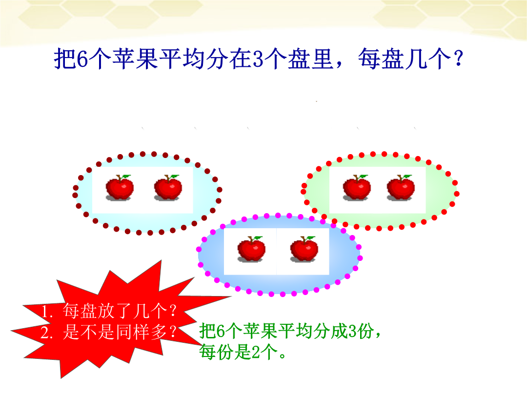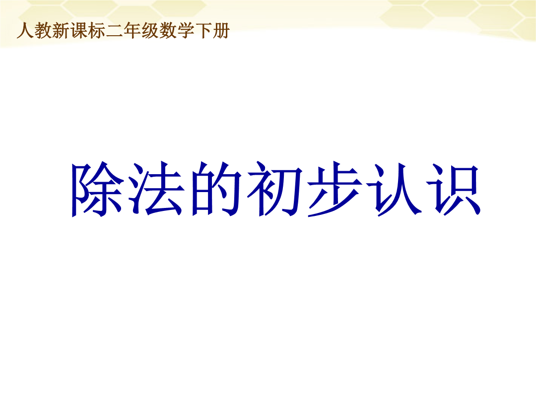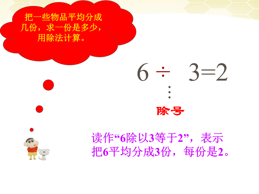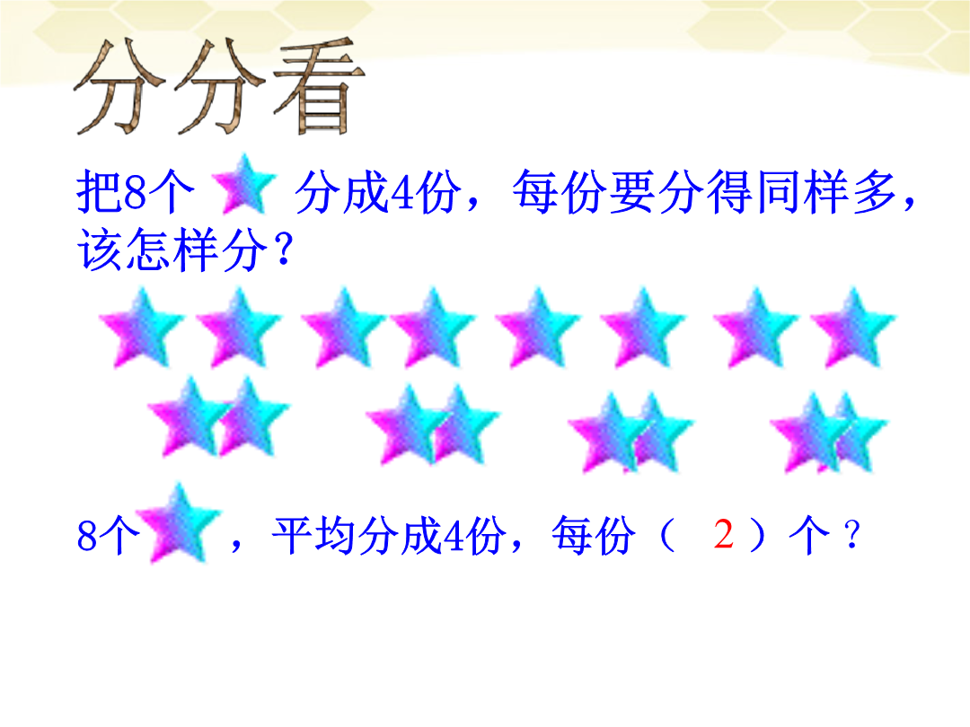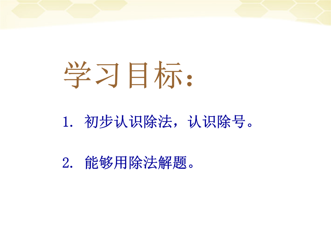 除法的初步认识学习目标:1.初步认识除法,认识除号。2.能够用除法解题。把8个分成4份,每份要分得同样多,该怎样分?把6个苹果平均分在3个盘里,每盘几个?把一些物品平均分成几份,求一份是多少,用除法计算。摆一摆,再写出算式。把8个皮球平均放在2个盒里,每盒几个?102=5把平均分成份,每份是。考考你总结:通过本节课的学习,同学们认识除法了吗?能够用除法熟练解题了吗?