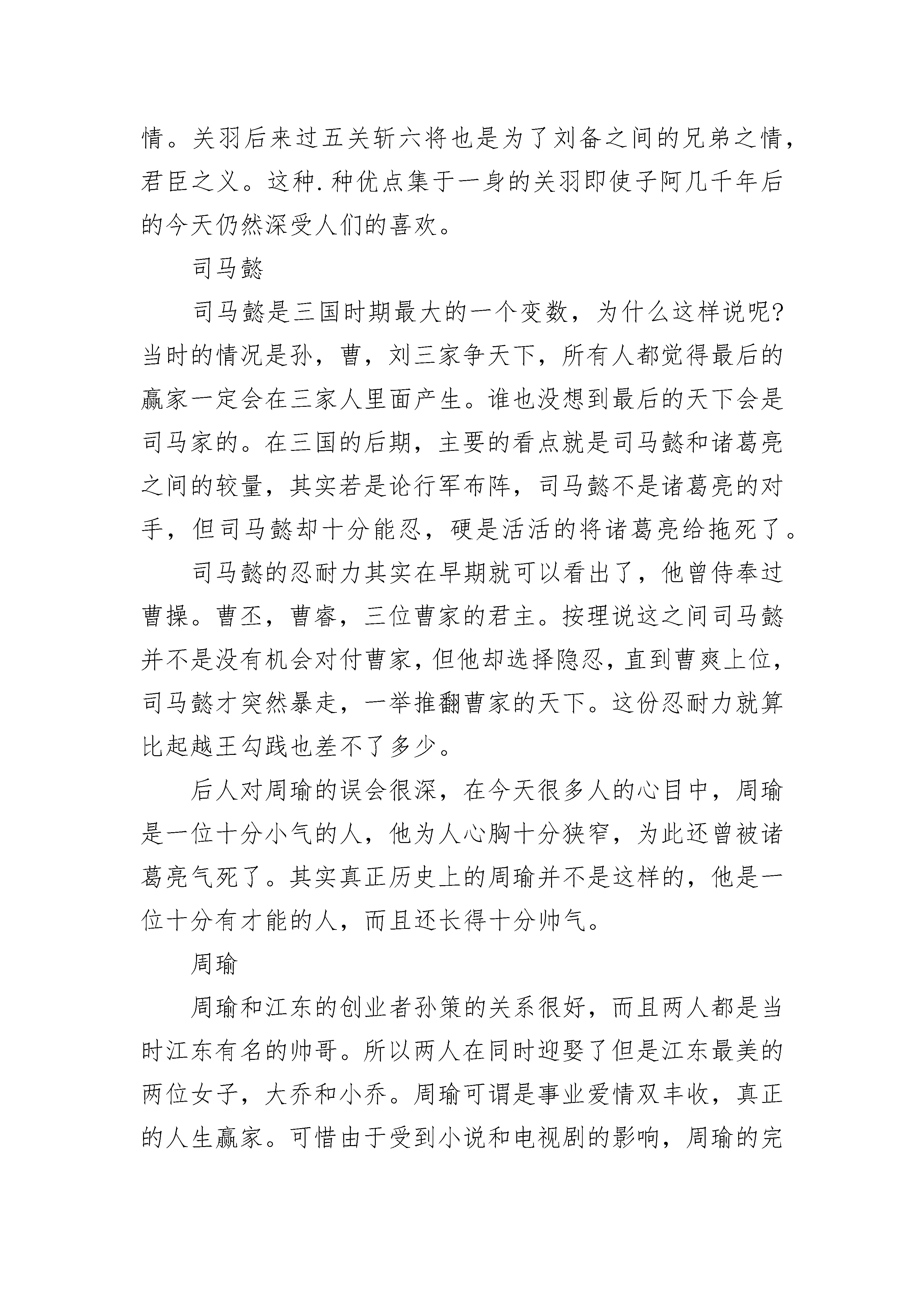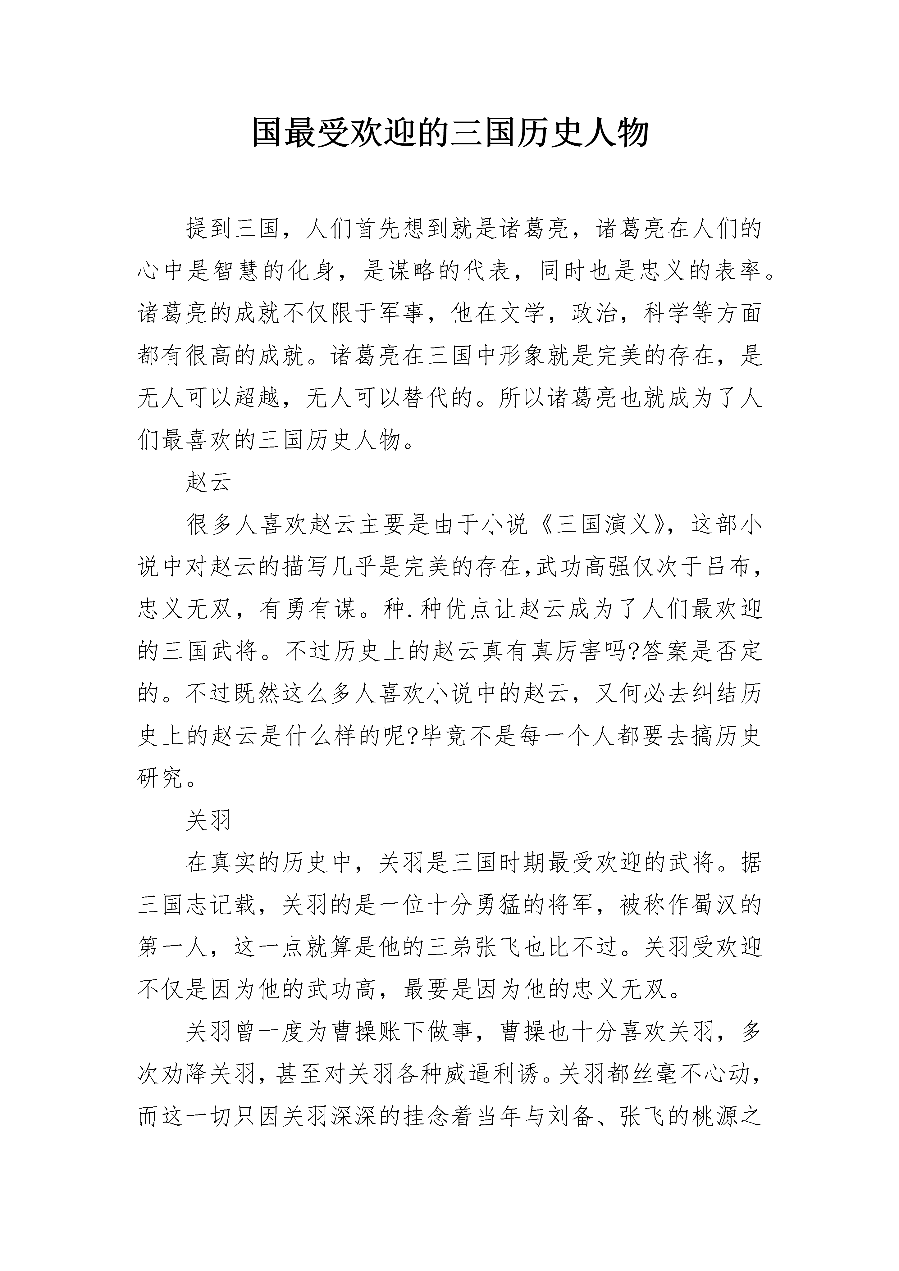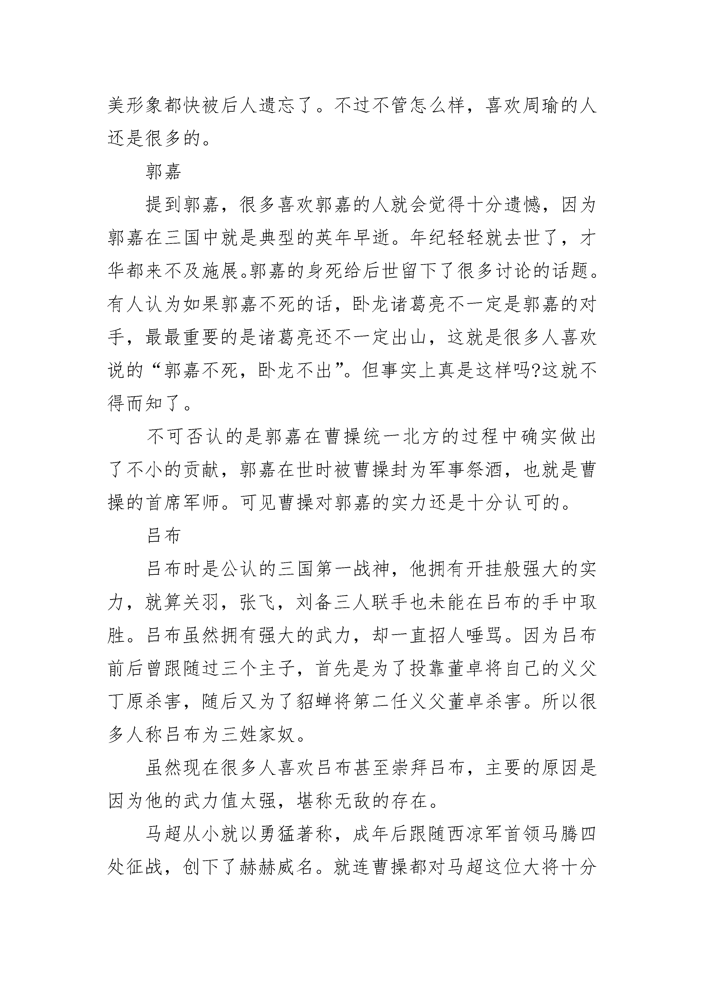 国最受欢迎的三国历史人物提到三国,人们首先想到就是诸葛亮,诸葛亮在人们的心中是智慧的化身,是谋略的代表,同时也是忠义的表率。诸葛亮的成就不仅限于军事,他在文学,政治,科学等方面都有很高的成就。诸葛亮在三国中形象就是完美的存在,是无人可以超越,无人可以替代的。所以诸葛亮也就成为了人们最喜欢的三国历史人物。赵云很多人喜欢赵云主要是由于小说《三国演义》,这部小说中对赵云的描写几乎是完美的存在,武功高强仅次于吕布,忠义无双,有勇有谋。种.种优点让赵云成为了人们最欢迎的三国武将。不过历史上的赵云真有真厉害吗?答案是否定的。不过既然这么多人喜欢小说中的赵云,又何必去纠结历史上的赵云是什么样的呢?毕竟不是每一个人都要去搞历史研究。关羽在真实的历史中,关羽是三国时期最受欢迎的武将。据三国志记载,关羽的是一位十分勇猛的将军,被称作蜀汉的第一人,这一点就算是他的三弟张飞也比不过。关羽受欢迎不仅是因为他的武功高,最要是因为他的忠义无双。关羽曾一度为曹操账下做事,曹操也十分喜欢关羽,多次劝降关羽,甚至对关羽各种威逼利诱。关羽都丝毫不心动,而这一切只因关羽深深的挂念着当年与刘备、张飞的桃源之情。关羽后来过五关斩六将也是为了刘备之间的兄弟之情,君臣之义。这种.种优点集于一身的关羽即使子阿几千年后的今天仍然深受人们的喜欢。司马懿司马懿是三国时期最大的一个变数,为什么这样说呢?当时的情况是孙,曹,刘三家争天下,所有人都觉得最后的赢家一定会在三家人里面产生。谁也没想到最后的天下会是司马家的。在三国的后期,主要的看点就是司马懿和诸葛亮之间的较量,其实若是论行军布阵,司马懿不是诸葛亮的对手,但司马懿却十分能忍,硬是活活的将诸葛亮给拖死了。司马懿的忍耐力其实在早期就可以看出了,他曾侍奉过曹操。曹丕,曹睿,三位曹家的君主。按理说这之间司马懿并不是没有机会对付曹家,但他却选择隐忍,直到曹爽上位,司马懿才突然暴走,一举推翻曹家的天下。这份忍耐力就算比起越王勾践也差不了多少。后人对周瑜的误会很深,在今天很多人的心目中,周瑜是一位十分小气的人,他为人心胸十分狭窄,为此还曾被诸葛亮气死了。其实真正历史上的周瑜并不是这样的,他是一位十分有才能的人,而且还长得十分帅气。周瑜周瑜和江东的创业者孙策的关系很好,而且两人都是当时江东有名的帅哥。所以两人在同时迎娶了但是江东最美的两位女子,大乔和小乔。周瑜可谓是事业爱情双丰收,真正的人生赢家。可惜由于受到小说和电视剧的影响,周瑜的完美形象都快被后人遗忘了。不过不管怎么样,喜欢周瑜的人还是很多的。郭嘉提到郭嘉,很多喜欢郭嘉的人就会觉得十分遗憾,因为郭嘉在三国中就是典型的英年早逝。年纪轻轻就去世了,才华都来不及施展。郭嘉的身死给后世留下了很多讨论的话题。有人认为如果郭嘉不死的话,卧龙诸葛亮不一定是郭嘉的对手,最最重要的是诸葛亮还不一定出山,这就是很多人喜欢说的“郭嘉不死,卧龙不出”。但事实上真是这样吗?这就不得而知了。不可否认的是郭嘉在曹操统一北方的过程中确实做出了不小的贡献,郭嘉在世时被曹操封为军事祭酒,也就是曹操的首席军师。可见曹操对郭嘉的实力还是十分认可的。吕布吕布时是公认的三国第一战神,他拥有开挂般强大的实力,就算关羽,张飞,刘备三人联手也未能在吕布的手中取胜。吕布虽然拥有强大的武力,却一直招人唾骂。因为吕布前后曾跟随过三个主子,首先是为了投靠董卓将自己的义父丁原杀害,随后又为了貂蝉将第二任义父董卓杀害。所以很多人称吕布为三姓家奴。虽然现在很多人喜欢吕布甚至崇拜吕布,主要的原因是因为他的武力值太强,堪称无敌的存在。马超从小就以勇猛著称,成年后跟随西凉军首领马腾四处征战,创下了赫赫威名。就连曹操都对马超这位大将十分偏爱,多次向马超抛出橄榄枝,可惜马超都没有任何投效曹操的意思,甚至一度和曹操开展。导致后来曹操将马超的家人全部杀害。马超马超虽然位列蜀汉五虎上将,但却是五虎将中最不被重用的人。所以马超在投降刘备之后一直十分郁闷,明明自己很有能力,却始终得不到刘备的信任,从来不会对马超委以重任,导致最后马超只能郁郁而终。曹操曹操是三国中最具争议的一个历史人物,有人认为他是一个奸诈狡猾的真小人,有人认为他是一个拥有治国之才的枭雄。纵观曹操的一生,很具有传奇色彩,从一个小小的官员摇身一变成为了统领北方的魏国之主。曹操为人十分谨慎,对每一个人都怀有防范之心。在三国中由于曹操过于谨慎被曹操误杀的人很多,其中最冤的就是华佗。本来华佗是想为曹操治兵,结果曹操却说华佗想要谋害他,就将华佗杀死。其实这样不能完全怪曹操,只怪华佗的技术太先进了,在当时的情况下,华佗给曹操说要把头颅切开治病,不要说曹操,估计谁都不会相信。曹操虽然形象很具争议,但现在喜欢他的人还是很多,很多人都将曹操当作学习的楷模。甚至想成为曹操哪样的奸雄。张飞张飞在三国中的形象十分鲜明,无论是长