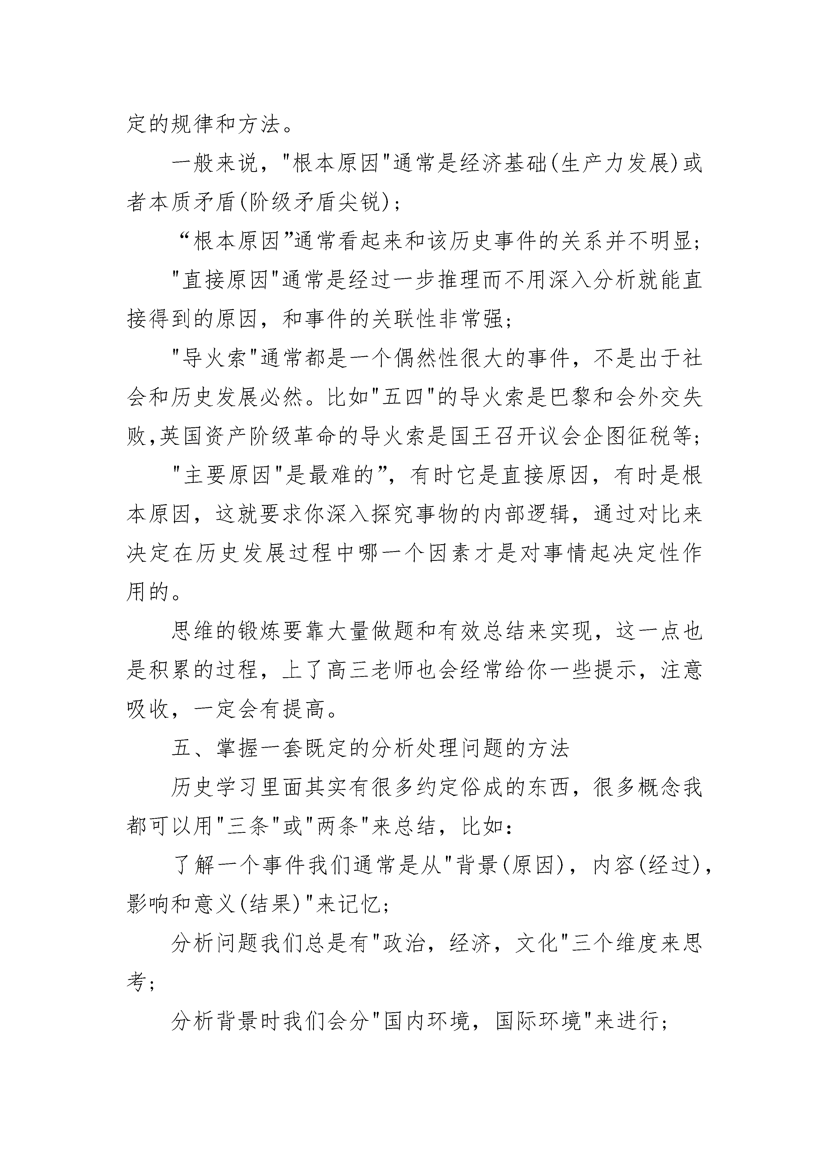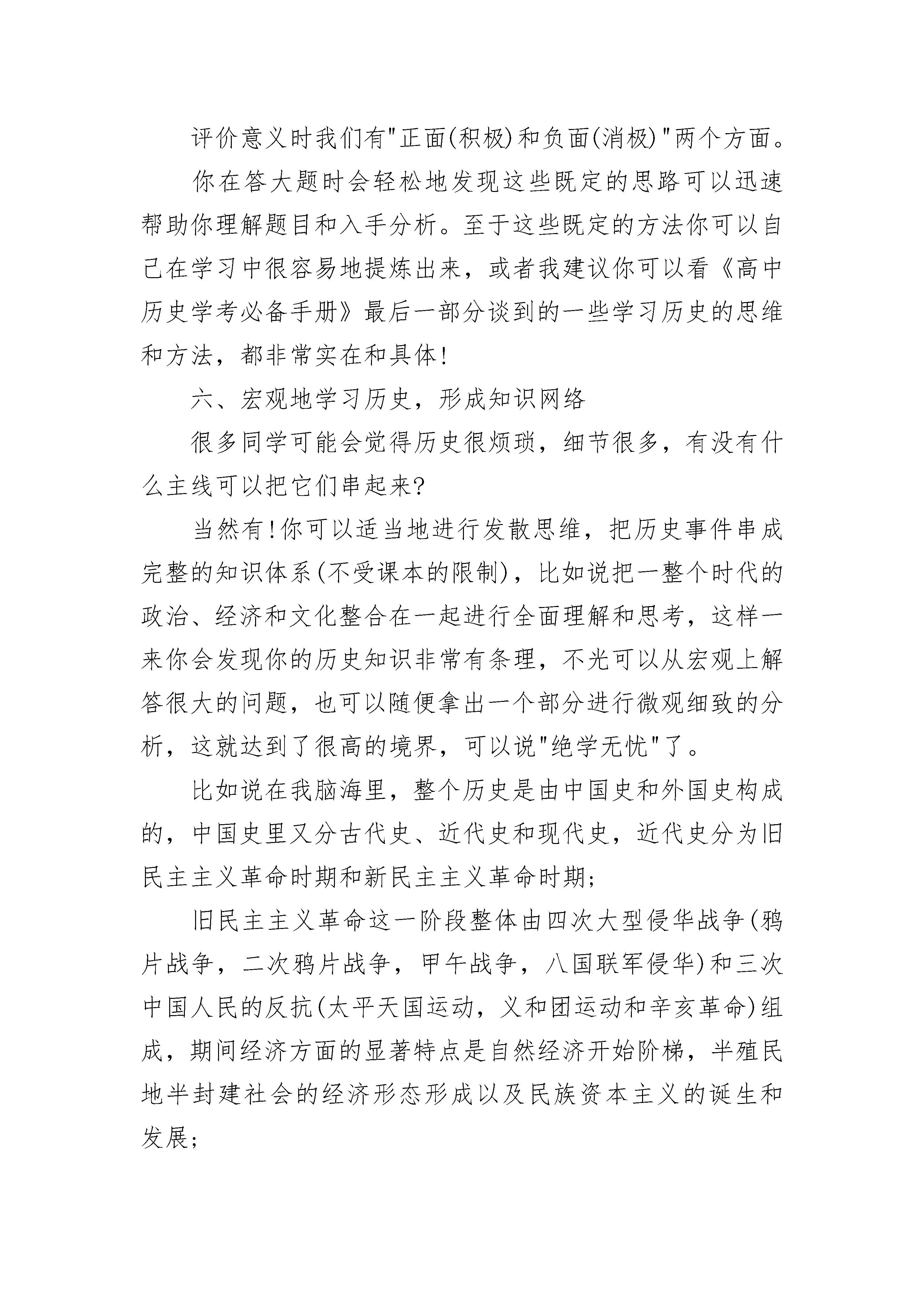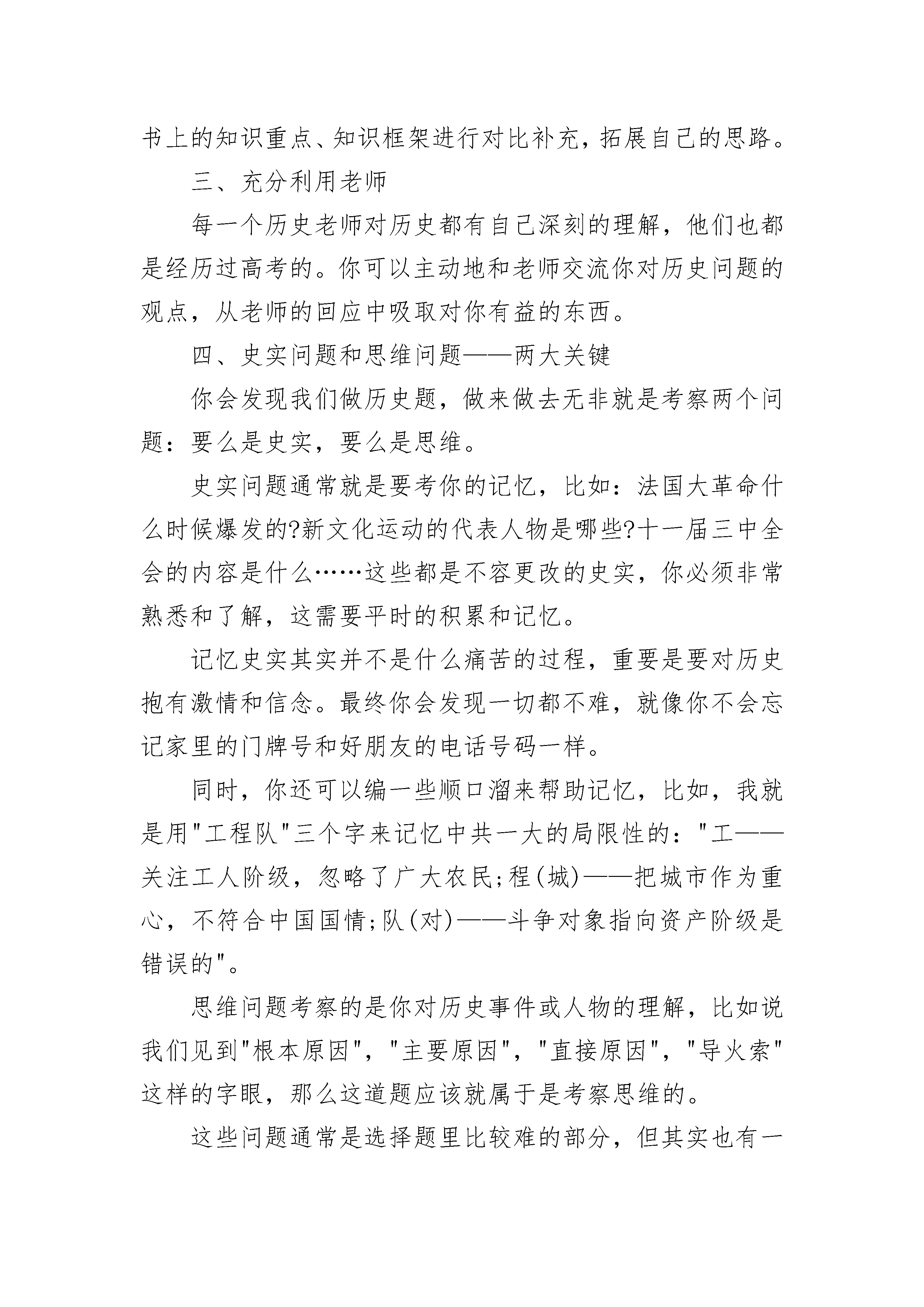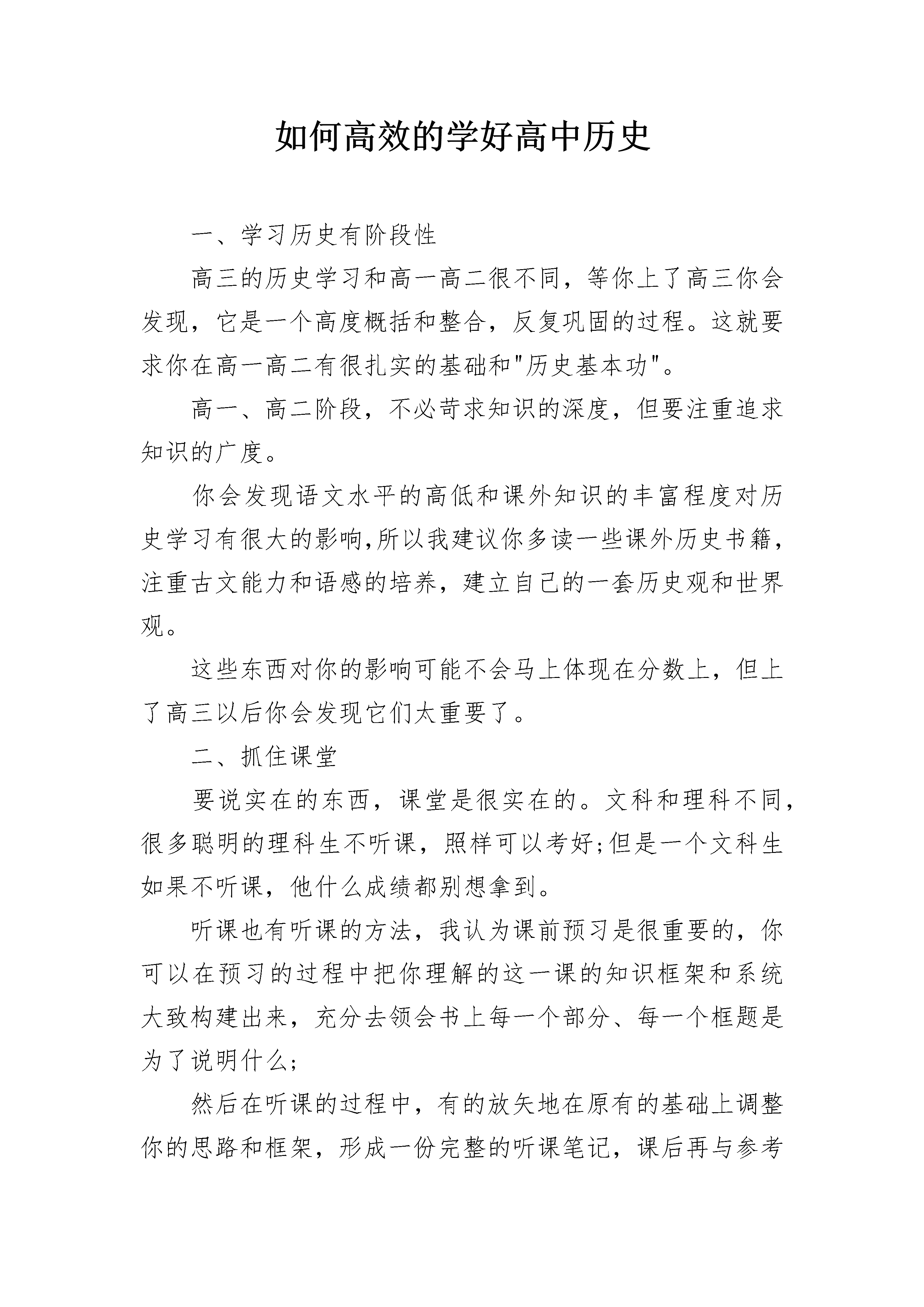 如何高效的学好高中历史一、学习历史有阶段性高三的历史学习和高一高二很不同,等你上了高三你会发现,它是一个高度概括和整合,反复巩固的过程。这就要求你在高一高二有很扎实的基础和"历史基本功"。高一、高二阶段,不必苛求知识的深度,但要注重追求知识的广度。你会发现语文水平的高低和课外知识的丰富程度对历史学习有很大的影响,所以我建议你多读一些课外历史书籍,注重古文能力和语感的培养,建立自己的一套历史观和世界观。这些东西对你的影响可能不会马上体现在分数上,但上了高三以后你会发现它们太重要了。二、抓住课堂要说实在的东西,课堂是很实在的。文科和理科不同,很多聪明的理科生不听课,照样可以考好;但是一个文科生如果不听课,他什么成绩都别想拿到。听课也有听课的方法,我认为课前预习是很重要的,你可以在预习的过程中把你理解的这一课的知识框架和系统大致构建出来,充分去领会书上每一个部分、每一个框题是为了说明什么;然后在听课的过程中,有的放矢地在原有的基础上调整你的思路和框架,形成一份完整的听课笔记,课后再与参考书上的知识重点、知识框架进行对比补充,拓展自己的思路。三、充分利用老师每一个历史老师对历史都有自己深刻的理解,他们也都是经历过高考的。你可以主动地和老师交流你对历史问题的观点,从老师的回应中吸取对你有益的东西。四、史实问题和思维问题——两大关键你会发现我们做历史题,做来做去无非就是考察两个问题:要么是史实,要么是思维。史实问题通常就是要考你的记忆,比如:法国大革命什么时候爆发的?新文化运动的代表人物是哪些?十一届三中全会的内容是什么……这些都是不容更改的史实,你必须非常熟悉和了解,这需要平时的积累和记忆。记忆史实其实并不是什么痛苦的过程,重要是要对历史抱有激情和信念。最终你会发现一切都不难,就像你不会忘记家里的门牌号和好朋友的电话号码一样。同时,你还可以编一些顺口溜来帮助记忆,比如,我就是用"工程队"三个字来记忆中共一大的局限性的:"工——关注工人阶级,忽略了广大农民;程(城)——把城市作为重心,不符合中国国情;队(对)——斗争对象指向资产阶级是错误的"。思维问题考察的是你对历史事件或人物的理解,比如说我们见到"根本原因","主要原因","直接原因","导火索"这样的字眼,那么这道题应该就属于是考察思维的。这些问题通常是选择题里比较难的部分,但其实也有一定的规律和方法。一般来说,"根本原因"通常是经济基础(生产力发展)或者本质矛盾(阶级矛盾尖锐);“根本原因”通常看起来和该历史事件的关系并不明显;"直接原因"通常是经过一步推理而不用深入分析就能直接得到的原因,和事件的关联性非常强;"导火索"通常都是一个偶然性很大的事件,不是出于社会和历史发展必然。比如"五四"的导火索是巴黎和会外交失败,英国资产阶级革命的导火索是国王召开议会企图征税等;"主要原因"是最难的”,有时它是直接原因,有时是根本原因,这就要求你深入探究事物的内部逻辑,通过对比来决定在历史发展过程中哪一个因素才是对事情起决定性作用的。思维的锻炼要靠大量做题和有效总结来实现,这一点也是积累的过程,上了高三老师也会经常给你一些提示,注意吸收,一定会有提高。五、掌握一套既定的分析处理问题的方法历史学习里面其实有很多约定俗成的东西,很多概念我都可以用"三条"或"两条"来总结,比如:了解一个事件我们通常是从"背景(原因),内容(经过),影响和意义(结果)"来记忆;分析问题我们总是有"政治,经济,文化"三个维度来思考;分析背景时我们会分"国内环境,国际环境"来进行;评价意义时我们有"正面(积极)和负面(消极)"两个方面。你在答大题时会轻松地发现这些既定的思路可以迅速帮助你理解题目和入手分析。至于这些既定的方法你可以自己在学习中很容易地提炼出来,或者我建议你可以看《高中历史学考必备手册》最后一部分谈到的一些学习历史的思维和方法,都非常实在和具体!六、宏观地学习历史,形成知识网络很多同学可能会觉得历史很烦琐,细节很多,有没有什么主线可以把它们串起来?当然有!你可以适当地进行发散思维,把历史事件串成完整的知识体系(不受课本的限制),比如说把一整个时代的政治、经济和文化整合在一起进行全面理解和思考,这样一来你会发现你的历史知识非常有条理,不光可以从宏观上解答很大的问题,也可以随便拿出一个部分进行微观细致的分析,这就达到了很高的境界,可以说"绝学无忧"了。比如说在我脑海里,整个历史是由中国史和外国史构成的,中国史里又分古代史、近代史和现代史,近代史分为旧民主主义革命时期和新民主主义革命时期;旧民主主义革命这一阶段整体由四次大型侵华战争(鸦片战争,二次鸦片战争,甲午战争,八国联军侵华)和三次中国人民的反抗(太平天国运动,义和团运动和辛亥革命)组成,期间经济方面的显著特点是自然经济开始阶梯,半殖民地半封建社会的经济