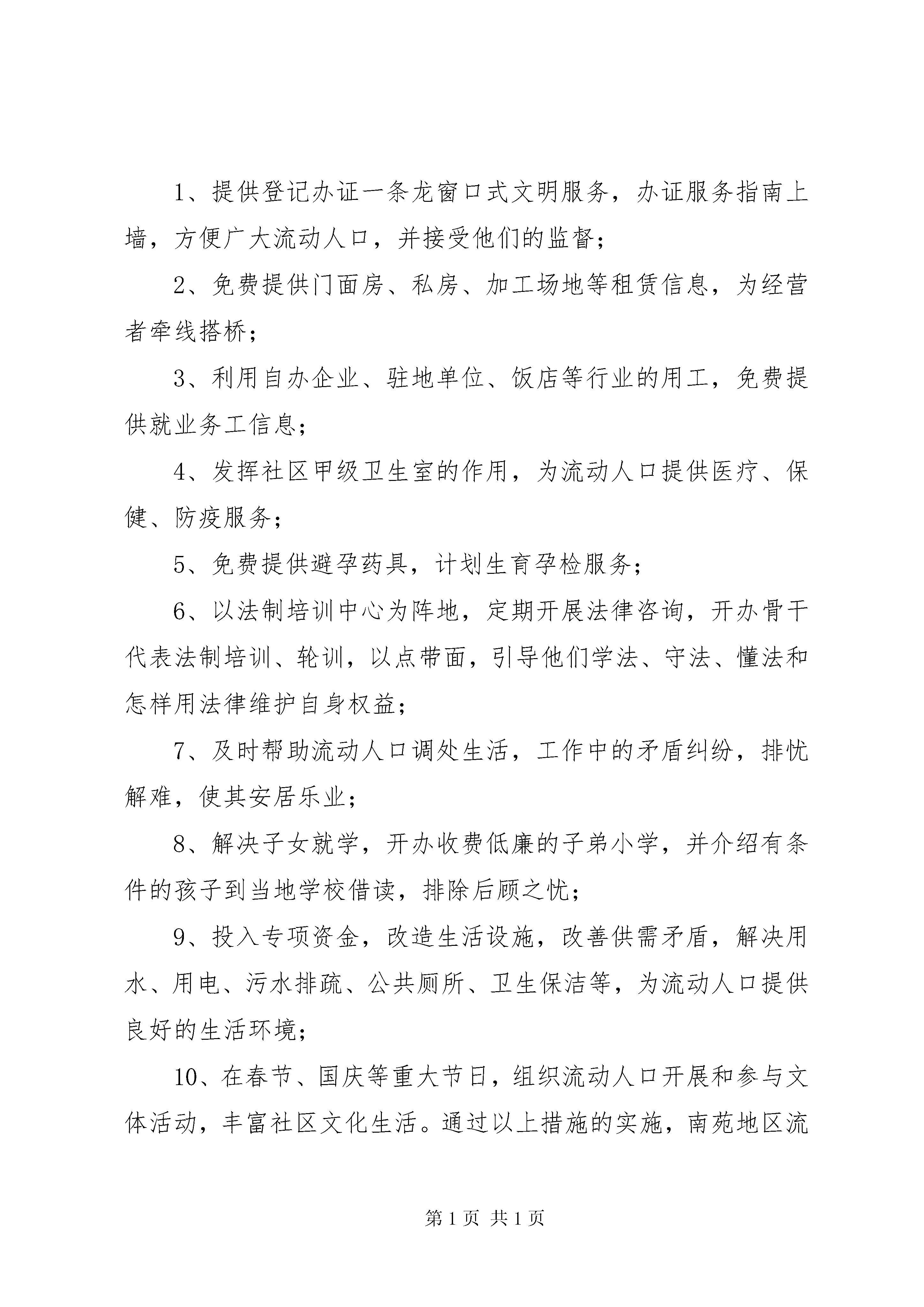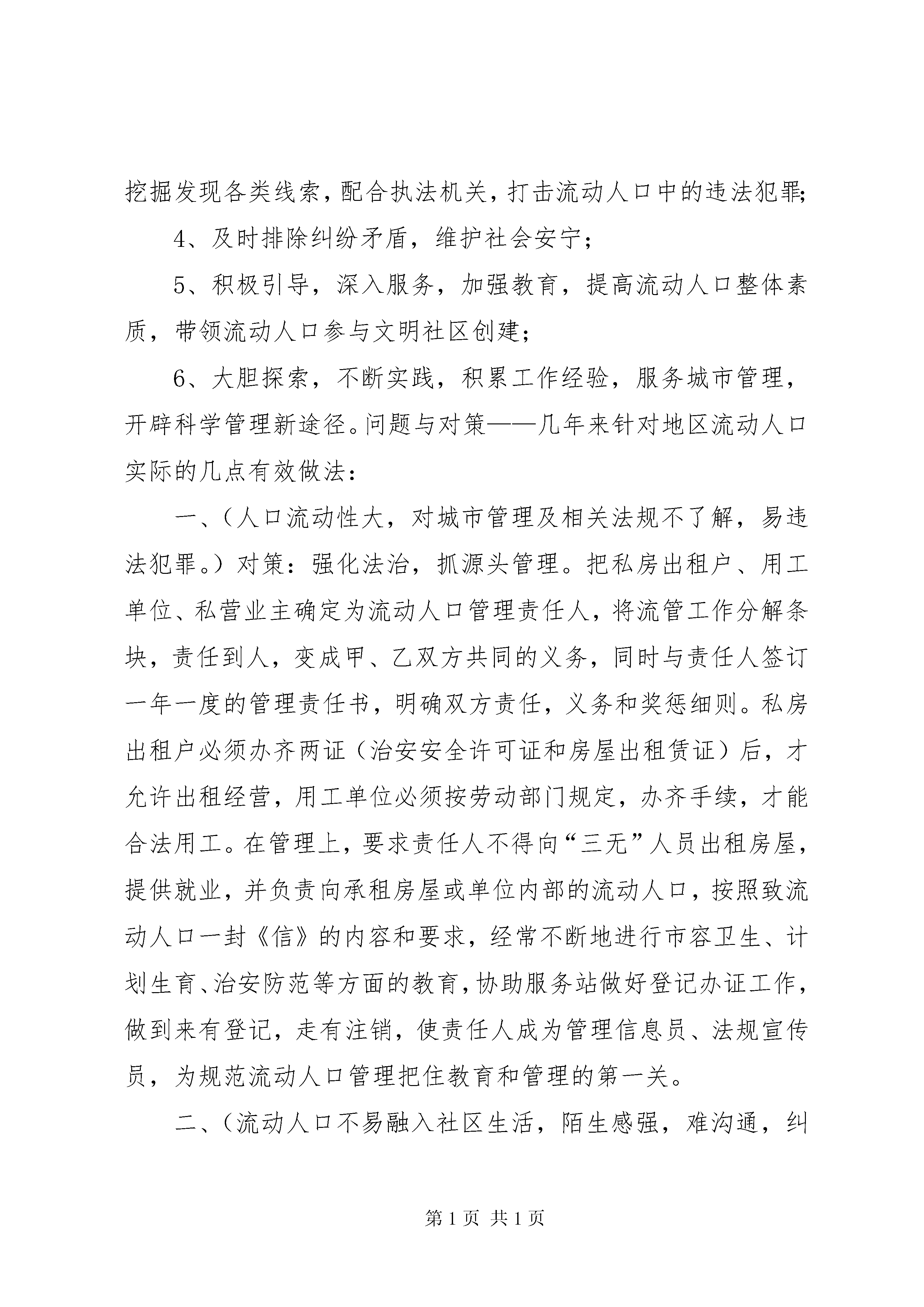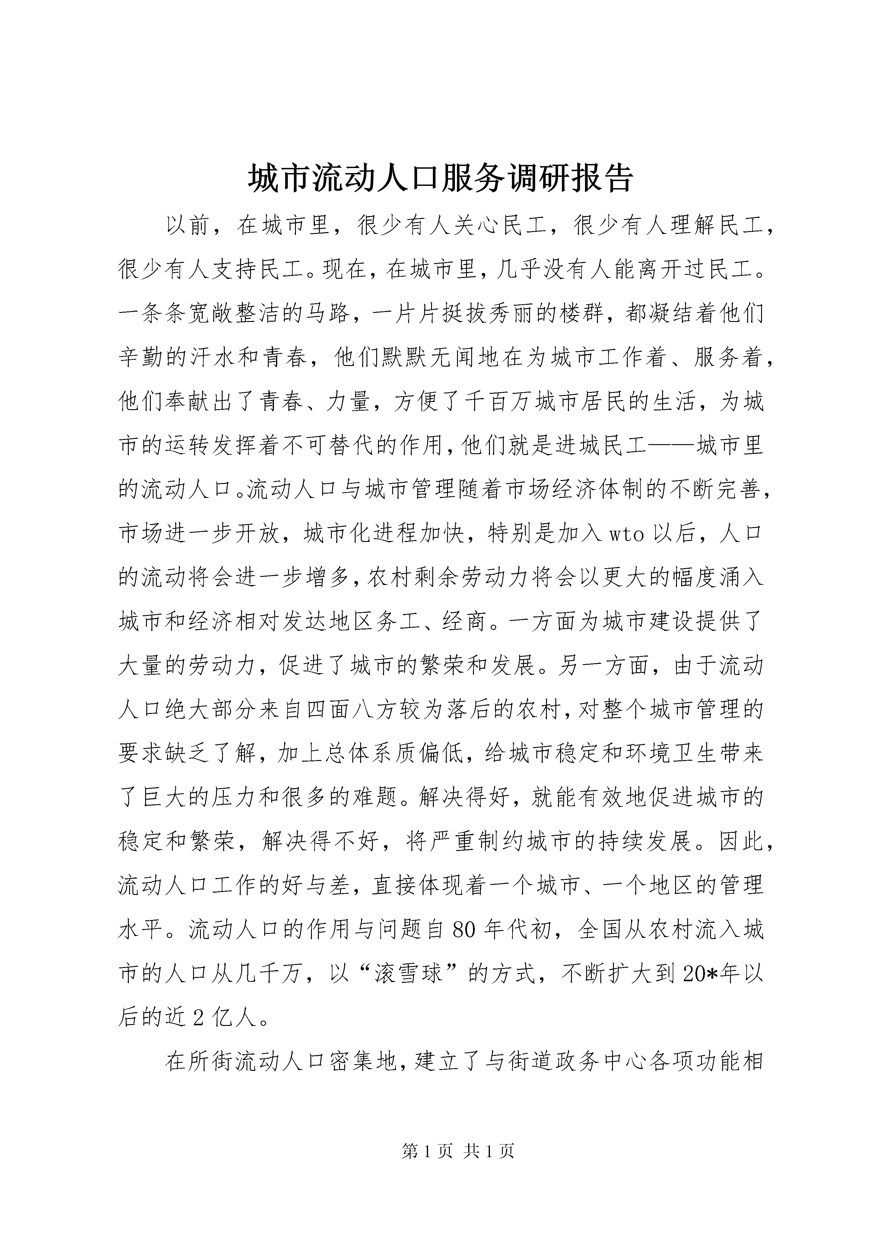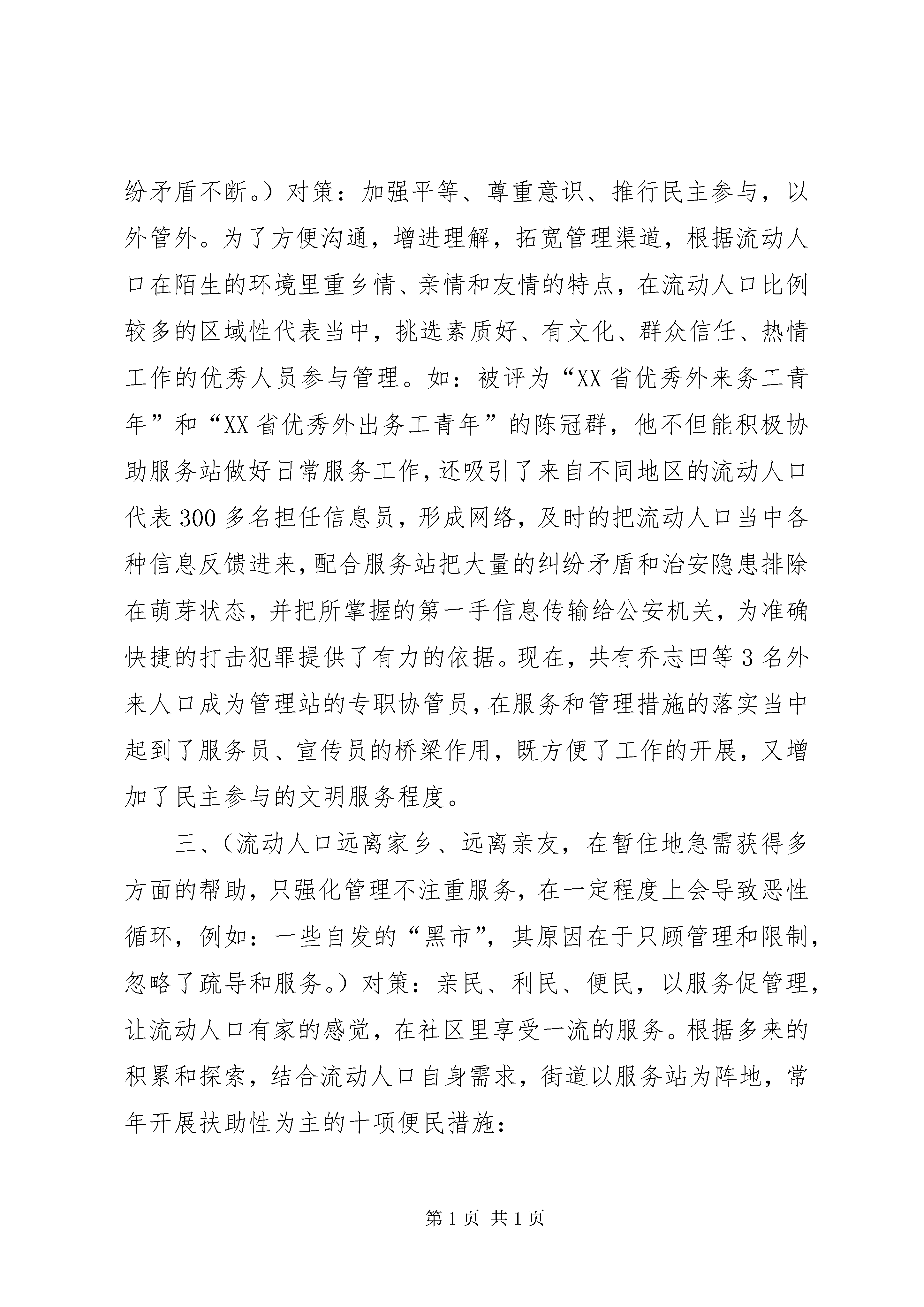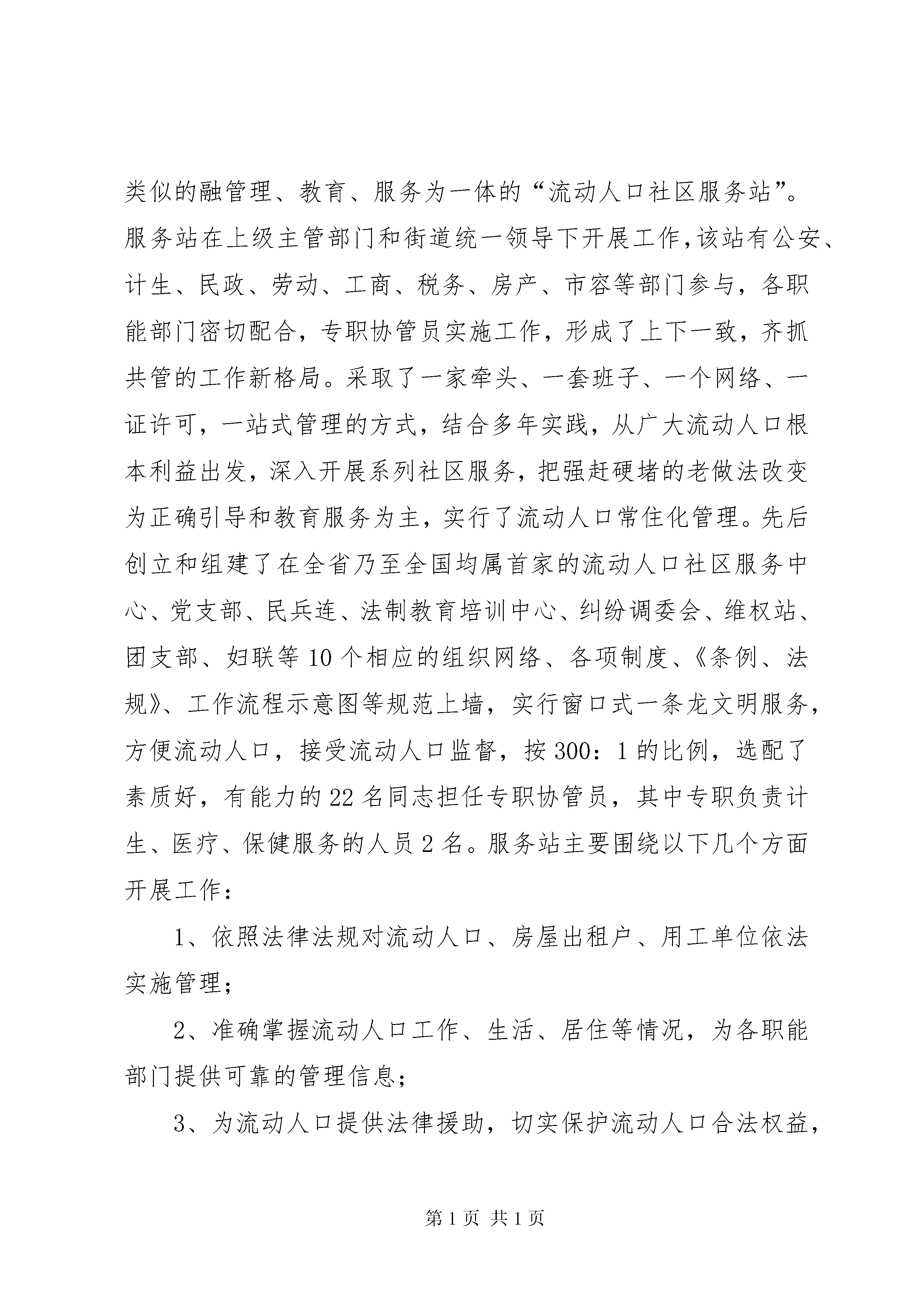 城市流动人口服务调研报告以前,在城市里,很少有人关心民工,很少有人理解民工,很少有人支持民工。现在,在城市里,几乎没有人能离开过民工。一条条宽敞整洁的马路,一片片挺拔秀丽的楼群,都凝结着他们辛勤的汗水和青春,他们默默无闻地在为城市工作着、服务着,他们奉献出了青春、力量,方便了千百万城市居民的生活,为城市的运转发挥着不可替代的作用,他们就是进城民工——城市里的流动人口。流动人口与城市管理随着市场经济体制的不断完善,市场进一步开放,城市化进程加快,特别是加入wto以后,人口的流动将会进一步增多,农村剩余劳动力将会以更大的幅度涌入城市和经济相对发达地区务工、经商。一方面为城市建设提供了大量的劳动力,促进了城市的繁荣和发展。另一方面,由于流动人口绝大部分来自四面八方较为落后的农村,对整个城市管理的要求缺乏了解,加上总体系质偏低,给城市稳定和环境卫生带来了巨大的压力和很多的难题。解决得好,就能有效地促进城市的稳定和繁荣,解决得不好,将严重制约城市的持续发展。因此,流动人口工作的好与差,直接体现着一个城市、一个地区的管理水平。流动人口的作用与问题自80年代初,全国从农村流入城市的人口从几千万,以“滚雪球”的方式,不断扩大到20*年以后的近2亿人。在所街流动人口密集地,建立了与街道政务中心各项功能相类似的融管理、教育、服务为一体的“流动人口社区服务站”。服务站在上级主管部门和街道统一领导下开展工作,该站有公安、计生、民政、劳动、工商、税务、房产、市容等部门参与,各职能部门密切配合,专职协管员实施工作,形成了上下一致,齐抓共管的工作新格局。采取了一家牵头、一套班子、一个网络、一证许可,一站式管理的方式,结合多年实践,从广大流动人口根本利益出发,深入开展系列社区服务,把强赶硬堵的老做法改变为正确引导和教育服务为主,实行了流动人口常住化管理。先后创立和组建了在全省乃至全国均属首家的流动人口社区服务中心、党支部、民兵连、法制教育培训中心、纠纷调委会、维权站、团支部、妇联等10个相应的组织网络、各项制度、《条例、法规》、工作流程示意图等规范上墙,实行窗口式一条龙文明服务,方便流动人口,接受流动人口监督,按300:1的比例,选配了素质好,有能力的22名同志担任专职协管员,其中专职负责计生、医疗、保健服务的人员2名。服务站主要围绕以下几个方面开展工作:1、依照法律法规对流动人口、房屋出租户、用工单位依法实施管理;2、准确掌握流动人口工作、生活、居住等情况,为各职能部门提供可靠的管理信息;3、为流动人口提供法律援助,切实保护流动人口合法权益,挖掘发现各类线索,配合执法机关,打击流动人口中的违法犯罪;4、及时排除纠纷矛盾,维护社会安宁;5、积极引导,深入服务,加强教育,提高流动人口整体素质,带领流动人口参与文明社区创建;6、大胆探索,不断实践,积累工作经验,服务城市管理,开辟科学管理新途径。问题与对策——几年来针对地区流动人口实际的几点有效做法:一、(人口流动性大,对城市管理及相关法规不了解,易违法犯罪。)对策:强化法治,抓源头管理。把私房出租户、用工单位、私营业主确定为流动人口管理责任人,将流管工作分解条块,责任到人,变成甲、乙双方共同的义务,同时与责任人签订一年一度的管理责任书,明确双方责任,义务和奖惩细则。私房出租户必须办齐两证(治安安全许可证和房屋出租赁证)后,才允许出租经营,用工单位必须按劳动部门规定,办齐手续,才能合法用工。在管理上,要求责任人不得向“三无”人员出租房屋,提供就业,并负责向承租房屋或单位内部的流动人口,按照致流动人口一封《信》的内容和要求,经常不断地进行市容卫生、计划生育、治安防范等方面的教育,协助服务站做好登记办证工作,做到来有登记,走有注销,使责任人成为管理信息员、法规宣传员,为规范流动人口管理把住教育和管理的第一关。二、(流动人口不易融入社区生活,陌生感强,难沟通,纠纷矛盾不断。)对策:加强平等、尊重意识、推行民主参与,以外管外。为了方便沟通,增进理解,拓宽管理渠道,根据流动人口在陌生的环境里重乡情、亲情和友情的特点,在流动人口比例较多的区域性代表当中,挑选素质好、有文化、群众信任、热情工作的优秀人员参与管理。如:被评为“XX省优秀外来务工青年”和“XX省优秀外出务工青年”的陈冠群,他不但能积极协助服务站做好日常服务工作,还吸引了来自不同地区的流动人口代表300多名担任信息员,形成网络,及时的把流动人口当中各种信息反馈进来,配合服务站把大量的纠纷矛盾和治安隐患排除在萌芽状态,并把所掌握的第一手信息传输给公安机关,为准确快捷的打击犯罪提供了有力的依据。现在,共有乔志田等3名外来人口成为管理站的专职协管员,在服务和管理措施的落实当中起到了服务员、宣传员的桥梁作用,既方便了工作的开展,又增加了民主参与的文