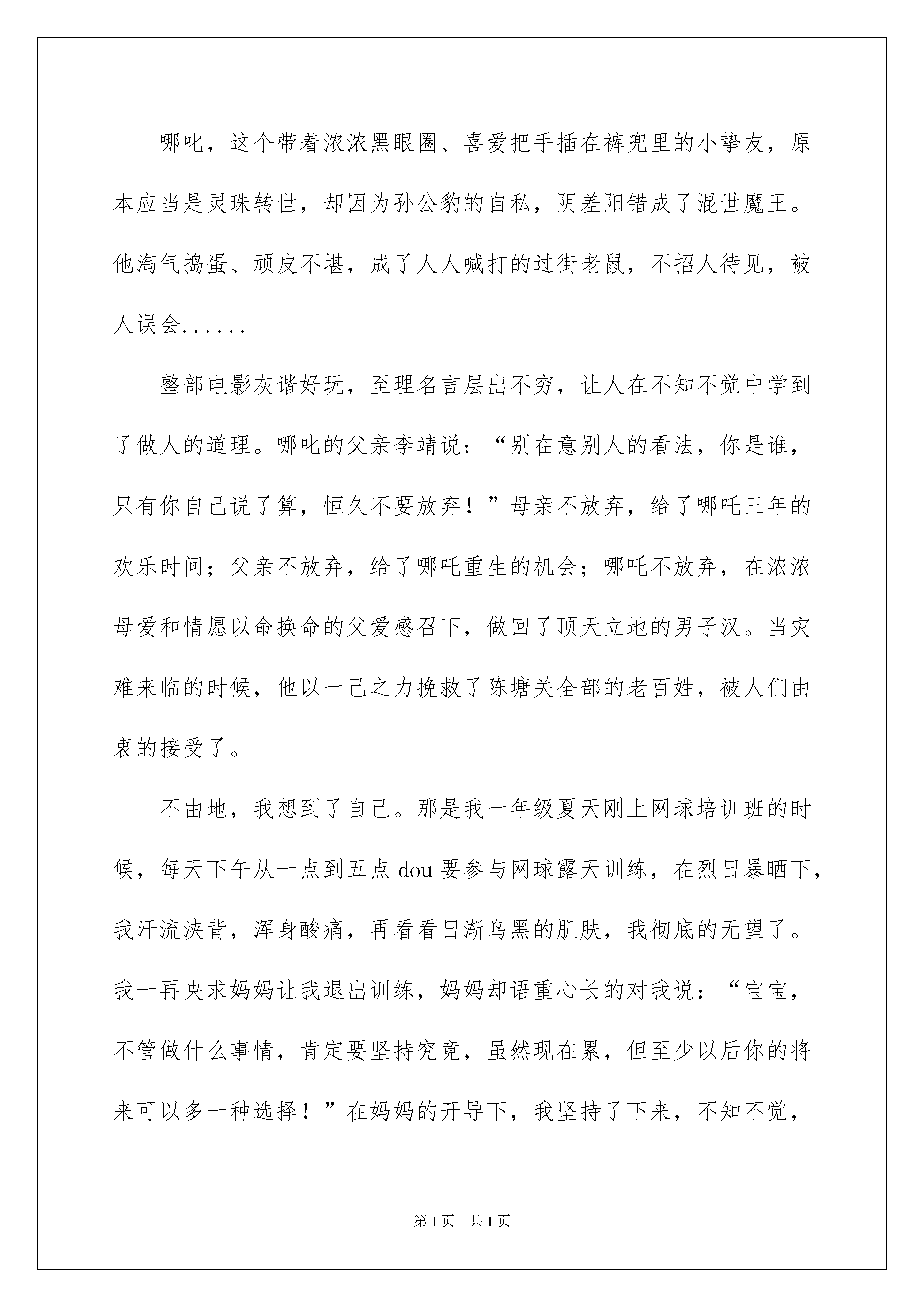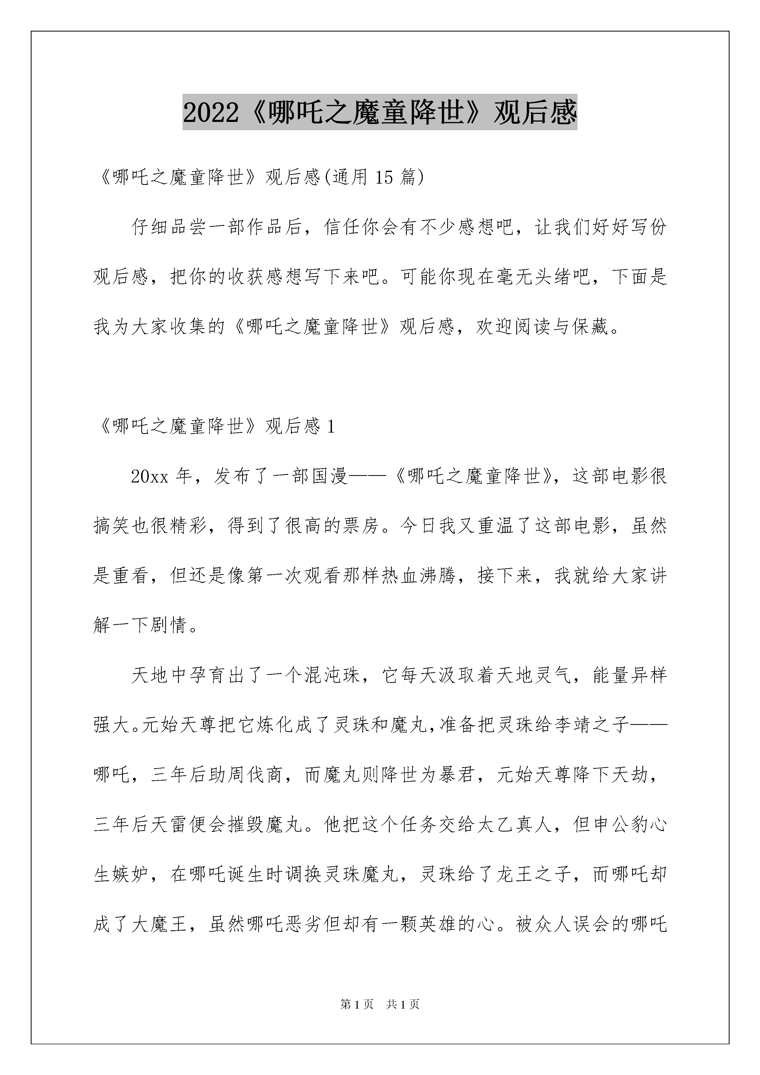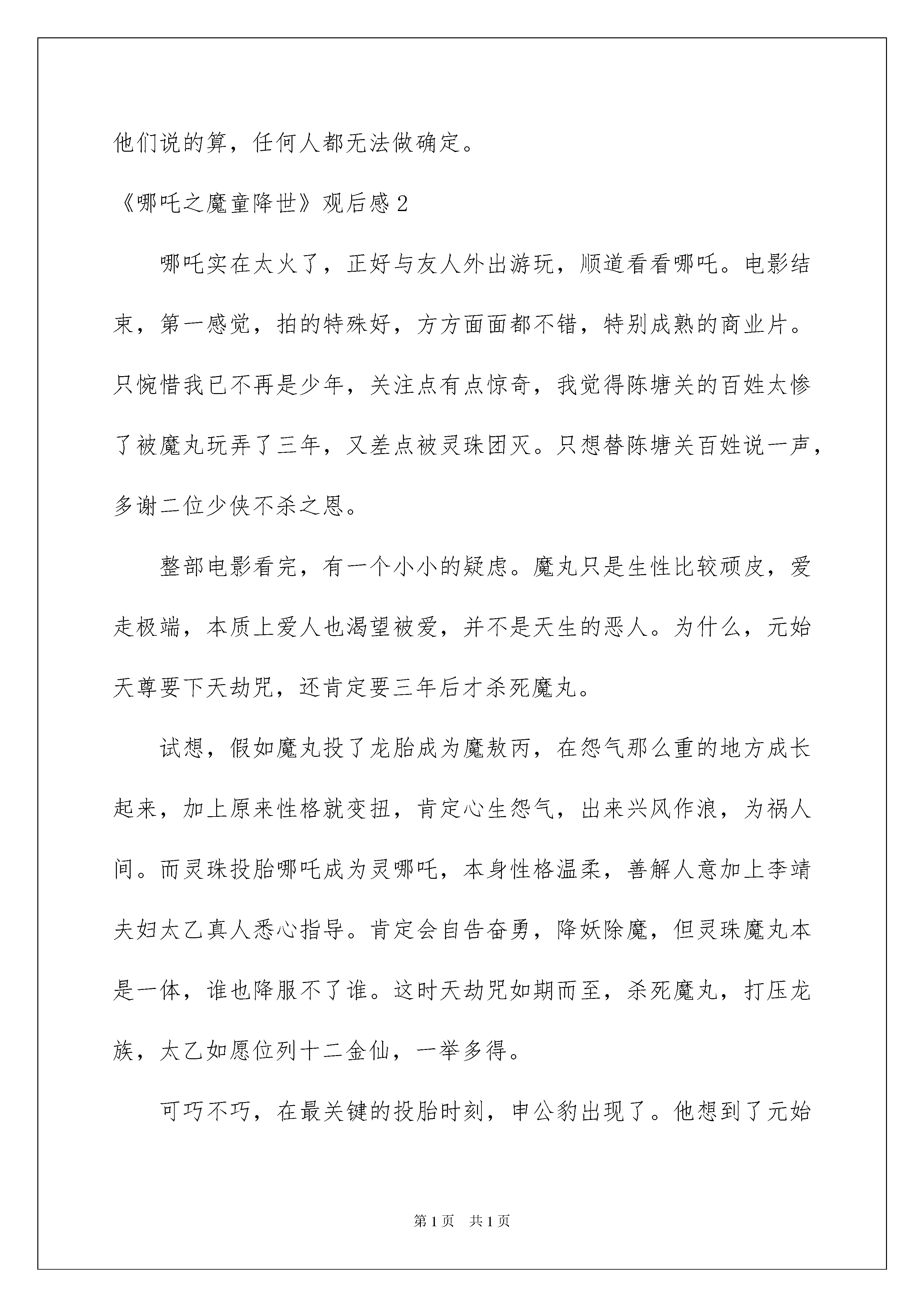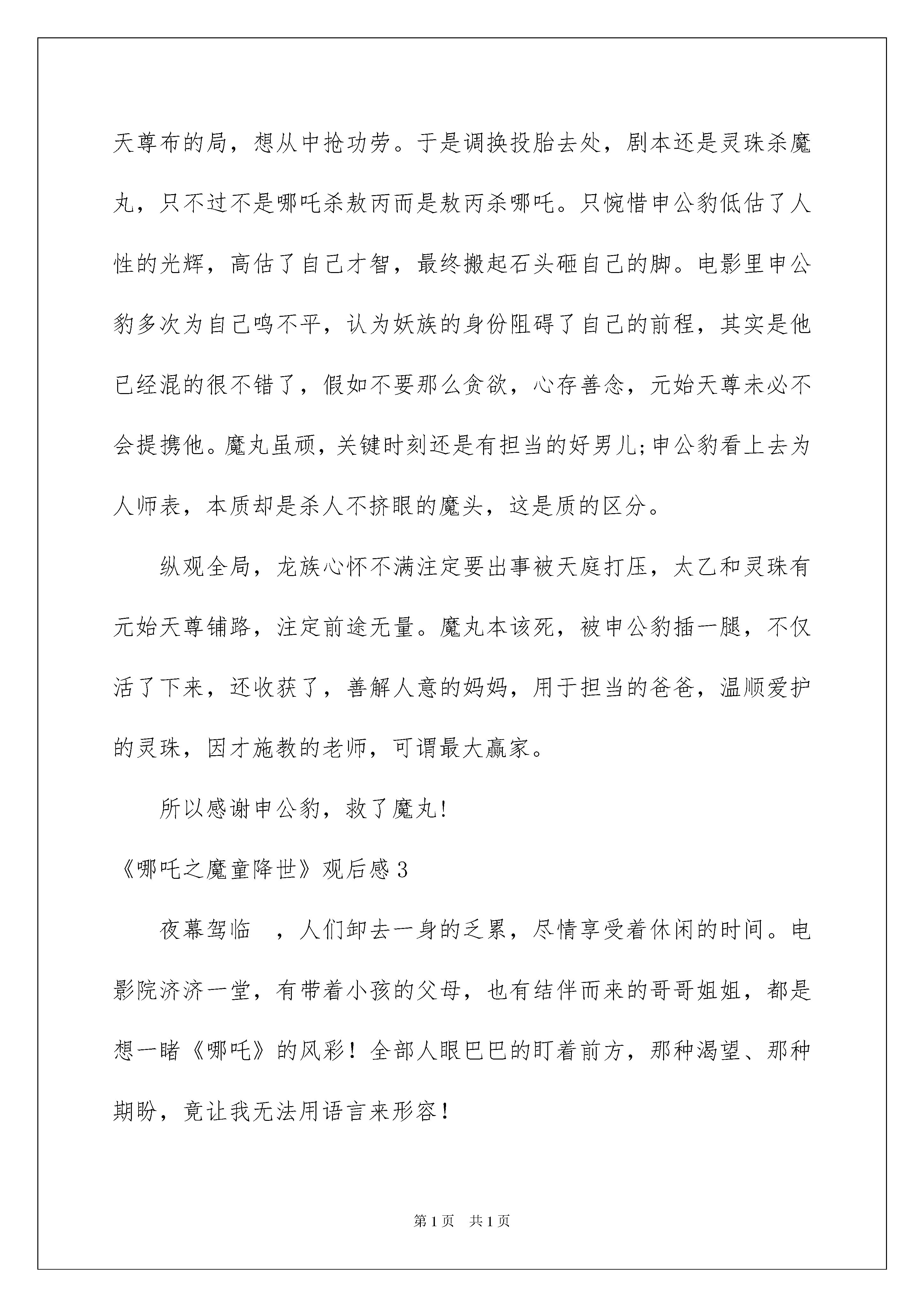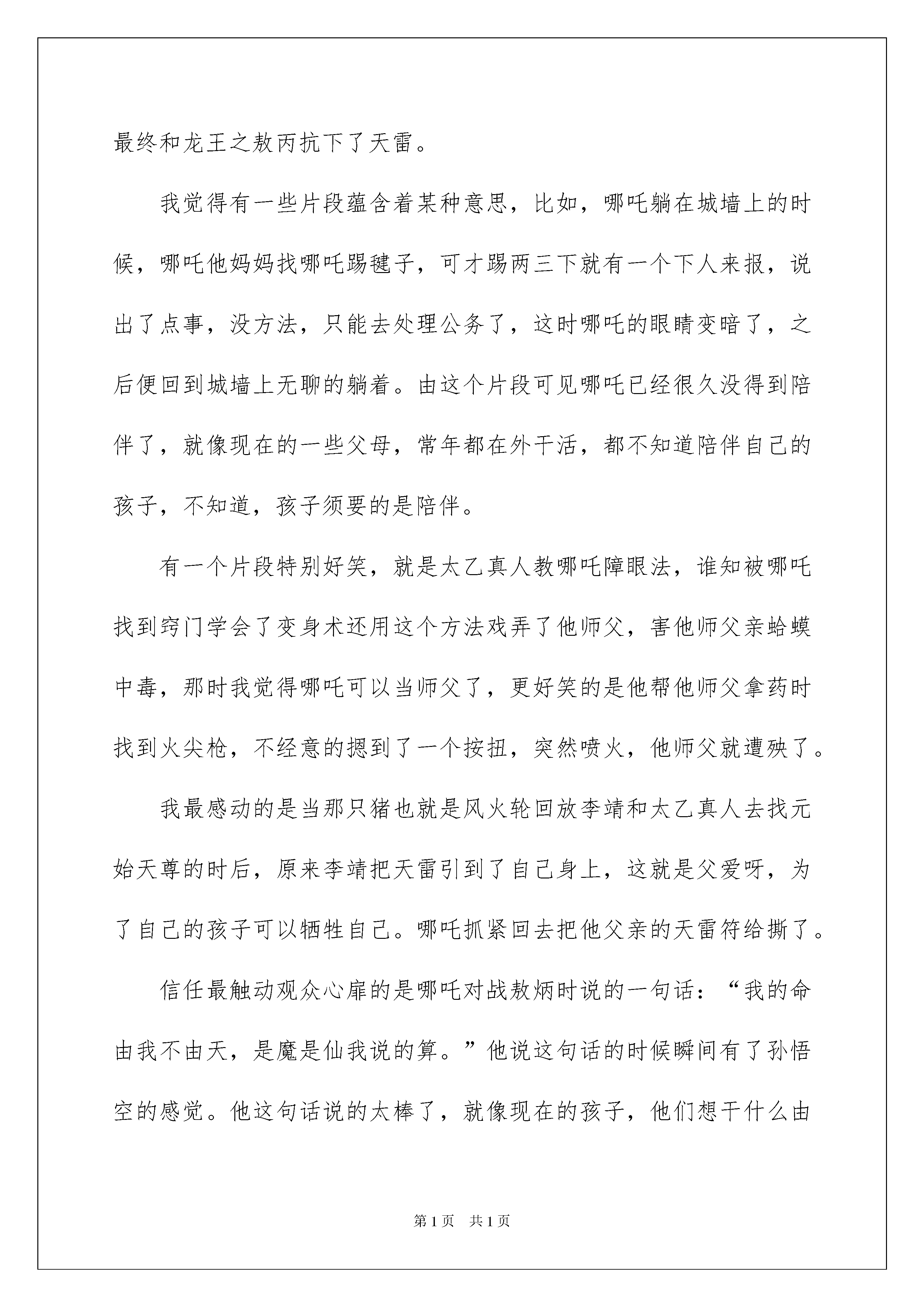 2022《哪吒之魔童降世》观后感《哪吒之魔童降世》观后感(通用15篇)仔细品尝一部作品后,信任你会有不少感想吧,让我们好好写份观后感,把你的收获感想写下来吧。可能你现在毫无头绪吧,下面是我为大家收集的《哪吒之魔童降世》观后感,欢迎阅读与保藏。《哪吒之魔童降世》观后感120xx年,发布了一部国漫——《哪吒之魔童降世》,这部电影很搞笑也很精彩,得到了很高的票房。今日我又重温了这部电影,虽然是重看,但还是像第一次观看那样热血沸腾,接下来,我就给大家讲解一下剧情。天地中孕育出了一个混沌珠,它每天汲取着天地灵气,能量异样强大。元始天尊把它炼化成了灵珠和魔丸,准备把灵珠给李靖之子——哪吒,三年后助周伐商,而魔丸则降世为暴君,元始天尊降下天劫,三年后天雷便会摧毁魔丸。他把这个任务交给太乙真人,但申公豹心生嫉妒,在哪吒诞生时调换灵珠魔丸,灵珠给了龙王之子,而哪吒却成了大魔王,虽然哪吒恶劣但却有一颗英雄的心。被众人误会的哪吒最终和龙王之敖丙抗下了天雷。我觉得有一些片段蕴含着某种意思,比如,哪吒躺在城墙上的时候,哪吒他妈妈找哪吒踢毽子,可才踢两三下就有一个下人来报,说出了点事,没方法,只能去处理公务了,这时哪吒的眼睛变暗了,之后便回到城墙上无聊的躺着。由这个片段可见哪吒已经很久没得到陪伴了,就像现在的一些父母,常年都在外干活,都不知道陪伴自己的孩子,不知道,孩子须要的是陪伴。有一个片段特别好笑,就是太乙真人教哪吒障眼法,谁知被哪吒找到窍门学会了变身术还用这个方法戏弄了他师父,害他师父亲蛤蟆中毒,那时我觉得哪吒可以当师父了,更好笑的是他帮他师父拿药时找到火尖枪,不经意的摁到了一个按扭,突然喷火,他师父就遭殃了。我最感动的是当那只猪也就是风火轮回放李靖和太乙真人去找元始天尊的时后,原来李靖把天雷引到了自己身上,这就是父爱呀,为了自己的孩子可以牺牲自己。哪吒抓紧回去把他父亲的天雷符给撕了。信任最触动观众心扉的是哪吒对战敖炳时说的一句话:“我的命由我不由天,是魔是仙我说的算。”他说这句话的时候瞬间有了孙悟空的感觉。他这句话说的太棒了,就像现在的孩子,他们想干什么由他们说的算,任何人都无法做确定。《哪吒之魔童降世》观后感2哪吒实在太火了,正好与友人外出游玩,顺道看看哪吒。电影结束,第一感觉,拍的特殊好,方方面面都不错,特别成熟的商业片。只惋惜我已不再是少年,关注点有点惊奇,我觉得陈塘关的百姓太惨了被魔丸玩弄了三年,又差点被灵珠团灭。只想替陈塘关百姓说一声,多谢二位少侠不杀之恩。整部电影看完,有一个小小的疑虑。魔丸只是生性比较顽皮,爱走极端,本质上爱人也渴望被爱,并不是天生的恶人。为什么,元始天尊要下天劫咒,还肯定要三年后才杀死魔丸。试想,假如魔丸投了龙胎成为魔敖丙,在怨气那么重的地方成长起来,加上原来性格就变扭,肯定心生怨气,出来兴风作浪,为祸人间。而灵珠投胎哪吒成为灵哪吒,本身性格温柔,善解人意加上李靖夫妇太乙真人悉心指导。肯定会自告奋勇,降妖除魔,但灵珠魔丸本是一体,谁也降服不了谁。这时天劫咒如期而至,杀死魔丸,打压龙族,太乙如愿位列十二金仙,一举多得。可巧不巧,在最关键的投胎时刻,申公豹出现了。他想到了元始天尊布的局,想从中抢功劳。于是调换投胎去处,剧本还是灵珠杀魔丸,只不过不是哪吒杀敖丙而是敖丙杀哪吒。只惋惜申公豹低估了人性的光辉,高估了自己才智,最终搬起石头砸自己的脚。电影里申公豹多次为自己鸣不平,认为妖族的身份阻碍了自己的前程,其实是他已经混的很不错了,假如不要那么贪欲,心存善念,元始天尊未必不会提携他。魔丸虽顽,关键时刻还是有担当的好男儿;申公豹看上去为人师表,本质却是杀人不挤眼的魔头,这是质的区分。纵观全局,龙族心怀不满注定要出事被天庭打压,太乙和灵珠有元始天尊铺路,注定前途无量。魔丸本该死,被申公豹插一腿,不仅活了下来,还收获了,善解人意的妈妈,用于担当的爸爸,温顺爱护的灵珠,因才施教的老师,可谓最大赢家。所以感谢申公豹,救了魔丸!《哪吒之魔童降世》观后感3夜幕驾临,人们卸去一身的乏累,尽情享受着休闲的时间。电影院济济一堂,有带着小孩的父母,也有结伴而来的哥哥姐姐,都是想一睹《哪吒》的风彩!全部人眼巴巴的盯着前方,那种渴望、那种期盼,竟让我无法用语言来形容!哪叱,这个带着浓浓黑眼圈、喜爱把手插在裤兜里的小挚友,原本应当是灵珠转世,却因为孙公豹的自私,阴差阳错成了混世魔王。他淘气捣蛋、顽皮不堪,成了人人喊打的过街老鼠,不招人待见,被人误会......整部电影灰谐好玩,至理名言层出不穷,让人在不知不觉中学到了做人的道理。哪叱的父亲李靖说:“别在意别人的看法,你是谁,只有你自己说了算,恒久