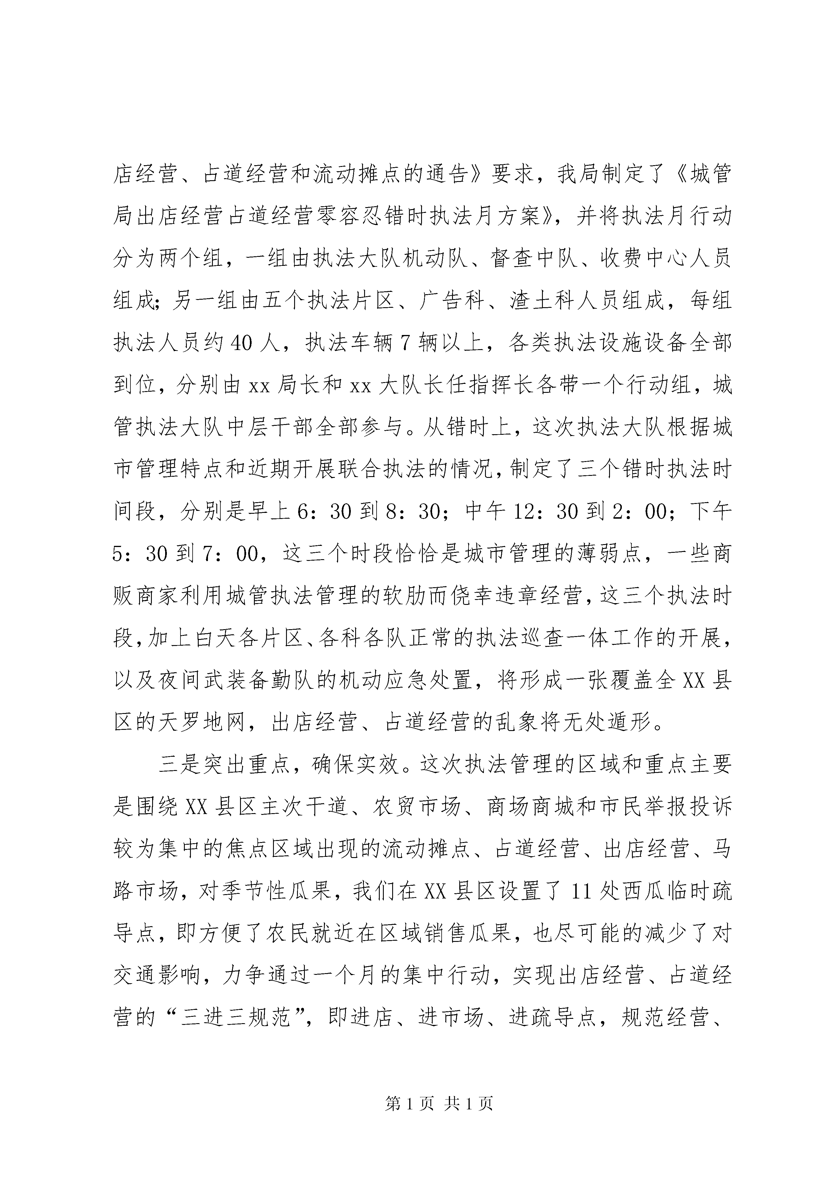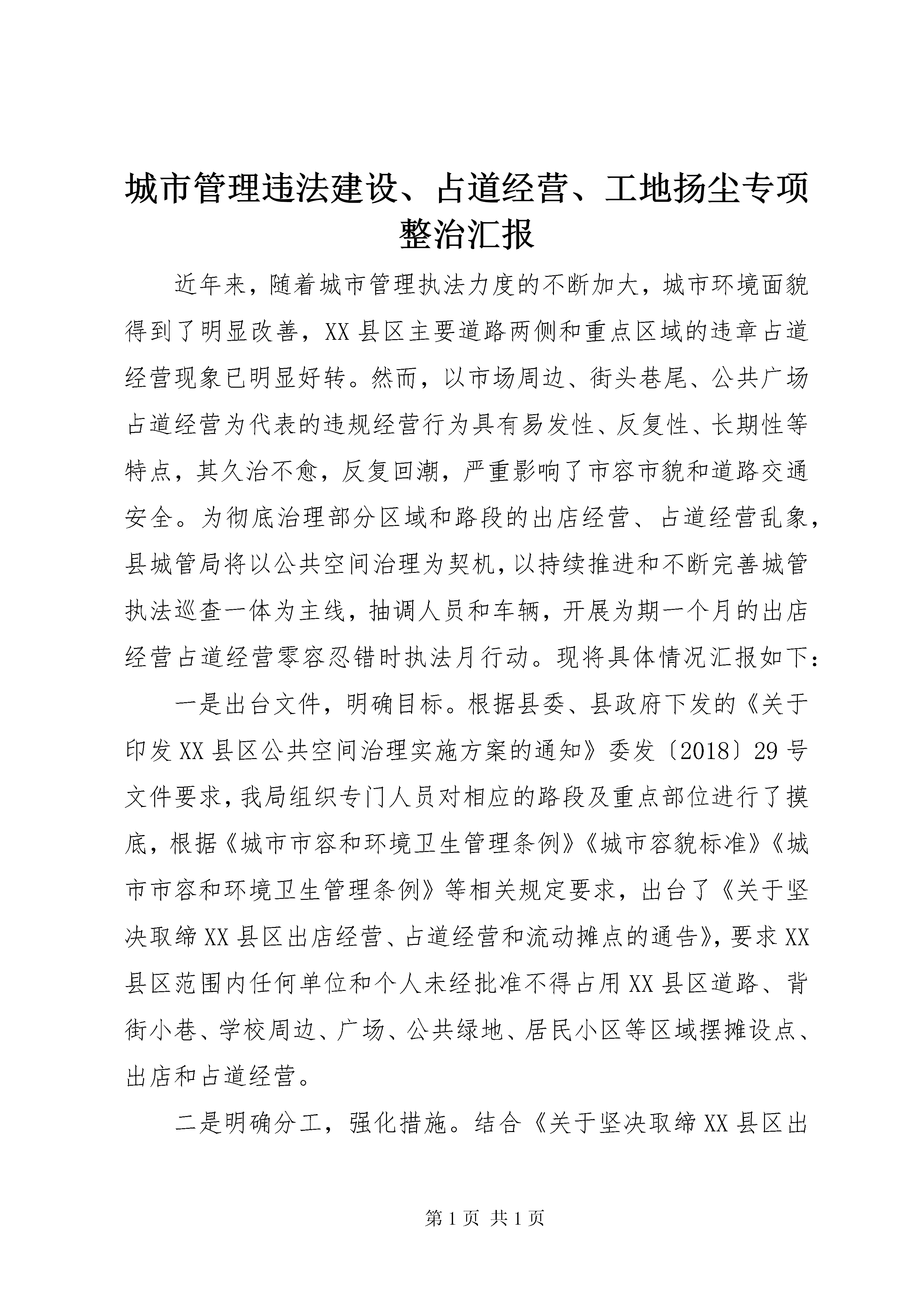 城市管理违法建设、占道经营、工地扬尘专项整治汇报近年来,随着城市管理执法力度的不断加大,城市环境面貌得到了明显改善,XX县区主要道路两侧和重点区域的违章占道经营现象已明显好转。然而,以市场周边、街头巷尾、公共广场占道经营为代表的违规经营行为具有易发性、反复性、长期性等特点,其久治不愈,反复回潮,严重影响了市容市貌和道路交通安全。为彻底治理部分区域和路段的出店经营、占道经营乱象,县城管局将以公共空间治理为契机,以持续推进和不断完善城管执法巡查一体为主线,抽调人员和车辆,开展为期一个月的出店经营占道经营零容忍错时执法月行动。现将具体情况汇报如下:一是出台文件,明确目标。根据县委、县政府下发的《关于印发XX县区公共空间治理实施方案的通知》委发〔2018〕29号文件要求,我局组织专门人员对相应的路段及重点部位进行了摸底,根据《城市市容和环境卫生管理条例》《城市容貌标准》《城市市容和环境卫生管理条例》等相关规定要求,出台了《关于坚决取缔XX县区出店经营、占道经营和流动摊点的通告》,要求XX县区范围内任何单位和个人未经批准不得占用XX县区道路、背街小巷、学校周边、广场、公共绿地、居民小区等区域摆摊设点、出店和占道经营。二是明确分工,强化措施。结合《关于坚决取缔XX县区出店经营、占道经营和流动摊点的通告》要求,我局制定了《城管局出店经营占道经营零容忍错时执法月方案》,并将执法月行动分为两个组,一组由执法大队机动队、督查中队、收费中心人员组成;另一组由五个执法片区、广告科、渣土科人员组成,每组执法人员约40人,执法车辆7辆以上,各类执法设施设备全部到位,分别由xx局长和xx大队长任指挥长各带一个行动组,城管执法大队中层干部全部参与。从错时上,这次执法大队根据城市管理特点和近期开展联合执法的情况,制定了三个错时执法时间段,分别是早上6:30到8:30;中午12:30到2:00;下午5:30到7:00,这三个时段恰恰是城市管理的薄弱点,一些商贩商家利用城管执法管理的软肋而侥幸违章经营,这三个执法时段,加上白天各片区、各科各队正常的执法巡查一体工作的开展,以及夜间武装备勤队的机动应急处置,将形成一张覆盖全XX县区的天罗地网,出店经营、占道经营的乱象将无处遁形。三是突出重点,确保实效。这次执法管理的区域和重点主要是围绕XX县区主次干道、农贸市场、商场商城和市民举报投诉较为集中的焦点区域出现的流动摊点、占道经营、出店经营、马路市场,对季节性瓜果,我们在XX县区设置了11处西瓜临时疏导点,即方便了农民就近在区域销售瓜果,也尽可能的减少了对交通影响,力争通过一个月的集中行动,实现出店经营、占道经营的“三进三规范”,即进店、进市场、进疏导点,规范经营、规范秩序、规范管理,让占道经营城市乱象将得到彻彻底底地改观,同时,我局也将非机动车辆整治和城市“六乱”现象列入此次行动规范中,确保全力打造“精致、细腻、整洁、有序”宜居环境,进一步实现城市管理精细化。