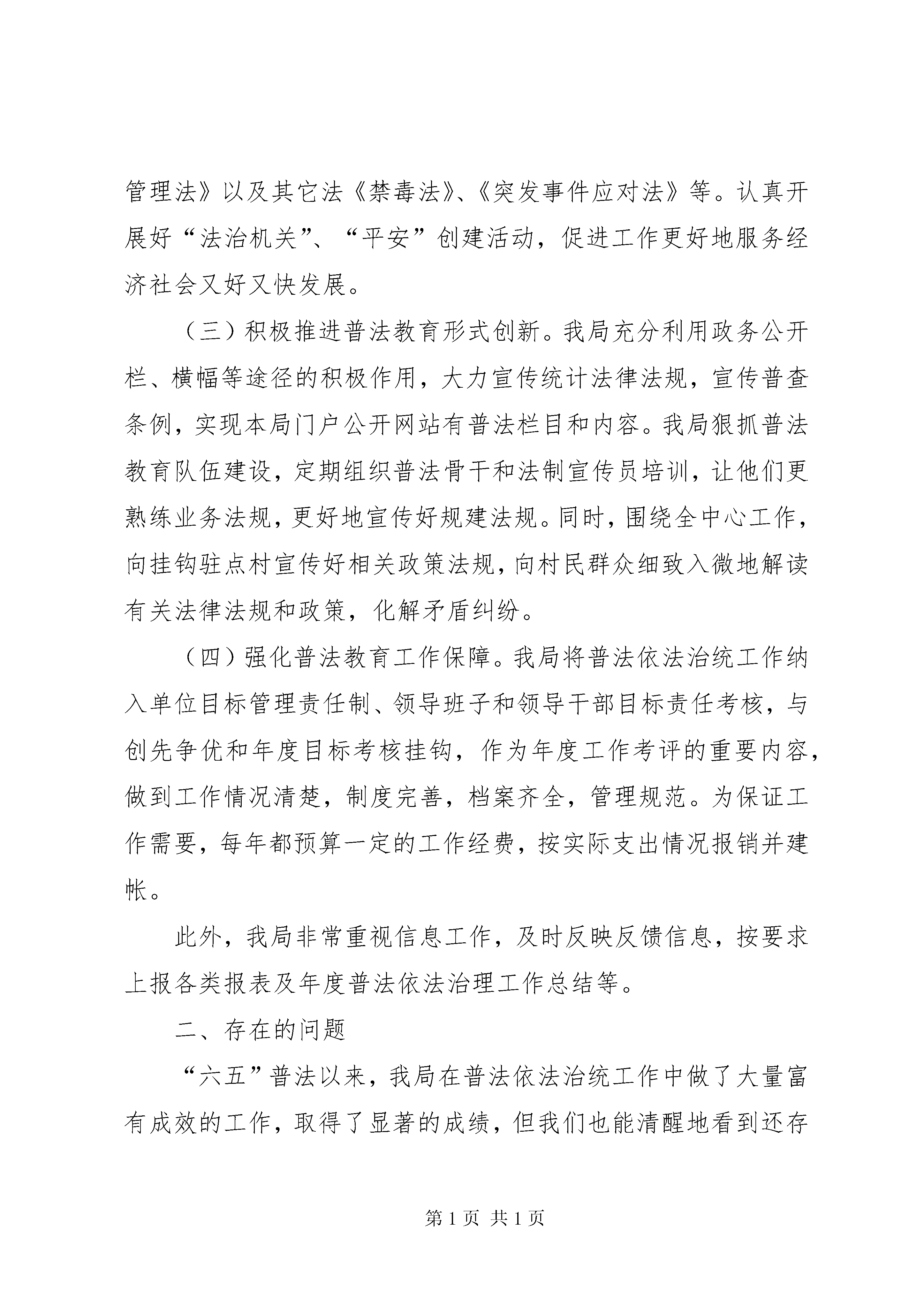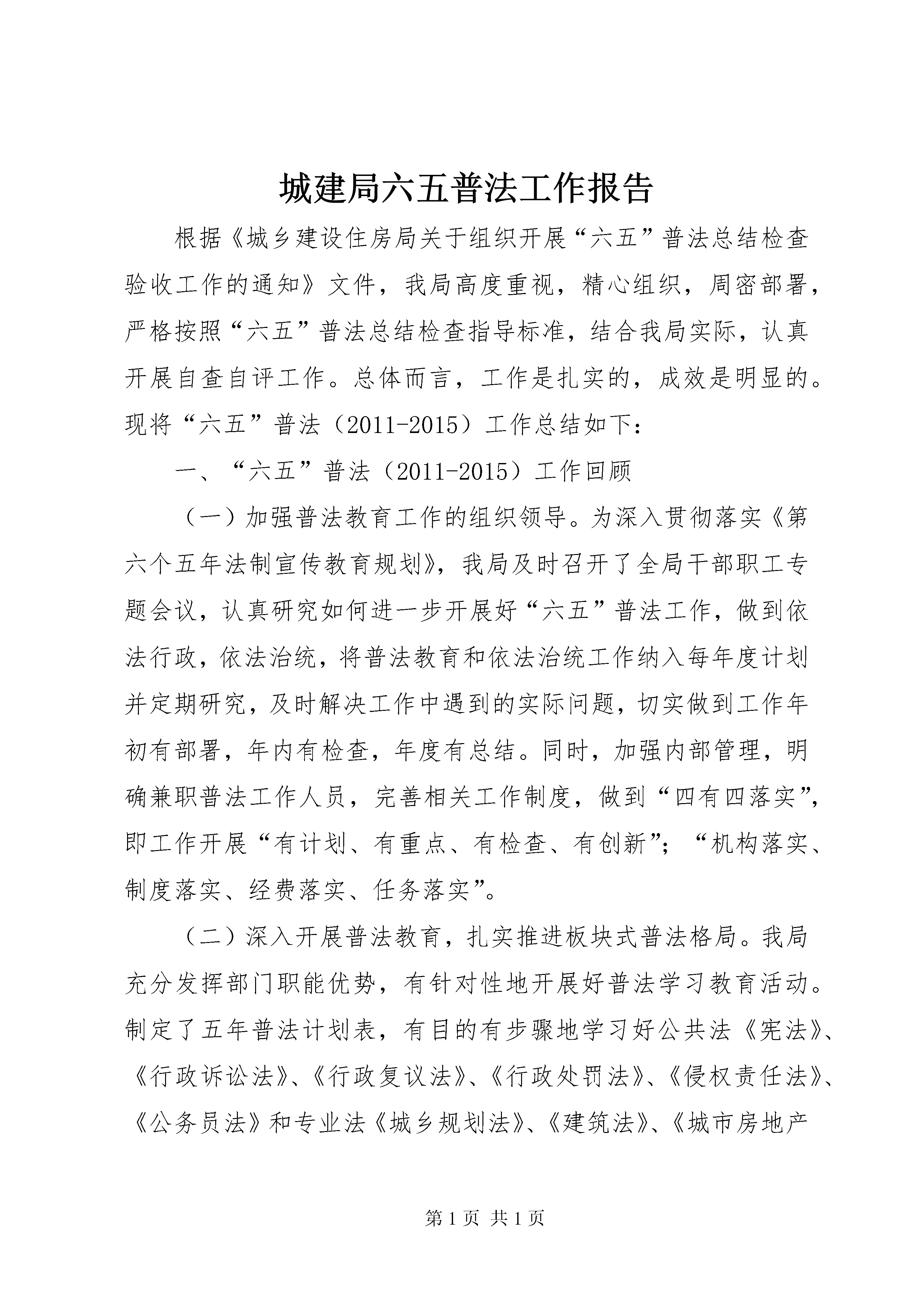城建局六五普法工作报告根据《城乡建设住房局关于组织开展“六五”普法总结检查验收工作的通知》文件,我局高度重视,精心组织,周密部署,严格按照“六五”普法总结检查指导标准,结合我局实际,认真开展自查自评工作。总体而言,工作是扎实的,成效是明显的。现将“六五”普法(2011-2015)工作总结如下:一、“六五”普法(2011-2015)工作回顾(一)加强普法教育工作的组织领导。为深入贯彻落实《第六个五年法制宣传教育规划》,我局及时召开了全局干部职工专题会议,认真研究如何进一步开展好“六五”普法工作,做到依法行政,依法治统,将普法教育和依法治统工作纳入每年度计划并定期研究,及时解决工作中遇到的实际问题,切实做到工作年初有部署,年内有检查,年度有总结。同时,加强内部管理,明确兼职普法工作人员,完善相关工作制度,做到“四有四落实”,即工作开展“有计划、有重点、有检查、有创新”;“机构落实、制度落实、经费落实、任务落实”。(二)深入开展普法教育,扎实推进板块式普法格局。我局充分发挥部门职能优势,有针对性地开展好普法学习教育活动。制定了五年普法计划表,有目的有步骤地学习好公共法《宪法》、《行政诉讼法》、《行政复议法》、《行政处罚法》、《侵权责任法》、《公务员法》和专业法《城乡规划法》、《建筑法》、《城市房地产管理法》以及其它法《禁毒法》、《突发事件应对法》等。认真开展好“法治机关”、“平安”创建活动,促进工作更好地服务经济社会又好又快发展。(三)积极推进普法教育形式创新。我局充分利用政务公开栏、横幅等途径的积极作用,大力宣传统计法律法规,宣传普查条例,实现本局门户公开网站有普法栏目和内容。我局狠抓普法教育队伍建设,定期组织普法骨干和法制宣传员培训,让他们更熟练业务法规,更好地宣传好规建法规。同时,围绕全中心工作,向挂钩驻点村宣传好相关政策法规,向村民群众细致入微地解读有关法律法规和政策,化解矛盾纠纷。(四)强化普法教育工作保障。我局将普法依法治统工作纳入单位目标管理责任制、领导班子和领导干部目标责任考核,与创先争优和年度目标考核挂钩,作为年度工作考评的重要内容,做到工作情况清楚,制度完善,档案齐全,管理规范。为保证工作需要,每年都预算一定的工作经费,按实际支出情况报销并建帐。此外,我局非常重视信息工作,及时反映反馈信息,按要求上报各类报表及年度普法依法治理工作总结等。二、存在的问题“六五”普法以来,我局在普法依法治统工作中做了大量富有成效的工作,取得了显著的成绩,但我们也能清醒地看到还存在着的一些问题和不足:一是领导干部学法用法做得还不够好,主要表现在学习时间不够,学习内容不精,学习领悟不深,读书笔记记录不详细。二是宣传专栏办得不够好,内容不够丰富。