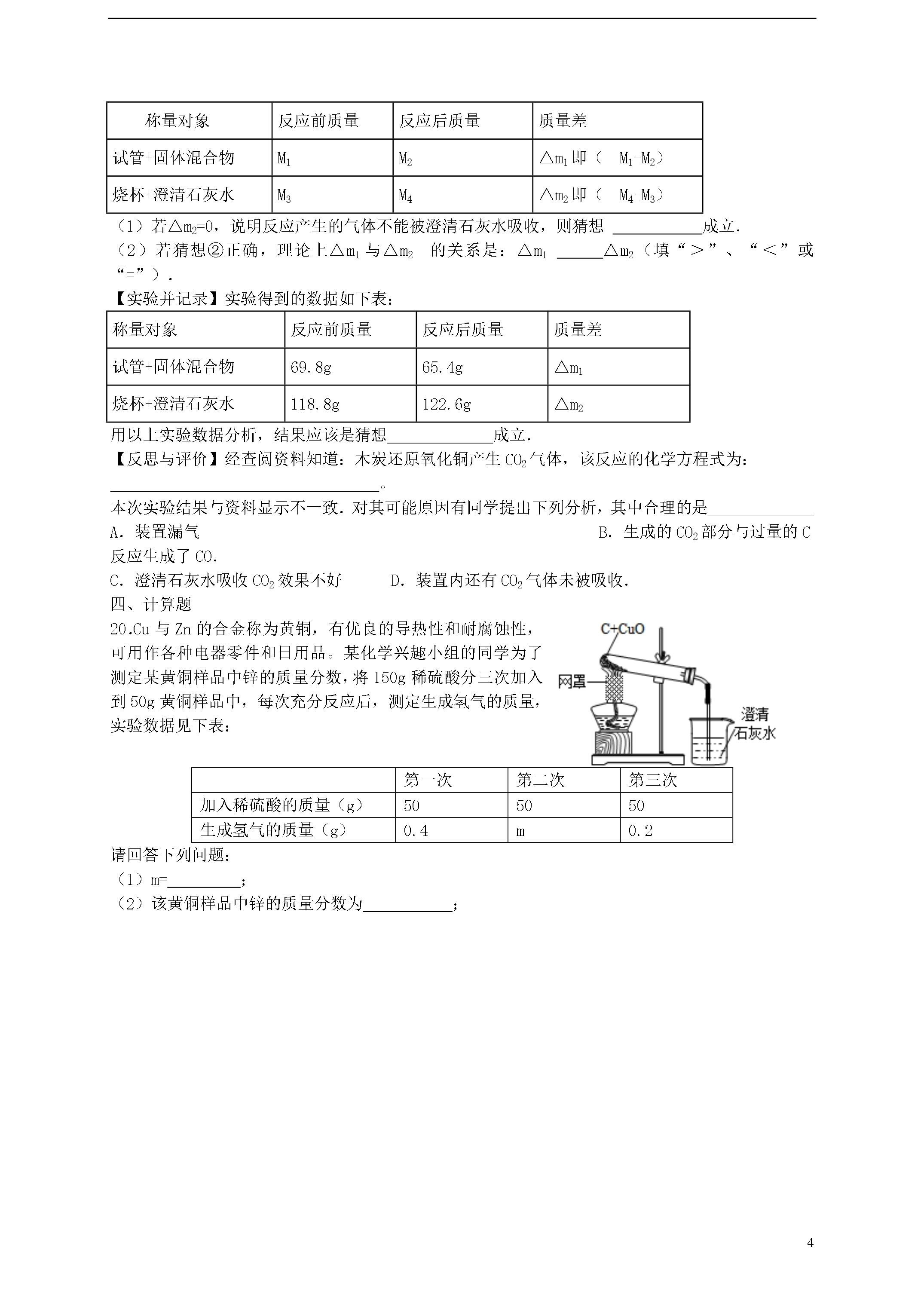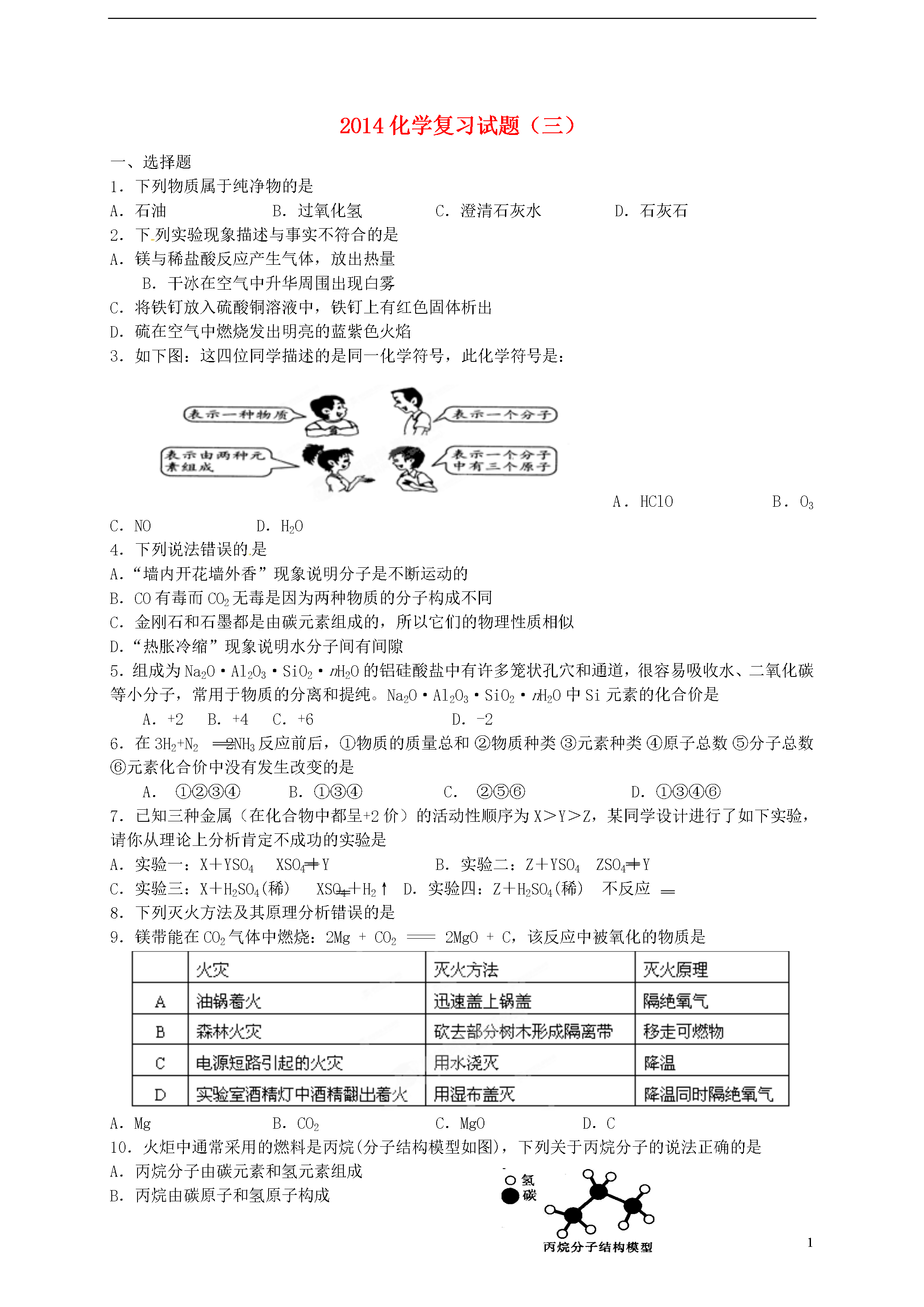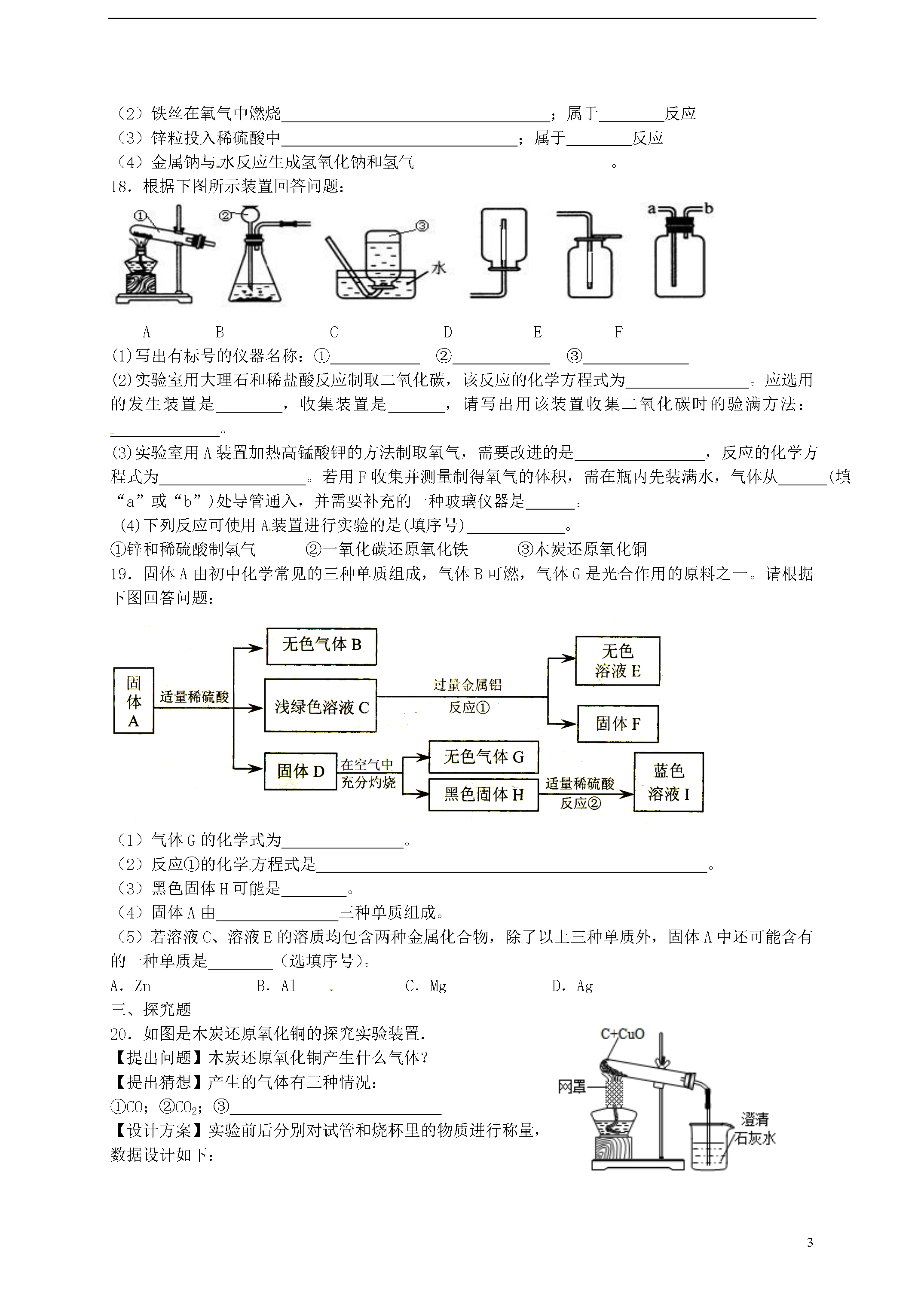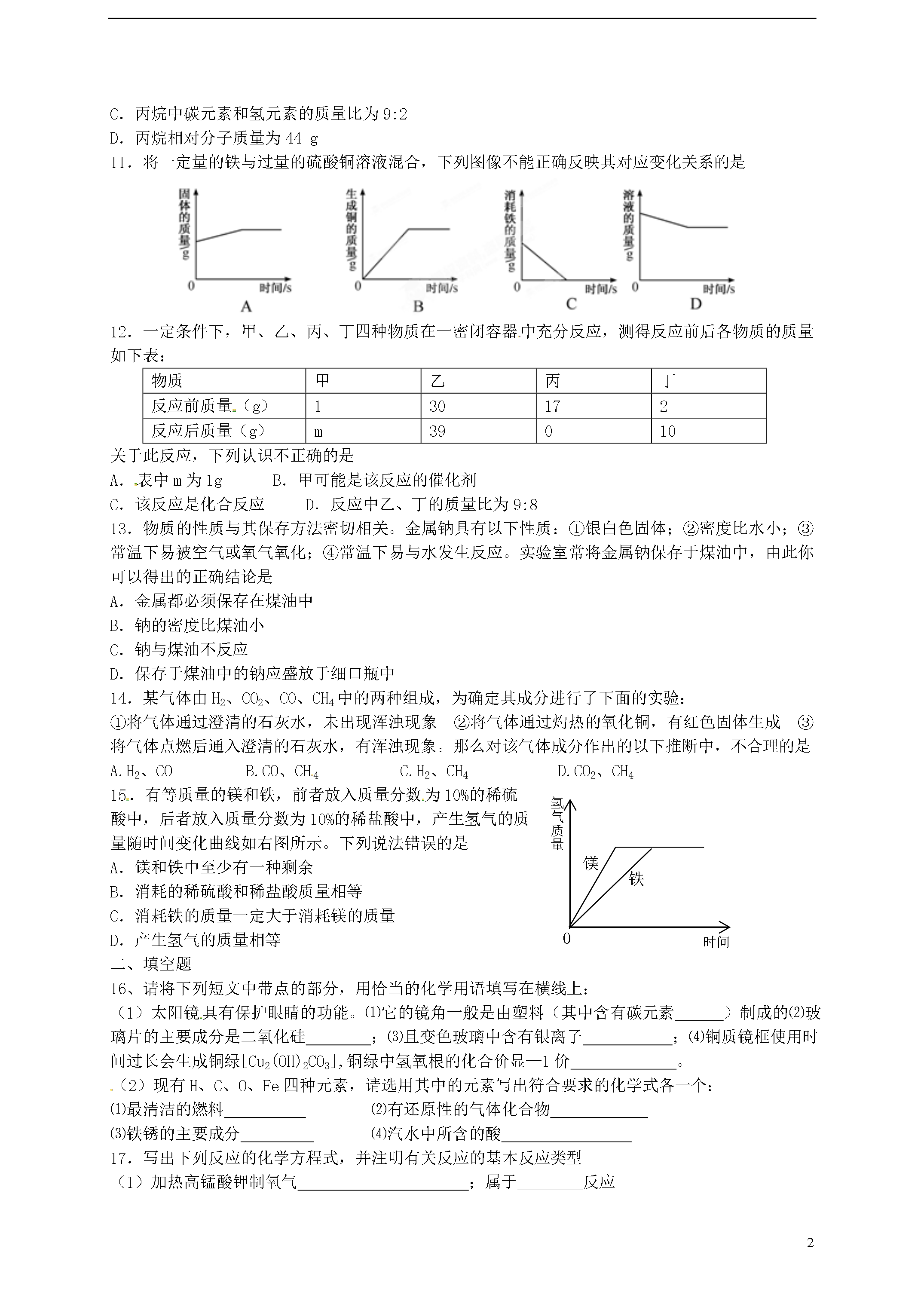 42014化学复习试题(三)一、选择题1.下列物质属于纯净物的是A.石油B.过氧化氢C.澄清石灰水D.石灰石2.下列实验现象描述与事实不符合的是A.镁与稀盐酸反应产生气体,放出热量B.干冰在空气中升华周围出现白雾C.将铁钉放入硫酸铜溶液中,铁钉上有红色固体析出D.硫在空气中燃烧发出明亮的蓝紫色火焰3.如下图:这四位同学描述的是同一化学符号,此化学符号是:A.HClOB.O3C.NOD.H2O4.下列说法错误的是A.“墙内开花墙外香”现象说明分子是不断运动的B.CO有毒而CO2无毒是因为两种物质的分子构成不同C.金刚石和石墨都是由碳元素组成的,所以它们的物理性质相似D.“热胀冷缩”现象说明水分子间有间隙5.组成为Na2O·Al2O3·SiO2·nH2O的铝硅酸盐中有许多笼状孔穴和通道,很容易吸收水、二氧化碳等小分子,常用于物质的分离和提纯。Na2O·Al2O3·SiO2·nH2O中Si元素的化合价是A.+2B.+4C.+6D.-26.在3H2+N22NH3反应前后,①物质的质量总和②物质种类③元素种类④原子总数⑤分子总数⑥元素化合价中没有发生改变的是A.①②③④B.①③④C.②⑤⑥D.①③④⑥7.已知三种金属(在化合物中都呈+2价)的活动性顺序为X>Y>Z,某同学设计进行了如下实验,请你从理论上分析肯定不成功的实验是A.实验一:X+YSO4XSO4+YB.实验二:Z+YSO4ZSO4+YC.实验三:X+H2SO4(稀)XSO4+H2↑D.实验四:Z+H2SO4(稀)不反应8.下列灭火方法及其原理分析错误的是9.镁带能在CO2气体中燃烧:2Mg+CO2=2MgO+C,该反应中被氧化的物质是A.MgB.CO2C.MgOD.C10.火炬中通常采用的燃料是丙烷(分子结构模型如图),下列关于丙烷分子的说法正确的是A.丙烷分子由碳元素和氢元素组成B.丙烷由碳原子和氢原子构成C.丙烷中碳元素和氢元素的质量比为9:2D.丙烷相对分子质量为44g11.将一定量的铁与过量的硫酸铜溶液混合,下列图像不能正确反映其对应变化关系的是12.一定条件下,甲、乙、丙、丁四种物质在一密闭容器中充分反应,测得反应前后各物质的质量如下表:物质甲乙丙丁反应前质量(g)130172反应后质量(g)m39010关于此反应,下列认识不正确的是A.表中m为1gB.甲可能是该反应的催化剂C.该反应是化合反应D.反应中乙、丁的质量比为9:813.物质的性质与其保存方法密切相关。金属钠具有以下性质:①银白色固体;②密度比水小;③常温下易被空气或氧气氧化;④常温下易与水发生反应。实验室常将金属钠保存于煤油中,由此你可以得出的正确结论是A.金属都必须保存在煤油中B.钠的密度比煤油小C.钠与煤油不反应D.保存于煤油中的钠应盛放于细口瓶中14.某气体由H2、CO2、CO、CH4中的两种组成,为确定其成分进行了下面的实验:①将气体通过澄清的石灰水,未出现浑浊现象②将气体通过灼热的氧化铜,有红色固体生成③将气体点燃后通入澄清的石灰水,有浑浊现象。那么对该气体成分作出的以下推断中,不合理的是A.H2、COB.CO、CH4C.H2、CH4D.CO2、CH4时间0镁铁氢气质量15.有等质量的镁和铁,前者放入质量分数为10%的稀硫酸中,后者放入质量分数为10%的稀盐酸中,产生氢气的质量随时间变化曲线如右图所示。下列说法错误的是A.镁和铁中至少有一种剩余B.消耗的稀硫酸和稀盐酸质量相等C.消耗铁的质量一定大于消耗镁的质量D.产生氢气的质量相等二、填空题16、请将下列短文中带点的部分,用恰当的化学用语填写在横线上:(1)太阳镜具有保护眼睛的功能。⑴它的镜角一般是由塑料(其中含有碳元素)制成的⑵玻璃片的主要成分是二氧化硅;⑶且变色玻璃中含有银离子;⑷铜质镜框使用时间过长会生成铜绿[Cu2(OH)2CO3],铜绿中氢氧根的化合价显—1价。(2)现有H、C、O、Fe四种元素,请选用其中的元素写出符合要求的化学式各一个:⑴最清洁的燃料⑵有还原性的气体化合物⑶铁锈的主要成分⑷汽水中所含的酸17.写出下列反应的化学方程式,并注明有关反应的基本反应类型(1)加热高锰酸钾制氧气;属于________反应(2)铁丝在氧气中燃烧;属于________反应(3)锌粒投入稀硫酸中;属于________反应(4)金属钠与水反应生成氢氧化钠和氢气________________________。18.根据下图所示装置回答问题:ABCDEF(1)写出有标号的仪器名称:①②③(2)实验室用大理石和稀盐酸反应制取二氧化碳,该反应的化学方程式为。应选用的发生装置是,收集装置是,请写出用该装置收集二氧化碳时的验满方法:。(3)实验室用A装置加热高锰酸钾的方法制取氧气,需要改进的是,反应的化学方程式为。若用F收集并测量制得氧气的体积,需在瓶内先