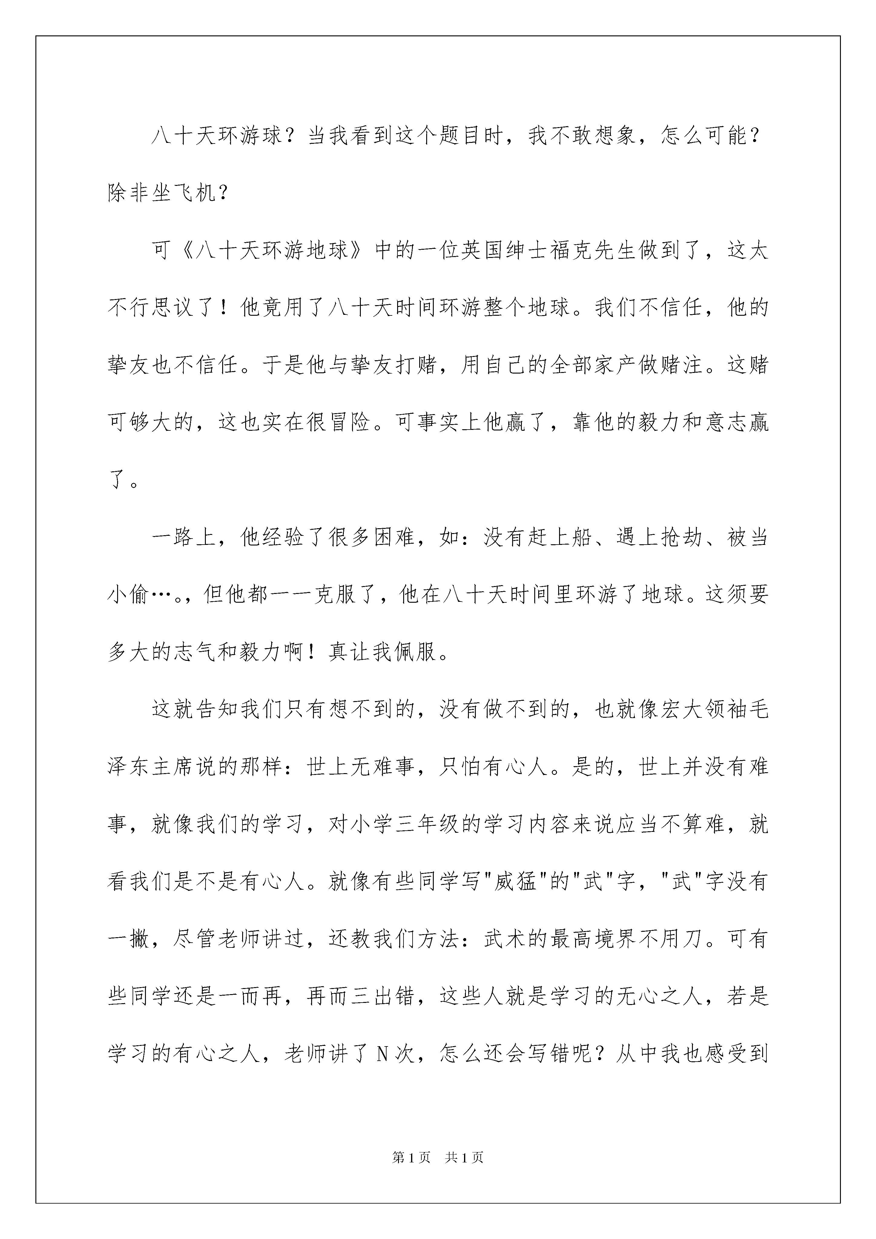 2022《地球》读后感《地球》读后感读完一本书以后,信任大家都有许多值得共享的东西,现在就让我们写一篇走心的读后感吧。那么你真的懂得怎么写读后感吗?以下是我为大家整理的《地球》读后感,欢迎大家共享。《地球》读后感1要说《八十天环游地球》中最有性格特点的人物,那确定是这本书的男主子公——菲力斯·福格先生了。他不管在什么状况下,都能保持冷静,而他的这种冷静也是值得我们学习的。在他的身上,我相识到了冷静在不同场合下的不同含义。因为要在八十天内环游地球,所以时间对于福格先生来说是非常重要的。根据他的规划,他们的行程本应是完备的。可是天不尽人意,在真正执行的时候,有好几次他们都误了火车和邮轮。每当陪伴的仆人路路通和艾娥达夫人着急担心的时候,福格先生总是露出一张扑克脸,似乎他根本没有任何表情。而每次,他总能找到弥补的方法。这时,冷静不只是冷静,是能多驾驭事情大局的实力。还记得在他们的旅途中有一次被印第安人的部落劫了火车。在福格先生等人的反击后,印第安人逃了回去,大家也平安抵达了车站,可是,他的仆人路路通和两名乘客不见了。福格先生说要去找他们三个,而防卫军的队长却认为面对近千人的印第安部落毫无胜算,不让他和军人去。这时,福格先生安静地说:“那我一个人去。”队长佩服他的志气,给了他三十个士兵一同前去。最终,他真的胜利救回了那三个人。这时,冷静不只是安静,更是为了挚友能两肋插刀,甘愿一个人抵抗千军万马的志气。在这本书中,其实还有一个贯穿全文的小人物——自大的侦探费克斯。他把环游地球的福格先生当成了偷走英国银行伦敦分行5万5千英镑的犯人。于是,他几乎全程跟随着福格先生,并在逮捕令到手后以偷窃罪逮捕了福格先生。在搞清晰这是一场误会之后,他向福格先生道了歉。这时,一路照看费克斯衣食住行的福格先生一言不发地走到费克斯的面前,给了他一拳后淡然地离开了当地的警察局。这时,冷静不只是一言不发,更是隐忍到最终的爆发。冷静,不只有一种含义。《地球》读后感2八十天环游球?当我看到这个题目时,我不敢想象,怎么可能?除非坐飞机?可《八十天环游地球》中的一位英国绅士福克先生做到了,这太不行思议了!他竟用了八十天时间环游整个地球。我们不信任,他的挚友也不信任。于是他与挚友打赌,用自己的全部家产做赌注。这赌可够大的,这也实在很冒险。可事实上他赢了,靠他的毅力和意志赢了。一路上,他经验了很多困难,如:没有赶上船、遇上抢劫、被当小偷…。,但他都一一克服了,他在八十天时间里环游了地球。这须要多大的志气和毅力啊!真让我佩服。这就告知我们只有想不到的,没有做不到的,也就像宏大领袖毛泽东主席说的那样:世上无难事,只怕有心人。是的,世上并没有难事,就像我们的学习,对小学三年级的学习内容来说应当不算难,就看我们是不是有心人。就像有些同学写"威猛"的"武"字,"武"字没有一撇,尽管老师讲过,还教我们方法:武术的最高境界不用刀。可有些同学还是一而再,再而三出错,这些人就是学习的无心之人,若是学习的有心之人,老师讲了N次,怎么还会写错呢?从中我也感受到老师是教书的有心之人,老师很专心地教我们,怕我们写错,想出好方法让我们记住字形。其实,我们学习、生活中困难是难免的,但要看我们怎样动脑筋想方法战胜困难,方法总比困难多,就看我们有没有福克生的这种精神和决心。假如每个人都把福克的这种精神用到学习中去,刻苦学习,那将来肯定学业有成。正所谓天下没有免费的午餐,大家不要想着坐享其成,就像书中皮蒂一样,想白拿福克先生的六千美金,结果自己的珍宝船也没有了。只有付出,才有收获,只有坚持,才能胜利,只有努力拼搏,才会有更大的成就,更好的将来。这本书给了我奋斗的力气,我要向着我的目标英勇前进,做一个学习、生活的勇士,成为一个真正的男子汉。《地球》读后感3《八十天环游地球》这本书讲解并描述了福格先生与俱乐部的人打赌,可以在八十天内环游地球的故事。在旅途中他和仆人万事通经验了被人追踪、英勇救人、在法院与恶僧对质、遭人暗算误轮船、主仆失散等一连串惊险,终获胜利的故事。福格先生是一位典型的绅士,举动落落大方,对人亲善可亲,从不高声叫嚷、大惊小怪,做出任何让人厌恶的举动。无论发生了什么事情,他总能临危不惧,镇静冷静地视察事态发展,从容应对各种状况。令我印象最深的是福格先生被菲克斯警探误抓的事。在环游地球立刻就要胜利的最终关头,福格先生被囚禁在房间里,但是他仍旧没有一丝慌乱,只是静静地坐在椅子上望着手表,直到警探发觉自己抓错了人而把他释放。这须要何等超群的定力啊!反观我自己,只要遇上一丁点的挫折,就会大惊小怪,大喊大叫,做事也是毛毛躁躁,与福格先生的品行实在相差甚远。福格先