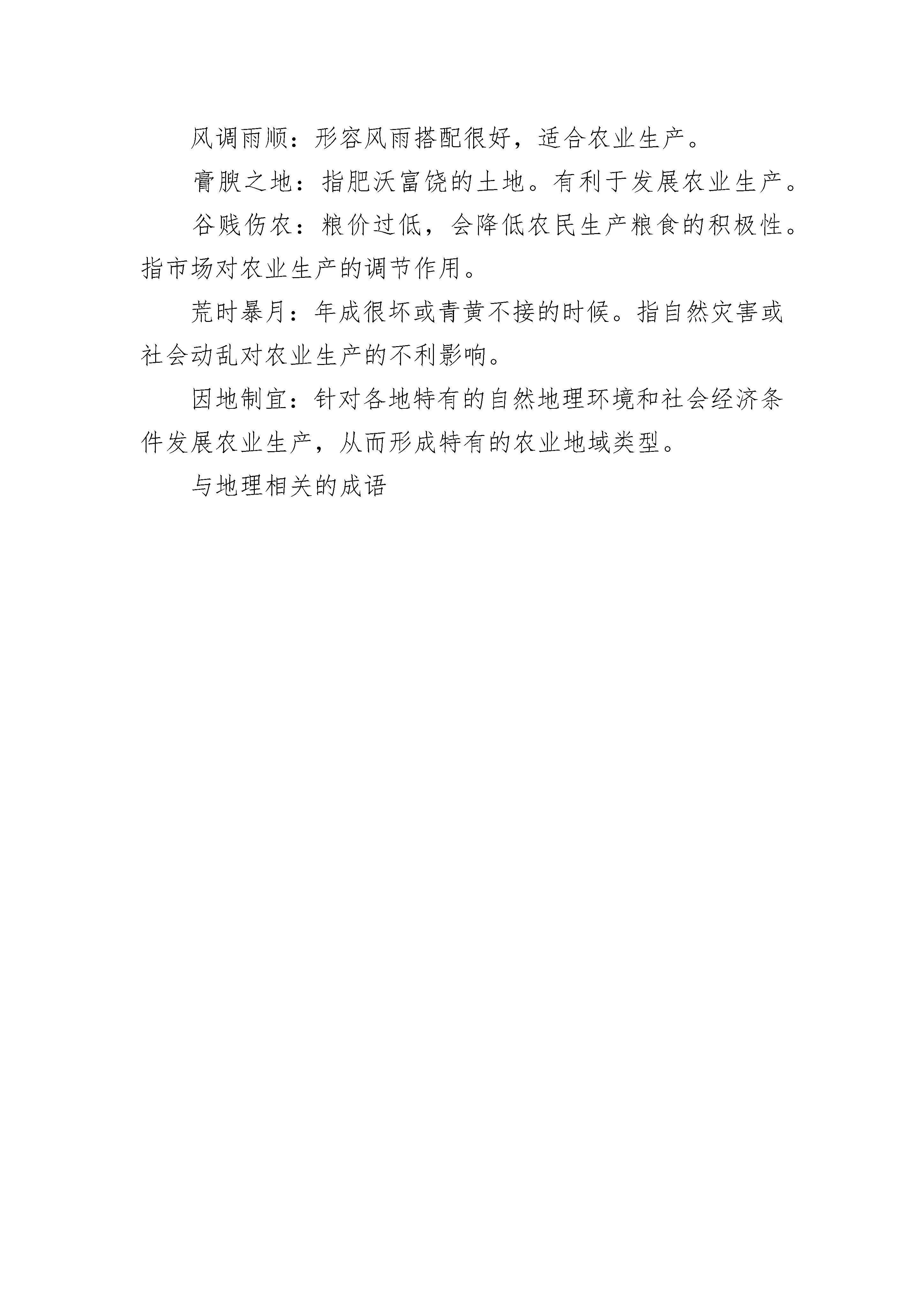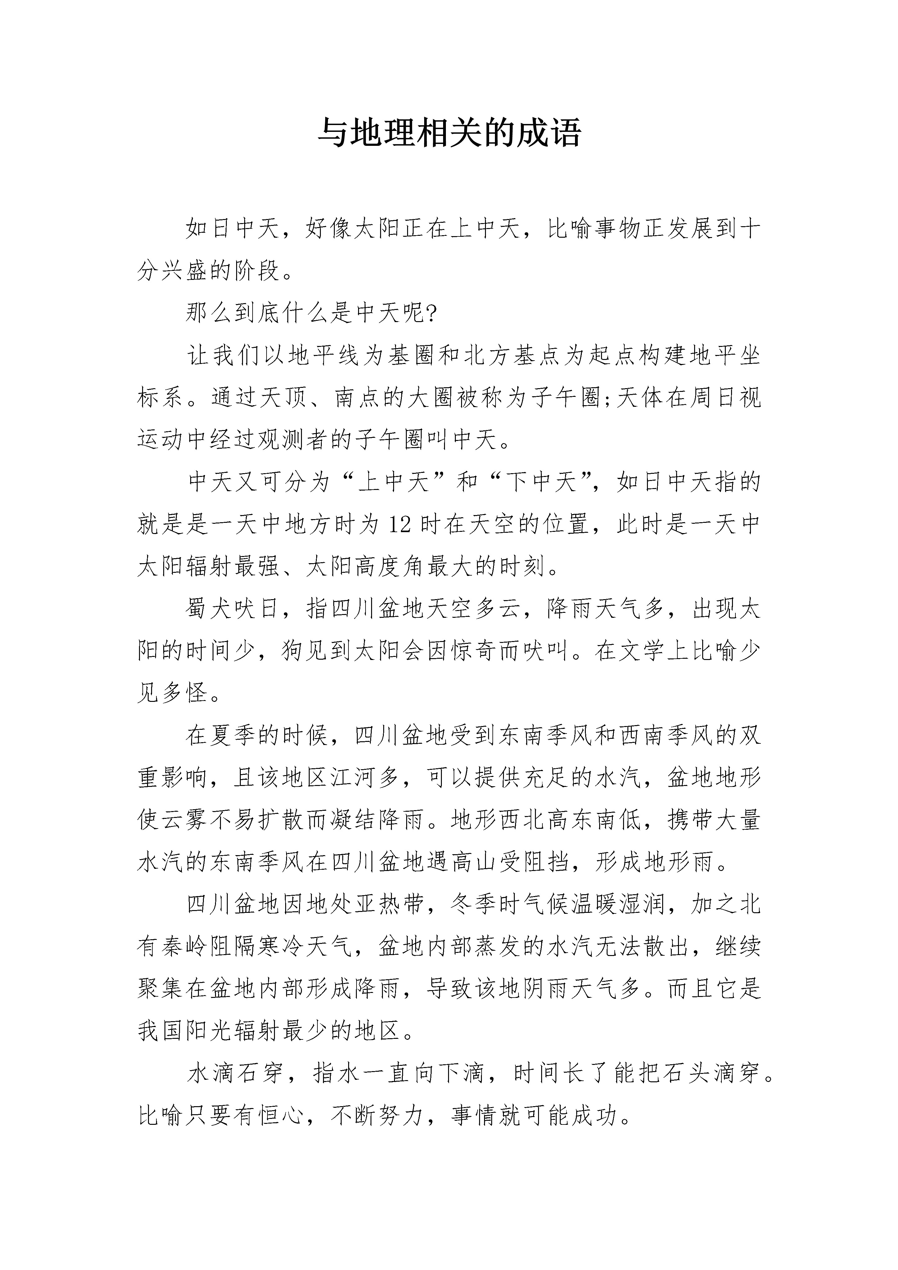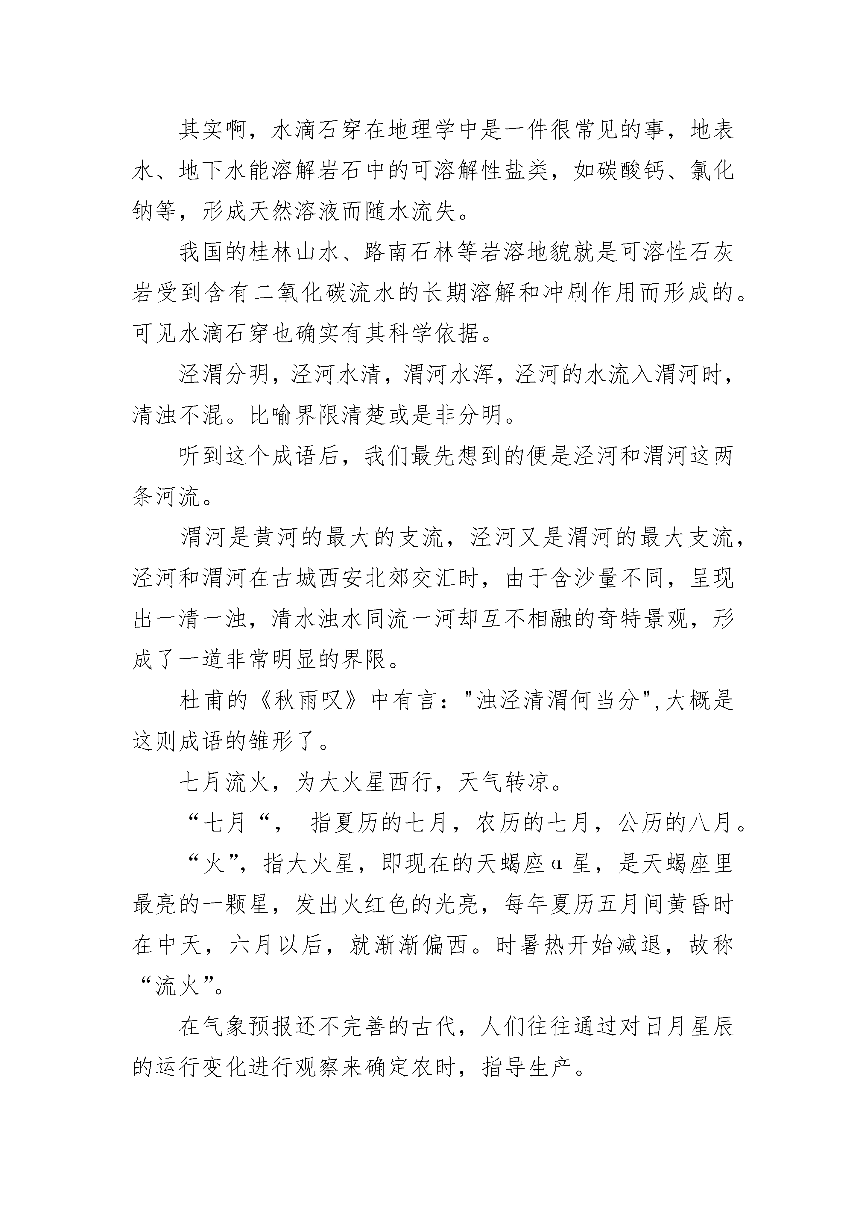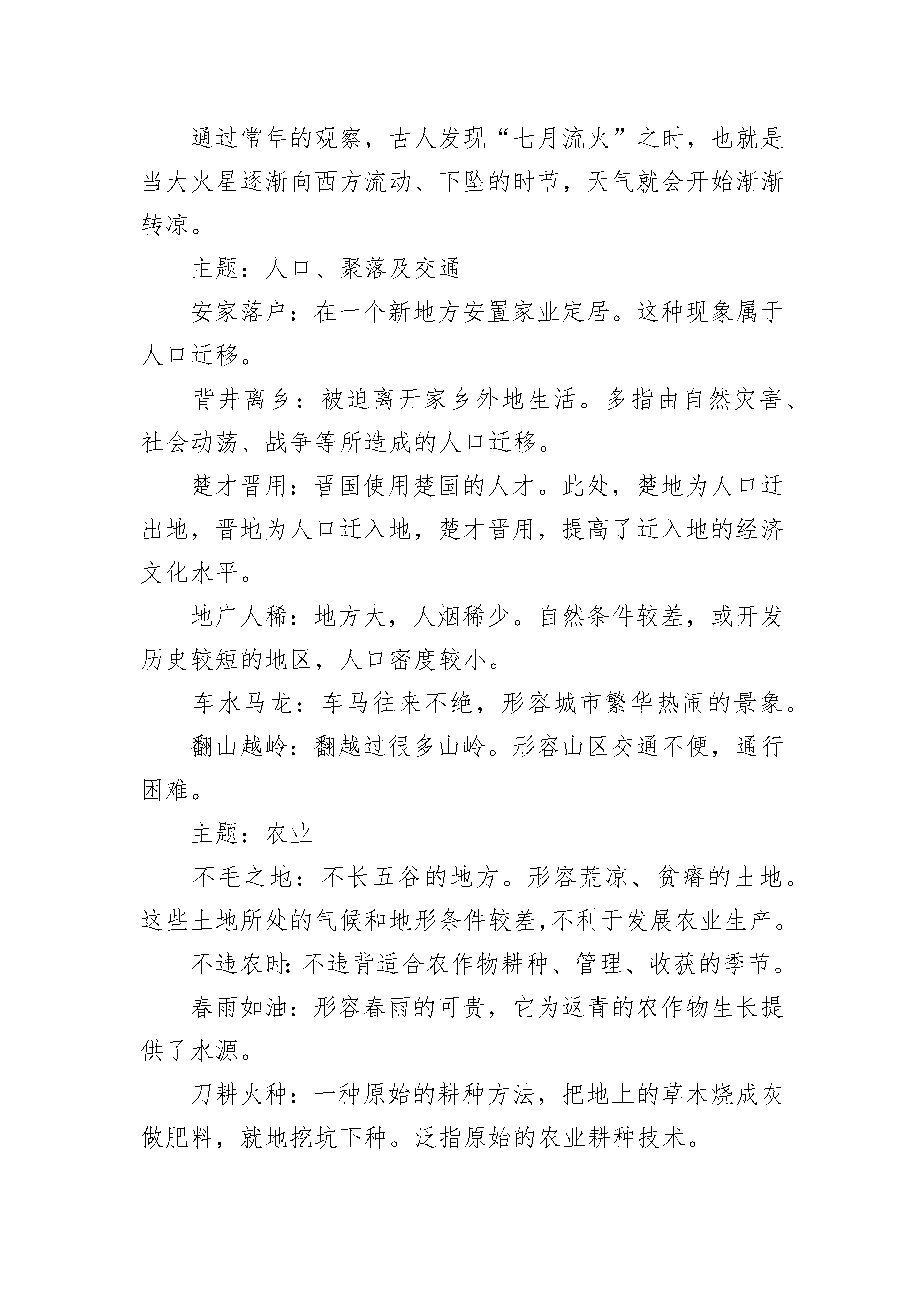 与地理相关的成语如日中天,好像太阳正在上中天,比喻事物正发展到十分兴盛的阶段。那么到底什么是中天呢?让我们以地平线为基圈和北方基点为起点构建地平坐标系。通过天顶、南点的大圈被称为子午圈;天体在周日视运动中经过观测者的子午圈叫中天。中天又可分为“上中天”和“下中天”,如日中天指的就是是一天中地方时为12时在天空的位置,此时是一天中太阳辐射最强、太阳高度角最大的时刻。蜀犬吠日,指四川盆地天空多云,降雨天气多,出现太阳的时间少,狗见到太阳会因惊奇而吠叫。在文学上比喻少见多怪。在夏季的时候,四川盆地受到东南季风和西南季风的双重影响,且该地区江河多,可以提供充足的水汽,盆地地形使云雾不易扩散而凝结降雨。地形西北高东南低,携带大量水汽的东南季风在四川盆地遇高山受阻挡,形成地形雨。四川盆地因地处亚热带,冬季时气候温暖湿润,加之北有秦岭阻隔寒冷天气,盆地内部蒸发的水汽无法散出,继续聚集在盆地内部形成降雨,导致该地阴雨天气多。而且它是我国阳光辐射最少的地区。水滴石穿,指水一直向下滴,时间长了能把石头滴穿。比喻只要有恒心,不断努力,事情就可能成功。其实啊,水滴石穿在地理学中是一件很常见的事,地表水、地下水能溶解岩石中的可溶解性盐类,如碳酸钙、氯化钠等,形成天然溶液而随水流失。我国的桂林山水、路南石林等岩溶地貌就是可溶性石灰岩受到含有二氧化碳流水的长期溶解和冲刷作用而形成的。可见水滴石穿也确实有其科学依据。泾渭分明,泾河水清,渭河水浑,泾河的水流入渭河时,清浊不混。比喻界限清楚或是非分明。听到这个成语后,我们最先想到的便是泾河和渭河这两条河流。渭河是黄河的最大的支流,泾河又是渭河的最大支流,泾河和渭河在古城西安北郊交汇时,由于含沙量不同,呈现出一清一浊,清水浊水同流一河却互不相融的奇特景观,形成了一道非常明显的界限。杜甫的《秋雨叹》中有言:"浊泾清渭何当分",大概是这则成语的雏形了。七月流火,为大火星西行,天气转凉。“七月“,指夏历的七月,农历的七月,公历的八月。“火”,指大火星,即现在的天蝎座α星,是天蝎座里最亮的一颗星,发出火红色的光亮,每年夏历五月间黄昏时在中天,六月以后,就渐渐偏西。时暑热开始减退,故称“流火”。在气象预报还不完善的古代,人们往往通过对日月星辰的运行变化进行观察来确定农时,指导生产。通过常年的观察,古人发现“七月流火”之时,也就是当大火星逐渐向西方流动、下坠的时节,天气就会开始渐渐转凉。主题:人口、聚落及交通安家落户:在一个新地方安置家业定居。这种现象属于人口迁移。背井离乡:被迫离开家乡外地生活。多指由自然灾害、社会动荡、战争等所造成的人口迁移。楚才晋用:晋国使用楚国的人才。此处,楚地为人口迁出地,晋地为人口迁入地,楚才晋用,提高了迁入地的经济文化水平。地广人稀:地方大,人烟稀少。自然条件较差,或开发历史较短的地区,人口密度较小。车水马龙:车马往来不绝,形容城市繁华热闹的景象。翻山越岭:翻越过很多山岭。形容山区交通不便,通行困难。主题:农业不毛之地:不长五谷的地方。形容荒凉、贫瘠的土地。这些土地所处的气候和地形条件较差,不利于发展农业生产。不违农时:不违背适合农作物耕种、管理、收获的季节。春雨如油:形容春雨的可贵,它为返青的农作物生长提供了水源。刀耕火种:一种原始的耕种方法,把地上的草木烧成灰做肥料,就地挖坑下种。泛指原始的农业耕种技术。风调雨顺:形容风雨搭配很好,适合农业生产。膏腴之地:指肥沃富饶的土地。有利于发展农业生产。谷贱伤农:粮价过低,会降低农民生产粮食的积极性。指市场对农业生产的调节作用。荒时暴月:年成很坏或青黄不接的时候。指自然灾害或社会动乱对农业生产的不利影响。因地制宜:针对各地特有的自然地理环境和社会经济条件发展农业生产,从而形成特有的农业地域类型。与地理相关的成语