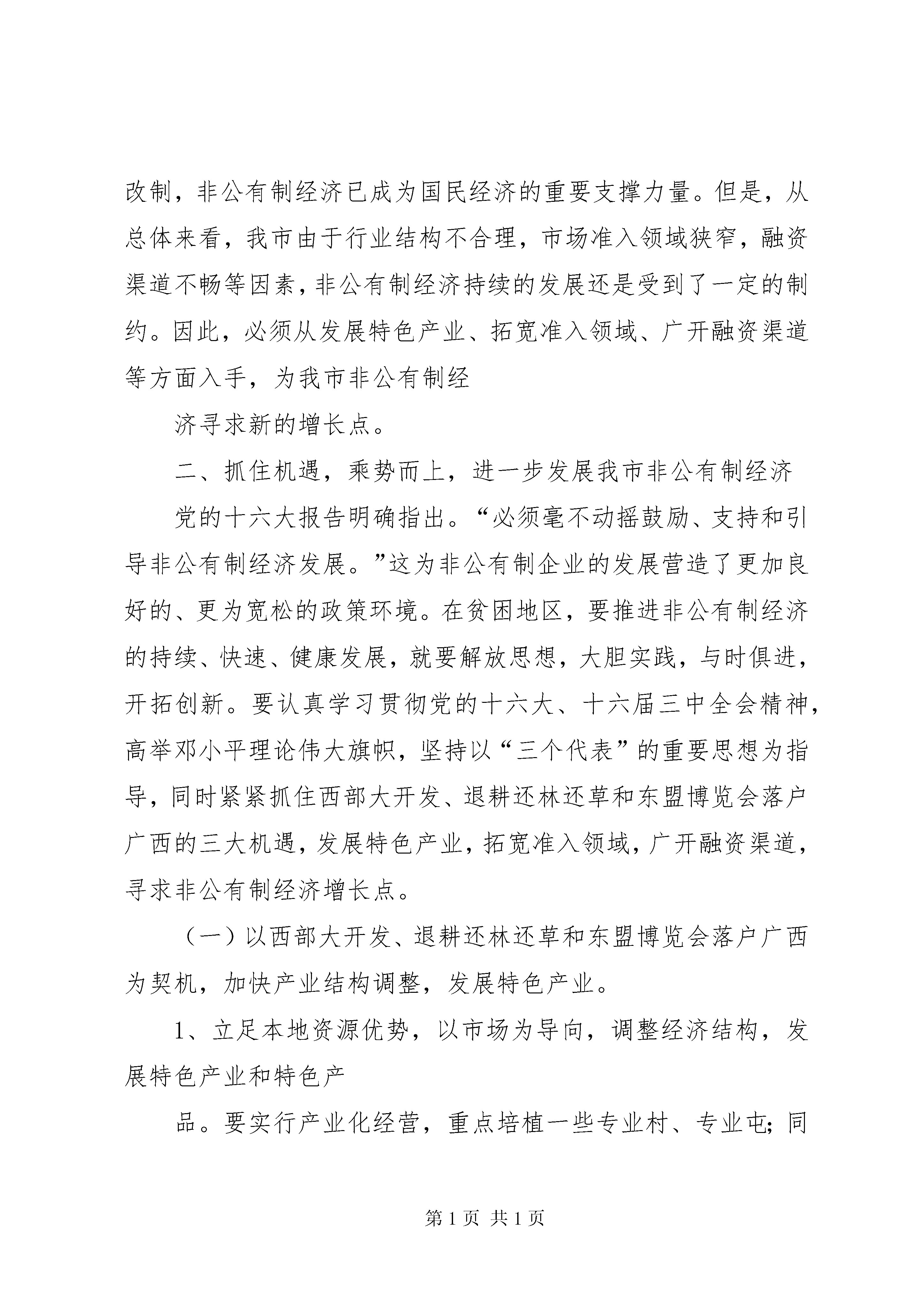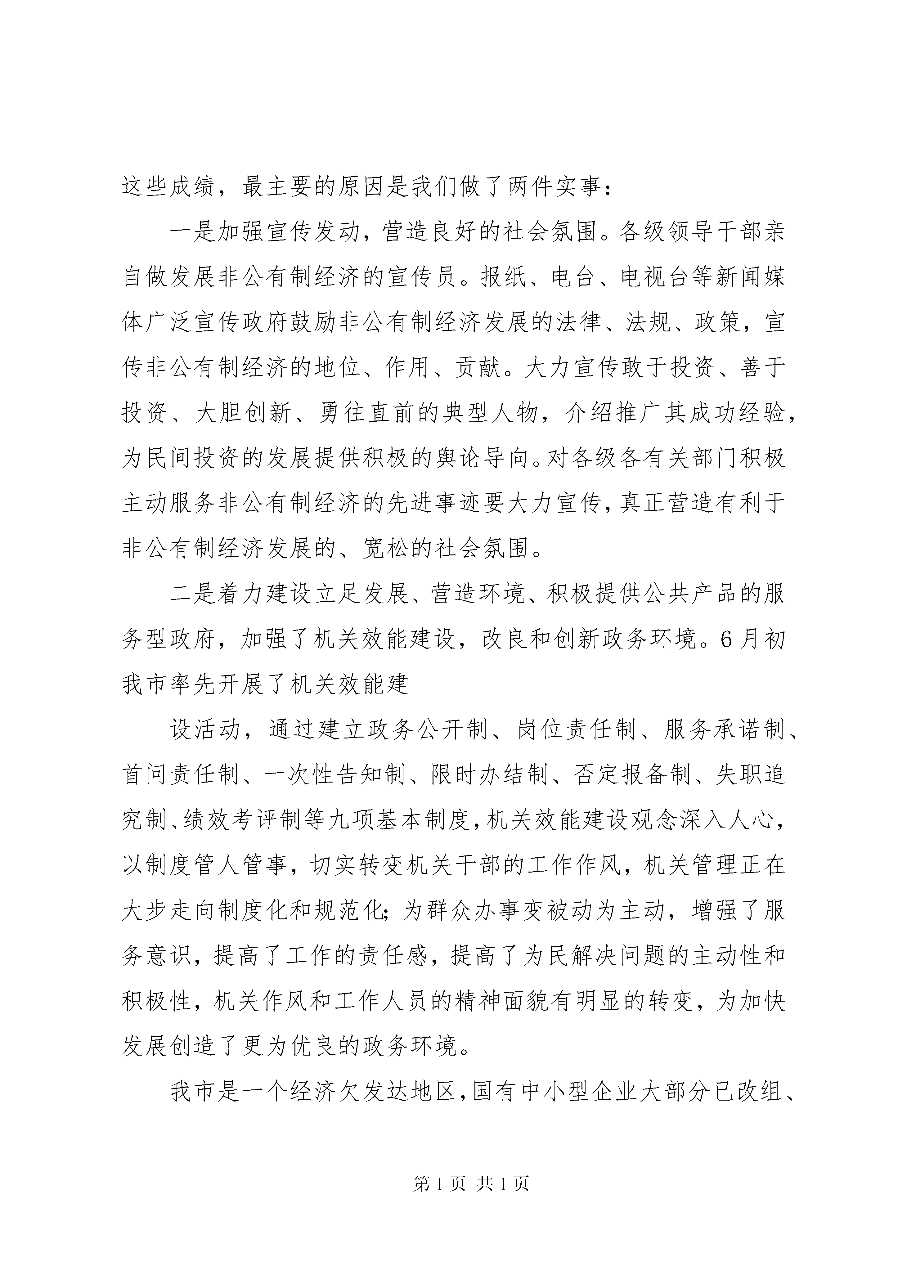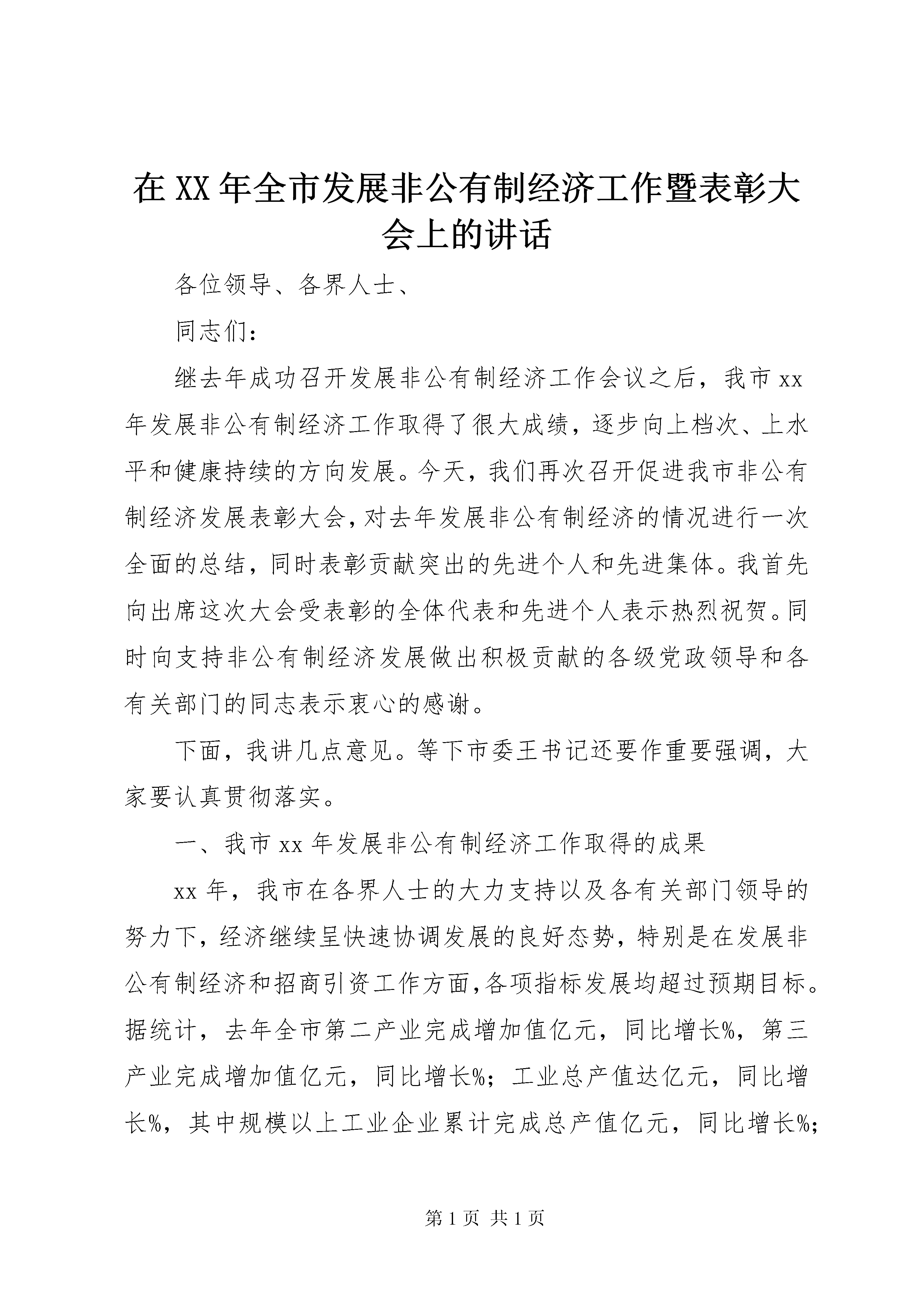 在XX年全市发展非公有制经济工作暨表彰大会上的讲话各位领导、各界人士、同志们:继去年成功召开发展非公有制经济工作会议之后,我市xx年发展非公有制经济工作取得了很大成绩,逐步向上档次、上水平和健康持续的方向发展。今天,我们再次召开促进我市非公有制经济发展表彰大会,对去年发展非公有制经济的情况进行一次全面的总结,同时表彰贡献突出的先进个人和先进集体。我首先向出席这次大会受表彰的全体代表和先进个人表示热烈祝贺。同时向支持非公有制经济发展做出积极贡献的各级党政领导和各有关部门的同志表示衷心的感谢。下面,我讲几点意见。等下市委王书记还要作重要强调,大家要认真贯彻落实。一、我市xx年发展非公有制经济工作取得的成果xx年,我市在各界人士的大力支持以及各有关部门领导的努力下,经济继续呈快速协调发展的良好态势,特别是在发展非公有制经济和招商引资工作方面,各项指标发展均超过预期目标。据统计,去年全市第二产业完成增加值亿元,同比增长%,第三产业完成增加值亿元,同比增长%;工业总产值达亿元,同比增长%,其中规模以上工业企业累计完成总产值亿元,同比增长%;外贸出口1583万美元;下岗失业人员实现再就业11592人,完成指标任务的%;城镇登记失业率%,比国家控制指标低个百分点。去年我市制定完善招商引资优惠政策,优化招商引资的软硬环境,招商引资取得了历年来的最好成果。其中新引入项目73个,落实招商引资项目68个,意向引入资金亿元,实际引入资金亿元,是上年的3倍多。投资11000万元的湘柳中密度纤维板厂、投资4500万元的xxx市佳绫丝绸有限公司、投资5400万元的xxx红枫淀粉厂都实现了当年投资当年投产当年有效益的目标。投资6500万元的温泉旅游开发项目于xx年11月11日举行隆重的开工典礼,投资3000万元的青山石巷迷宫开发项目已完成征(租)地及设计工作,即将动工建设。投资总额达亿元的甲六水利枢纽工程于11月18日正式开工。广东三水至丰纸业公司投资亿元建设年产19万吨高强瓦楞纸生产线项目已开始征地,落户我市。xx年,我市共新发展个体工商户5378户、私营企业110户,新增从业人员7891人,新增注册资金34370万元。统计至xx年年底,全市个体私营企业发展到110086户,从业人员204520人,注册资本52755万元,总产值69600万元,销售总额和营业收入94890万元,社会消费品零售总额93420万元,全年上缴利税23330万元,非公有制经济已逐步成为地方财政收入的重要支柱,促进了地方经济的发展,缓解了就业矛盾。取得这些成绩,最主要的原因是我们做了两件实事:一是加强宣传发动,营造良好的社会氛围。各级领导干部亲自做发展非公有制经济的宣传员。报纸、电台、电视台等新闻媒体广泛宣传政府鼓励非公有制经济发展的法律、法规、政策,宣传非公有制经济的地位、作用、贡献。大力宣传敢于投资、善于投资、大胆创新、勇往直前的典型人物,介绍推广其成功经验,为民间投资的发展提供积极的舆论导向。对各级各有关部门积极主动服务非公有制经济的先进事迹要大力宣传,真正营造有利于非公有制经济发展的、宽松的社会氛围。二是着力建设立足发展、营造环境、积极提供公共产品的服务型政府,加强了机关效能建设,改良和创新政务环境。6月初我市率先开展了机关效能建设活动,通过建立政务公开制、岗位责任制、服务承诺制、首问责任制、一次性告知制、限时办结制、否定报备制、失职追究制、绩效考评制等九项基本制度,机关效能建设观念深入人心,以制度管人管事,切实转变机关干部的工作作风,机关管理正在大步走向制度化和规范化;为群众办事变被动为主动,增强了服务意识,提高了工作的责任感,提高了为民解决问题的主动性和积极性,机关作风和工作人员的精神面貌有明显的转变,为加快发展创造了更为优良的政务环境。我市是一个经济欠发达地区,国有中小型企业大部分已改组、改制,非公有制经济已成为国民经济的重要支撑力量。但是,从总体来看,我市由于行业结构不合理,市场准入领域狭窄,融资渠道不畅等因素,非公有制经济持续的发展还是受到了一定的制约。因此,必须从发展特色产业、拓宽准入领域、广开融资渠道等方面入手,为我市非公有制经济寻求新的增长点。二、抓住机遇,乘势而上,进一步发展我市非公有制经济党的十六大报告明确指出。“必须毫不动摇鼓励、支持和引导非公有制经济发展。”这为非公有制企业的发展营造了更加良好的、更为宽松的政策环境。在贫困地区,要推进非公有制经济的持续、快速、健康发展,就要解放思想,大胆实践,与时俱进,开拓创新。要认真学习贯彻党的十六大、十六届三中全会精神,高举邓小平理论伟大旗帜,坚持以“三个代表”的重要思想为指导,同时紧紧抓住西部大开发、退耕还林还草和东盟博览会落户广西的三大机遇,发展特色产业,拓宽准入领域,广开融资渠道,寻